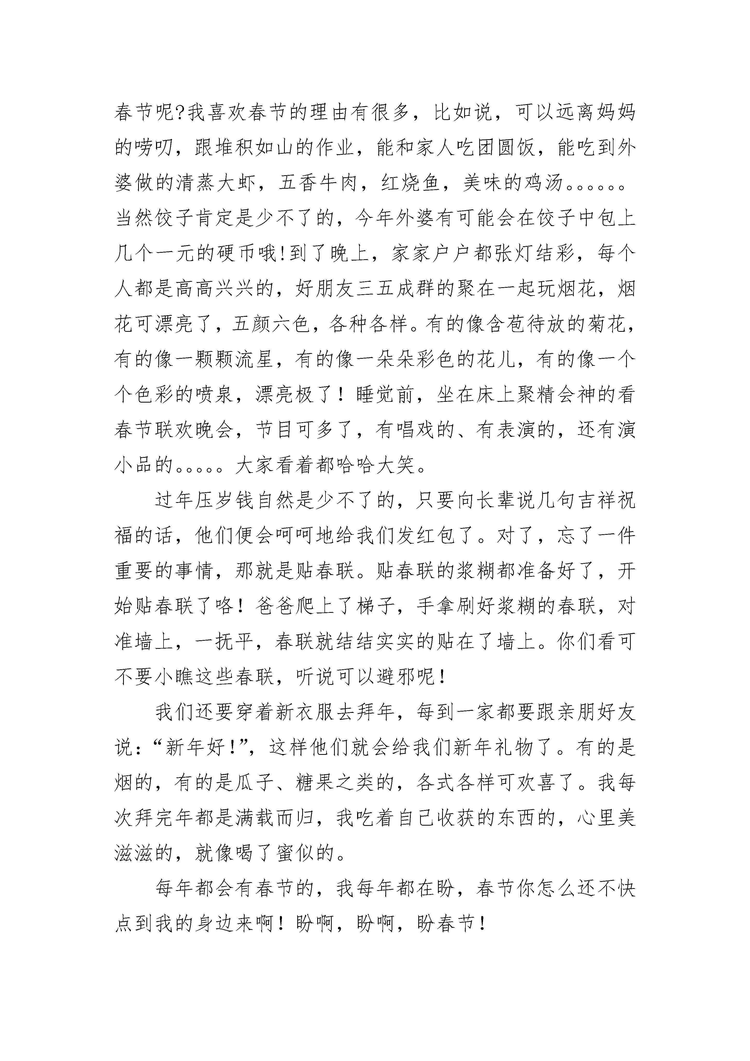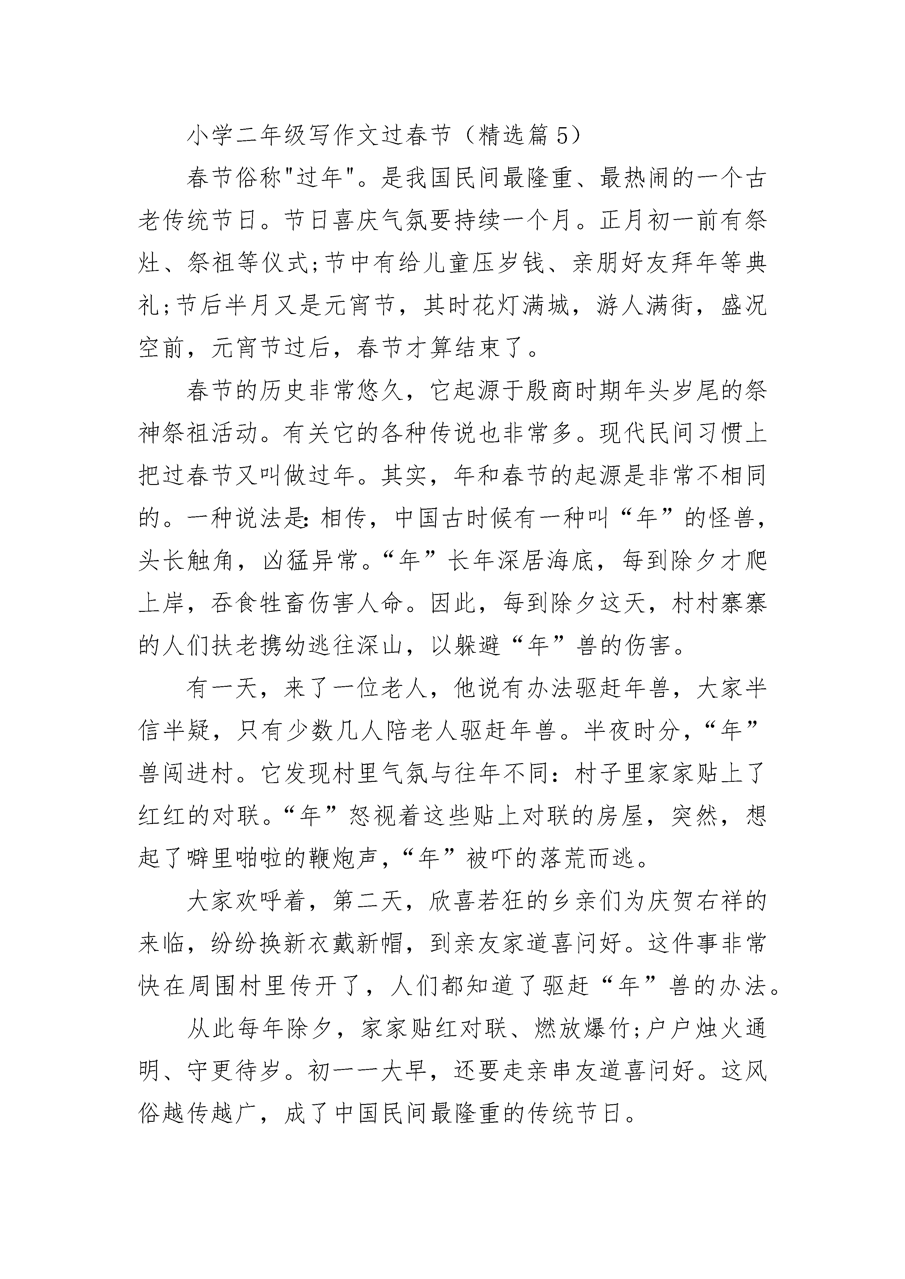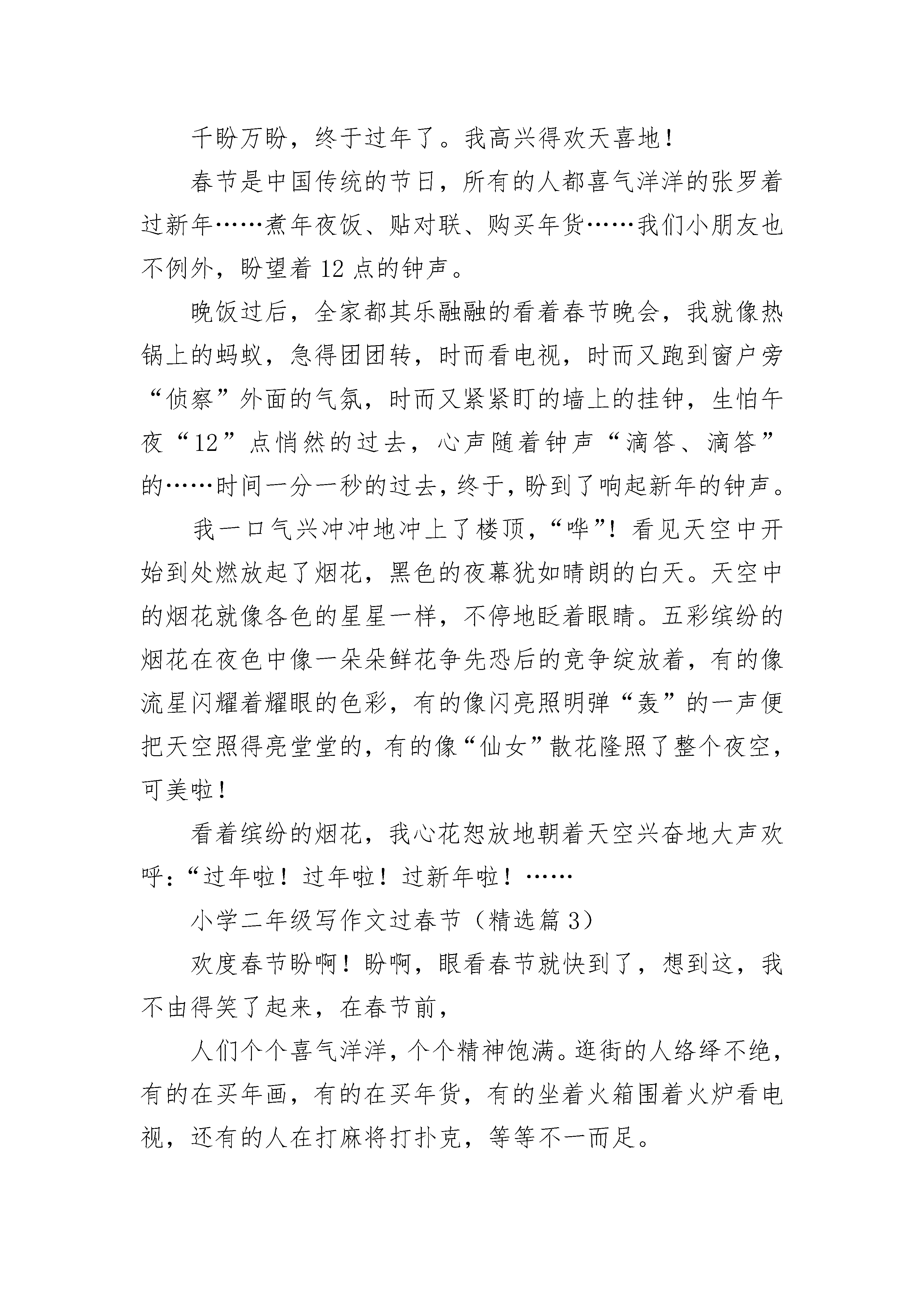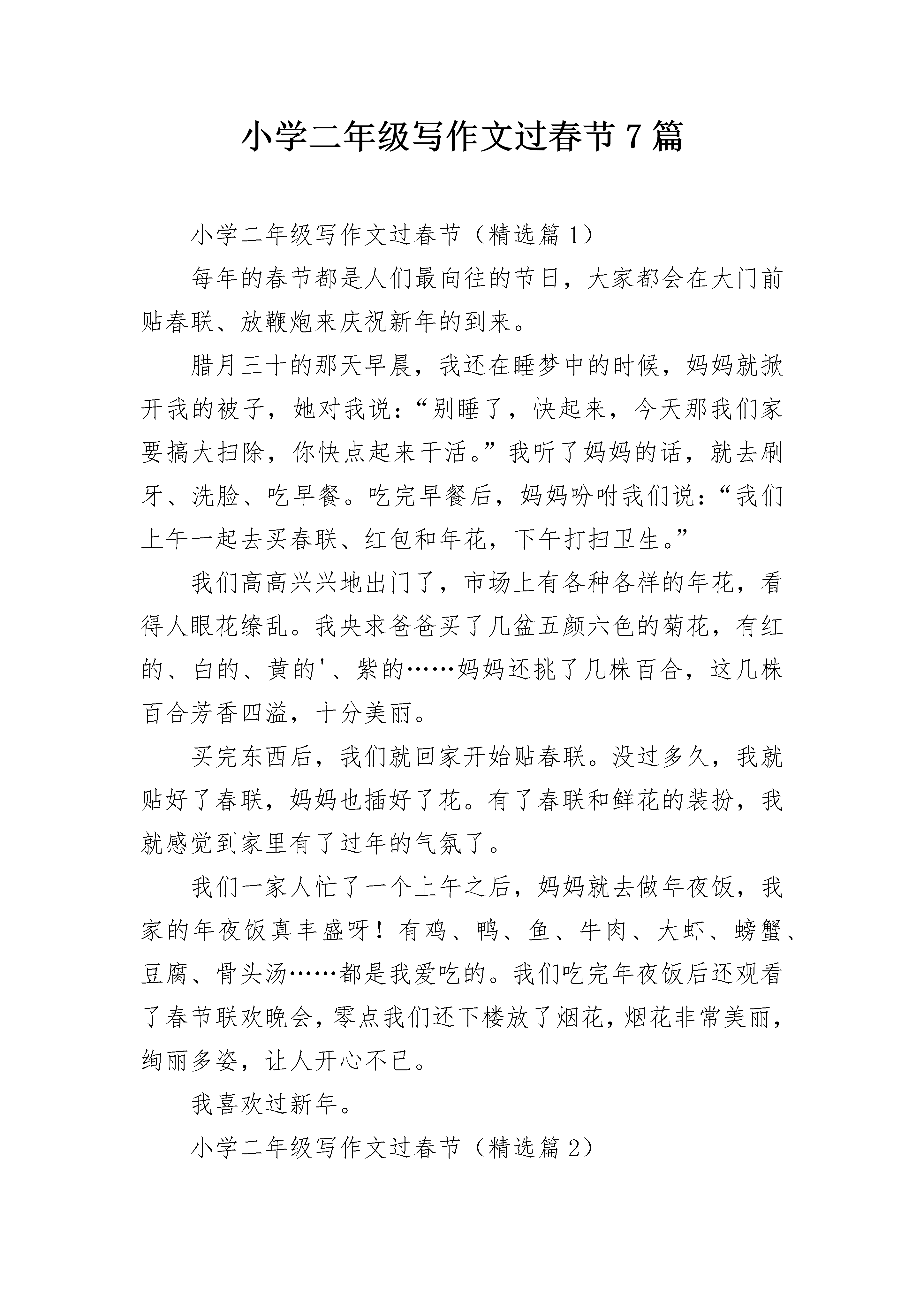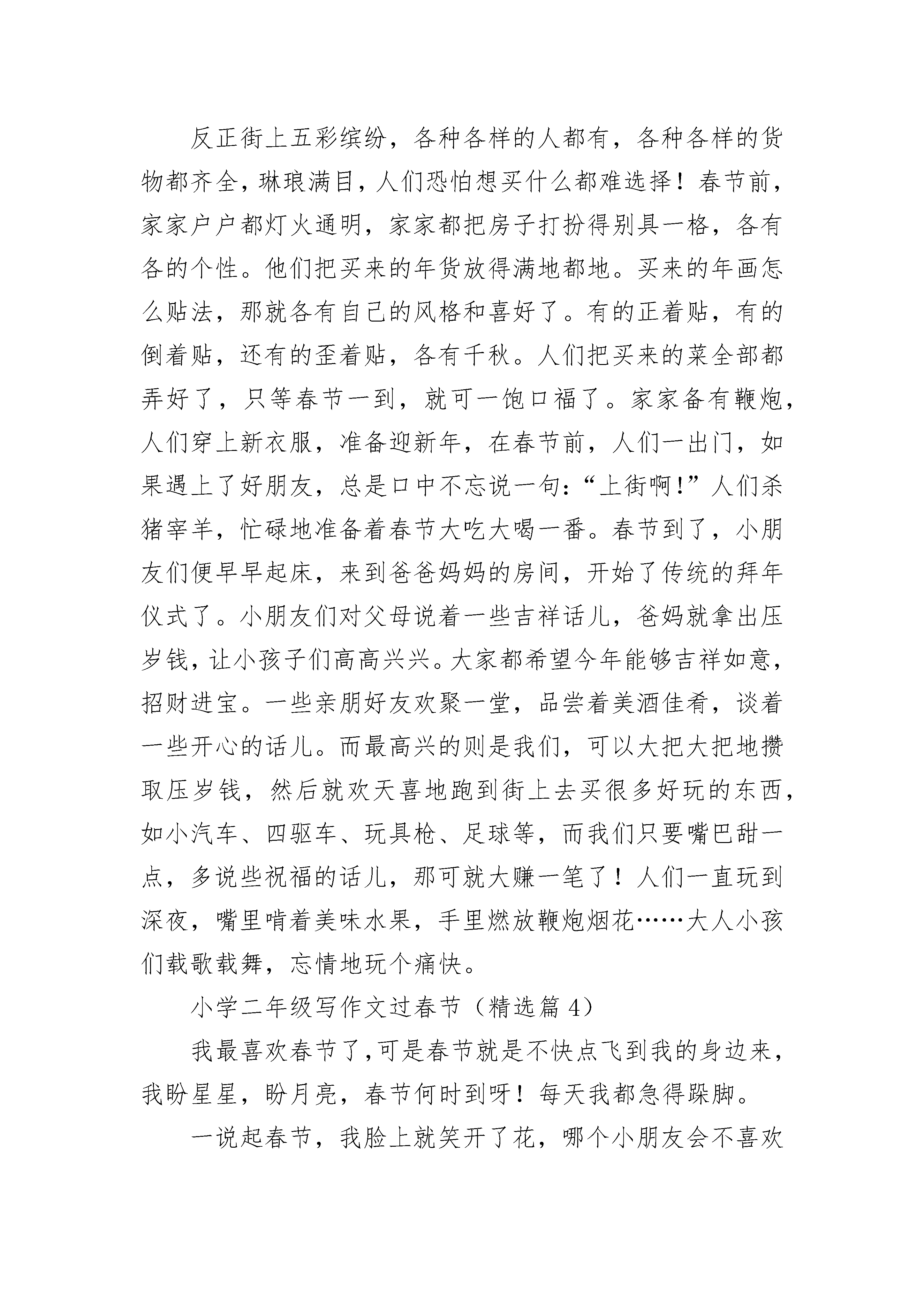 小学二年级写作文过春节7篇小学二年级写作文过春节(精选篇1)每年的春节都是人们最向往的节日,大家都会在大门前贴春联、放鞭炮来庆祝新年的到来。腊月三十的那天早晨,我还在睡梦中的时候,妈妈就掀开我的被子,她对我说:“别睡了,快起来,今天那我们家要搞大扫除,你快点起来干活。”我听了妈妈的话,就去刷牙、洗脸、吃早餐。吃完早餐后,妈妈吩咐我们说:“我们上午一起去买春联、红包和年花,下午打扫卫生。”我们高高兴兴地出门了,市场上有各种各样的年花,看得人眼花缭乱。我央求爸爸买了几盆五颜六色的菊花,有红的、白的、黄的'、紫的……妈妈还挑了几株百合,这几株百合芳香四溢,十分美丽。买完东西后,我们就回家开始贴春联。没过多久,我就贴好了春联,妈妈也插好了花。有了春联和鲜花的装扮,我就感觉到家里有了过年的气氛了。我们一家人忙了一个上午之后,妈妈就去做年夜饭,我家的年夜饭真丰盛呀!有鸡、鸭、鱼、牛肉、大虾、螃蟹、豆腐、骨头汤……都是我爱吃的。我们吃完年夜饭后还观看了春节联欢晚会,零点我们还下楼放了烟花,烟花非常美丽,绚丽多姿,让人开心不已。我喜欢过新年。小学二年级写作文过春节(精选篇2)千盼万盼,终于过年了。我高兴得欢天喜地!春节是中国传统的节日,所有的人都喜气洋洋的张罗着过新年……煮年夜饭、贴对联、购买年货……我们小朋友也不例外,盼望着12点的钟声。晚饭过后,全家都其乐融融的看着春节晚会,我就像热锅上的蚂蚁,急得团团转,时而看电视,时而又跑到窗户旁“侦察”外面的气氛,时而又紧紧盯的墙上的挂钟,生怕午夜“12”点悄然的过去,心声随着钟声“滴答、滴答”的……时间一分一秒的过去,终于,盼到了响起新年的钟声。我一口气兴冲冲地冲上了楼顶,“哗”!看见天空中开始到处燃放起了烟花,黑色的夜幕犹如晴朗的白天。天空中的烟花就像各色的星星一样,不停地眨着眼睛。五彩缤纷的烟花在夜色中像一朵朵鲜花争先恐后的竞争绽放着,有的像流星闪耀着耀眼的色彩,有的像闪亮照明弹“轰”的一声便把天空照得亮堂堂的,有的像“仙女”散花隆照了整个夜空,可美啦!看着缤纷的烟花,我心花恕放地朝着天空兴奋地大声欢呼:“过年啦!过年啦!过新年啦!……小学二年级写作文过春节(精选篇3)欢度春节盼啊!盼啊,眼看春节就快到了,想到这,我不由得笑了起来,在春节前,人们个个喜气洋洋,个个精神饱满。逛街的人络绎不绝,有的在买年画,有的在买年货,有的坐着火箱围着火炉看电视,还有的人在打麻将打扑克,等等不一而足。反正街上五彩缤纷,各种各样的人都有,各种各样的货物都齐全,琳琅满目,人们恐怕想买什么都难选择!春节前,家家户户都灯火通明,家家都把房子打扮得别具一格,各有各的个性。他们把买来的年货放得满地都地。买来的年画怎么贴法,那就各有自己的风格和喜好了。有的正着贴,有的倒着贴,还有的歪着贴,各有千秋。人们把买来的菜全部都弄好了,只等春节一到,就可一饱口福了。家家备有鞭炮,人们穿上新衣服,准备迎新年,在春节前,人们一出门,如果遇上了好朋友,总是口中不忘说一句:“上街啊!”人们杀猪宰羊,忙碌地准备着春节大吃大喝一番。春节到了,小朋友们便早早起床,来到爸爸妈妈的房间,开始了传统的拜年仪式了。小朋友们对父母说着一些吉祥话儿,爸妈就拿出压岁钱,让小孩子们高高兴兴。大家都希望今年能够吉祥如意,招财进宝。一些亲朋好友欢聚一堂,品尝着美酒佳肴,谈着一些开心的话儿。而最高兴的则是我们,可以大把大把地攒取压岁钱,然后就欢天喜地跑到街上去买很多好玩的东西,如小汽车、四驱车、玩具枪、足球等,而我们只要嘴巴甜一点,多说些祝福的话儿,那可就大赚一笔了!人们一直玩到深夜,嘴里啃着美味水果,手里燃放鞭炮烟花……大人小孩们载歌载舞,忘情地玩个痛快。小学二年级写作文过春节(精选篇4)我最喜欢春节了,可是春节就是不快点飞到我的身边来,我盼星星,盼月亮,春节何时到呀!每天我都急得跺脚。一说起春节,我脸上就笑开了花,哪个小朋友会不喜欢春节呢?我喜欢春节的理由有很多,比如说,可以远离妈妈的唠叨,跟堆积如山的作业,能和家人吃团圆饭,能吃到外婆做的清蒸大虾,五香牛肉,红烧鱼,美味的鸡汤。。。。。。当然饺子肯定是少不了的,今年外婆有可能会在饺子中包上几个一元的硬币哦!到了晚上,家家户户都张灯结彩,每个人都是高高兴兴的,好朋友三五成群的聚在一起玩烟花,烟花可漂亮了,五颜六色,各种各样。有的像含苞待放的菊花,有的像一颗颗流星,有的像一朵朵彩色的花儿,有的像一个个色彩的喷泉,漂亮极了!睡觉前,坐在床上聚精会神的看春节联欢晚会,节目可多了,有唱戏的、有表演的,还有演小品的。。。。。大家看着都哈哈大笑。过年压岁钱自然是少不了的,只要向长辈说几句吉祥祝福的话,他们便会呵呵地给我们发红包了。对了,忘了一件重要的事情,那就是贴春联。贴春联的浆糊都准备好了,开始贴春联了咯!爸爸爬上了梯子,