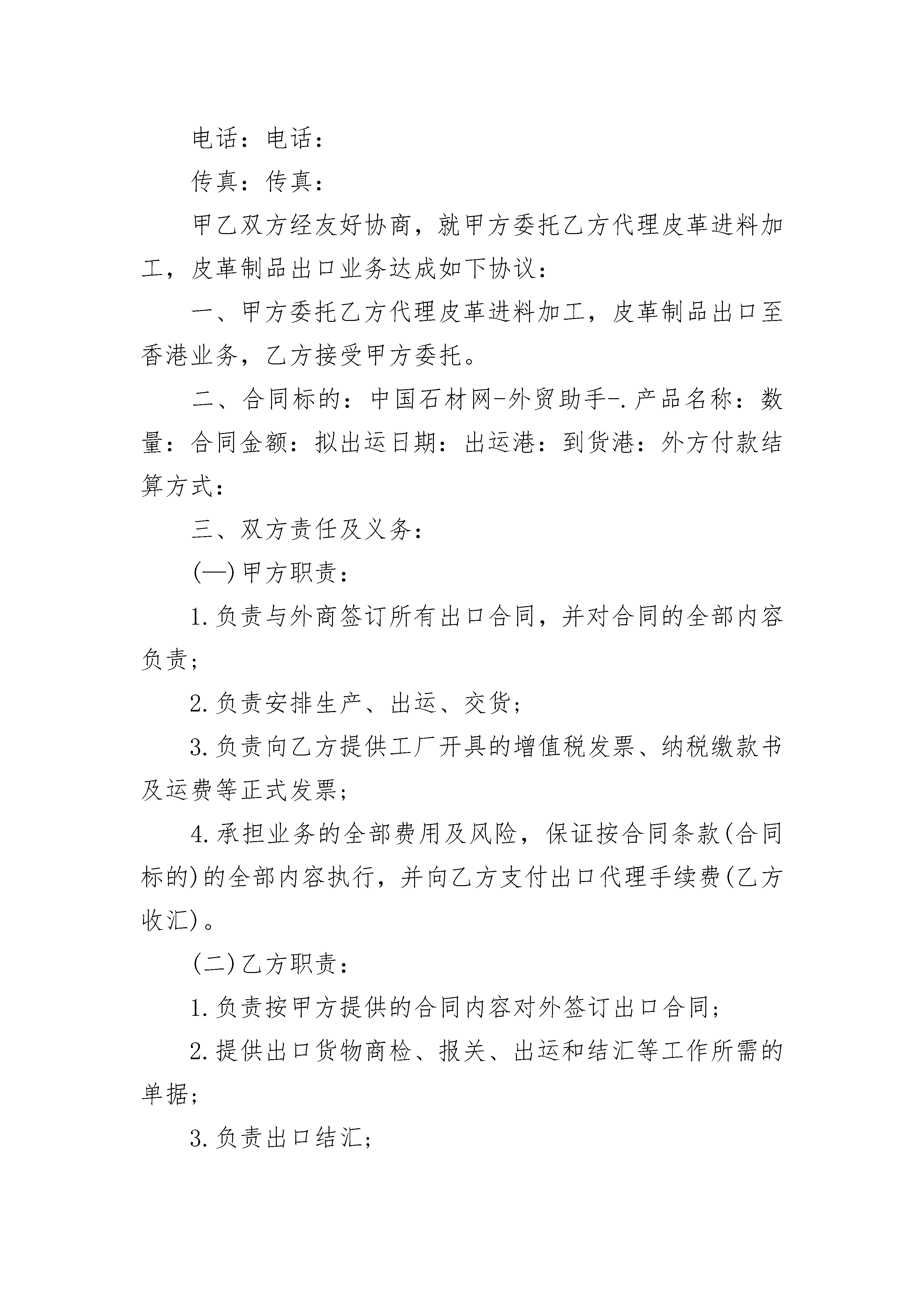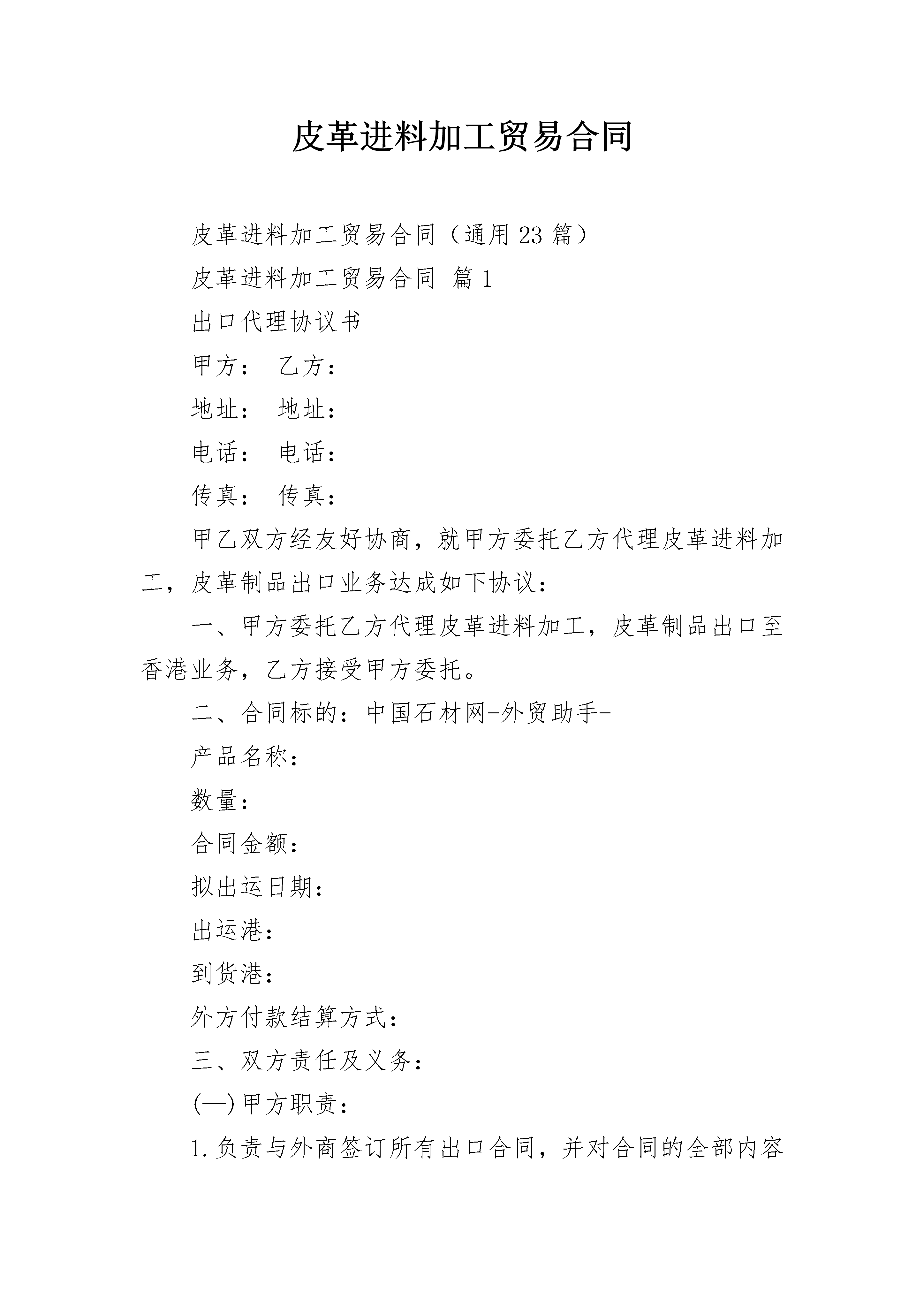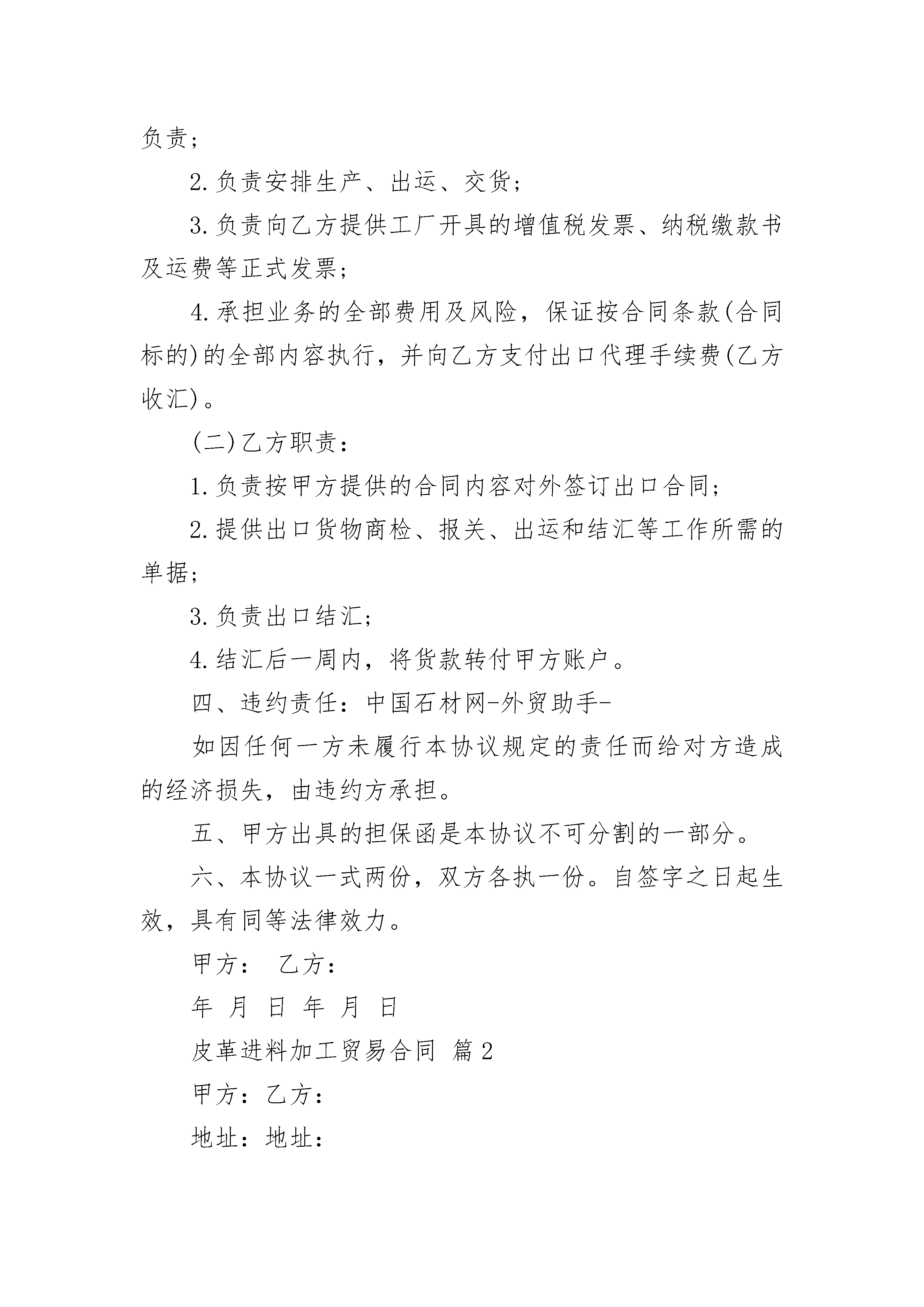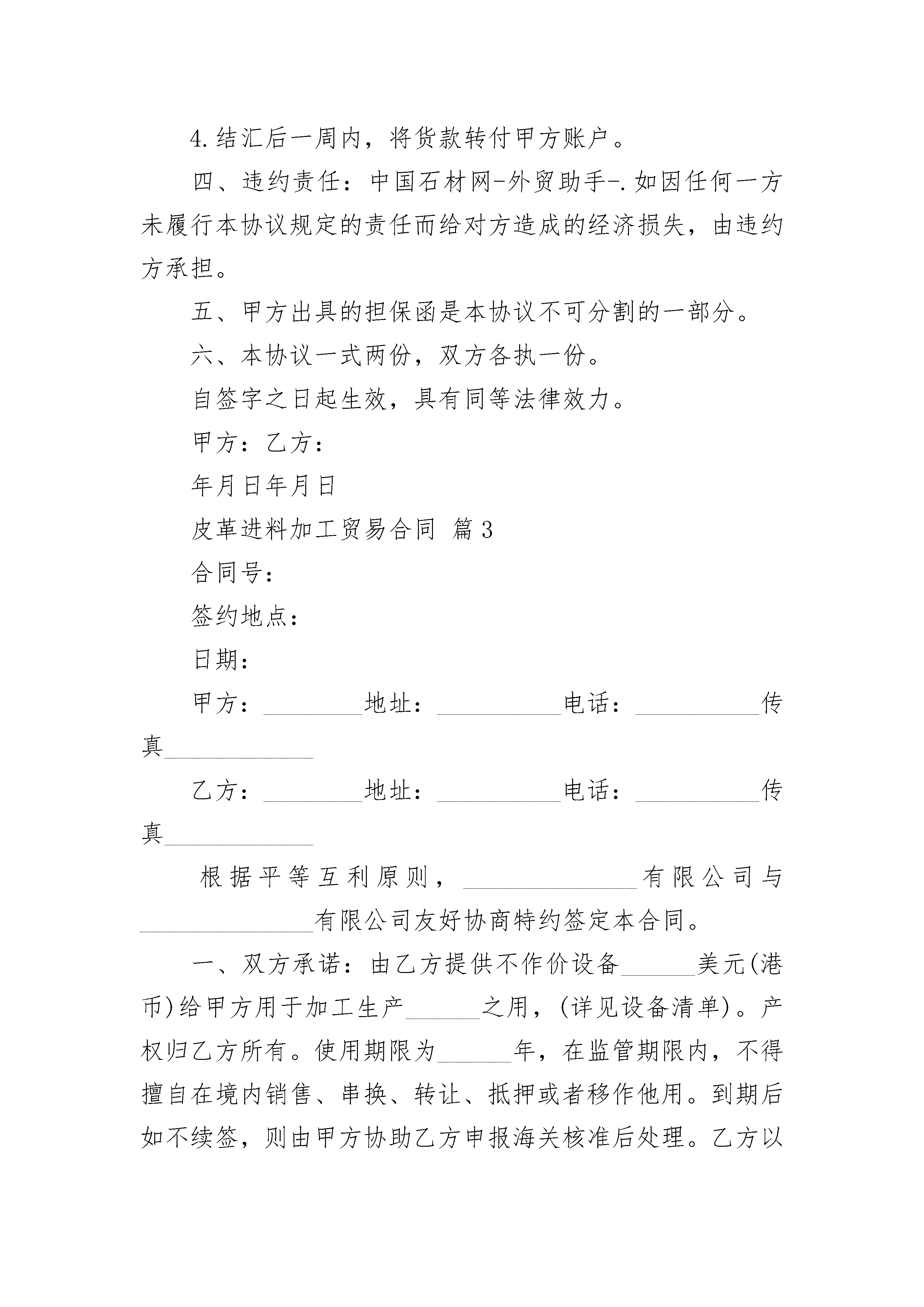 皮革进料加工贸易合同皮革进料加工贸易合同(通用23篇)皮革进料加工贸易合同篇1出口代理协议书甲方:乙方:地址:地址:电话:电话:传真:传真:甲乙双方经友好协商,就甲方委托乙方代理皮革进料加工,皮革制品出口业务达成如下协议:一、甲方委托乙方代理皮革进料加工,皮革制品出口至香港业务,乙方接受甲方委托。二、合同标的:中国石材网-外贸助手-产品名称:数量:合同金额:拟出运日期:出运港:到货港:外方付款结算方式:三、双方责任及义务:(—)甲方职责:1.负责与外商签订所有出口合同,并对合同的全部内容负责;2.负责安排生产、出运、交货;3.负责向乙方提供工厂开具的增值税发票、纳税缴款书及运费等正式发票;4.承担业务的全部费用及风险,保证按合同条款(合同标的)的全部内容执行,并向乙方支付出口代理手续费(乙方收汇)。(二)乙方职责:1.负责按甲方提供的合同内容对外签订出口合同;2.提供出口货物商检、报关、出运和结汇等工作所需的单据;3.负责出口结汇;4.结汇后一周内,将货款转付甲方账户。四、违约责任:中国石材网-外贸助手-如因任何一方未履行本协议规定的责任而给对方造成的经济损失,由违约方承担。五、甲方出具的担保函是本协议不可分割的一部分。六、本协议一式两份,双方各执一份。自签字之日起生效,具有同等法律效力。甲方:乙方:年月日年月日皮革进料加工贸易合同篇2甲方:乙方:地址:地址:电话:电话:传真:传真:甲乙双方经友好协商,就甲方委托乙方代理皮革进料加工,皮革制品出口业务达成如下协议:一、甲方委托乙方代理皮革进料加工,皮革制品出口至香港业务,乙方接受甲方委托。二、合同标的:中国石材网-外贸助手-.产品名称:数量:合同金额:拟出运日期:出运港:到货港:外方付款结算方式:三、双方责任及义务:(—)甲方职责:1.负责与外商签订所有出口合同,并对合同的全部内容负责;2.负责安排生产、出运、交货;3.负责向乙方提供工厂开具的增值税发票、纳税缴款书及运费等正式发票;4.承担业务的全部费用及风险,保证按合同条款(合同标的)的全部内容执行,并向乙方支付出口代理手续费(乙方收汇)。(二)乙方职责:1.负责按甲方提供的合同内容对外签订出口合同;2.提供出口货物商检、报关、出运和结汇等工作所需的单据;3.负责出口结汇;4.结汇后一周内,将货款转付甲方账户。四、违约责任:中国石材网-外贸助手-.如因任何一方未履行本协议规定的责任而给对方造成的经济损失,由违约方承担。五、甲方出具的担保函是本协议不可分割的一部分。六、本协议一式两份,双方各执一份。自签字之日起生效,具有同等法律效力。甲方:乙方:年月日年月日皮革进料加工贸易合同篇3合同号:签约地点:日期:甲方:________地址:__________电话:__________传真____________乙方:________地址:__________电话:__________传真____________根据平等互利原则,______________有限公司与______________有限公司友好协商特约签定本合同。一、双方承诺:由乙方提供不作价设备______美元(港币)给甲方用于加工生产______之用,(详见设备清单)。产权归乙方所有。使用期限为______年,在监管期限内,不得擅自在境内销售、串换、转让、抵押或者移作他用。到期后如不续签,则由甲方协助乙方申报海关核准后处理。乙方以免费方式提供设备,不需甲方办理付汇进口,也不需用加工费或差价偿还设备款。二、甲方向乙方购买原料、辅料┌────────────────────┬────────────────────────┐│原料│辅料│├───┬────┬───┬───┬───┼───┬───┬───┬──────┬─────┤│编码│单位│数量│单价│金额│品名│单位│数量│单价│金额│├───┼────┼───┼───┼───┼───┼───┼───┼──────┼─────┤│││││││││││├───┼────┼───┼───┼───┼───┼───┼───┼──────┼─────┤│││││││││││├───┼────┼───┼───┼───┼───┼───┼───┼──────┼─────┤│││││││││││├───┼────┼───┼───┼───┼───┼───┼───┼──────┼─────┤│││││││││││└───┴────┴───┴───┴───┴───┴───┴───┴──────┴─────┘三、甲方供乙方制成品的数量及金额┌────────────────────┬────────────────────────┐│原料│辅料│├───┬────┬───┬───┬───┼───┬───┬───┬──────┬─────┤