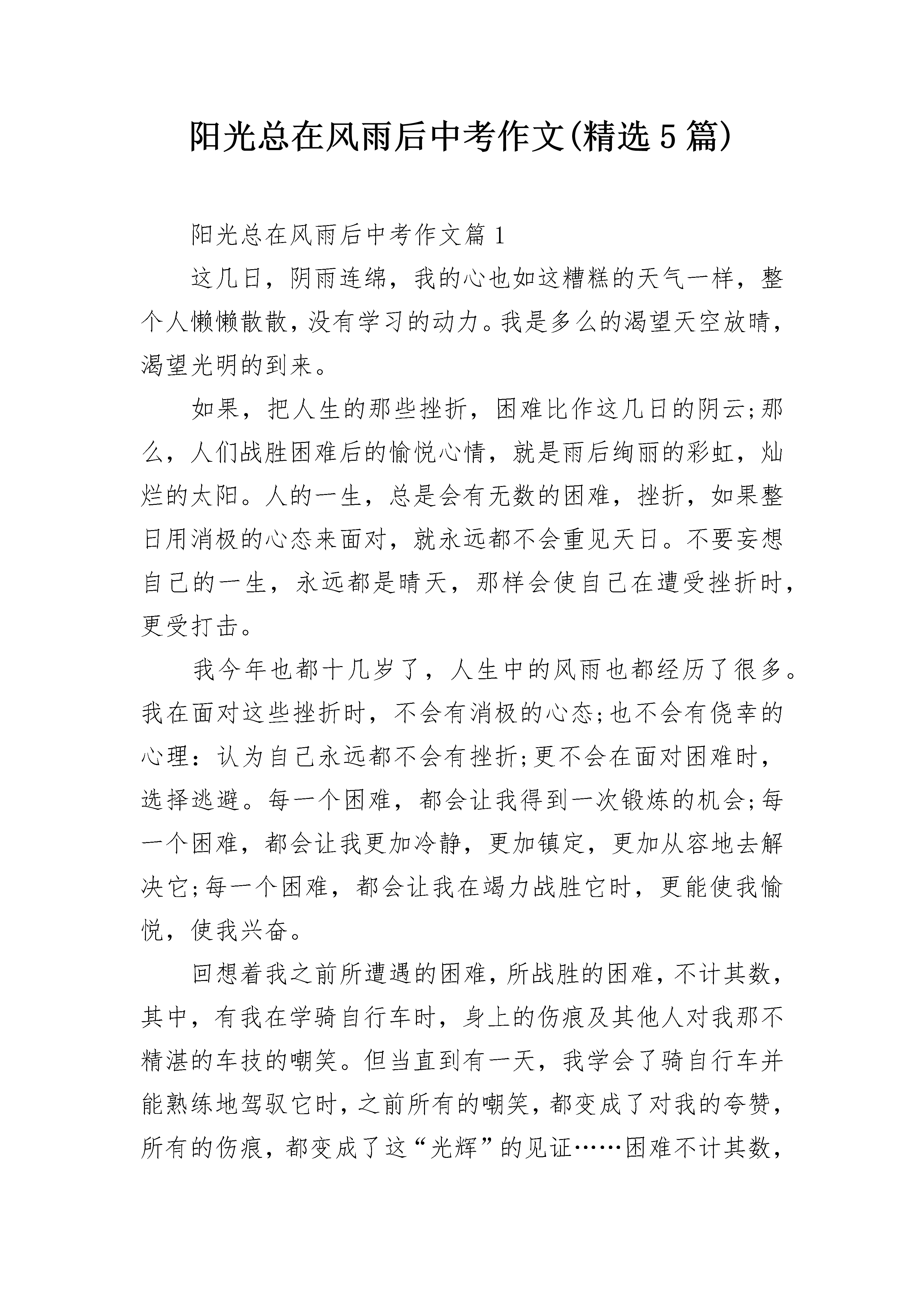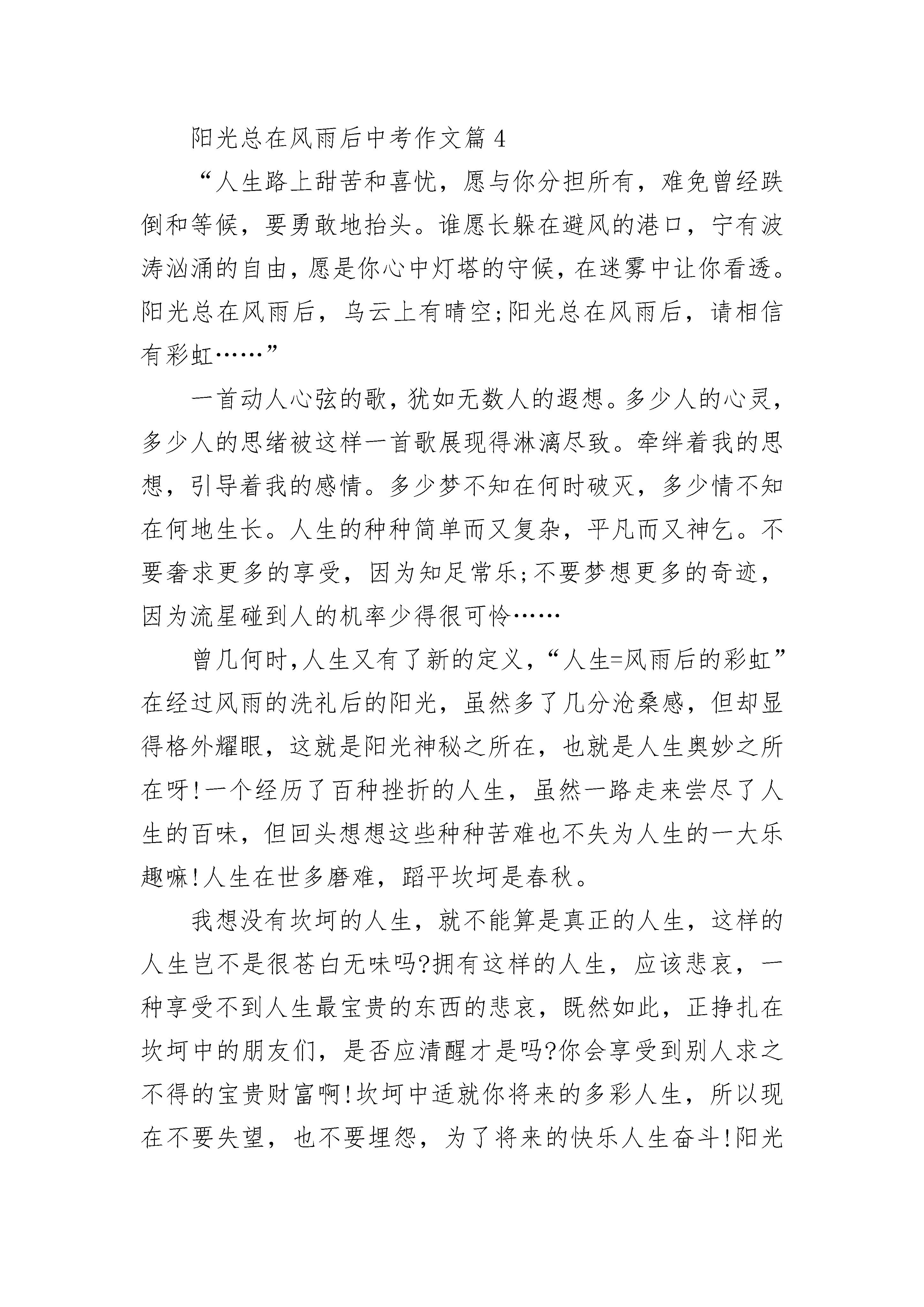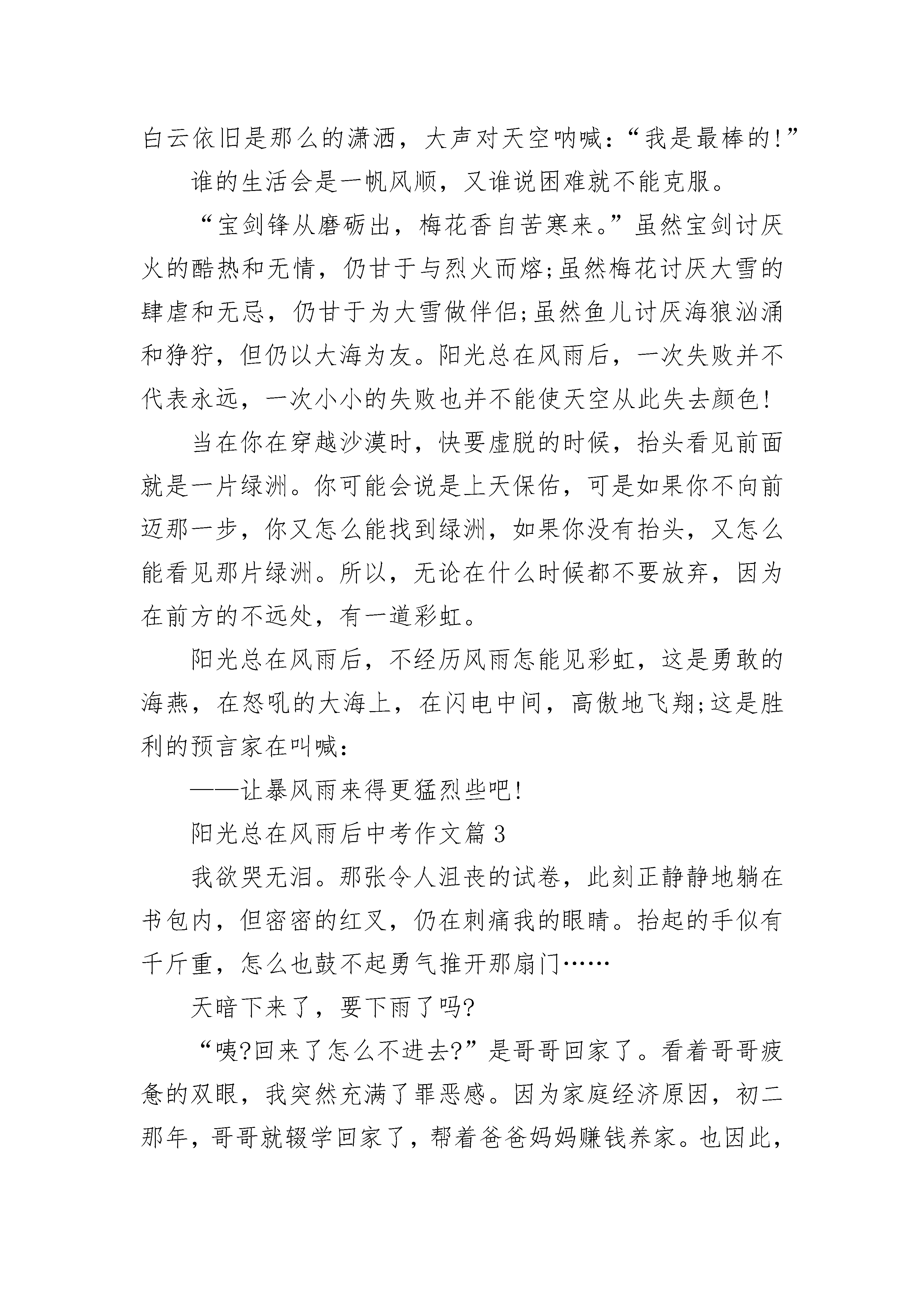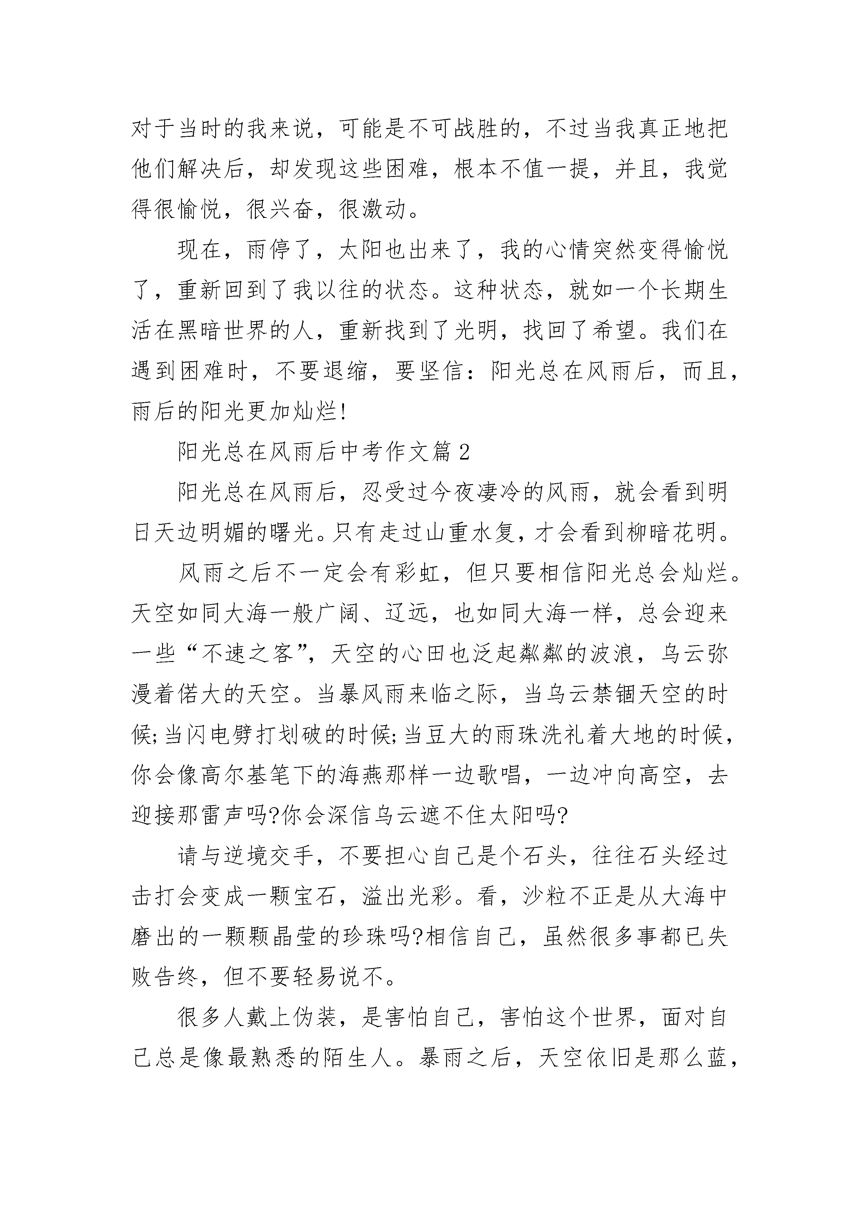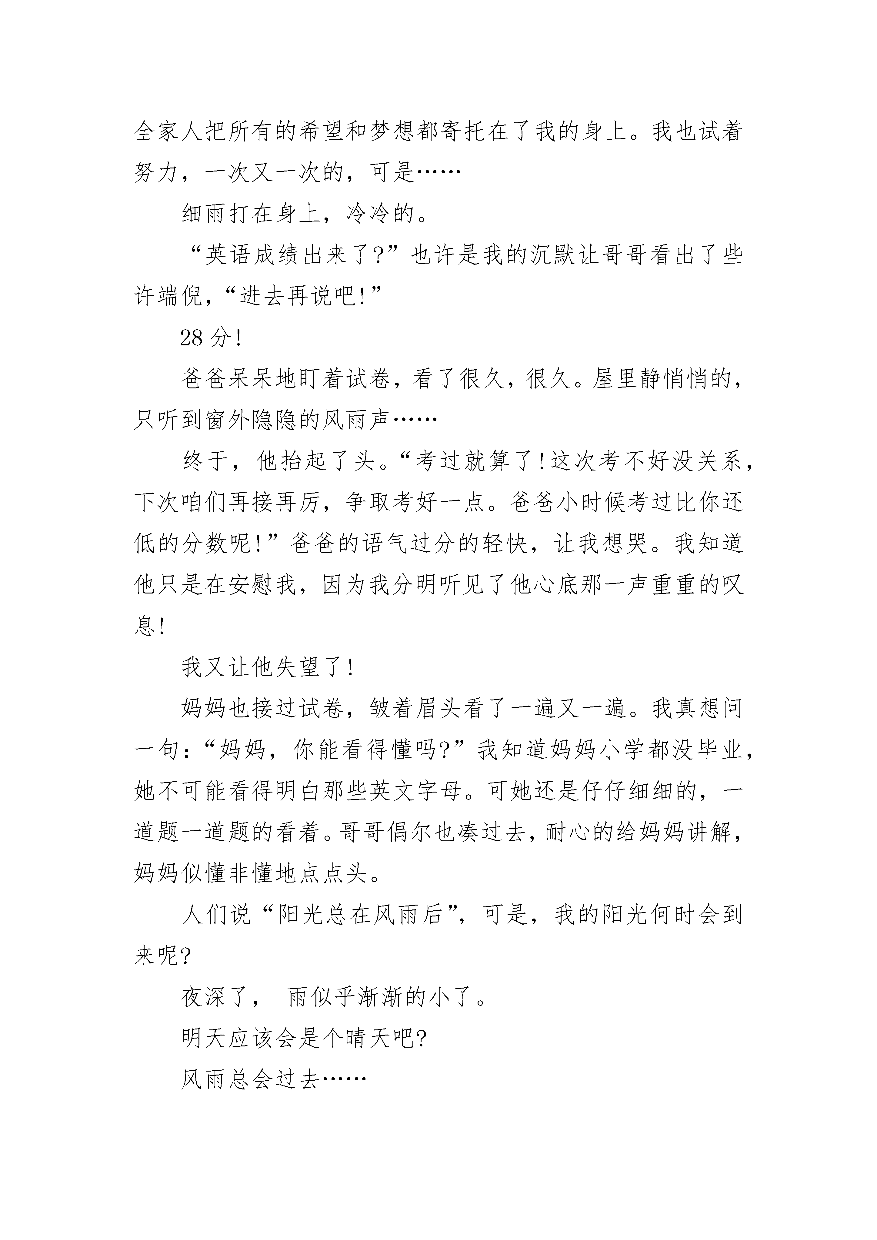 阳光总在风雨后中考作文(精选5篇)阳光总在风雨后中考作文篇1这几日,阴雨连绵,我的心也如这糟糕的天气一样,整个人懒懒散散,没有学习的动力。我是多么的渴望天空放晴,渴望光明的到来。如果,把人生的那些挫折,困难比作这几日的阴云;那么,人们战胜困难后的愉悦心情,就是雨后绚丽的彩虹,灿烂的太阳。人的一生,总是会有无数的困难,挫折,如果整日用消极的心态来面对,就永远都不会重见天日。不要妄想自己的一生,永远都是晴天,那样会使自己在遭受挫折时,更受打击。我今年也都十几岁了,人生中的风雨也都经历了很多。我在面对这些挫折时,不会有消极的心态;也不会有侥幸的心理:认为自己永远都不会有挫折;更不会在面对困难时,选择逃避。每一个困难,都会让我得到一次锻炼的机会;每一个困难,都会让我更加冷静,更加镇定,更加从容地去解决它;每一个困难,都会让我在竭力战胜它时,更能使我愉悦,使我兴奋。回想着我之前所遭遇的困难,所战胜的困难,不计其数,其中,有我在学骑自行车时,身上的伤痕及其他人对我那不精湛的车技的嘲笑。但当直到有一天,我学会了骑自行车并能熟练地驾驭它时,之前所有的嘲笑,都变成了对我的夸赞,所有的伤痕,都变成了这“光辉”的见证……困难不计其数,对于当时的我来说,可能是不可战胜的,不过当我真正地把他们解决后,却发现这些困难,根本不值一提,并且,我觉得很愉悦,很兴奋,很激动。现在,雨停了,太阳也出来了,我的心情突然变得愉悦了,重新回到了我以往的状态。这种状态,就如一个长期生活在黑暗世界的人,重新找到了光明,找回了希望。我们在遇到困难时,不要退缩,要坚信:阳光总在风雨后,而且,雨后的阳光更加灿烂!阳光总在风雨后中考作文篇2阳光总在风雨后,忍受过今夜凄冷的风雨,就会看到明日天边明媚的曙光。只有走过山重水复,才会看到柳暗花明。风雨之后不一定会有彩虹,但只要相信阳光总会灿烂。天空如同大海一般广阔、辽远,也如同大海一样,总会迎来一些“不速之客”,天空的心田也泛起粼粼的波浪,乌云弥漫着偌大的天空。当暴风雨来临之际,当乌云禁锢天空的时候;当闪电劈打划破的时候;当豆大的雨珠洗礼着大地的时候,你会像高尔基笔下的海燕那样一边歌唱,一边冲向高空,去迎接那雷声吗?你会深信乌云遮不住太阳吗?请与逆境交手,不要担心自己是个石头,往往石头经过击打会变成一颗宝石,溢出光彩。看,沙粒不正是从大海中磨出的一颗颗晶莹的珍珠吗?相信自己,虽然很多事都已失败告终,但不要轻易说不。很多人戴上伪装,是害怕自己,害怕这个世界,面对自己总是像最熟悉的陌生人。暴雨之后,天空依旧是那么蓝,白云依旧是那么的潇洒,大声对天空呐喊:“我是最棒的!”谁的生活会是一帆风顺,又谁说困难就不能克服。“宝剑锋从磨砺出,梅花香自苦寒来。”虽然宝剑讨厌火的酷热和无情,仍甘于与烈火而熔;虽然梅花讨厌大雪的肆虐和无忌,仍甘于为大雪做伴侣;虽然鱼儿讨厌海狼汹涌和狰狞,但仍以大海为友。阳光总在风雨后,一次失败并不代表永远,一次小小的失败也并不能使天空从此失去颜色!当在你在穿越沙漠时,快要虚脱的时候,抬头看见前面就是一片绿洲。你可能会说是上天保佑,可是如果你不向前迈那一步,你又怎么能找到绿洲,如果你没有抬头,又怎么能看见那片绿洲。所以,无论在什么时候都不要放弃,因为在前方的不远处,有一道彩虹。阳光总在风雨后,不经历风雨怎能见彩虹,这是勇敢的海燕,在怒吼的大海上,在闪电中间,高傲地飞翔;这是胜利的预言家在叫喊:——让暴风雨来得更猛烈些吧!阳光总在风雨后中考作文篇3我欲哭无泪。那张令人沮丧的试卷,此刻正静静地躺在书包内,但密密的红叉,仍在刺痛我的眼睛。抬起的手似有千斤重,怎么也鼓不起勇气推开那扇门……天暗下来了,要下雨了吗?“咦?回来了怎么不进去?”是哥哥回家了。看着哥哥疲惫的双眼,我突然充满了罪恶感。因为家庭经济原因,初二那年,哥哥就辍学回家了,帮着爸爸妈妈赚钱养家。也因此,全家人把所有的希望和梦想都寄托在了我的身上。我也试着努力,一次又一次的,可是……细雨打在身上,冷冷的。“英语成绩出来了?”也许是我的沉默让哥哥看出了些许端倪,“进去再说吧!”28分!爸爸呆呆地盯着试卷,看了很久,很久。屋里静悄悄的,只听到窗外隐隐的风雨声……终于,他抬起了头。“考过就算了!这次考不好没关系,下次咱们再接再厉,争取考好一点。爸爸小时候考过比你还低的分数呢!”爸爸的语气过分的轻快,让我想哭。我知道他只是在安慰我,因为我分明听见了他心底那一声重重的叹息!我又让他失望了!妈妈也接过试卷,皱着眉头看了一遍又一遍。我真想问一句:“妈妈,你能看得懂吗?”我知道妈妈小学都没毕业,她不可能看得明白那些英文字母。可她还是仔仔细细的,一道题一道题的看着。哥哥偶尔也凑过去,耐心的给妈妈讲解,妈妈似懂非懂地点点头。人们说“阳光总在风雨后”,可是,我的阳光何时会到来呢?夜深了,雨似乎