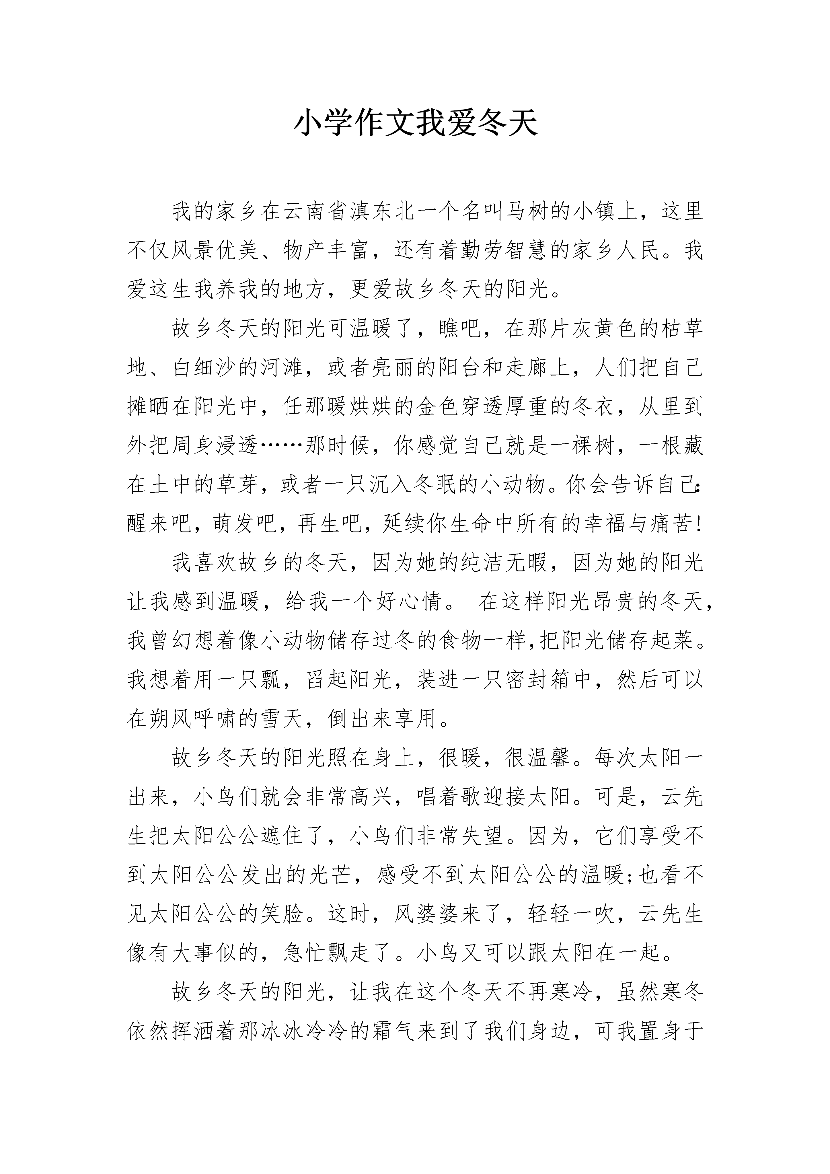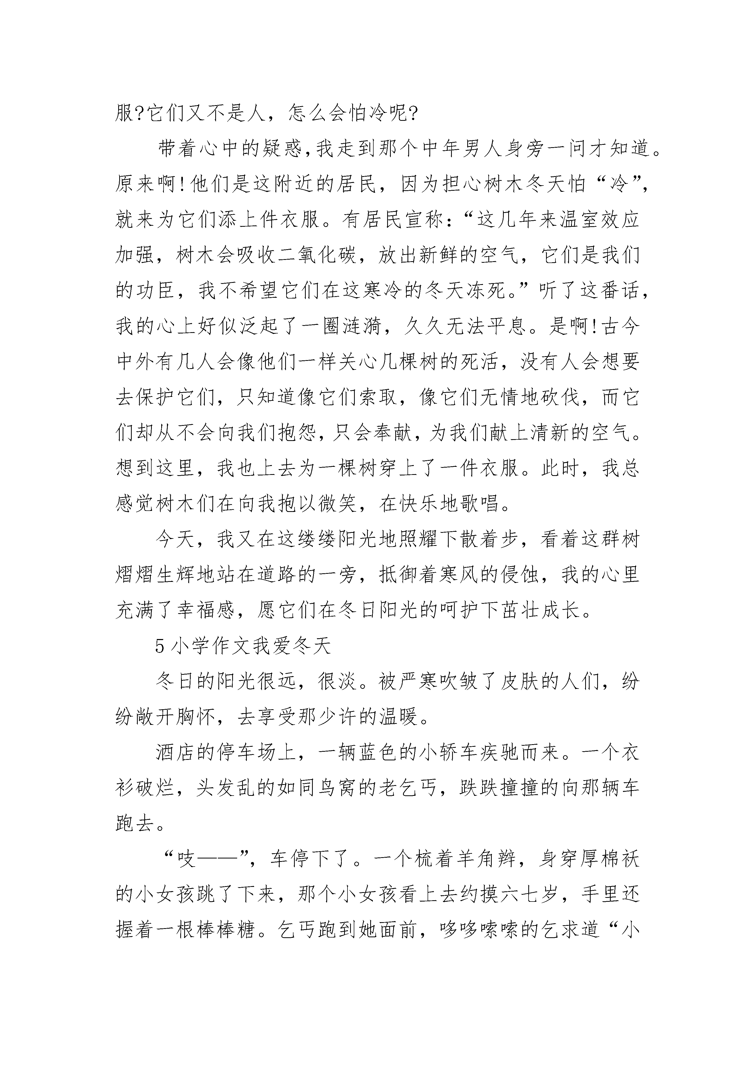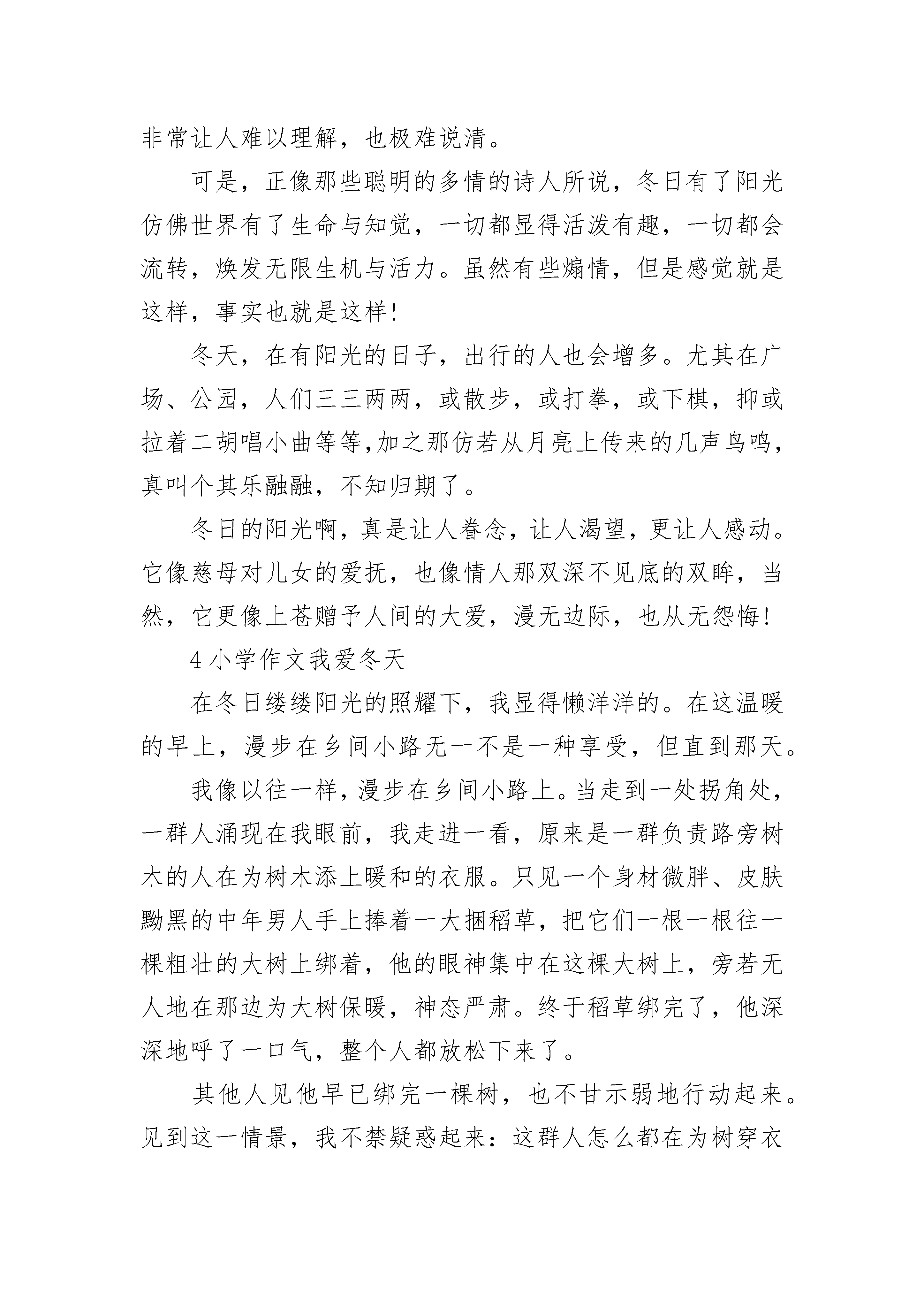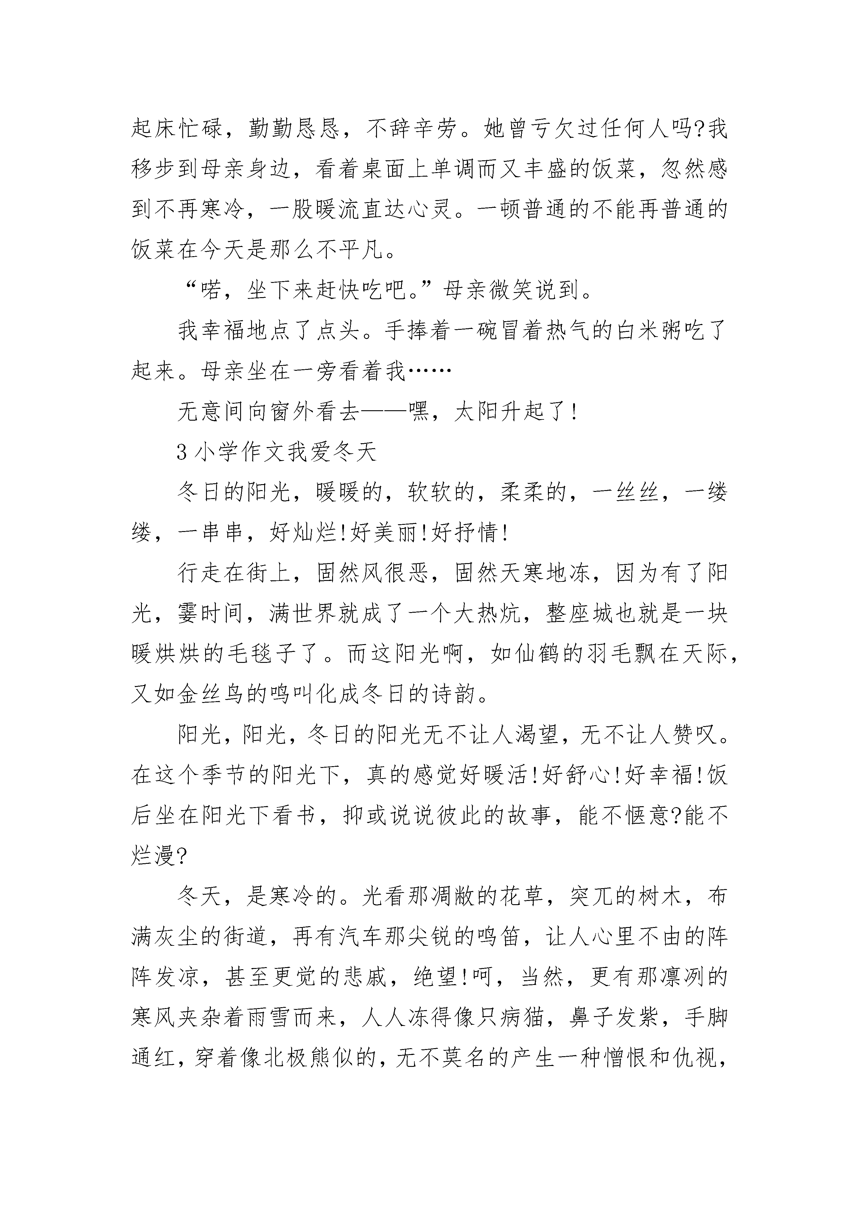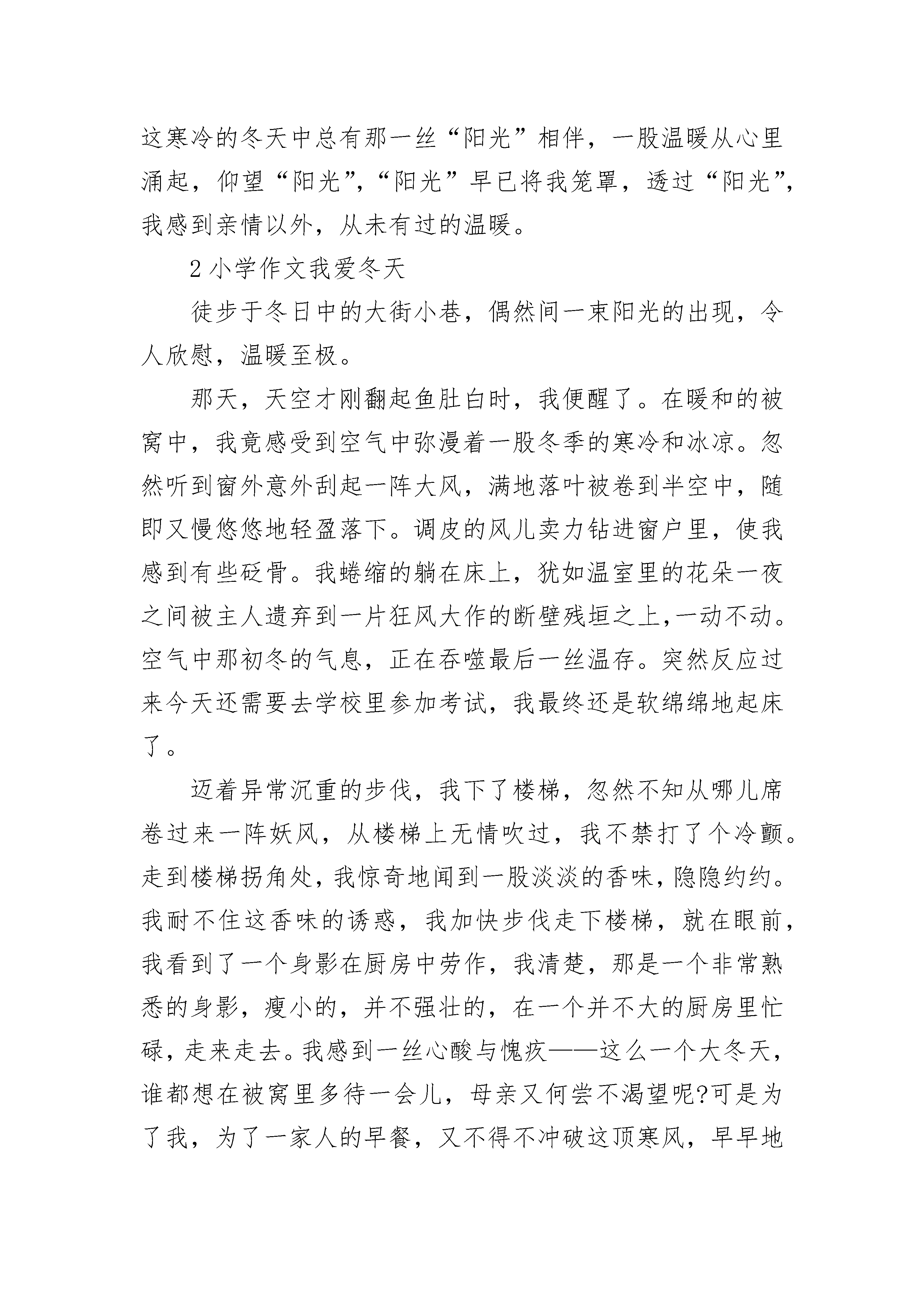 小学作文我爱冬天我的家乡在云南省滇东北一个名叫马树的小镇上,这里不仅风景优美、物产丰富,还有着勤劳智慧的家乡人民。我爱这生我养我的地方,更爱故乡冬天的阳光。故乡冬天的阳光可温暖了,瞧吧,在那片灰黄色的枯草地、白细沙的河滩,或者亮丽的阳台和走廊上,人们把自己摊晒在阳光中,任那暖烘烘的金色穿透厚重的冬衣,从里到外把周身浸透……那时候,你感觉自己就是一棵树,一根藏在土中的草芽,或者一只沉入冬眠的小动物。你会告诉自己:醒来吧,萌发吧,再生吧,延续你生命中所有的幸福与痛苦!我喜欢故乡的冬天,因为她的纯洁无暇,因为她的阳光让我感到温暖,给我一个好心情。在这样阳光昂贵的冬天,我曾幻想着像小动物储存过冬的食物一样,把阳光储存起莱。我想着用一只瓢,舀起阳光,装进一只密封箱中,然后可以在朔风呼啸的雪天,倒出来享用。故乡冬天的阳光照在身上,很暖,很温馨。每次太阳一出来,小鸟们就会非常高兴,唱着歌迎接太阳。可是,云先生把太阳公公遮住了,小鸟们非常失望。因为,它们享受不到太阳公公发出的光芒,感受不到太阳公公的温暖;也看不见太阳公公的笑脸。这时,风婆婆来了,轻轻一吹,云先生像有大事似的,急忙飘走了。小鸟又可以跟太阳在一起。故乡冬天的阳光,让我在这个冬天不再寒冷,虽然寒冬依然挥洒着那冰冰冷冷的霜气来到了我们身边,可我置身于这寒冷的冬天中总有那一丝“阳光”相伴,一股温暖从心里涌起,仰望“阳光”,“阳光”早已将我笼罩,透过“阳光”,我感到亲情以外,从未有过的温暖。2小学作文我爱冬天徒步于冬日中的大街小巷,偶然间一束阳光的出现,令人欣慰,温暖至极。那天,天空才刚翻起鱼肚白时,我便醒了。在暖和的被窝中,我竟感受到空气中弥漫着一股冬季的寒冷和冰凉。忽然听到窗外意外刮起一阵大风,满地落叶被卷到半空中,随即又慢悠悠地轻盈落下。调皮的风儿卖力钻进窗户里,使我感到有些砭骨。我蜷缩的躺在床上,犹如温室里的花朵一夜之间被主人遗弃到一片狂风大作的断壁残垣之上,一动不动。空气中那初冬的气息,正在吞噬最后一丝温存。突然反应过来今天还需要去学校里参加考试,我最终还是软绵绵地起床了。迈着异常沉重的步伐,我下了楼梯,忽然不知从哪儿席卷过来一阵妖风,从楼梯上无情吹过,我不禁打了个冷颤。走到楼梯拐角处,我惊奇地闻到一股淡淡的香味,隐隐约约。我耐不住这香味的诱惑,我加快步伐走下楼梯,就在眼前,我看到了一个身影在厨房中劳作,我清楚,那是一个非常熟悉的身影,瘦小的,并不强壮的,在一个并不大的厨房里忙碌,走来走去。我感到一丝心酸与愧疚——这么一个大冬天,谁都想在被窝里多待一会儿,母亲又何尝不渴望呢?可是为了我,为了一家人的早餐,又不得不冲破这顶寒风,早早地起床忙碌,勤勤恳恳,不辞辛劳。她曾亏欠过任何人吗?我移步到母亲身边,看着桌面上单调而又丰盛的饭菜,忽然感到不再寒冷,一股暖流直达心灵。一顿普通的不能再普通的饭菜在今天是那么不平凡。“喏,坐下来赶快吃吧。”母亲微笑说到。我幸福地点了点头。手捧着一碗冒着热气的白米粥吃了起来。母亲坐在一旁看着我……无意间向窗外看去——嘿,太阳升起了!3小学作文我爱冬天冬日的阳光,暖暖的,软软的,柔柔的,一丝丝,一缕缕,一串串,好灿烂!好美丽!好抒情!行走在街上,固然风很恶,固然天寒地冻,因为有了阳光,霎时间,满世界就成了一个大热炕,整座城也就是一块暖烘烘的毛毯子了。而这阳光啊,如仙鹤的羽毛飘在天际,又如金丝鸟的鸣叫化成冬日的诗韵。阳光,阳光,冬日的阳光无不让人渴望,无不让人赞叹。在这个季节的阳光下,真的感觉好暖活!好舒心!好幸福!饭后坐在阳光下看书,抑或说说彼此的故事,能不惬意?能不烂漫?冬天,是寒冷的。光看那凋敝的花草,突兀的树木,布满灰尘的街道,再有汽车那尖锐的鸣笛,让人心里不由的阵阵发凉,甚至更觉的悲戚,绝望!呵,当然,更有那凛冽的寒风夹杂着雨雪而来,人人冻得像只病猫,鼻子发紫,手脚通红,穿着像北极熊似的,无不莫名的产生一种憎恨和仇视,非常让人难以理解,也极难说清。可是,正像那些聪明的多情的诗人所说,冬日有了阳光仿佛世界有了生命与知觉,一切都显得活泼有趣,一切都会流转,焕发无限生机与活力。虽然有些煽情,但是感觉就是这样,事实也就是这样!冬天,在有阳光的日子,出行的人也会增多。尤其在广场、公园,人们三三两两,或散步,或打拳,或下棋,抑或拉着二胡唱小曲等等,加之那仿若从月亮上传来的几声鸟鸣,真叫个其乐融融,不知归期了。冬日的阳光啊,真是让人眷念,让人渴望,更让人感动。它像慈母对儿女的爱抚,也像情人那双深不见底的双眸,当然,它更像上苍赠予人间的大爱,漫无边际,也从无怨悔!4小学作文我爱冬天在冬日缕缕阳光的照耀下,我显得懒洋洋的。在这温暖的早上,漫步在乡间小路无一不是一种享受,但直到那天。我像以往一样,漫步在乡间小路上。当走到一处拐角处,一群人涌现在我眼前,我走进一看,
