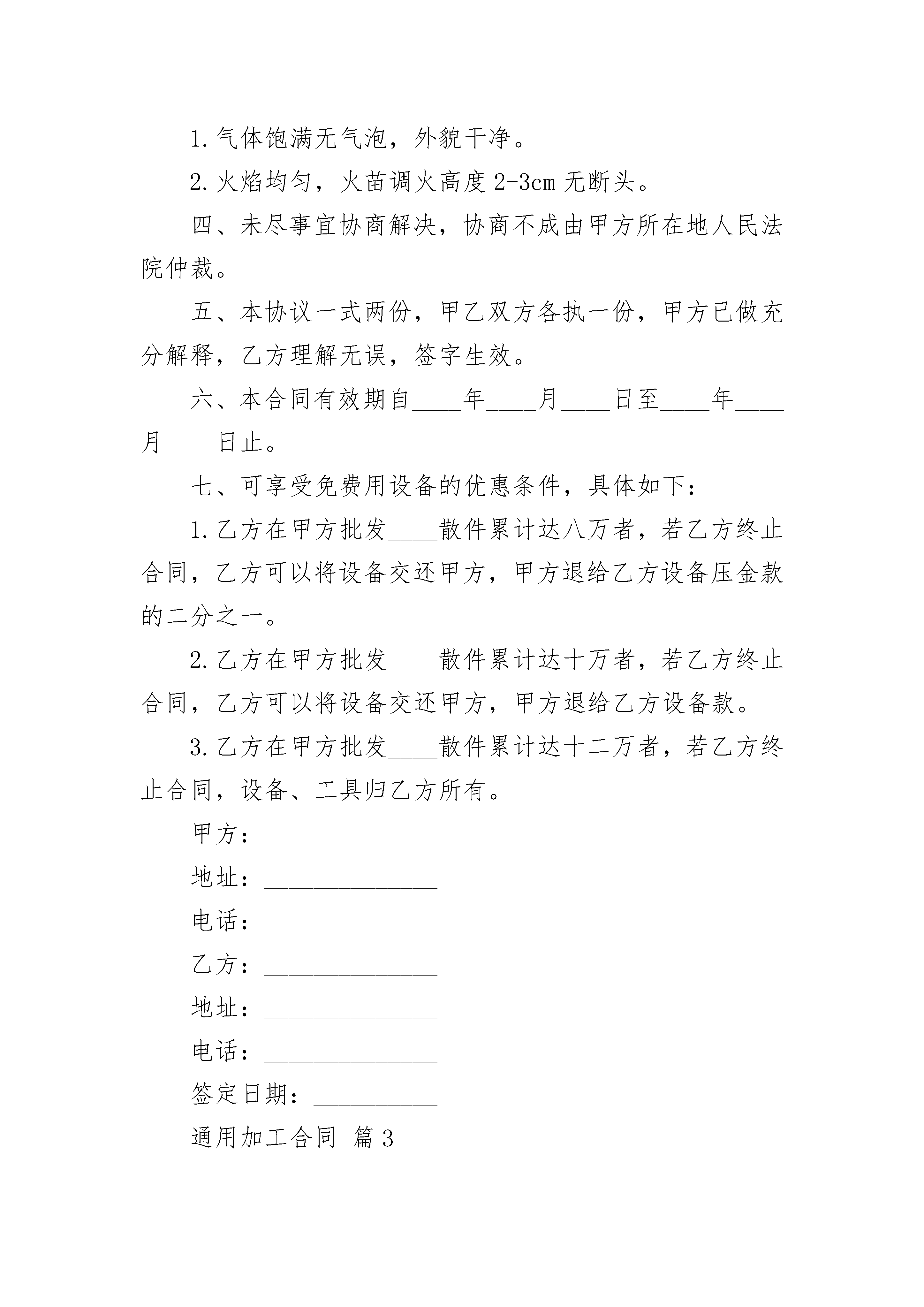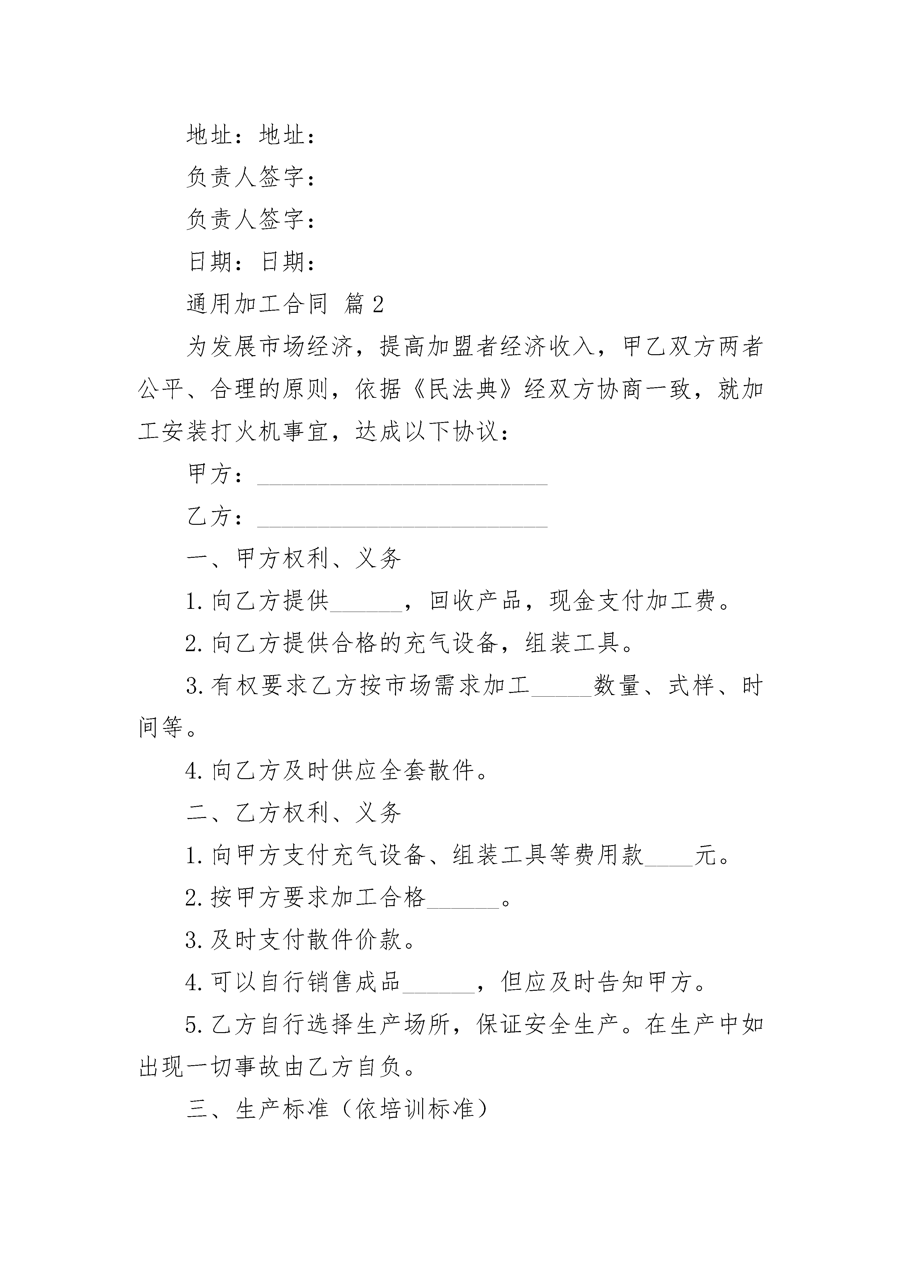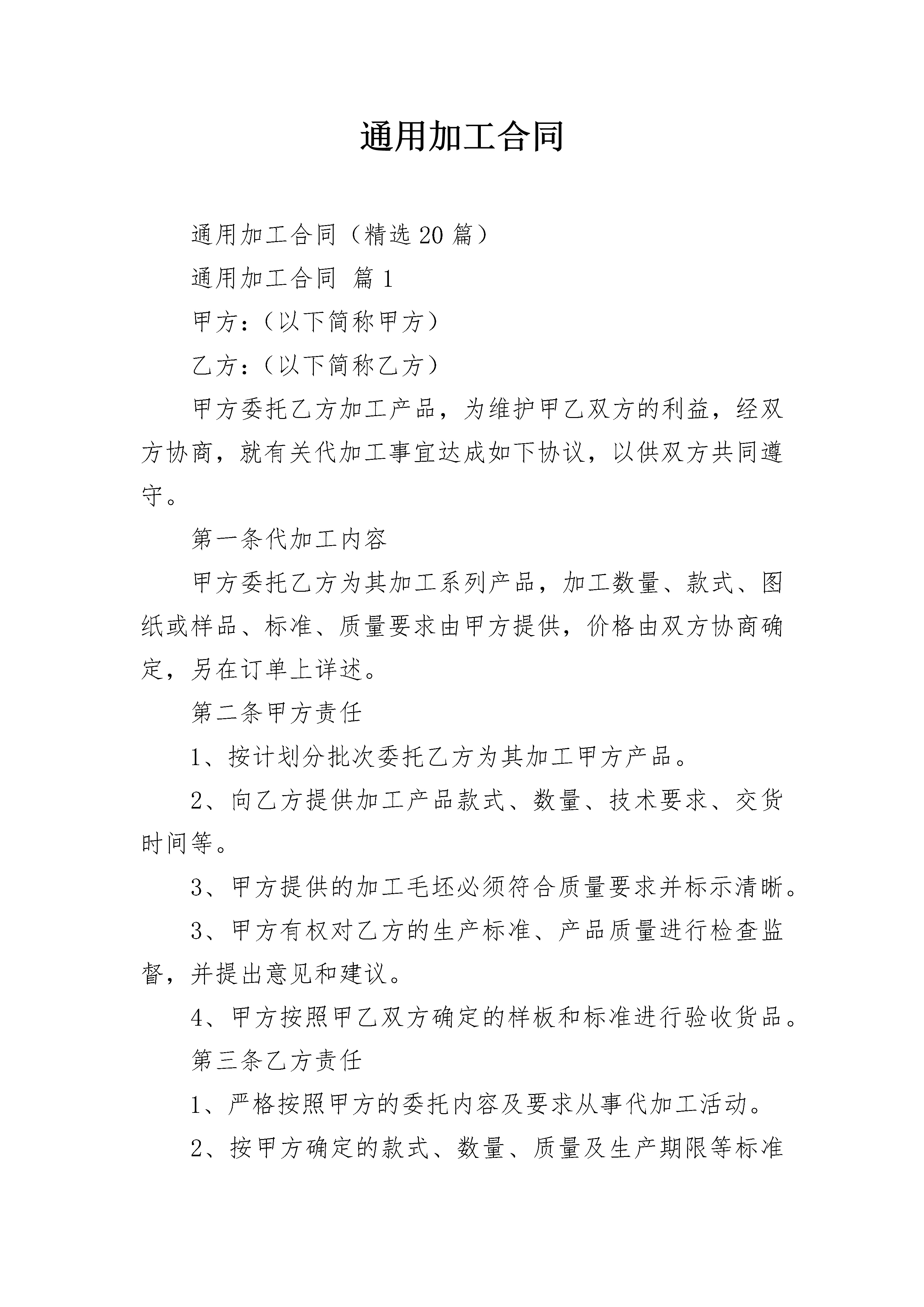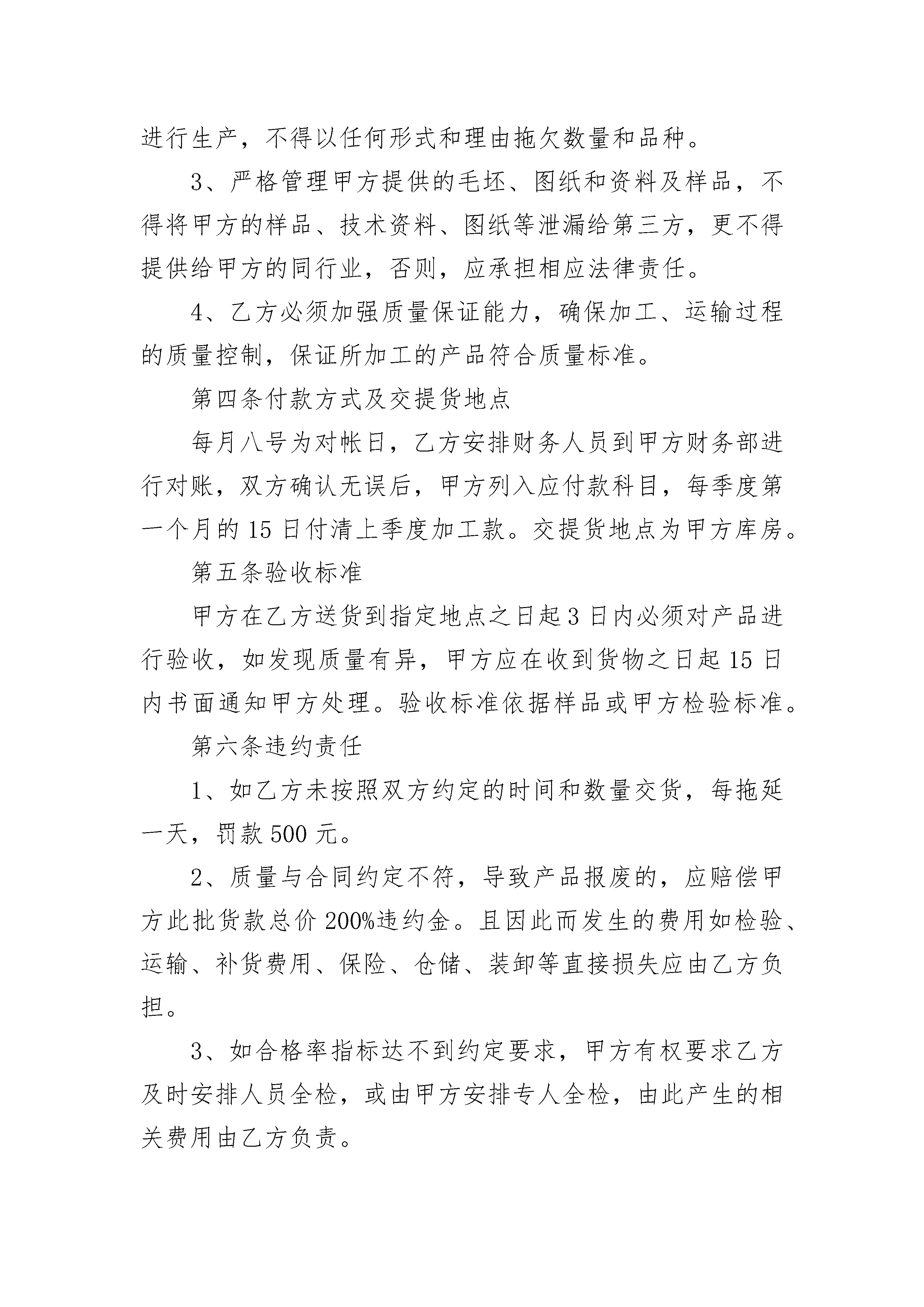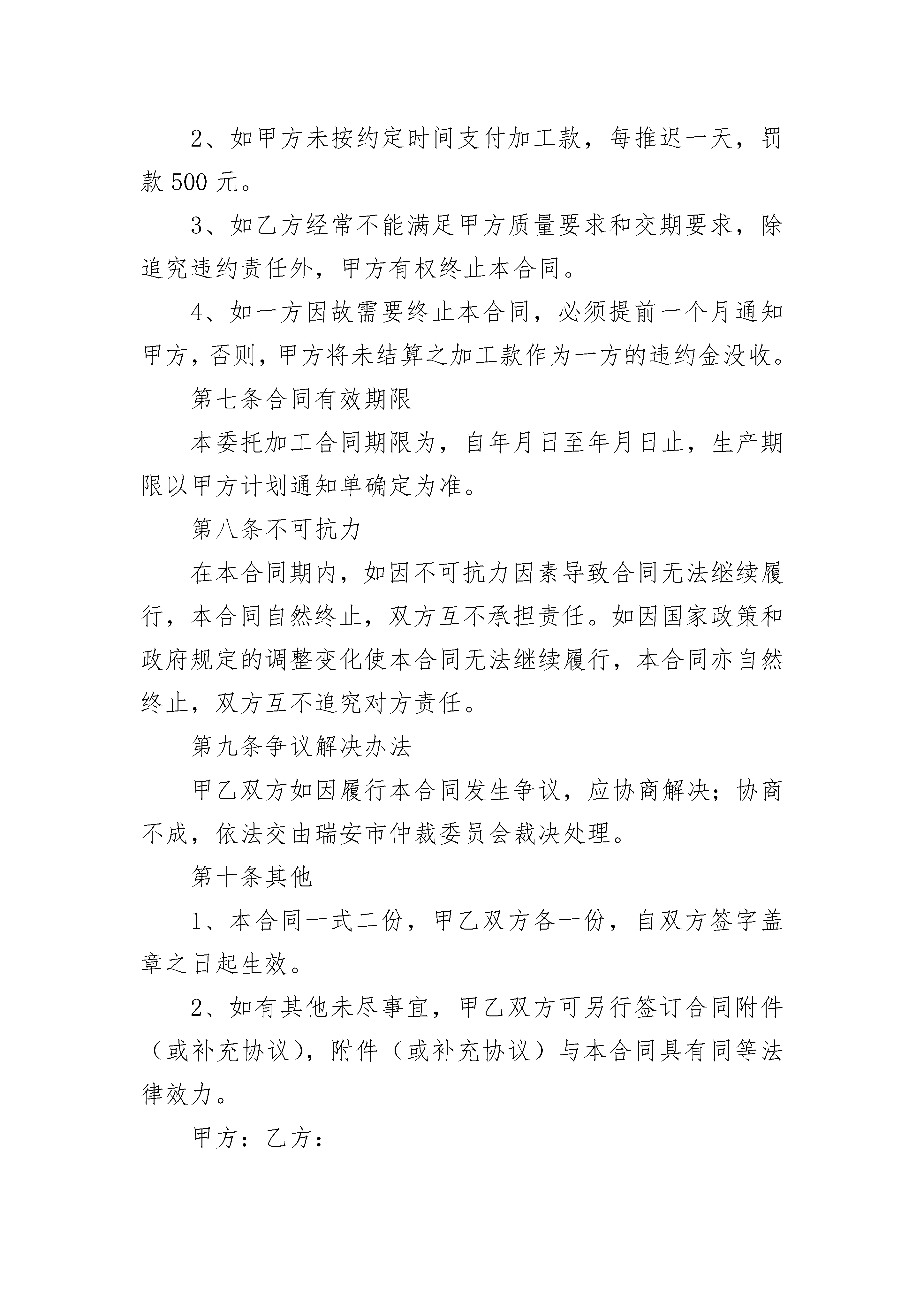 通用加工合同通用加工合同(精选20篇)通用加工合同篇1甲方:(以下简称甲方)乙方:(以下简称乙方)甲方委托乙方加工产品,为维护甲乙双方的利益,经双方协商,就有关代加工事宜达成如下协议,以供双方共同遵守。第一条代加工内容甲方委托乙方为其加工系列产品,加工数量、款式、图纸或样品、标准、质量要求由甲方提供,价格由双方协商确定,另在订单上详述。第二条甲方责任1、按计划分批次委托乙方为其加工甲方产品。2、向乙方提供加工产品款式、数量、技术要求、交货时间等。3、甲方提供的加工毛坯必须符合质量要求并标示清晰。3、甲方有权对乙方的生产标准、产品质量进行检查监督,并提出意见和建议。4、甲方按照甲乙双方确定的样板和标准进行验收货品。第三条乙方责任1、严格按照甲方的委托内容及要求从事代加工活动。2、按甲方确定的款式、数量、质量及生产期限等标准进行生产,不得以任何形式和理由拖欠数量和品种。3、严格管理甲方提供的毛坯、图纸和资料及样品,不得将甲方的样品、技术资料、图纸等泄漏给第三方,更不得提供给甲方的同行业,否则,应承担相应法律责任。4、乙方必须加强质量保证能力,确保加工、运输过程的质量控制,保证所加工的产品符合质量标准。第四条付款方式及交提货地点每月八号为对帐日,乙方安排财务人员到甲方财务部进行对账,双方确认无误后,甲方列入应付款科目,每季度第一个月的15日付清上季度加工款。交提货地点为甲方库房。第五条验收标准甲方在乙方送货到指定地点之日起3日内必须对产品进行验收,如发现质量有异,甲方应在收到货物之日起15日内书面通知甲方处理。验收标准依据样品或甲方检验标准。第六条违约责任1、如乙方未按照双方约定的时间和数量交货,每拖延一天,罚款500元。2、质量与合同约定不符,导致产品报废的,应赔偿甲方此批货款总价200%违约金。且因此而发生的费用如检验、运输、补货费用、保险、仓储、装卸等直接损失应由乙方负担。3、如合格率指标达不到约定要求,甲方有权要求乙方及时安排人员全检,或由甲方安排专人全检,由此产生的相关费用由乙方负责。2、如甲方未按约定时间支付加工款,每推迟一天,罚款500元。3、如乙方经常不能满足甲方质量要求和交期要求,除追究违约责任外,甲方有权终止本合同。4、如一方因故需要终止本合同,必须提前一个月通知甲方,否则,甲方将未结算之加工款作为一方的违约金没收。第七条合同有效期限本委托加工合同期限为,自年月日至年月日止,生产期限以甲方计划通知单确定为准。第八条不可抗力在本合同期内,如因不可抗力因素导致合同无法继续履行,本合同自然终止,双方互不承担责任。如因国家政策和政府规定的调整变化使本合同无法继续履行,本合同亦自然终止,双方互不追究对方责任。第九条争议解决办法甲乙双方如因履行本合同发生争议,应协商解决;协商不成,依法交由瑞安市仲裁委员会裁决处理。第十条其他1、本合同一式二份,甲乙双方各一份,自双方签字盖章之日起生效。2、如有其他未尽事宜,甲乙双方可另行签订合同附件(或补充协议),附件(或补充协议)与本合同具有同等法律效力。甲方:乙方:地址:地址:负责人签字:负责人签字:日期:日期:通用加工合同篇2为发展市场经济,提高加盟者经济收入,甲乙双方两者公平、合理的原则,依据《民法典》经双方协商一致,就加工安装打火机事宜,达成以下协议:甲方:________________________乙方:________________________一、甲方权利、义务1.向乙方提供______,回收产品,现金支付加工费。2.向乙方提供合格的充气设备,组装工具。3.有权要求乙方按市场需求加工_____数量、式样、时间等。4.向乙方及时供应全套散件。二、乙方权利、义务1.向甲方支付充气设备、组装工具等费用款____元。2.按甲方要求加工合格______。3.及时支付散件价款。4.可以自行销售成品______,但应及时告知甲方。5.乙方自行选择生产场所,保证安全生产。在生产中如出现一切事故由乙方自负。三、生产标准(依培训标准)1.气体饱满无气泡,外貌干净。2.火焰均匀,火苗调火高度2-3cm无断头。四、未尽事宜协商解决,协商不成由甲方所在地人民法院仲裁。五、本协议一式两份,甲乙双方各执一份,甲方已做充分解释,乙方理解无误,签字生效。六、本合同有效期自____年____月____日至____年____月____日止。七、可享受免费用设备的优惠条件,具体如下:1.乙方在甲方批发____散件累计达八万者,若乙方终止合同,乙方可以将设备交还甲方,甲方退给乙方设备压金款的二分之一。2.乙方在甲方批发____散件累计达十万者,若乙方终止合同,乙方可以将设备交还甲方,甲方退给乙方设备款。3.乙方在甲方批发____散件累计达十二万者,若乙方终止合同,设备、工具归乙方所有。甲方:_______