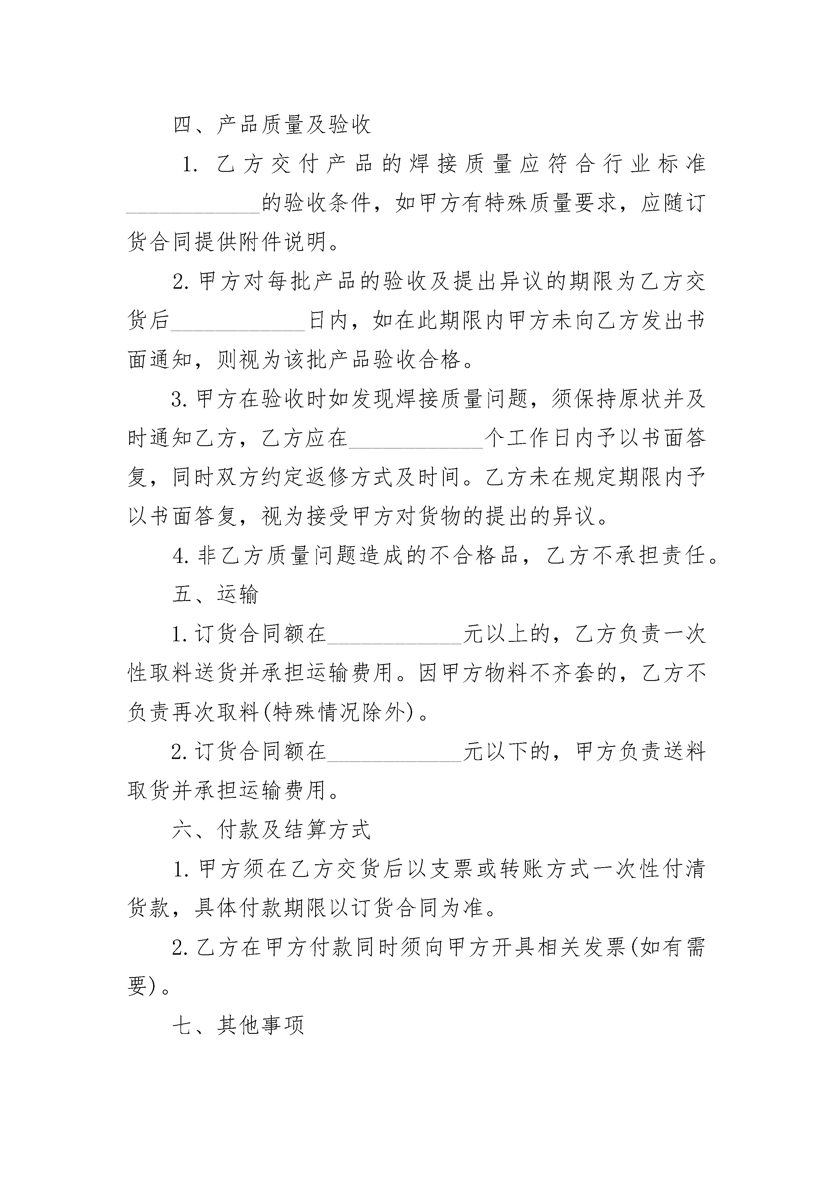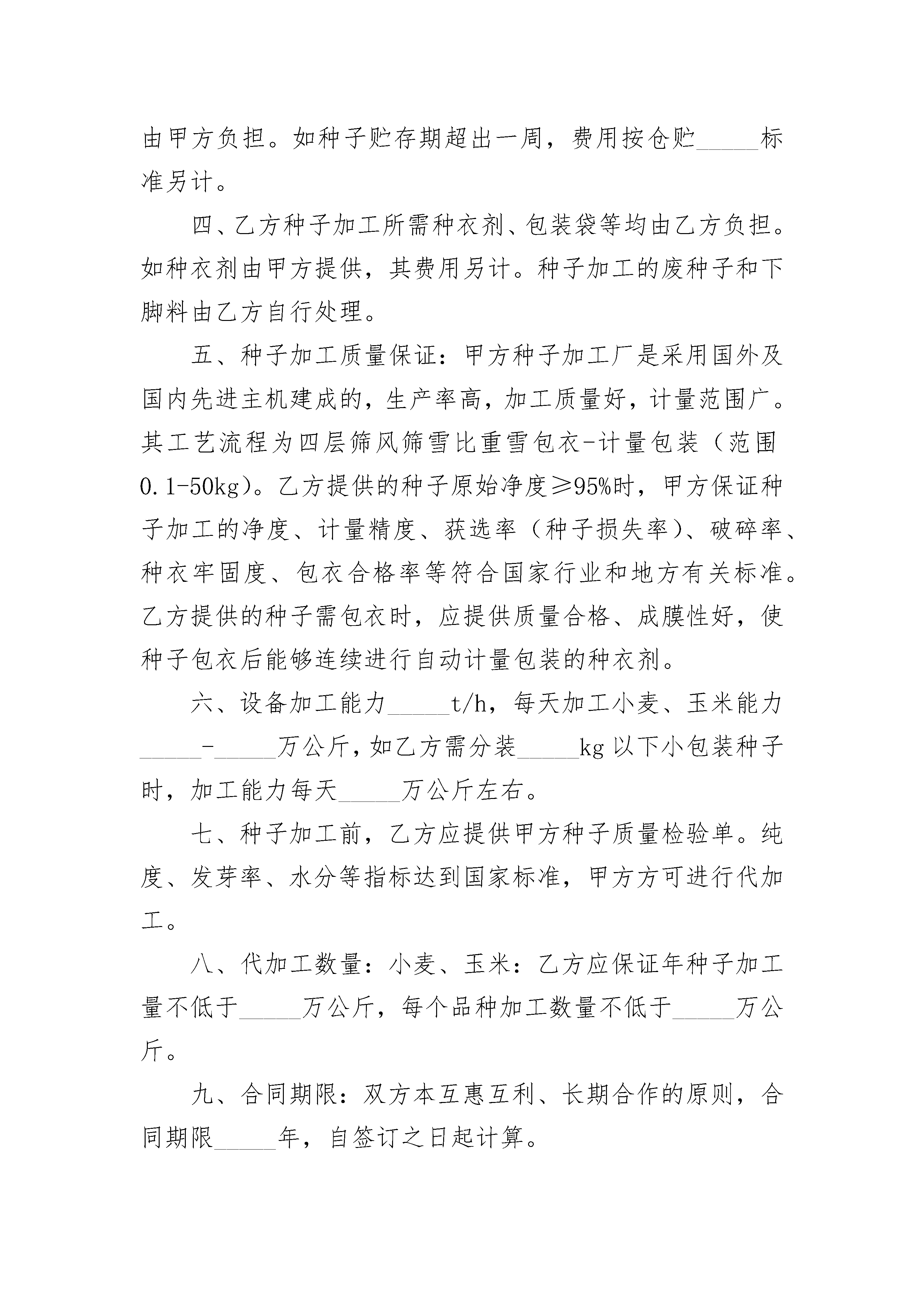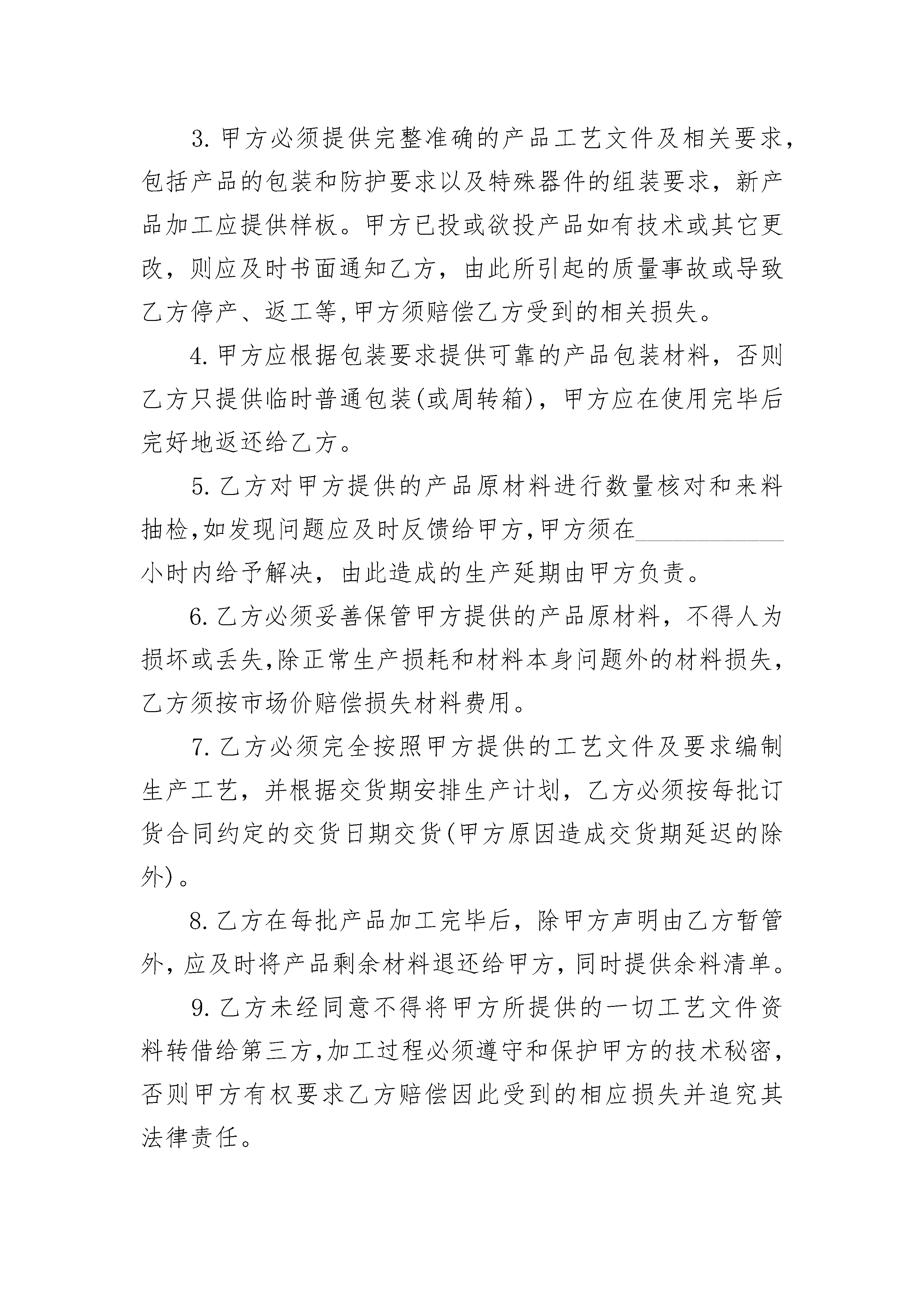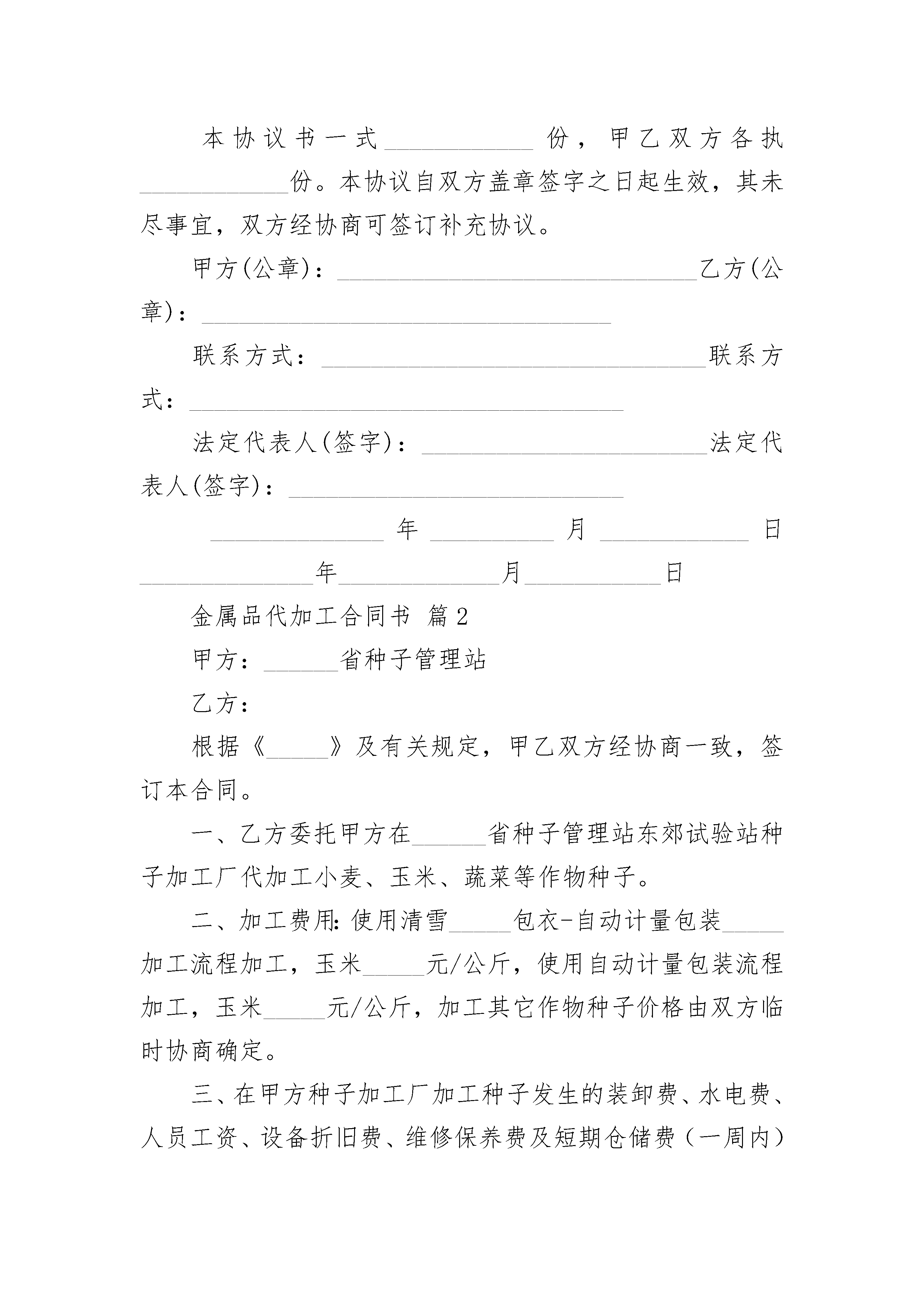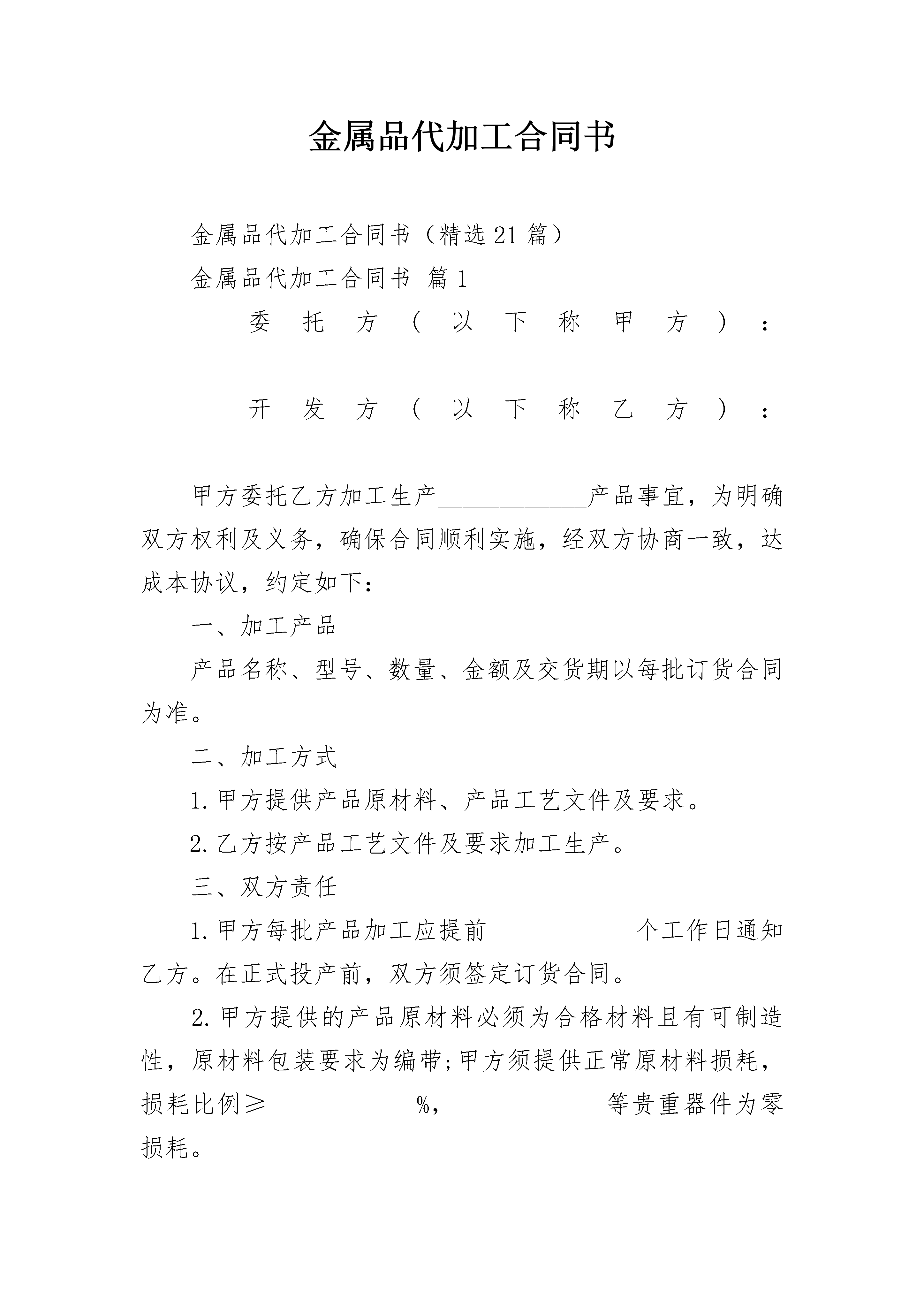 金属品代加工合同书金属品代加工合同书(精选21篇)金属品代加工合同书篇1委托方(以下称甲方):_________________________________开发方(以下称乙方):_________________________________甲方委托乙方加工生产____________产品事宜,为明确双方权利及义务,确保合同顺利实施,经双方协商一致,达成本协议,约定如下:一、加工产品产品名称、型号、数量、金额及交货期以每批订货合同为准。二、加工方式1.甲方提供产品原材料、产品工艺文件及要求。2.乙方按产品工艺文件及要求加工生产。三、双方责任1.甲方每批产品加工应提前____________个工作日通知乙方。在正式投产前,双方须签定订货合同。2.甲方提供的产品原材料必须为合格材料且有可制造性,原材料包装要求为编带;甲方须提供正常原材料损耗,损耗比例≥____________%,____________等贵重器件为零损耗。3.甲方必须提供完整准确的产品工艺文件及相关要求,包括产品的包装和防护要求以及特殊器件的组装要求,新产品加工应提供样板。甲方已投或欲投产品如有技术或其它更改,则应及时书面通知乙方,由此所引起的质量事故或导致乙方停产、返工等,甲方须赔偿乙方受到的相关损失。4.甲方应根据包装要求提供可靠的产品包装材料,否则乙方只提供临时普通包装(或周转箱),甲方应在使用完毕后完好地返还给乙方。5.乙方对甲方提供的产品原材料进行数量核对和来料抽检,如发现问题应及时反馈给甲方,甲方须在____________小时内给予解决,由此造成的生产延期由甲方负责。6.乙方必须妥善保管甲方提供的产品原材料,不得人为损坏或丢失,除正常生产损耗和材料本身问题外的材料损失,乙方须按市场价赔偿损失材料费用。7.乙方必须完全按照甲方提供的工艺文件及要求编制生产工艺,并根据交货期安排生产计划,乙方必须按每批订货合同约定的交货日期交货(甲方原因造成交货期延迟的除外)。8.乙方在每批产品加工完毕后,除甲方声明由乙方暂管外,应及时将产品剩余材料退还给甲方,同时提供余料清单。9.乙方未经同意不得将甲方所提供的一切工艺文件资料转借给第三方,加工过程必须遵守和保护甲方的技术秘密,否则甲方有权要求乙方赔偿因此受到的相应损失并追究其法律责任。四、产品质量及验收1.乙方交付产品的焊接质量应符合行业标准____________的验收条件,如甲方有特殊质量要求,应随订货合同提供附件说明。2.甲方对每批产品的验收及提出异议的期限为乙方交货后____________日内,如在此期限内甲方未向乙方发出书面通知,则视为该批产品验收合格。3.甲方在验收时如发现焊接质量问题,须保持原状并及时通知乙方,乙方应在____________个工作日内予以书面答复,同时双方约定返修方式及时间。乙方未在规定期限内予以书面答复,视为接受甲方对货物的提出的异议。4.非乙方质量问题造成的不合格品,乙方不承担责任。五、运输1.订货合同额在____________元以上的,乙方负责一次性取料送货并承担运输费用。因甲方物料不齐套的,乙方不负责再次取料(特殊情况除外)。2.订货合同额在____________元以下的,甲方负责送料取货并承担运输费用。六、付款及结算方式1.甲方须在乙方交货后以支票或转账方式一次性付清货款,具体付款期限以订货合同为准。2.乙方在甲方付款同时须向甲方开具相关发票(如有需要)。七、其他事项本协议书一式____________份,甲乙双方各执____________份。本协议自双方盖章签字之日起生效,其未尽事宜,双方经协商可签订补充协议。甲方(公章):_____________________________乙方(公章):_________________________________联系方式:_______________________________联系方式:___________________________________法定代表人(签字):_______________________法定代表人(签字):_________________________________________年__________月____________日______________年_____________月___________日金属品代加工合同书篇2甲方:______省种子管理站乙方:根据《_____》及有关规定,甲乙双方经协商一致,签订本合同。一、乙方委托甲方在______省种子管理站东郊试验站种子加工厂代加工小麦、玉米、蔬菜等作物种子。二、加工费用:使用清雪_____包衣-自动计量包装_____加工流程加工,玉米_____元/公斤,使用自动计量包装流程加工,玉米_____元/公斤