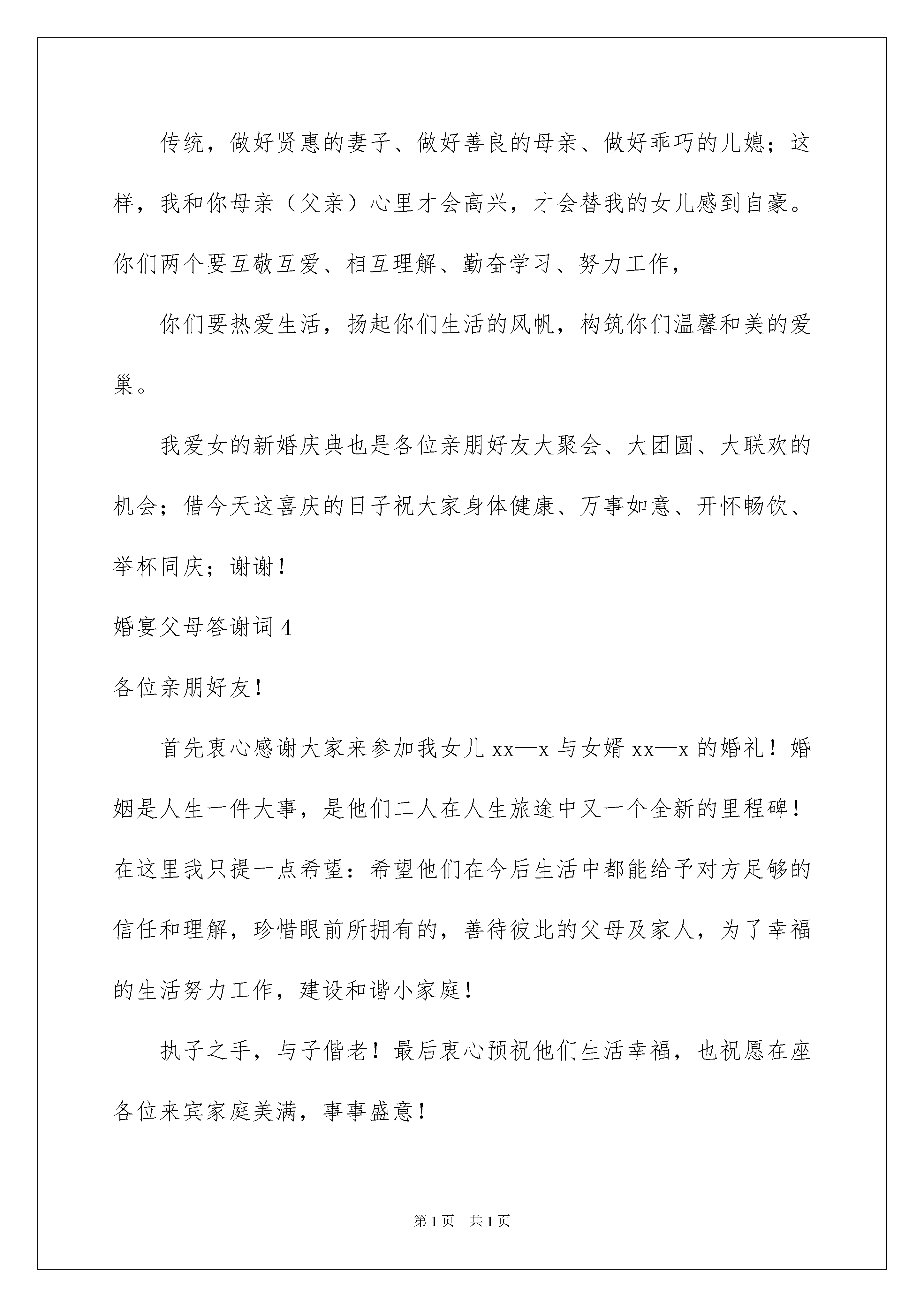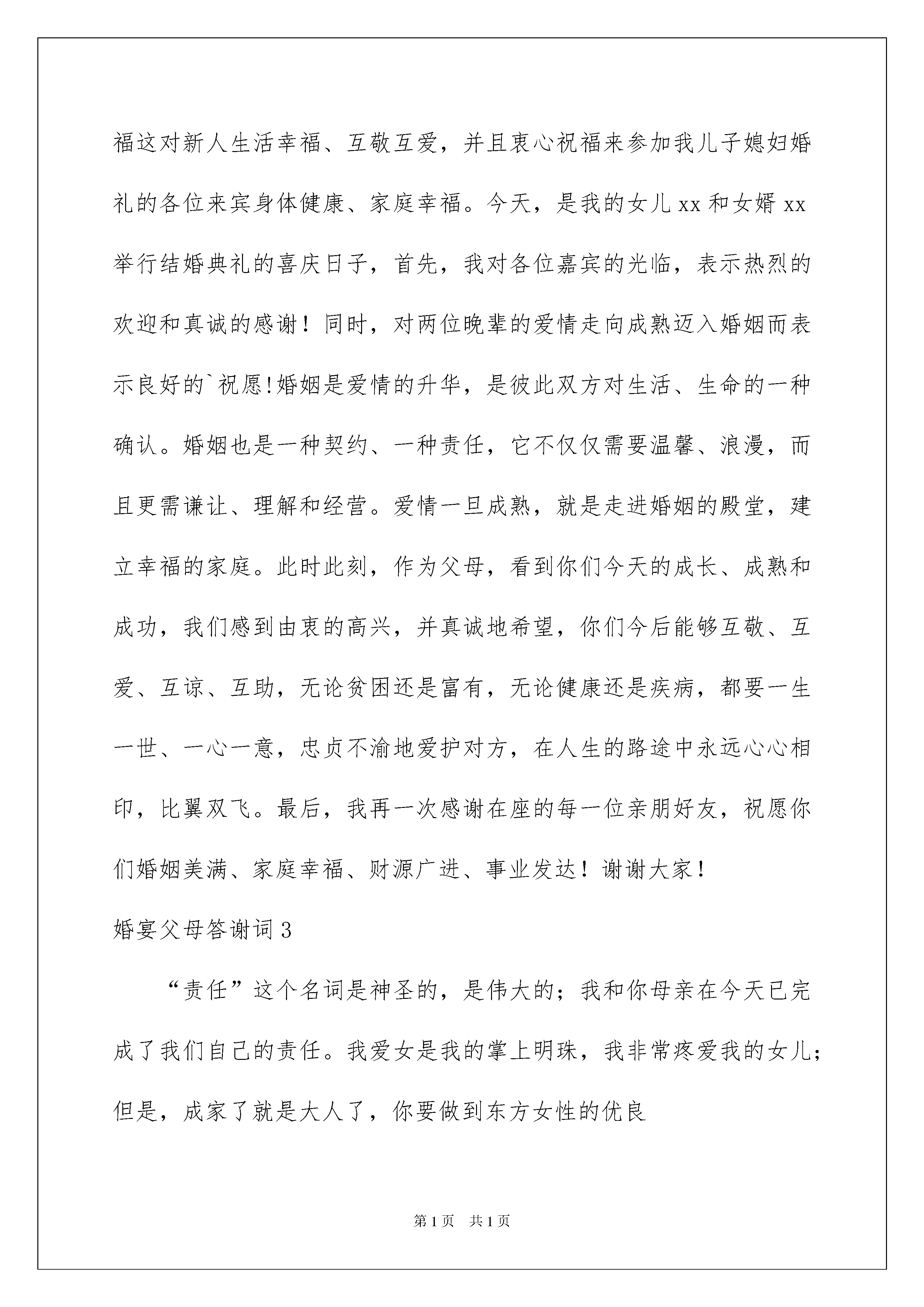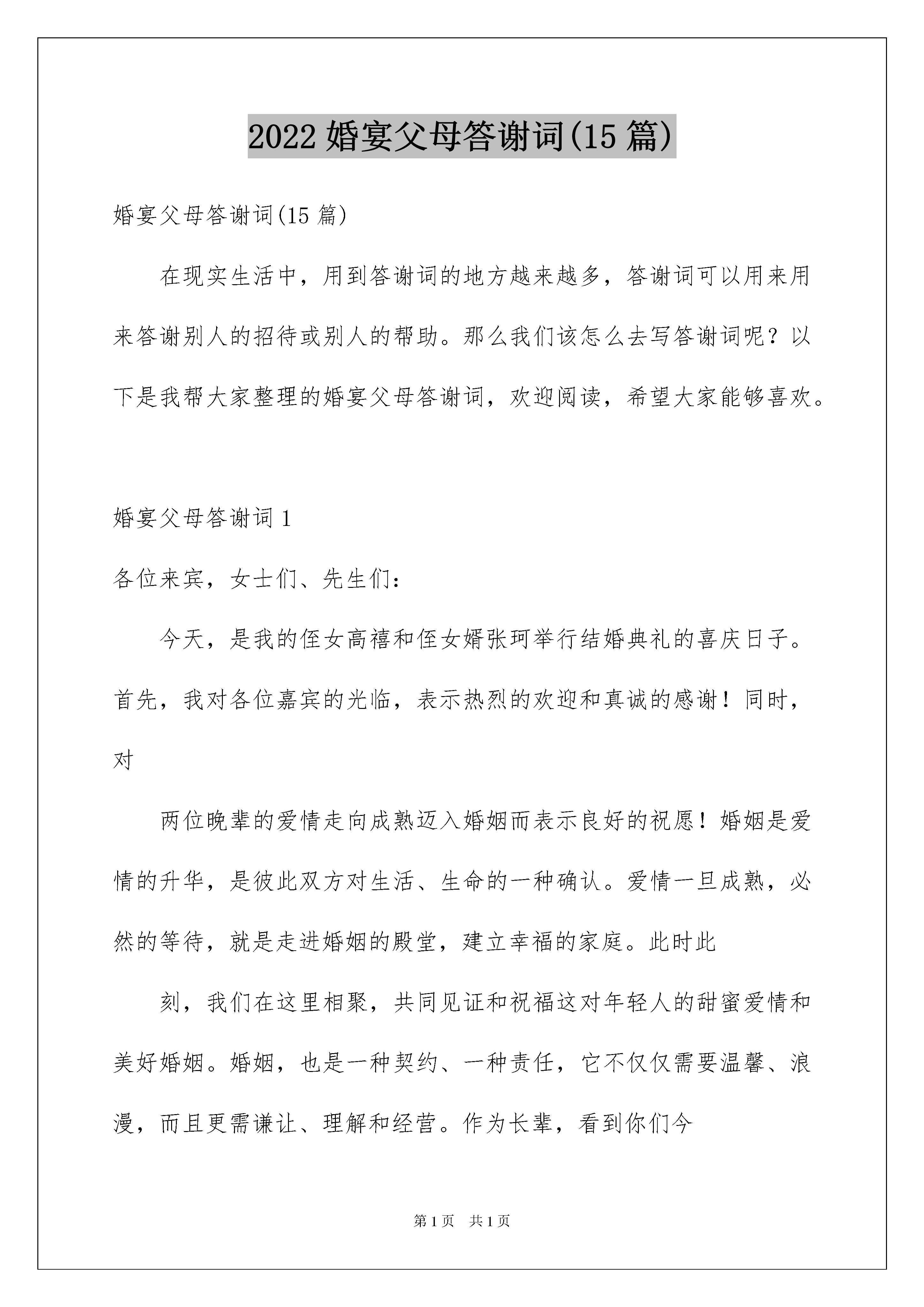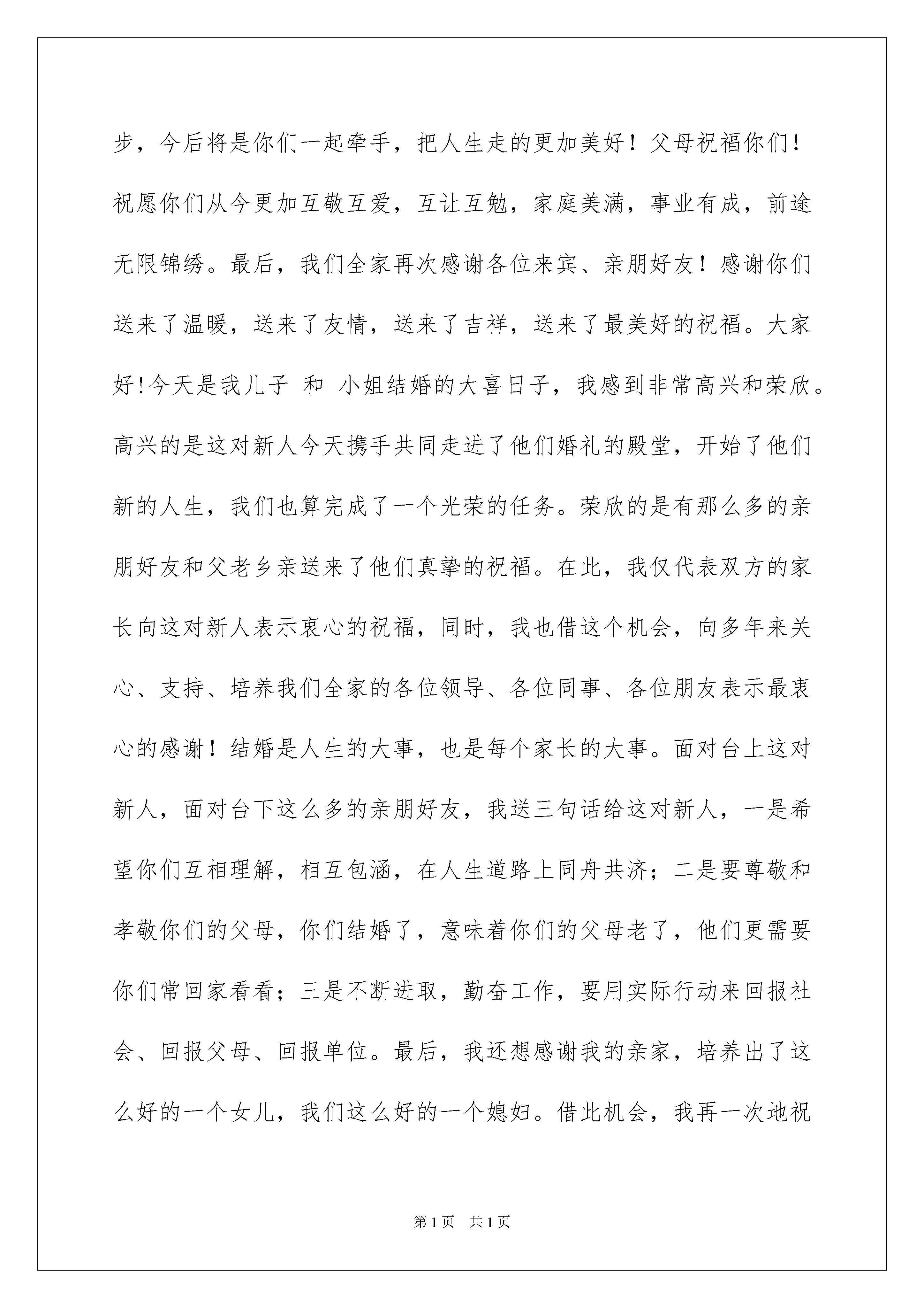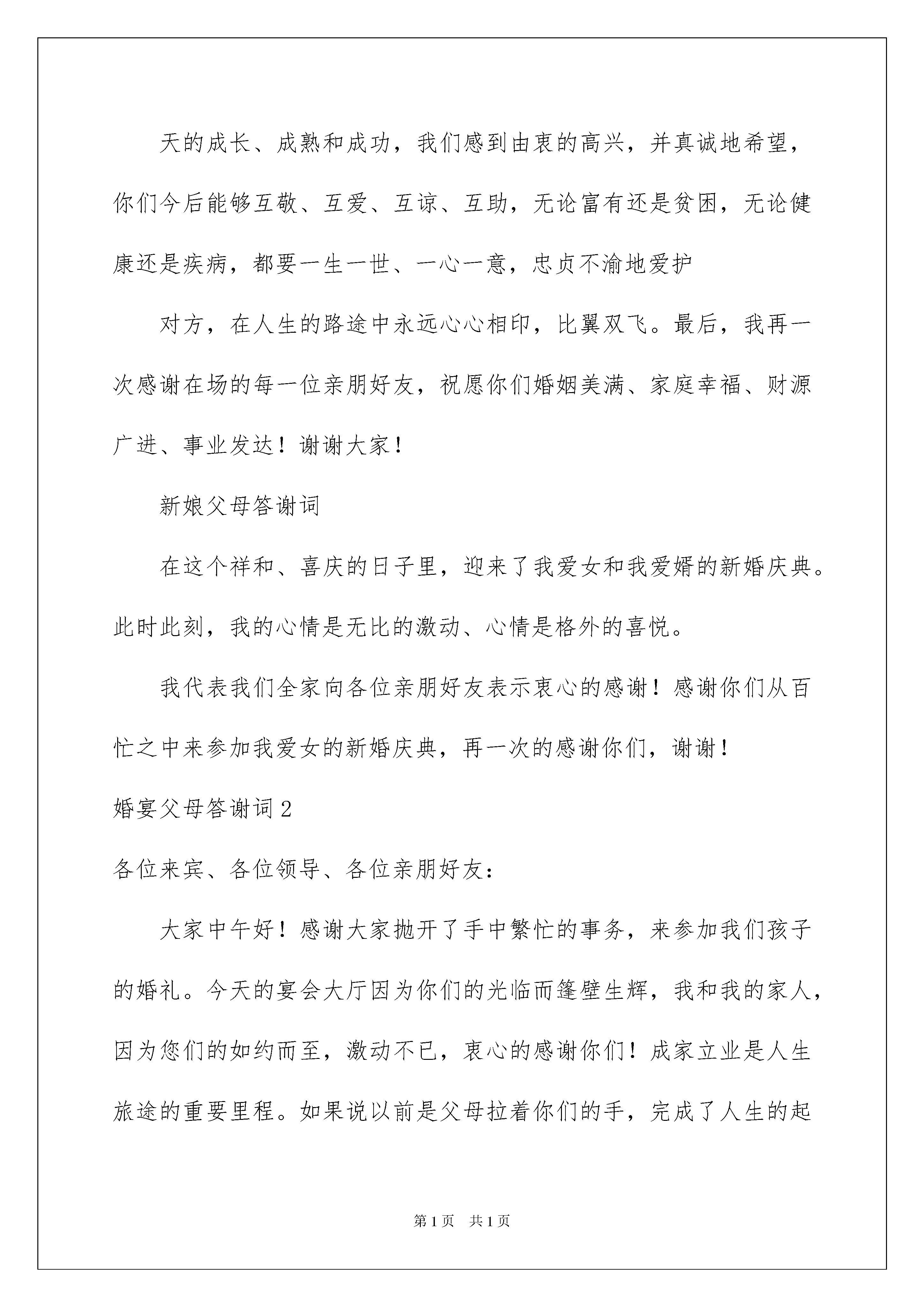 2022婚宴父母答谢词(15篇)婚宴父母答谢词(15篇)在现实生活中,用到答谢词的地方越来越多,答谢词可以用来用来答谢别人的招待或别人的帮助。那么我们该怎么去写答谢词呢?以下是我帮大家整理的婚宴父母答谢词,欢迎阅读,希望大家能够喜欢。婚宴父母答谢词1各位来宾,女士们、先生们:今天,是我的侄女高禧和侄女婿张珂举行结婚典礼的喜庆日子。首先,我对各位嘉宾的光临,表示热烈的欢迎和真诚的感谢!同时,对两位晚辈的爱情走向成熟迈入婚姻而表示良好的祝愿!婚姻是爱情的升华,是彼此双方对生活、生命的一种确认。爱情一旦成熟,必然的等待,就是走进婚姻的殿堂,建立幸福的家庭。此时此刻,我们在这里相聚,共同见证和祝福这对年轻人的甜蜜爱情和美好婚姻。婚姻,也是一种契约、一种责任,它不仅仅需要温馨、浪漫,而且更需谦让、理解和经营。作为长辈,看到你们今天的成长、成熟和成功,我们感到由衷的高兴,并真诚地希望,你们今后能够互敬、互爱、互谅、互助,无论富有还是贫困,无论健康还是疾病,都要一生一世、一心一意,忠贞不渝地爱护对方,在人生的路途中永远心心相印,比翼双飞。最后,我再一次感谢在场的每一位亲朋好友,祝愿你们婚姻美满、家庭幸福、财源广进、事业发达!谢谢大家!新娘父母答谢词在这个祥和、喜庆的日子里,迎来了我爱女和我爱婿的新婚庆典。此时此刻,我的心情是无比的激动、心情是格外的喜悦。我代表我们全家向各位亲朋好友表示衷心的感谢!感谢你们从百忙之中来参加我爱女的新婚庆典,再一次的感谢你们,谢谢!婚宴父母答谢词2各位来宾、各位领导、各位亲朋好友:大家中午好!感谢大家抛开了手中繁忙的事务,来参加我们孩子的婚礼。今天的宴会大厅因为你们的光临而篷壁生辉,我和我的家人,因为您们的如约而至,激动不已,衷心的感谢你们!成家立业是人生旅途的重要里程。如果说以前是父母拉着你们的手,完成了人生的起步,今后将是你们一起牵手,把人生走的更加美好!父母祝福你们!祝愿你们从今更加互敬互爱,互让互勉,家庭美满,事业有成,前途无限锦绣。最后,我们全家再次感谢各位来宾、亲朋好友!感谢你们送来了温暖,送来了友情,送来了吉祥,送来了最美好的祝福。大家好!今天是我儿子和小姐结婚的大喜日子,我感到非常高兴和荣欣。高兴的是这对新人今天携手共同走进了他们婚礼的殿堂,开始了他们新的人生,我们也算完成了一个光荣的任务。荣欣的是有那么多的亲朋好友和父老乡亲送来了他们真挚的祝福。在此,我仅代表双方的家长向这对新人表示衷心的祝福,同时,我也借这个机会,向多年来关心、支持、培养我们全家的各位领导、各位同事、各位朋友表示最衷心的感谢!结婚是人生的大事,也是每个家长的大事。面对台上这对新人,面对台下这么多的亲朋好友,我送三句话给这对新人,一是希望你们互相理解,相互包涵,在人生道路上同舟共济;二是要尊敬和孝敬你们的父母,你们结婚了,意味着你们的父母老了,他们更需要你们常回家看看;三是不断进取,勤奋工作,要用实际行动来回报社会、回报父母、回报单位。最后,我还想感谢我的亲家,培养出了这么好的一个女儿,我们这么好的一个媳妇。借此机会,我再一次地祝福这对新人生活幸福、互敬互爱,并且衷心祝福来参加我儿子媳妇婚礼的各位来宾身体健康、家庭幸福。今天,是我的女儿xx和女婿xx举行结婚典礼的喜庆日子,首先,我对各位嘉宾的光临,表示热烈的欢迎和真诚的感谢!同时,对两位晚辈的爱情走向成熟迈入婚姻而表示良好的`祝愿!婚姻是爱情的升华,是彼此双方对生活、生命的一种确认。婚姻也是一种契约、一种责任,它不仅仅需要温馨、浪漫,而且更需谦让、理解和经营。爱情一旦成熟,就是走进婚姻的殿堂,建立幸福的家庭。此时此刻,作为父母,看到你们今天的成长、成熟和成功,我们感到由衷的高兴,并真诚地希望,你们今后能够互敬、互爱、互谅、互助,无论贫困还是富有,无论健康还是疾病,都要一生一世、一心一意,忠贞不渝地爱护对方,在人生的路途中永远心心相印,比翼双飞。最后,我再一次感谢在座的每一位亲朋好友,祝愿你们婚姻美满、家庭幸福、财源广进、事业发达!谢谢大家!婚宴父母答谢词3“责任”这个名词是神圣的,是伟大的;我和你母亲在今天已完成了我们自己的责任。我爱女是我的掌上明珠,我非常疼爱我的女儿;但是,成家了就是大人了,你要做到东方女性的优良传统,做好贤惠的妻子、做好善良的母亲、做好乖巧的儿媳;这样,我和你母亲(父亲)心里才会高兴,才会替我的女儿感到自豪。你们两个要互敬互爱、相互理解、勤奋学习、努力工作,你们要热爱生活,扬起你们生活的风帆,构筑你们温馨和美的爱巢。我爱女的新婚庆典也是各位亲朋好友大聚会、大团圆、大联欢的机会;借今天这喜庆的日子祝大