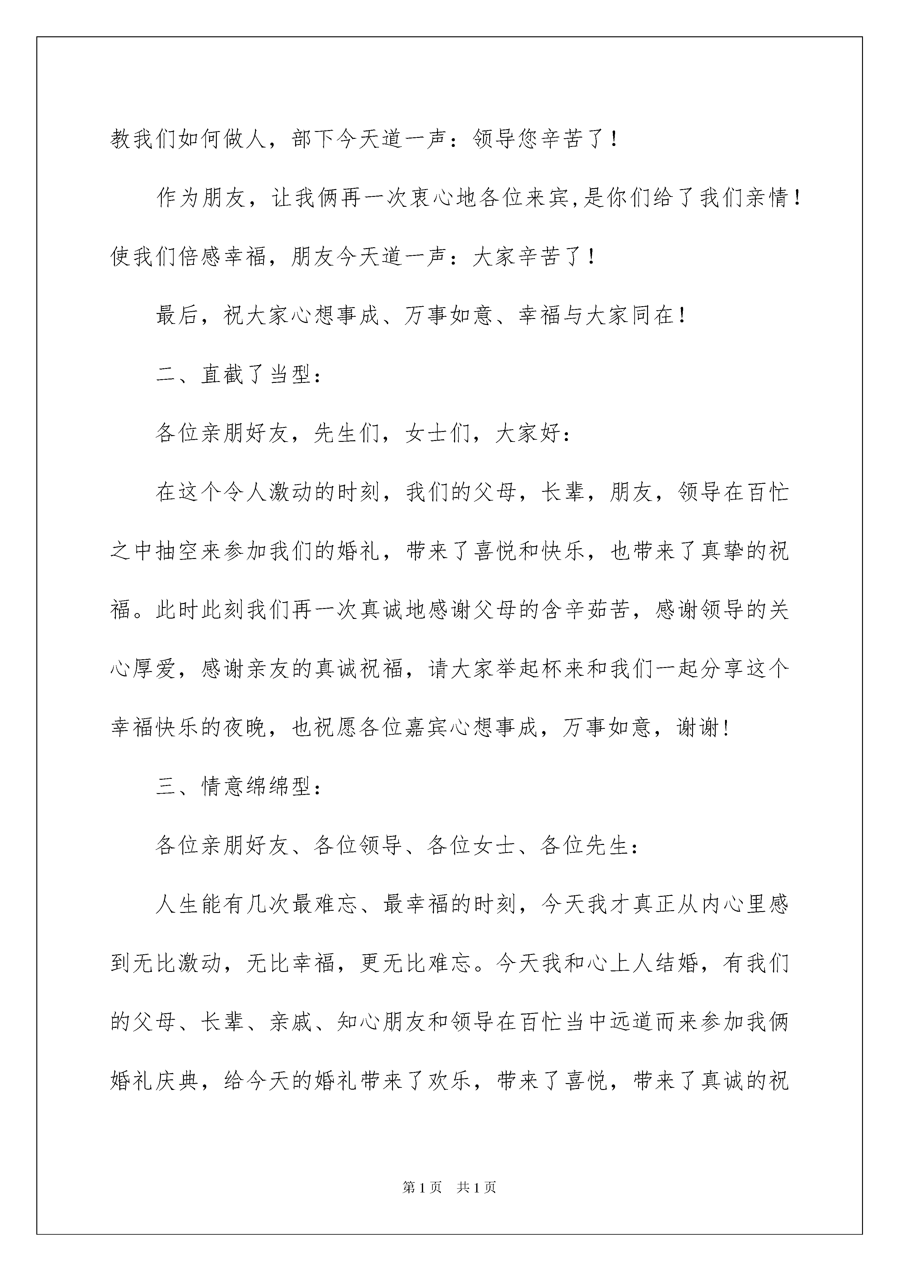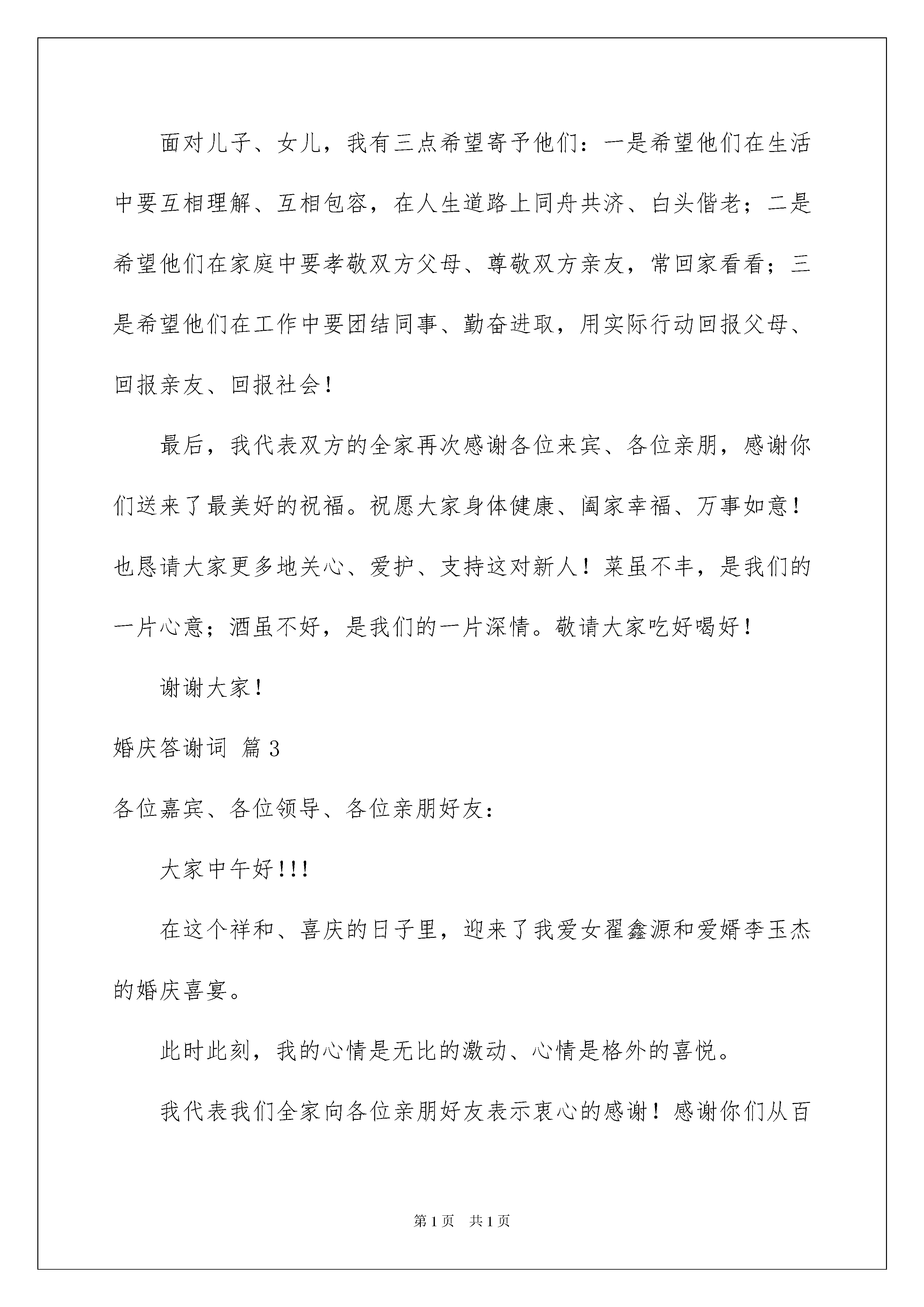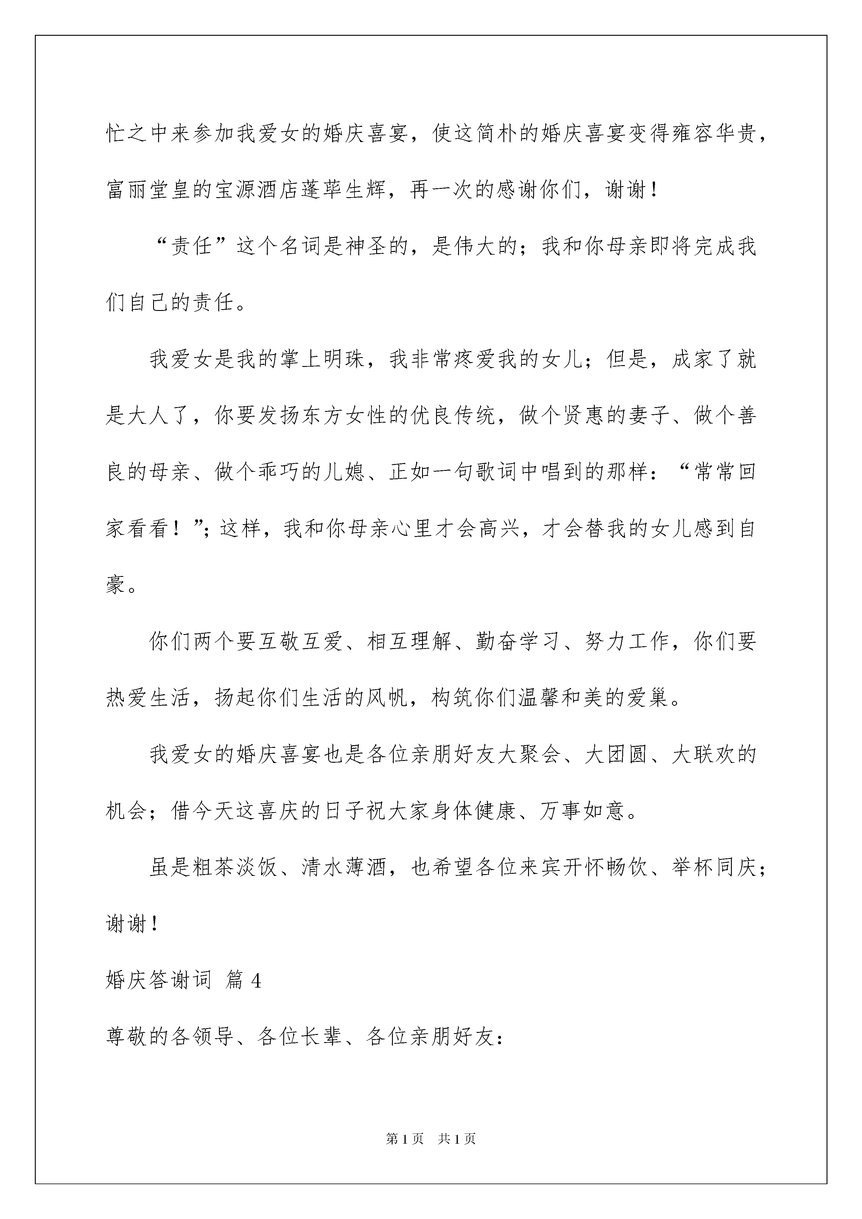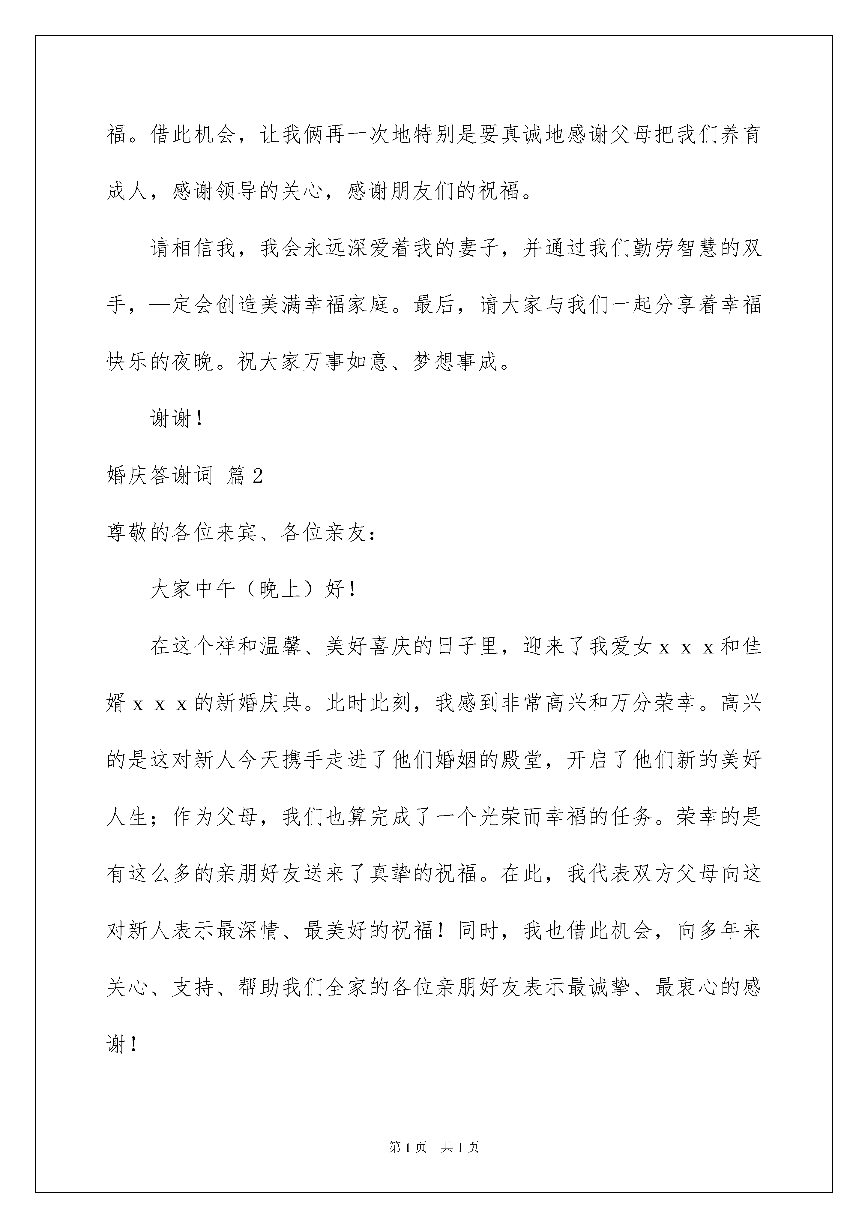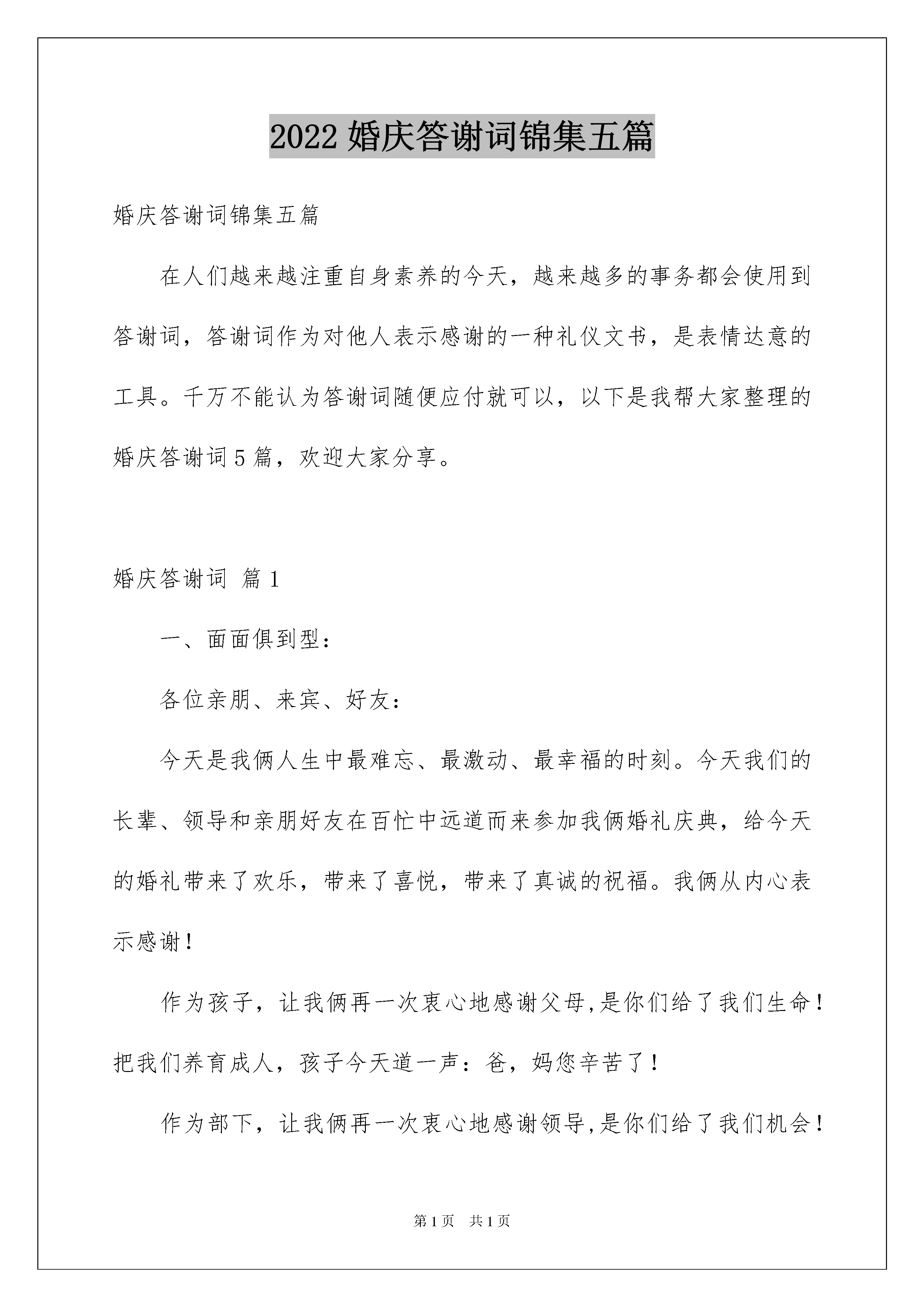 2022婚庆答谢词锦集五篇婚庆答谢词锦集五篇在人们越来越注重自身素养的今天,越来越多的事务都会使用到答谢词,答谢词作为对他人表示感谢的一种礼仪文书,是表情达意的工具。千万不能认为答谢词随便应付就可以,以下是我帮大家整理的婚庆答谢词5篇,欢迎大家分享。婚庆答谢词篇1一、面面俱到型:各位亲朋、来宾、好友:今天是我俩人生中最难忘、最激动、最幸福的时刻。今天我们的长辈、领导和亲朋好友在百忙中远道而来参加我俩婚礼庆典,给今天的婚礼带来了欢乐,带来了喜悦,带来了真诚的祝福。我俩从内心表示感谢!作为孩子,让我俩再一次衷心地感谢父母,是你们给了我们生命!把我们养育成人,孩子今天道一声:爸,妈您辛苦了!作为部下,让我俩再一次衷心地感谢领导,是你们给了我们机会!教我们如何做人,部下今天道一声:领导您辛苦了!作为朋友,让我俩再一次衷心地各位来宾,是你们给了我们亲情!使我们倍感幸福,朋友今天道一声:大家辛苦了!最后,祝大家心想事成、万事如意、幸福与大家同在!二、直截了当型:各位亲朋好友,先生们,女士们,大家好:在这个令人激动的时刻,我们的父母,长辈,朋友,领导在百忙之中抽空来参加我们的婚礼,带来了喜悦和快乐,也带来了真挚的祝福。此时此刻我们再一次真诚地感谢父母的含辛茹苦,感谢领导的关心厚爱,感谢亲友的真诚祝福,请大家举起杯来和我们一起分享这个幸福快乐的夜晚,也祝愿各位嘉宾心想事成,万事如意,谢谢!三、情意绵绵型:各位亲朋好友、各位领导、各位女士、各位先生:人生能有几次最难忘、最幸福的时刻,今天我才真正从内心里感到无比激动,无比幸福,更无比难忘。今天我和心上人结婚,有我们的父母、长辈、亲戚、知心朋友和领导在百忙当中远道而来参加我俩婚礼庆典,给今天的婚礼带来了欢乐,带来了喜悦,带来了真诚的祝福。借此机会,让我俩再一次地特别是要真诚地感谢父母把我们养育成人,感谢领导的关心,感谢朋友们的祝福。请相信我,我会永远深爱着我的妻子,并通过我们勤劳智慧的双手,—定会创造美满幸福家庭。最后,请大家与我们一起分享着幸福快乐的夜晚。祝大家万事如意、梦想事成。谢谢!婚庆答谢词篇2尊敬的各位来宾、各位亲友:大家中午(晚上)好!在这个祥和温馨、美好喜庆的日子里,迎来了我爱女xxx和佳婿xxx的新婚庆典。此时此刻,我感到非常高兴和万分荣幸。高兴的是这对新人今天携手走进了他们婚姻的殿堂,开启了他们新的美好人生;作为父母,我们也算完成了一个光荣而幸福的任务。荣幸的是有这么多的亲朋好友送来了真挚的祝福。在此,我代表双方父母向这对新人表示最深情、最美好的祝福!同时,我也借此机会,向多年来关心、支持、帮助我们全家的各位亲朋好友表示最诚挚、最衷心的感谢!面对儿子、女儿,我有三点希望寄予他们:一是希望他们在生活中要互相理解、互相包容,在人生道路上同舟共济、白头偕老;二是希望他们在家庭中要孝敬双方父母、尊敬双方亲友,常回家看看;三是希望他们在工作中要团结同事、勤奋进取,用实际行动回报父母、回报亲友、回报社会!最后,我代表双方的全家再次感谢各位来宾、各位亲朋,感谢你们送来了最美好的祝福。祝愿大家身体健康、阖家幸福、万事如意!也恳请大家更多地关心、爱护、支持这对新人!菜虽不丰,是我们的一片心意;酒虽不好,是我们的一片深情。敬请大家吃好喝好!谢谢大家!婚庆答谢词篇3各位嘉宾、各位领导、各位亲朋好友:大家中午好!!!在这个祥和、喜庆的日子里,迎来了我爱女翟鑫源和爱婿李玉杰的婚庆喜宴。此时此刻,我的心情是无比的激动、心情是格外的喜悦。我代表我们全家向各位亲朋好友表示衷心的感谢!感谢你们从百忙之中来参加我爱女的婚庆喜宴,使这简朴的婚庆喜宴变得雍容华贵,富丽堂皇的宝源酒店蓬荜生辉,再一次的感谢你们,谢谢!“责任”这个名词是神圣的,是伟大的;我和你母亲即将完成我们自己的责任。我爱女是我的掌上明珠,我非常疼爱我的女儿;但是,成家了就是大人了,你要发扬东方女性的优良传统,做个贤惠的妻子、做个善良的母亲、做个乖巧的儿媳、正如一句歌词中唱到的那样:“常常回家看看!”;这样,我和你母亲心里才会高兴,才会替我的女儿感到自豪。你们两个要互敬互爱、相互理解、勤奋学习、努力工作,你们要热爱生活,扬起你们生活的风帆,构筑你们温馨和美的爱巢。我爱女的婚庆喜宴也是各位亲朋好友大聚会、大团圆、大联欢的机会;借今天这喜庆的日子祝大家身体健康、万事如意。虽是粗茶淡饭、清水薄酒,也希望各位来宾开怀畅饮、举杯同庆;谢谢!婚庆答谢词篇4尊敬的各领导、各位长辈、各位亲朋好友:大家晚上好!现在我很激动,心中有很多的感激、感谢。我要感激老天,让我遇到了这么好的依靠。xxx,是你让我的生命充满了意义