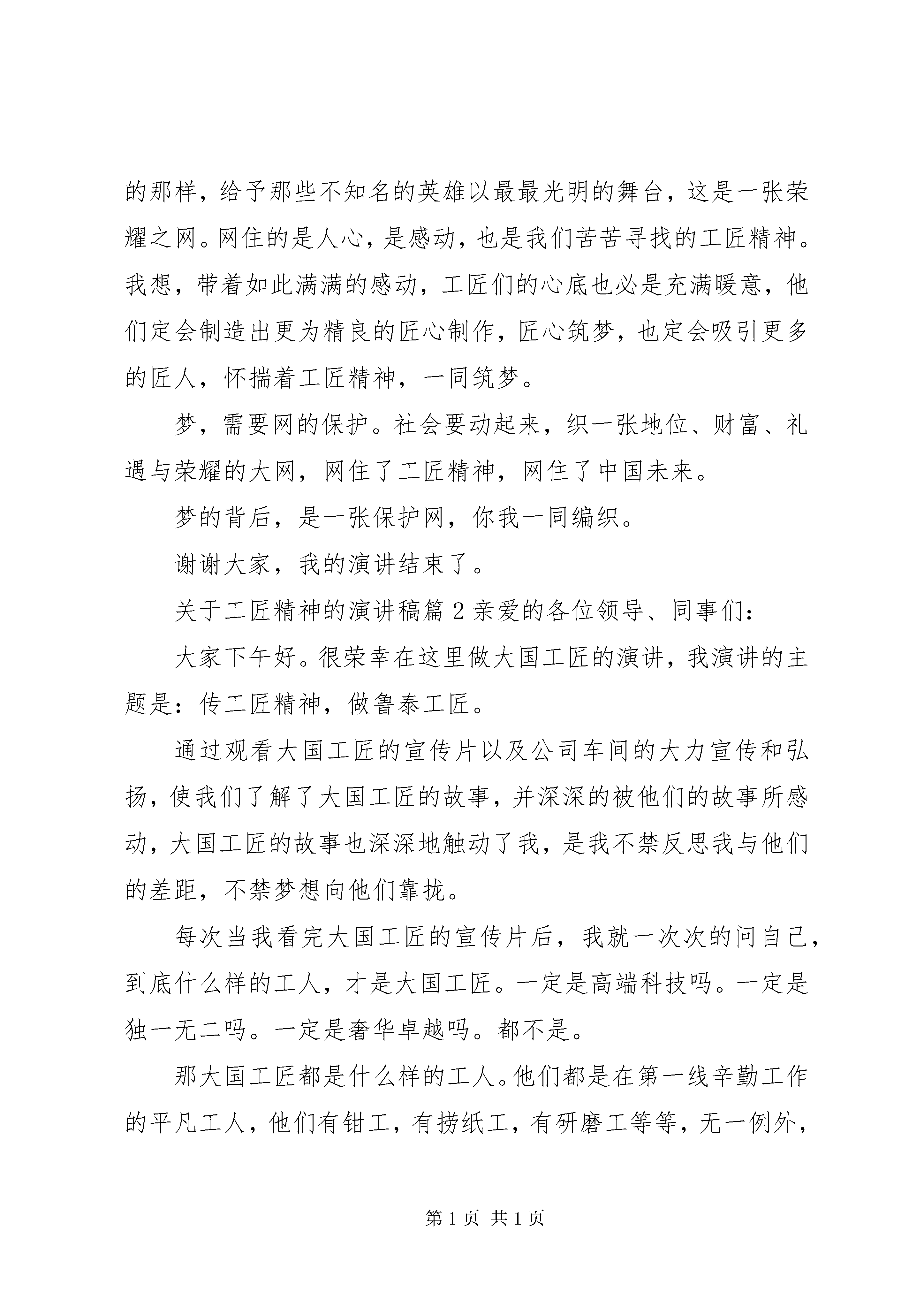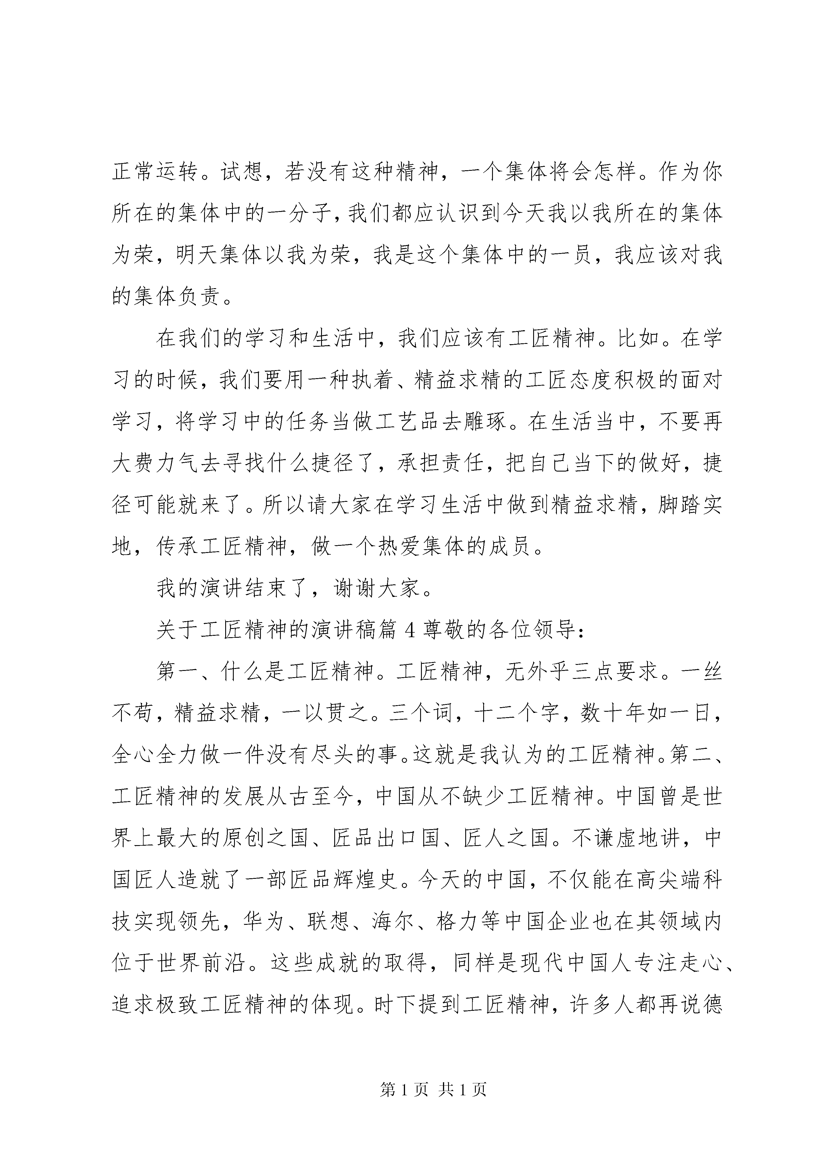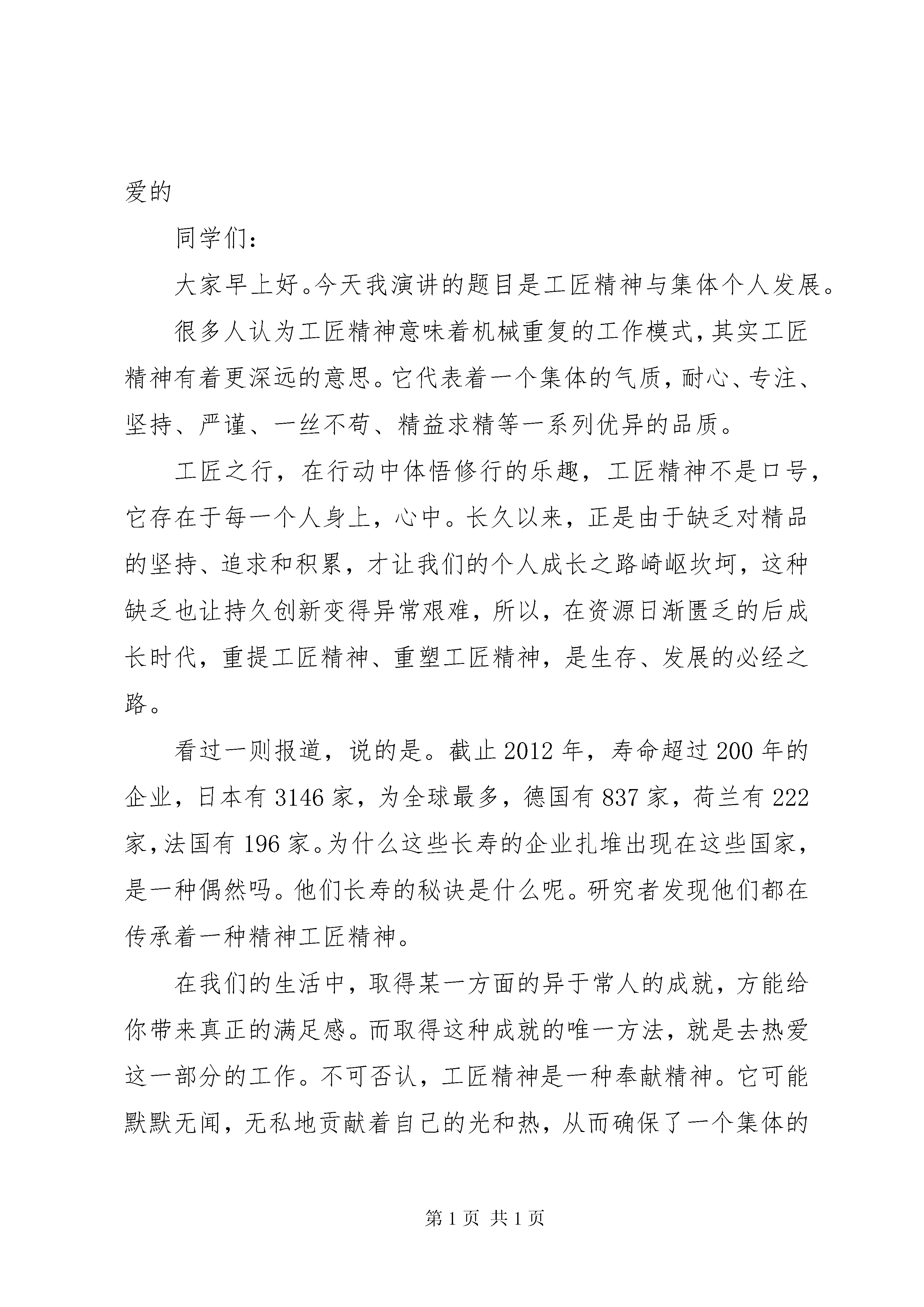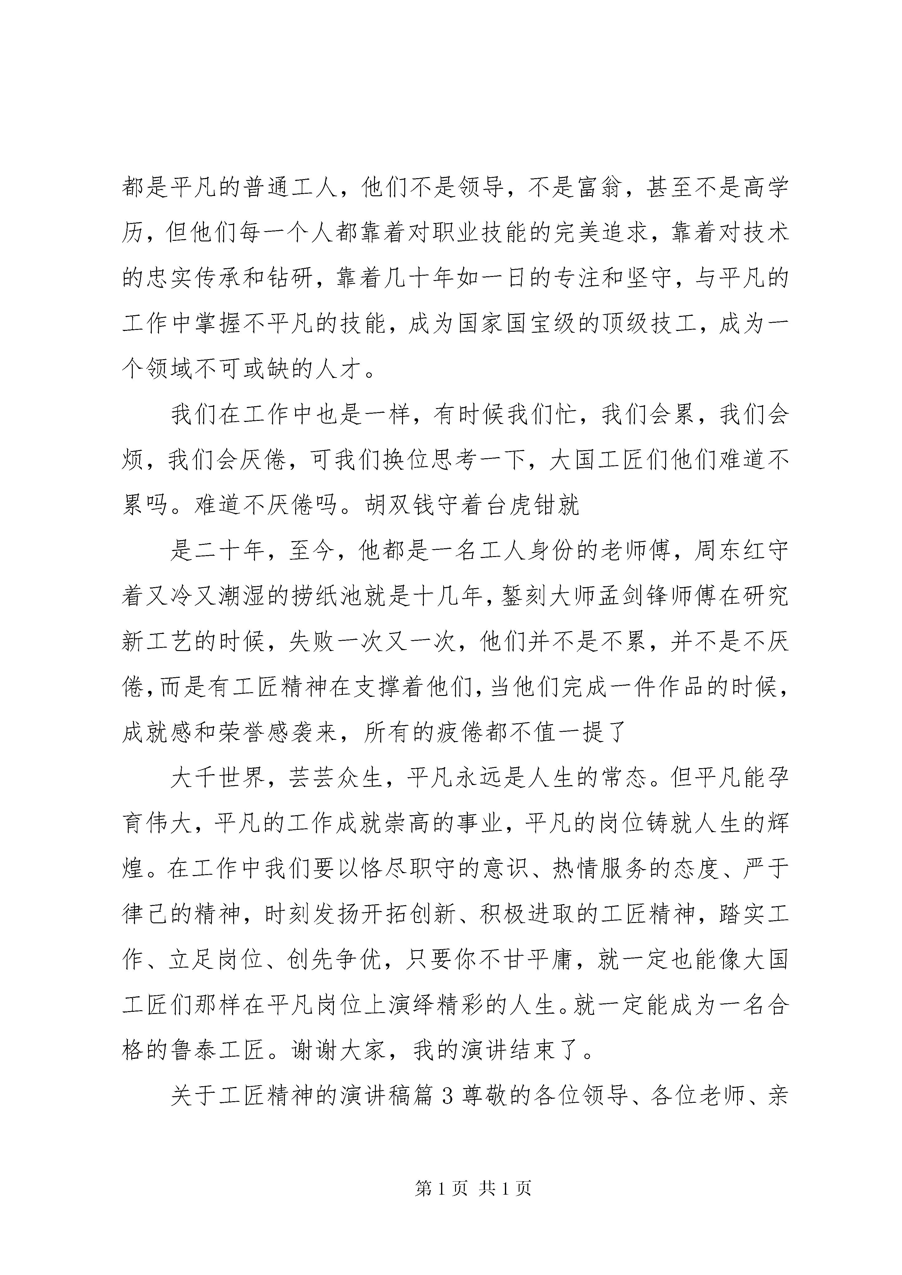 关于工匠精神的演讲稿精选篇关于工匠精神的演讲稿篇1大国工匠,匠心筑梦。但梦的背后,有太多辛酸,有太多不为人知的血与泪。一个人,太渺小,生活能轻而易举地将他击倒;一个工匠,形单影只,聚不起社会的力量,中国制造跟不上工业4.0的步子。大国工匠梦的背后,工匠精神的背后,需要我们用网来守护。《墨子尚贤》中语云。古之圣王为政,列德而尚贤。国之贤者,高于之爵,厚与之禄,重之以令。是也,工匠亦然,倘若以全社会之力而形成一张梦的保护网,梦不会碎。高与之爵。德国有许多蓝领工人,却是比白领经理更令人尊敬的存在。他们靠自己的劳动和技术为生,地位较高,虽是工人,却也体面得像个绅士。这是社会给予他们的肯定,给予他们那双劳动后布满老茧的手以崇高的敬意。大国工匠,也需要这样一张来自社会的保护网,不受人白眼,深爱着自己的职业。厚与之禄。梦,也是需要金钱为代价的。当商人等不及一个个精细打磨的手工瓷器出路,市场上流动的就只能是统一形态的碗和盆。何不多给工匠们一些时间,一些支持,助他们圆梦,他们梦圆的时候,中国才能真正走入工业4.0,这张金钱锻造的网,少不了。重之以令,给予工匠们礼遇、荣耀,就像《感动中国》所做的那样,给予那些不知名的英雄以最最光明的舞台,这是一张荣耀之网。网住的是人心,是感动,也是我们苦苦寻找的工匠精神。我想,带着如此满满的感动,工匠们的心底也必是充满暖意,他们定会制造出更为精良的匠心制作,匠心筑梦,也定会吸引更多的匠人,怀揣着工匠精神,一同筑梦。梦,需要网的保护。社会要动起来,织一张地位、财富、礼遇与荣耀的大网,网住了工匠精神,网住了中国未来。梦的背后,是一张保护网,你我一同编织。谢谢大家,我的演讲结束了。关于工匠精神的演讲稿篇2亲爱的各位领导、同事们:大家下午好。很荣幸在这里做大国工匠的演讲,我演讲的主题是:传工匠精神,做鲁泰工匠。通过观看大国工匠的宣传片以及公司车间的大力宣传和弘扬,使我们了解了大国工匠的故事,并深深的被他们的故事所感动,大国工匠的故事也深深地触动了我,是我不禁反思我与他们的差距,不禁梦想向他们靠拢。每次当我看完大国工匠的宣传片后,我就一次次的问自己,到底什么样的工人,才是大国工匠。一定是高端科技吗。一定是独一无二吗。一定是奢华卓越吗。都不是。那大国工匠都是什么样的工人。他们都是在第一线辛勤工作的平凡工人,他们有钳工,有捞纸工,有研磨工等等,无一例外,都是平凡的普通工人,他们不是领导,不是富翁,甚至不是高学历,但他们每一个人都靠着对职业技能的完美追求,靠着对技术的忠实传承和钻研,靠着几十年如一日的专注和坚守,与平凡的工作中掌握不平凡的技能,成为国家国宝级的顶级技工,成为一个领域不可或缺的人才。我们在工作中也是一样,有时候我们忙,我们会累,我们会烦,我们会厌倦,可我们换位思考一下,大国工匠们他们难道不累吗。难道不厌倦吗。胡双钱守着台虎钳就是二十年,至今,他都是一名工人身份的老师傅,周东红守着又冷又潮湿的捞纸池就是十几年,錾刻大师孟剑锋师傅在研究新工艺的时候,失败一次又一次,他们并不是不累,并不是不厌倦,而是有工匠精神在支撑着他们,当他们完成一件作品的时候,成就感和荣誉感袭来,所有的疲倦都不值一提了大千世界,芸芸众生,平凡永远是人生的常态。但平凡能孕育伟大,平凡的工作成就崇高的事业,平凡的岗位铸就人生的辉煌。在工作中我们要以恪尽职守的意识、热情服务的态度、严于律己的精神,时刻发扬开拓创新、积极进取的工匠精神,踏实工作、立足岗位、创先争优,只要你不甘平庸,就一定也能像大国工匠们那样在平凡岗位上演绎精彩的人生。就一定能成为一名合格的鲁泰工匠。谢谢大家,我的演讲结束了。关于工匠精神的演讲稿篇3尊敬的各位领导、各位老师、亲爱的同学们:大家早上好。今天我演讲的题目是工匠精神与集体个人发展。很多人认为工匠精神意味着机械重复的工作模式,其实工匠精神有着更深远的意思。它代表着一个集体的气质,耐心、专注、坚持、严谨、一丝不苟、精益求精等一系列优异的品质。工匠之行,在行动中体悟修行的乐趣,工匠精神不是口号,它存在于每一个人身上,心中。长久以来,正是由于缺乏对精品的坚持、追求和积累,才让我们的个人成长之路崎岖坎坷,这种缺乏也让持久创新变得异常艰难,所以,在资源日渐匮乏的后成长时代,重提工匠精神、重塑工匠精神,是生存、发展的必经之路。看过一则报道,说的是。截止2012年,寿命超过200年的企业,日本有3146家,为全球最多,德国有837家,荷兰有222家,法国有196家。为什么这些长寿的企业扎堆出现在这些国家,是一种偶然吗。他们长寿的秘诀是什么呢。研究者发现他们都在传承着一种精神工匠精神。在我们的生活中,取得某一方面的异于常人的成就,方能给你带来真正的满足感。而取得这种成就的唯一方法,就是去热爱这一部分的工作。不可否认,工匠精