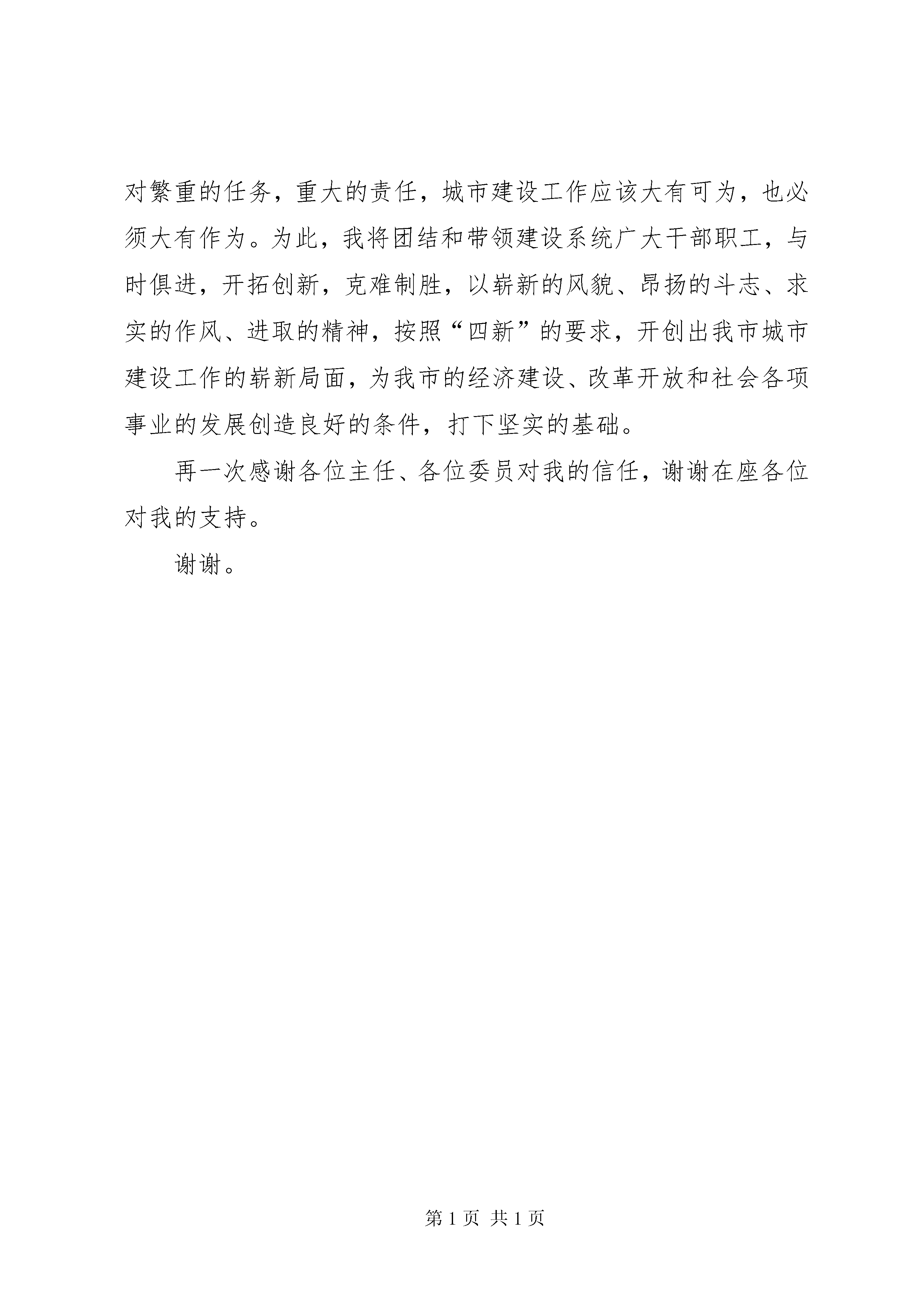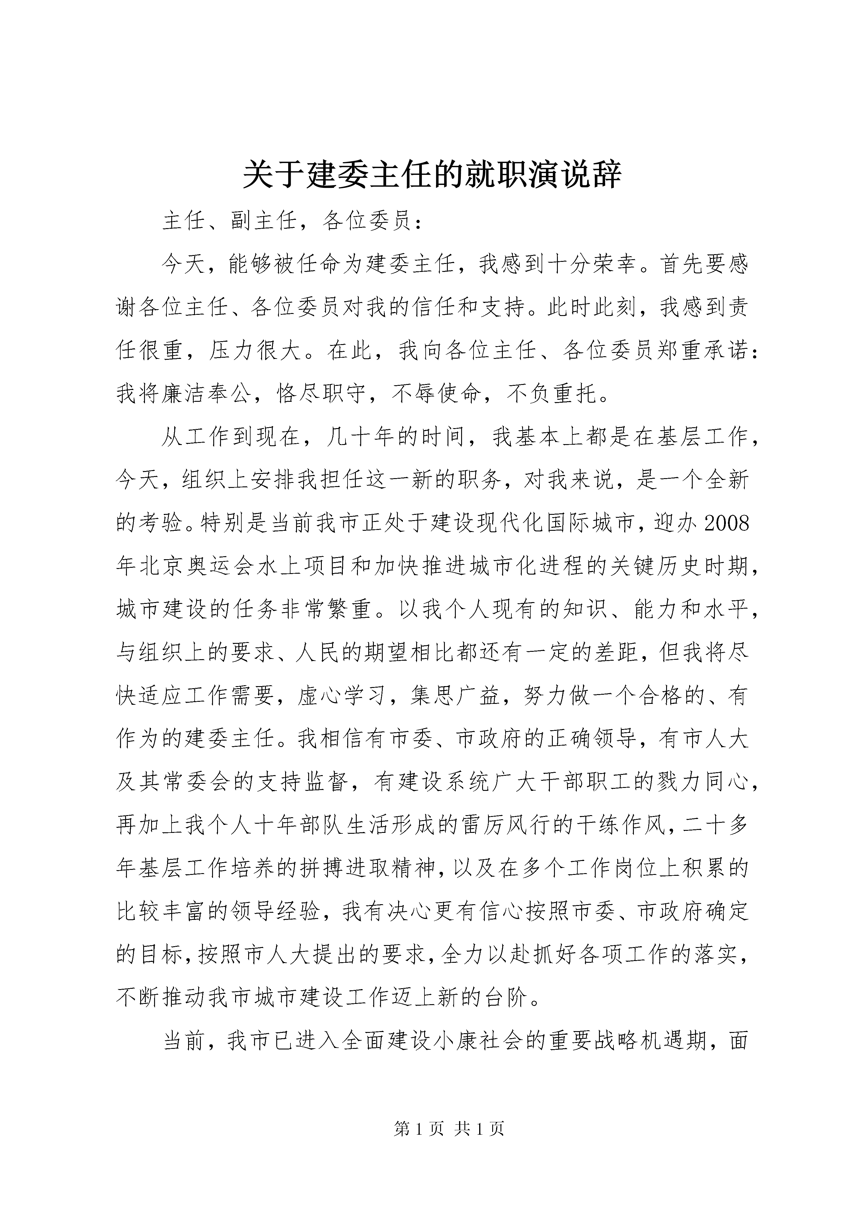 关于建委主任的就职演说辞主任、副主任,各位委员:今天,能够被任命为建委主任,我感到十分荣幸。首先要感谢各位主任、各位委员对我的信任和支持。此时此刻,我感到责任很重,压力很大。在此,我向各位主任、各位委员郑重承诺:我将廉洁奉公,恪尽职守,不辱使命,不负重托。从工作到现在,几十年的时间,我基本上都是在基层工作,今天,组织上安排我担任这一新的职务,对我来说,是一个全新的考验。特别是当前我市正处于建设现代化国际城市,迎办2008年北京奥运会水上项目和加快推进城市化进程的关键历史时期,城市建设的任务非常繁重。以我个人现有的知识、能力和水平,与组织上的要求、人民的期望相比都还有一定的差距,但我将尽快适应工作需要,虚心学习,集思广益,努力做一个合格的、有作为的建委主任。我相信有市委、市政府的正确领导,有市人大及其常委会的支持监督,有建设系统广大干部职工的戮力同心,再加上我个人十年部队生活形成的雷厉风行的干练作风,二十多年基层工作培养的拼搏进取精神,以及在多个工作岗位上积累的比较丰富的领导经验,我有决心更有信心按照市委、市政府确定的目标,按照市人大提出的要求,全力以赴抓好各项工作的落实,不断推动我市城市建设工作迈上新的台阶。当前,我市已进入全面建设小康社会的重要战略机遇期,面对繁重的任务,重大的责任,城市建设工作应该大有可为,也必须大有作为。为此,我将团结和带领建设系统广大干部职工,与时俱进,开拓创新,克难制胜,以崭新的风貌、昂扬的斗志、求实的作风、进取的精神,按照“四新”的要求,开创出我市城市建设工作的崭新局面,为我市的经济建设、改革开放和社会各项事业的发展创造良好的条件,打下坚实的基础。再一次感谢各位主任、各位委员对我的信任,谢谢在座各位对我的支持。谢谢。