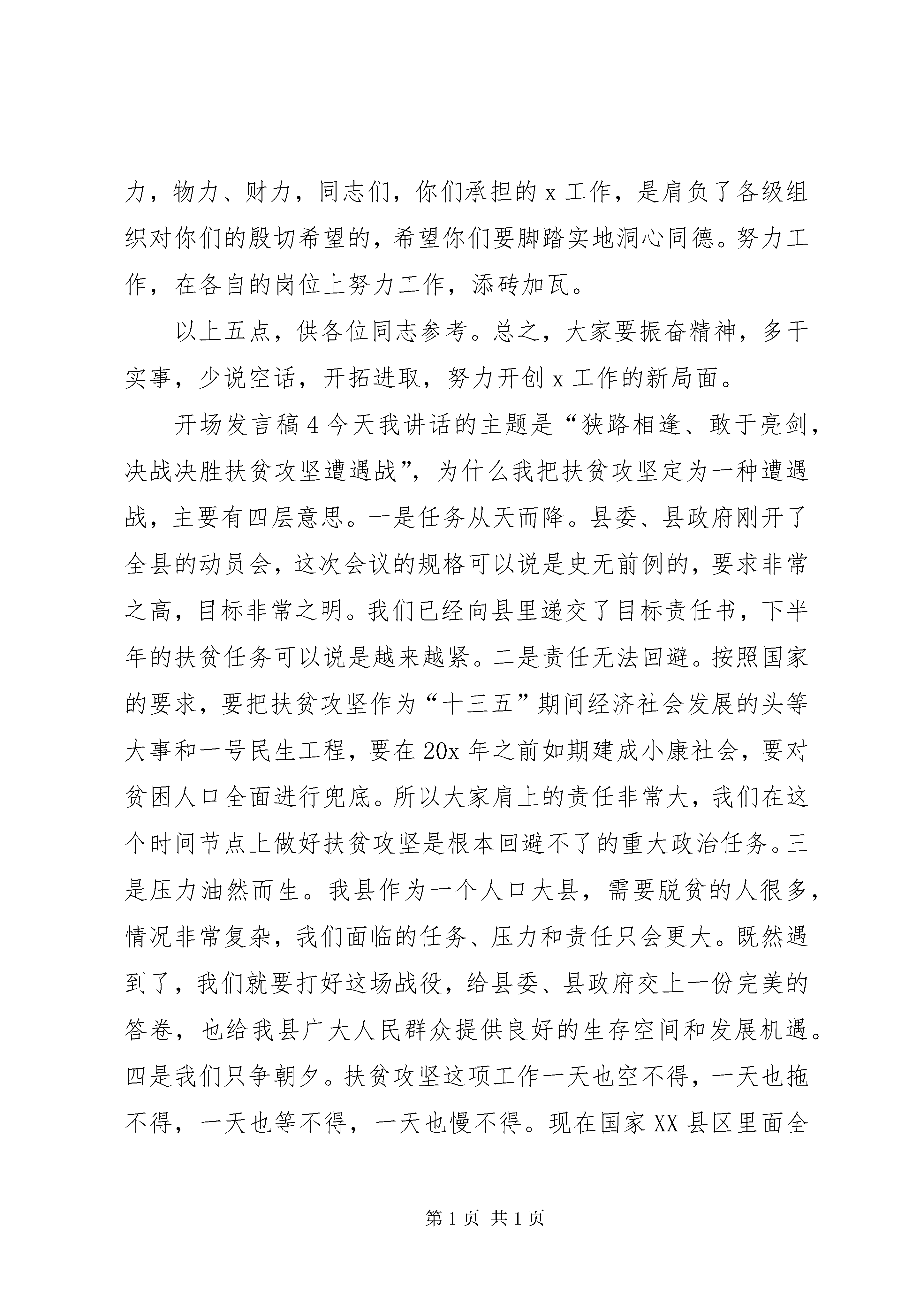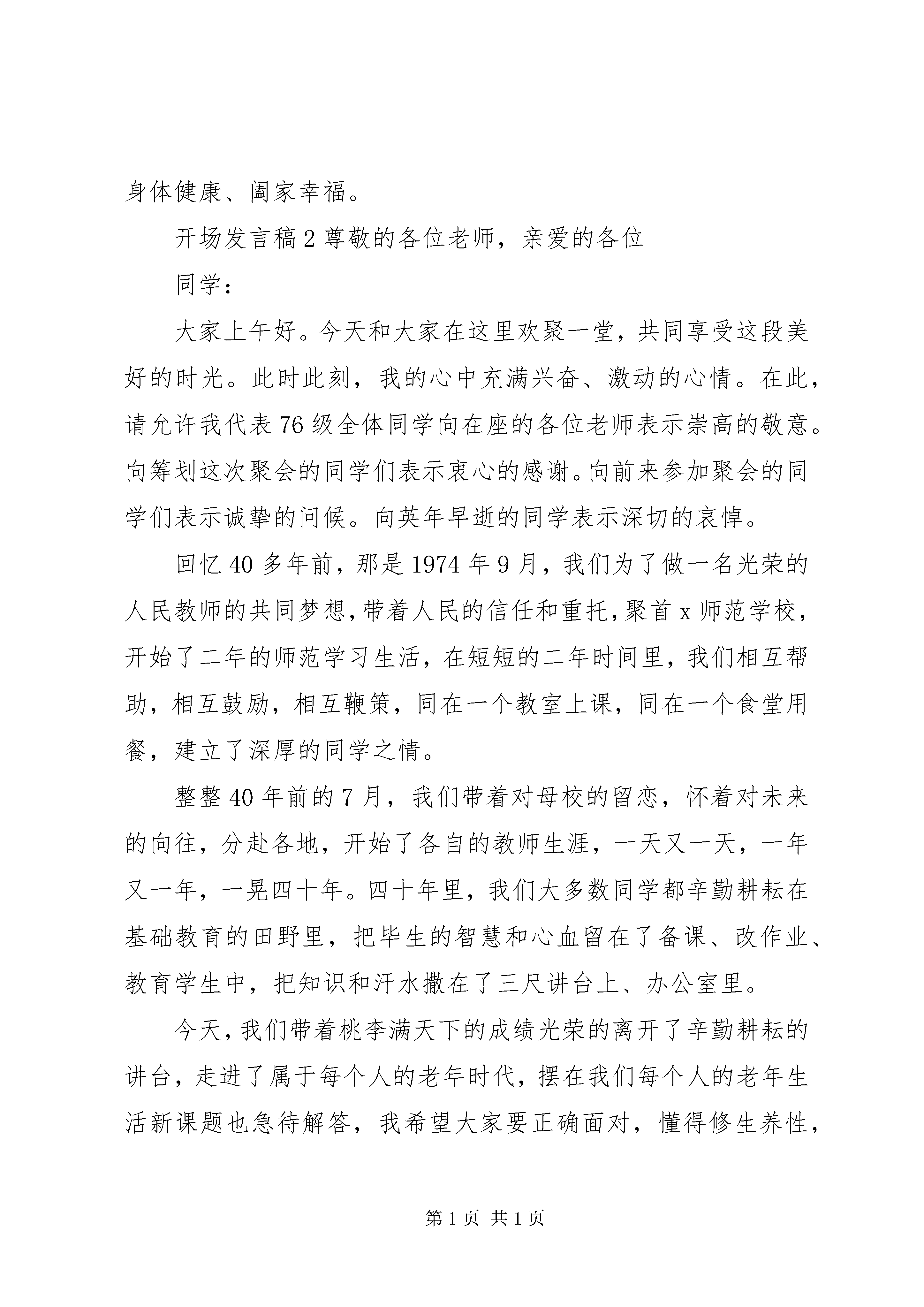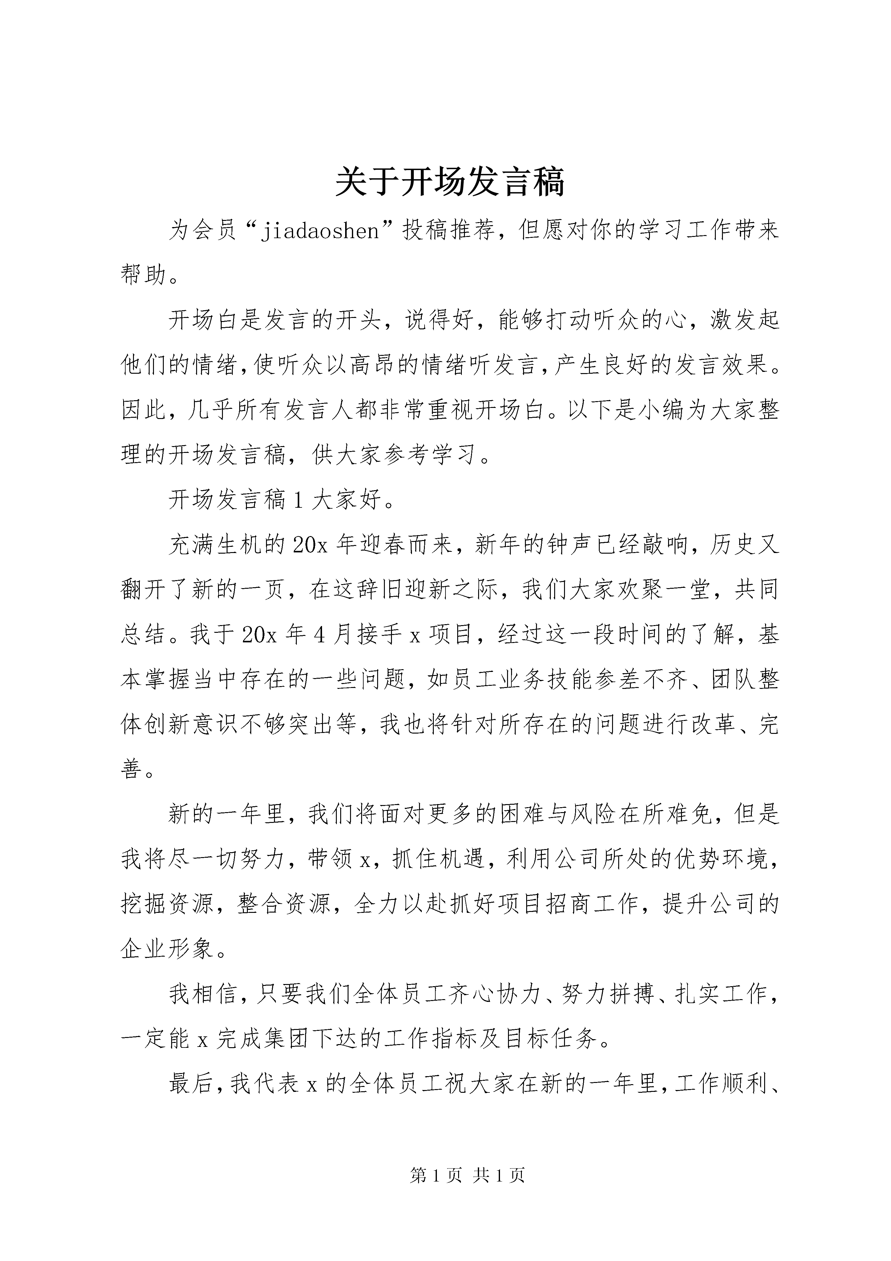 关于开场发言稿为会员“jiadaoshen”投稿推荐,但愿对你的学习工作带来帮助。开场白是发言的开头,说得好,能够打动听众的心,激发起他们的情绪,使听众以高昂的情绪听发言,产生良好的发言效果。因此,几乎所有发言人都非常重视开场白。以下是小编为大家整理的开场发言稿,供大家参考学习。开场发言稿1大家好。充满生机的20x年迎春而来,新年的钟声已经敲响,历史又翻开了新的一页,在这辞旧迎新之际,我们大家欢聚一堂,共同总结。我于20x年4月接手x项目,经过这一段时间的了解,基本掌握当中存在的一些问题,如员工业务技能参差不齐、团队整体创新意识不够突出等,我也将针对所存在的问题进行改革、完善。新的一年里,我们将面对更多的困难与风险在所难免,但是我将尽一切努力,带领x,抓住机遇,利用公司所处的优势环境,挖掘资源,整合资源,全力以赴抓好项目招商工作,提升公司的企业形象。我相信,只要我们全体员工齐心协力、努力拼搏、扎实工作,一定能x完成集团下达的工作指标及目标任务。最后,我代表x的全体员工祝大家在新的一年里,工作顺利、身体健康、阖家幸福。开场发言稿2尊敬的各位老师,亲爱的各位同学:大家上午好。今天和大家在这里欢聚一堂,共同享受这段美好的时光。此时此刻,我的心中充满兴奋、激动的心情。在此,请允许我代表76级全体同学向在座的各位老师表示崇高的敬意。向筹划这次聚会的同学们表示衷心的感谢。向前来参加聚会的同学们表示诚挚的问候。向英年早逝的同学表示深切的哀悼。回忆40多年前,那是1974年9月,我们为了做一名光荣的人民教师的共同梦想,带着人民的信任和重托,聚首x师范学校,开始了二年的师范学习生活,在短短的二年时间里,我们相互帮助,相互鼓励,相互鞭策,同在一个教室上课,同在一个食堂用餐,建立了深厚的同学之情。整整40年前的7月,我们带着对母校的留恋,怀着对未来的向往,分赴各地,开始了各自的教师生涯,一天又一天,一年又一年,一晃四十年。四十年里,我们大多数同学都辛勤耕耘在基础教育的田野里,把毕生的智慧和心血留在了备课、改作业、教育学生中,把知识和汗水撒在了三尺讲台上、办公室里。今天,我们带着桃李满天下的成绩光荣的离开了辛勤耕耘的讲台,走进了属于每个人的老年时代,摆在我们每个人的老年生活新课题也急待解答,我希望大家要正确面对,懂得修生养性,注意锻炼身体,保持心情舒畅,安享晚年天伦之乐。最后,衷心祝愿老师们、同学们身体健康,生活幸福、万事如意。谢谢大家。开场发言稿3同志们:今天,我们在这里召开的x会议,我认为是十分必要的,这对于x工作的开展,具有十分重要的指导意义。对于刚才x,以及x的讲话,我认为,讲得非常好,非常深刻。希望在座的同志,认真领会,深刻理解。回去后,要传达x及x的讲话精神,并认真落实。真抓实干,推动x工作的顺利开展,努力开创x工作新局面。对于x工作,我提几点补充意见:一、对于x工作,我们要从思想上提高认识,充分领会x工作的重要性和必要性。目前,x工作已经开创了很好的局面,获得了很大的成绩,这是有目共睹的。但是,还是要从深度和广度上更加推进x工作。我看,最重要的一点是:提高认识。各级领导要充分领会x工作的重要性和必要性,各级组织要加强关于x工作的宣传力度,形成上下“齐抓共管”的局面,只有这样,x工作才能更上层楼。二、对于x工作,要加强落实,要把工作落到实处。目前,有个别同志、个别部门,存在一个很不好的现象,就是:热衷于搞形式主义,热衷于开大会,传达文件。当然,开大会是必要的,上传下达也是必须的。但是,光是讲空话。打官腔,是远远不够的。对x工作,要真抓实干,加强落实。各级领导要把x工作,列入日常议事日程,要具体部署。认真执行。各级领导要为x工作,创造必要的物质条件和舆论环境,扎扎实实推动x工作的开展。要抓出实效,抓出成绩。三、要加强协调,工作历史证明。团结,是我们消除一切困难的有力武器。关于x工作也一样,各级领导要加强协调工作,要把上下,左右,各方面,各环节有机结合起来,步调一致地推进x工作的开展。目前,有些部门,遇事推倭、互相扯皮,这种官僚作风,十分要不得。这种作风,轻则导致工作效率降低,重则影响我们的威信。我们要坚决铲除这种官僚作风。四、要在实践中探索x工作与市场经济有机结合的新路子。x工作与市场经济有没有关系,我看是大有关系。市场经济是一场深刻的社会变革,它的影响将波及社会生活的每一个领域,x工作也不例外,它必然会受市场经济的影响。因此,如何适应市场经济的要求,如何和市场经济有机结合起来,希望大家认真地思考一下,去探索一下,这是十分有意义的。五、参与x工作的同志,要有自豪感和责任感。同志们,对于x工作,我们是非常重视的,尤其各级组织也投入了大量的人力,物力、财力,同志们,你们承担的x工作,是肩负了各级组织对你们的殷切希望的,