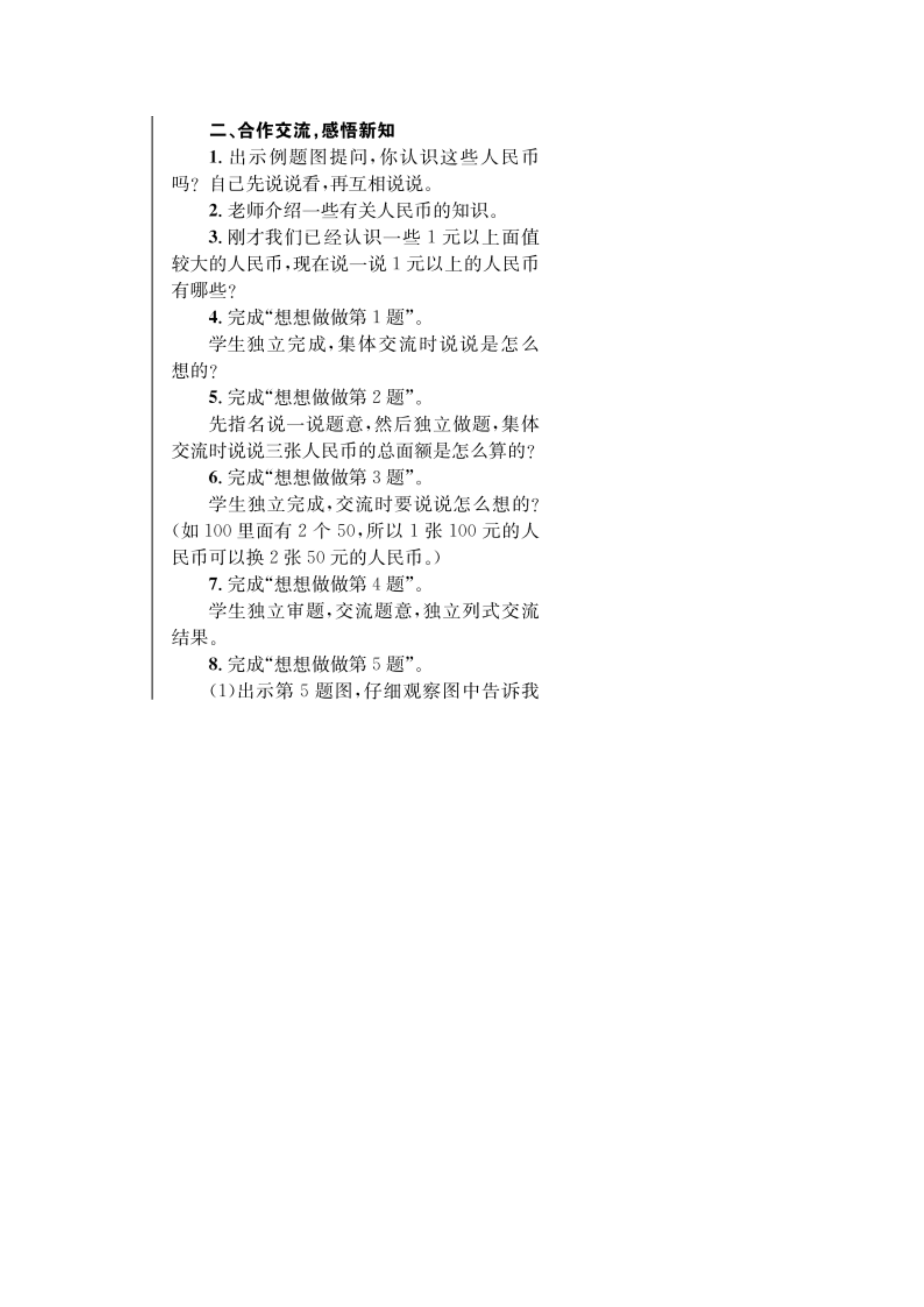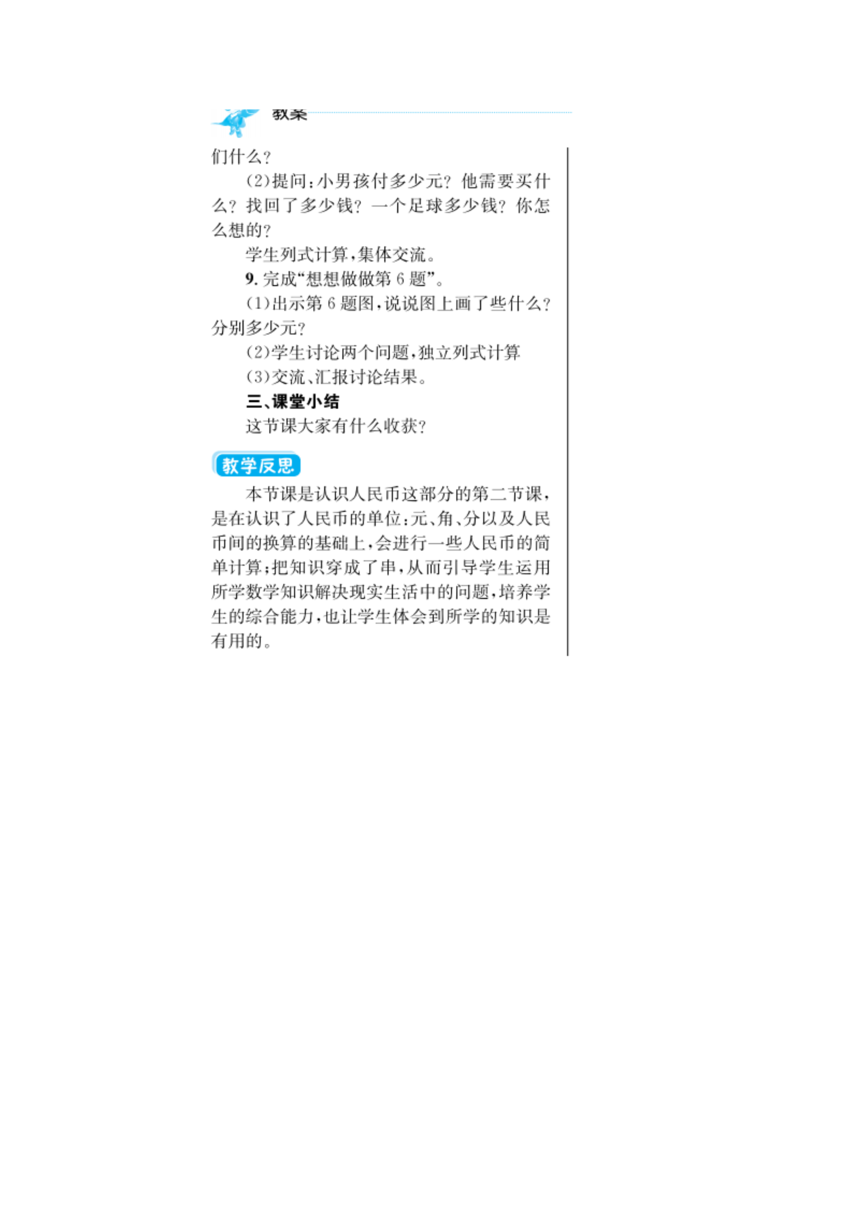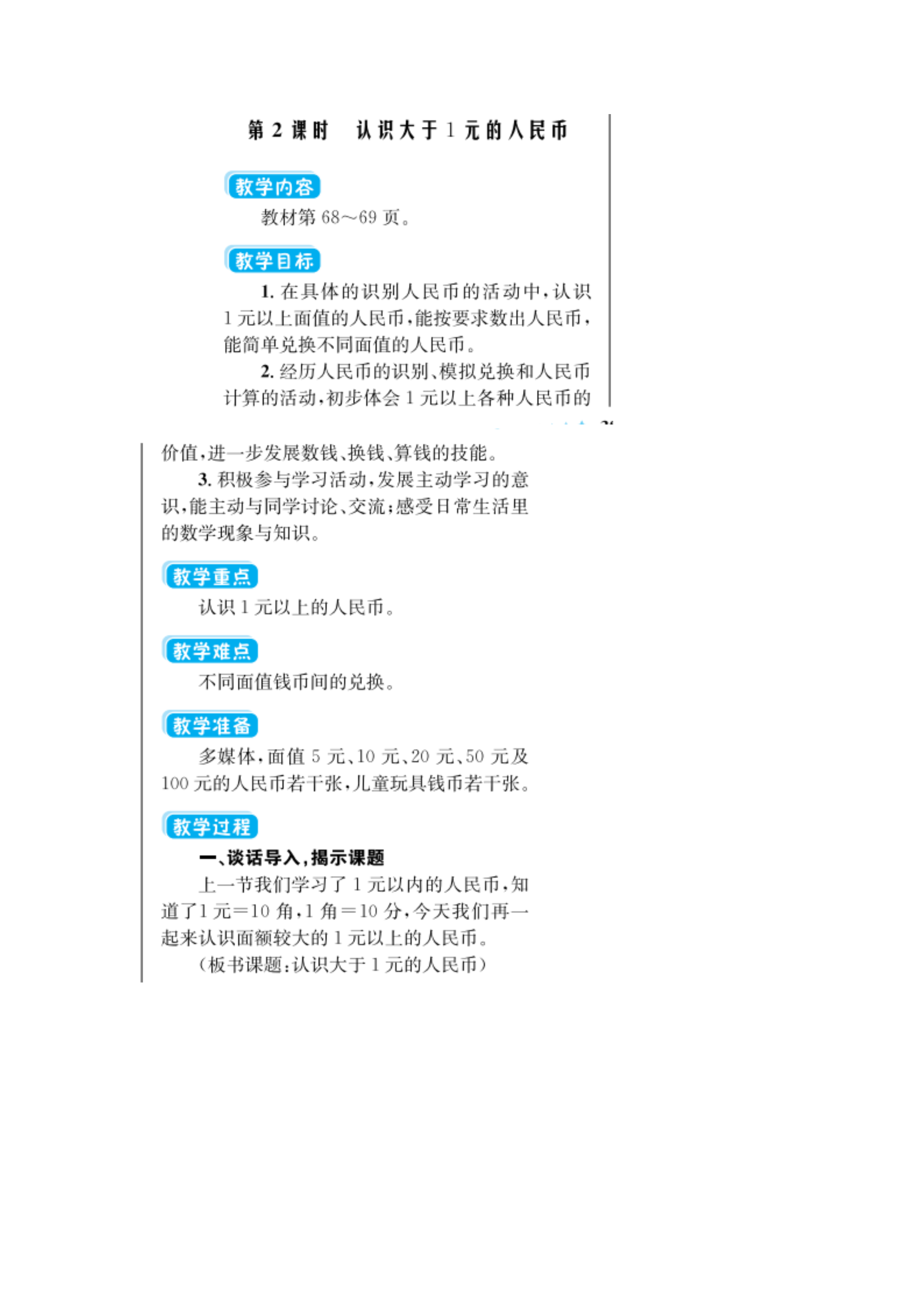 教案-全国-2020_2020春一年级数学下册 五 元、角、分 第2课时 认识大于1元的人民币教案(扫描版) 苏教版