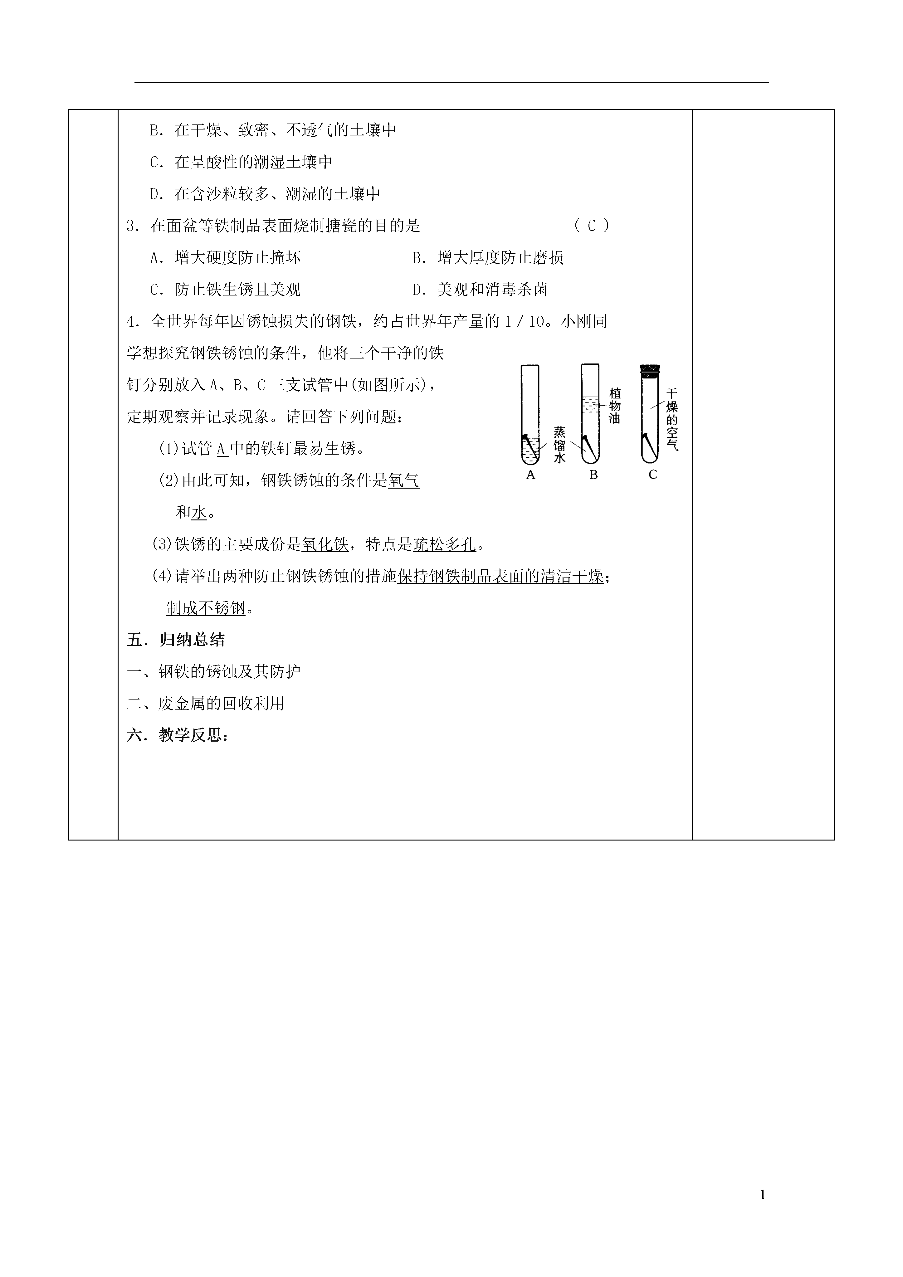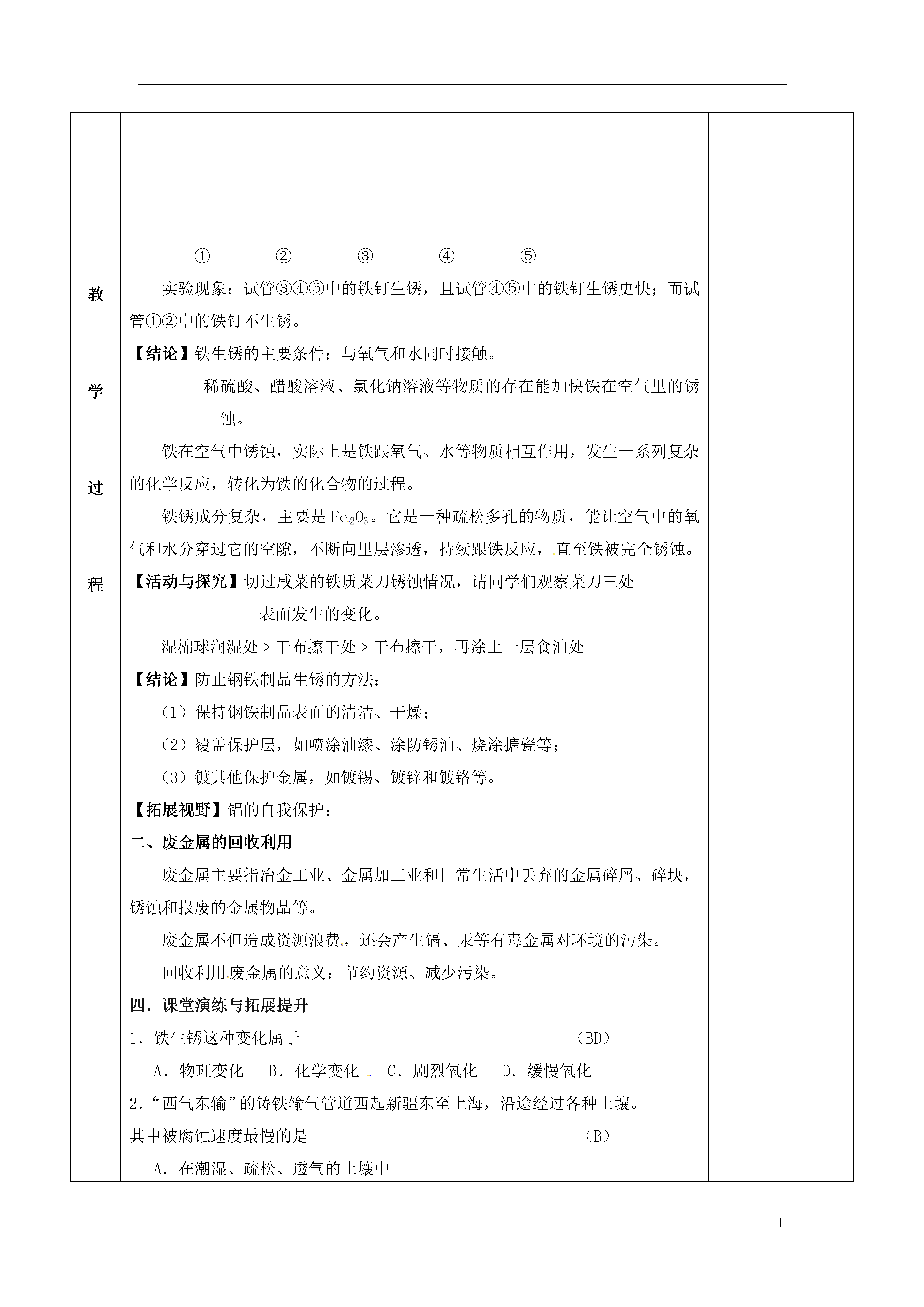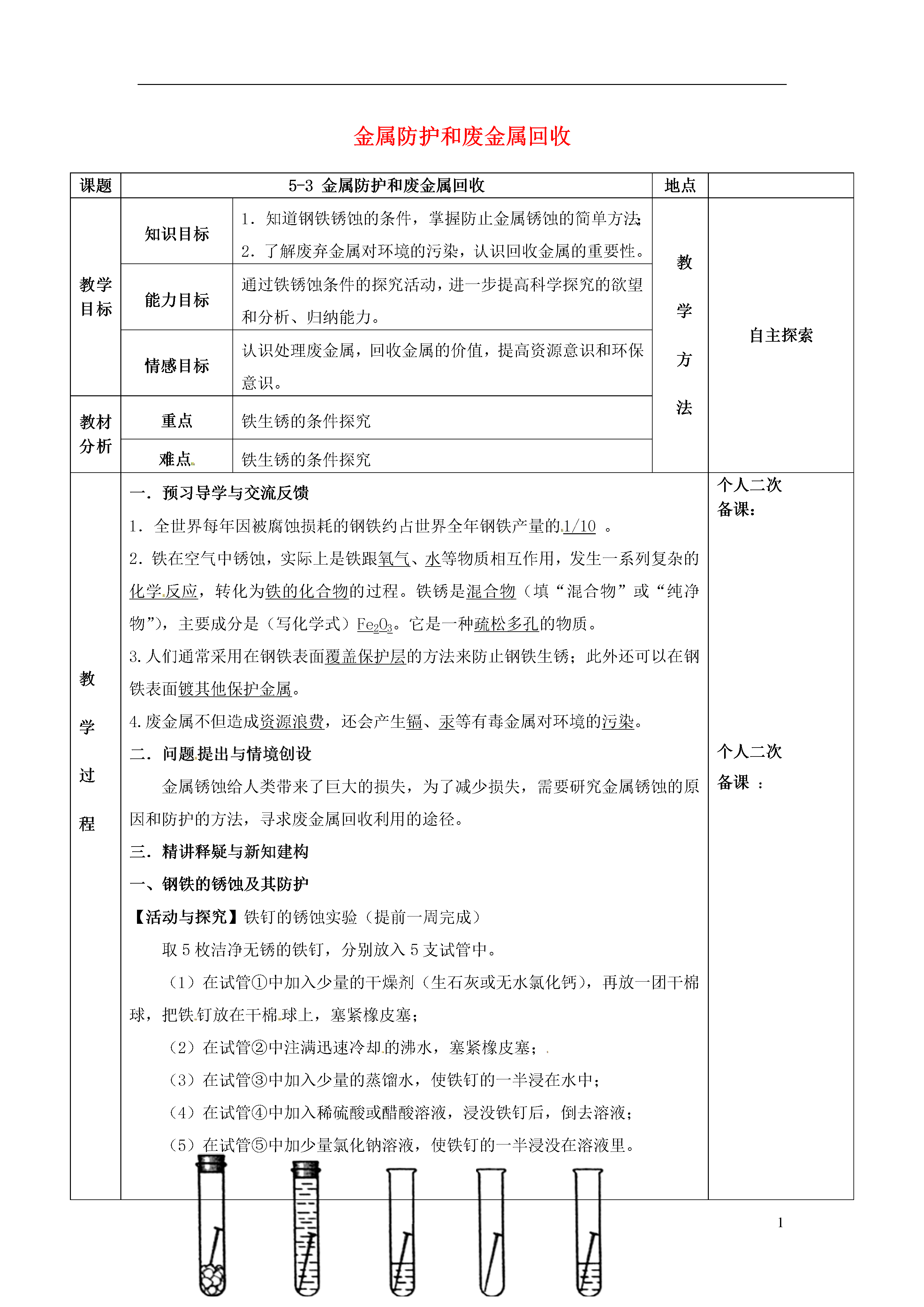 1金属防护和废金属回收课题5-3金属防护和废金属回收地点教学目标知识目标1.知道钢铁锈蚀的条件,掌握防止金属锈蚀的简单方法;2.了解废弃金属对环境的污染,认识回收金属的重要性。教学方法自主探索能力目标通过铁锈蚀条件的探究活动,进一步提高科学探究的欲望和分析、归纳能力。情感目标认识处理废金属,回收金属的价值,提高资源意识和环保意识。教材分析重点铁生锈的条件探究难点铁生锈的条件探究教学过程教学过程一.预习导学与交流反馈1.全世界每年因被腐蚀损耗的钢铁约占世界全年钢铁产量的1/10。2.铁在空气中锈蚀,实际上是铁跟氧气、水等物质相互作用,发生一系列复杂的化学反应,转化为铁的化合物的过程。铁锈是混合物(填“混合物”或“纯净物”),主要成分是(写化学式)Fe2O3。它是一种疏松多孔的物质。3.人们通常采用在钢铁表面覆盖保护层的方法来防止钢铁生锈;此外还可以在钢铁表面镀其他保护金属。4.废金属不但造成资源浪费,还会产生镉、汞等有毒金属对环境的污染。二.问题提出与情境创设金属锈蚀给人类带来了巨大的损失,为了减少损失,需要研究金属锈蚀的原因和防护的方法,寻求废金属回收利用的途径。三.精讲释疑与新知建构一、钢铁的锈蚀及其防护【活动与探究】铁钉的锈蚀实验(提前一周完成)取5枚洁净无锈的铁钉,分别放入5支试管中。(1)在试管①中加入少量的干燥剂(生石灰或无水氯化钙),再放一团干棉球,把铁钉放在干棉球上,塞紧橡皮塞;(2)在试管②中注满迅速冷却的沸水,塞紧橡皮塞;(3)在试管③中加入少量的蒸馏水,使铁钉的一半浸在水中;(4)在试管④中加入稀硫酸或醋酸溶液,浸没铁钉后,倒去溶液;(5)在试管⑤中加少量氯化钠溶液,使铁钉的一半浸没在溶液里。①②③④⑤实验现象:试管③④⑤中的铁钉生锈,且试管④⑤中的铁钉生锈更快;而试管①②中的铁钉不生锈。【结论】铁生锈的主要条件:与氧气和水同时接触。稀硫酸、醋酸溶液、氯化钠溶液等物质的存在能加快铁在空气里的锈蚀。铁在空气中锈蚀,实际上是铁跟氧气、水等物质相互作用,发生一系列复杂的化学反应,转化为铁的化合物的过程。铁锈成分复杂,主要是Fe2O3。它是一种疏松多孔的物质,能让空气中的氧气和水分穿过它的空隙,不断向里层渗透,持续跟铁反应,直至铁被完全锈蚀。【活动与探究】切过咸菜的铁质菜刀锈蚀情况,请同学们观察菜刀三处表面发生的变化。湿棉球润湿处﹥干布擦干处﹥干布擦干,再涂上一层食油处【结论】防止钢铁制品生锈的方法:(1)保持钢铁制品表面的清洁、干燥;(2)覆盖保护层,如喷涂油漆、涂防锈油、烧涂搪瓷等;(3)镀其他保护金属,如镀锡、镀锌和镀铬等。【拓展视野】铝的自我保护:二、废金属的回收利用废金属主要指冶金工业、金属加工业和日常生活中丢弃的金属碎屑、碎块,锈蚀和报废的金属物品等。废金属不但造成资源浪费,还会产生镉、汞等有毒金属对环境的污染。回收利用废金属的意义:节约资源、减少污染。四.课堂演练与拓展提升1.铁生锈这种变化属于(BD)A.物理变化B.化学变化C.剧烈氧化D.缓慢氧化2.“西气东输”的铸铁输气管道西起新疆东至上海,沿途经过各种土壤。其中被腐蚀速度最慢的是(B)A.在潮湿、疏松、透气的土壤中B.在干燥、致密、不透气的土壤中C.在呈酸性的潮湿土壤中D.在含沙粒较多、潮湿的土壤中3.在面盆等铁制品表面烧制搪瓷的目的是(C)A.增大硬度防止撞坏B.增大厚度防止磨损C.防止铁生锈且美观D.美观和消毒杀菌4.全世界每年因锈蚀损失的钢铁,约占世界年产量的1/10。小刚同学想探究钢铁锈蚀的条件,他将三个干净的铁钉分别放入A、B、C三支试管中(如图所示),定期观察并记录现象。请回答下列问题:(1)试管A中的铁钉最易生锈。(2)由此可知,钢铁锈蚀的条件是氧气和水。(3)铁锈的主要成份是氧化铁,特点是疏松多孔。(4)请举出两种防止钢铁锈蚀的措施保持钢铁制品表面的清洁干燥;制成不锈钢。五.归纳总结一、钢铁的锈蚀及其防护二、废金属的回收利用六.教学反思:个人二次备课:个人二次备课: