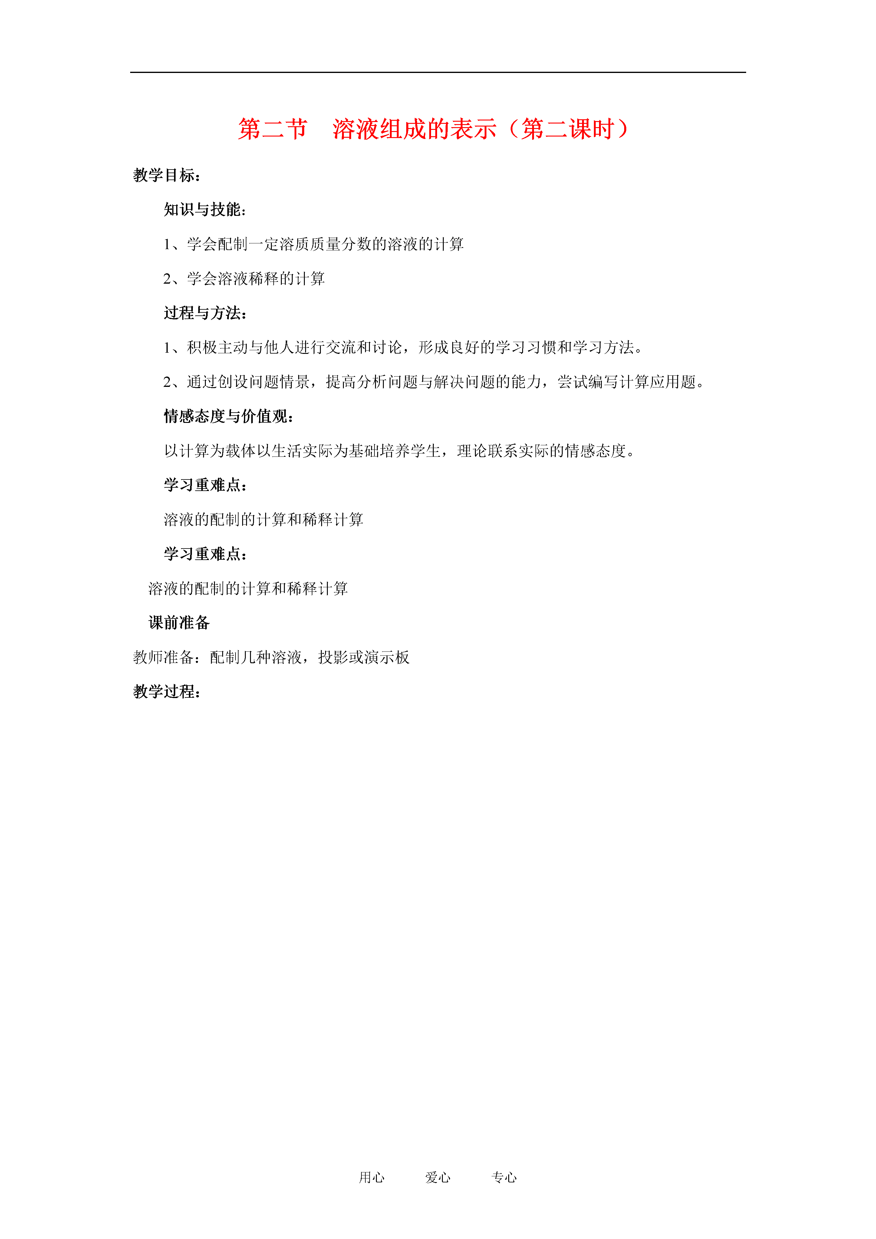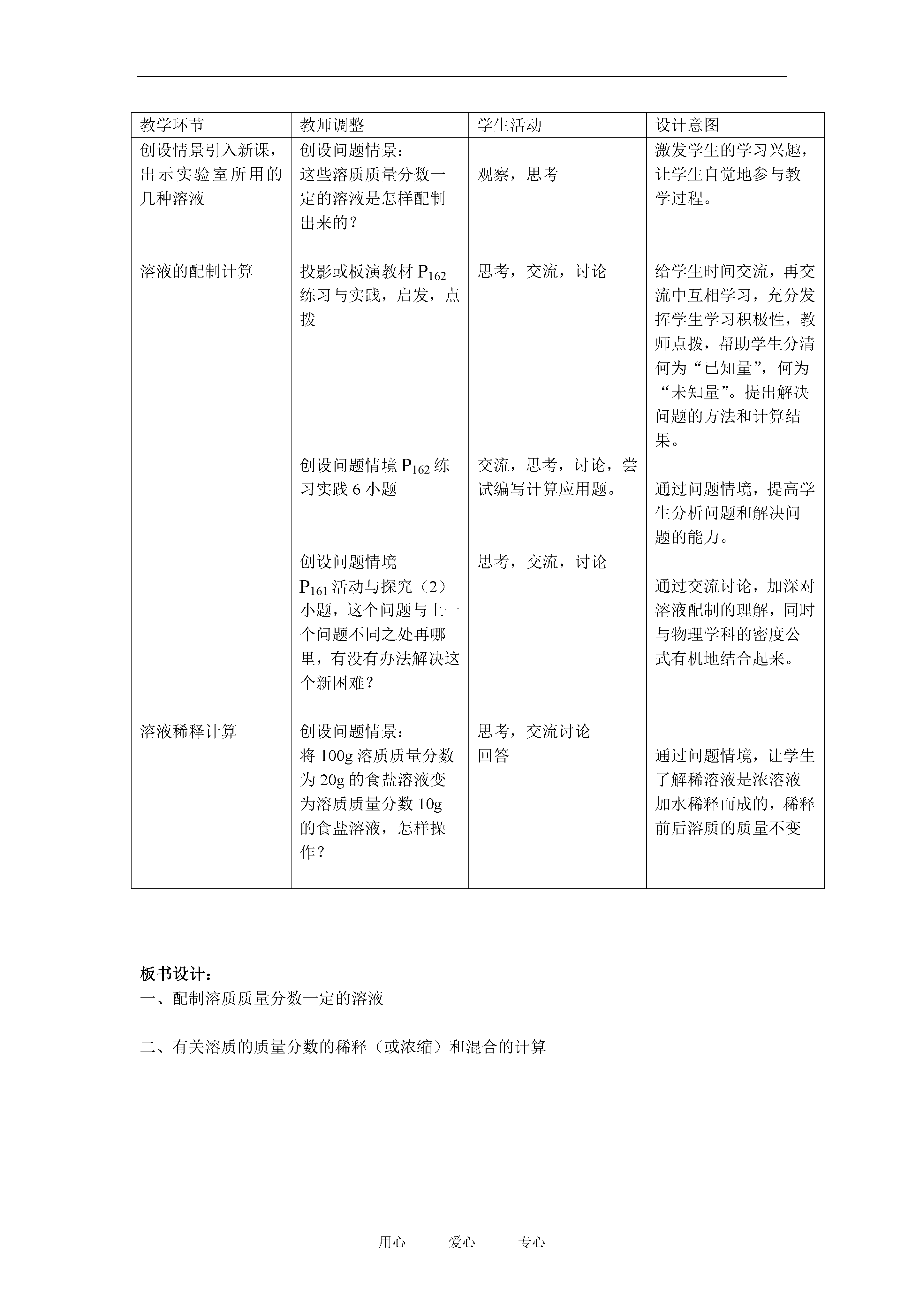 用心爱心专心第二节溶液组成的表示(第二课时)教学目标:知识与技能:1、学会配制一定溶质质量分数的溶液的计算2、学会溶液稀释的计算过程与方法:1、积极主动与他人进行交流和讨论,形成良好的学习习惯和学习方法。2、通过创设问题情景,提高分析问题与解决问题的能力,尝试编写计算应用题。情感态度与价值观:以计算为载体以生活实际为基础培养学生,理论联系实际的情感态度。学习重难点:溶液的配制的计算和稀释计算学习重难点:溶液的配制的计算和稀释计算课前准备教师准备:配制几种溶液,投影或演示板教学过程:教学环节教师调整学生活动设计意图创设情景引入新课,出示实验室所用的几种溶液溶液的配制计算溶液稀释计算创设问题情景:这些溶质质量分数一定的溶液是怎样配制出来的?投影或板演教材P162练习与实践,启发,点拨创设问题情境P162练习实践6小题创设问题情境P161活动与探究(2)小题,这个问题与上一个问题不同之处再哪里,有没有办法解决这个新困难?创设问题情景:将100g溶质质量分数为20g的食盐溶液变为溶质质量分数10g的食盐溶液,怎样操作?观察,思考思考,交流,讨论交流,思考,讨论,尝试编写计算应用题。思考,交流,讨论思考,交流讨论回答激发学生的学习兴趣,让学生自觉地参与教学过程。给学生时间交流,再交流中互相学习,充分发挥学生学习积极性,教师点拨,帮助学生分清何为“已知量”,何为“未知量”。提出解决问题的方法和计算结果。通过问题情境,提高学生分析问题和解决问题的能力。通过交流讨论,加深对溶液配制的理解,同时与物理学科的密度公式有机地结合起来。通过问题情境,让学生了解稀溶液是浓溶液加水稀释而成的,稀释前后溶质的质量不变板书设计:一、配制溶质质量分数一定的溶液二、有关溶质的质量分数的稀释(或浓缩)和混合的计算