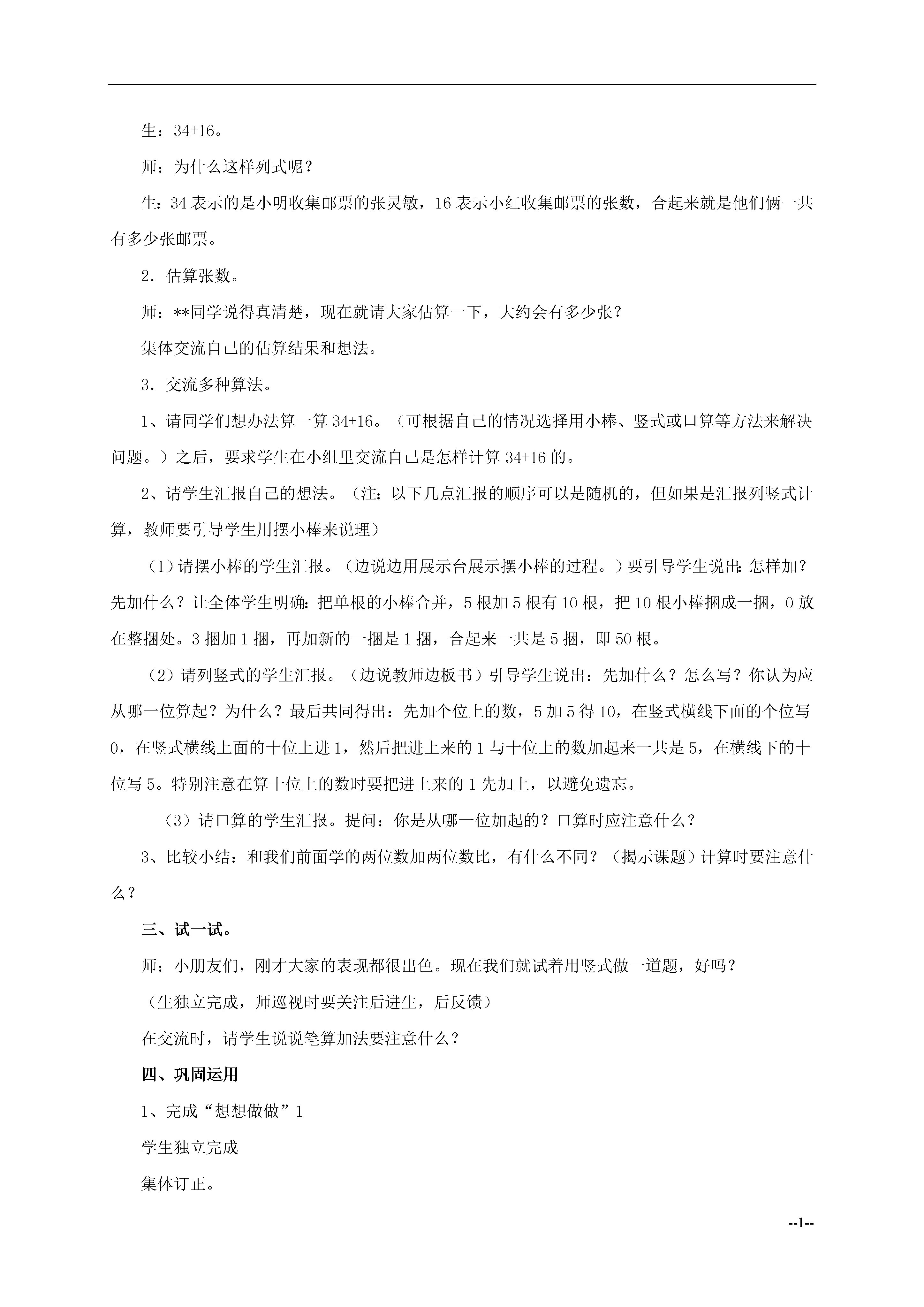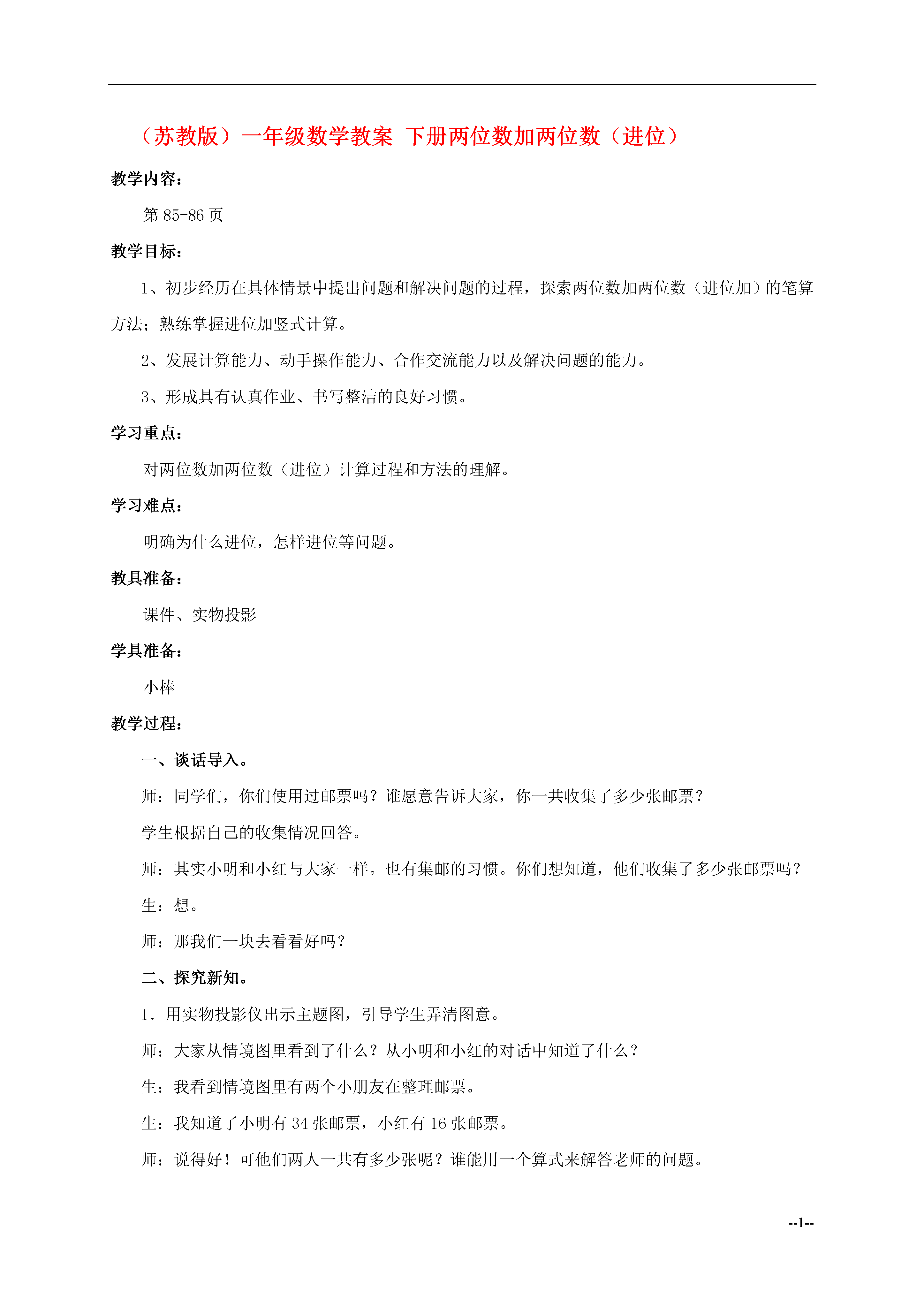 --1--(苏教版)一年级数学教案下册两位数加两位数(进位)教学内容:第85-86页教学目标:1、初步经历在具体情景中提出问题和解决问题的过程,探索两位数加两位数(进位加)的笔算方法;熟练掌握进位加竖式计算。2、发展计算能力、动手操作能力、合作交流能力以及解决问题的能力。3、形成具有认真作业、书写整洁的良好习惯。学习重点:对两位数加两位数(进位)计算过程和方法的理解。学习难点:明确为什么进位,怎样进位等问题。教具准备:课件、实物投影学具准备:小棒教学过程:一、谈话导入。师:同学们,你们使用过邮票吗?谁愿意告诉大家,你一共收集了多少张邮票?学生根据自己的收集情况回答。师:其实小明和小红与大家一样。也有集邮的习惯。你们想知道,他们收集了多少张邮票吗?生:想。师:那我们一块去看看好吗?二、探究新知。1.用实物投影仪出示主题图,引导学生弄清图意。师:大家从情境图里看到了什么?从小明和小红的对话中知道了什么?生:我看到情境图里有两个小朋友在整理邮票。生:我知道了小明有34张邮票,小红有16张邮票。师:说得好!可他们两人一共有多少张呢?谁能用一个算式来解答老师的问题。生:34+16。师:为什么这样列式呢?生:34表示的是小明收集邮票的张灵敏,16表示小红收集邮票的张数,合起来就是他们俩一共有多少张邮票。2.估算张数。师:**同学说得真清楚,现在就请大家估算一下,大约会有多少张?集体交流自己的估算结果和想法。3.交流多种算法。1、请同学们想办法算一算34+16。(可根据自己的情况选择用小棒、竖式或口算等方法来解决问题。)之后,要求学生在小组里交流自己是怎样计算34+16的。2、请学生汇报自己的想法。(注:以下几点汇报的顺序可以是随机的,但如果是汇报列竖式计算,教师要引导学生用摆小棒来说理)(1)请摆小棒的学生汇报。(边说边用展示台展示摆小棒的过程。)要引导学生说出:怎样加?先加什么?让全体学生明确:把单根的小棒合并,5根加5根有10根,把10根小棒捆成一捆,0放在整捆处。3捆加1捆,再加新的一捆是1捆,合起来一共是5捆,即50根。(2)请列竖式的学生汇报。(边说教师边板书)引导学生说出:先加什么?怎么写?你认为应从哪一位算起?为什么?最后共同得出:先加个位上的数,5加5得10,在竖式横线下面的个位写0,在竖式横线上面的十位上进1,然后把进上来的1与十位上的数加起来一共是5,在横线下的十位写5。特别注意在算十位上的数时要把进上来的1先加上,以避免遗忘。(3)请口算的学生汇报。提问:你是从哪一位加起的?口算时应注意什么?3、比较小结:和我们前面学的两位数加两位数比,有什么不同?(揭示课题)计算时要注意什么?三、试一试。师:小朋友们,刚才大家的表现都很出色。现在我们就试着用竖式做一道题,好吗?(生独立完成,师巡视时要关注后进生,后反馈)在交流时,请学生说说笔算加法要注意什么?四、巩固运用1、完成“想想做做”1学生独立完成集体订正。2、完成“想想做做”2在学生计算之前,先请一位小朋友说说,怎样列竖式?学生独立完成,反馈。3、完成“想想做做”3(1)出示题目,弄清题意。从图中你获得了哪些信息?那现在有多少幢呢?你能用一个版式解答这个问题吗?为什么这样列式呢?你们会计算27+23吗?(2)学生独立完成,集体订正。五、课时小结今天我们又在愉快的气氛中学到了很多的知识,小朋友们都来说说,这节课你学会了什么?作业设计:用竖式计算。46+47=38+36=72+19=18+32=48+34=26+25=