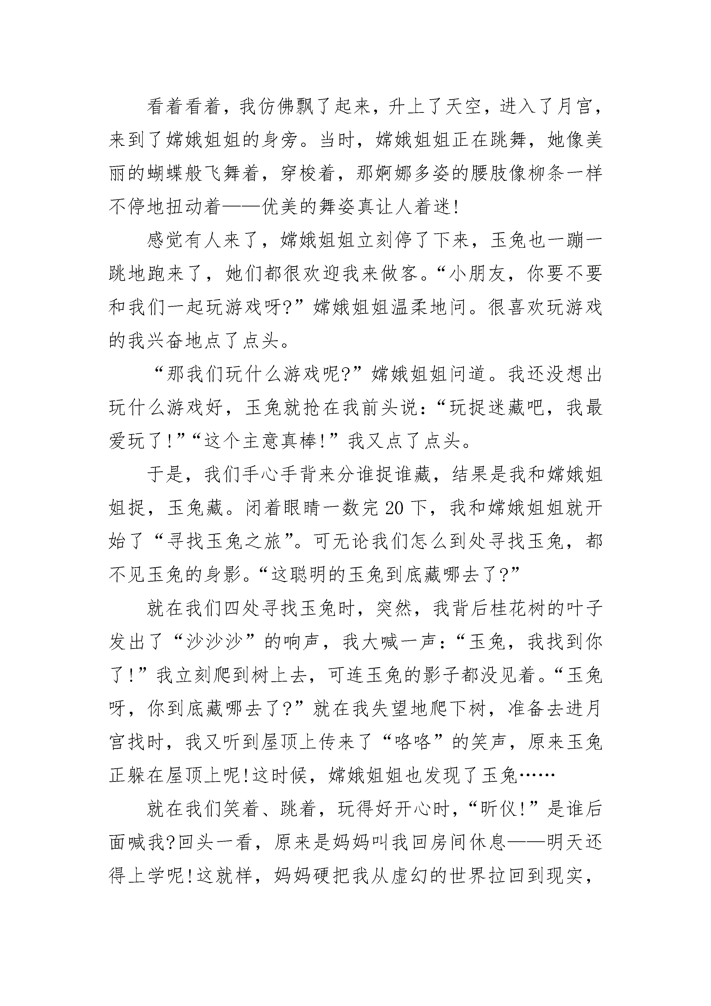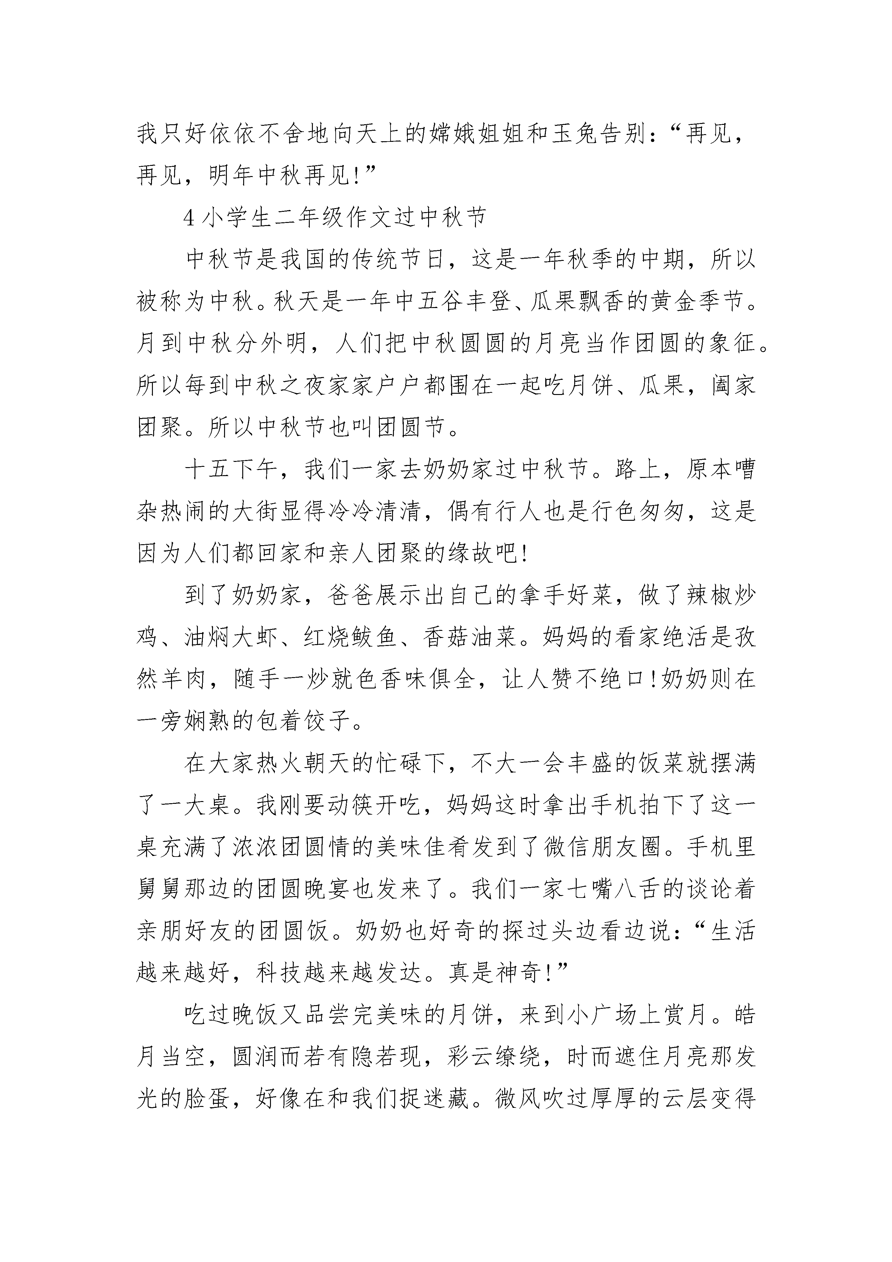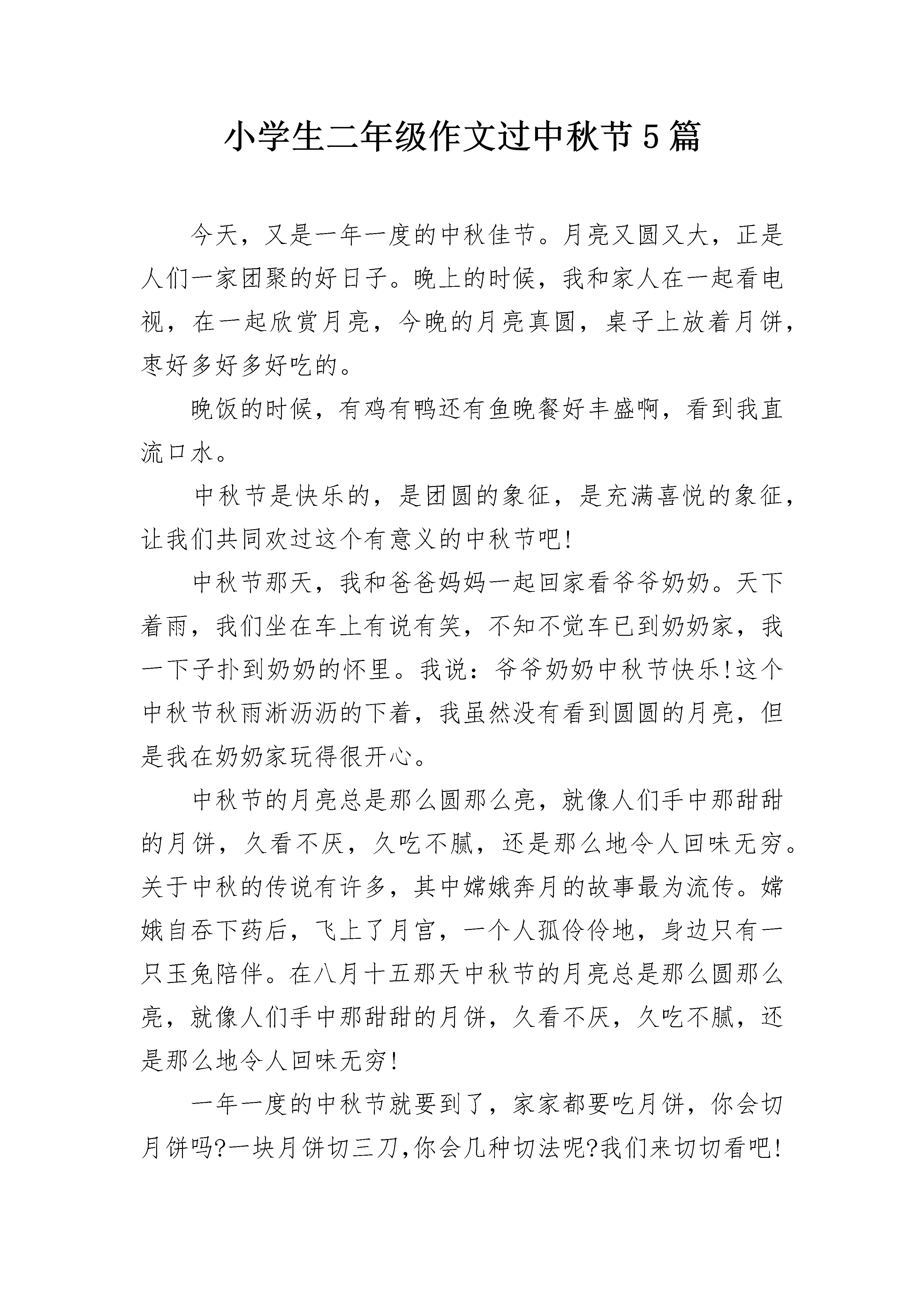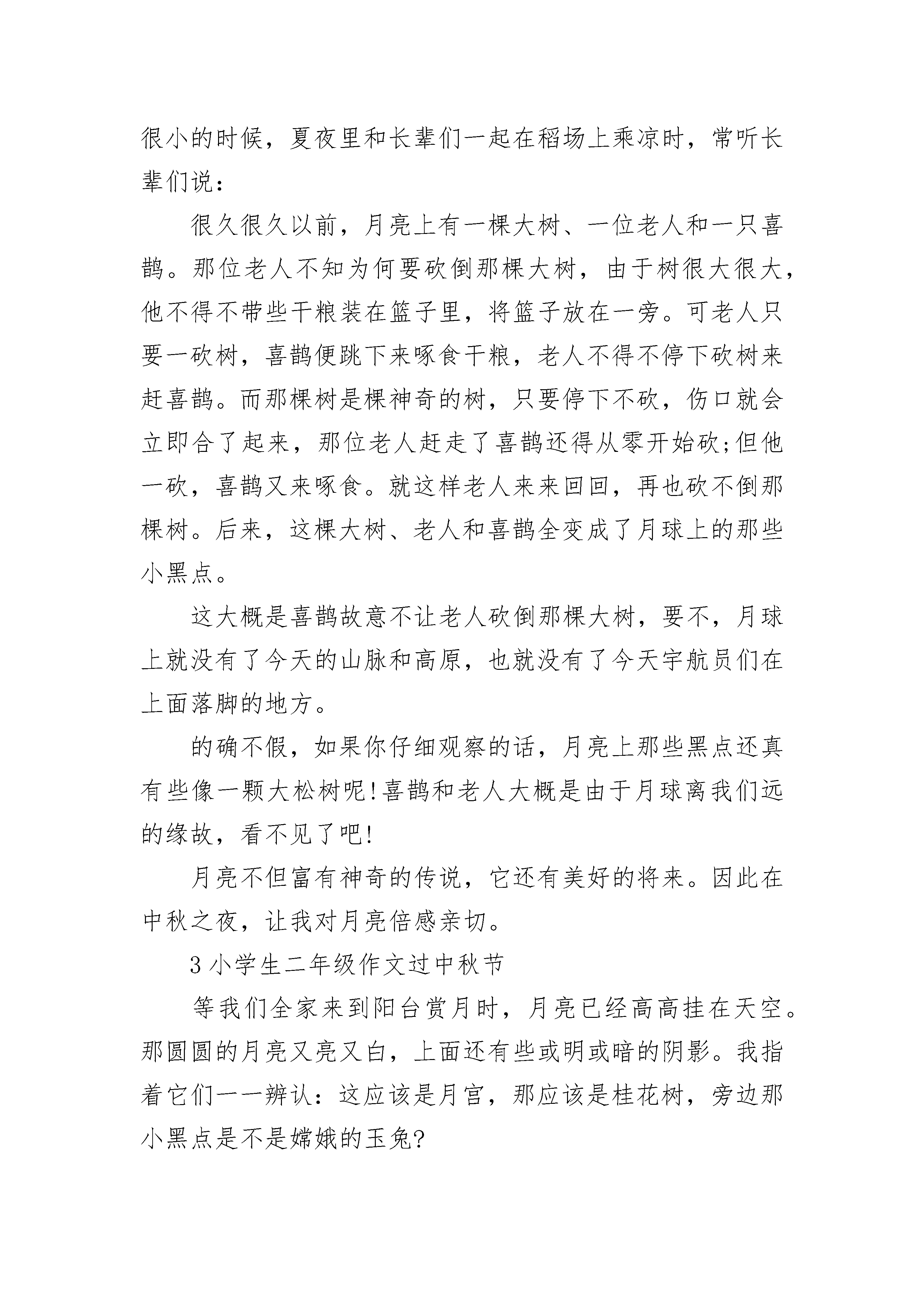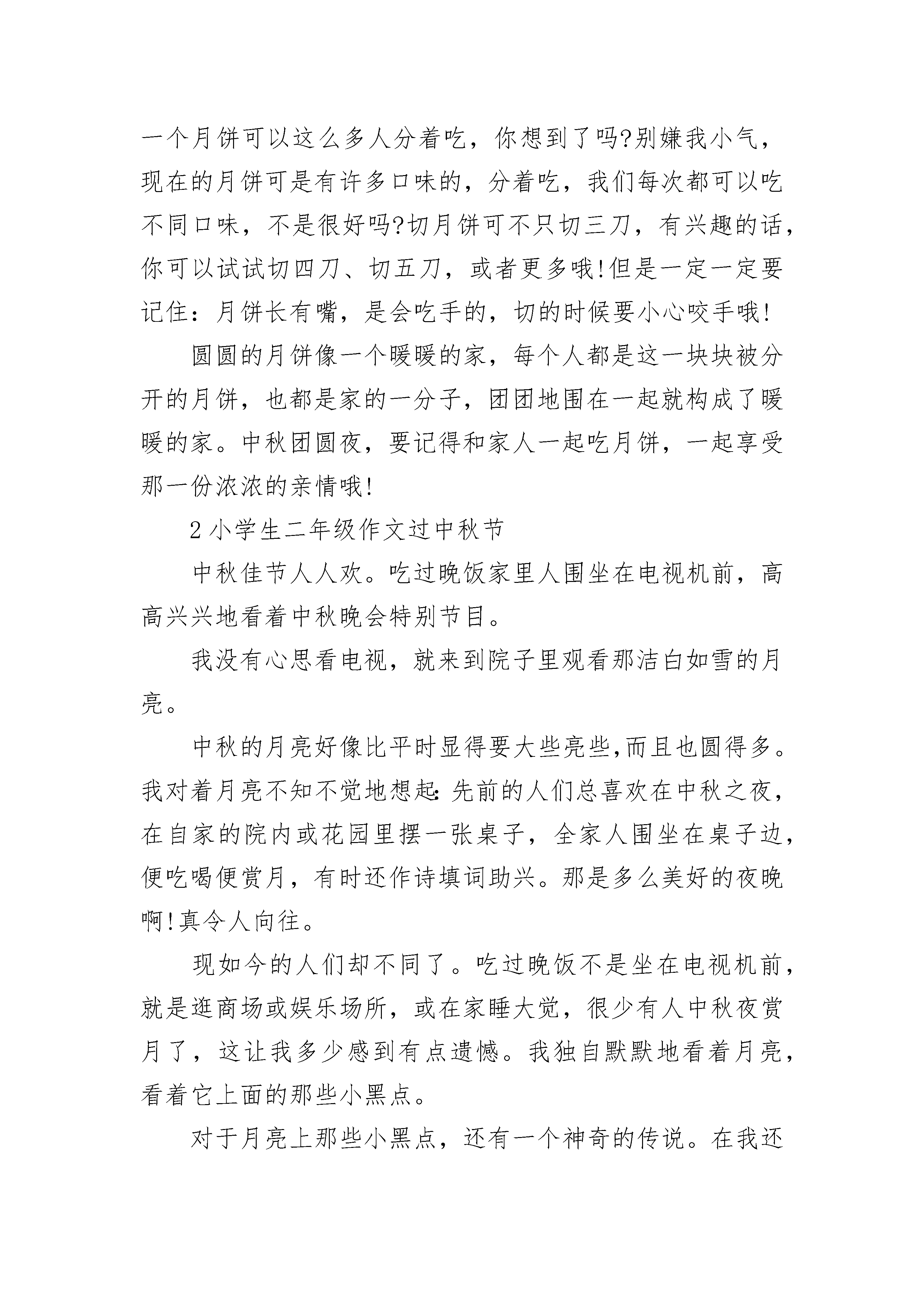 小学生二年级作文过中秋节5篇今天,又是一年一度的中秋佳节。月亮又圆又大,正是人们一家团聚的好日子。晚上的时候,我和家人在一起看电视,在一起欣赏月亮,今晚的月亮真圆,桌子上放着月饼,枣好多好多好吃的。晚饭的时候,有鸡有鸭还有鱼晚餐好丰盛啊,看到我直流口水。中秋节是快乐的,是团圆的象征,是充满喜悦的象征,让我们共同欢过这个有意义的中秋节吧!中秋节那天,我和爸爸妈妈一起回家看爷爷奶奶。天下着雨,我们坐在车上有说有笑,不知不觉车已到奶奶家,我一下子扑到奶奶的怀里。我说:爷爷奶奶中秋节快乐!这个中秋节秋雨淅沥沥的下着,我虽然没有看到圆圆的月亮,但是我在奶奶家玩得很开心。中秋节的月亮总是那么圆那么亮,就像人们手中那甜甜的月饼,久看不厌,久吃不腻,还是那么地令人回味无穷。关于中秋的传说有许多,其中嫦娥奔月的故事最为流传。嫦娥自吞下药后,飞上了月宫,一个人孤伶伶地,身边只有一只玉兔陪伴。在八月十五那天中秋节的月亮总是那么圆那么亮,就像人们手中那甜甜的月饼,久看不厌,久吃不腻,还是那么地令人回味无穷!一年一度的中秋节就要到了,家家都要吃月饼,你会切月饼吗?一块月饼切三刀,你会几种切法呢?我们来切切看吧!一个月饼可以这么多人分着吃,你想到了吗?别嫌我小气,现在的月饼可是有许多口味的,分着吃,我们每次都可以吃不同口味,不是很好吗?切月饼可不只切三刀,有兴趣的话,你可以试试切四刀、切五刀,或者更多哦!但是一定一定要记住:月饼长有嘴,是会吃手的,切的时候要小心咬手哦!圆圆的月饼像一个暖暖的家,每个人都是这一块块被分开的月饼,也都是家的一分子,团团地围在一起就构成了暖暖的家。中秋团圆夜,要记得和家人一起吃月饼,一起享受那一份浓浓的亲情哦!2小学生二年级作文过中秋节中秋佳节人人欢。吃过晚饭家里人围坐在电视机前,高高兴兴地看着中秋晚会特别节目。我没有心思看电视,就来到院子里观看那洁白如雪的月亮。中秋的月亮好像比平时显得要大些亮些,而且也圆得多。我对着月亮不知不觉地想起:先前的人们总喜欢在中秋之夜,在自家的院内或花园里摆一张桌子,全家人围坐在桌子边,便吃喝便赏月,有时还作诗填词助兴。那是多么美好的夜晚啊!真令人向往。现如今的人们却不同了。吃过晚饭不是坐在电视机前,就是逛商场或娱乐场所,或在家睡大觉,很少有人中秋夜赏月了,这让我多少感到有点遗憾。我独自默默地看着月亮,看着它上面的那些小黑点。对于月亮上那些小黑点,还有一个神奇的传说。在我还很小的时候,夏夜里和长辈们一起在稻场上乘凉时,常听长辈们说:很久很久以前,月亮上有一棵大树、一位老人和一只喜鹊。那位老人不知为何要砍倒那棵大树,由于树很大很大,他不得不带些干粮装在篮子里,将篮子放在一旁。可老人只要一砍树,喜鹊便跳下来啄食干粮,老人不得不停下砍树来赶喜鹊。而那棵树是棵神奇的树,只要停下不砍,伤口就会立即合了起来,那位老人赶走了喜鹊还得从零开始砍;但他一砍,喜鹊又来啄食。就这样老人来来回回,再也砍不倒那棵树。后来,这棵大树、老人和喜鹊全变成了月球上的那些小黑点。这大概是喜鹊故意不让老人砍倒那棵大树,要不,月球上就没有了今天的山脉和高原,也就没有了今天宇航员们在上面落脚的地方。的确不假,如果你仔细观察的话,月亮上那些黑点还真有些像一颗大松树呢!喜鹊和老人大概是由于月球离我们远的缘故,看不见了吧!月亮不但富有神奇的传说,它还有美好的将来。因此在中秋之夜,让我对月亮倍感亲切。3小学生二年级作文过中秋节等我们全家来到阳台赏月时,月亮已经高高挂在天空。那圆圆的月亮又亮又白,上面还有些或明或暗的阴影。我指着它们一一辨认:这应该是月宫,那应该是桂花树,旁边那小黑点是不是嫦娥的玉兔?看着看着,我仿佛飘了起来,升上了天空,进入了月宫,来到了嫦娥姐姐的身旁。当时,嫦娥姐姐正在跳舞,她像美丽的蝴蝶般飞舞着,穿梭着,那婀娜多姿的腰肢像柳条一样不停地扭动着——优美的舞姿真让人着迷!感觉有人来了,嫦娥姐姐立刻停了下来,玉兔也一蹦一跳地跑来了,她们都很欢迎我来做客。“小朋友,你要不要和我们一起玩游戏呀?”嫦娥姐姐温柔地问。很喜欢玩游戏的我兴奋地点了点头。“那我们玩什么游戏呢?”嫦娥姐姐问道。我还没想出玩什么游戏好,玉兔就抢在我前头说:“玩捉迷藏吧,我最爱玩了!”“这个主意真棒!”我又点了点头。于是,我们手心手背来分谁捉谁藏,结果是我和嫦娥姐姐捉,玉兔藏。闭着眼睛一数完20下,我和嫦娥姐姐就开始了“寻找玉兔之旅”。可无论我们怎么到处寻找玉兔,都不见玉兔的身影。“这聪明的玉兔到底藏哪去了?”就在我们四处寻找玉兔时,突然,我背后桂花树的叶子发出了“沙沙沙”的响声,我大喊一声:“玉兔,我找到你了!”我立刻爬到树上去,可连玉兔的影子都没见着。“玉兔呀,你到底藏哪去了?”就在我失望地爬下树,准备去进月宫找时,我又听到屋顶上传来了“咯咯”的笑声,原来玉兔