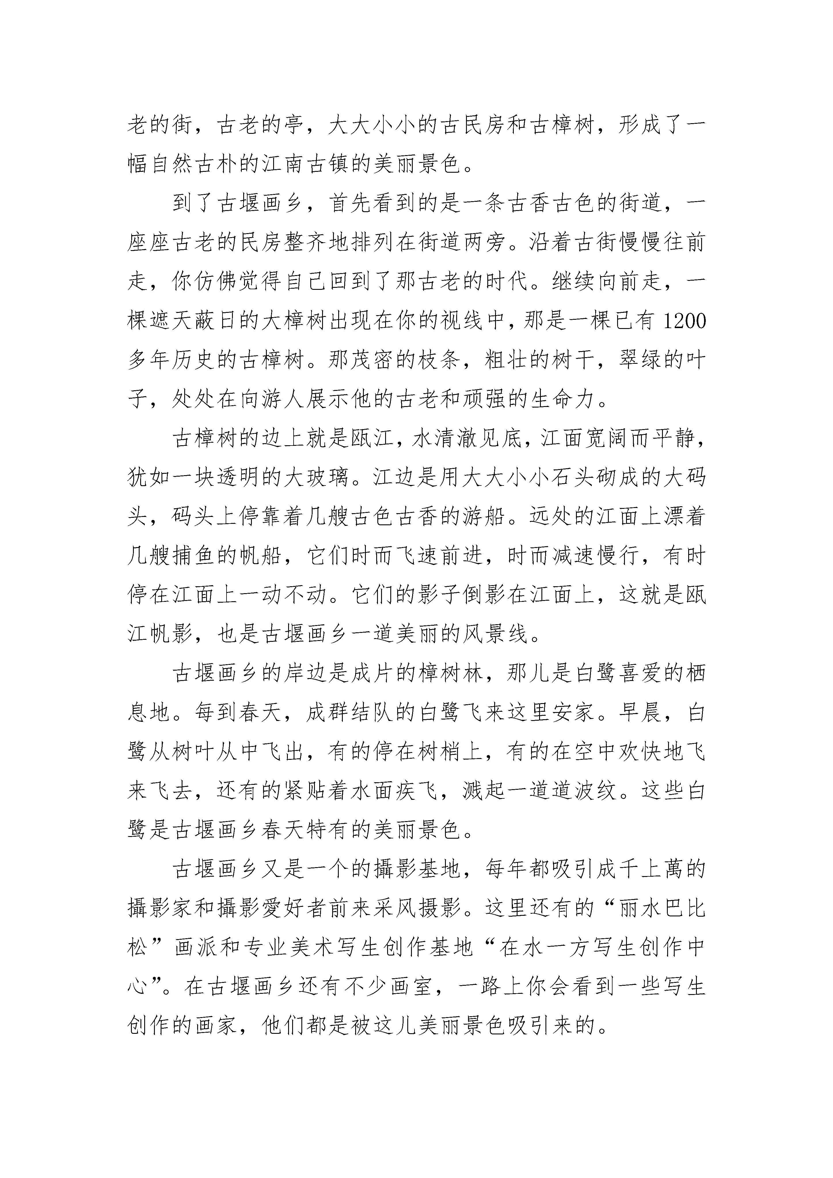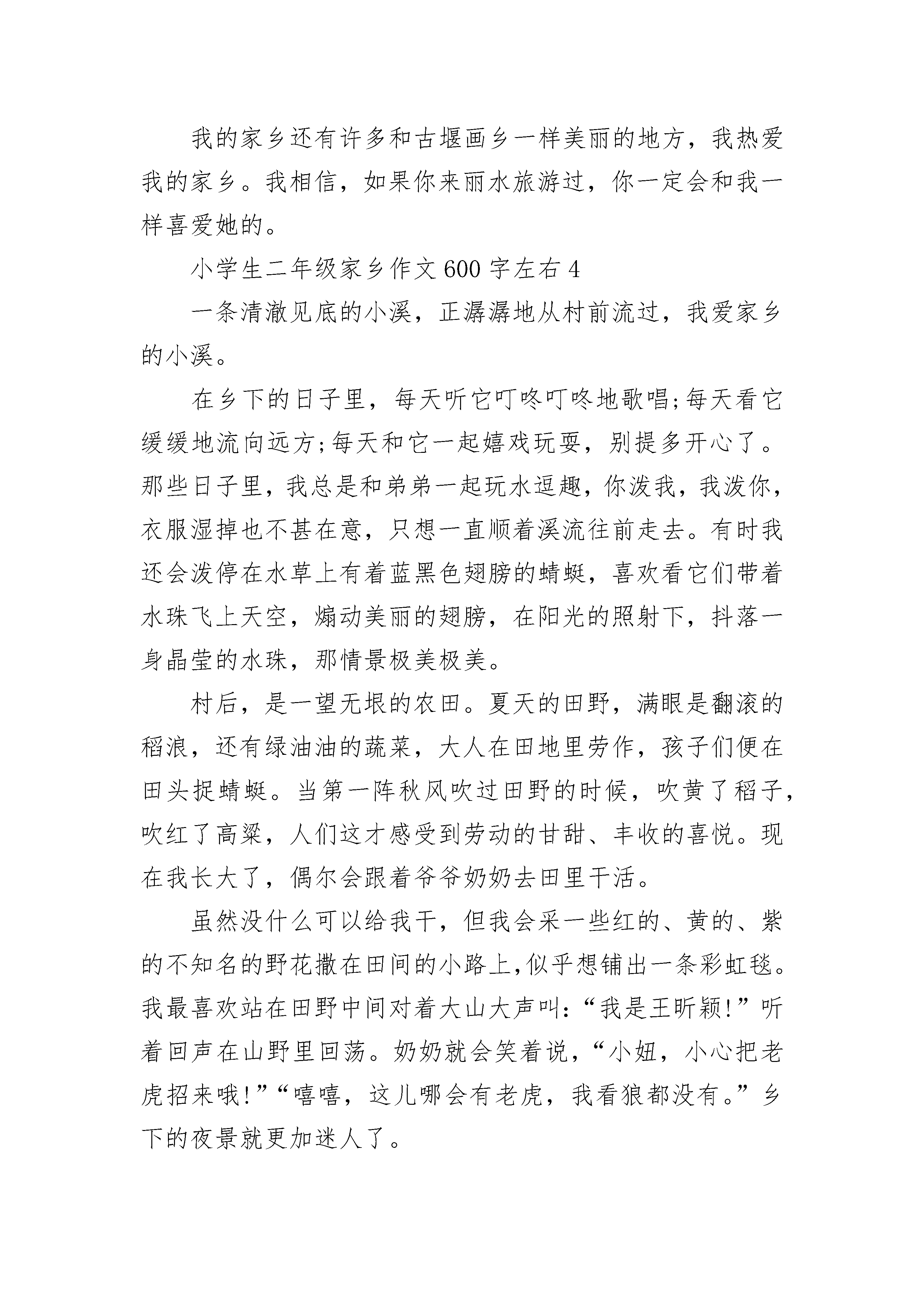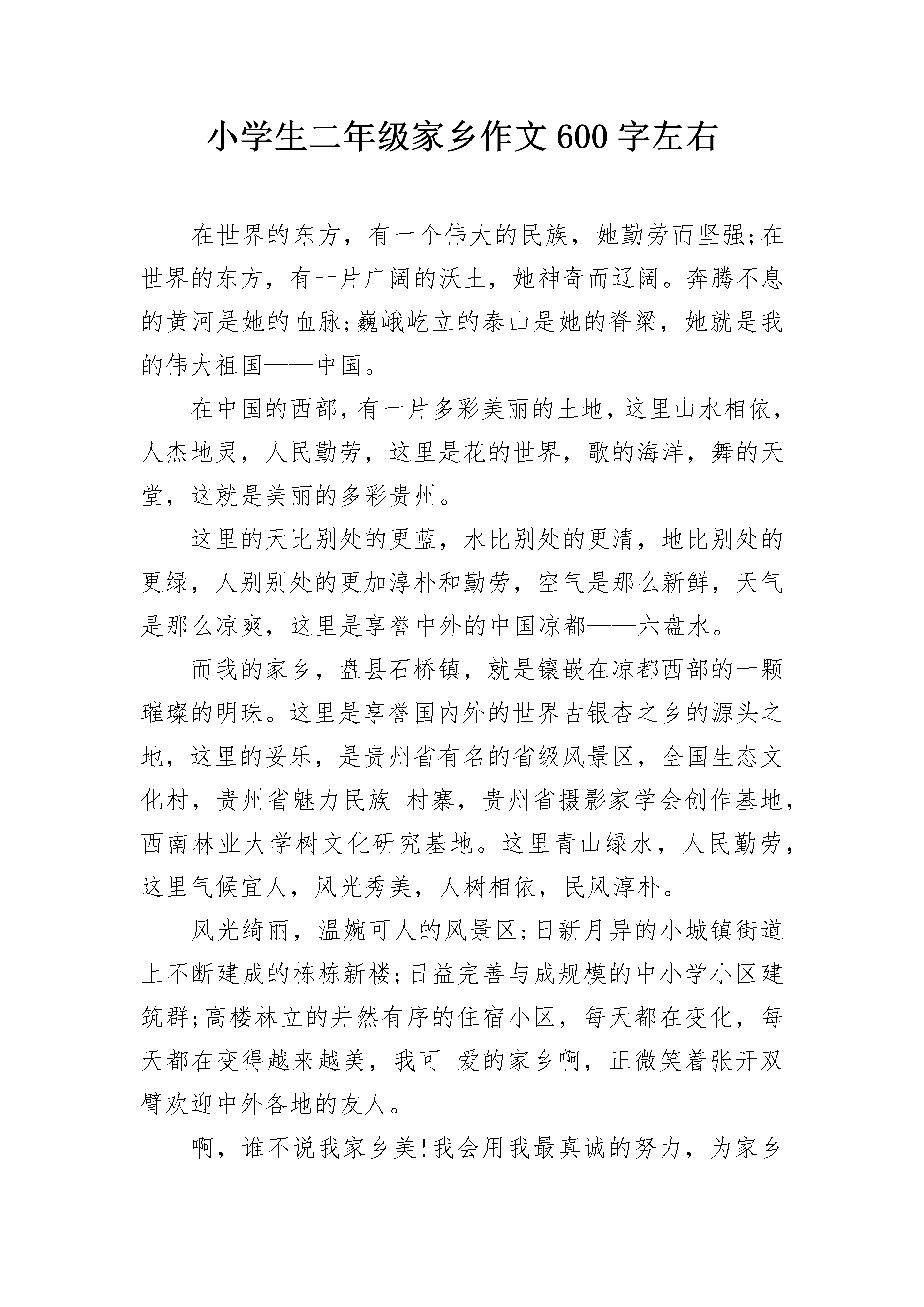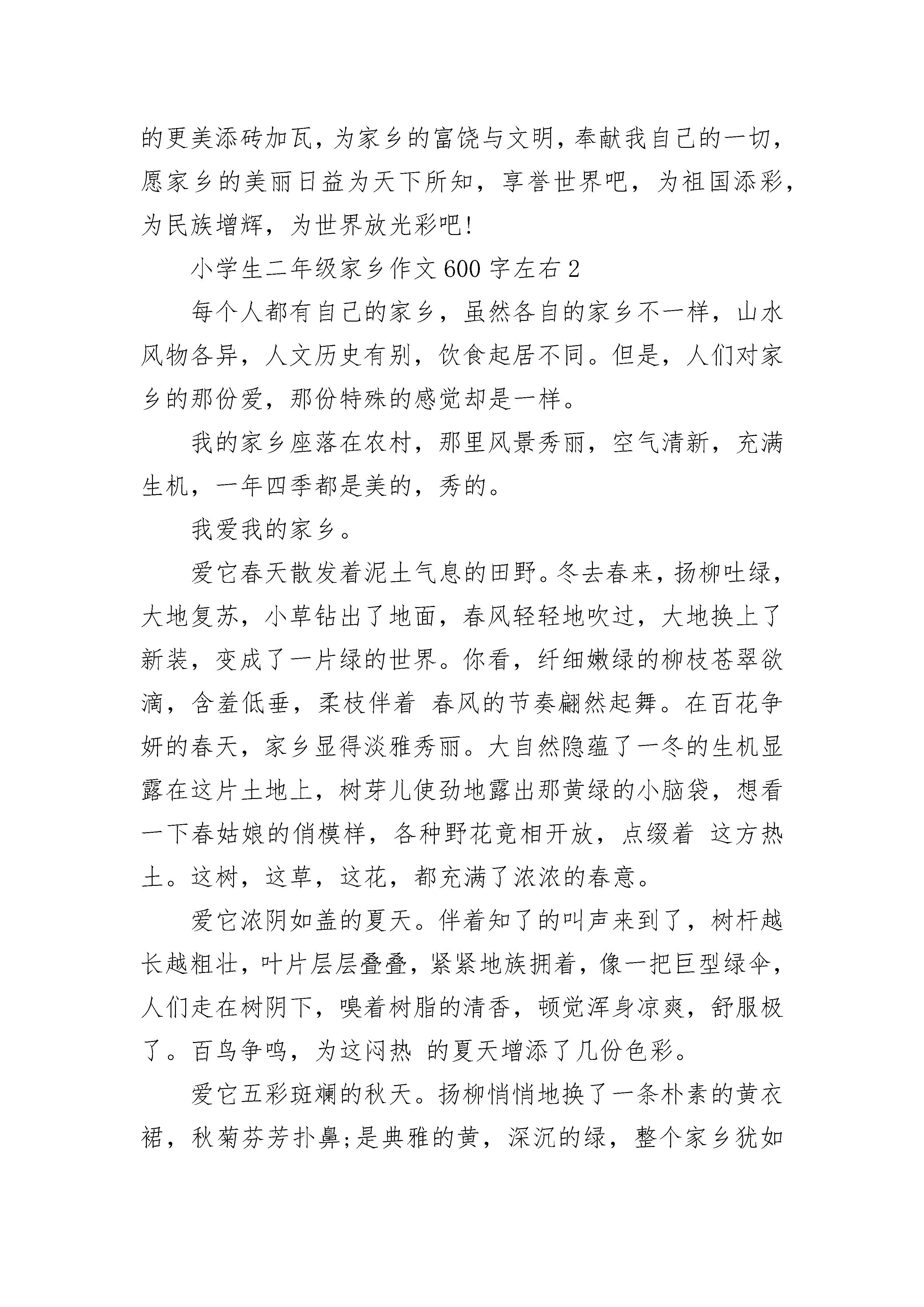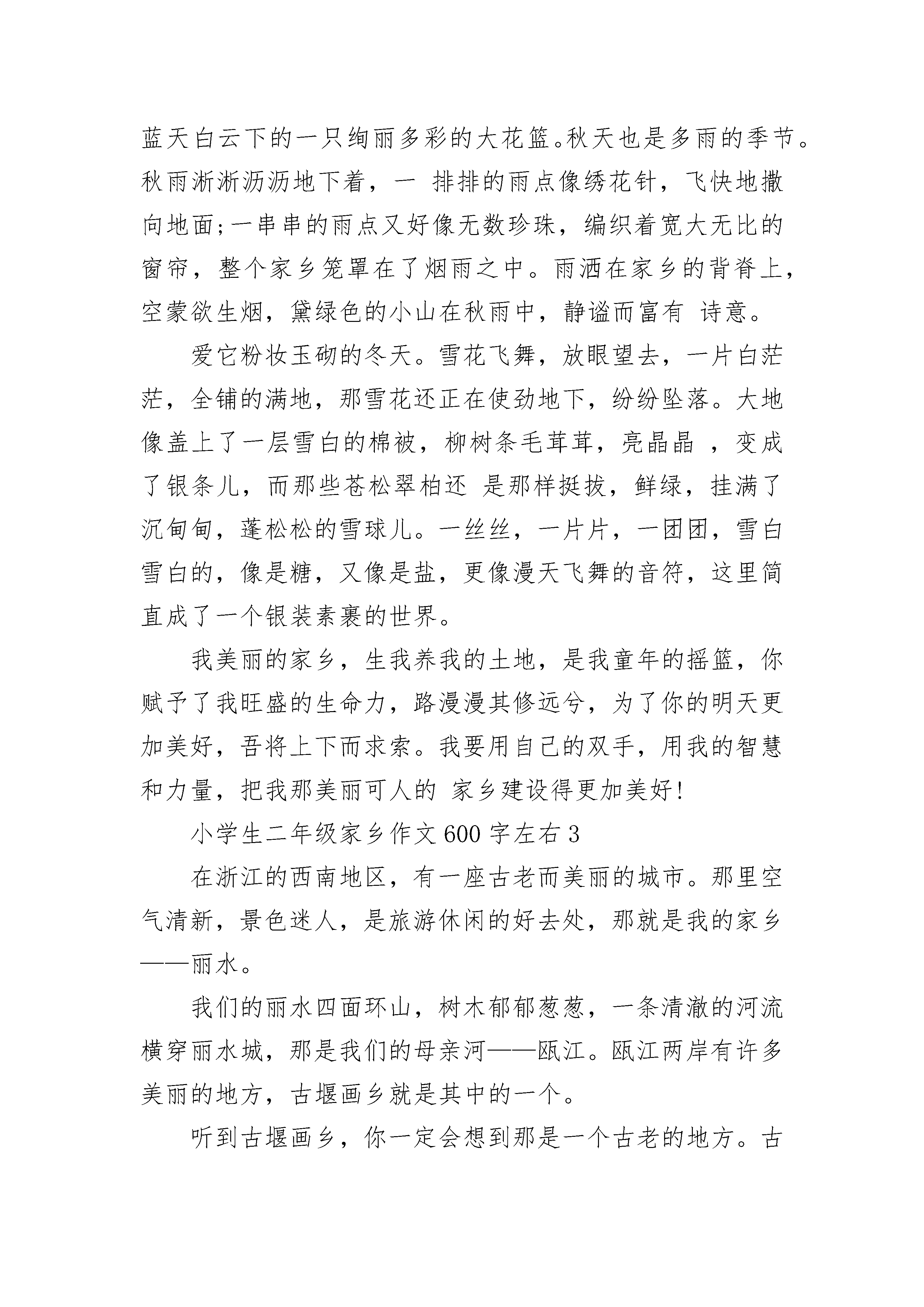 小学生二年级家乡作文600字左右在世界的东方,有一个伟大的民族,她勤劳而坚强;在世界的东方,有一片广阔的沃土,她神奇而辽阔。奔腾不息的黄河是她的血脉;巍峨屹立的泰山是她的脊梁,她就是我的伟大祖国——中国。在中国的西部,有一片多彩美丽的土地,这里山水相依,人杰地灵,人民勤劳,这里是花的世界,歌的海洋,舞的天堂,这就是美丽的多彩贵州。这里的天比别处的更蓝,水比别处的更清,地比别处的更绿,人别别处的更加淳朴和勤劳,空气是那么新鲜,天气是那么凉爽,这里是享誉中外的中国凉都——六盘水。而我的家乡,盘县石桥镇,就是镶嵌在凉都西部的一颗璀璨的明珠。这里是享誉国内外的世界古银杏之乡的源头之地,这里的妥乐,是贵州省有名的省级风景区,全国生态文化村,贵州省魅力民族村寨,贵州省摄影家学会创作基地,西南林业大学树文化研究基地。这里青山绿水,人民勤劳,这里气候宜人,风光秀美,人树相依,民风淳朴。风光绮丽,温婉可人的风景区;日新月异的小城镇街道上不断建成的栋栋新楼;日益完善与成规模的中小学小区建筑群;高楼林立的井然有序的住宿小区,每天都在变化,每天都在变得越来越美,我可爱的家乡啊,正微笑着张开双臂欢迎中外各地的友人。啊,谁不说我家乡美!我会用我最真诚的努力,为家乡的更美添砖加瓦,为家乡的富饶与文明,奉献我自己的一切,愿家乡的美丽日益为天下所知,享誉世界吧,为祖国添彩,为民族增辉,为世界放光彩吧!小学生二年级家乡作文600字左右2每个人都有自己的家乡,虽然各自的家乡不一样,山水风物各异,人文历史有别,饮食起居不同。但是,人们对家乡的那份爱,那份特殊的感觉却是一样。我的家乡座落在农村,那里风景秀丽,空气清新,充满生机,一年四季都是美的,秀的。我爱我的家乡。爱它春天散发着泥土气息的田野。冬去春来,扬柳吐绿,大地复苏,小草钻出了地面,春风轻轻地吹过,大地换上了新装,变成了一片绿的世界。你看,纤细嫩绿的柳枝苍翠欲滴,含羞低垂,柔枝伴着春风的节奏翩然起舞。在百花争妍的春天,家乡显得淡雅秀丽。大自然隐蕴了一冬的生机显露在这片土地上,树芽儿使劲地露出那黄绿的小脑袋,想看一下春姑娘的俏模样,各种野花竟相开放,点缀着这方热土。这树,这草,这花,都充满了浓浓的春意。爱它浓阴如盖的夏天。伴着知了的叫声来到了,树杆越长越粗壮,叶片层层叠叠,紧紧地族拥着,像一把巨型绿伞,人们走在树阴下,嗅着树脂的清香,顿觉浑身凉爽,舒服极了。百鸟争鸣,为这闷热的夏天增添了几份色彩。爱它五彩斑斓的秋天。扬柳悄悄地换了一条朴素的黄衣裙,秋菊芬芳扑鼻;是典雅的黄,深沉的绿,整个家乡犹如蓝天白云下的一只绚丽多彩的大花篮。秋天也是多雨的季节。秋雨淅淅沥沥地下着,一排排的雨点像绣花针,飞快地撒向地面;一串串的雨点又好像无数珍珠,编织着宽大无比的窗帘,整个家乡笼罩在了烟雨之中。雨洒在家乡的背脊上,空蒙欲生烟,黛绿色的小山在秋雨中,静谧而富有诗意。爱它粉妆玉砌的冬天。雪花飞舞,放眼望去,一片白茫茫,全铺的满地,那雪花还正在使劲地下,纷纷坠落。大地像盖上了一层雪白的棉被,柳树条毛茸茸,亮晶晶,变成了银条儿,而那些苍松翠柏还是那样挺拔,鲜绿,挂满了沉甸甸,蓬松松的雪球儿。一丝丝,一片片,一团团,雪白雪白的,像是糖,又像是盐,更像漫天飞舞的音符,这里简直成了一个银装素裹的世界。我美丽的家乡,生我养我的土地,是我童年的摇篮,你赋予了我旺盛的生命力,路漫漫其修远兮,为了你的明天更加美好,吾将上下而求索。我要用自己的双手,用我的智慧和力量,把我那美丽可人的家乡建设得更加美好!小学生二年级家乡作文600字左右3在浙江的西南地区,有一座古老而美丽的城市。那里空气清新,景色迷人,是旅游休闲的好去处,那就是我的家乡——丽水。我们的丽水四面环山,树木郁郁葱葱,一条清澈的河流横穿丽水城,那是我们的母亲河——瓯江。瓯江两岸有许多美丽的地方,古堰画乡就是其中的一个。听到古堰画乡,你一定会想到那是一个古老的地方。古老的街,古老的亭,大大小小的古民房和古樟树,形成了一幅自然古朴的江南古镇的美丽景色。到了古堰画乡,首先看到的是一条古香古色的街道,一座座古老的民房整齐地排列在街道两旁。沿着古街慢慢往前走,你仿佛觉得自己回到了那古老的时代。继续向前走,一棵遮天蔽日的大樟树出现在你的视线中,那是一棵已有1200多年历史的古樟树。那茂密的枝条,粗壮的树干,翠绿的叶子,处处在向游人展示他的古老和顽强的生命力。古樟树的边上就是瓯江,水清澈见底,江面宽阔而平静,犹如一块透明的大玻璃。江边是用大大小小石头砌成的大码头,码头上停靠着几艘古色古香的游船。远处的江面上漂着几艘捕鱼的帆船,它们时而飞速前进,时而减速慢行,有时停在江面上一动不动。它们的影子倒影在江面上,这就是瓯江帆影,也是古堰画乡一道美丽的风景线。古堰画乡的岸边是成片的樟树林,那儿是白鹭喜爱的栖息地。