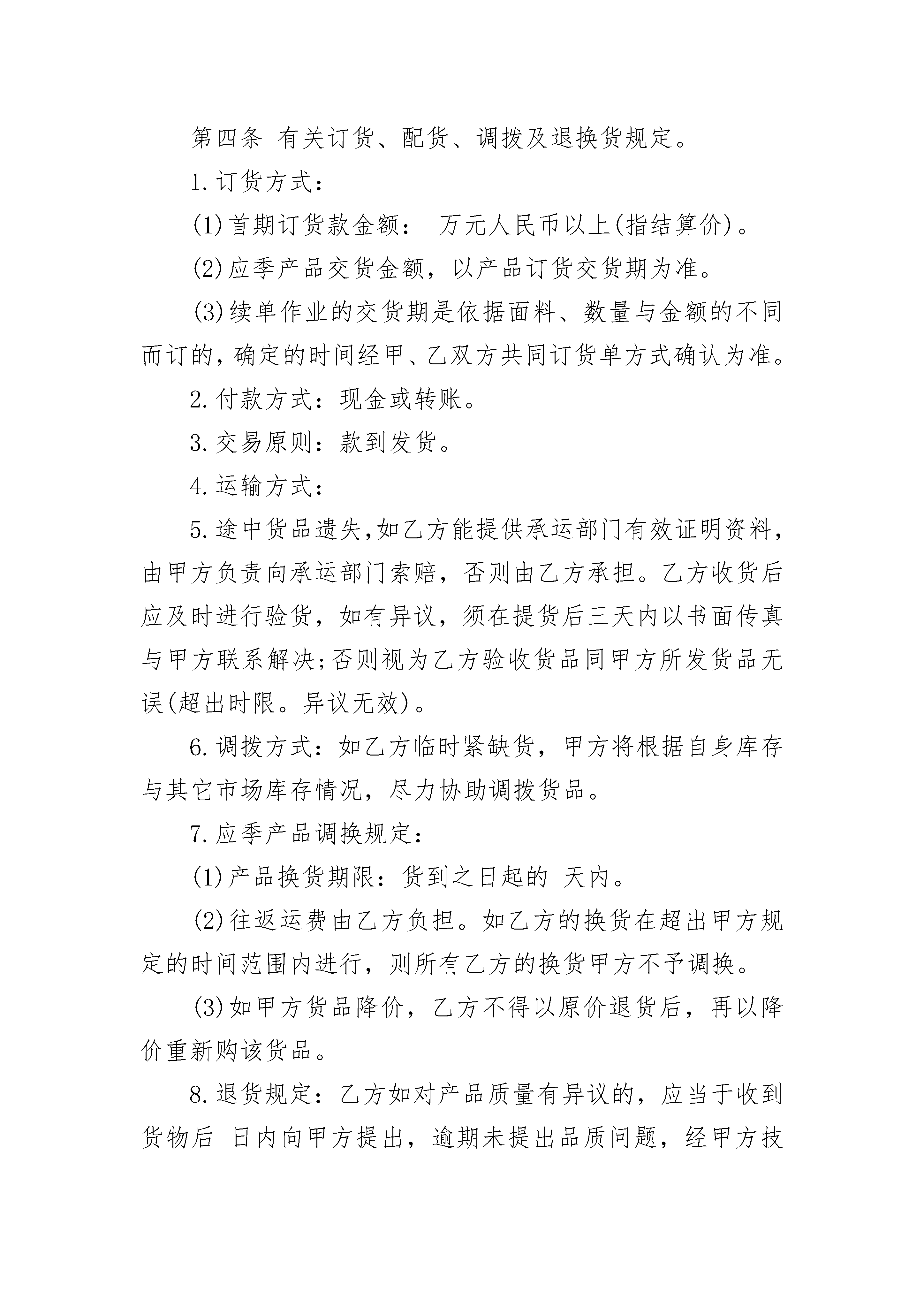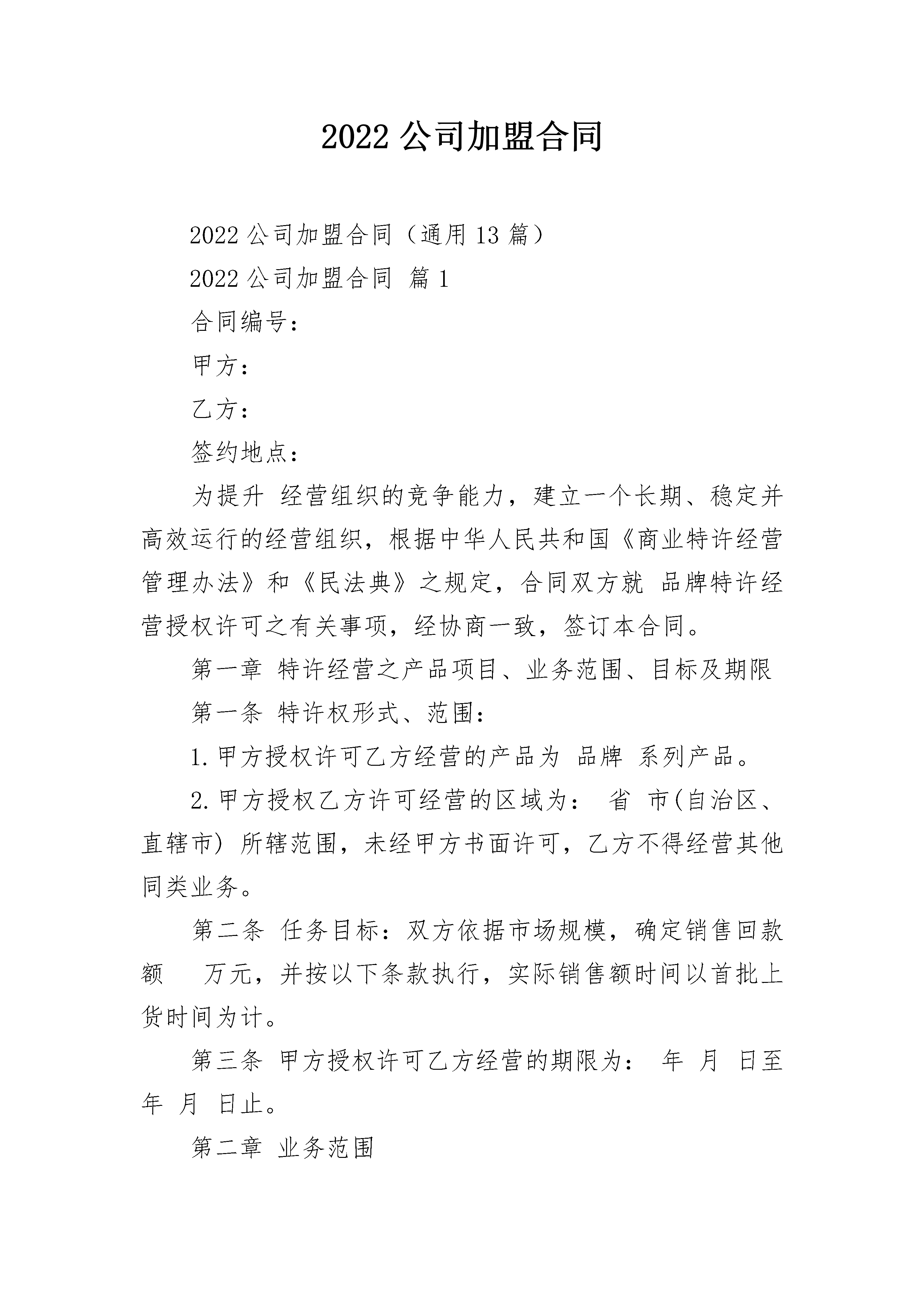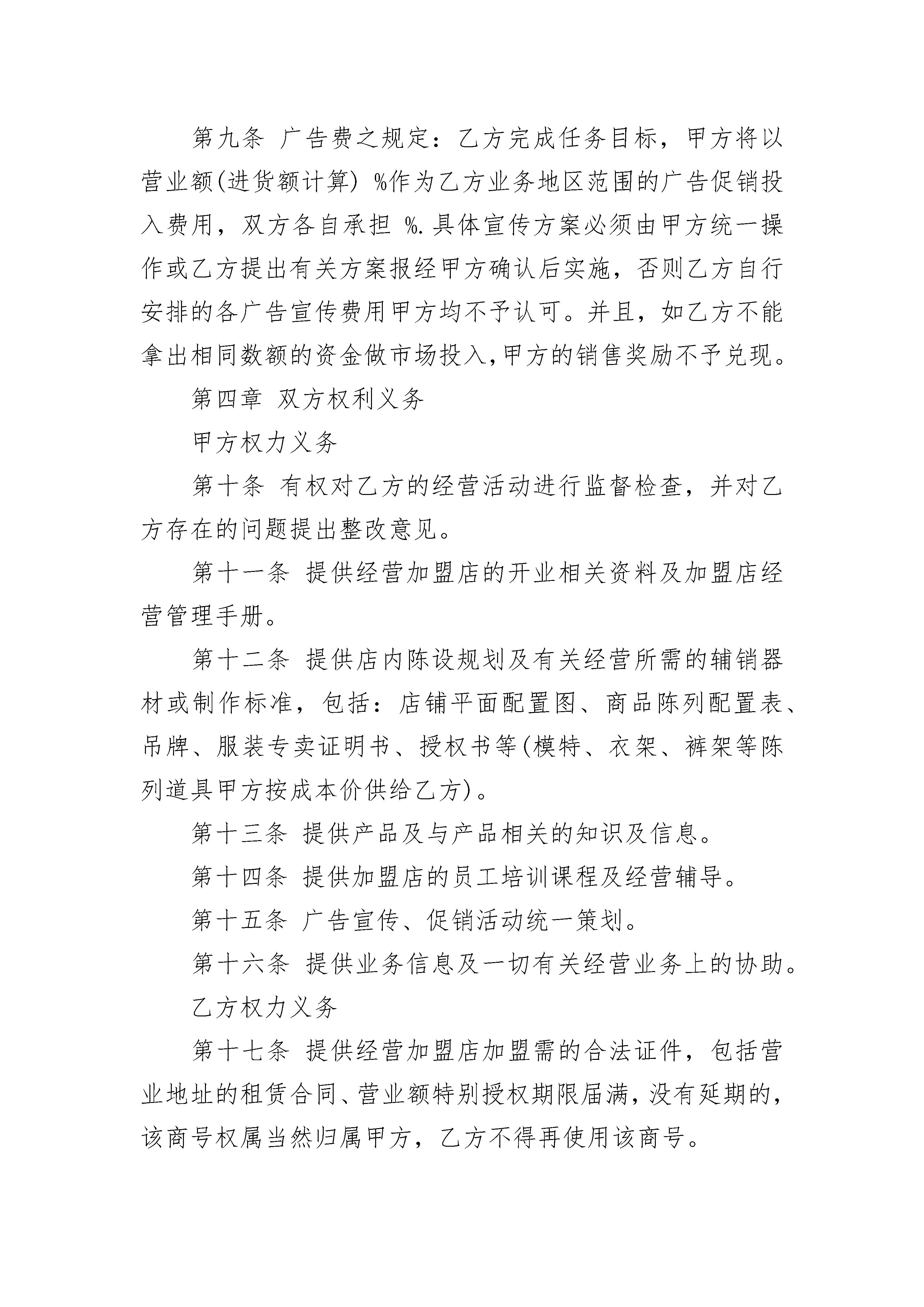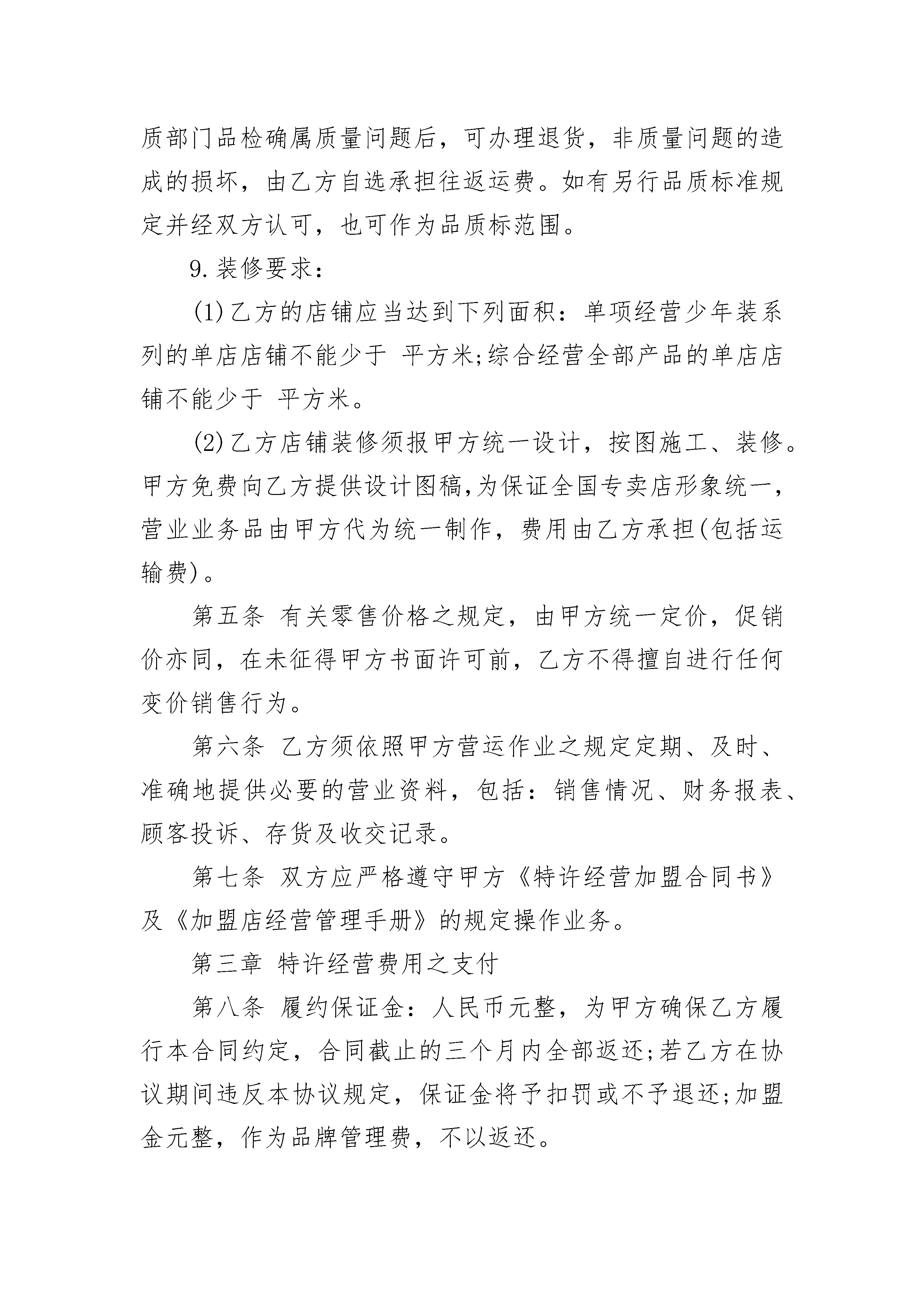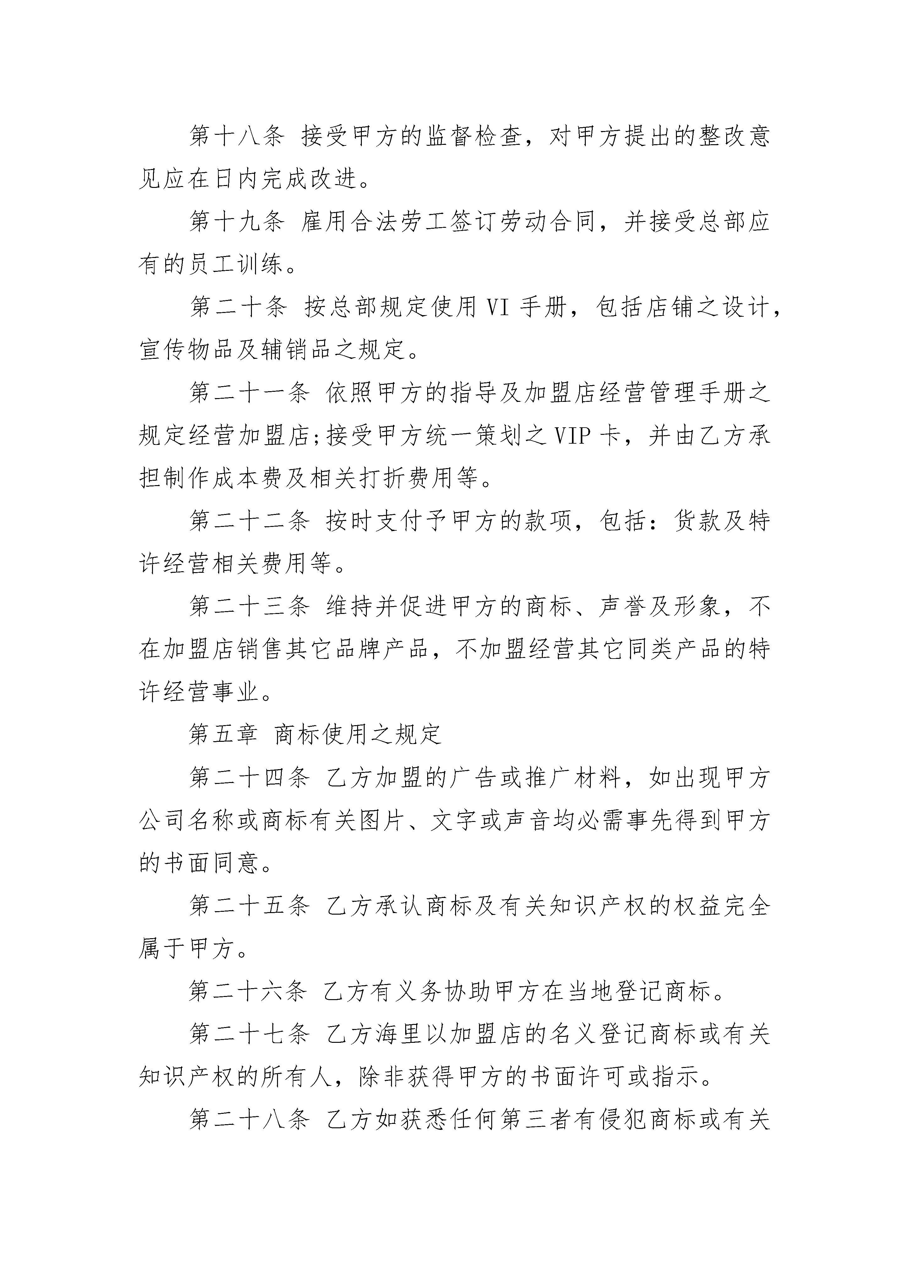 2022公司加盟合同2022公司加盟合同(通用13篇)2022公司加盟合同篇1合同编号:甲方:乙方:签约地点:为提升经营组织的竞争能力,建立一个长期、稳定并高效运行的经营组织,根据中华人民共和国《商业特许经营管理办法》和《民法典》之规定,合同双方就品牌特许经营授权许可之有关事项,经协商一致,签订本合同。第一章特许经营之产品项目、业务范围、目标及期限第一条特许权形式、范围:1.甲方授权许可乙方经营的产品为品牌系列产品。2.甲方授权乙方许可经营的区域为:省市(自治区、直辖市)所辖范围,未经甲方书面许可,乙方不得经营其他同类业务。第二条任务目标:双方依据市场规模,确定销售回款额万元,并按以下条款执行,实际销售额时间以首批上货时间为计。第三条甲方授权许可乙方经营的期限为:年月日至年月日止。第二章业务范围第四条有关订货、配货、调拨及退换货规定。1.订货方式:(1)首期订货款金额:万元人民币以上(指结算价)。(2)应季产品交货金额,以产品订货交货期为准。(3)续单作业的交货期是依据面料、数量与金额的不同而订的,确定的时间经甲、乙双方共同订货单方式确认为准。2.付款方式:现金或转账。3.交易原则:款到发货。4.运输方式:5.途中货品遗失,如乙方能提供承运部门有效证明资料,由甲方负责向承运部门索赔,否则由乙方承担。乙方收货后应及时进行验货,如有异议,须在提货后三天内以书面传真与甲方联系解决;否则视为乙方验收货品同甲方所发货品无误(超出时限。异议无效)。6.调拨方式:如乙方临时紧缺货,甲方将根据自身库存与其它市场库存情况,尽力协助调拨货品。7.应季产品调换规定:(1)产品换货期限:货到之日起的天内。(2)往返运费由乙方负担。如乙方的换货在超出甲方规定的时间范围内进行,则所有乙方的换货甲方不予调换。(3)如甲方货品降价,乙方不得以原价退货后,再以降价重新购该货品。8.退货规定:乙方如对产品质量有异议的,应当于收到货物后日内向甲方提出,逾期未提出品质问题,经甲方技质部门品检确属质量问题后,可办理退货,非质量问题的造成的损坏,由乙方自选承担往返运费。如有另行品质标准规定并经双方认可,也可作为品质标范围。9.装修要求:(1)乙方的店铺应当达到下列面积:单项经营少年装系列的单店店铺不能少于平方米;综合经营全部产品的单店店铺不能少于平方米。(2)乙方店铺装修须报甲方统一设计,按图施工、装修。甲方免费向乙方提供设计图稿,为保证全国专卖店形象统一,营业业务品由甲方代为统一制作,费用由乙方承担(包括运输费)。第五条有关零售价格之规定,由甲方统一定价,促销价亦同,在未征得甲方书面许可前,乙方不得擅自进行任何变价销售行为。第六条乙方须依照甲方营运作业之规定定期、及时、准确地提供必要的营业资料,包括:销售情况、财务报表、顾客投诉、存货及收交记录。第七条双方应严格遵守甲方《特许经营加盟合同书》及《加盟店经营管理手册》的规定操作业务。第三章特许经营费用之支付第八条履约保证金:人民币元整,为甲方确保乙方履行本合同约定,合同截止的三个月内全部返还;若乙方在协议期间违反本协议规定,保证金将予扣罚或不予退还;加盟金元整,作为品牌管理费,不以返还。第九条广告费之规定:乙方完成任务目标,甲方将以营业额(进货额计算)%作为乙方业务地区范围的广告促销投入费用,双方各自承担%.具体宣传方案必须由甲方统一操作或乙方提出有关方案报经甲方确认后实施,否则乙方自行安排的各广告宣传费用甲方均不予认可。并且,如乙方不能拿出相同数额的资金做市场投入,甲方的销售奖励不予兑现。第四章双方权利义务甲方权力义务第十条有权对乙方的经营活动进行监督检查,并对乙方存在的问题提出整改意见。第十一条提供经营加盟店的开业相关资料及加盟店经营管理手册。第十二条提供店内陈设规划及有关经营所需的辅销器材或制作标准,包括:店铺平面配置图、商品陈列配置表、吊牌、服装专卖证明书、授权书等(模特、衣架、裤架等陈列道具甲方按成本价供给乙方)。第十三条提供产品及与产品相关的知识及信息。第十四条提供加盟店的员工培训课程及经营辅导。第十五条广告宣传、促销活动统一策划。第十六条提供业务信息及一切有关经营业务上的协助。乙方权力义务第十七条提供经营加盟店加盟需的合法证件,包括营业地址的租赁合同、营业额特别授权期限届满,没有延期的,该商号权属当然归属甲方,乙方不得再使用该商号。第十八条接受甲方的监督检查,对甲方提出的整改意见应在日内完成改进。第十九条雇用合法劳工签订劳动合同,并接受总部应有的员工训练。第二十条按总部规定使用VI手册,包括店铺之设计,宣传物品及辅销品之规定。第二十一条依照甲方的指导及加盟店经营管理手册之规定经营加盟店;接受甲方统一策划之VIP卡,并由乙方承担制作成本费及相关打折费用等。第二十二条按时支付予甲方的款项,包括:货款及