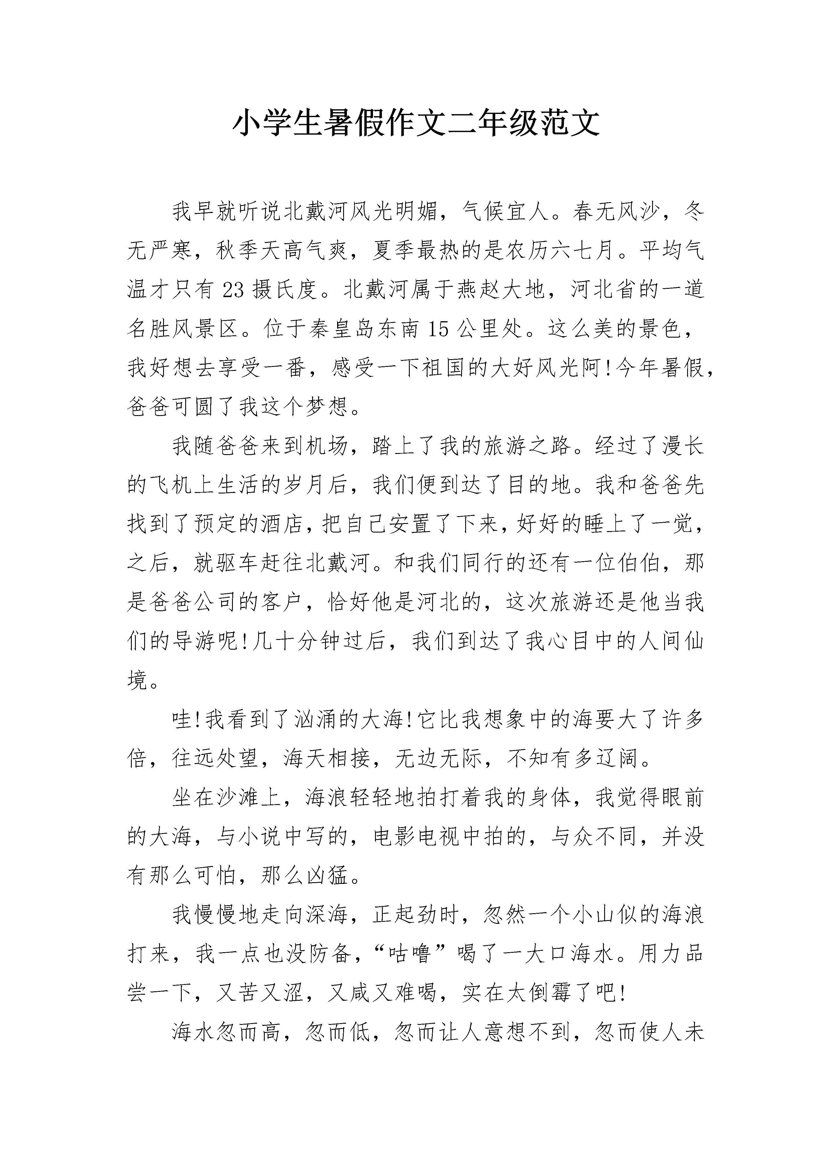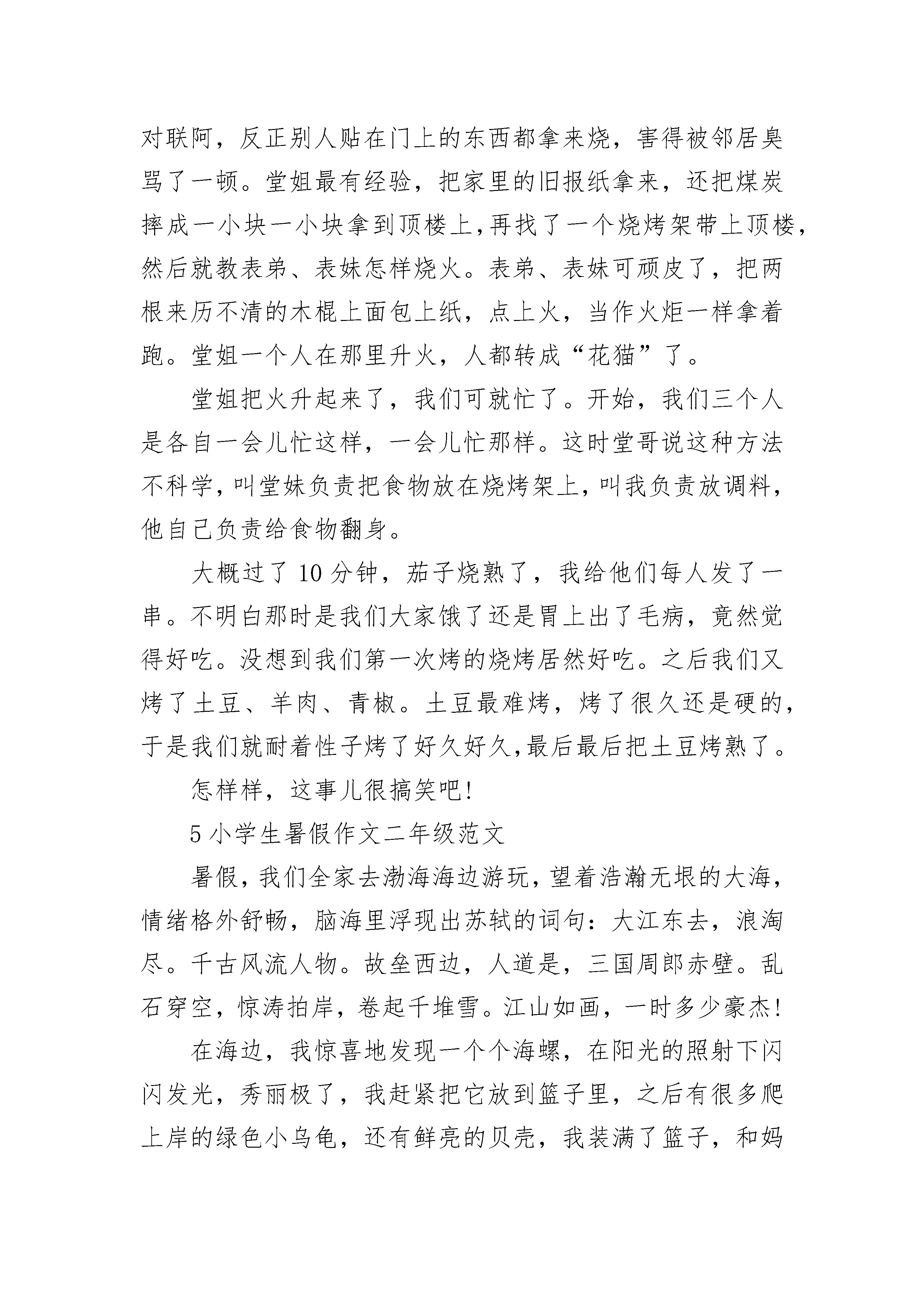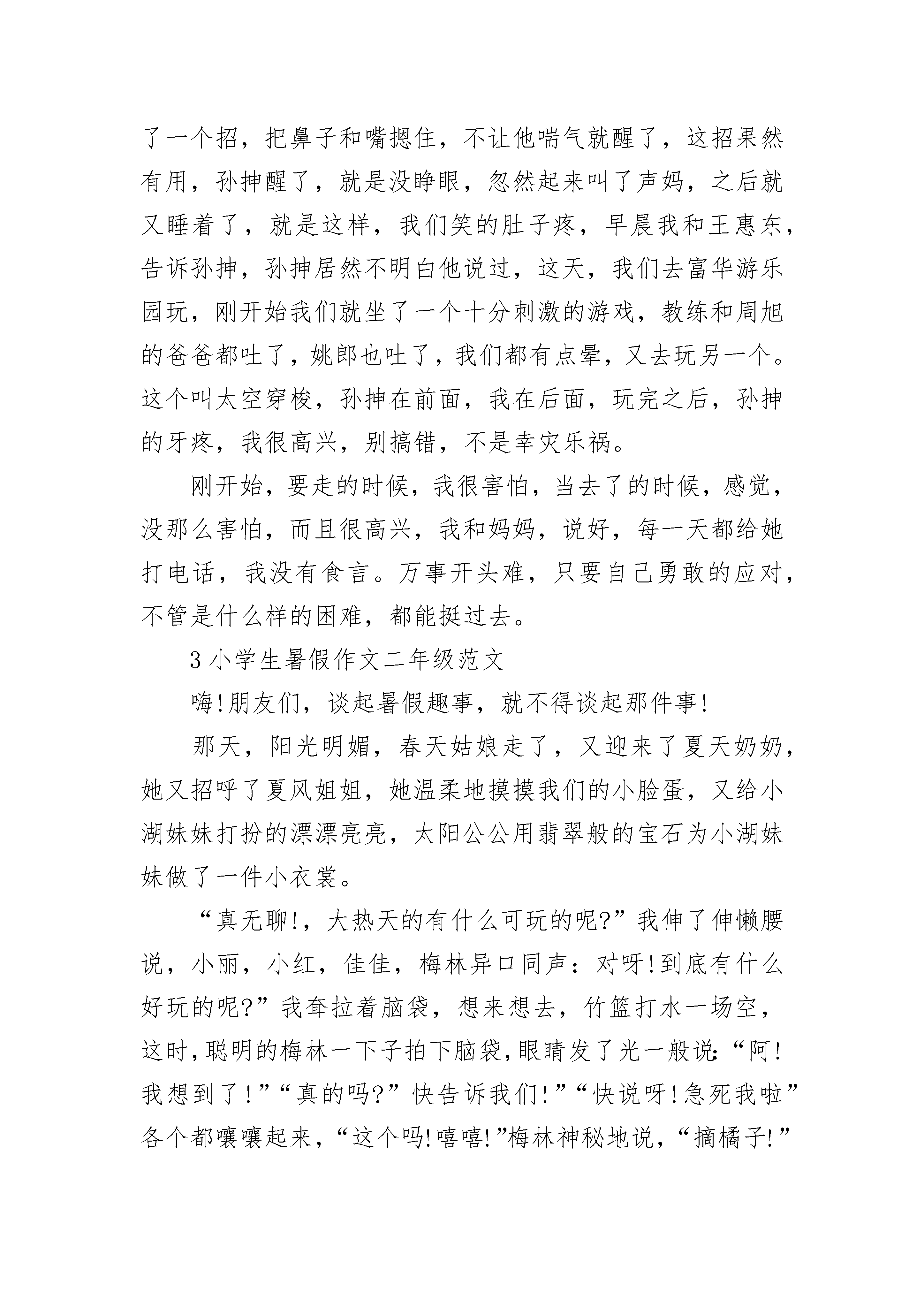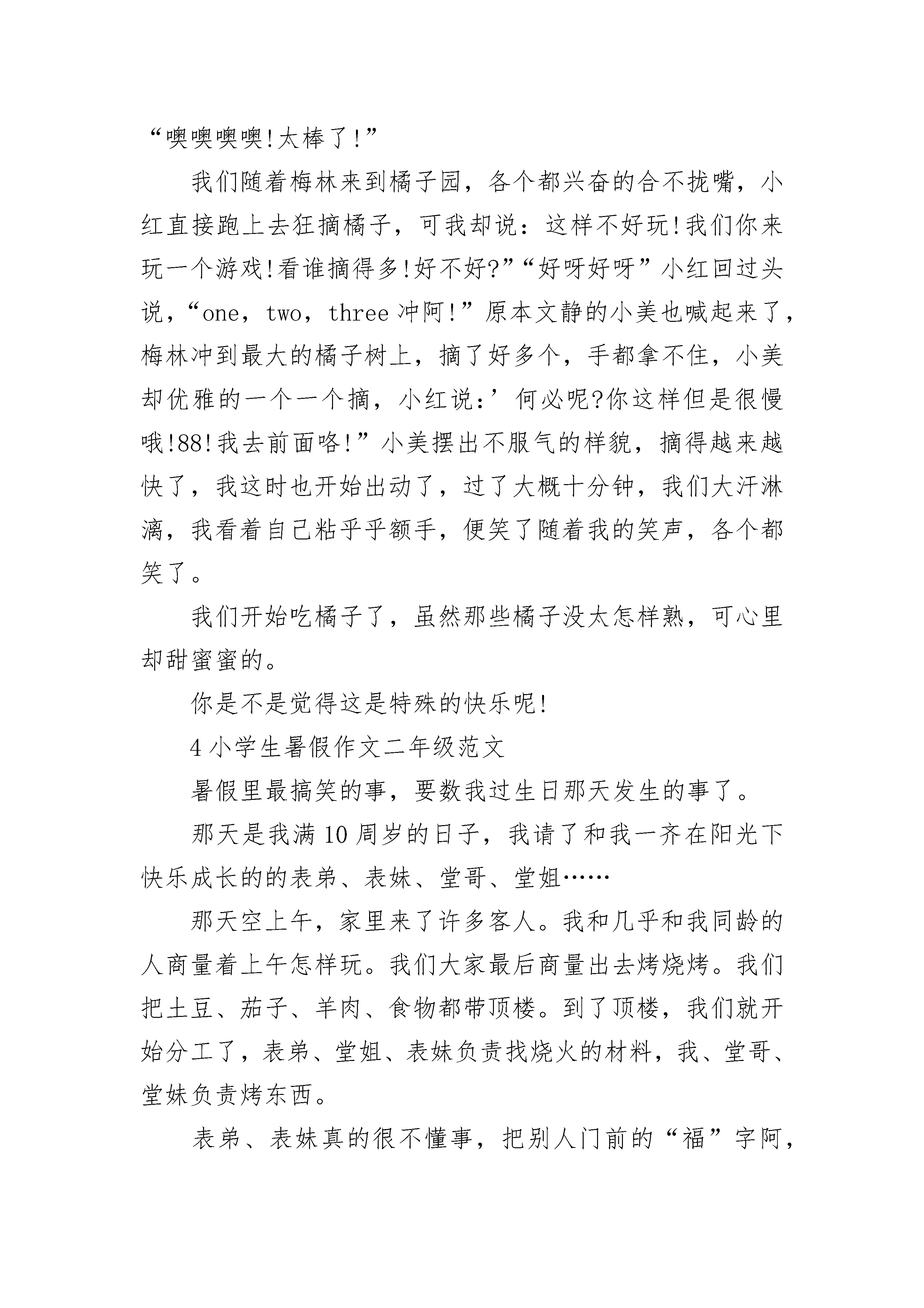 小学生暑假作文二年级范文我早就听说北戴河风光明媚,气候宜人。春无风沙,冬无严寒,秋季天高气爽,夏季最热的是农历六七月。平均气温才只有23摄氏度。北戴河属于燕赵大地,河北省的一道名胜风景区。位于秦皇岛东南15公里处。这么美的景色,我好想去享受一番,感受一下祖国的大好风光阿!今年暑假,爸爸可圆了我这个梦想。我随爸爸来到机场,踏上了我的旅游之路。经过了漫长的飞机上生活的岁月后,我们便到达了目的地。我和爸爸先找到了预定的酒店,把自己安置了下来,好好的睡上了一觉,之后,就驱车赶往北戴河。和我们同行的还有一位伯伯,那是爸爸公司的客户,恰好他是河北的,这次旅游还是他当我们的导游呢!几十分钟过后,我们到达了我心目中的人间仙境。哇!我看到了汹涌的大海!它比我想象中的海要大了许多倍,往远处望,海天相接,无边无际,不知有多辽阔。坐在沙滩上,海浪轻轻地拍打着我的身体,我觉得眼前的大海,与小说中写的,电影电视中拍的,与众不同,并没有那么可怕,那么凶猛。我慢慢地走向深海,正起劲时,忽然一个小山似的海浪打来,我一点也没防备,“咕噜”喝了一大口海水。用力品尝一下,又苦又涩,又咸又难喝,实在太倒霉了吧!海水忽而高,忽而低,忽而让人意想不到,忽而使人未报先知。在沙滩上,我用海沙堆沙雕、堆沙人。我先用沙子堆成人的大概模样,再用小贝壳和小彩石做炯炯有神的大眼睛,高高的鼻梁和樱桃小嘴,又用海草做飘逸的长发。但是这个小沙人一点儿也不坚强,正当我着乐滋滋的欣赏自己做的小沙人时,一个海浪打来,它就瘫痪变形,“人影全无”。时间飞流一逝,转眼间黄昏来临了,我们只好回酒店了。晚上,我躺在床上,似乎还听到远处传来了海浪拍打礁石的声响“轰嗒,轰嗒”。大海阿!我爱您!2小学生暑假作文二年级范文我和我在道馆里的几个同学还有老师,去了潍坊,参加比赛,我是去看比赛的,所以要当拉拉队,个性是周旭上场的时候,我们十分兴奋,而周旭也没辜负我们的期望,在50秒内拿下对手。当天我们拿了7块金牌、8块银牌、4块铜牌、一个奖杯。教练也十分兴奋,当天晚上,教练说:“晚上最晚10:00回房间,回房间,闹、看电视都行,就是不许窜房间。”我们都说行。当天晚上10:00以前,306号间的人都上我们房间去了,由于太乱,我不让他们上我们的床,所以我把他们都赶了出去了。出去了,我发现我们的床单烂了一个洞,我们十分生气!当天晚上孙抻,想家,很早就睡了,我和王惠东很闷得慌,就想把他弄醒,这一弄不要紧,笑死我们了,王惠东给我出了一个招,把鼻子和嘴摁住,不让他喘气就醒了,这招果然有用,孙抻醒了,就是没睁眼,忽然起来叫了声妈,之后就又睡着了,就是这样,我们笑的肚子疼,早晨我和王惠东,告诉孙抻,孙抻居然不明白他说过,这天,我们去富华游乐园玩,刚开始我们就坐了一个十分刺激的游戏,教练和周旭的爸爸都吐了,姚郎也吐了,我们都有点晕,又去玩另一个。这个叫太空穿梭,孙抻在前面,我在后面,玩完之后,孙抻的牙疼,我很高兴,别搞错,不是幸灾乐祸。刚开始,要走的时候,我很害怕,当去了的时候,感觉,没那么害怕,而且很高兴,我和妈妈,说好,每一天都给她打电话,我没有食言。万事开头难,只要自己勇敢的应对,不管是什么样的困难,都能挺过去。3小学生暑假作文二年级范文嗨!朋友们,谈起暑假趣事,就不得谈起那件事!那天,阳光明媚,春天姑娘走了,又迎来了夏天奶奶,她又招呼了夏风姐姐,她温柔地摸摸我们的小脸蛋,又给小湖妹妹打扮的漂漂亮亮,太阳公公用翡翠般的宝石为小湖妹妹做了一件小衣裳。“真无聊!,大热天的有什么可玩的呢?”我伸了伸懒腰说,小丽,小红,佳佳,梅林异口同声:对呀!到底有什么好玩的呢?”我耷拉着脑袋,想来想去,竹篮打水一场空,这时,聪明的梅林一下子拍下脑袋,眼睛发了光一般说:“阿!我想到了!”“真的吗?”快告诉我们!”“快说呀!急死我啦”各个都嚷嚷起来,“这个吗!嘻嘻!”梅林神秘地说,“摘橘子!”“噢噢噢噢!太棒了!”我们随着梅林来到橘子园,各个都兴奋的合不拢嘴,小红直接跑上去狂摘橘子,可我却说:这样不好玩!我们你来玩一个游戏!看谁摘得多!好不好?”“好呀好呀”小红回过头说,“one,two,three冲阿!”原本文静的小美也喊起来了,梅林冲到最大的橘子树上,摘了好多个,手都拿不住,小美却优雅的一个一个摘,小红说:’何必呢?你这样但是很慢哦!88!我去前面咯!”小美摆出不服气的样貌,摘得越来越快了,我这时也开始出动了,过了大概十分钟,我们大汗淋漓,我看着自己粘乎乎额手,便笑了随着我的笑声,各个都笑了。我们开始吃橘子了,虽然那些橘子没太怎样熟,可心里却甜蜜蜜的。你是不是觉得这是特殊的快乐呢!4小学生暑假作文二年级范文暑假里最搞笑的事,要数我过生日那天发生的事了。那天是我满10周岁的日子,我请了和我一齐在阳光下快乐成长的的表弟、表妹、堂哥、堂姐……那天空上午,