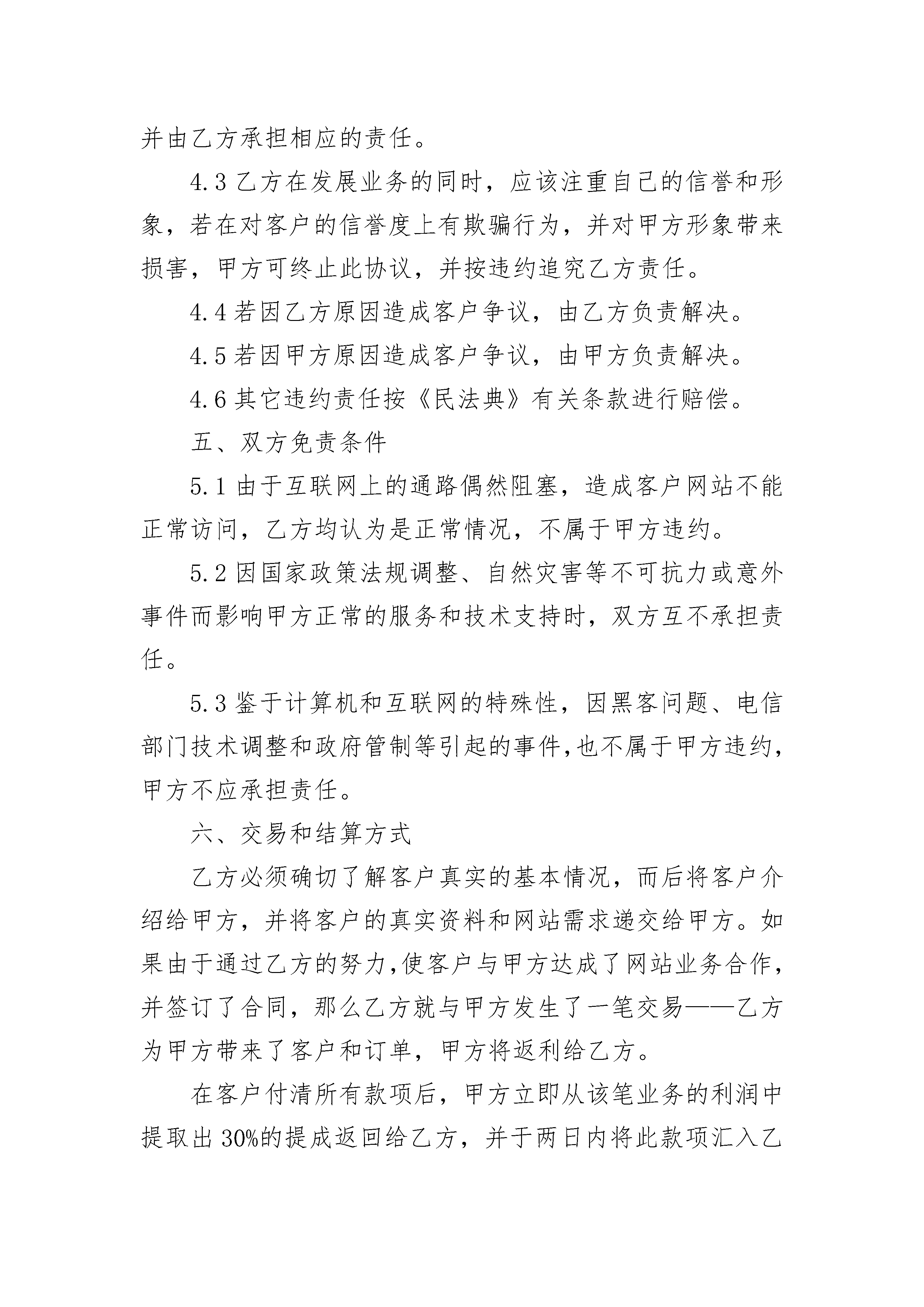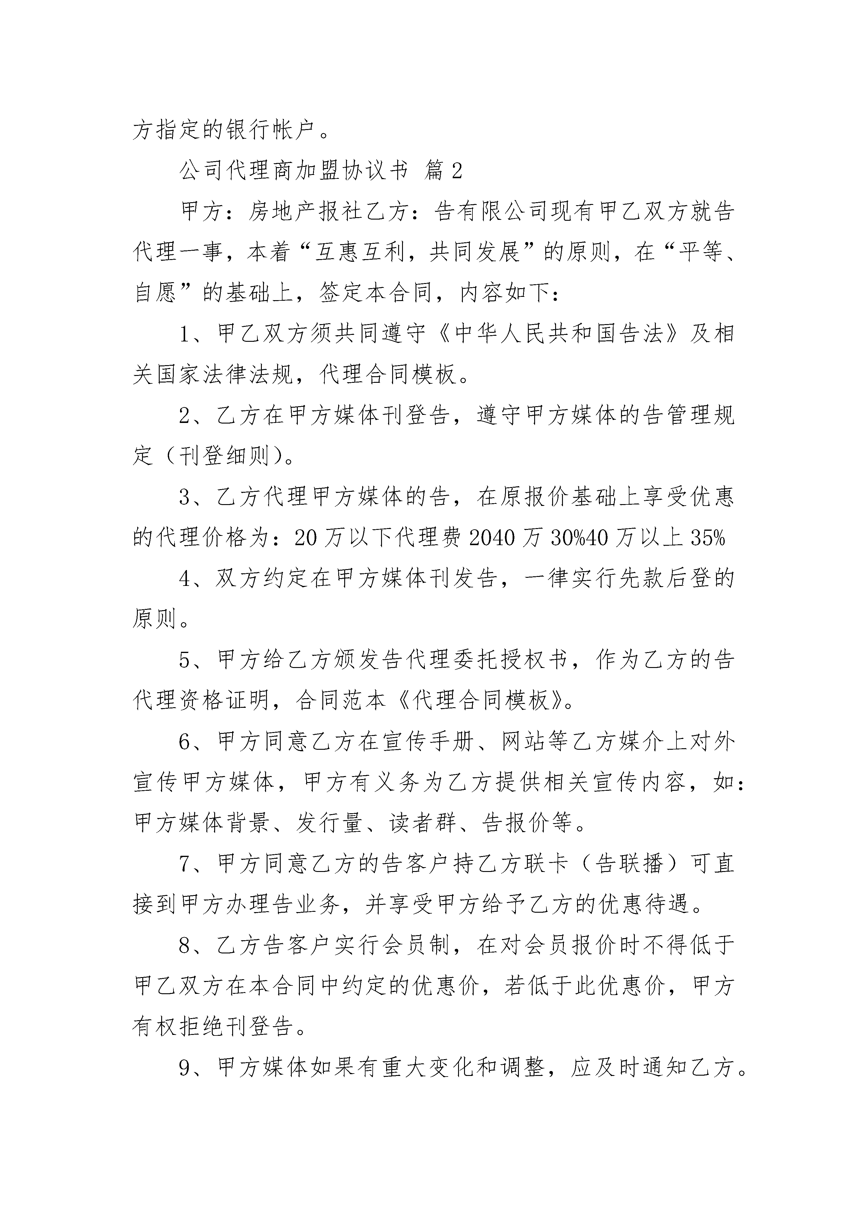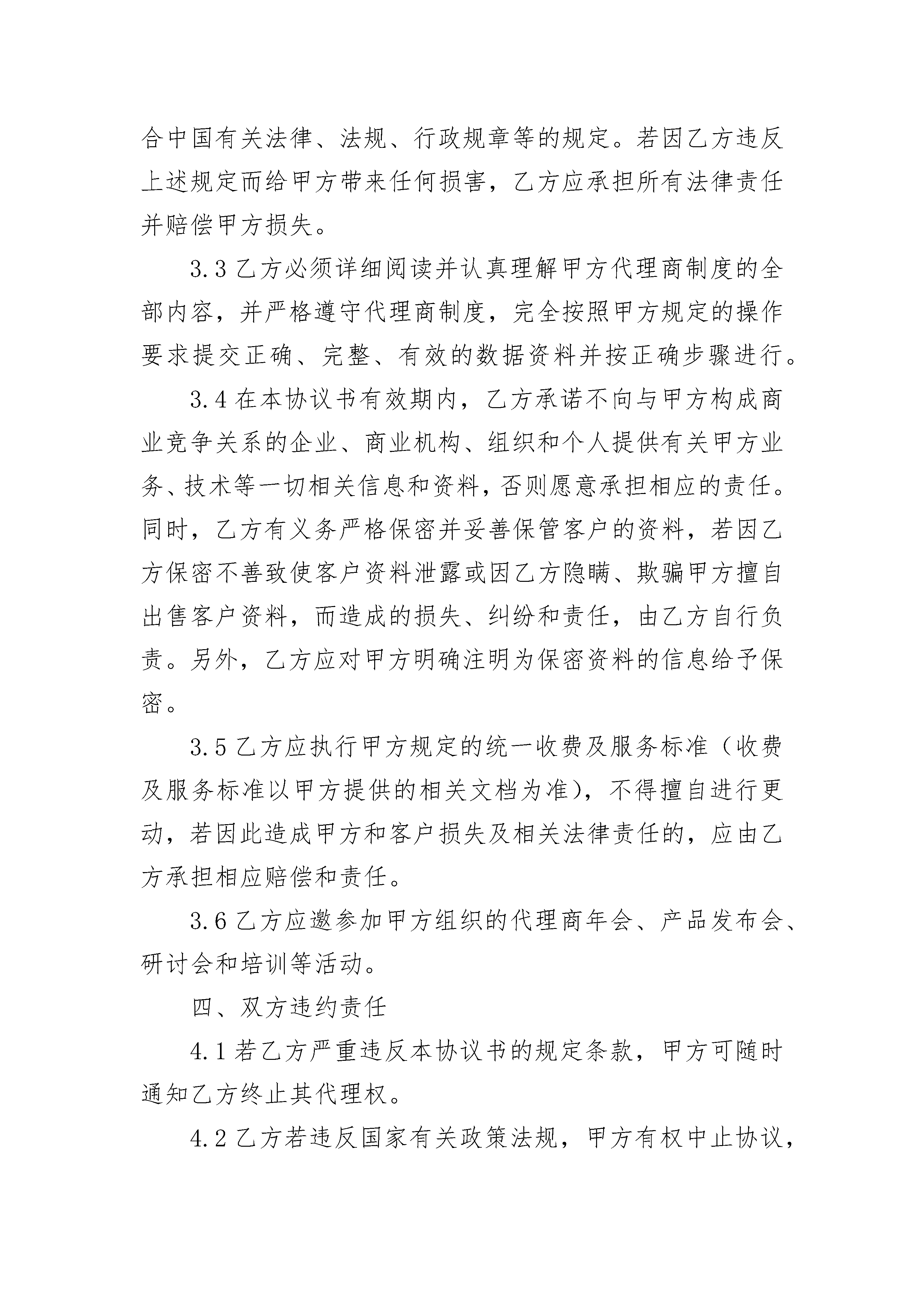 公司代理商加盟协议书公司代理商加盟协议书(通用3篇)公司代理商加盟协议书篇1甲方:南宁市巨*网络乙方:_________________________________签约双方就合作开展南宁市巨*网络(以下简称巨*网络)产品和服务的推广,共同组织发动企业、组织和个人加入事宜进行友好协商,甲方同意乙方代理甲方的网站制作、系统开发、动画设计、网站推广、网站维护销售业务,双方达成并同意遵照以下条款:一、甲方的权利和义务1.1甲方为乙方提供规范的产品和服务体系,以及有效的业务购买、管理和售后支持。甲方尽力向乙方提供业务范围内的技术支持和技术培训,帮助乙方提高技术能力,拓宽业务范围,并向乙方提供完整的售后服务支持。1.2甲方有权根据市场情况调整产品服务体系、价格体系和代理制度,调整信息以书面文档或电子邮件的方式通知乙方。1.3对于乙方与客户之间的纠纷、争议、损失、侵权、违约责任等,均由乙方与客户自行解决,甲方不介入乙方与客户的纠纷、争议等,也不对客户的任何损失负责。1.4甲方视必要定期或不定期邀请乙方参加各类代理商年会、产品发布会、研讨会和培训等活动。二、乙方成为甲方代理商的基本条件1.可以独立承担民事责任的企业单位;2.具有比较丰富的计算机和互联网知识,了解网站建设的基本内容;3.拥有固定的办公地点和便利的上网设备;4.拥有良好的知名度和完善的销售网络,以宣传和推广巨*网络;5.具有良好的客户服务能力与经验,能够并愿意为客户提供必要的咨询和解答;6.提供有效的本公司营业执照复印件、负责人身份证复印件;7.愿意接受巨*网络的审核、监督、管理和指导。8.愿意接受甲方制订的《代理商加盟协议书》;9.乙方必须熟悉甲方的代理商制度、产品信息、服务内容、业务流程等相关信息,甲方对提出代理申请的乙方就上述各项内容进行审核、确认,决定是否授予乙方代理资格。三、乙方的权利和义务3.1乙方申请成为甲方的代理商不需要交纳任何费用。在成为甲方的代理商后,甲方向乙方颁发代理商授权书,代理商授权书中明确规定了乙方可以代理甲方产品和服务的范围。乙方在自行负责开拓市场与发展客户时,要保证向客户提供良好的服务,不得以欺诈、胁迫等不正当手段损害客户及甲方的利益和声誉。3.2乙方保证自己和客户的经营活动和业务活动完全符合中国有关法律、法规、行政规章等的规定。若因乙方违反上述规定而给甲方带来任何损害,乙方应承担所有法律责任并赔偿甲方损失。3.3乙方必须详细阅读并认真理解甲方代理商制度的全部内容,并严格遵守代理商制度,完全按照甲方规定的操作要求提交正确、完整、有效的数据资料并按正确步骤进行。3.4在本协议书有效期内,乙方承诺不向与甲方构成商业竞争关系的企业、商业机构、组织和个人提供有关甲方业务、技术等一切相关信息和资料,否则愿意承担相应的责任。同时,乙方有义务严格保密并妥善保管客户的资料,若因乙方保密不善致使客户资料泄露或因乙方隐瞒、欺骗甲方擅自出售客户资料,而造成的损失、纠纷和责任,由乙方自行负责。另外,乙方应对甲方明确注明为保密资料的信息给予保密。3.5乙方应执行甲方规定的统一收费及服务标准(收费及服务标准以甲方提供的相关文档为准),不得擅自进行更动,若因此造成甲方和客户损失及相关法律责任的,应由乙方承担相应赔偿和责任。3.6乙方应邀参加甲方组织的代理商年会、产品发布会、研讨会和培训等活动。四、双方违约责任4.1若乙方严重违反本协议书的规定条款,甲方可随时通知乙方终止其代理权。4.2乙方若违反国家有关政策法规,甲方有权中止协议,并由乙方承担相应的责任。4.3乙方在发展业务的同时,应该注重自己的信誉和形象,若在对客户的信誉度上有欺骗行为,并对甲方形象带来损害,甲方可终止此协议,并按违约追究乙方责任。4.4若因乙方原因造成客户争议,由乙方负责解决。4.5若因甲方原因造成客户争议,由甲方负责解决。4.6其它违约责任按《民法典》有关条款进行赔偿。五、双方免责条件5.1由于互联网上的通路偶然阻塞,造成客户网站不能正常访问,乙方均认为是正常情况,不属于甲方违约。5.2因国家政策法规调整、自然灾害等不可抗力或意外事件而影响甲方正常的服务和技术支持时,双方互不承担责任。5.3鉴于计算机和互联网的特殊性,因黑客问题、电信部门技术调整和政府管制等引起的事件,也不属于甲方违约,甲方不应承担责任。六、交易和结算方式乙方必须确切了解客户真实的基本情况,而后将客户介绍给甲方,并将客户的真实资料和网站需求递交给甲方。如果由于通过乙方的努力,使客户与甲方达成了网站业务合作,并签订了合同,那么乙方就与甲方发生了一笔交易——乙方为甲方带来了客户和订单,甲方将返利给乙方。在客户付清所有款项后,甲方立即从该笔业务的利润中提取出30%的提成返回给乙方,并于两日内将此款项汇入乙方指定的银行帐户。公司代理商加盟协