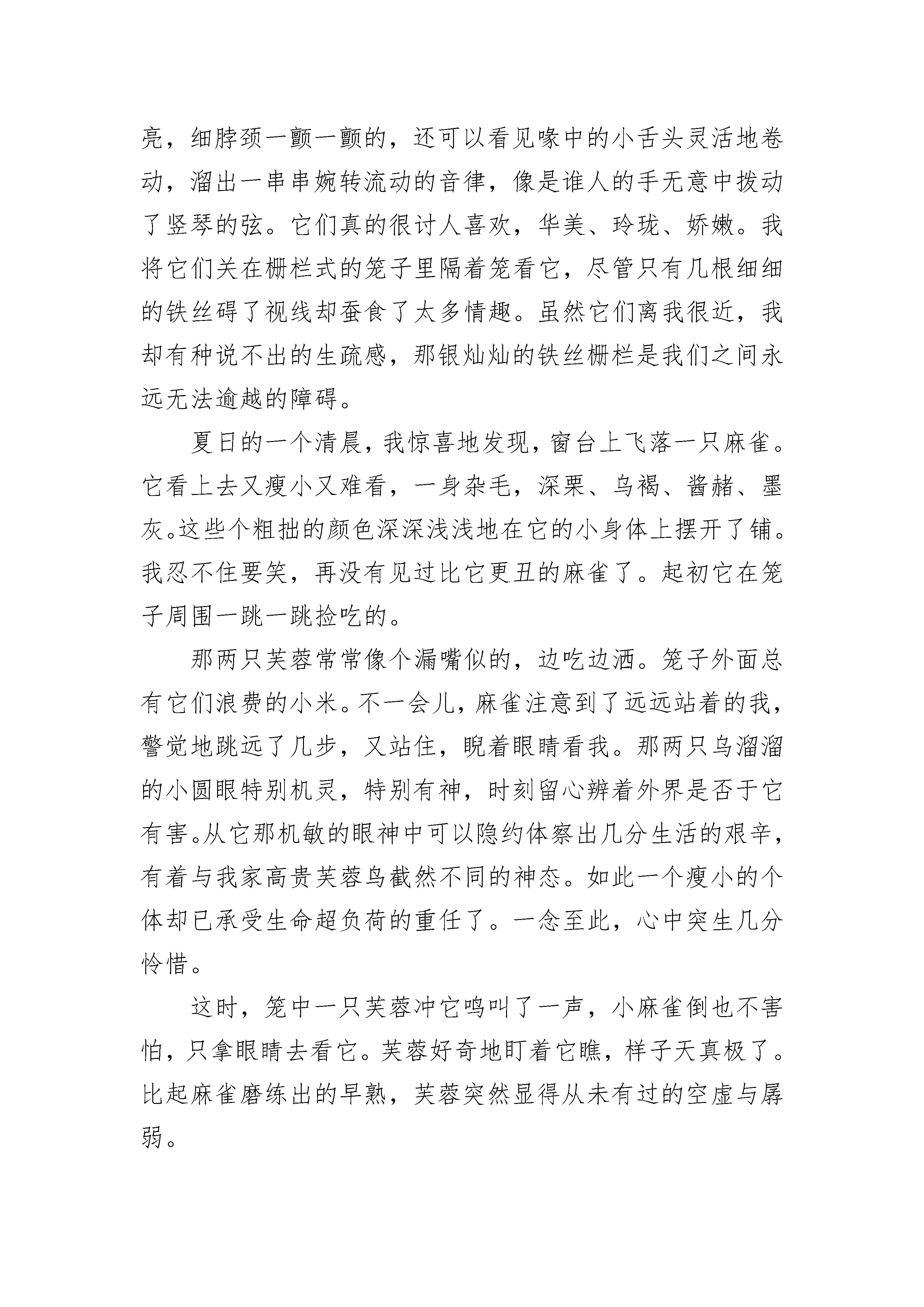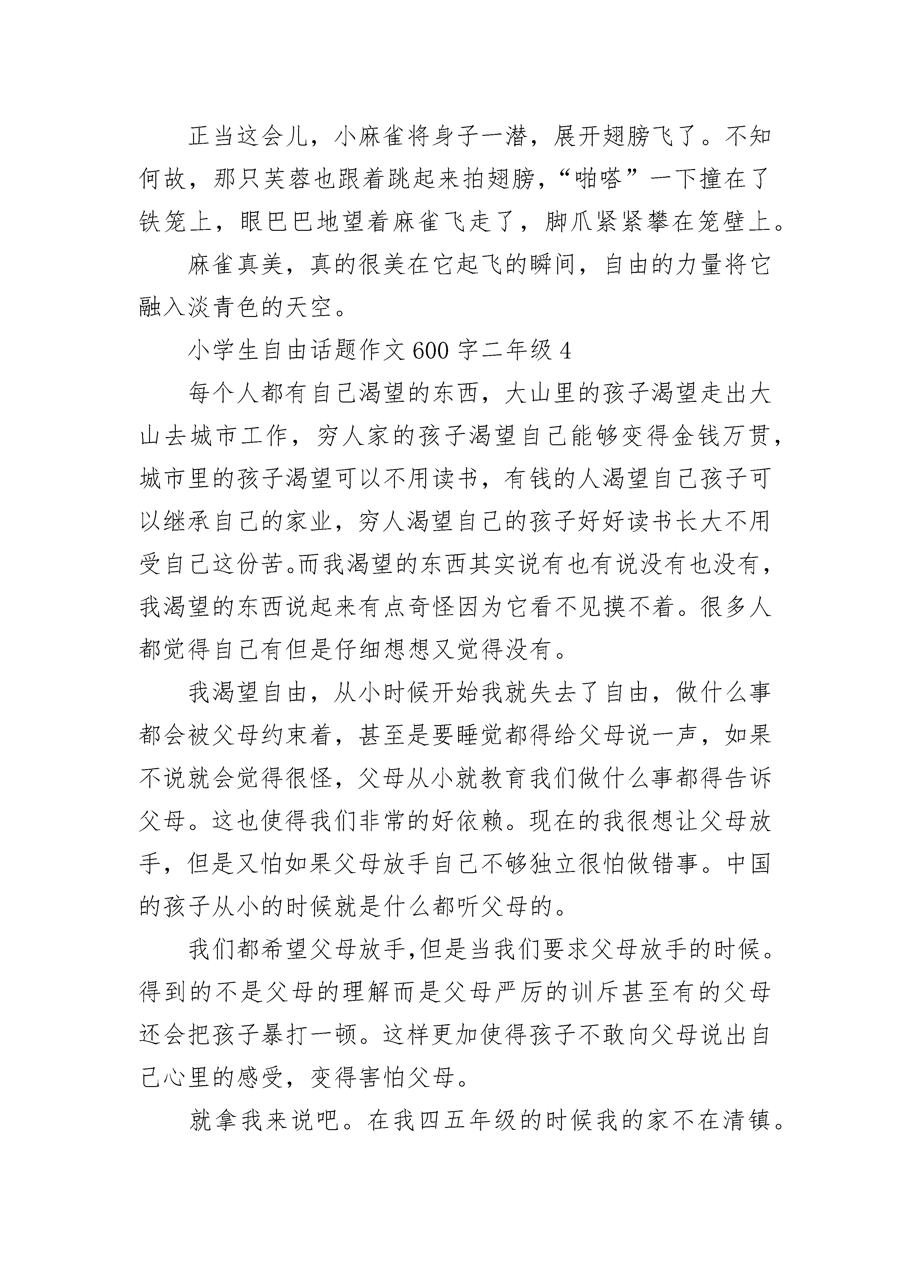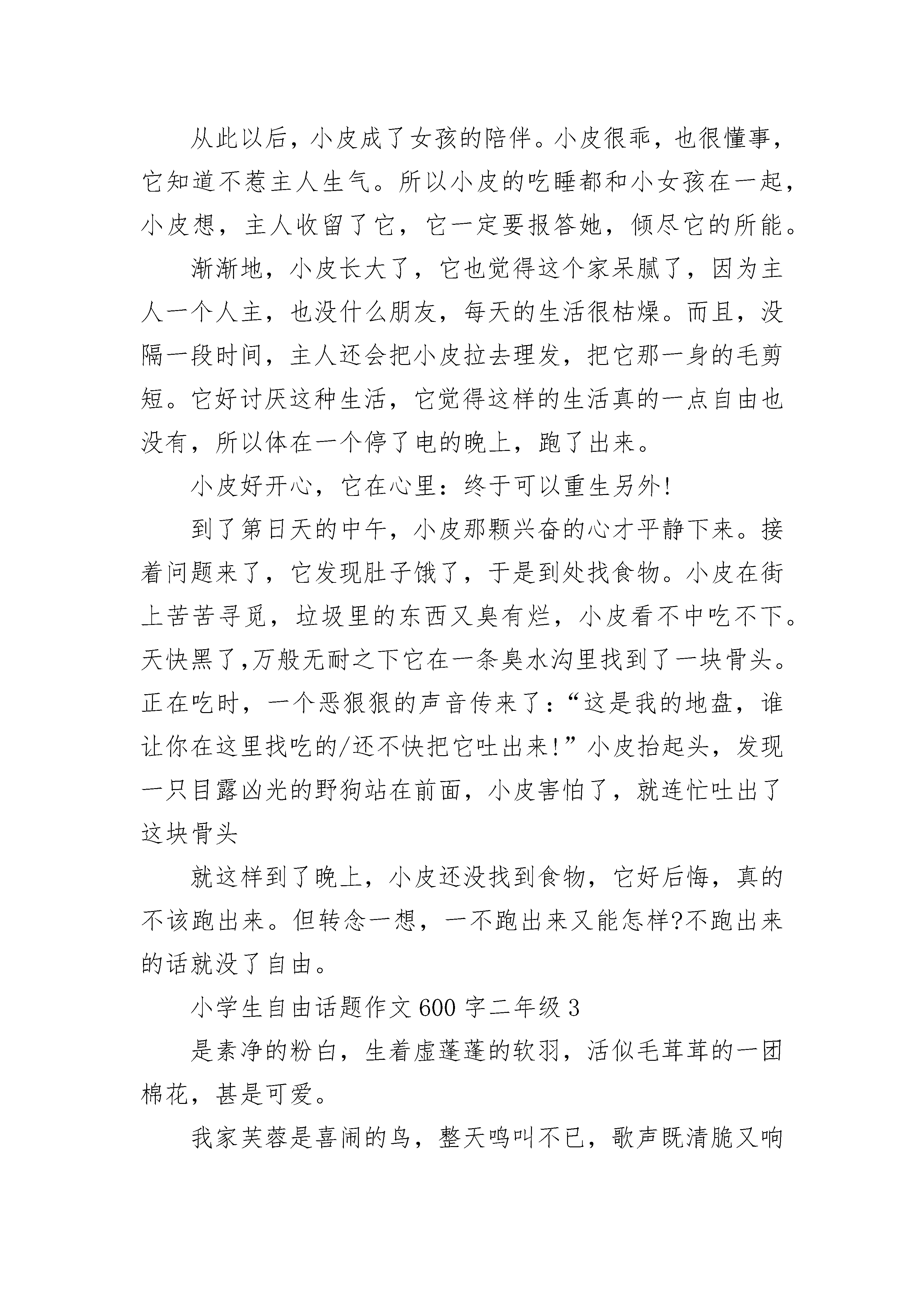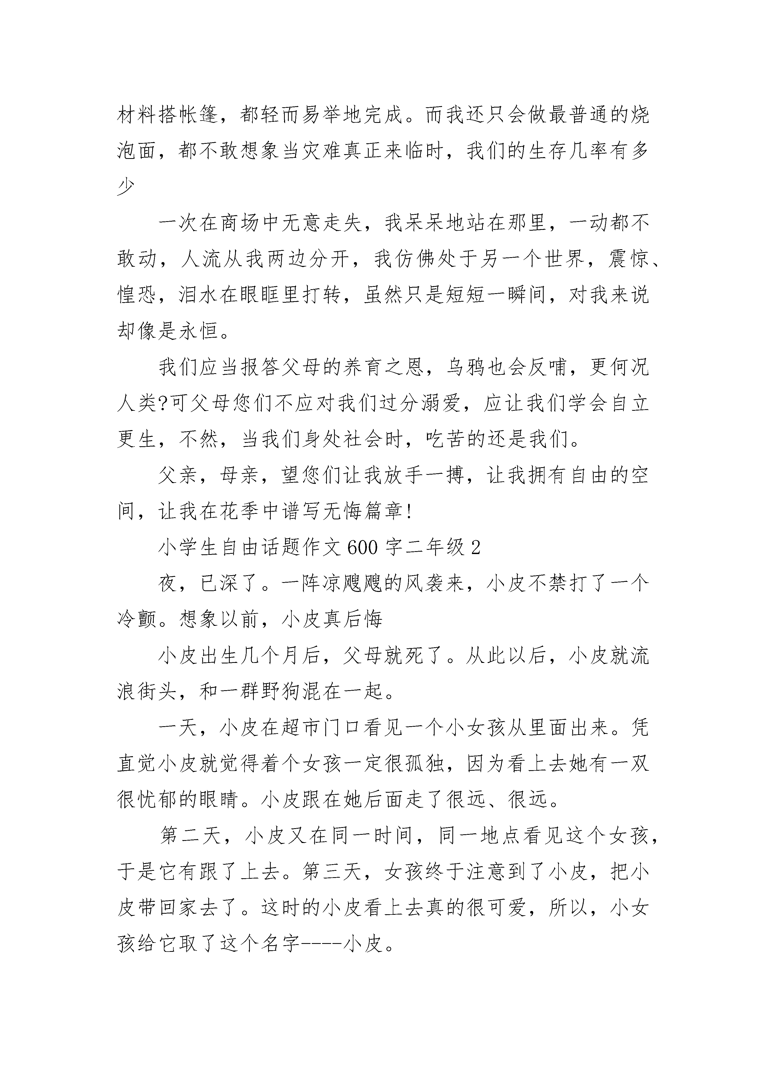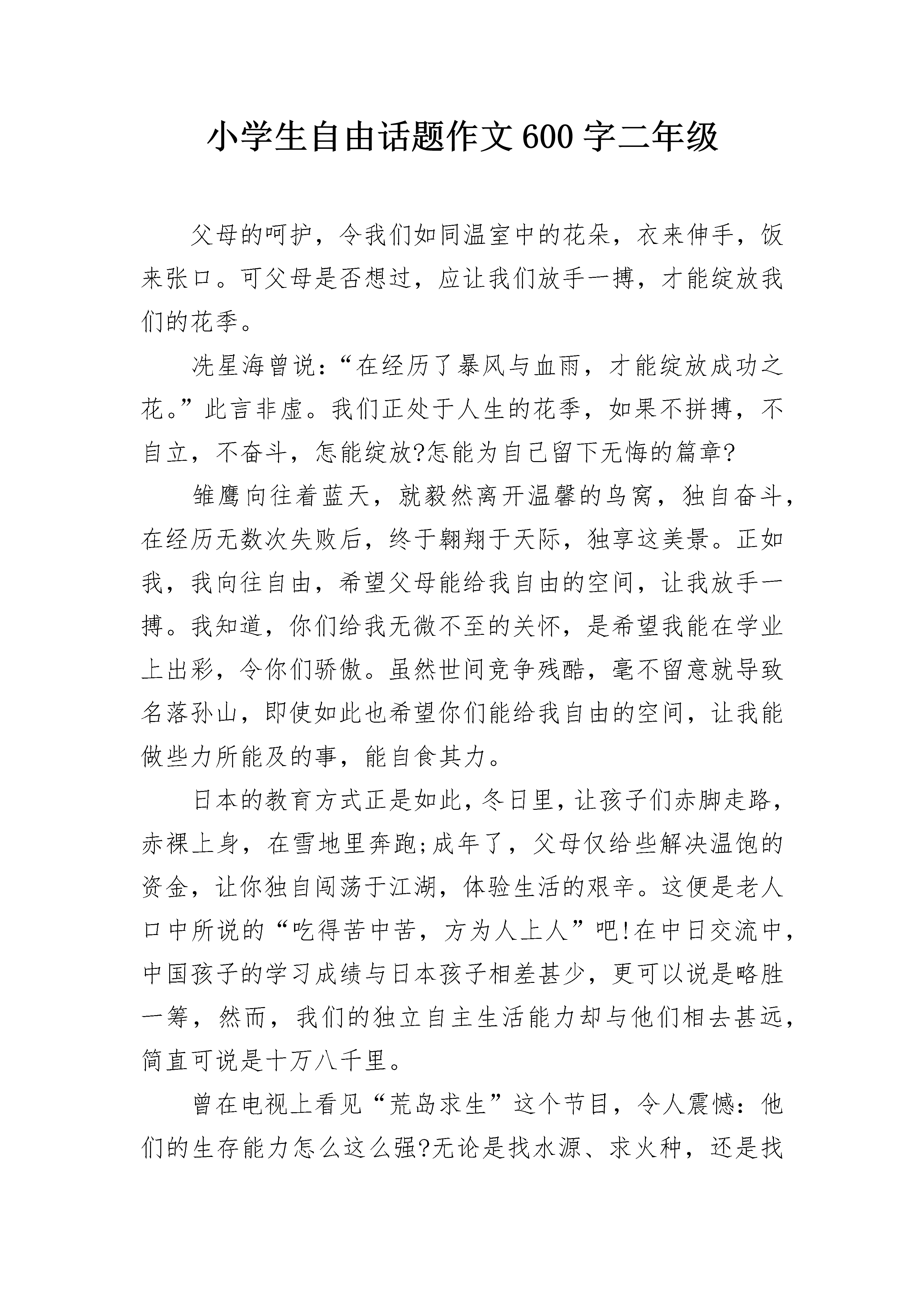 小学生自由话题作文600字二年级父母的呵护,令我们如同温室中的花朵,衣来伸手,饭来张口。可父母是否想过,应让我们放手一搏,才能绽放我们的花季。冼星海曾说:“在经历了暴风与血雨,才能绽放成功之花。”此言非虚。我们正处于人生的花季,如果不拼搏,不自立,不奋斗,怎能绽放?怎能为自己留下无悔的篇章?雏鹰向往着蓝天,就毅然离开温馨的鸟窝,独自奋斗,在经历无数次失败后,终于翱翔于天际,独享这美景。正如我,我向往自由,希望父母能给我自由的空间,让我放手一搏。我知道,你们给我无微不至的关怀,是希望我能在学业上出彩,令你们骄傲。虽然世间竞争残酷,毫不留意就导致名落孙山,即使如此也希望你们能给我自由的空间,让我能做些力所能及的事,能自食其力。日本的教育方式正是如此,冬日里,让孩子们赤脚走路,赤裸上身,在雪地里奔跑;成年了,父母仅给些解决温饱的资金,让你独自闯荡于江湖,体验生活的艰辛。这便是老人口中所说的“吃得苦中苦,方为人上人”吧!在中日交流中,中国孩子的学习成绩与日本孩子相差甚少,更可以说是略胜一筹,然而,我们的独立自主生活能力却与他们相去甚远,简直可说是十万八千里。曾在电视上看见“荒岛求生”这个节目,令人震憾:他们的生存能力怎么这么强?无论是找水源、求火种,还是找材料搭帐篷,都轻而易举地完成。而我还只会做最普通的烧泡面,都不敢想象当灾难真正来临时,我们的生存几率有多少一次在商场中无意走失,我呆呆地站在那里,一动都不敢动,人流从我两边分开,我仿佛处于另一个世界,震惊、惶恐,泪水在眼眶里打转,虽然只是短短一瞬间,对我来说却像是永恒。我们应当报答父母的养育之恩,乌鸦也会反哺,更何况人类?可父母您们不应对我们过分溺爱,应让我们学会自立更生,不然,当我们身处社会时,吃苦的还是我们。父亲,母亲,望您们让我放手一搏,让我拥有自由的空间,让我在花季中谱写无悔篇章!小学生自由话题作文600字二年级2夜,已深了。一阵凉飕飕的风袭来,小皮不禁打了一个冷颤。想象以前,小皮真后悔小皮出生几个月后,父母就死了。从此以后,小皮就流浪街头,和一群野狗混在一起。一天,小皮在超市门口看见一个小女孩从里面出来。凭直觉小皮就觉得着个女孩一定很孤独,因为看上去她有一双很忧郁的眼睛。小皮跟在她后面走了很远、很远。第二天,小皮又在同一时间,同一地点看见这个女孩,于是它有跟了上去。第三天,女孩终于注意到了小皮,把小皮带回家去了。这时的小皮看上去真的很可爱,所以,小女孩给它取了这个名字----小皮。从此以后,小皮成了女孩的陪伴。小皮很乖,也很懂事,它知道不惹主人生气。所以小皮的吃睡都和小女孩在一起,小皮想,主人收留了它,它一定要报答她,倾尽它的所能。渐渐地,小皮长大了,它也觉得这个家呆腻了,因为主人一个人主,也没什么朋友,每天的生活很枯燥。而且,没隔一段时间,主人还会把小皮拉去理发,把它那一身的毛剪短。它好讨厌这种生活,它觉得这样的生活真的一点自由也没有,所以体在一个停了电的晚上,跑了出来。小皮好开心,它在心里:终于可以重生另外!到了第日天的中午,小皮那颗兴奋的心才平静下来。接着问题来了,它发现肚子饿了,于是到处找食物。小皮在街上苦苦寻觅,垃圾里的东西又臭有烂,小皮看不中吃不下。天快黑了,万般无耐之下它在一条臭水沟里找到了一块骨头。正在吃时,一个恶狠狠的声音传来了:“这是我的地盘,谁让你在这里找吃的/还不快把它吐出来!”小皮抬起头,发现一只目露凶光的野狗站在前面,小皮害怕了,就连忙吐出了这块骨头就这样到了晚上,小皮还没找到食物,它好后悔,真的不该跑出来。但转念一想,一不跑出来又能怎样?不跑出来的话就没了自由。小学生自由话题作文600字二年级3是素净的粉白,生着虚蓬蓬的软羽,活似毛茸茸的一团棉花,甚是可爱。我家芙蓉是喜闹的鸟,整天鸣叫不已,歌声既清脆又响亮,细脖颈一颤一颤的,还可以看见喙中的小舌头灵活地卷动,溜出一串串婉转流动的音律,像是谁人的手无意中拨动了竖琴的弦。它们真的很讨人喜欢,华美、玲珑、娇嫩。我将它们关在栅栏式的笼子里隔着笼看它,尽管只有几根细细的铁丝碍了视线却蚕食了太多情趣。虽然它们离我很近,我却有种说不出的生疏感,那银灿灿的铁丝栅栏是我们之间永远无法逾越的障碍。夏日的一个清晨,我惊喜地发现,窗台上飞落一只麻雀。它看上去又瘦小又难看,一身杂毛,深栗、乌褐、酱赭、墨灰。这些个粗拙的颜色深深浅浅地在它的小身体上摆开了铺。我忍不住要笑,再没有见过比它更丑的麻雀了。起初它在笼子周围一跳一跳捡吃的。那两只芙蓉常常像个漏嘴似的,边吃边洒。笼子外面总有它们浪费的小米。不一会儿,麻雀注意到了远远站着的我,警觉地跳远了几步,又站住,睨着眼睛看我。那两只乌溜溜的小圆眼特别机灵,特别有神,时刻留心辨着外界是否于它有害。从它那机敏的眼神中可以隐约体察出几分生活的艰辛,有着与我家高贵芙蓉鸟截然不同的神