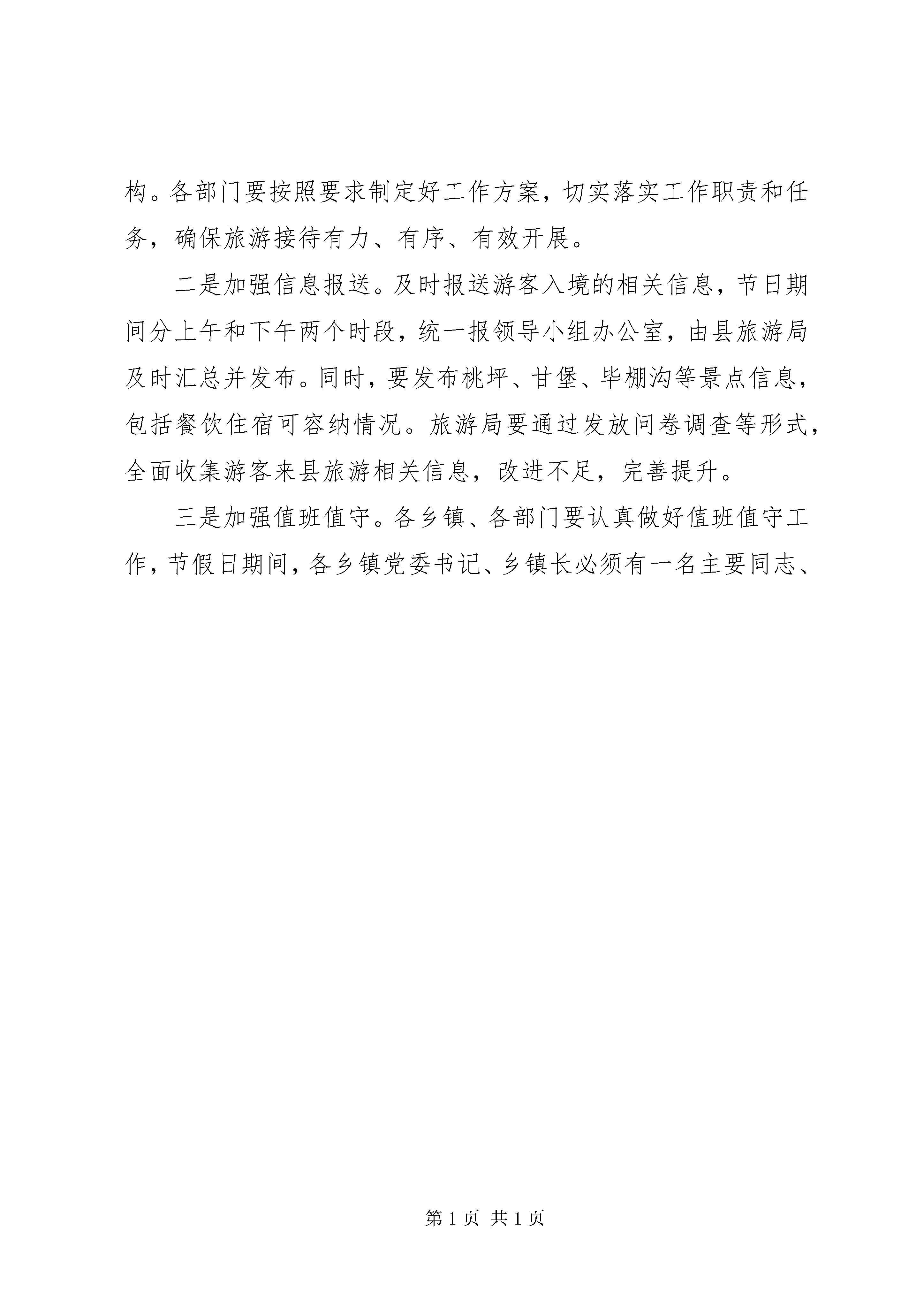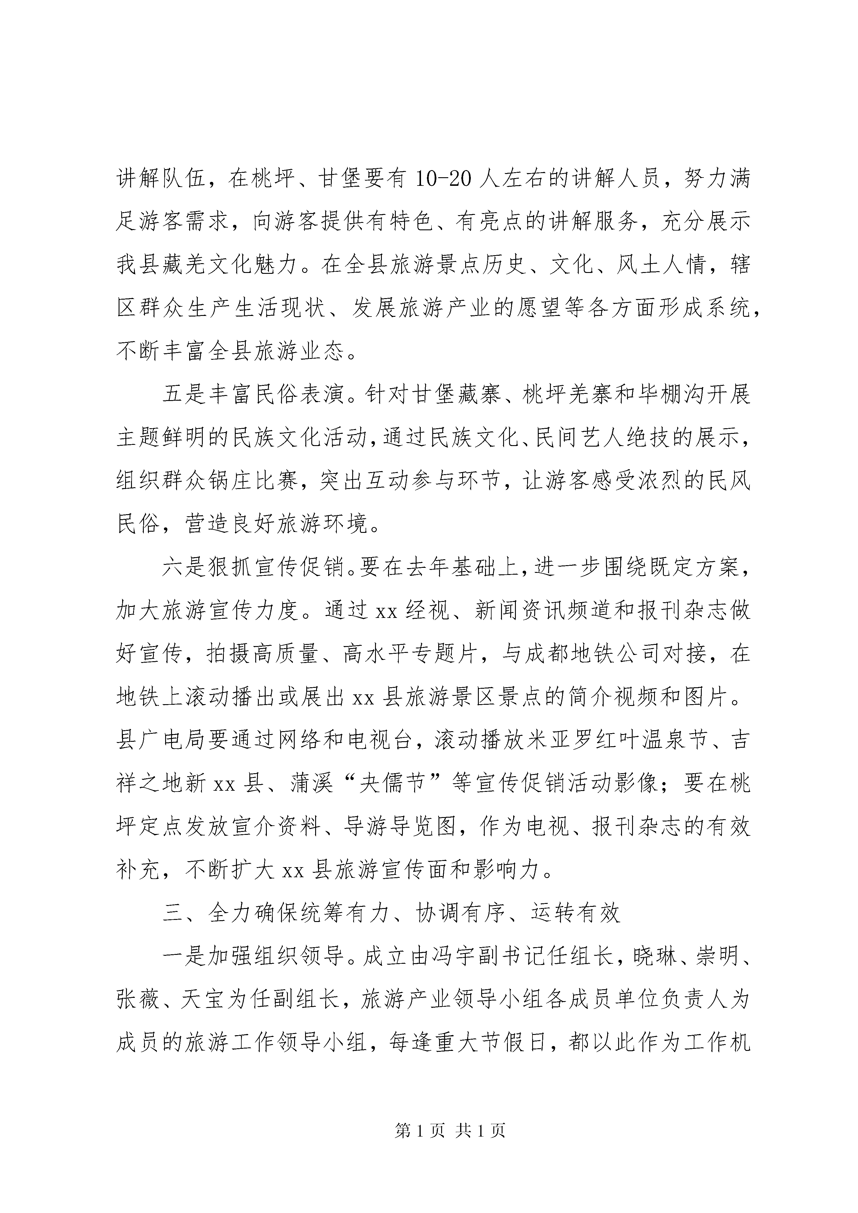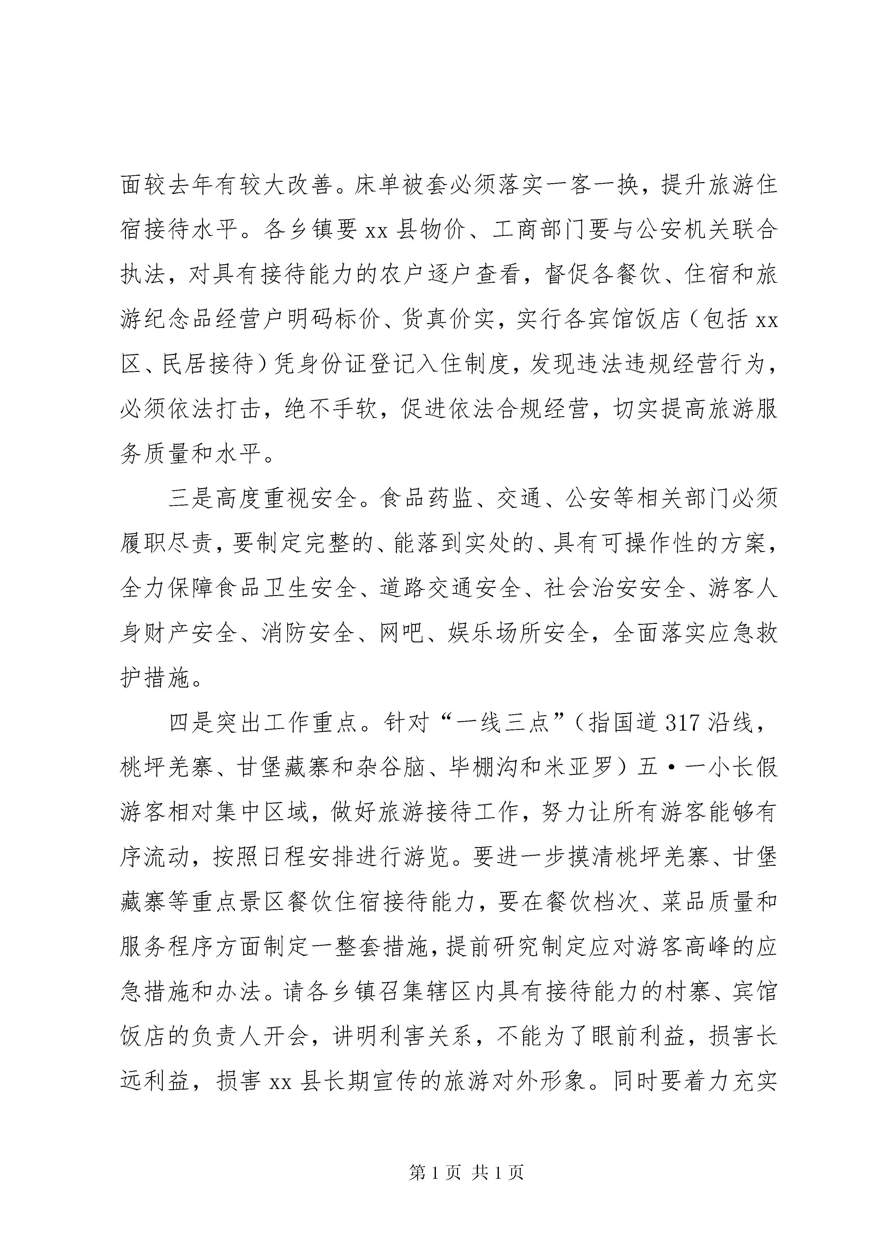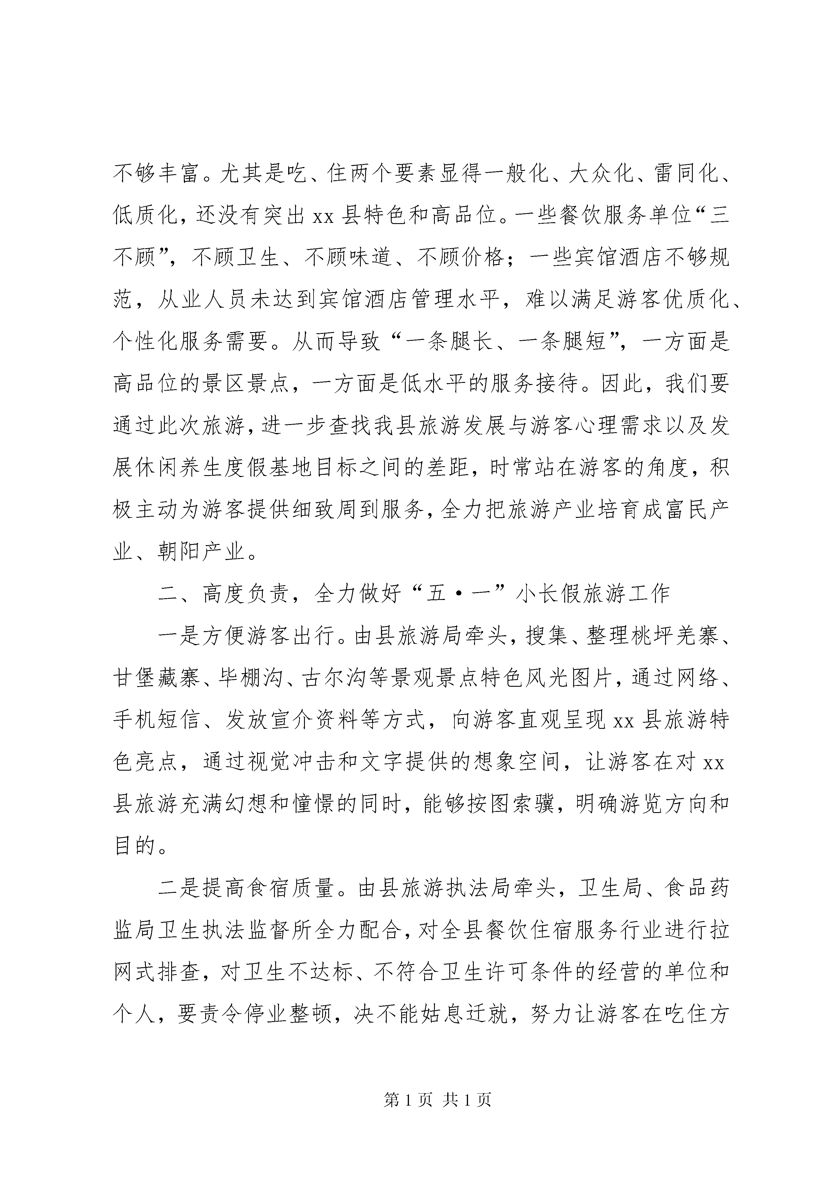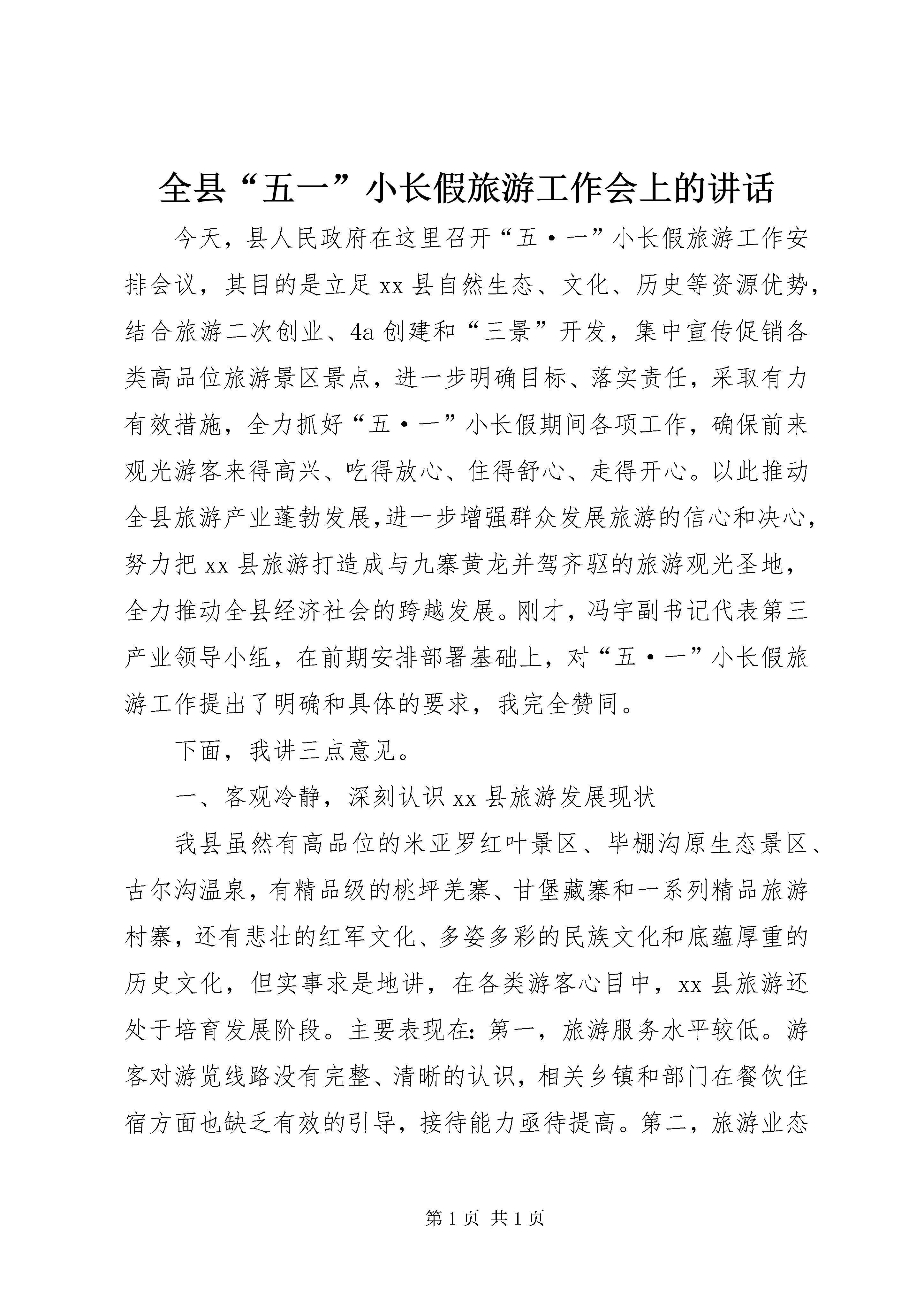全县“五一”小长假旅游工作会上的讲话今天,县人民政府在这里召开“五·一”小长假旅游工作安排会议,其目的是立足xx县自然生态、文化、历史等资源优势,结合旅游二次创业、4a创建和“三景”开发,集中宣传促销各类高品位旅游景区景点,进一步明确目标、落实责任,采取有力有效措施,全力抓好“五·一”小长假期间各项工作,确保前来观光游客来得高兴、吃得放心、住得舒心、走得开心。以此推动全县旅游产业蓬勃发展,进一步增强群众发展旅游的信心和决心,努力把xx县旅游打造成与九寨黄龙并驾齐驱的旅游观光圣地,全力推动全县经济社会的跨越发展。刚才,冯宇副书记代表第三产业领导小组,在前期安排部署基础上,对“五·一”小长假旅游工作提出了明确和具体的要求,我完全赞同。下面,我讲三点意见。一、客观冷静,深刻认识xx县旅游发展现状我县虽然有高品位的米亚罗红叶景区、毕棚沟原生态景区、古尔沟温泉,有精品级的桃坪羌寨、甘堡藏寨和一系列精品旅游村寨,还有悲壮的红军文化、多姿多彩的民族文化和底蕴厚重的历史文化,但实事求是地讲,在各类游客心目中,xx县旅游还处于培育发展阶段。主要表现在:第一,旅游服务水平较低。游客对游览线路没有完整、清晰的认识,相关乡镇和部门在餐饮住宿方面也缺乏有效的引导,接待能力亟待提高。第二,旅游业态不够丰富。尤其是吃、住两个要素显得一般化、大众化、雷同化、低质化,还没有突出xx县特色和高品位。一些餐饮服务单位“三不顾”,不顾卫生、不顾味道、不顾价格;一些宾馆酒店不够规范,从业人员未达到宾馆酒店管理水平,难以满足游客优质化、个性化服务需要。从而导致“一条腿长、一条腿短”,一方面是高品位的景区景点,一方面是低水平的服务接待。因此,我们要通过此次旅游,进一步查找我县旅游发展与游客心理需求以及发展休闲养生度假基地目标之间的差距,时常站在游客的角度,积极主动为游客提供细致周到服务,全力把旅游产业培育成富民产业、朝阳产业。二、高度负责,全力做好“五·一”小长假旅游工作一是方便游客出行。由县旅游局牵头,搜集、整理桃坪羌寨、甘堡藏寨、毕棚沟、古尔沟等景观景点特色风光图片,通过网络、手机短信、发放宣介资料等方式,向游客直观呈现xx县旅游特色亮点,通过视觉冲击和文字提供的想象空间,让游客在对xx县旅游充满幻想和憧憬的同时,能够按图索骥,明确游览方向和目的。二是提高食宿质量。由县旅游执法局牵头,卫生局、食品药监局卫生执法监督所全力配合,对全县餐饮住宿服务行业进行拉网式排查,对卫生不达标、不符合卫生许可条件的经营的单位和个人,要责令停业整顿,决不能姑息迁就,努力让游客在吃住方面较去年有较大改善。床单被套必须落实一客一换,提升旅游住宿接待水平。各乡镇要xx县物价、工商部门要与公安机关联合执法,对具有接待能力的农户逐户查看,督促各餐饮、住宿和旅游纪念品经营户明码标价、货真价实,实行各宾馆饭店(包括xx区、民居接待)凭身份证登记入住制度,发现违法违规经营行为,必须依法打击,绝不手软,促进依法合规经营,切实提高旅游服务质量和水平。三是高度重视安全。食品药监、交通、公安等相关部门必须履职尽责,要制定完整的、能落到实处的、具有可操作性的方案,全力保障食品卫生安全、道路交通安全、社会治安安全、游客人身财产安全、消防安全、网吧、娱乐场所安全,全面落实应急救护措施。四是突出工作重点。针对“一线三点”(指国道317沿线,桃坪羌寨、甘堡藏寨和杂谷脑、毕棚沟和米亚罗)五·一小长假游客相对集中区域,做好旅游接待工作,努力让所有游客能够有序流动,按照日程安排进行游览。要进一步摸清桃坪羌寨、甘堡藏寨等重点景区餐饮住宿接待能力,要在餐饮档次、菜品质量和服务程序方面制定一整套措施,提前研究制定应对游客高峰的应急措施和办法。请各乡镇召集辖区内具有接待能力的村寨、宾馆饭店的负责人开会,讲明利害关系,不能为了眼前利益,损害长远利益,损害xx县长期宣传的旅游对外形象。同时要着力充实讲解队伍,在桃坪、甘堡要有10-20人左右的讲解人员,努力满足游客需求,向游客提供有特色、有亮点的讲解服务,充分展示我县藏羌文化魅力。在全县旅游景点历史、文化、风土人情,辖区群众生产生活现状、发展旅游产业的愿望等各方面形成系统,不断丰富全县旅游业态。五是丰富民俗表演。针对甘堡藏寨、桃坪羌寨和毕棚沟开展主题鲜明的民族文化活动,通过民族文化、民间艺人绝技的展示,组织群众锅庄比赛,突出互动参与环节,让游客感受浓烈的民风民俗,营造良好旅游环境。六是狠抓宣传促销。要在去年基础上,进一步围绕既定方案,加大旅游宣传力度。通过xx经视、新闻资讯频道和报刊杂志做好宣传,拍摄高质量、高水平专题片,与成都地铁公司对接,在地铁上滚动播出或展出xx县旅游景区景点的简介视频和图片。县广电局要通过网络和电视台,滚动播放米亚罗红叶温泉节、吉祥之地新x