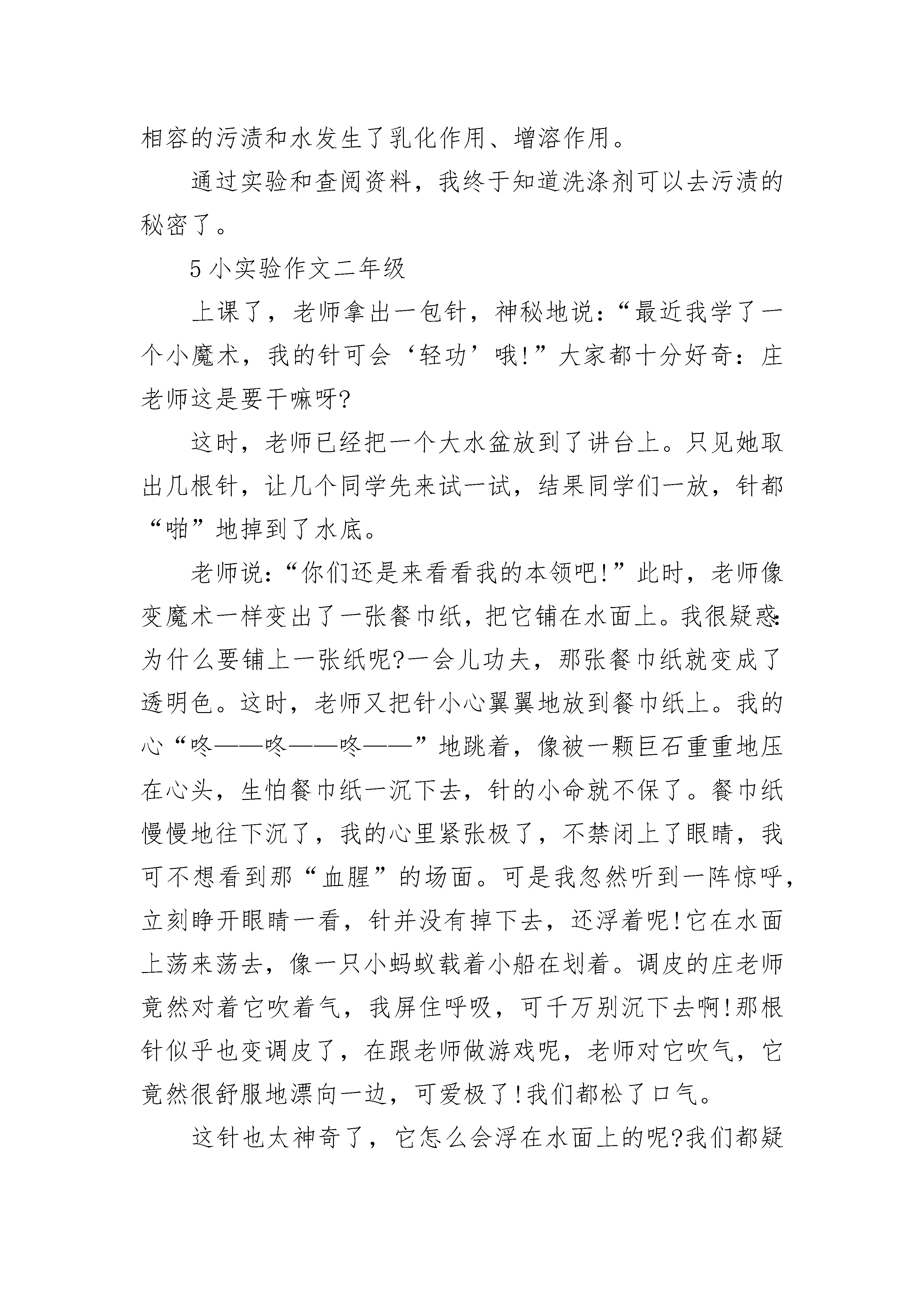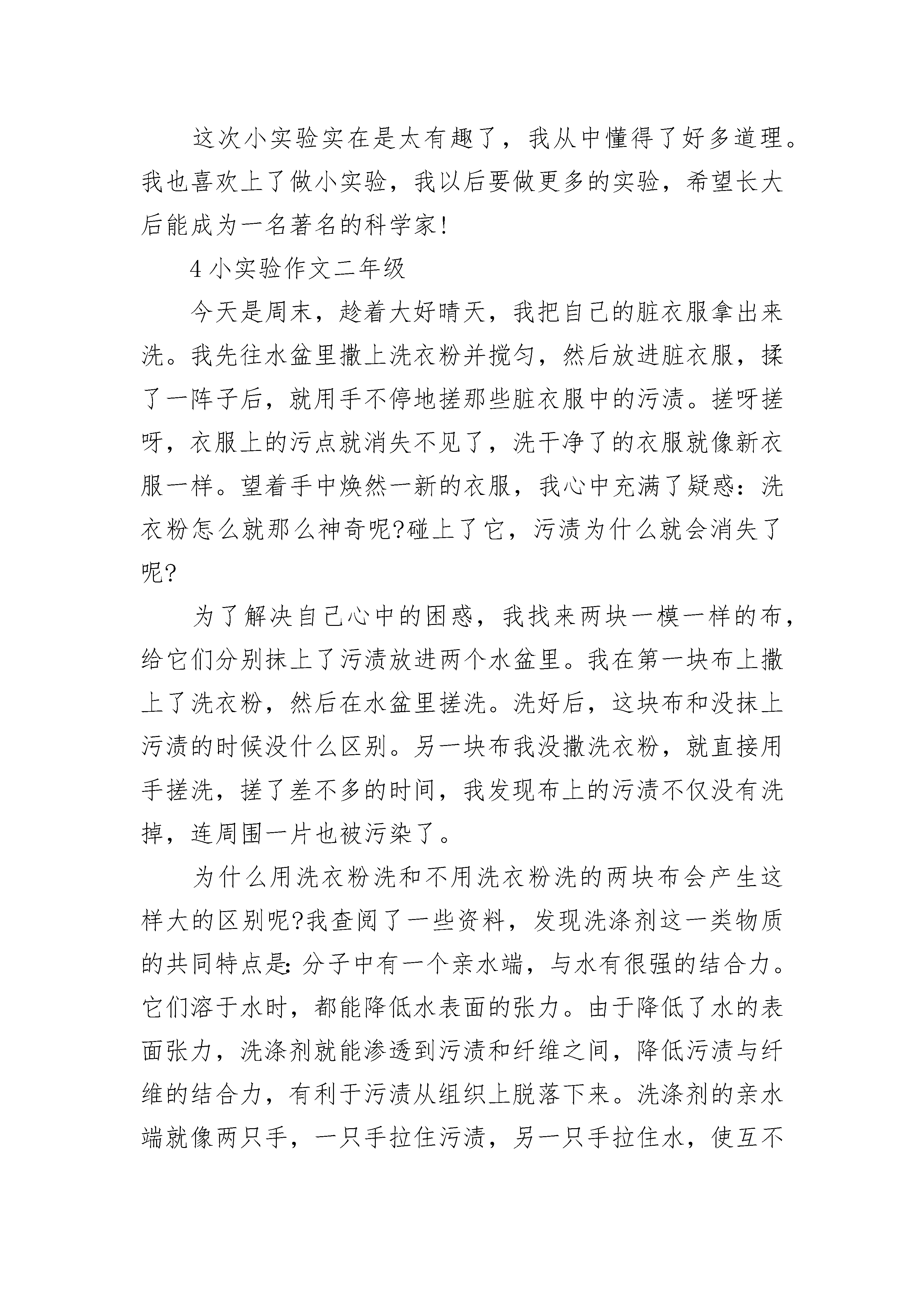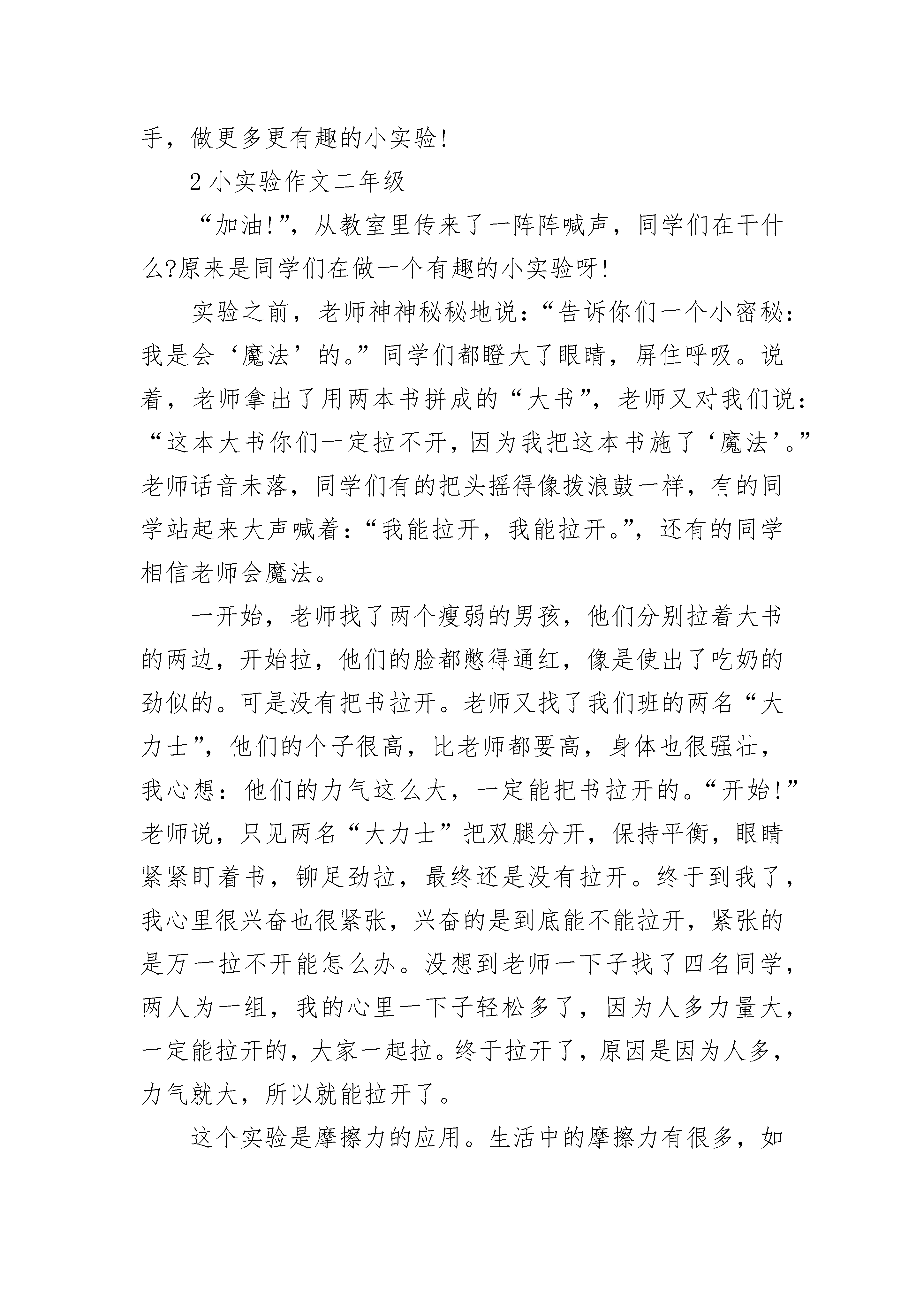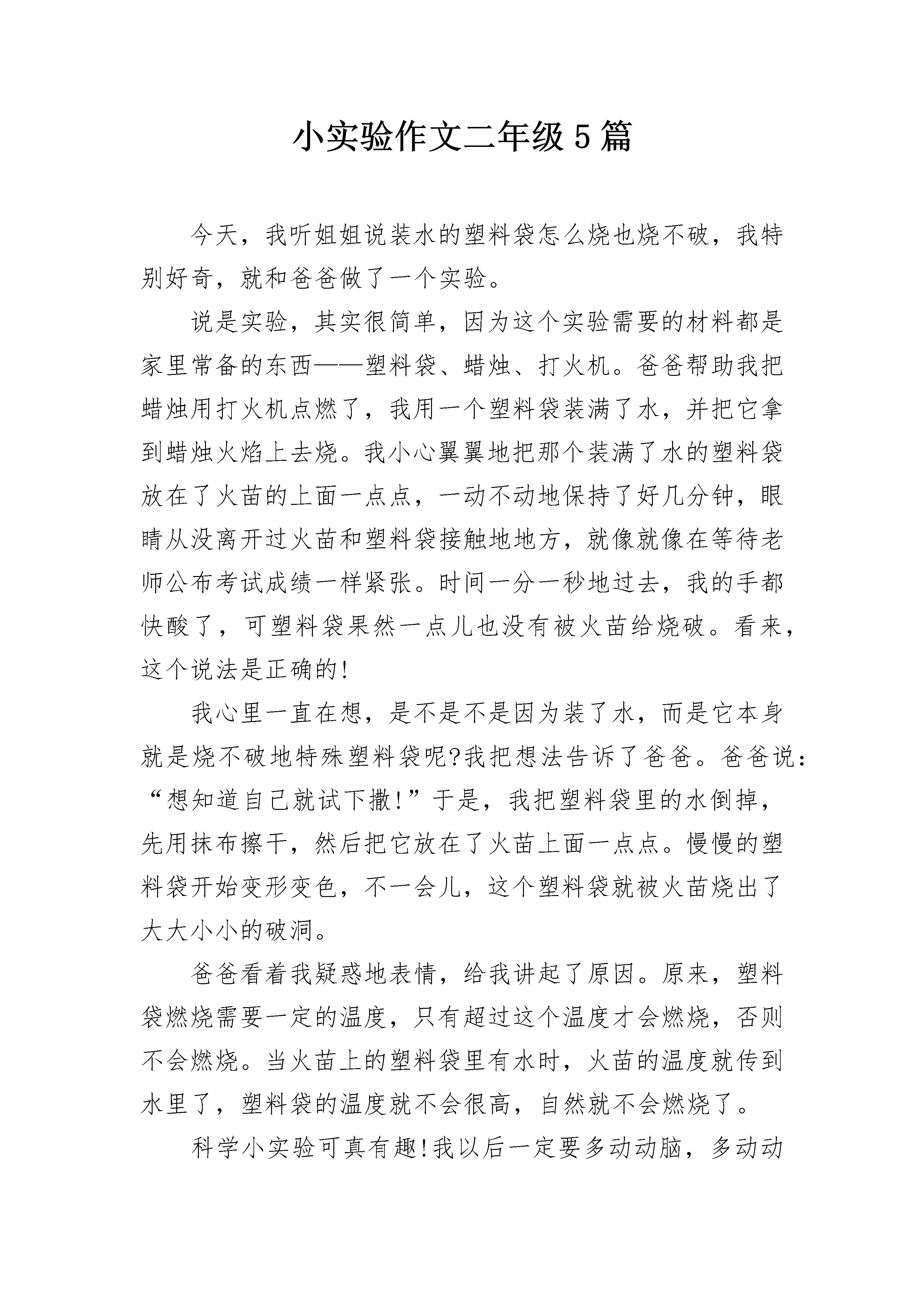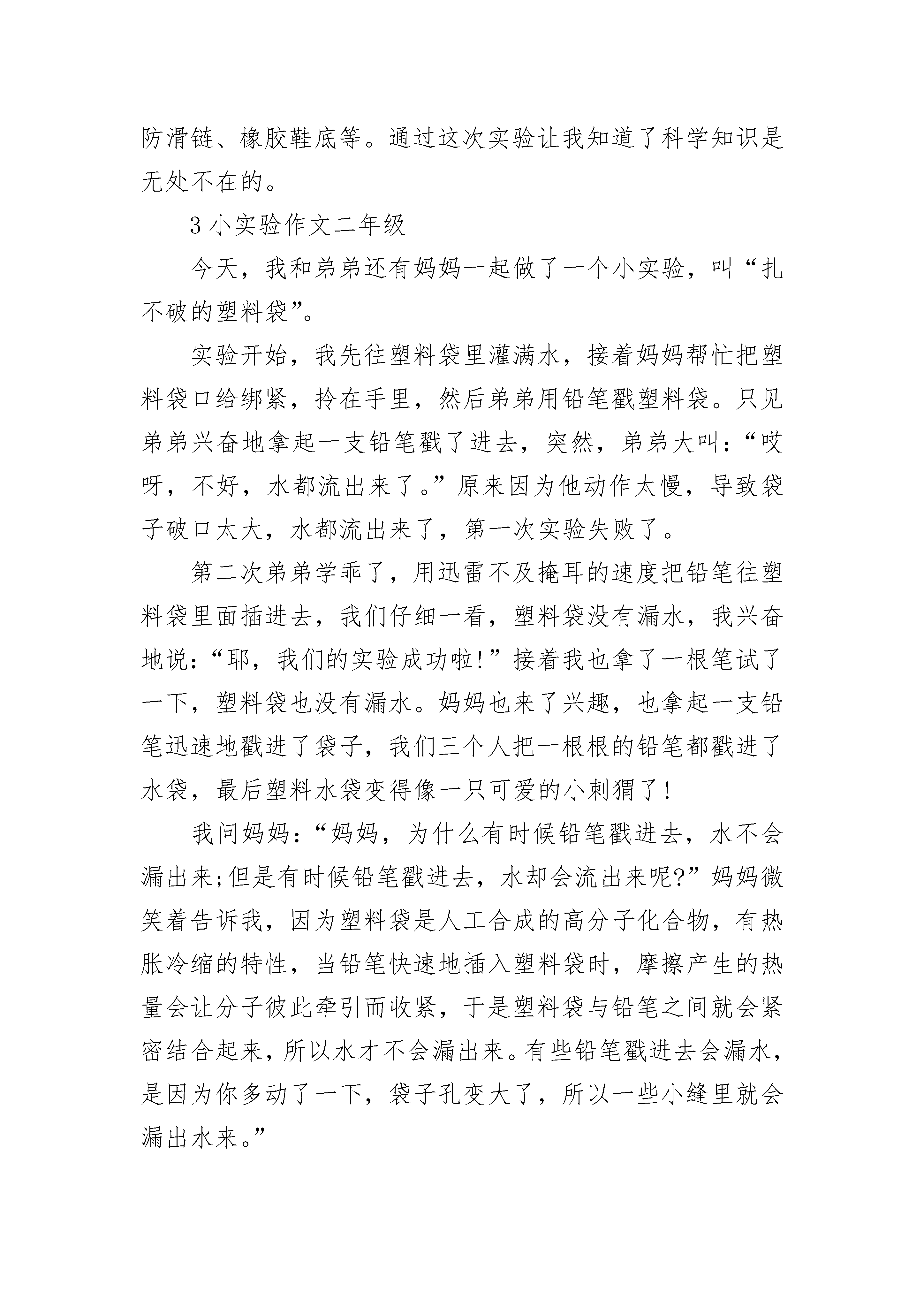 小实验作文二年级5篇今天,我听姐姐说装水的塑料袋怎么烧也烧不破,我特别好奇,就和爸爸做了一个实验。说是实验,其实很简单,因为这个实验需要的材料都是家里常备的东西——塑料袋、蜡烛、打火机。爸爸帮助我把蜡烛用打火机点燃了,我用一个塑料袋装满了水,并把它拿到蜡烛火焰上去烧。我小心翼翼地把那个装满了水的塑料袋放在了火苗的上面一点点,一动不动地保持了好几分钟,眼睛从没离开过火苗和塑料袋接触地地方,就像就像在等待老师公布考试成绩一样紧张。时间一分一秒地过去,我的手都快酸了,可塑料袋果然一点儿也没有被火苗给烧破。看来,这个说法是正确的!我心里一直在想,是不是不是因为装了水,而是它本身就是烧不破地特殊塑料袋呢?我把想法告诉了爸爸。爸爸说:“想知道自己就试下撒!”于是,我把塑料袋里的水倒掉,先用抹布擦干,然后把它放在了火苗上面一点点。慢慢的塑料袋开始变形变色,不一会儿,这个塑料袋就被火苗烧出了大大小小的破洞。爸爸看着我疑惑地表情,给我讲起了原因。原来,塑料袋燃烧需要一定的温度,只有超过这个温度才会燃烧,否则不会燃烧。当火苗上的塑料袋里有水时,火苗的温度就传到水里了,塑料袋的温度就不会很高,自然就不会燃烧了。科学小实验可真有趣!我以后一定要多动动脑,多动动手,做更多更有趣的小实验!2小实验作文二年级“加油!”,从教室里传来了一阵阵喊声,同学们在干什么?原来是同学们在做一个有趣的小实验呀!实验之前,老师神神秘秘地说:“告诉你们一个小密秘:我是会‘魔法’的。”同学们都瞪大了眼睛,屏住呼吸。说着,老师拿出了用两本书拼成的“大书”,老师又对我们说:“这本大书你们一定拉不开,因为我把这本书施了‘魔法’。”老师话音未落,同学们有的把头摇得像拨浪鼓一样,有的同学站起来大声喊着:“我能拉开,我能拉开。”,还有的同学相信老师会魔法。一开始,老师找了两个瘦弱的男孩,他们分别拉着大书的两边,开始拉,他们的脸都憋得通红,像是使出了吃奶的劲似的。可是没有把书拉开。老师又找了我们班的两名“大力士”,他们的个子很高,比老师都要高,身体也很强壮,我心想:他们的力气这么大,一定能把书拉开的。“开始!”老师说,只见两名“大力士”把双腿分开,保持平衡,眼睛紧紧盯着书,铆足劲拉,最终还是没有拉开。终于到我了,我心里很兴奋也很紧张,兴奋的是到底能不能拉开,紧张的是万一拉不开能怎么办。没想到老师一下子找了四名同学,两人为一组,我的心里一下子轻松多了,因为人多力量大,一定能拉开的,大家一起拉。终于拉开了,原因是因为人多,力气就大,所以就能拉开了。这个实验是摩擦力的应用。生活中的摩擦力有很多,如防滑链、橡胶鞋底等。通过这次实验让我知道了科学知识是无处不在的。3小实验作文二年级今天,我和弟弟还有妈妈一起做了一个小实验,叫“扎不破的塑料袋”。实验开始,我先往塑料袋里灌满水,接着妈妈帮忙把塑料袋口给绑紧,拎在手里,然后弟弟用铅笔戳塑料袋。只见弟弟兴奋地拿起一支铅笔戳了进去,突然,弟弟大叫:“哎呀,不好,水都流出来了。”原来因为他动作太慢,导致袋子破口太大,水都流出来了,第一次实验失败了。第二次弟弟学乖了,用迅雷不及掩耳的速度把铅笔往塑料袋里面插进去,我们仔细一看,塑料袋没有漏水,我兴奋地说:“耶,我们的实验成功啦!”接着我也拿了一根笔试了一下,塑料袋也没有漏水。妈妈也来了兴趣,也拿起一支铅笔迅速地戳进了袋子,我们三个人把一根根的铅笔都戳进了水袋,最后塑料水袋变得像一只可爱的小刺猬了!我问妈妈:“妈妈,为什么有时候铅笔戳进去,水不会漏出来;但是有时候铅笔戳进去,水却会流出来呢?”妈妈微笑着告诉我,因为塑料袋是人工合成的高分子化合物,有热胀冷缩的特性,当铅笔快速地插入塑料袋时,摩擦产生的热量会让分子彼此牵引而收紧,于是塑料袋与铅笔之间就会紧密结合起来,所以水才不会漏出来。有些铅笔戳进去会漏水,是因为你多动了一下,袋子孔变大了,所以一些小缝里就会漏出水来。”这次小实验实在是太有趣了,我从中懂得了好多道理。我也喜欢上了做小实验,我以后要做更多的实验,希望长大后能成为一名著名的科学家!4小实验作文二年级今天是周末,趁着大好晴天,我把自己的脏衣服拿出来洗。我先往水盆里撒上洗衣粉并搅匀,然后放进脏衣服,揉了一阵子后,就用手不停地搓那些脏衣服中的污渍。搓呀搓呀,衣服上的污点就消失不见了,洗干净了的衣服就像新衣服一样。望着手中焕然一新的衣服,我心中充满了疑惑:洗衣粉怎么就那么神奇呢?碰上了它,污渍为什么就会消失了呢?为了解决自己心中的困惑,我找来两块一模一样的布,给它们分别抹上了污渍放进两个水盆里。我在第一块布上撒上了洗衣粉,然后在水盆里搓洗。洗好后,这块布和没抹上污渍的时候没什么区别。另一块布我没撒洗衣粉,就直接用手搓洗,搓了差不多的时间,我发现布上的污渍不仅没有洗掉,连周围一片也被污染了。为什么用洗衣粉洗和不