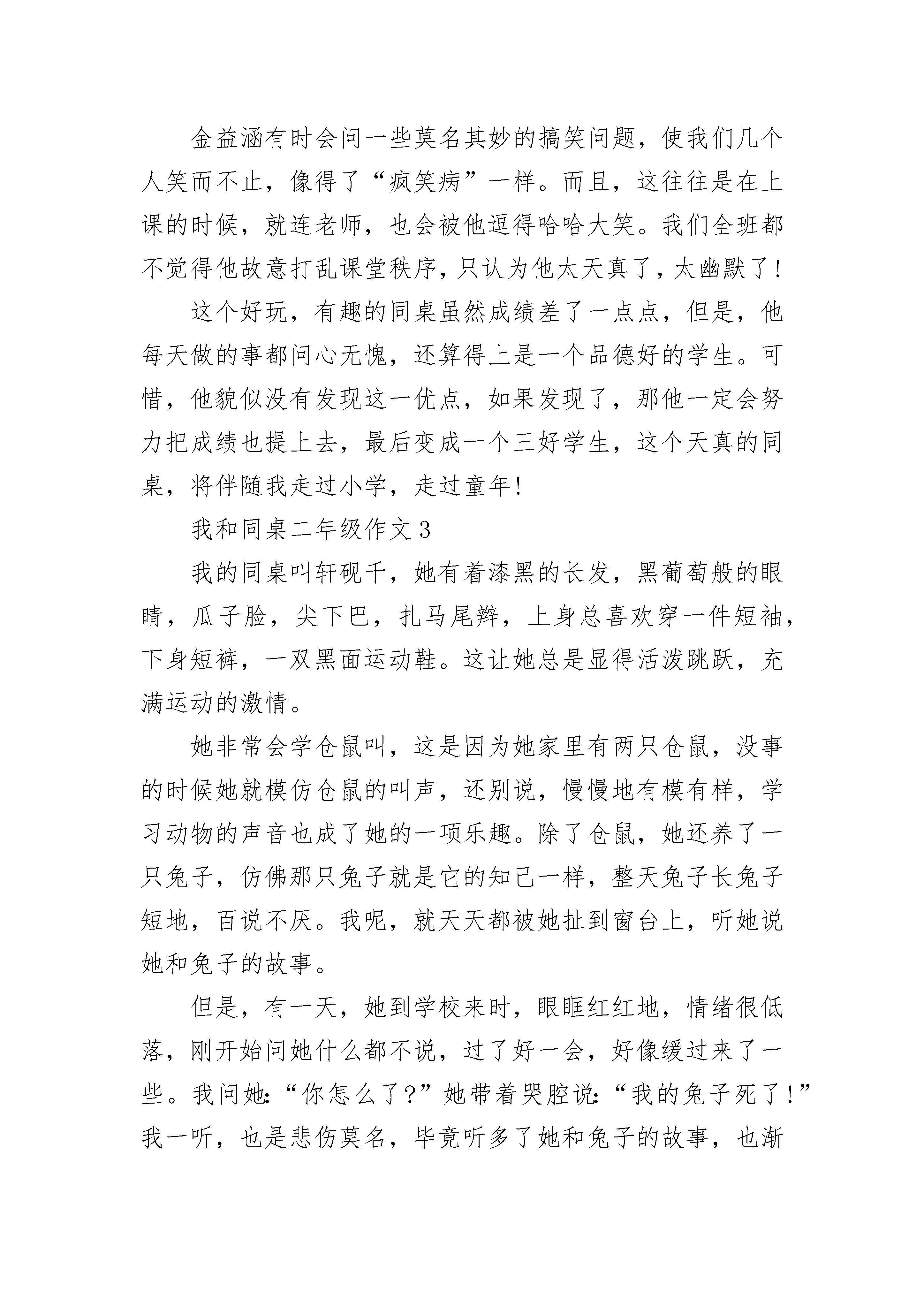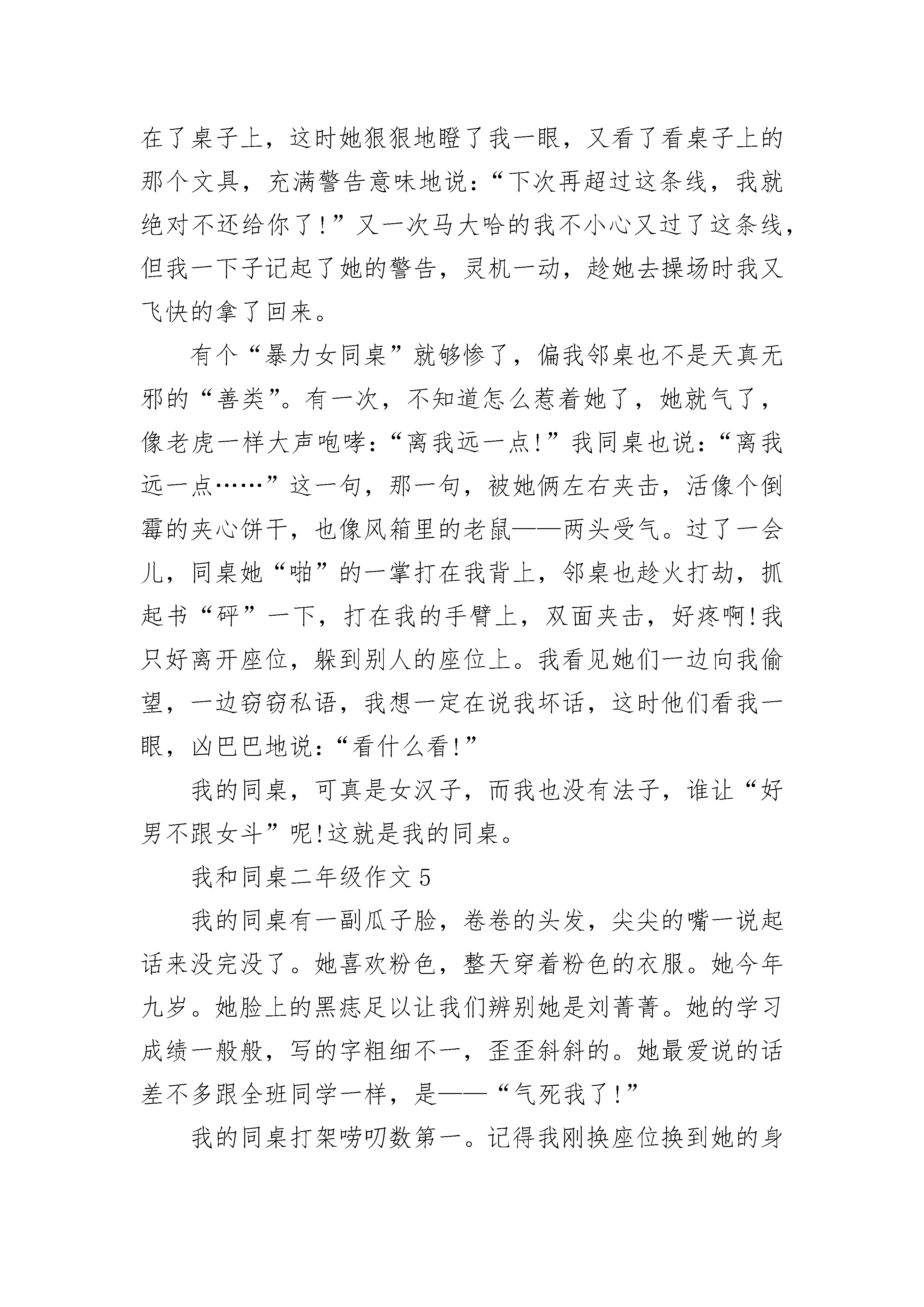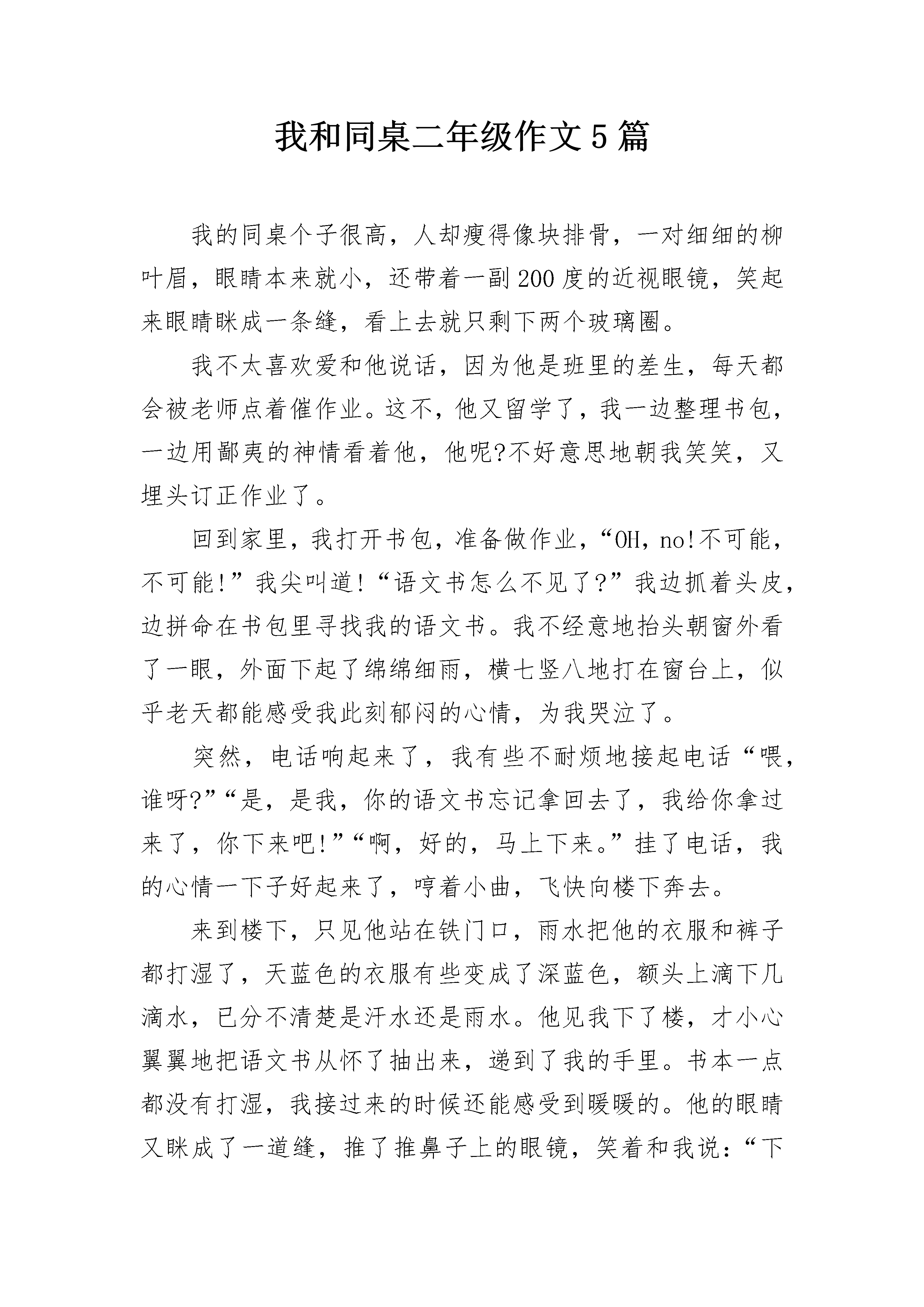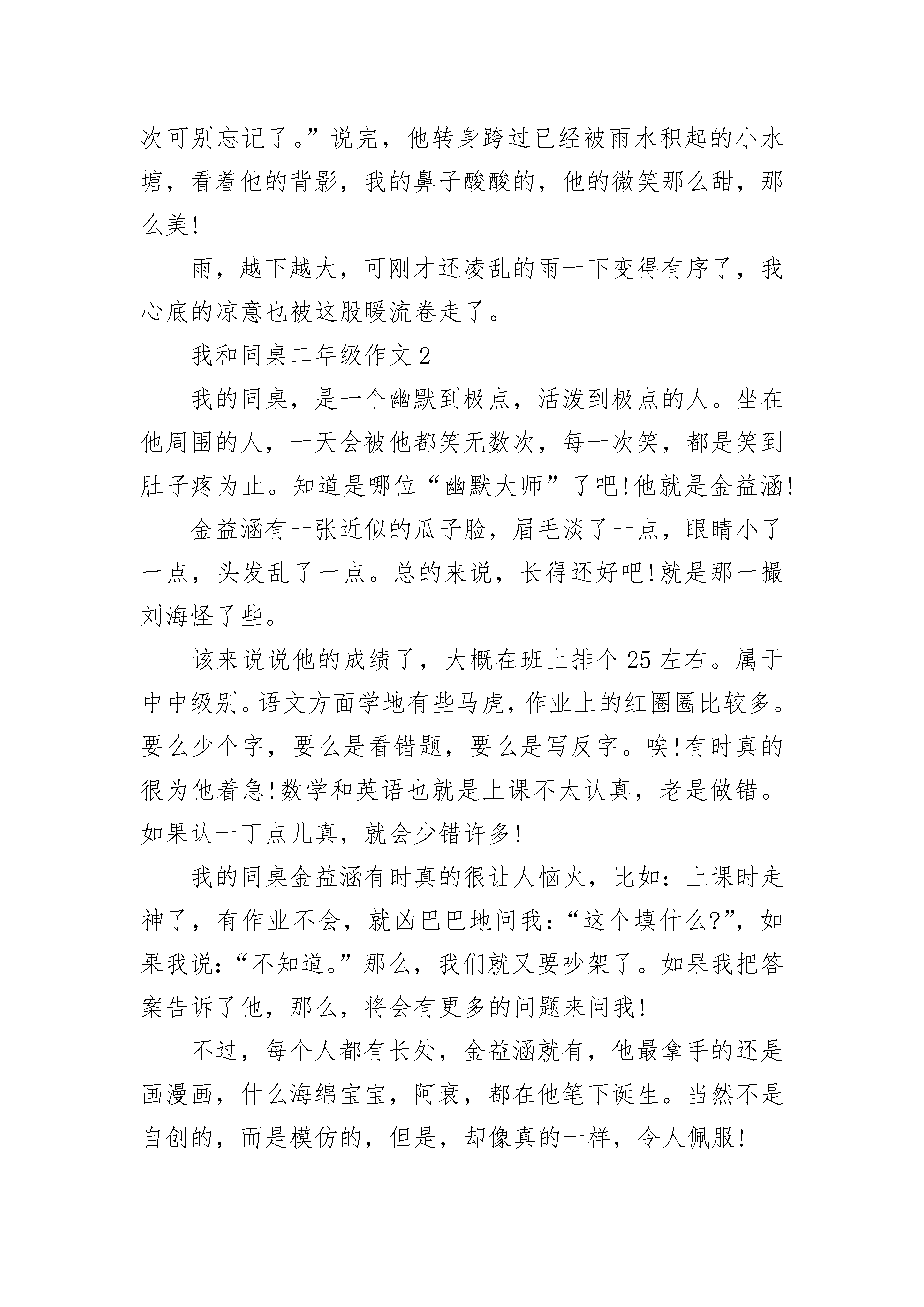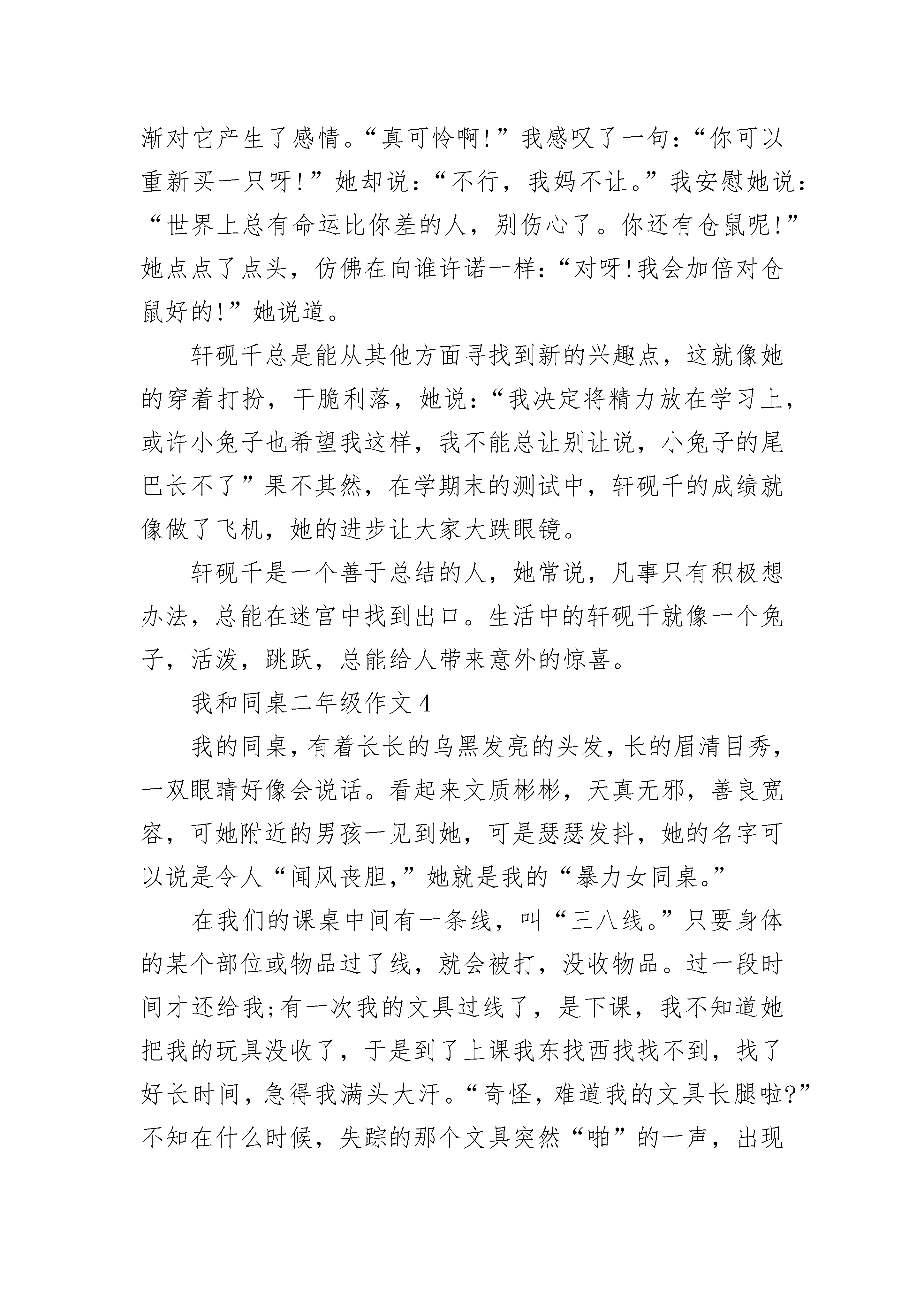 我和同桌二年级作文5篇我的同桌个子很高,人却瘦得像块排骨,一对细细的柳叶眉,眼睛本来就小,还带着一副200度的近视眼镜,笑起来眼睛眯成一条缝,看上去就只剩下两个玻璃圈。我不太喜欢爱和他说话,因为他是班里的差生,每天都会被老师点着催作业。这不,他又留学了,我一边整理书包,一边用鄙夷的神情看着他,他呢?不好意思地朝我笑笑,又埋头订正作业了。回到家里,我打开书包,准备做作业,“OH,no!不可能,不可能!”我尖叫道!“语文书怎么不见了?”我边抓着头皮,边拼命在书包里寻找我的语文书。我不经意地抬头朝窗外看了一眼,外面下起了绵绵细雨,横七竖八地打在窗台上,似乎老天都能感受我此刻郁闷的心情,为我哭泣了。突然,电话响起来了,我有些不耐烦地接起电话“喂,谁呀?”“是,是我,你的语文书忘记拿回去了,我给你拿过来了,你下来吧!”“啊,好的,马上下来。”挂了电话,我的心情一下子好起来了,哼着小曲,飞快向楼下奔去。来到楼下,只见他站在铁门口,雨水把他的衣服和裤子都打湿了,天蓝色的衣服有些变成了深蓝色,额头上滴下几滴水,已分不清楚是汗水还是雨水。他见我下了楼,才小心翼翼地把语文书从怀了抽出来,递到了我的手里。书本一点都没有打湿,我接过来的时候还能感受到暖暖的。他的眼睛又眯成了一道缝,推了推鼻子上的眼镜,笑着和我说:“下次可别忘记了。”说完,他转身跨过已经被雨水积起的小水塘,看着他的背影,我的鼻子酸酸的,他的微笑那么甜,那么美!雨,越下越大,可刚才还凌乱的雨一下变得有序了,我心底的凉意也被这股暖流卷走了。我和同桌二年级作文2我的同桌,是一个幽默到极点,活泼到极点的人。坐在他周围的人,一天会被他都笑无数次,每一次笑,都是笑到肚子疼为止。知道是哪位“幽默大师”了吧!他就是金益涵!金益涵有一张近似的瓜子脸,眉毛淡了一点,眼睛小了一点,头发乱了一点。总的来说,长得还好吧!就是那一撮刘海怪了些。该来说说他的成绩了,大概在班上排个25左右。属于中中级别。语文方面学地有些马虎,作业上的红圈圈比较多。要么少个字,要么是看错题,要么是写反字。唉!有时真的很为他着急!数学和英语也就是上课不太认真,老是做错。如果认一丁点儿真,就会少错许多!我的同桌金益涵有时真的很让人恼火,比如:上课时走神了,有作业不会,就凶巴巴地问我:“这个填什么?”,如果我说:“不知道。”那么,我们就又要吵架了。如果我把答案告诉了他,那么,将会有更多的问题来问我!不过,每个人都有长处,金益涵就有,他最拿手的还是画漫画,什么海绵宝宝,阿衰,都在他笔下诞生。当然不是自创的,而是模仿的,但是,却像真的一样,令人佩服!金益涵有时会问一些莫名其妙的搞笑问题,使我们几个人笑而不止,像得了“疯笑病”一样。而且,这往往是在上课的时候,就连老师,也会被他逗得哈哈大笑。我们全班都不觉得他故意打乱课堂秩序,只认为他太天真了,太幽默了!这个好玩,有趣的同桌虽然成绩差了一点点,但是,他每天做的事都问心无愧,还算得上是一个品德好的学生。可惜,他貌似没有发现这一优点,如果发现了,那他一定会努力把成绩也提上去,最后变成一个三好学生,这个天真的同桌,将伴随我走过小学,走过童年!我和同桌二年级作文3我的同桌叫轩砚千,她有着漆黑的长发,黑葡萄般的眼睛,瓜子脸,尖下巴,扎马尾辫,上身总喜欢穿一件短袖,下身短裤,一双黑面运动鞋。这让她总是显得活泼跳跃,充满运动的激情。她非常会学仓鼠叫,这是因为她家里有两只仓鼠,没事的时候她就模仿仓鼠的叫声,还别说,慢慢地有模有样,学习动物的声音也成了她的一项乐趣。除了仓鼠,她还养了一只兔子,仿佛那只兔子就是它的知己一样,整天兔子长兔子短地,百说不厌。我呢,就天天都被她扯到窗台上,听她说她和兔子的故事。但是,有一天,她到学校来时,眼眶红红地,情绪很低落,刚开始问她什么都不说,过了好一会,好像缓过来了一些。我问她:“你怎么了?”她带着哭腔说:“我的兔子死了!”我一听,也是悲伤莫名,毕竟听多了她和兔子的故事,也渐渐对它产生了感情。“真可怜啊!”我感叹了一句:“你可以重新买一只呀!”她却说:“不行,我妈不让。”我安慰她说:“世界上总有命运比你差的人,别伤心了。你还有仓鼠呢!”她点点了点头,仿佛在向谁许诺一样:“对呀!我会加倍对仓鼠好的!”她说道。轩砚千总是能从其他方面寻找到新的兴趣点,这就像她的穿着打扮,干脆利落,她说:“我决定将精力放在学习上,或许小兔子也希望我这样,我不能总让别让说,小兔子的尾巴长不了”果不其然,在学期末的测试中,轩砚千的成绩就像做了飞机,她的进步让大家大跌眼镜。轩砚千是一个善于总结的人,她常说,凡事只有积极想办法,总能在迷宫中找到出口。生活中的轩砚千就像一个兔子,活泼,跳跃,总能给人带来意外的惊喜。我和同桌二年级作文4我的同桌,有着长长的乌黑发亮的头发,长的眉清目秀,一双眼睛好像会说话。看起来文