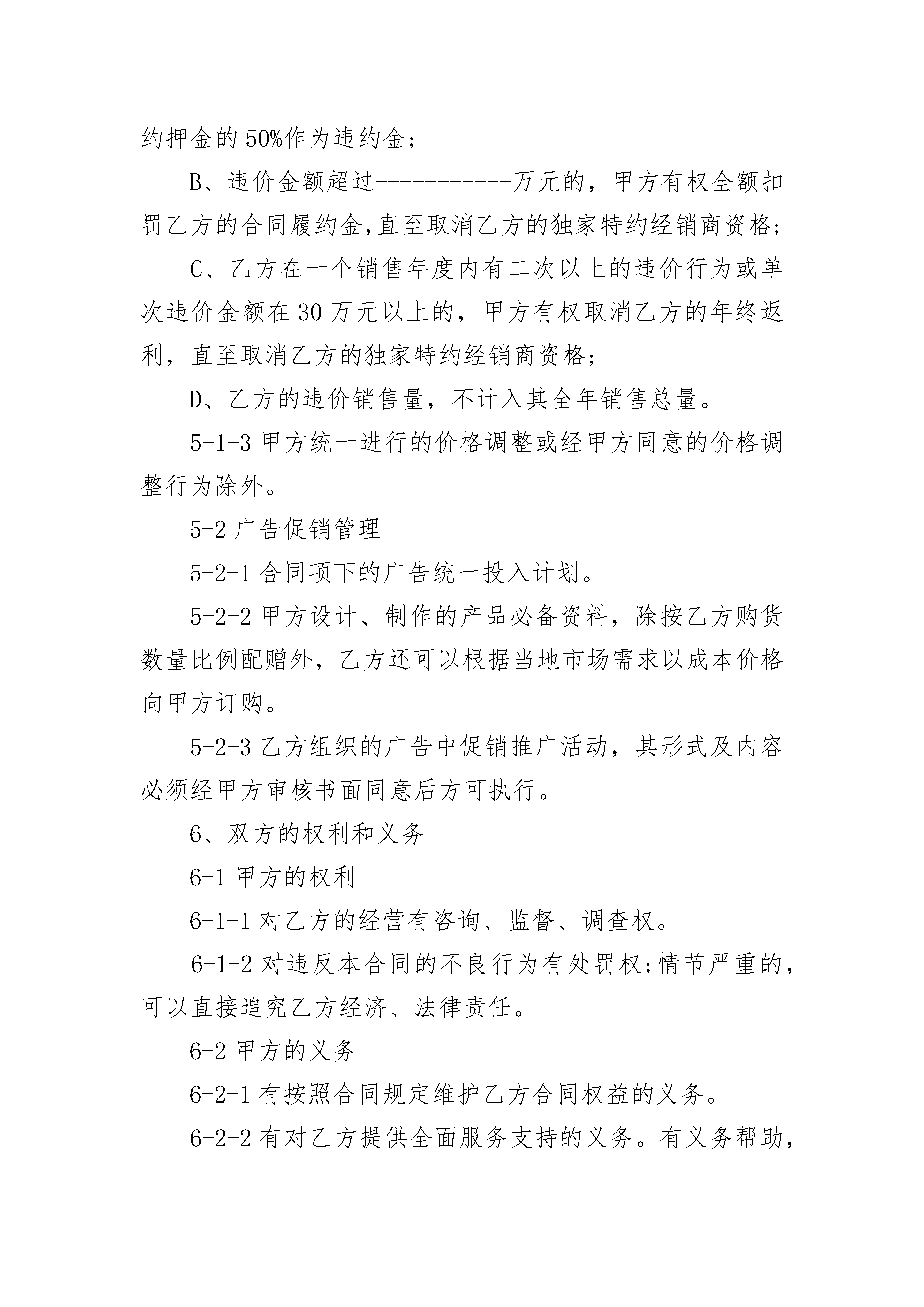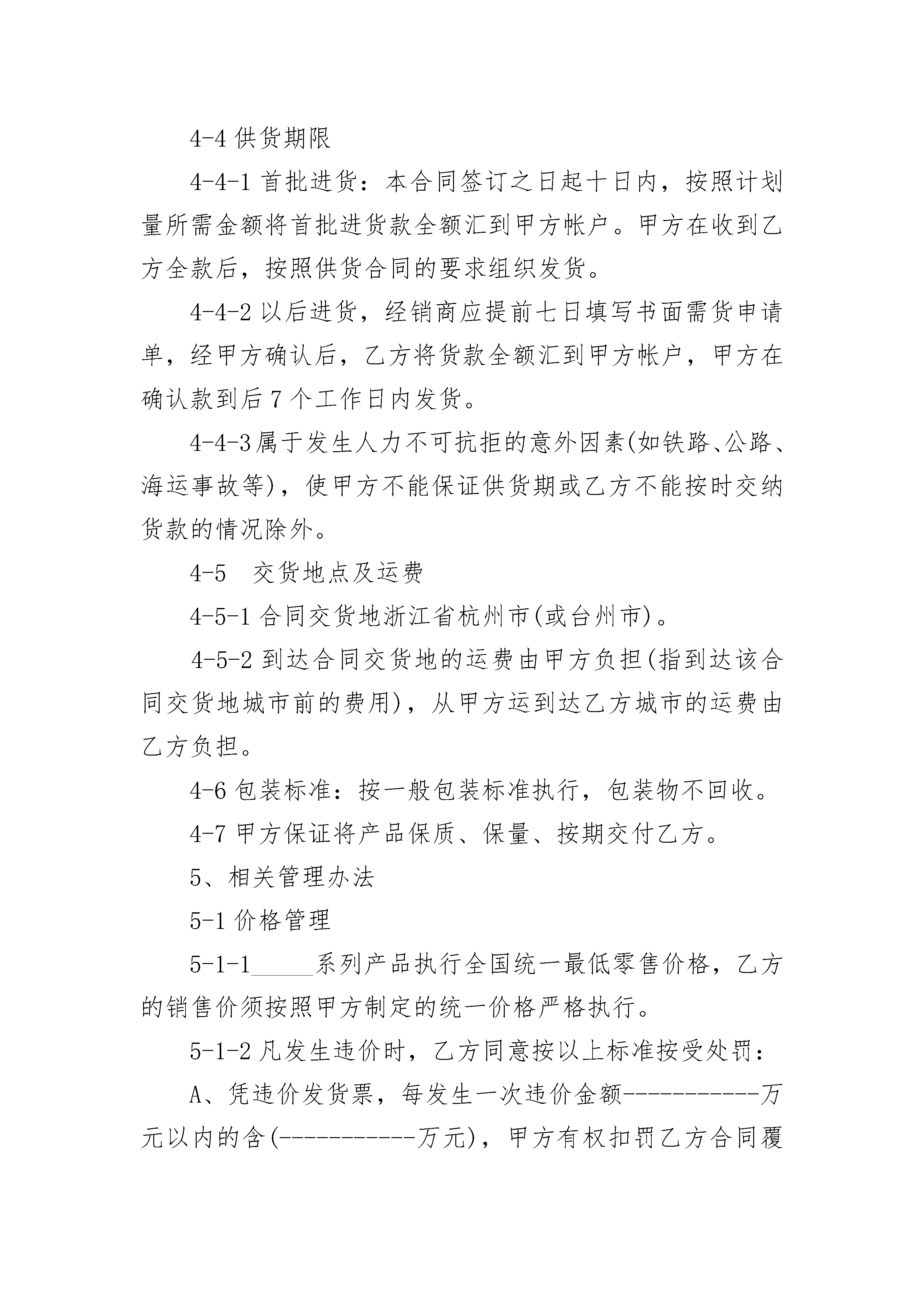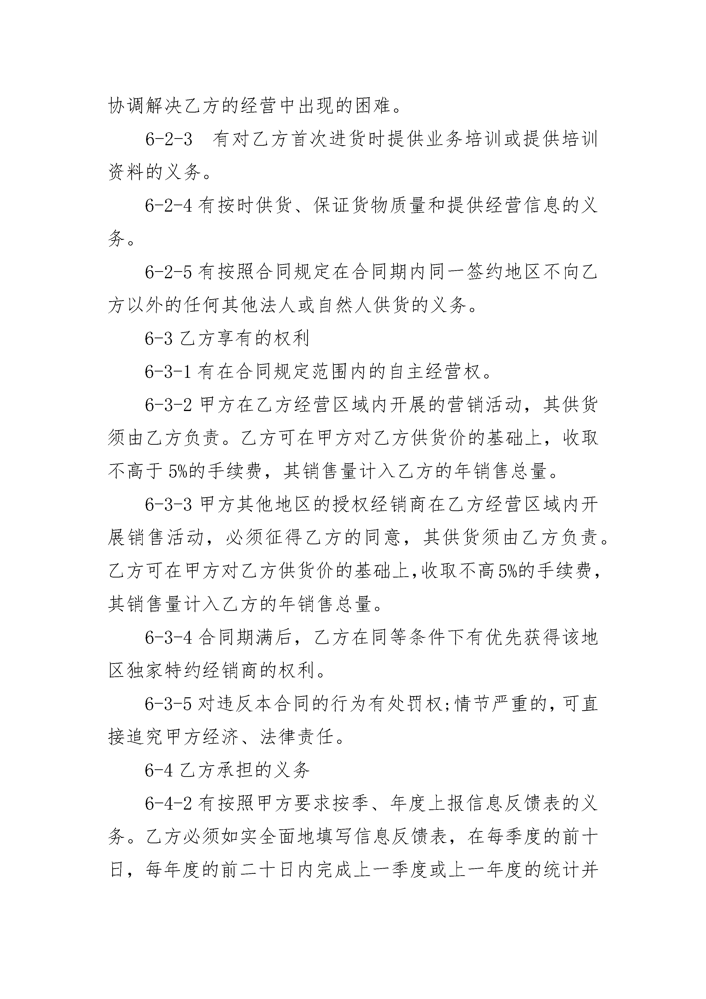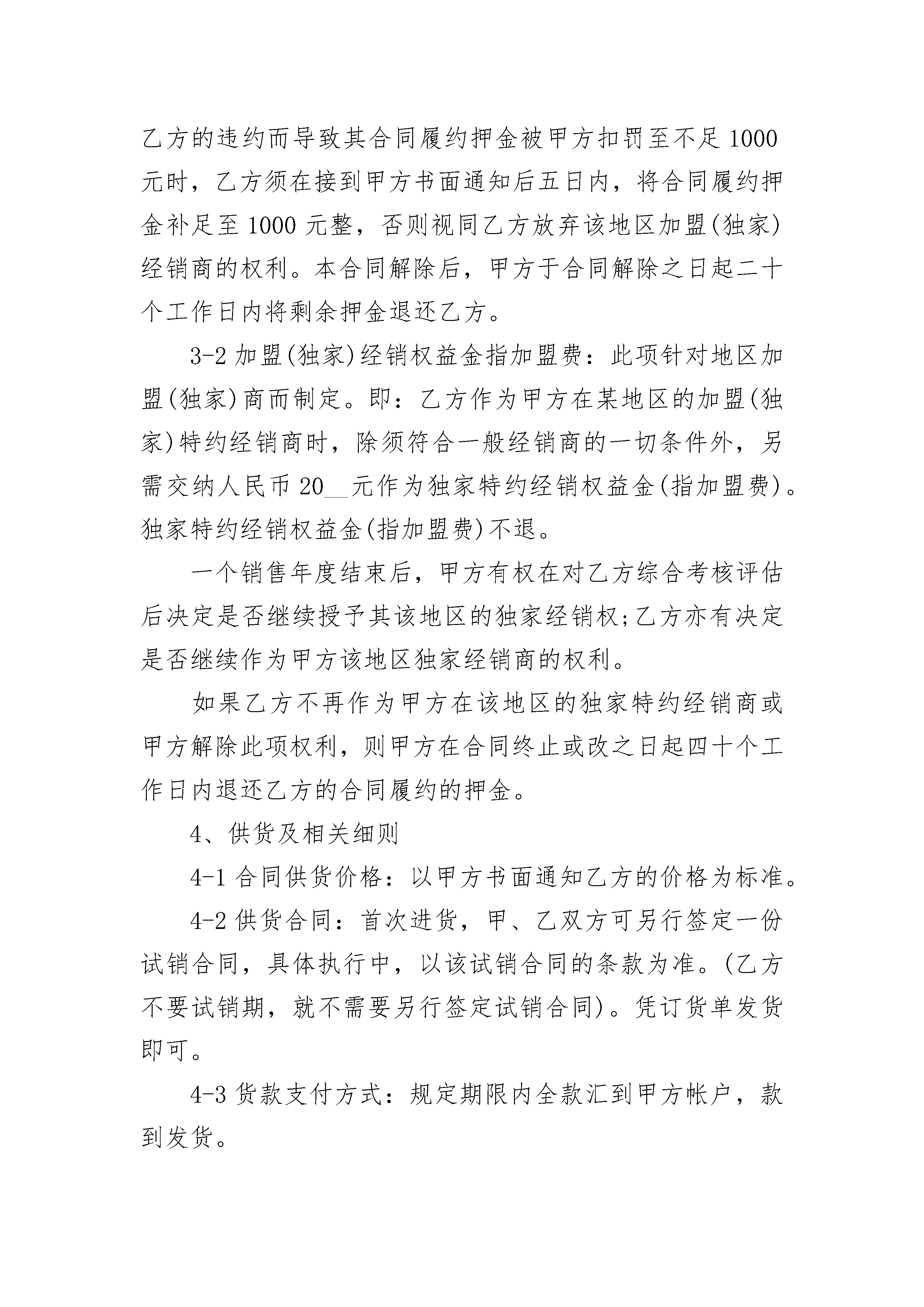加盟经销加盟经销(精选20篇)加盟经销篇1加盟(独家)经销合同范本合同签署地:浙江省杭州市合同编号:甲方:杭州车龙汽车用*有限公司乙方:为保护甲乙双方的合法权益,根据国家有关法律,法规规定,秉着诚实守信,互惠互利的原则,双方协商一致,特订立本合同。1、甲乙双方均同意按照本合同内容之规定执行。甲方授权乙方作为_______县(市)杭州车龙持有的车龙车饰商标独家使用权。相关系列产品加盟(独家)授权经销商。公司在该县(市)不再发展第二家加盟(独家)经销商。2、20__年度合同标的_____万元;以后年度的标准双方届时视情况协商而定。2-1经销商首批进货金额----------万元;2-2经销商全年进货金额----------万元;2-3完成销售量及年终返利。3、合同履约押金及独家特约经销权益金(加盟费)。3-1合同履约押金:乙方在本合同签定之日起十日内,须支付人民币1000元给甲方,作为合同履约的押金。由于乙方的违约而导致其合同履约押金被甲方扣罚至不足1000元时,乙方须在接到甲方书面通知后五日内,将合同履约押金补足至1000元整,否则视同乙方放弃该地区加盟(独家)经销商的权利。本合同解除后,甲方于合同解除之日起二十个工作日内将剩余押金退还乙方。3-2加盟(独家)经销权益金指加盟费:此项针对地区加盟(独家)商而制定。即:乙方作为甲方在某地区的加盟(独家)特约经销商时,除须符合一般经销商的一切条件外,另需交纳人民币20__元作为独家特约经销权益金(指加盟费)。独家特约经销权益金(指加盟费)不退。一个销售年度结束后,甲方有权在对乙方综合考核评估后决定是否继续授予其该地区的独家经销权;乙方亦有决定是否继续作为甲方该地区独家经销商的权利。如果乙方不再作为甲方在该地区的独家特约经销商或甲方解除此项权利,则甲方在合同终止或改之日起四十个工作日内退还乙方的合同履约的押金。4、供货及相关细则4-1合同供货价格:以甲方书面通知乙方的价格为标准。4-2供货合同:首次进货,甲、乙双方可另行签定一份试销合同,具体执行中,以该试销合同的条款为准。(乙方不要试销期,就不需要另行签定试销合同)。凭订货单发货即可。4-3货款支付方式:规定期限内全款汇到甲方帐户,款到发货。4-4供货期限4-4-1首批进货:本合同签订之日起十日内,按照计划量所需金额将首批进货款全额汇到甲方帐户。甲方在收到乙方全款后,按照供货合同的要求组织发货。4-4-2以后进货,经销商应提前七日填写书面需货申请单,经甲方确认后,乙方将货款全额汇到甲方帐户,甲方在确认款到后7个工作日内发货。4-4-3属于发生人力不可抗拒的意外因素(如铁路、公路、海运事故等),使甲方不能保证供货期或乙方不能按时交纳货款的情况除外。4-5交货地点及运费4-5-1合同交货地浙江省杭州市(或台州市)。4-5-2到达合同交货地的运费由甲方负担(指到达该合同交货地城市前的费用),从甲方运到达乙方城市的运费由乙方负担。4-6包装标准:按一般包装标准执行,包装物不回收。4-7甲方保证将产品保质、保量、按期交付乙方。5、相关管理办法5-1价格管理5-1-1_____系列产品执行全国统一最低零售价格,乙方的销售价须按照甲方制定的统一价格严格执行。5-1-2凡发生违价时,乙方同意按以上标准按受处罚:A、凭违价发货票,每发生一次违价金额-----------万元以内的含(-----------万元),甲方有权扣罚乙方合同覆约押金的50%作为违约金;B、违价金额超过-----------万元的,甲方有权全额扣罚乙方的合同履约金,直至取消乙方的独家特约经销商资格;C、乙方在一个销售年度内有二次以上的违价行为或单次违价金额在30万元以上的,甲方有权取消乙方的年终返利,直至取消乙方的独家特约经销商资格;D、乙方的违价销售量,不计入其全年销售总量。5-1-3甲方统一进行的价格调整或经甲方同意的价格调整行为除外。5-2广告促销管理5-2-1合同项下的广告统一投入计划。5-2-2甲方设计、制作的产品必备资料,除按乙方购货数量比例配赠外,乙方还可以根据当地市场需求以成本价格向甲方订购。5-2-3乙方组织的广告中促销推广活动,其形式及内容必须经甲方审核书面同意后方可执行。6、双方的权利和义务6-1甲方的权利6-1-1对乙方的经营有咨询、监督、调查权。6-1-2对违反本合同的不良行为有处罚权;情节严重的,可以直接追究乙方经济、法律责任。6-2甲方的义务6-2-1有按照合同规定维护乙方合同权益的义务。6-2-2有对乙方提供全面服务支持的义务。有义务帮助,协调解决乙方的经营中出现的困难。6-2-3有对乙方首次进货时提供业务培训或提供培训资料的义务。6-2-4有按时供货、保证货物质量和提供经营信息的义务。6-2-5有按照合同规定在合同期内同一签约地区