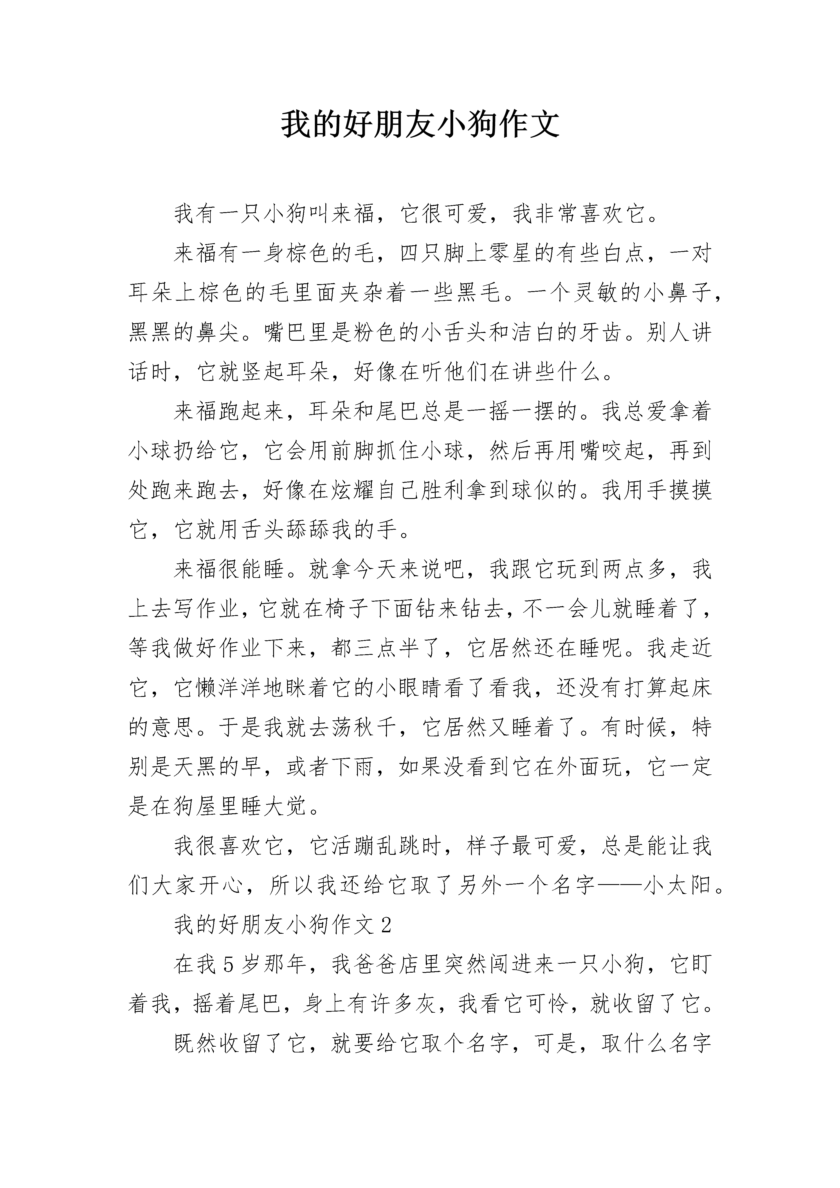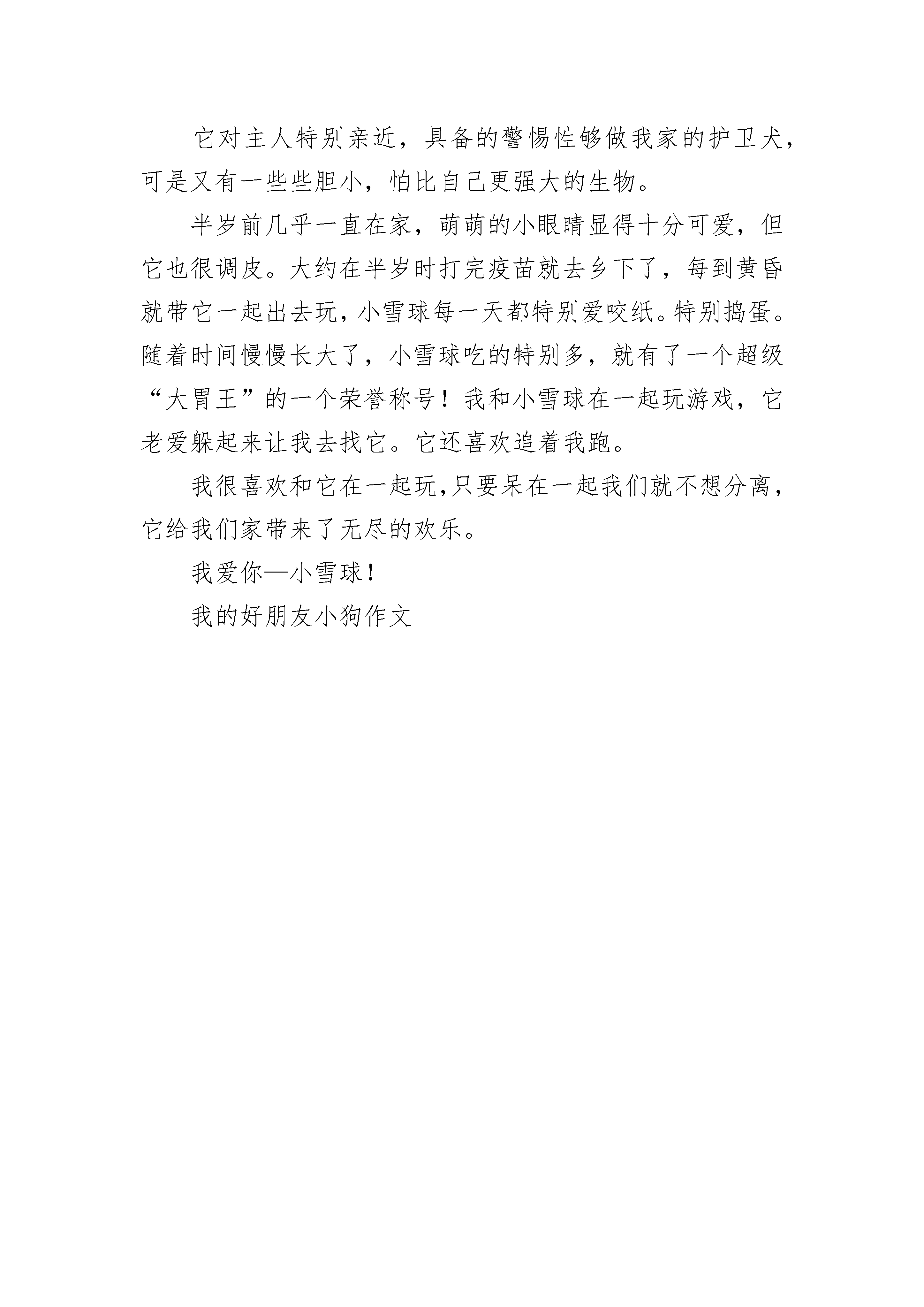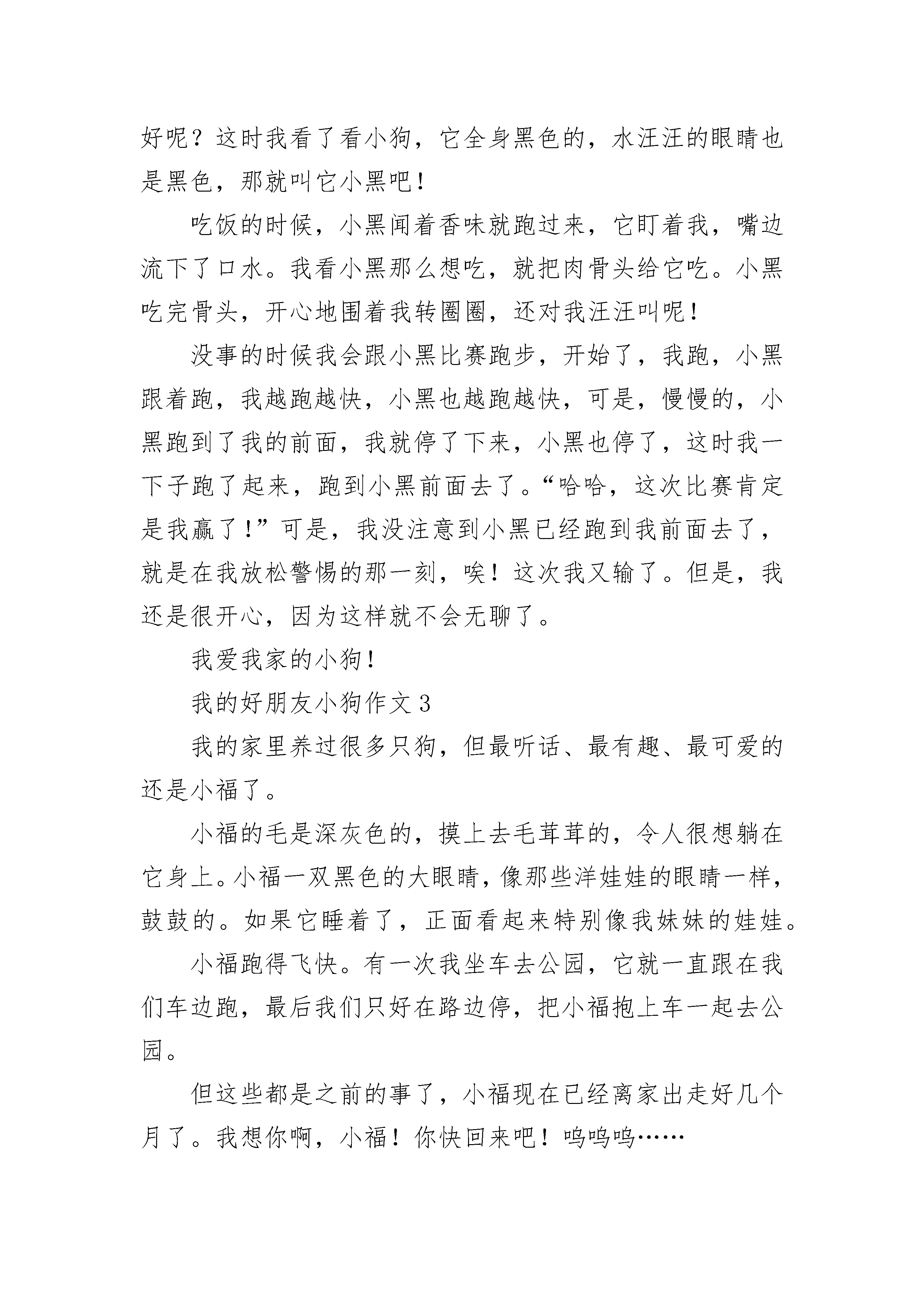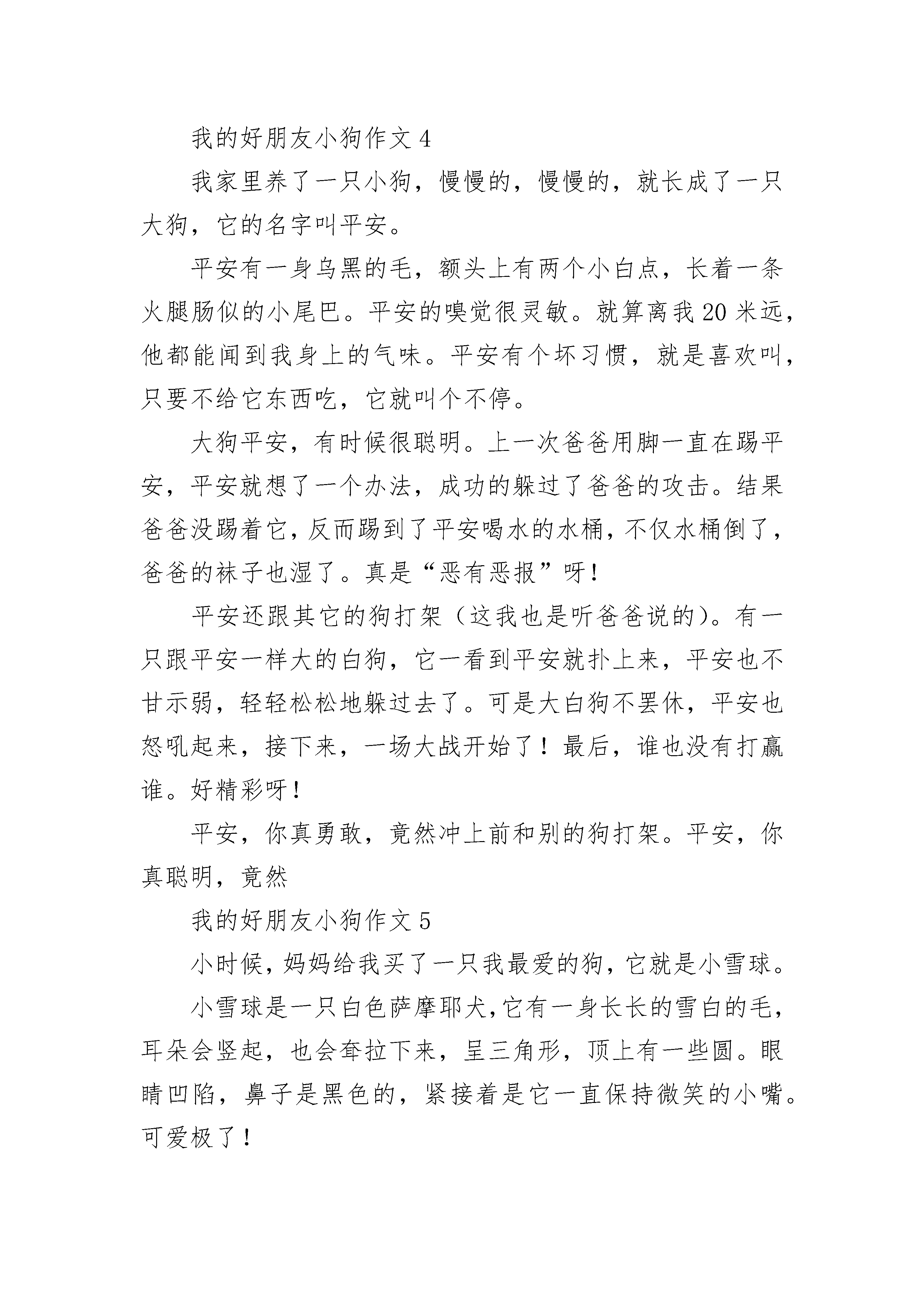 我的好朋友小狗作文我有一只小狗叫来福,它很可爱,我非常喜欢它。来福有一身棕色的毛,四只脚上零星的有些白点,一对耳朵上棕色的毛里面夹杂着一些黑毛。一个灵敏的小鼻子,黑黑的鼻尖。嘴巴里是粉色的小舌头和洁白的牙齿。别人讲话时,它就竖起耳朵,好像在听他们在讲些什么。来福跑起来,耳朵和尾巴总是一摇一摆的。我总爱拿着小球扔给它,它会用前脚抓住小球,然后再用嘴咬起,再到处跑来跑去,好像在炫耀自己胜利拿到球似的。我用手摸摸它,它就用舌头舔舔我的手。来福很能睡。就拿今天来说吧,我跟它玩到两点多,我上去写作业,它就在椅子下面钻来钻去,不一会儿就睡着了,等我做好作业下来,都三点半了,它居然还在睡呢。我走近它,它懒洋洋地眯着它的小眼睛看了看我,还没有打算起床的意思。于是我就去荡秋千,它居然又睡着了。有时候,特别是天黑的早,或者下雨,如果没看到它在外面玩,它一定是在狗屋里睡大觉。我很喜欢它,它活蹦乱跳时,样子最可爱,总是能让我们大家开心,所以我还给它取了另外一个名字——小太阳。我的好朋友小狗作文2在我5岁那年,我爸爸店里突然闯进来一只小狗,它盯着我,摇着尾巴,身上有许多灰,我看它可怜,就收留了它。既然收留了它,就要给它取个名字,可是,取什么名字好呢?这时我看了看小狗,它全身黑色的,水汪汪的眼睛也是黑色,那就叫它小黑吧!吃饭的时候,小黑闻着香味就跑过来,它盯着我,嘴边流下了口水。我看小黑那么想吃,就把肉骨头给它吃。小黑吃完骨头,开心地围着我转圈圈,还对我汪汪叫呢!没事的时候我会跟小黑比赛跑步,开始了,我跑,小黑跟着跑,我越跑越快,小黑也越跑越快,可是,慢慢的,小黑跑到了我的前面,我就停了下来,小黑也停了,这时我一下子跑了起来,跑到小黑前面去了。“哈哈,这次比赛肯定是我赢了!”可是,我没注意到小黑已经跑到我前面去了,就是在我放松警惕的那一刻,唉!这次我又输了。但是,我还是很开心,因为这样就不会无聊了。我爱我家的小狗!我的好朋友小狗作文3我的家里养过很多只狗,但最听话、最有趣、最可爱的还是小福了。小福的毛是深灰色的,摸上去毛茸茸的,令人很想躺在它身上。小福一双黑色的大眼睛,像那些洋娃娃的眼睛一样,鼓鼓的。如果它睡着了,正面看起来特别像我妹妹的娃娃。小福跑得飞快。有一次我坐车去公园,它就一直跟在我们车边跑,最后我们只好在路边停,把小福抱上车一起去公园。但这些都是之前的事了,小福现在已经离家出走好几个月了。我想你啊,小福!你快回来吧!呜呜呜……我的好朋友小狗作文4我家里养了一只小狗,慢慢的,慢慢的,就长成了一只大狗,它的名字叫平安。平安有一身乌黑的毛,额头上有两个小白点,长着一条火腿肠似的小尾巴。平安的嗅觉很灵敏。就算离我20米远,他都能闻到我身上的气味。平安有个坏习惯,就是喜欢叫,只要不给它东西吃,它就叫个不停。大狗平安,有时候很聪明。上一次爸爸用脚一直在踢平安,平安就想了一个办法,成功的躲过了爸爸的攻击。结果爸爸没踢着它,反而踢到了平安喝水的水桶,不仅水桶倒了,爸爸的袜子也湿了。真是“恶有恶报”呀!平安还跟其它的狗打架(这我也是听爸爸说的)。有一只跟平安一样大的白狗,它一看到平安就扑上来,平安也不甘示弱,轻轻松松地躲过去了。可是大白狗不罢休,平安也怒吼起来,接下来,一场大战开始了!最后,谁也没有打赢谁。好精彩呀!平安,你真勇敢,竟然冲上前和别的狗打架。平安,你真聪明,竟然我的好朋友小狗作文5小时候,妈妈给我买了一只我最爱的狗,它就是小雪球。小雪球是一只白色萨摩耶犬,它有一身长长的雪白的毛,耳朵会竖起,也会耷拉下来,呈三角形,顶上有一些圆。眼睛凹陷,鼻子是黑色的,紧接着是它一直保持微笑的小嘴。可爱极了!它对主人特别亲近,具备的警惕性够做我家的护卫犬,可是又有一些些胆小,怕比自己更强大的生物。半岁前几乎一直在家,萌萌的小眼睛显得十分可爱,但它也很调皮。大约在半岁时打完疫苗就去乡下了,每到黄昏就带它一起出去玩,小雪球每一天都特别爱咬纸。特别捣蛋。随着时间慢慢长大了,小雪球吃的特别多,就有了一个超级“大胃王”的一个荣誉称号!我和小雪球在一起玩游戏,它老爱躲起来让我去找它。它还喜欢追着我跑。我很喜欢和它在一起玩,只要呆在一起我们就不想分离,它给我们家带来了无尽的欢乐。我爱你—小雪球!我的好朋友小狗作文