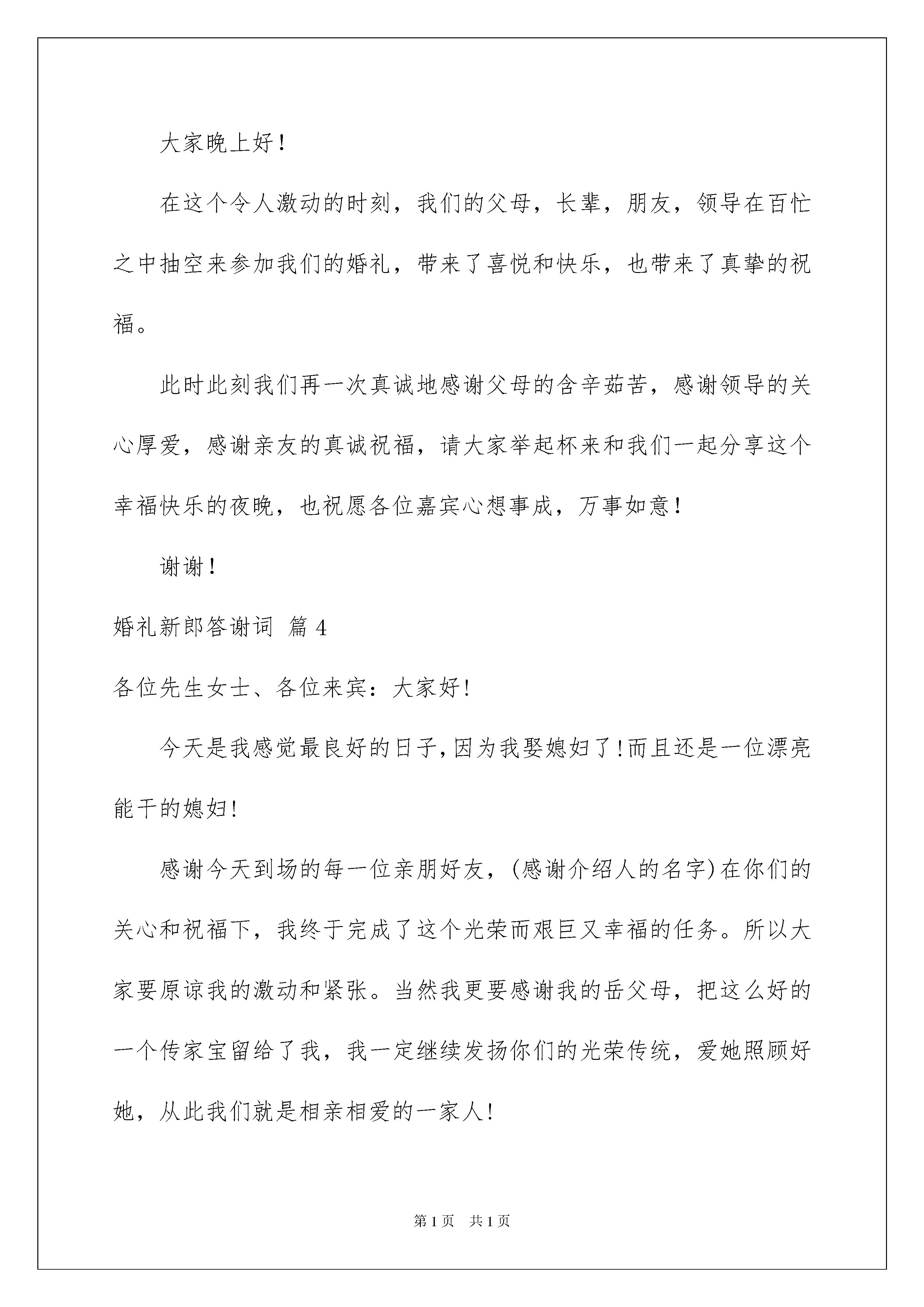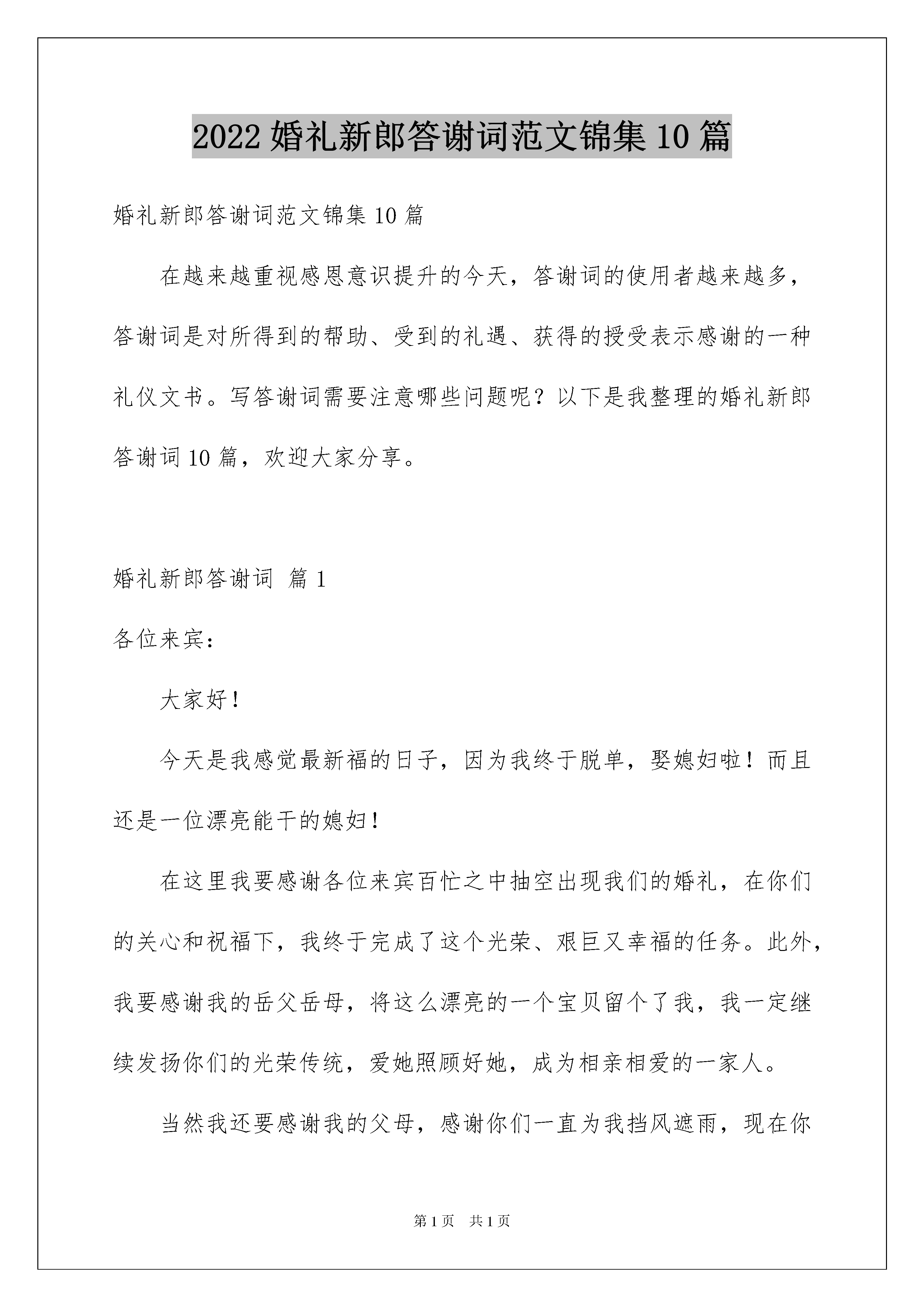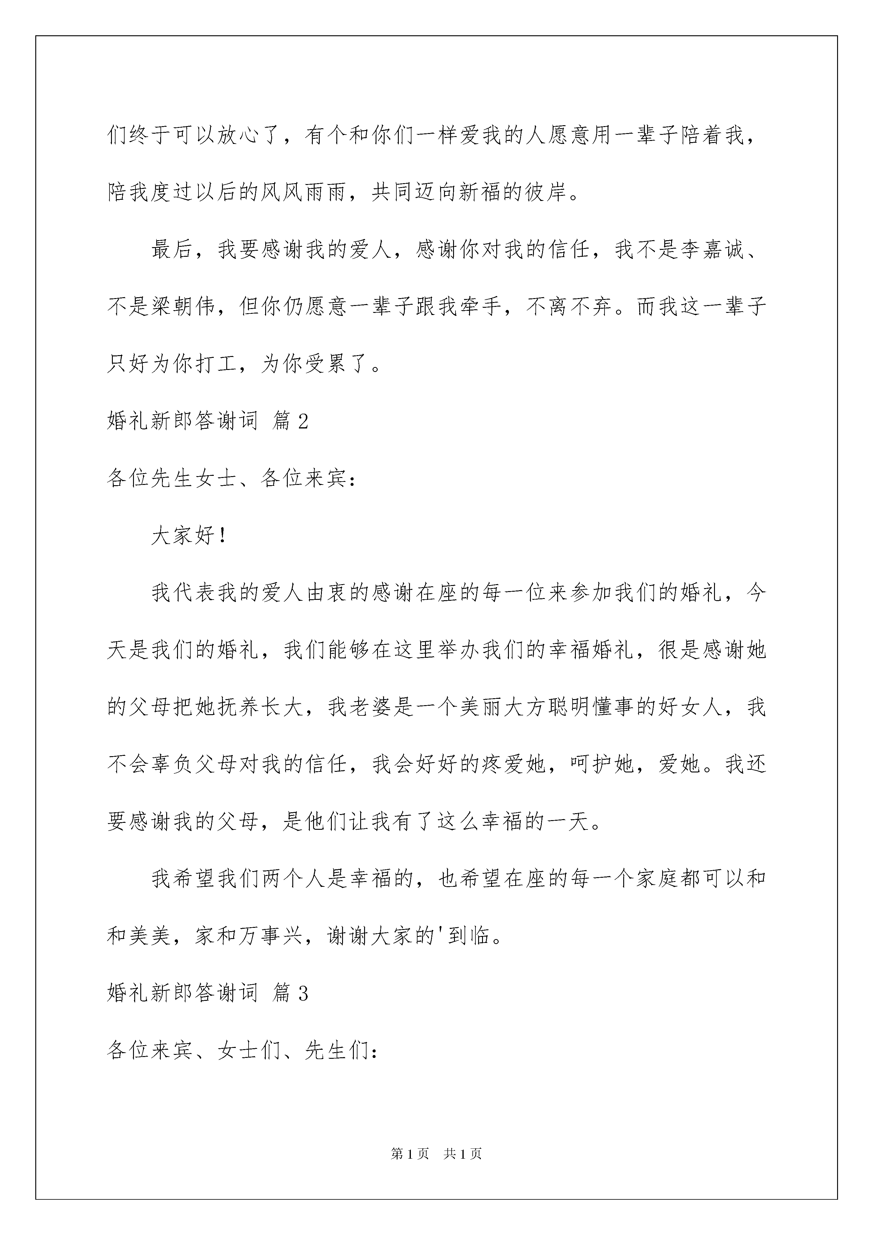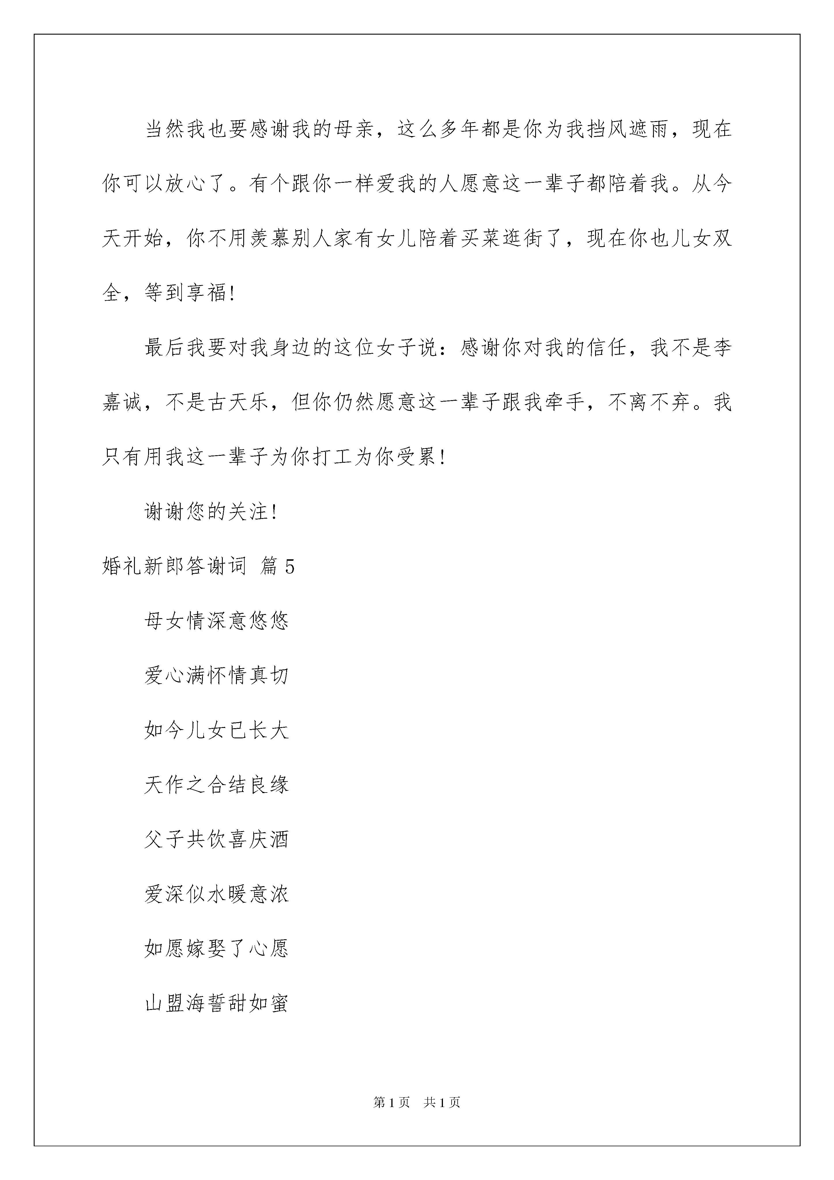 2022婚礼新郎答谢词范文锦集10篇婚礼新郎答谢词范文锦集10篇在越来越重视感恩意识提升的今天,答谢词的使用者越来越多,答谢词是对所得到的帮助、受到的礼遇、获得的授受表示感谢的一种礼仪文书。写答谢词需要注意哪些问题呢?以下是我整理的婚礼新郎答谢词10篇,欢迎大家分享。婚礼新郎答谢词篇1各位来宾:大家好!今天是我感觉最新福的日子,因为我终于脱单,娶媳妇啦!而且还是一位漂亮能干的媳妇!在这里我要感谢各位来宾百忙之中抽空出现我们的婚礼,在你们的关心和祝福下,我终于完成了这个光荣、艰巨又幸福的任务。此外,我要感谢我的岳父岳母,将这么漂亮的一个宝贝留个了我,我一定继续发扬你们的光荣传统,爱她照顾好她,成为相亲相爱的一家人。当然我还要感谢我的父母,感谢你们一直为我挡风遮雨,现在你们终于可以放心了,有个和你们一样爱我的人愿意用一辈子陪着我,陪我度过以后的风风雨雨,共同迈向新福的彼岸。最后,我要感谢我的爱人,感谢你对我的信任,我不是李嘉诚、不是梁朝伟,但你仍愿意一辈子跟我牵手,不离不弃。而我这一辈子只好为你打工,为你受累了。婚礼新郎答谢词篇2各位先生女士、各位来宾:大家好!我代表我的爱人由衷的感谢在座的每一位来参加我们的婚礼,今天是我们的婚礼,我们能够在这里举办我们的幸福婚礼,很是感谢她的父母把她抚养长大,我老婆是一个美丽大方聪明懂事的好女人,我不会辜负父母对我的信任,我会好好的疼爱她,呵护她,爱她。我还要感谢我的父母,是他们让我有了这么幸福的一天。我希望我们两个人是幸福的,也希望在座的每一个家庭都可以和和美美,家和万事兴,谢谢大家的'到临。婚礼新郎答谢词篇3各位来宾、女士们、先生们:大家晚上好!在这个令人激动的时刻,我们的父母,长辈,朋友,领导在百忙之中抽空来参加我们的婚礼,带来了喜悦和快乐,也带来了真挚的祝福。此时此刻我们再一次真诚地感谢父母的含辛茹苦,感谢领导的关心厚爱,感谢亲友的真诚祝福,请大家举起杯来和我们一起分享这个幸福快乐的夜晚,也祝愿各位嘉宾心想事成,万事如意!谢谢!婚礼新郎答谢词篇4各位先生女士、各位来宾:大家好!今天是我感觉最良好的日子,因为我娶媳妇了!而且还是一位漂亮能干的媳妇!感谢今天到场的每一位亲朋好友,(感谢介绍人的名字)在你们的关心和祝福下,我终于完成了这个光荣而艰巨又幸福的任务。所以大家要原谅我的激动和紧张。当然我更要感谢我的岳父母,把这么好的一个传家宝留给了我,我一定继续发扬你们的光荣传统,爱她照顾好她,从此我们就是相亲相爱的一家人!当然我也要感谢我的母亲,这么多年都是你为我挡风遮雨,现在你可以放心了。有个跟你一样爱我的人愿意这一辈子都陪着我。从今天开始,你不用羡慕别人家有女儿陪着买菜逛街了,现在你也儿女双全,等到享福!最后我要对我身边的这位女子说:感谢你对我的信任,我不是李嘉诚,不是古天乐,但你仍然愿意这一辈子跟我牵手,不离不弃。我只有用我这一辈子为你打工为你受累!谢谢您的关注!婚礼新郎答谢词篇5母女情深意悠悠爱心满怀情真切如今儿女已长大天作之合结良缘父子共饮喜庆酒爱深似水暖意浓如愿嫁娶了心愿山盟海誓甜如蜜感谢双亲赐生命恩重如山铭心间父亲叮咛已牢记母亲嘱托永存心将这首藏头诗每一段的第一个字提取出来,便是这首诗的主题——母爱如天,父爱如山,感恩父母。婚礼新郎答谢词篇6各位来宾,大家中午好:首先真挚的感谢在座的各位,百忙之中出席婚礼,见证我们的这份爱情。更要感谢双方父母对我们的支持、关爱和祝福。常州与甘泉距离1千多公里,我和____的爱情真可谓是穿越了千山万水。今天,我们终于结婚了。虽然由于工作和路途原因,我的亲友没有能参加我们的婚礼。但是我并没有感到失望和孤单。因为从今天开始,在座的各位来宾都成为了我的亲友。在此,我要特别的感谢我的爸爸妈妈对我的培养和关爱,我相信此时刻,他们一定能感受到我们的幸福和快乐。借此机会,我想对他们说,爸爸妈妈,请放心。你们的女儿找到了一个美好的归宿,我相信____会是一个优秀的丈夫,我们一定会相亲相爱,白头偕老。最后,再此感谢大家的出席,祝大家身体健康,新年快乐!婚礼新郎答谢词篇7各位领导、各位亲人、朋友们:其次,我要感谢我身边的这个男人。谢谢他愿意来到我身边,愿意和我共度余生。有一段很美丽的话是这样说的:“于千万人中遇见你所遇见的人,于千万年中,在广裹无涯的荒野里,没有早一步,也没有晚一步,刚巧赶上了。那也没别的话可说,唯有轻轻地问一句:哦,你也在这里吗?”感谢上天让我遇到了心爱的人,不管未来有多远,不管时间由多长,我相信我们的感情会始终如一,我们会牵着彼此的手,一步步走下去。现在我们有了自己的家庭,也是我们尽孝心报答父母的