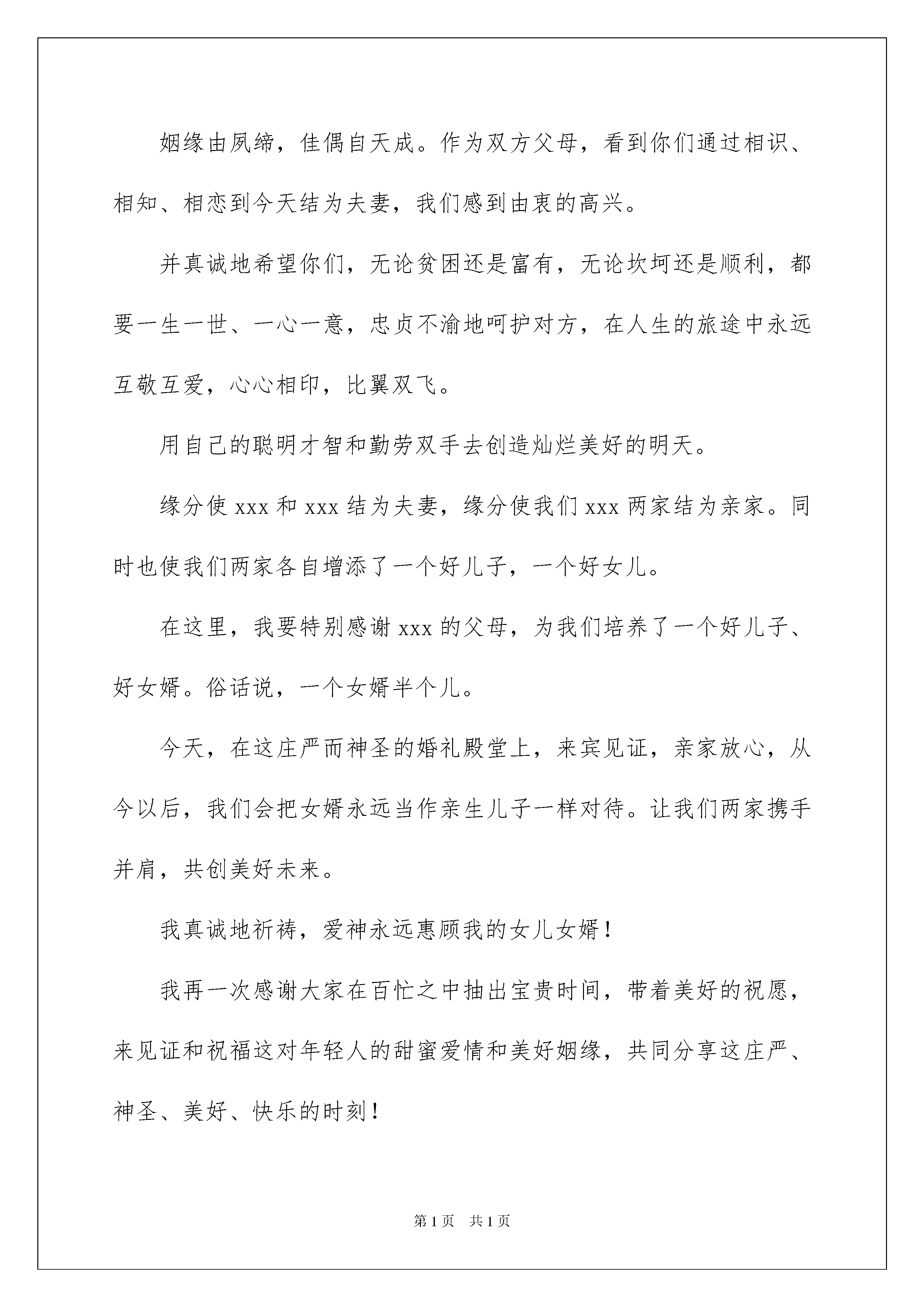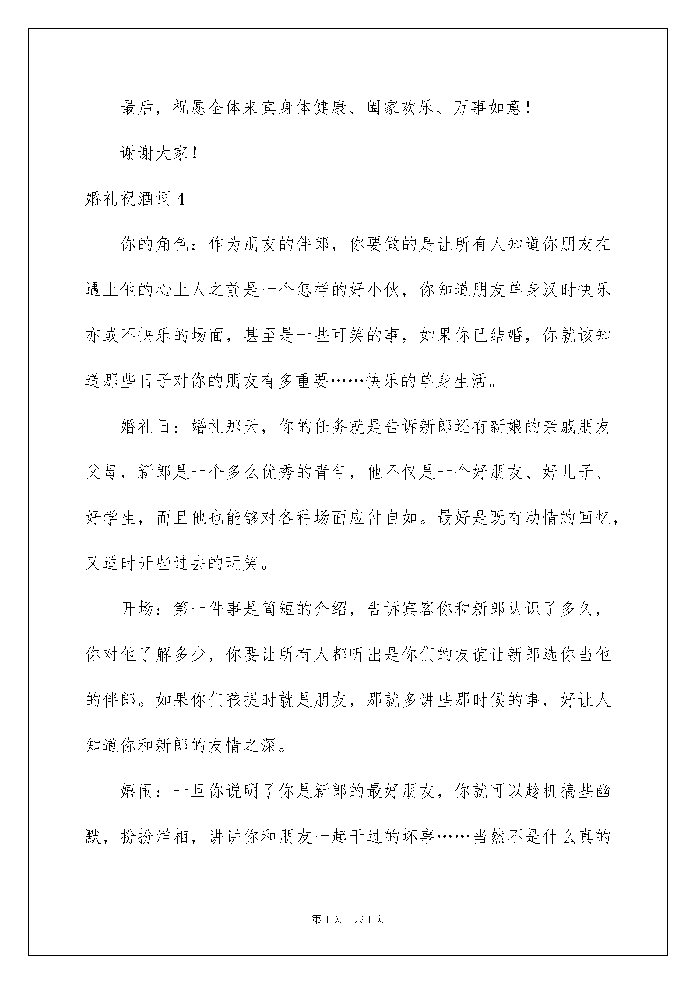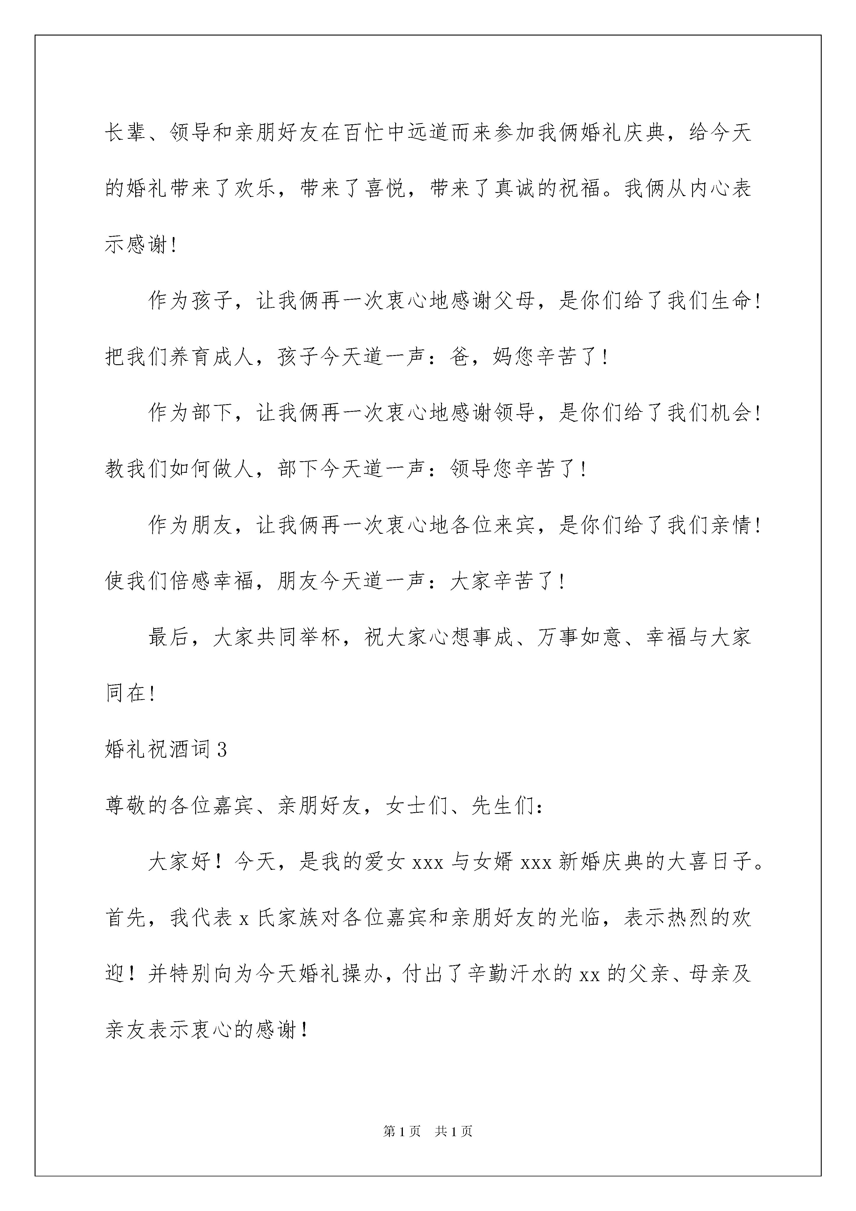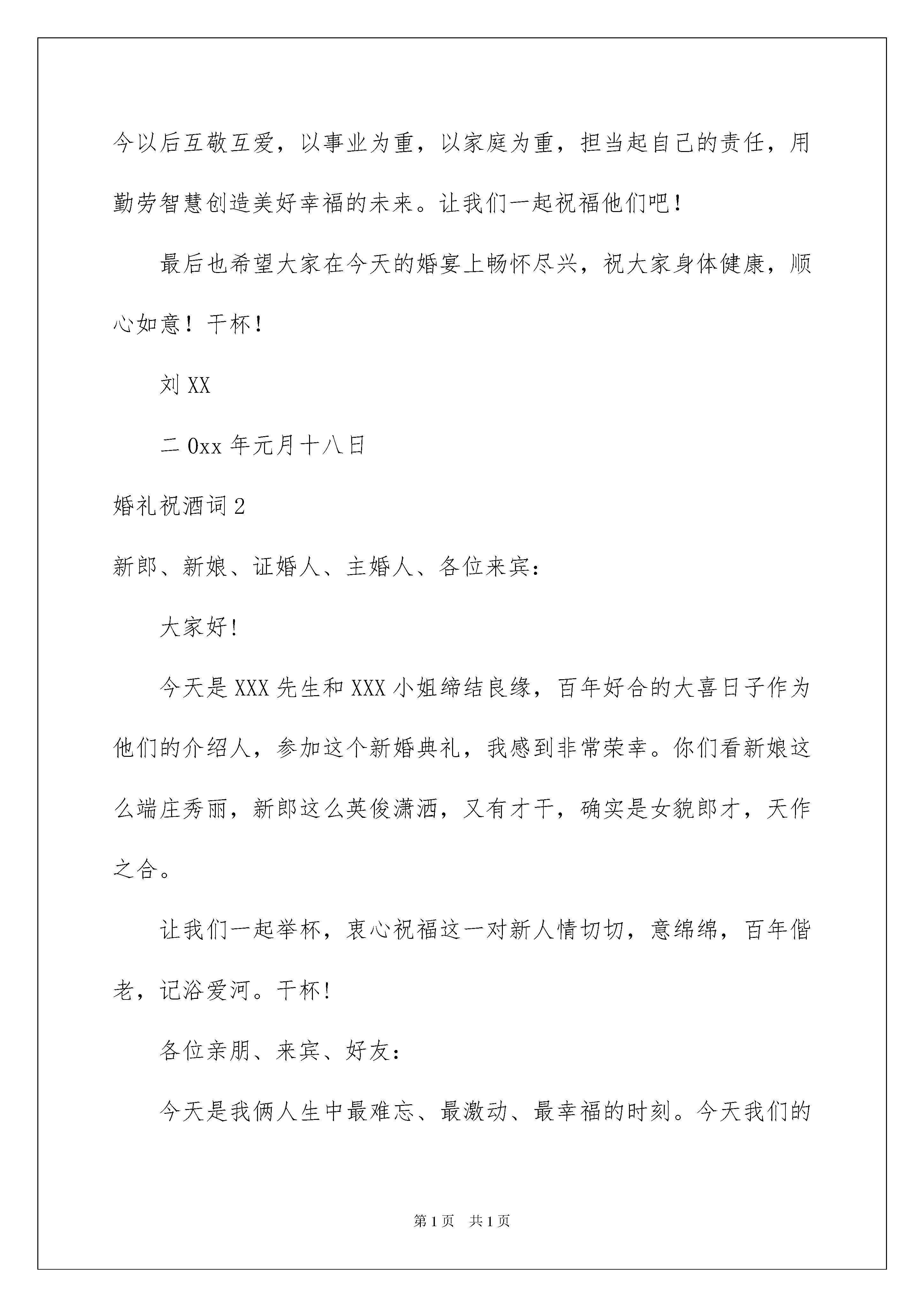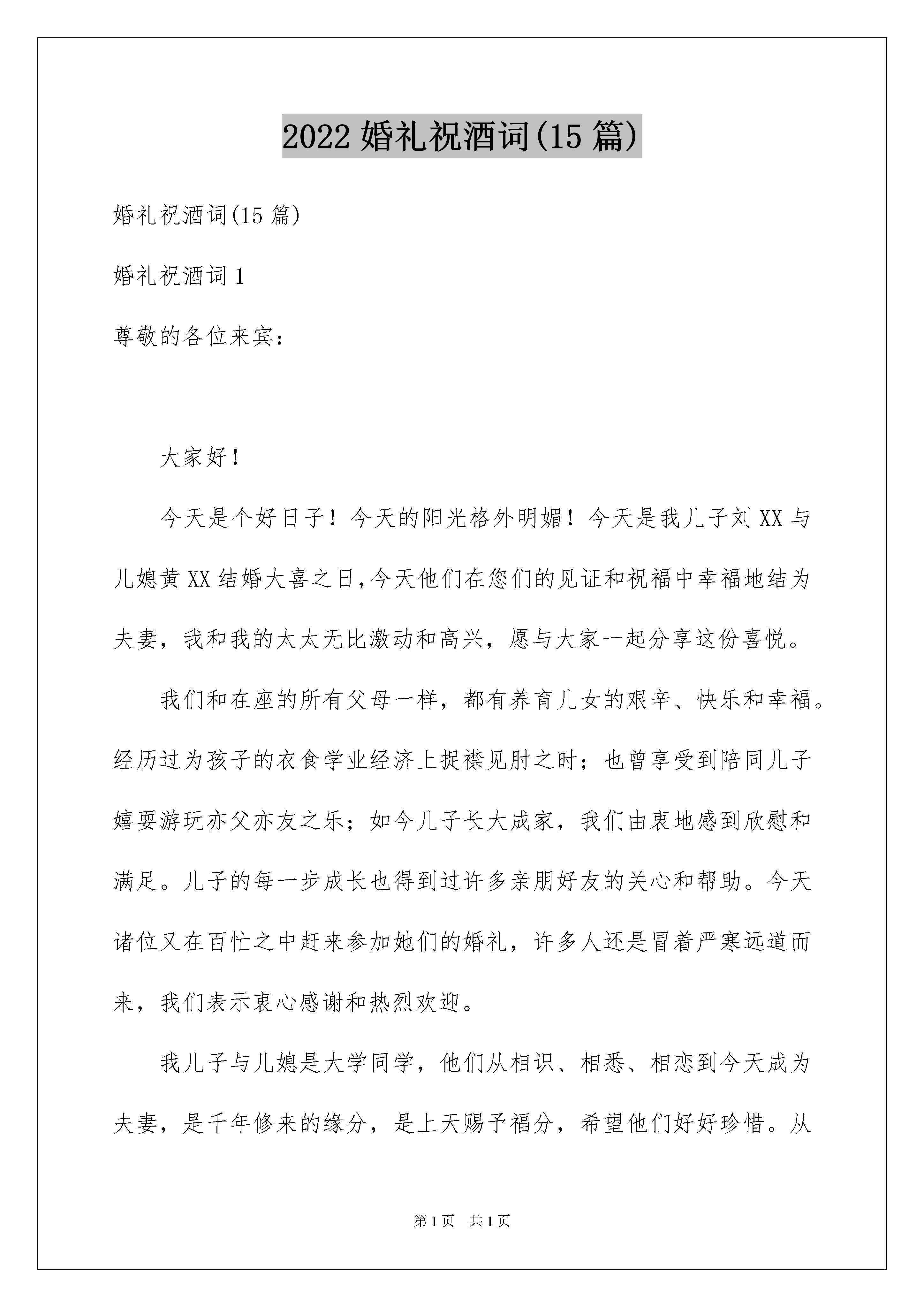 2022婚礼祝酒词(15篇)婚礼祝酒词(15篇)婚礼祝酒词1尊敬的各位来宾:大家好!今天是个好日子!今天的阳光格外明媚!今天是我儿子刘XX与儿媳黄XX结婚大喜之日,今天他们在您们的见证和祝福中幸福地结为夫妻,我和我的太太无比激动和高兴,愿与大家一起分享这份喜悦。我们和在座的所有父母一样,都有养育儿女的艰辛、快乐和幸福。经历过为孩子的衣食学业经济上捉襟见肘之时;也曾享受到陪同儿子嬉耍游玩亦父亦友之乐;如今儿子长大成家,我们由衷地感到欣慰和满足。儿子的每一步成长也得到过许多亲朋好友的关心和帮助。今天诸位又在百忙之中赶来参加她们的婚礼,许多人还是冒着严寒远道而来,我们表示衷心感谢和热烈欢迎。我儿子与儿媳是大学同学,他们从相识、相悉、相恋到今天成为夫妻,是千年修来的缘分,是上天赐予福分,希望他们好好珍惜。从今以后互敬互爱,以事业为重,以家庭为重,担当起自己的责任,用勤劳智慧创造美好幸福的未来。让我们一起祝福他们吧!最后也希望大家在今天的婚宴上畅怀尽兴,祝大家身体健康,顺心如意!干杯!刘XX二0xx年元月十八日婚礼祝酒词2新郎、新娘、证婚人、主婚人、各位来宾:大家好!今天是XXX先生和XXX小姐缔结良缘,百年好合的大喜日子作为他们的介绍人,参加这个新婚典礼,我感到非常荣幸。你们看新娘这么端庄秀丽,新郎这么英俊潇洒,又有才干,确实是女貌郎才,天作之合。让我们一起举杯,衷心祝福这一对新人情切切,意绵绵,百年偕老,记浴爱河。干杯!各位亲朋、来宾、好友:今天是我俩人生中最难忘、最激动、最幸福的时刻。今天我们的长辈、领导和亲朋好友在百忙中远道而来参加我俩婚礼庆典,给今天的婚礼带来了欢乐,带来了喜悦,带来了真诚的祝福。我俩从内心表示感谢!作为孩子,让我俩再一次衷心地感谢父母,是你们给了我们生命!把我们养育成人,孩子今天道一声:爸,妈您辛苦了!作为部下,让我俩再一次衷心地感谢领导,是你们给了我们机会!教我们如何做人,部下今天道一声:领导您辛苦了!作为朋友,让我俩再一次衷心地各位来宾,是你们给了我们亲情!使我们倍感幸福,朋友今天道一声:大家辛苦了!最后,大家共同举杯,祝大家心想事成、万事如意、幸福与大家同在!婚礼祝酒词3尊敬的各位嘉宾、亲朋好友,女士们、先生们:大家好!今天,是我的爱女xxx与女婿xxx新婚庆典的大喜日子。首先,我代表x氏家族对各位嘉宾和亲朋好友的光临,表示热烈的欢迎!并特别向为今天婚礼操办,付出了辛勤汗水的xx的父亲、母亲及亲友表示衷心的感谢!姻缘由夙缔,佳偶自天成。作为双方父母,看到你们通过相识、相知、相恋到今天结为夫妻,我们感到由衷的高兴。并真诚地希望你们,无论贫困还是富有,无论坎坷还是顺利,都要一生一世、一心一意,忠贞不渝地呵护对方,在人生的旅途中永远互敬互爱,心心相印,比翼双飞。用自己的聪明才智和勤劳双手去创造灿烂美好的明天。缘分使xxx和xxx结为夫妻,缘分使我们xxx两家结为亲家。同时也使我们两家各自增添了一个好儿子,一个好女儿。在这里,我要特别感谢xxx的父母,为我们培养了一个好儿子、好女婿。俗话说,一个女婿半个儿。今天,在这庄严而神圣的婚礼殿堂上,来宾见证,亲家放心,从今以后,我们会把女婿永远当作亲生儿子一样对待。让我们两家携手并肩,共创美好未来。我真诚地祈祷,爱神永远惠顾我的女儿女婿!我再一次感谢大家在百忙之中抽出宝贵时间,带着美好的祝愿,来见证和祝福这对年轻人的甜蜜爱情和美好姻缘,共同分享这庄严、神圣、美好、快乐的时刻!最后,祝愿全体来宾身体健康、阖家欢乐、万事如意!谢谢大家!婚礼祝酒词4你的角色:作为朋友的伴郎,你要做的是让所有人知道你朋友在遇上他的心上人之前是一个怎样的好小伙,你知道朋友单身汉时快乐亦或不快乐的场面,甚至是一些可笑的事,如果你已结婚,你就该知道那些日子对你的朋友有多重要……快乐的单身生活。婚礼日:婚礼那天,你的任务就是告诉新郎还有新娘的亲戚朋友父母,新郎是一个多么优秀的青年,他不仅是一个好朋友、好儿子、好学生,而且他也能够对各种场面应付自如。最好是既有动情的回忆,又适时开些过去的玩笑。开场:第一件事是简短的介绍,告诉宾客你和新郎认识了多久,你对他了解多少,你要让所有人都听出是你们的友谊让新郎选你当他的伴郎。如果你们孩提时就是朋友,那就多讲些那时候的事,好让人知道你和新郎的友情之深。嬉闹:一旦你说明了你是新郎的最好朋友,你就可以趁机搞些幽默,扮扮洋相,讲讲你和朋友一起干过的坏事……当然不是什么真的坏事……你们一起时有趣的插曲,如第一次做什么事,认错人的事,旅游冒险之类的故事。小故事应该短而有趣,自始至终体现你和朋友的深情友谊。祝福:最后以新郎