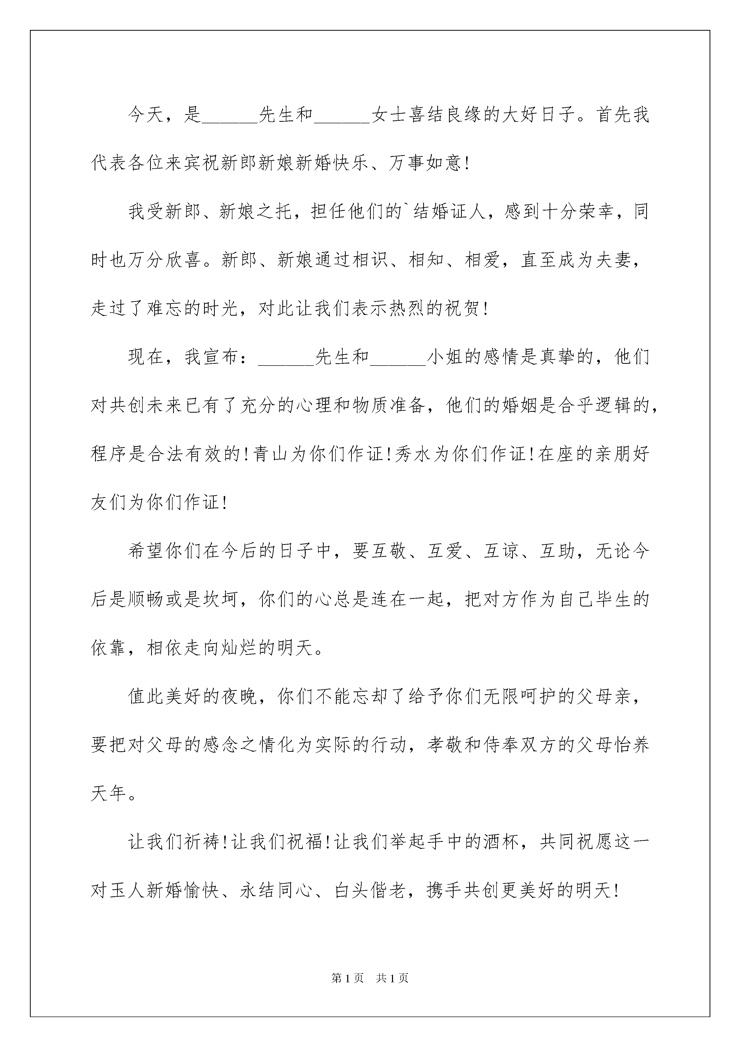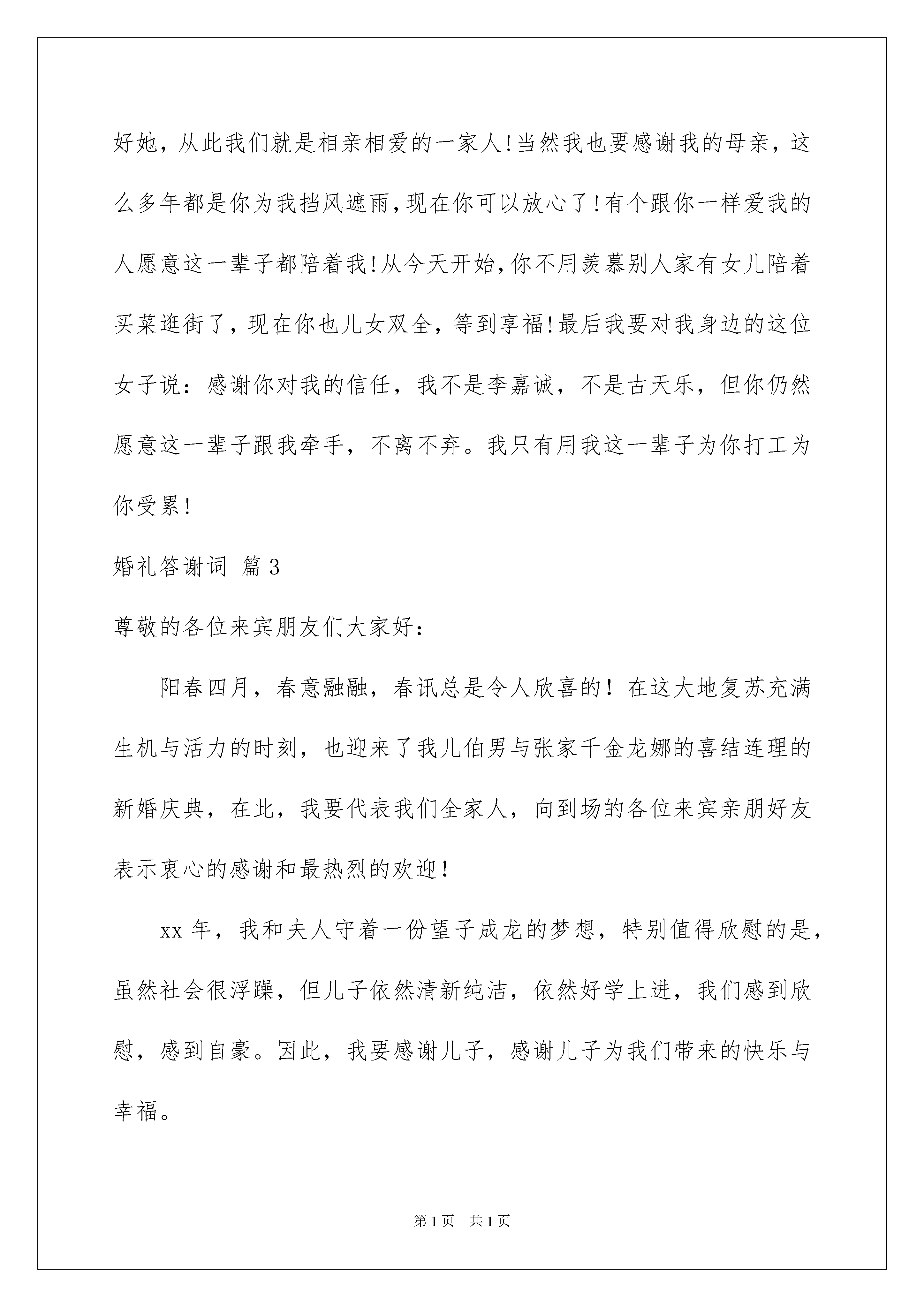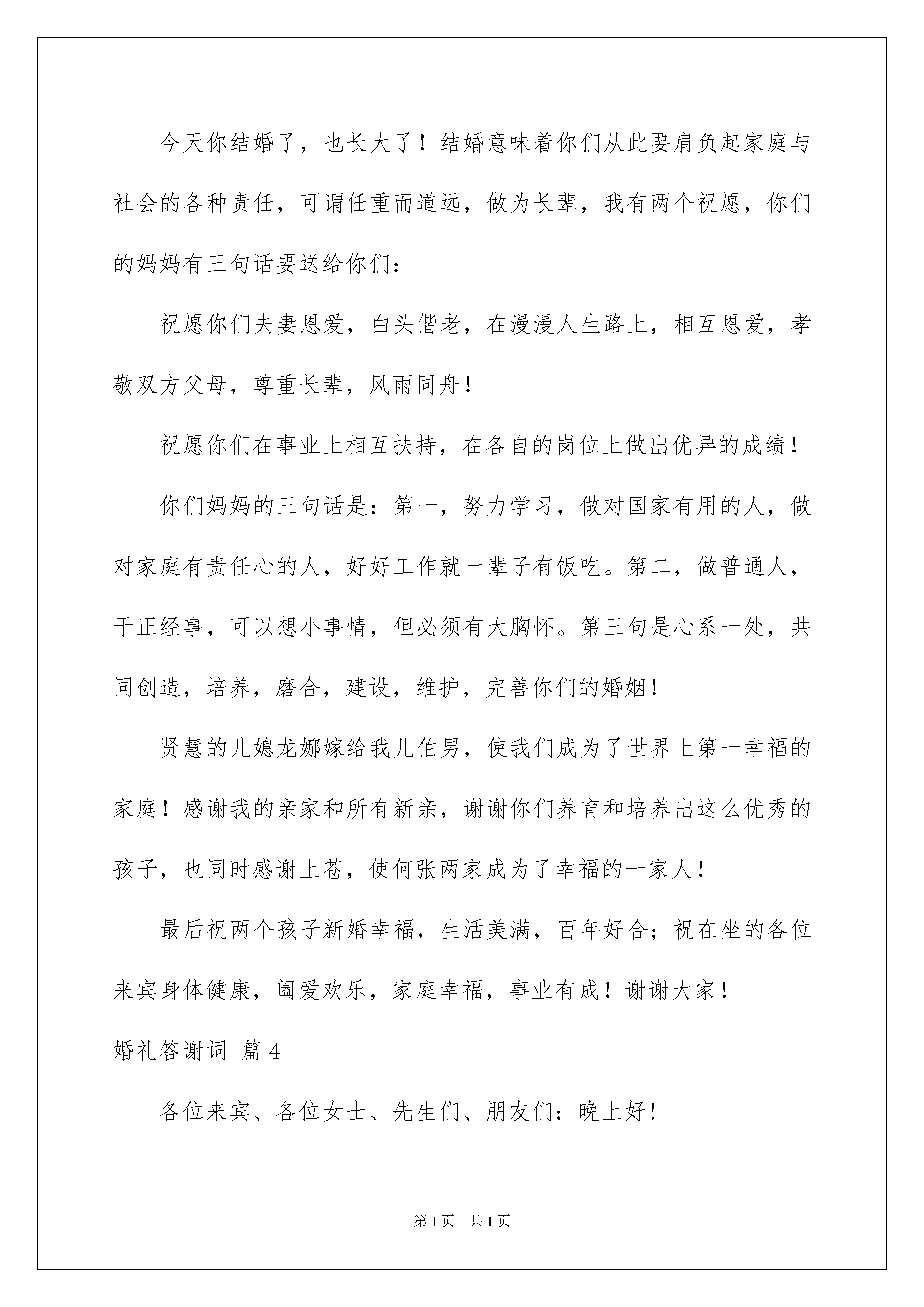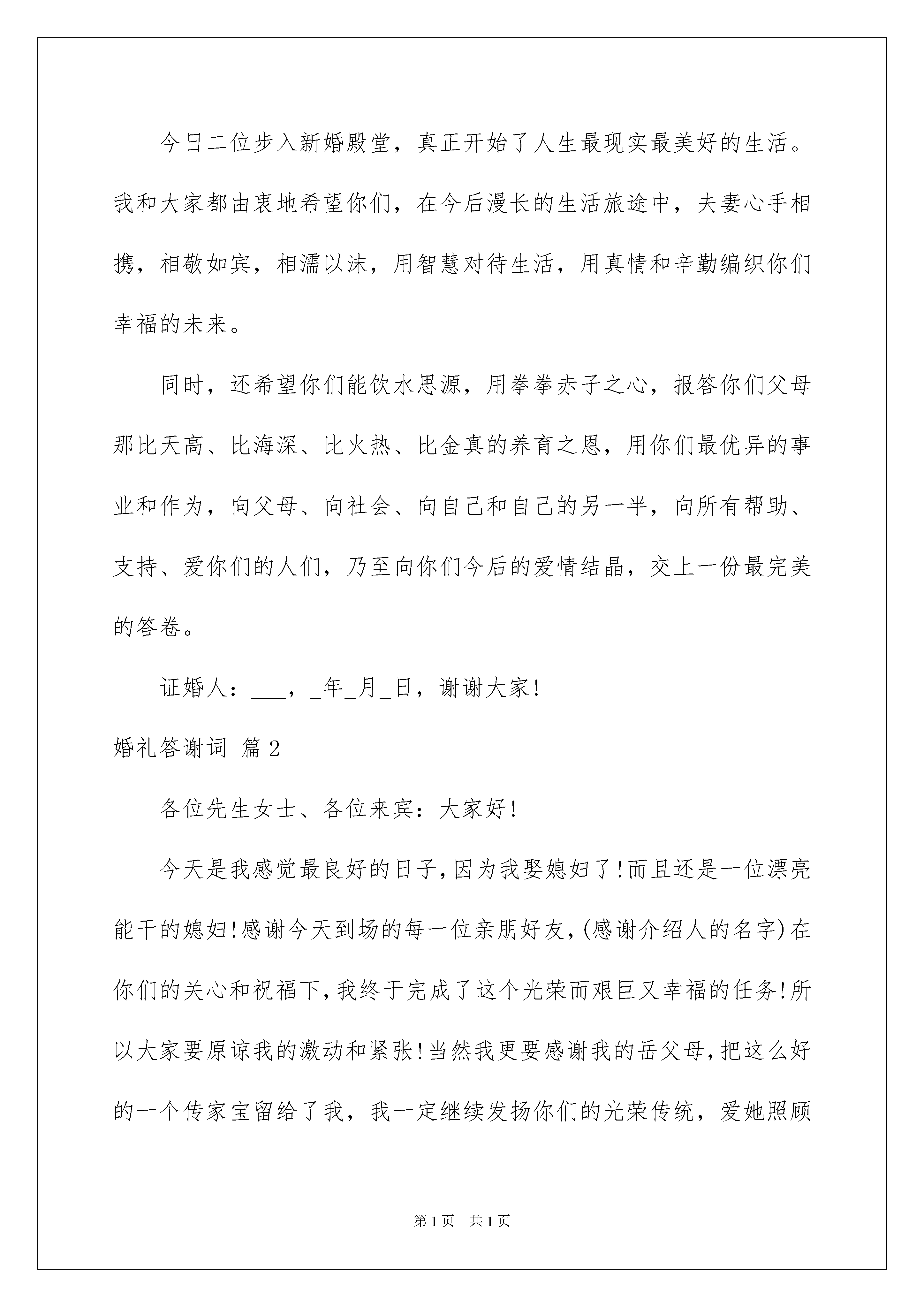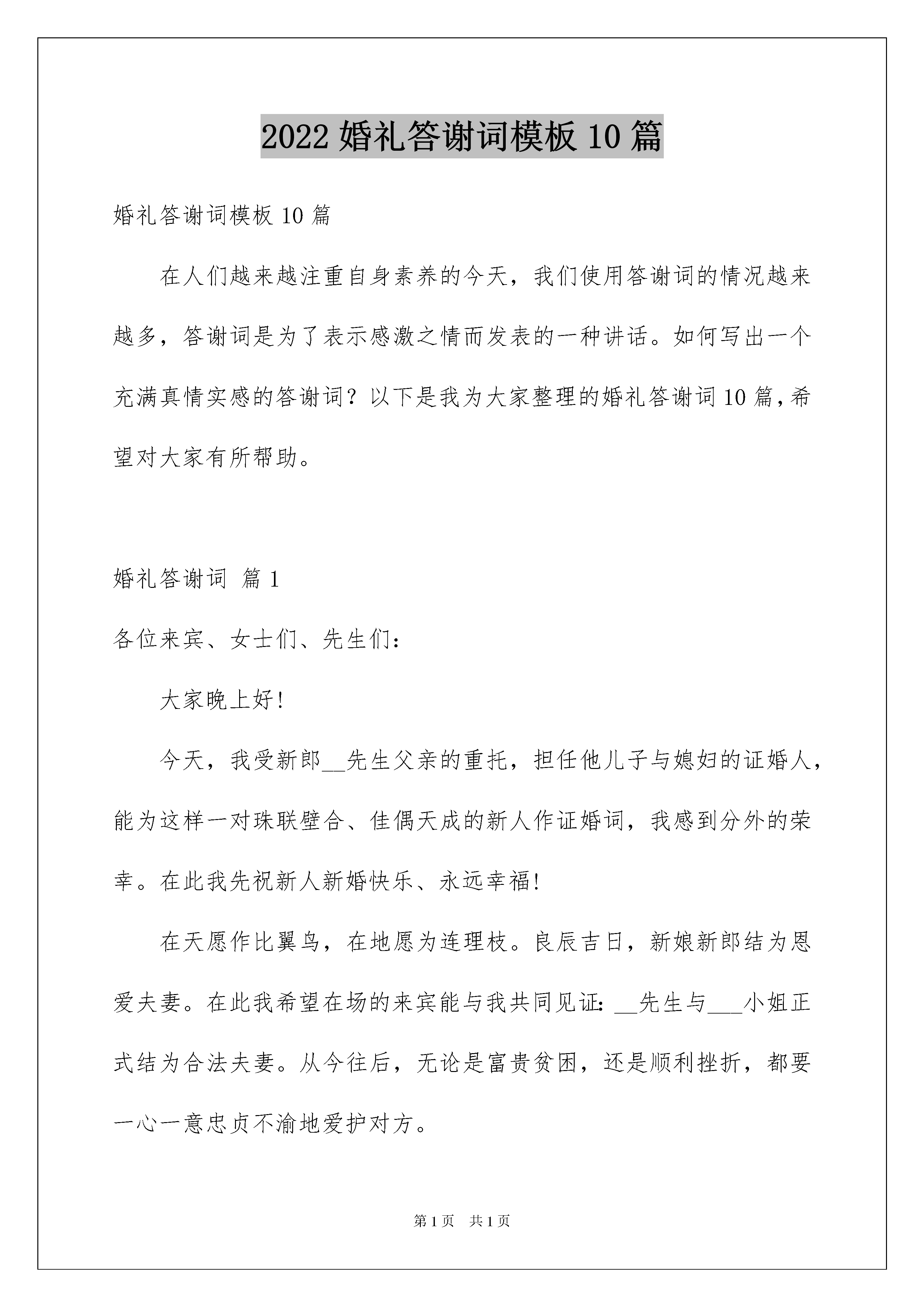 2022婚礼答谢词模板10篇婚礼答谢词模板10篇在人们越来越注重自身素养的今天,我们使用答谢词的情况越来越多,答谢词是为了表示感激之情而发表的一种讲话。如何写出一个充满真情实感的答谢词?以下是我为大家整理的婚礼答谢词10篇,希望对大家有所帮助。婚礼答谢词篇1各位来宾、女士们、先生们:大家晚上好!今天,我受新郎__先生父亲的重托,担任他儿子与媳妇的证婚人,能为这样一对珠联壁合、佳偶天成的新人作证婚词,我感到分外的荣幸。在此我先祝新人新婚快乐、永远幸福!在天愿作比翼鸟,在地愿为连理枝。良辰吉日,新娘新郎结为恩爱夫妻。在此我希望在场的来宾能与我共同见证:__先生与___小姐正式结为合法夫妻。从今往后,无论是富贵贫困,还是顺利挫折,都要一心一意忠贞不渝地爱护对方。今日二位步入新婚殿堂,真正开始了人生最现实最美好的生活。我和大家都由衷地希望你们,在今后漫长的生活旅途中,夫妻心手相携,相敬如宾,相濡以沫,用智慧对待生活,用真情和辛勤编织你们幸福的未来。同时,还希望你们能饮水思源,用拳拳赤子之心,报答你们父母那比天高、比海深、比火热、比金真的养育之恩,用你们最优异的事业和作为,向父母、向社会、向自己和自己的另一半,向所有帮助、支持、爱你们的人们,乃至向你们今后的爱情结晶,交上一份最完美的答卷。证婚人:___,_年_月_日,谢谢大家!婚礼答谢词篇2各位先生女士、各位来宾:大家好!今天是我感觉最良好的日子,因为我娶媳妇了!而且还是一位漂亮能干的媳妇!感谢今天到场的每一位亲朋好友,(感谢介绍人的名字)在你们的关心和祝福下,我终于完成了这个光荣而艰巨又幸福的任务!所以大家要原谅我的激动和紧张!当然我更要感谢我的岳父母,把这么好的一个传家宝留给了我,我一定继续发扬你们的光荣传统,爱她照顾好她,从此我们就是相亲相爱的一家人!当然我也要感谢我的母亲,这么多年都是你为我挡风遮雨,现在你可以放心了!有个跟你一样爱我的人愿意这一辈子都陪着我!从今天开始,你不用羡慕别人家有女儿陪着买菜逛街了,现在你也儿女双全,等到享福!最后我要对我身边的这位女子说:感谢你对我的信任,我不是李嘉诚,不是古天乐,但你仍然愿意这一辈子跟我牵手,不离不弃。我只有用我这一辈子为你打工为你受累!婚礼答谢词篇3尊敬的各位来宾朋友们大家好:阳春四月,春意融融,春讯总是令人欣喜的!在这大地复苏充满生机与活力的时刻,也迎来了我儿伯男与张家千金龙娜的喜结连理的新婚庆典,在此,我要代表我们全家人,向到场的各位来宾亲朋好友表示衷心的感谢和最热烈的欢迎!xx年,我和夫人守着一份望子成龙的梦想,特别值得欣慰的是,虽然社会很浮躁,但儿子依然清新纯洁,依然好学上进,我们感到欣慰,感到自豪。因此,我要感谢儿子,感谢儿子为我们带来的快乐与幸福。今天你结婚了,也长大了!结婚意味着你们从此要肩负起家庭与社会的各种责任,可谓任重而道远,做为长辈,我有两个祝愿,你们的妈妈有三句话要送给你们:祝愿你们夫妻恩爱,白头偕老,在漫漫人生路上,相互恩爱,孝敬双方父母,尊重长辈,风雨同舟!祝愿你们在事业上相互扶持,在各自的岗位上做出优异的成绩!你们妈妈的三句话是:第一,努力学习,做对国家有用的人,做对家庭有责任心的人,好好工作就一辈子有饭吃。第二,做普通人,干正经事,可以想小事情,但必须有大胸怀。第三句是心系一处,共同创造,培养,磨合,建设,维护,完善你们的婚姻!贤慧的儿媳龙娜嫁给我儿伯男,使我们成为了世界上第一幸福的家庭!感谢我的亲家和所有新亲,谢谢你们养育和培养出这么优秀的孩子,也同时感谢上苍,使何张两家成为了幸福的一家人!最后祝两个孩子新婚幸福,生活美满,百年好合;祝在坐的各位来宾身体健康,阖爱欢乐,家庭幸福,事业有成!谢谢大家!婚礼答谢词篇4各位来宾、各位女士、先生们、朋友们:晚上好!今天,是______先生和______女士喜结良缘的大好日子。首先我代表各位来宾祝新郎新娘新婚快乐、万事如意!我受新郎、新娘之托,担任他们的`结婚证人,感到十分荣幸,同时也万分欣喜。新郎、新娘通过相识、相知、相爱,直至成为夫妻,走过了难忘的时光,对此让我们表示热烈的祝贺!现在,我宣布:______先生和______小姐的感情是真挚的,他们对共创未来已有了充分的心理和物质准备,他们的婚姻是合乎逻辑的,程序是合法有效的!青山为你们作证!秀水为你们作证!在座的亲朋好友们为你们作证!希望你们在今后的日子中,要互敬、互爱、互谅、互助,无论今后是顺畅或是坎坷,你们的心总是连在一起,把对方作为自己毕生的依靠,相依走向灿烂的明天。值此美好的夜晚,你们不能忘却了给予你们无限呵护的父母亲,要把对父母的感念之情化