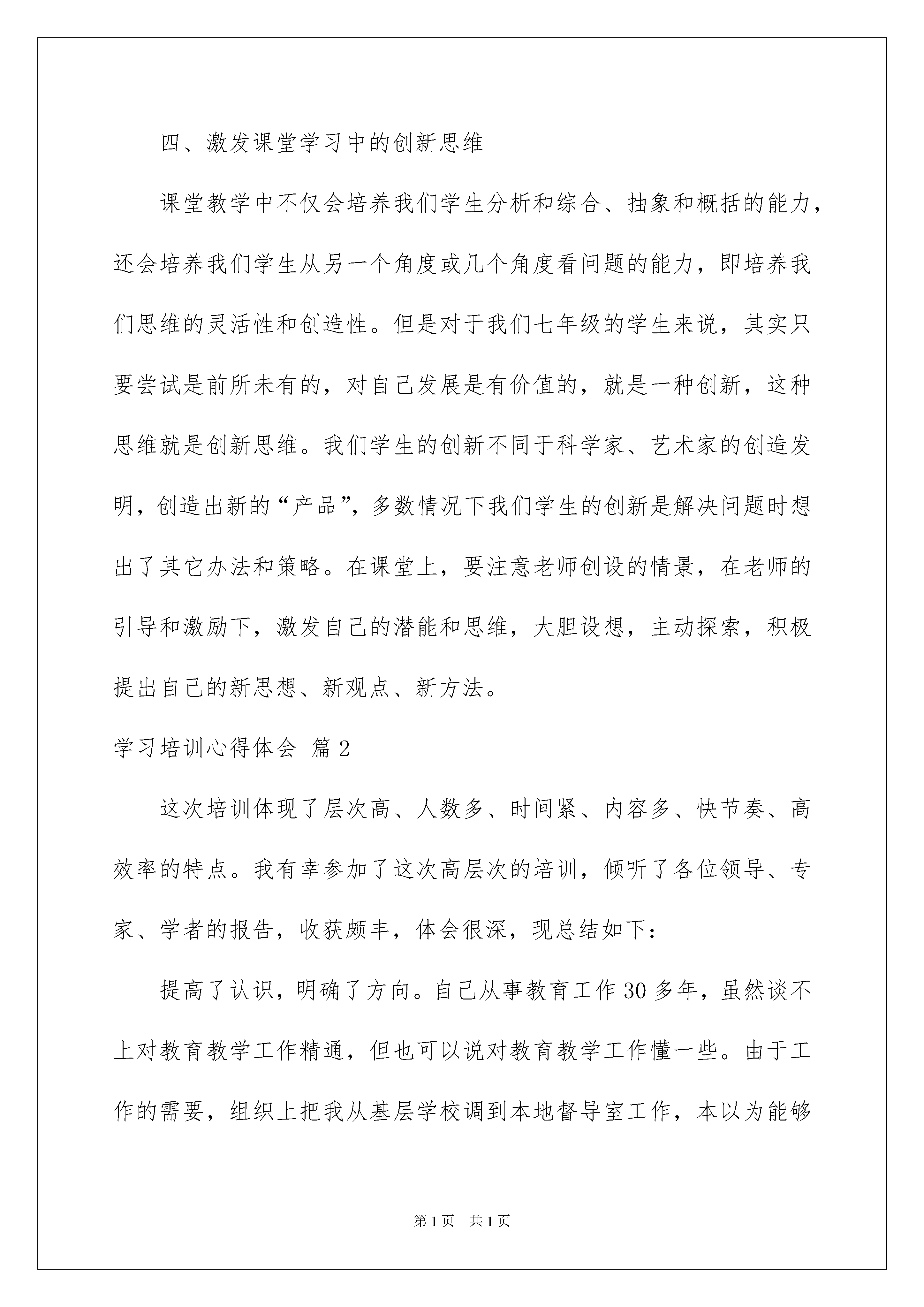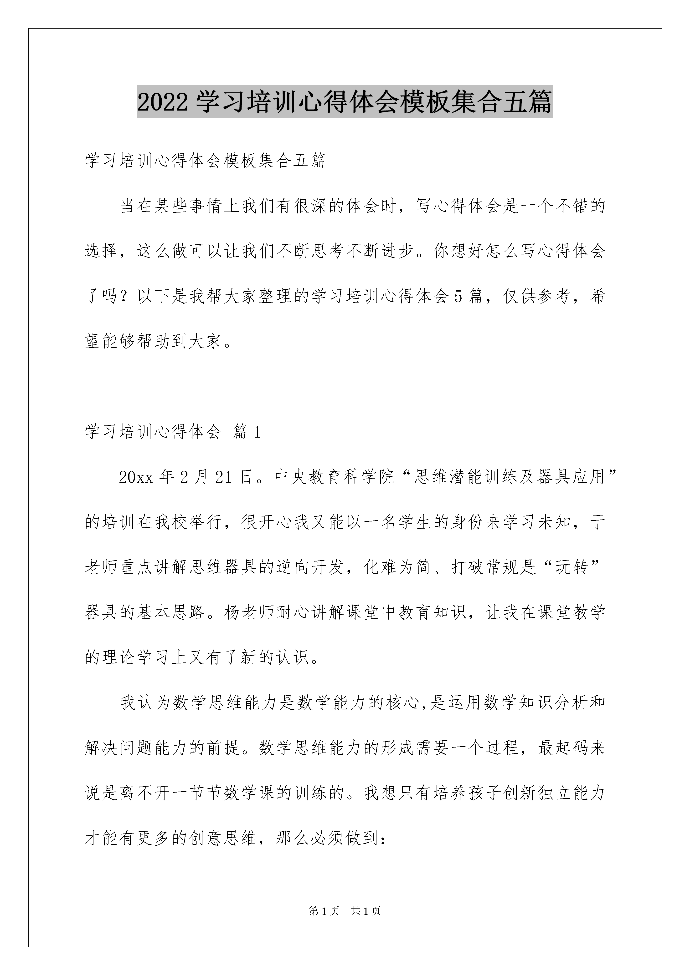 2022学习培训心得体会模板集合五篇学习培训心得体会模板集合五篇当在某些事情上我们有很深的体会时,写心得体会是一个不错的选择,这么做可以让我们不断思考不断进步。你想好怎么写心得体会了吗?以下是我帮大家整理的学习培训心得体会5篇,仅供参考,希望能够帮助到大家。学习培训心得体会篇120xx年2月21日。中央教育科学院“思维潜能训练及器具应用”的培训在我校举行,很开心我又能以一名学生的身份来学习未知,于老师重点讲解思维器具的逆向开发,化难为简、打破常规是“玩转”器具的基本思路。杨老师耐心讲解课堂中教育知识,让我在课堂教学的理论学习上又有了新的认识。我认为数学思维能力是数学能力的核心,是运用数学知识分析和解决问题能力的前提。数学思维能力的形成需要一个过程,最起码来说是离不开一节节数学课的训练的。我想只有培养孩子创新独立能力才能有更多的创意思维,那么必须做到:一、独立思考。接触到具体问题的时候,首先要自己独立自主的思考判断,这个问题中已经给出的条件是什么,要干什么?需要用到哪些知识,怎么来解决比较合理等等进行必要的思维判断,然后进行。当自己独立自主的思维判断后依然有困难,可以请教老师,或跟同学进行研究来解决。在这样的过程中,自己的思维力会得到训练和提高。二、学会学习。在学习中,我们要利用好教师为我们学习创设的有利于质疑、探究的情境,在独立学习的基础上合作,我们学生要主动参与、乐于探索、勤于动手、学思结合,把抽象的知识具体化、形象化,从中感受认识、理解、掌握知识,在解决问题的过程中提高思维能力。三、打破常规,逆向思维。思维器具贴近生活,注重过程;发展思维,引导探索;加强实践,促进交流。体现思维规律;引导积极探索;通过“观察、实验、比较、归纳、猜想、推理、反思”等活动,优化思维品质,提高思维能力,培养创新精神和实践能力。器具的编排有助于提高我们学生学习数学的兴趣,有助于明白教材的整体思路,从而提高我们学生数学思维能力。四、激发课堂学习中的创新思维课堂教学中不仅会培养我们学生分析和综合、抽象和概括的能力,还会培养我们学生从另一个角度或几个角度看问题的能力,即培养我们思维的灵活性和创造性。但是对于我们七年级的学生来说,其实只要尝试是前所未有的,对自己发展是有价值的,就是一种创新,这种思维就是创新思维。我们学生的创新不同于科学家、艺术家的创造发明,创造出新的“产品”,多数情况下我们学生的创新是解决问题时想出了其它办法和策略。在课堂上,要注意老师创设的情景,在老师的引导和激励下,激发自己的潜能和思维,大胆设想,主动探索,积极提出自己的新思想、新观点、新方法。学习培训心得体会篇2这次培训体现了层次高、人数多、时间紧、内容多、快节奏、高效率的特点。我有幸参加了这次高层次的培训,倾听了各位领导、专家、学者的报告,收获颇丰,体会很深,现总结如下:提高了认识,明确了方向。自己从事教育工作30多年,虽然谈不上对教育教学工作精通,但也可以说对教育教学工作懂一些。由于工作的需要,组织上把我从基层学校调到本地督导室工作,本以为能够很有余地驾驭现有工作,但工作一段时间后,觉得不是那么一回事。特别是参加此次督导培训班,深感曾经的认识不足,方向不明。通过培训,倾听领导的报告和督导战线上精英们的经验介绍,觉得自己还是门外汉,需要学习和专研的东西太多。对于我——督导工作岗位的一名新兵来说,这次督导培训课程的安排无论从形式到内容,从层次到高度,以及各位领导深入浅出地讲解,感到非常解渴。说实话,这次培训就是把我们领进门、扶上马、送一程。通过学习知道了督导工作的目的、要求和意义,以及工作中需要遵守的原则和标准。更知道了督导工作在教育工作发展和改革过程中的作用,也深深体会到要想做好督导工作,只凭经验和热情是不够的,要摒弃吃老本,凭经验的想法,要从理论高度、政策规定高度、法律条例高度审视自己的工作,只有不断的学习和丰富自己已有的知识,才能适应督导工作的要求,只有用《教育督导条例》和相关政策法规指导自己,才能适应新时期督导工作的需要。丰富了知识,增强了信念。“教育督导是现代教育管理中一项十分重要的制度,是保证教育法律法规和方针政策贯彻落实的重要手段,是保障教育目标实现的有效机制。”孙鹤娟总督学从“教育督导要坚持围绕中心,服务大局;教育督导要坚持顶层设计,科学实施;教育督导要强化队伍建设,多措并举;教育督导要坚持公道正派,求真务实。”四个方面,科学阐释并回答了教育督导督什么?怎么督?依据什么督?督到啥程度的问题,使我眼前豁然开朗,思路顿开。国家教育督导团办公室何秀超主任,用十个字高度阐述了督导的内涵,督导就是:监督、指导、评估、评价、