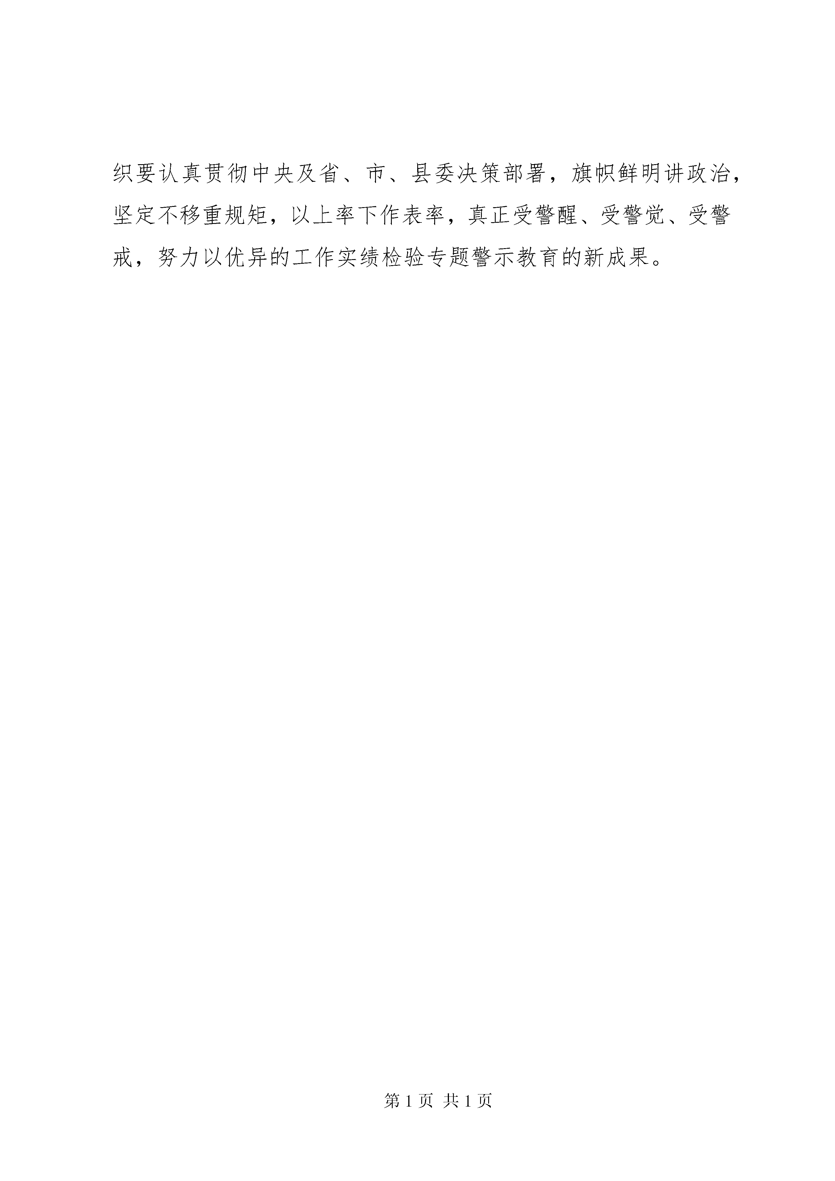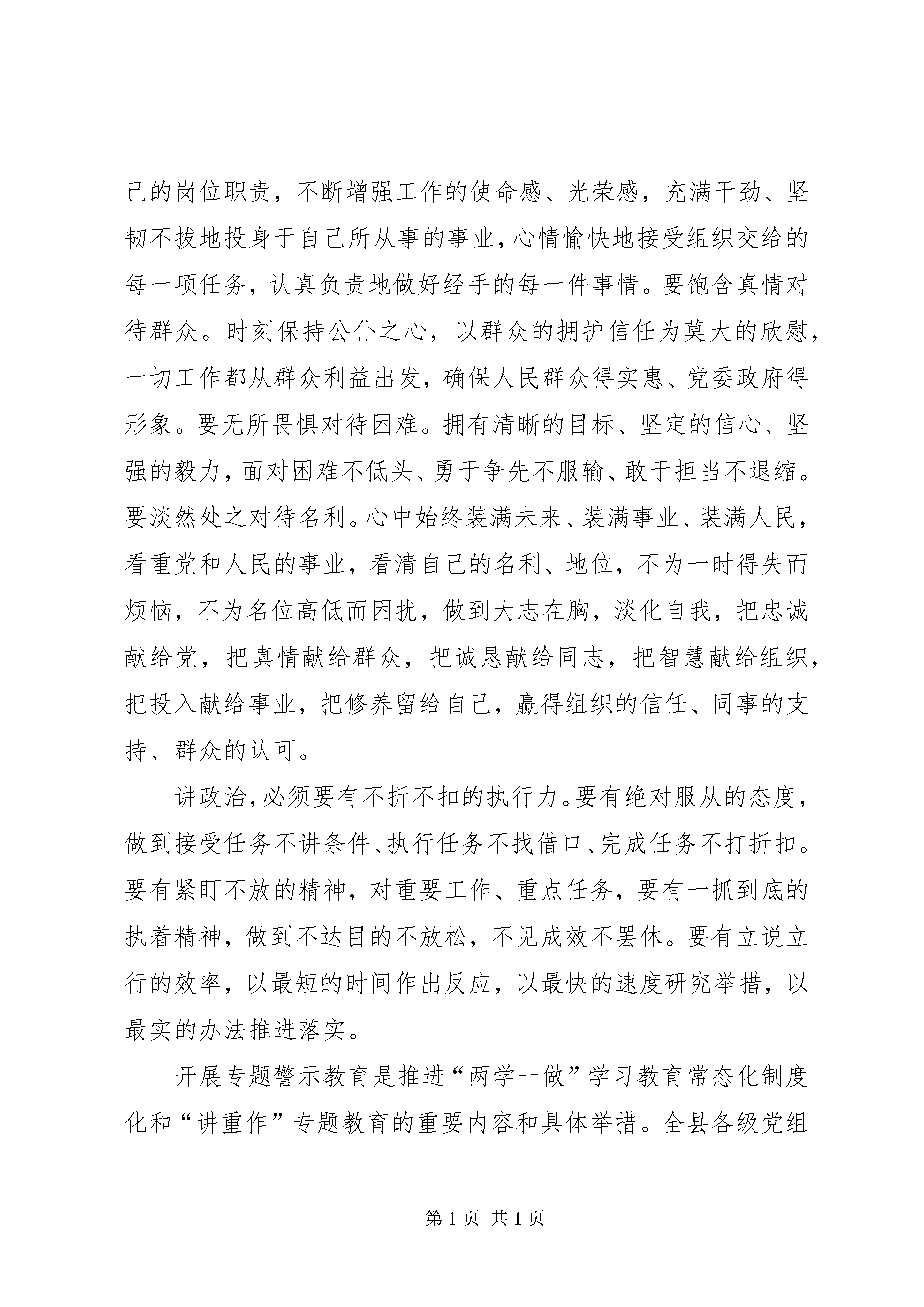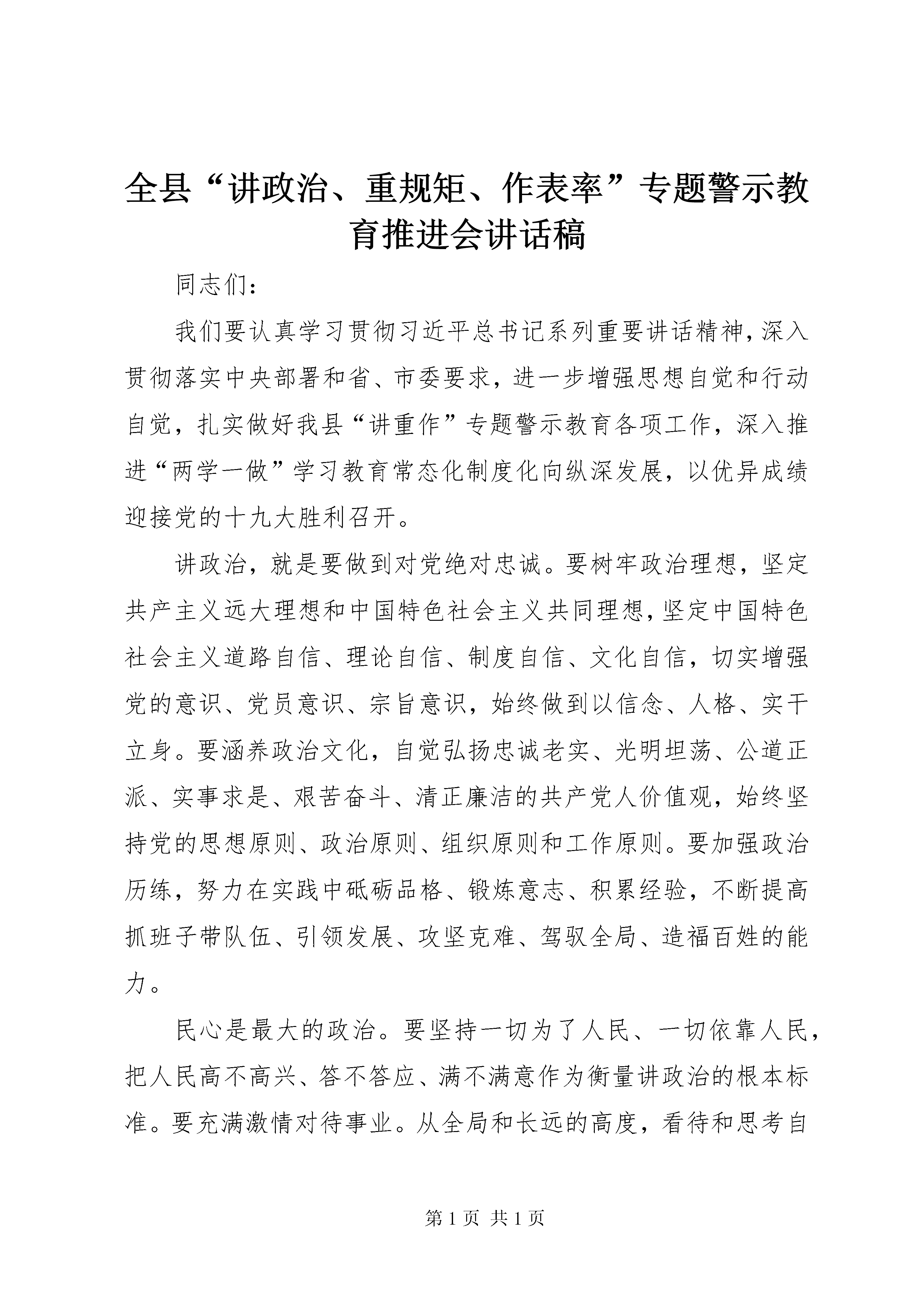 全县“讲政治、重规矩、作表率”专题警示教育推进会讲话稿同志们:我们要认真学习贯彻习近平总书记系列重要讲话精神,深入贯彻落实中央部署和省、市委要求,进一步增强思想自觉和行动自觉,扎实做好我县“讲重作”专题警示教育各项工作,深入推进“两学一做”学习教育常态化制度化向纵深发展,以优异成绩迎接党的十九大胜利召开。讲政治,就是要做到对党绝对忠诚。要树牢政治理想,坚定共产主义远大理想和中国特色社会主义共同理想,坚定中国特色社会主义道路自信、理论自信、制度自信、文化自信,切实增强党的意识、党员意识、宗旨意识,始终做到以信念、人格、实干立身。要涵养政治文化,自觉弘扬忠诚老实、光明坦荡、公道正派、实事求是、艰苦奋斗、清正廉洁的共产党人价值观,始终坚持党的思想原则、政治原则、组织原则和工作原则。要加强政治历练,努力在实践中砥砺品格、锻炼意志、积累经验,不断提高抓班子带队伍、引领发展、攻坚克难、驾驭全局、造福百姓的能力。民心是最大的政治。要坚持一切为了人民、一切依靠人民,把人民高不高兴、答不答应、满不满意作为衡量讲政治的根本标准。要充满激情对待事业。从全局和长远的高度,看待和思考自己的岗位职责,不断增强工作的使命感、光荣感,充满干劲、坚韧不拔地投身于自己所从事的事业,心情愉快地接受组织交给的每一项任务,认真负责地做好经手的每一件事情。要饱含真情对待群众。时刻保持公仆之心,以群众的拥护信任为莫大的欣慰,一切工作都从群众利益出发,确保人民群众得实惠、党委政府得形象。要无所畏惧对待困难。拥有清晰的目标、坚定的信心、坚强的毅力,面对困难不低头、勇于争先不服输、敢于担当不退缩。要淡然处之对待名利。心中始终装满未来、装满事业、装满人民,看重党和人民的事业,看清自己的名利、地位,不为一时得失而烦恼,不为名位高低而困扰,做到大志在胸,淡化自我,把忠诚献给党,把真情献给群众,把诚恳献给同志,把智慧献给组织,把投入献给事业,把修养留给自己,赢得组织的信任、同事的支持、群众的认可。讲政治,必须要有不折不扣的执行力。要有绝对服从的态度,做到接受任务不讲条件、执行任务不找借口、完成任务不打折扣。要有紧盯不放的精神,对重要工作、重点任务,要有一抓到底的执着精神,做到不达目的不放松,不见成效不罢休。要有立说立行的效率,以最短的时间作出反应,以最快的速度研究举措,以最实的办法推进落实。开展专题警示教育是推进“两学一做”学习教育常态化制度化和“讲重作”专题教育的重要内容和具体举措。全县各级党组织要认真贯彻中央及省、市、县委决策部署,旗帜鲜明讲政治,坚定不移重规矩,以上率下作表率,真正受警醒、受警觉、受警戒,努力以优异的工作实绩检验专题警示教育的新成果。