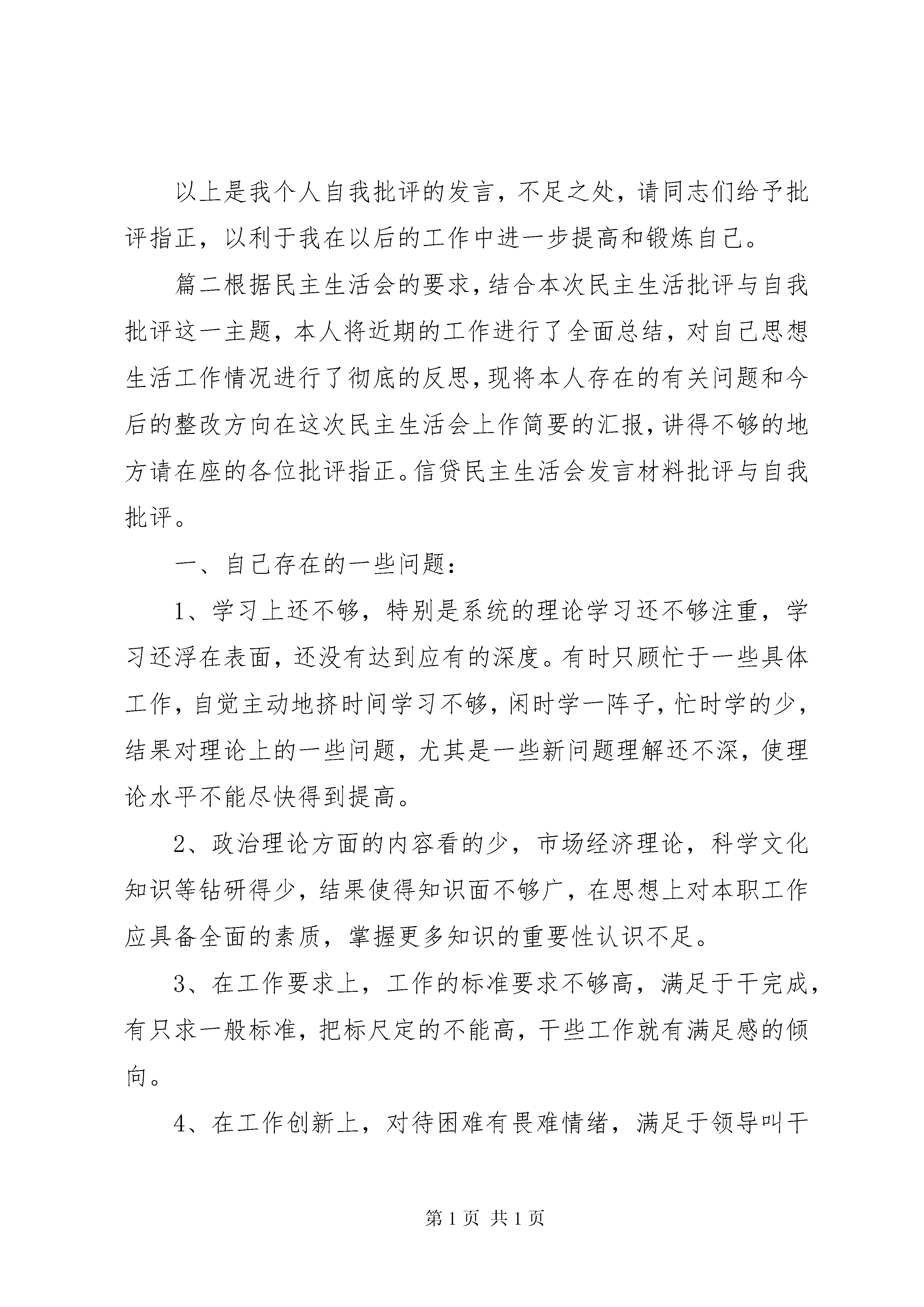 关于开展批评与自我批评的发言稿三篇本人能严格遵守领导干部廉洁自律的六项规定。凡要求下面做到的,自己首先要做到,要求别人不做的,自己绝对不做。堂堂正正做人,清清白白为官,真正做到自律、自省、自警、自励,始终保持共产党人的政治本色。职场为大家整理的《开展批评与自我批评发言稿三篇》,希望对大家有所帮助。篇一本人通过理论和文件学习,不断改造世界观、人生观和价值观,更加坚定了信念,在思想上、行动上进一步统一到xxxx重要思想的要求上来,统一到经贸委党委当前的工作重心和奋斗目标上来。一年来,做为经贸委党委委员和xxx总经理,在集团公司的带领下,本人能正确给自己定位,注意维护班子的团结,履行好自己的职责,牢记两个务必廉洁自律,积极做好本职工作,现从以下几个方面做汇报,自我批评,如有不妥,不足之处,请领导和同志批评指正,我将本着有则改之,无则加勉的态度,虚心诚恳接受。一、加强作风建设在工作中本人能够树立大局意识,认真执行上级党委和集团公司的各项制度和粮食政策,积极倡导为三农服务,认真做好粮食工作,努力完成收购任务。能够坚持民主集中制原则,在党总支上能充分发表自己的意见,对会议决定的事坚决服从,对重大事项及时请示汇报,并及时向下级传达党委的决定,不搞暗箱操作。平时注意和班子成员沟通,向他们学习,丰富自己的管理经验,提高自己的领导水平,维护班子的团结。二、认真落实党风廉政责任制我能严格遵守领导干部廉洁自律的六项规定。凡要求下面做到的,自己首先要做到;要求别人不做的,自己绝对不做。堂堂正正做人,清清白白为官,真正做到自律、自省、自警、自励,始终保持共产党人的政治本色。在生活上严格要求自己,敢于抵制各种不正之风和腐败行为,能严格要求自己的亲属及身边工作人员,使他们也能够严格执行各项规定,认真落实党内监督五项制度,努力做到勤政廉政。自觉接受监督,抵制不正之风,不滥用权力,不谋私利,坚持实事求是,坚持务实的工作作风,不说大话空话。三、存在的问题1、政治理论学习深度不够,平时,自己虽然也重视政治理论的学习,能够及时、认真的学习有关政策,但不够系统,缺乏全面的、系统的钻研精神。仅仅满足于有关安排学习,学过了事,在学习的自觉性方面还存在较大的差距,没有对学过的东西进行认真反思,没有深刻钻研。在以后的工作,我还需认真加以克服和改进。2、深入基层调查研究不够,领导干部与一般职工需要面对面地交心、谈心,从这个角度上讲我做得不细。今后我要进一步牢固树立党的从群众中来,到群众中去的观点,多深入基层,多搞调查研究,了解情况,职工生活和思想状况,多倾听群众建议,及时掌握干部职工的思想动态和普遍要求,把他们的一些好意见征集上来,针对性地提出解决办法和措施,以更好地做好工作。3、自己的领导艺术和水平还待进一步提高,领导艺术和水平还需要在今后工作中进一步加强。要通过学习,不断提高领导水平,提高明辨是非的能力,提高政治敏锐性和政治鉴别力,要善于透过现象看本质,站在全局的高度,从整体利益看待问题,解决问题,以适应现代企业管理的需要。4、积极探索粮食购销企业发展的新路子,维护粮食安全。今年由于粮食购销市场发生了变化,销价下跌给粮食经营带来了困难,同时夏粮收购价格定价的不合理,造成目前销售收购困难很大,粮食购销企业面对目前的粮食市场经营存在一定的危机,因此自己在今后的工作中,更要加强学习,吸收好的经验,提高管理水平,认真对待研究调查市场,适应市场,积极开拓市场,探索粮食企业发展的新路子。切实做好粮食安全稳定工作。5、积极参加党委各项活动,充分发挥党委委员的作用。粮食购销企业是一个季节性的企业,收购季节工作忙,造成了有时不能及时参加党委召开的会议,所以今后工作中努力克服,严格要求自己,合理安排好工作和会议的关系,及时参加党委召开的会议,充分发挥党委委员的作用,切实为企业发展出谋划策。以上是我个人自我批评的发言,不足之处,请同志们给予批评指正,以利于我在以后的工作中进一步提高和锻炼自己。篇二根据民主生活会的要求,结合本次民主生活批评与自我批评这一主题,本人将近期的工作进行了全面总结,对自己思想生活工作情况进行了彻底的反思,现将本人存在的有关问题和今后的整改方向在这次民主生活会上作简要的汇报,讲得不够的地方请在座的各位批评指正。信贷民主生活会发言材料批评与自我批评。一、自己存在的一些问题:1、学习上还不够,特别是系统的理论学习还不够注重,学习还浮在表面,还没有达到应有的深度。有时只顾忙于一些具体工作,自觉主动地挤时间学习不够,闲时学一阵子,忙时学的少,结果对理论上的一些问题,尤其是一些新问题理解还不深,使理论水平不能尽快得到提高。2、政治理论方面的内容看的少,市场经济理论,科学文化知识等钻研得少,结果使得知识面不够广,在思想上对本职工作应具备全面的素质,掌握更多知识的