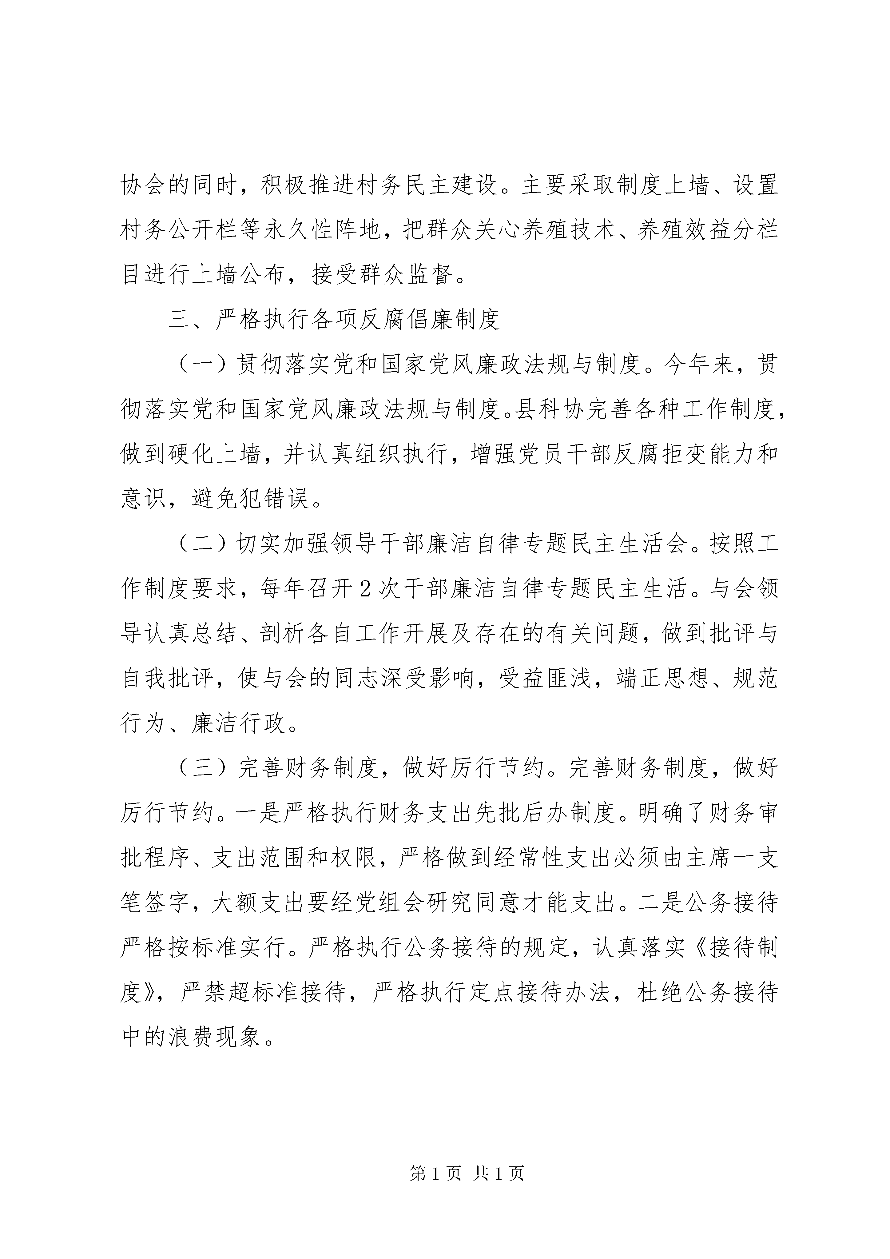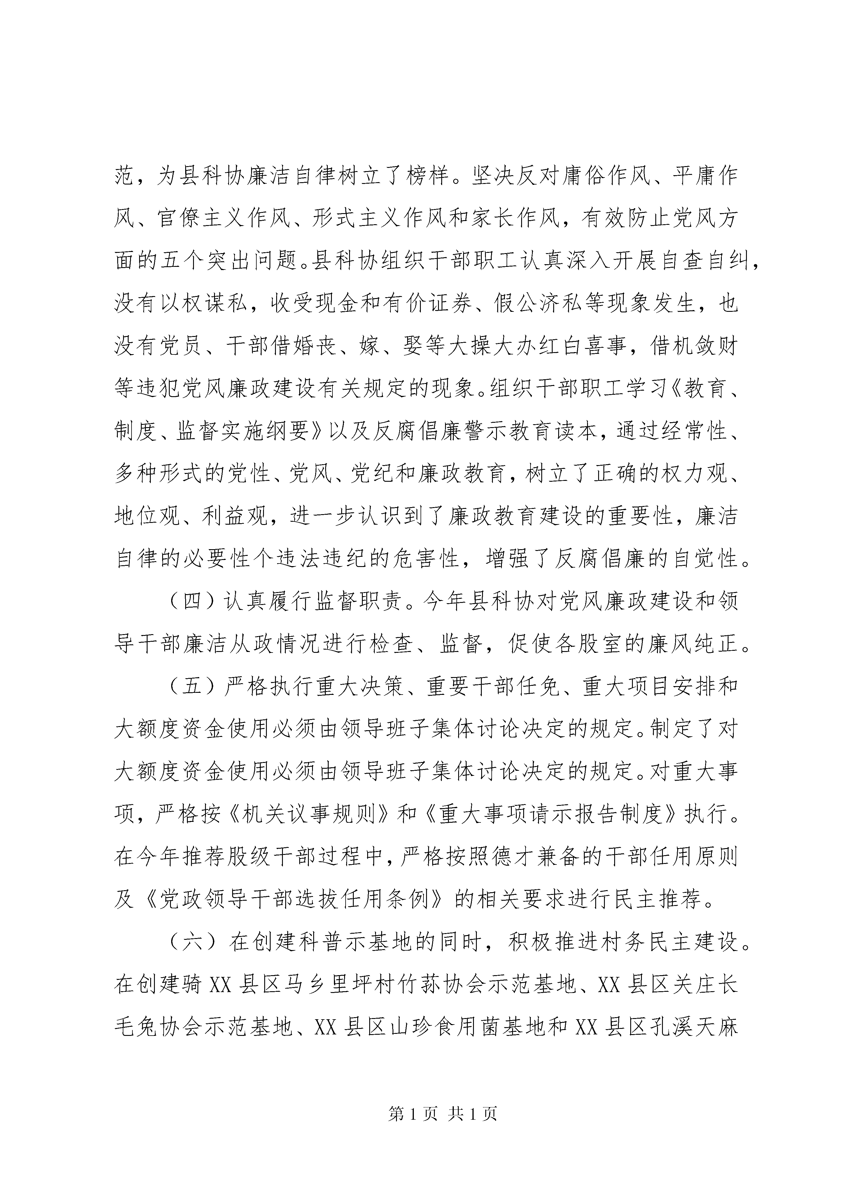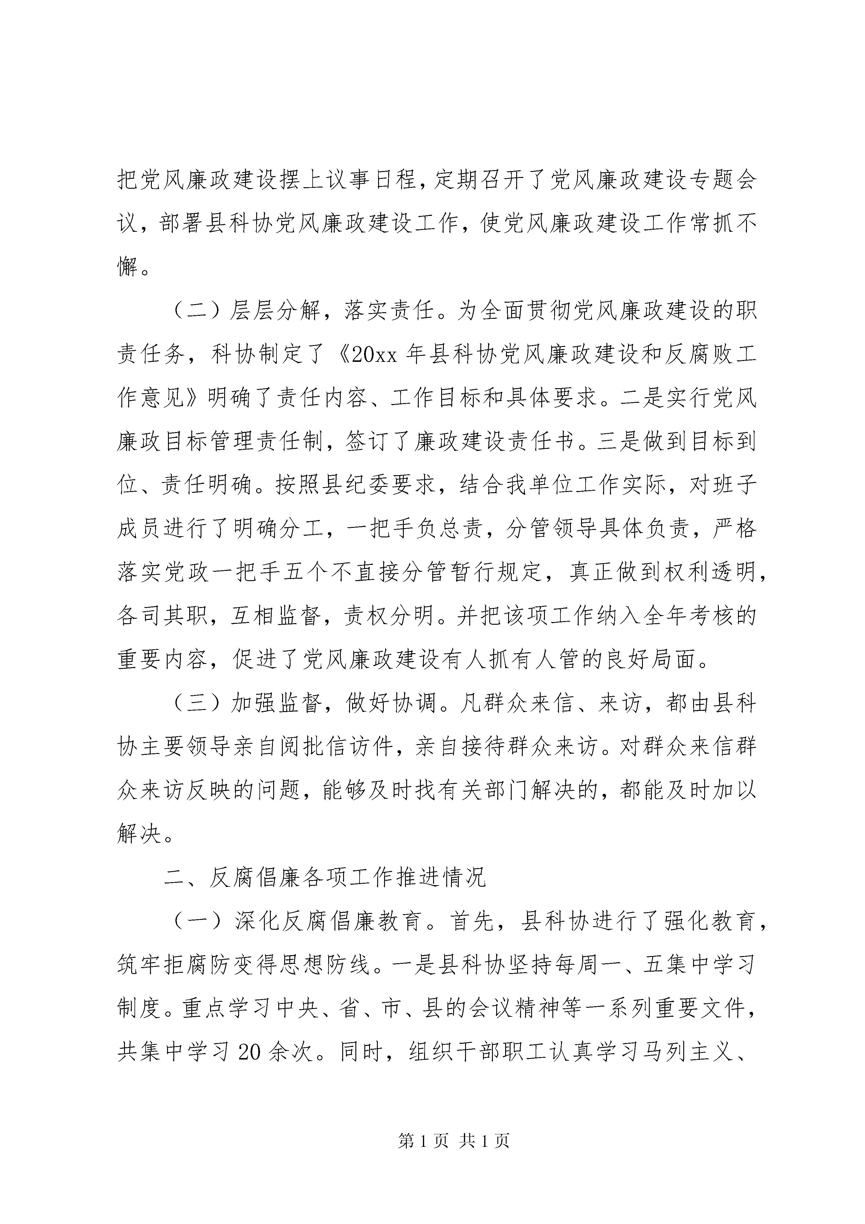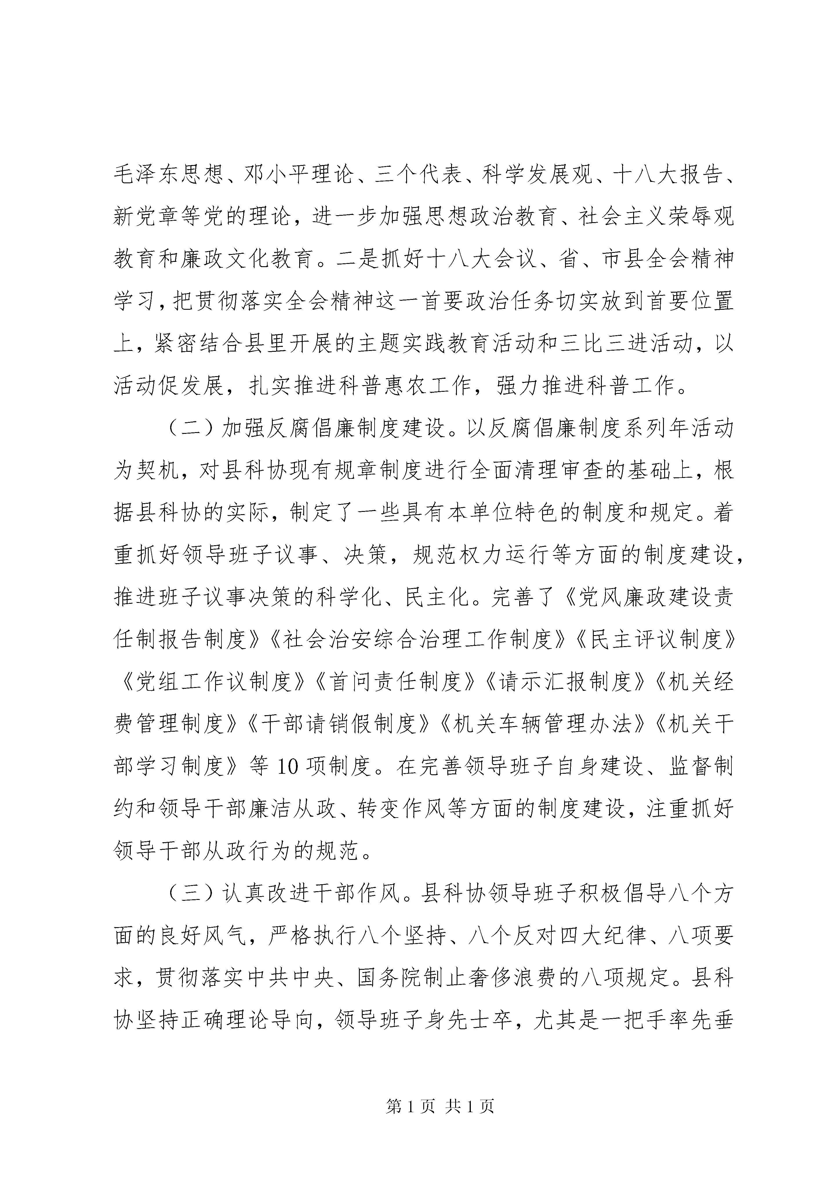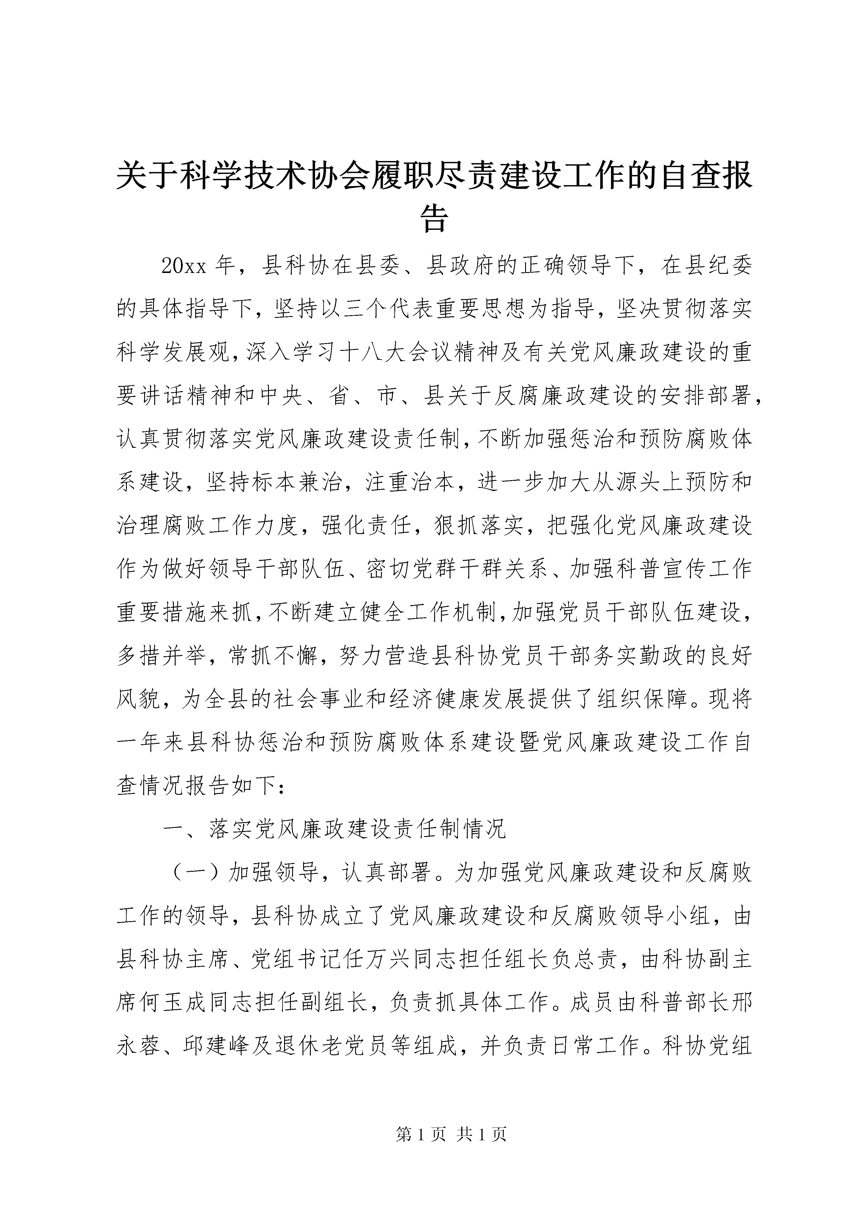 关于科学技术协会履职尽责建设工作的自查报告20xx年,县科协在县委、县政府的正确领导下,在县纪委的具体指导下,坚持以三个代表重要思想为指导,坚决贯彻落实科学发展观,深入学习十八大会议精神及有关党风廉政建设的重要讲话精神和中央、省、市、县关于反腐廉政建设的安排部署,认真贯彻落实党风廉政建设责任制,不断加强惩治和预防腐败体系建设,坚持标本兼治,注重治本,进一步加大从源头上预防和治理腐败工作力度,强化责任,狠抓落实,把强化党风廉政建设作为做好领导干部队伍、密切党群干群关系、加强科普宣传工作重要措施来抓,不断建立健全工作机制,加强党员干部队伍建设,多措并举,常抓不懈,努力营造县科协党员干部务实勤政的良好风貌,为全县的社会事业和经济健康发展提供了组织保障。现将一年来县科协惩治和预防腐败体系建设暨党风廉政建设工作自查情况报告如下:一、落实党风廉政建设责任制情况(一)加强领导,认真部署。为加强党风廉政建设和反腐败工作的领导,县科协成立了党风廉政建设和反腐败领导小组,由县科协主席、党组书记任万兴同志担任组长负总责,由科协副主席何玉成同志担任副组长,负责抓具体工作。成员由科普部长邢永蓉、邱建峰及退休老党员等组成,并负责日常工作。科协党组把党风廉政建设摆上议事日程,定期召开了党风廉政建设专题会议,部署县科协党风廉政建设工作,使党风廉政建设工作常抓不懈。(二)层层分解,落实责任。为全面贯彻党风廉政建设的职责任务,科协制定了《20xx年县科协党风廉政建设和反腐败工作意见》明确了责任内容、工作目标和具体要求。二是实行党风廉政目标管理责任制,签订了廉政建设责任书。三是做到目标到位、责任明确。按照县纪委要求,结合我单位工作实际,对班子成员进行了明确分工,一把手负总责,分管领导具体负责,严格落实党政一把手五个不直接分管暂行规定,真正做到权利透明,各司其职,互相监督,责权分明。并把该项工作纳入全年考核的重要内容,促进了党风廉政建设有人抓有人管的良好局面。(三)加强监督,做好协调。凡群众来信、来访,都由县科协主要领导亲自阅批信访件,亲自接待群众来访。对群众来信群众来访反映的问题,能够及时找有关部门解决的,都能及时加以解决。二、反腐倡廉各项工作推进情况(一)深化反腐倡廉教育。首先,县科协进行了强化教育,筑牢拒腐防变得思想防线。一是县科协坚持每周一、五集中学习制度。重点学习中央、省、市、县的会议精神等一系列重要文件,共集中学习20余次。同时,组织干部职工认真学习马列主义、毛泽东思想、邓小平理论、三个代表、科学发展观、十八大报告、新党章等党的理论,进一步加强思想政治教育、社会主义荣辱观教育和廉政文化教育。二是抓好十八大会议、省、市县全会精神学习,把贯彻落实全会精神这一首要政治任务切实放到首要位置上,紧密结合县里开展的主题实践教育活动和三比三进活动,以活动促发展,扎实推进科普惠农工作,强力推进科普工作。(二)加强反腐倡廉制度建设。以反腐倡廉制度系列年活动为契机,对县科协现有规章制度进行全面清理审查的基础上,根据县科协的实际,制定了一些具有本单位特色的制度和规定。着重抓好领导班子议事、决策,规范权力运行等方面的制度建设,推进班子议事决策的科学化、民主化。完善了《党风廉政建设责任制报告制度》《社会治安综合治理工作制度》《民主评议制度》《党组工作议制度》《首问责任制度》《请示汇报制度》《机关经费管理制度》《干部请销假制度》《机关车辆管理办法》《机关干部学习制度》等10项制度。在完善领导班子自身建设、监督制约和领导干部廉洁从政、转变作风等方面的制度建设,注重抓好领导干部从政行为的规范。(三)认真改进干部作风。县科协领导班子积极倡导八个方面的良好风气,严格执行八个坚持、八个反对四大纪律、八项要求,贯彻落实中共中央、国务院制止奢侈浪费的八项规定。县科协坚持正确理论导向,领导班子身先士卒,尤其是一把手率先垂范,为县科协廉洁自律树立了榜样。坚决反对庸俗作风、平庸作风、官僚主义作风、形式主义作风和家长作风,有效防止党风方面的五个突出问题。县科协组织干部职工认真深入开展自查自纠,没有以权谋私,收受现金和有价证券、假公济私等现象发生,也没有党员、干部借婚丧、嫁、娶等大操大办红白喜事,借机敛财等违犯党风廉政建设有关规定的现象。组织干部职工学习《教育、制度、监督实施纲要》以及反腐倡廉警示教育读本,通过经常性、多种形式的党性、党风、党纪和廉政教育,树立了正确的权力观、地位观、利益观,进一步认识到了廉政教育建设的重要性,廉洁自律的必要性个违法违纪的危害性,增强了反腐倡廉的自觉性。(四)认真履行监督职责。今年县科协对党风廉政建设和领导干部廉洁从政情况进行检查、监督,促使各股室的廉风纯正。(五)严格执行重大决策、重要干部任免、重大项目安排和大额度资金使用必须由领导班子集体讨论决