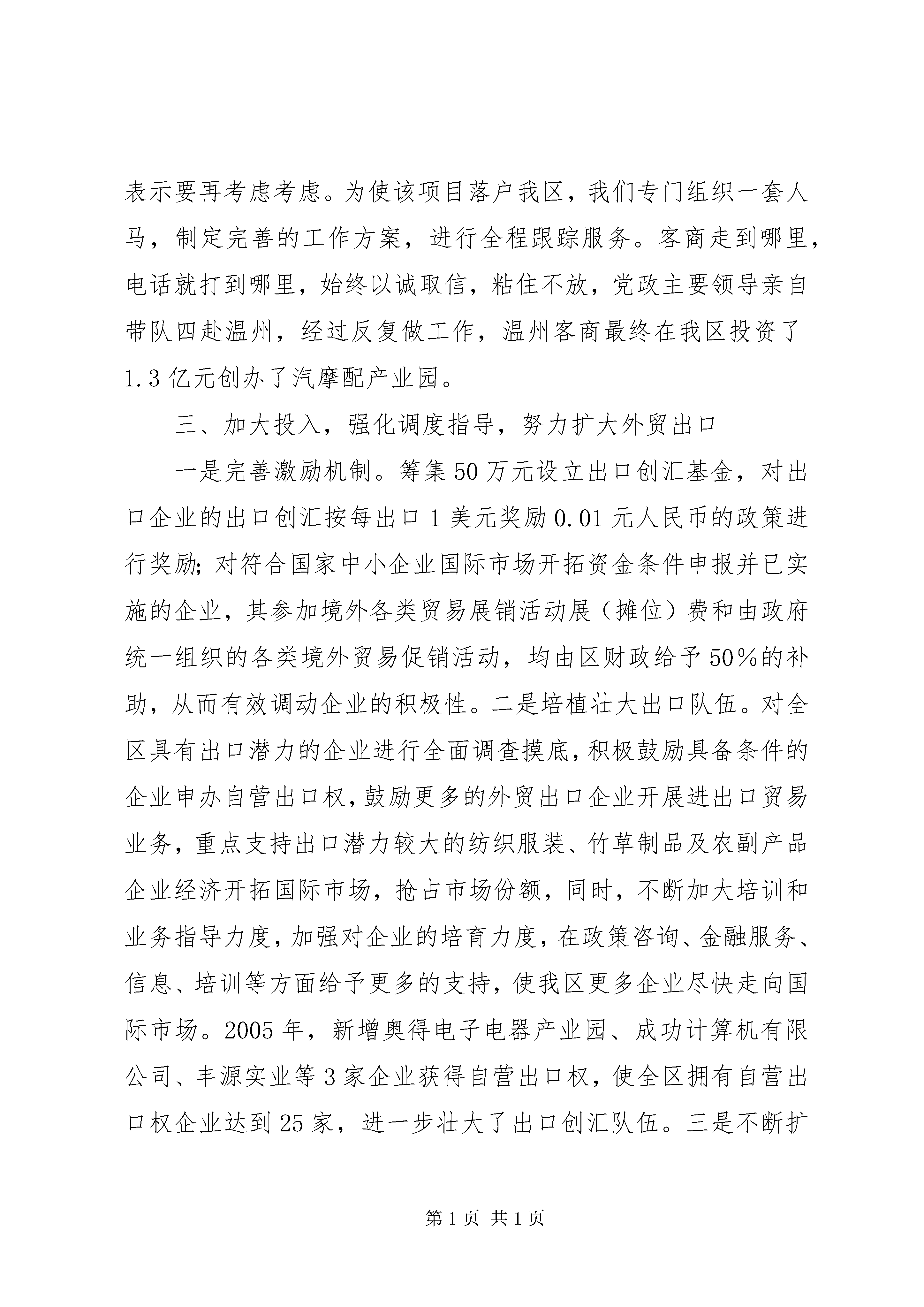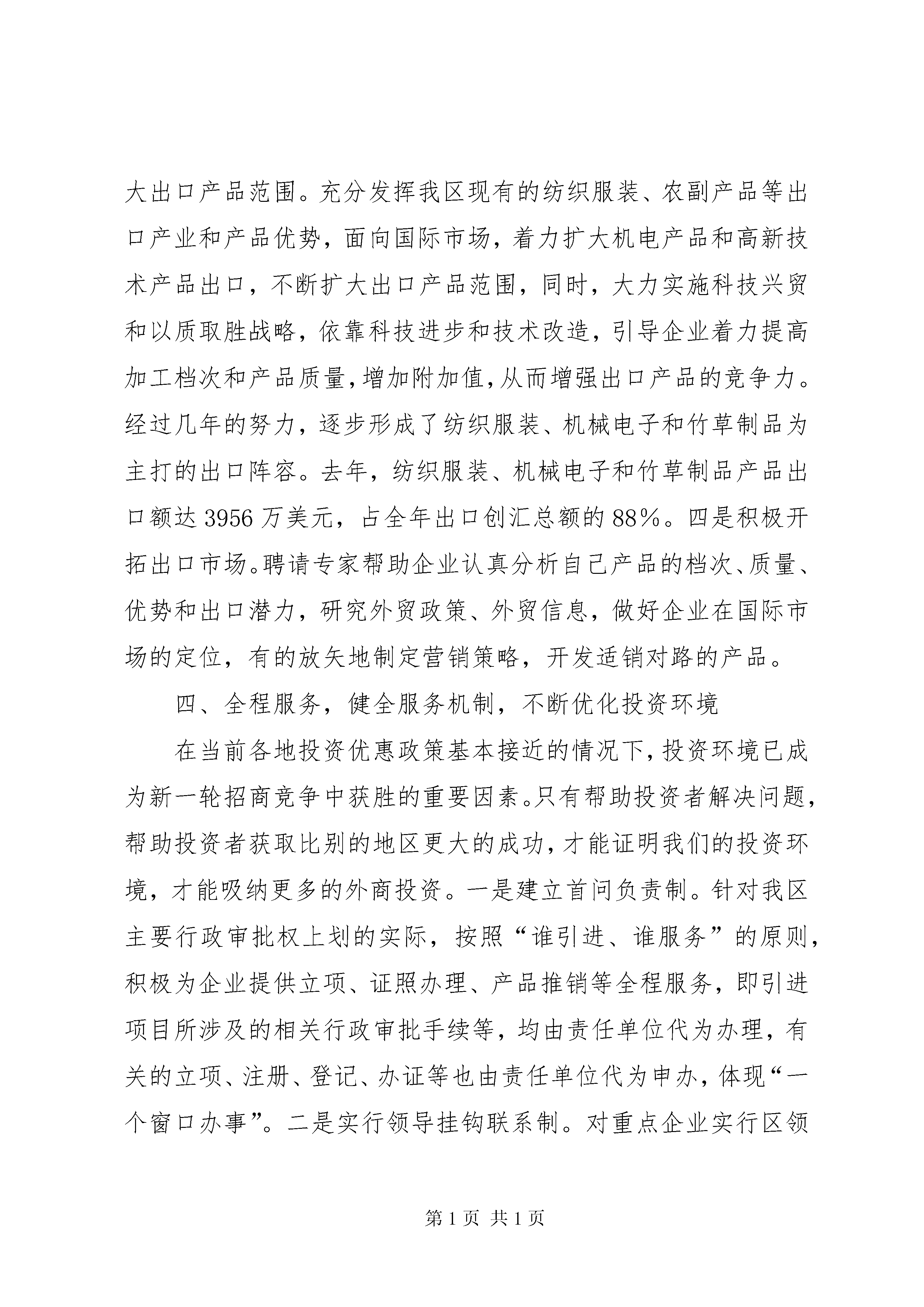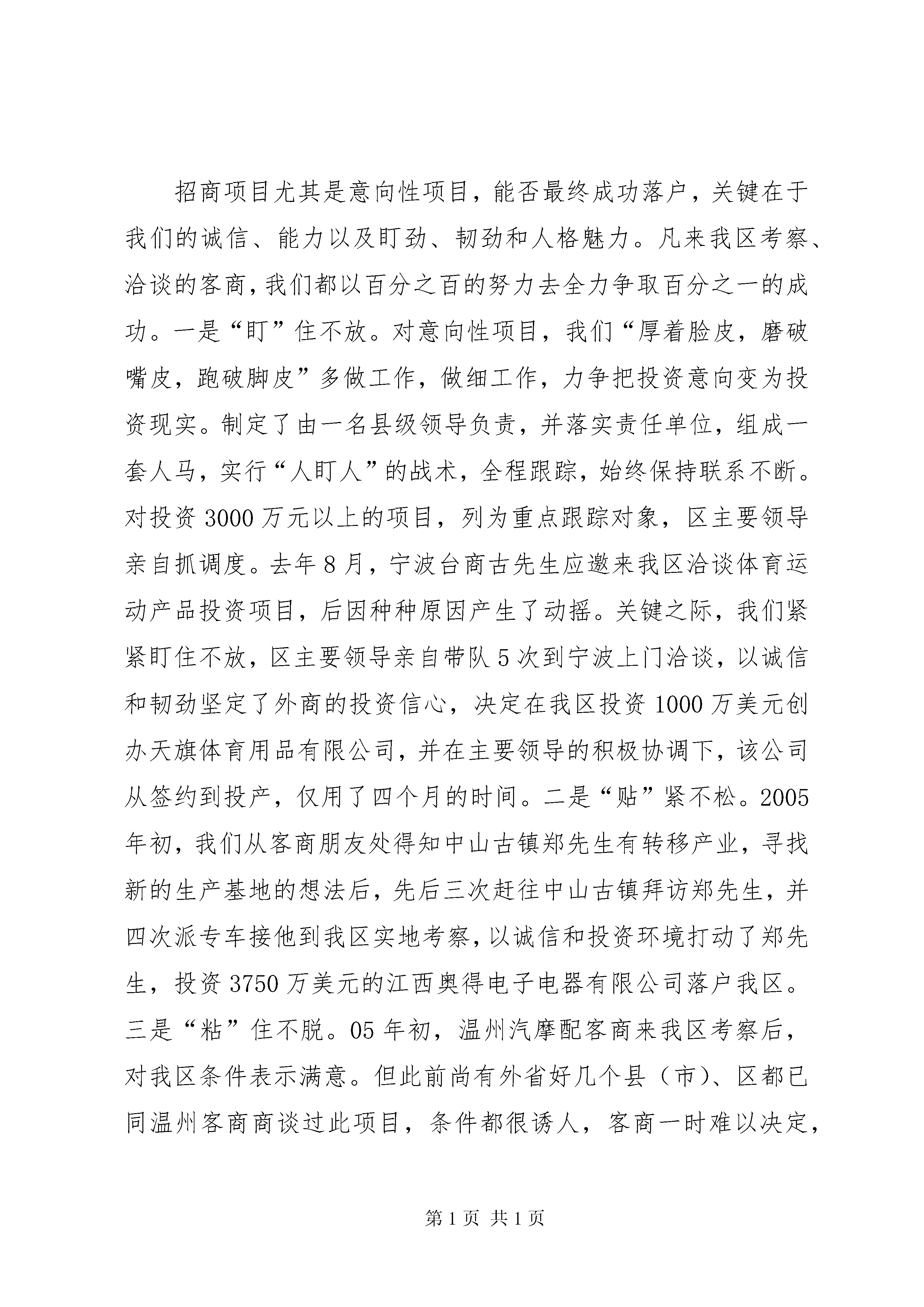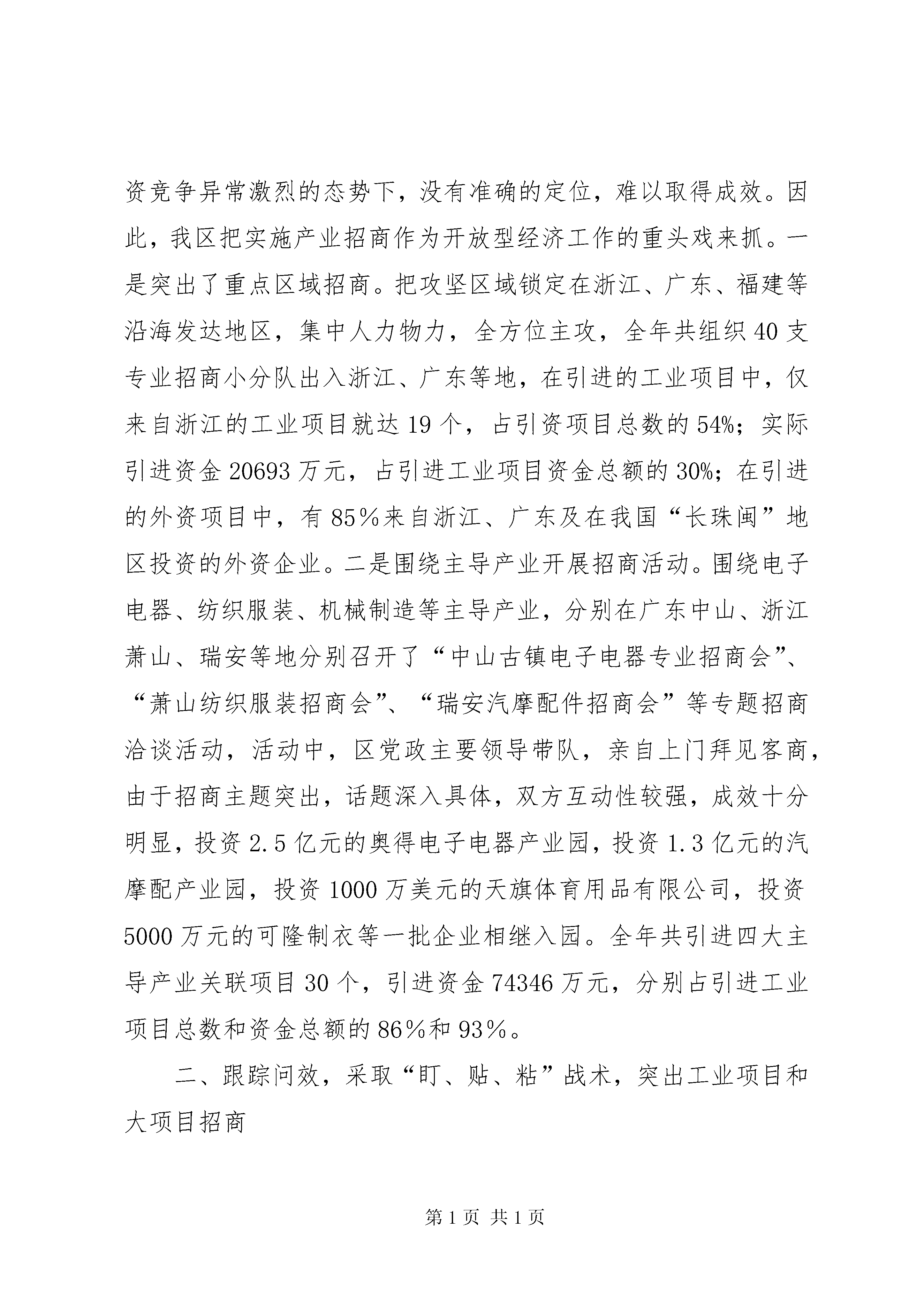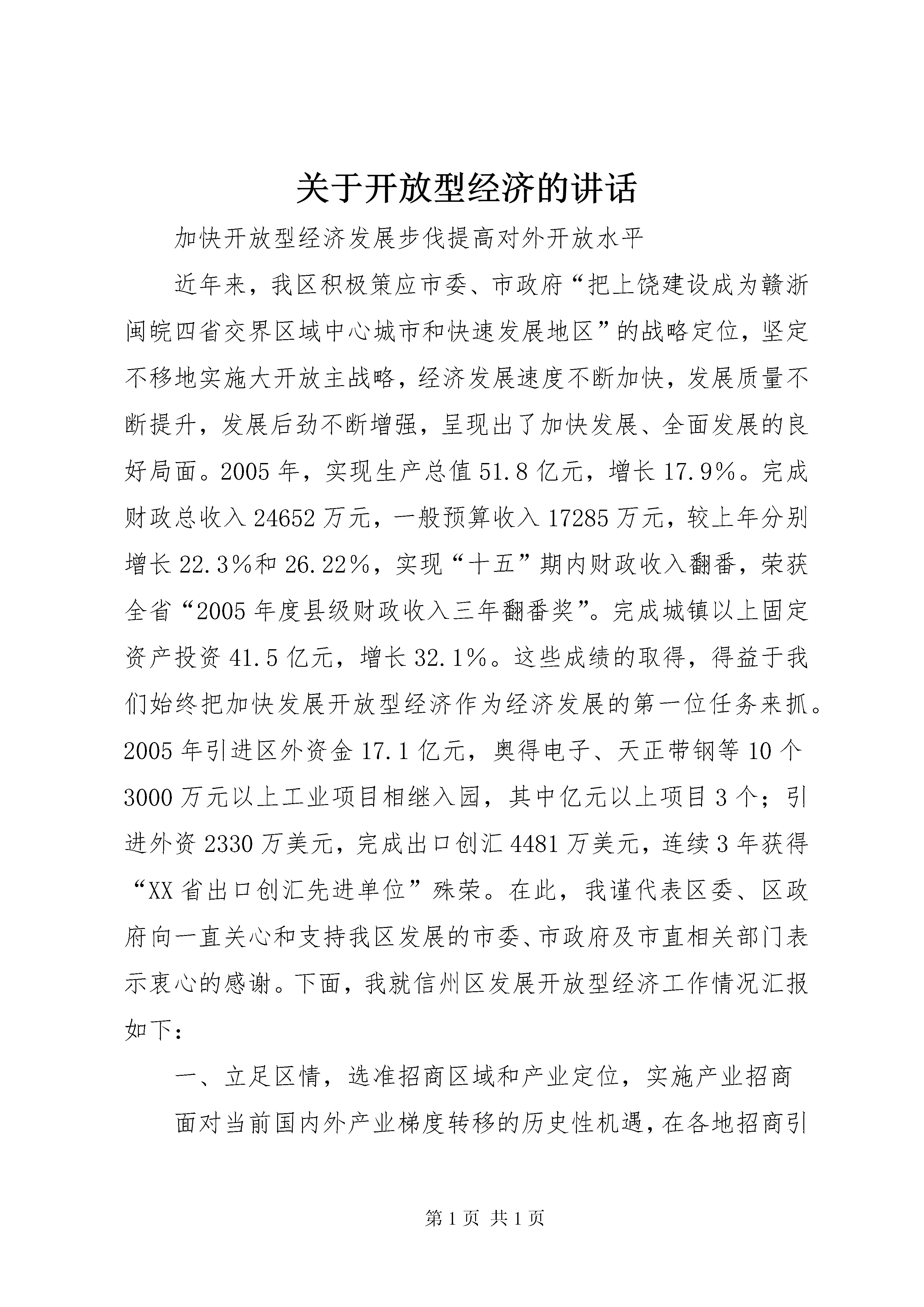 关于开放型经济的讲话加快开放型经济发展步伐提高对外开放水平近年来,我区积极策应市委、市政府“把上饶建设成为赣浙闽皖四省交界区域中心城市和快速发展地区”的战略定位,坚定不移地实施大开放主战略,经济发展速度不断加快,发展质量不断提升,发展后劲不断增强,呈现出了加快发展、全面发展的良好局面。2005年,实现生产总值51.8亿元,增长17.9%。完成财政总收入24652万元,一般预算收入17285万元,较上年分别增长22.3%和26.22%,实现“十五”期内财政收入翻番,荣获全省“2005年度县级财政收入三年翻番奖”。完成城镇以上固定资产投资41.5亿元,增长32.1%。这些成绩的取得,得益于我们始终把加快发展开放型经济作为经济发展的第一位任务来抓。2005年引进区外资金17.1亿元,奥得电子、天正带钢等10个3000万元以上工业项目相继入园,其中亿元以上项目3个;引进外资2330万美元,完成出口创汇4481万美元,连续3年获得“XX省出口创汇先进单位”殊荣。在此,我谨代表区委、区政府向一直关心和支持我区发展的市委、市政府及市直相关部门表示衷心的感谢。下面,我就信州区发展开放型经济工作情况汇报如下:一、立足区情,选准招商区域和产业定位,实施产业招商面对当前国内外产业梯度转移的历史性机遇,在各地招商引资竞争异常激烈的态势下,没有准确的定位,难以取得成效。因此,我区把实施产业招商作为开放型经济工作的重头戏来抓。一是突出了重点区域招商。把攻坚区域锁定在浙江、广东、福建等沿海发达地区,集中人力物力,全方位主攻,全年共组织40支专业招商小分队出入浙江、广东等地,在引进的工业项目中,仅来自浙江的工业项目就达19个,占引资项目总数的54%;实际引进资金20693万元,占引进工业项目资金总额的30%;在引进的外资项目中,有85%来自浙江、广东及在我国“长珠闽”地区投资的外资企业。二是围绕主导产业开展招商活动。围绕电子电器、纺织服装、机械制造等主导产业,分别在广东中山、浙江萧山、瑞安等地分别召开了“中山古镇电子电器专业招商会”、“萧山纺织服装招商会”、“瑞安汽摩配件招商会”等专题招商洽谈活动,活动中,区党政主要领导带队,亲自上门拜见客商,由于招商主题突出,话题深入具体,双方互动性较强,成效十分明显,投资2.5亿元的奥得电子电器产业园,投资1.3亿元的汽摩配产业园,投资1000万美元的天旗体育用品有限公司,投资5000万元的可隆制衣等一批企业相继入园。全年共引进四大主导产业关联项目30个,引进资金74346万元,分别占引进工业项目总数和资金总额的86%和93%。二、跟踪问效,采取“盯、贴、粘”战术,突出工业项目和大项目招商招商项目尤其是意向性项目,能否最终成功落户,关键在于我们的诚信、能力以及盯劲、韧劲和人格魅力。凡来我区考察、洽谈的客商,我们都以百分之百的努力去全力争取百分之一的成功。一是“盯”住不放。对意向性项目,我们“厚着脸皮,磨破嘴皮,跑破脚皮”多做工作,做细工作,力争把投资意向变为投资现实。制定了由一名县级领导负责,并落实责任单位,组成一套人马,实行“人盯人”的战术,全程跟踪,始终保持联系不断。对投资3000万元以上的项目,列为重点跟踪对象,区主要领导亲自抓调度。去年8月,宁波台商古先生应邀来我区洽谈体育运动产品投资项目,后因种种原因产生了动摇。关键之际,我们紧紧盯住不放,区主要领导亲自带队5次到宁波上门洽谈,以诚信和韧劲坚定了外商的投资信心,决定在我区投资1000万美元创办天旗体育用品有限公司,并在主要领导的积极协调下,该公司从签约到投产,仅用了四个月的时间。二是“贴”紧不松。2005年初,我们从客商朋友处得知中山古镇郑先生有转移产业,寻找新的生产基地的想法后,先后三次赶往中山古镇拜访郑先生,并四次派专车接他到我区实地考察,以诚信和投资环境打动了郑先生,投资3750万美元的江西奥得电子电器有限公司落户我区。三是“粘”住不脱。05年初,温州汽摩配客商来我区考察后,对我区条件表示满意。但此前尚有外省好几个县(市)、区都已同温州客商商谈过此项目,条件都很诱人,客商一时难以决定,表示要再考虑考虑。为使该项目落户我区,我们专门组织一套人马,制定完善的工作方案,进行全程跟踪服务。客商走到哪里,电话就打到哪里,始终以诚取信,粘住不放,党政主要领导亲自带队四赴温州,经过反复做工作,温州客商最终在我区投资了1.3亿元创办了汽摩配产业园。三、加大投入,强化调度指导,努力扩大外贸出口一是完善激励机制。筹集50万元设立出口创汇基金,对出口企业的出口创汇按每出口1美元奖励0.01元人民币的政策进行奖励;对符合国家中小企业国际市场开拓资金条件申报并已实施的企业,其参加境外各类贸易展销活动展(摊位)费和由政府统一组织的各类境外贸易促销活动,均由区