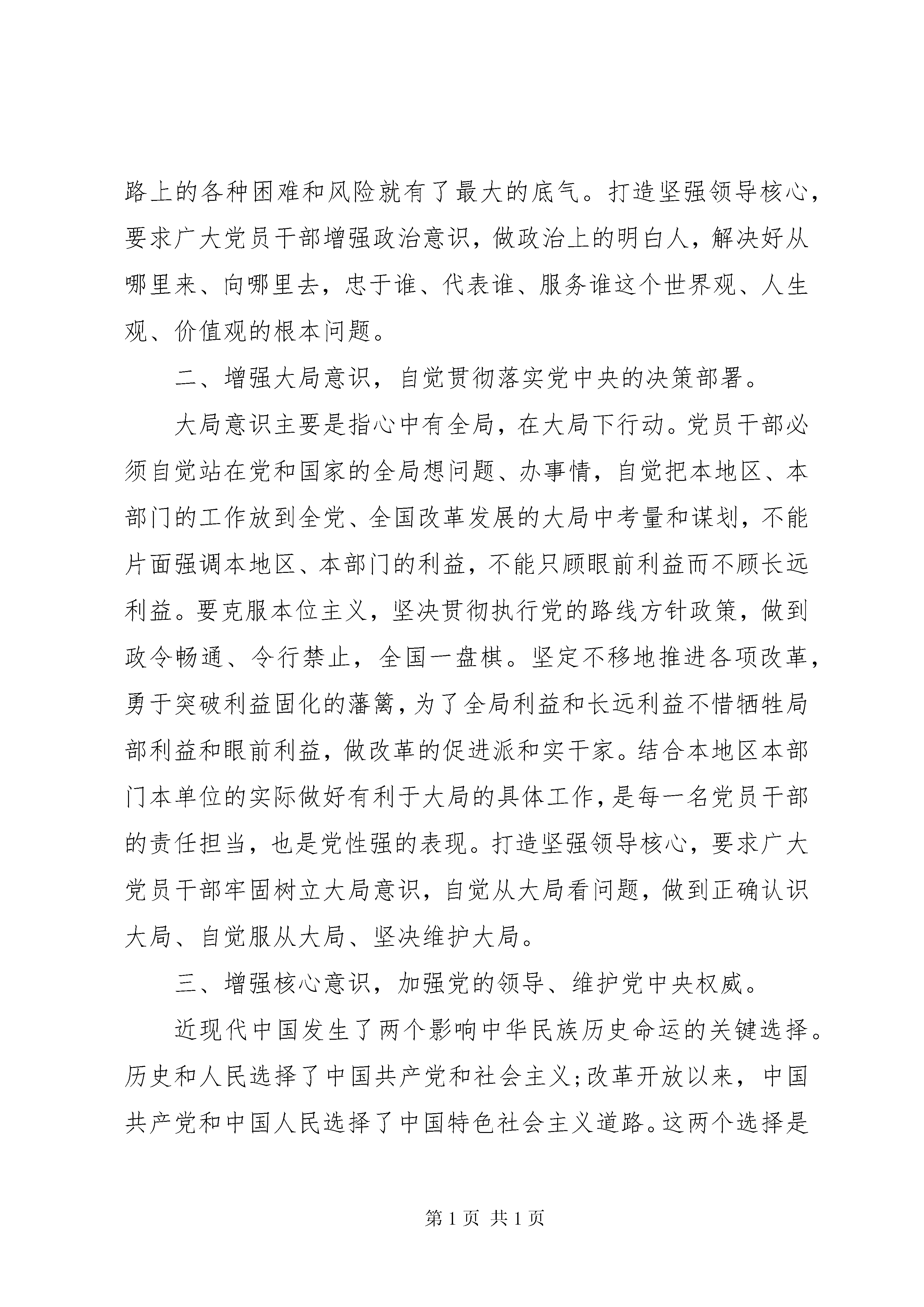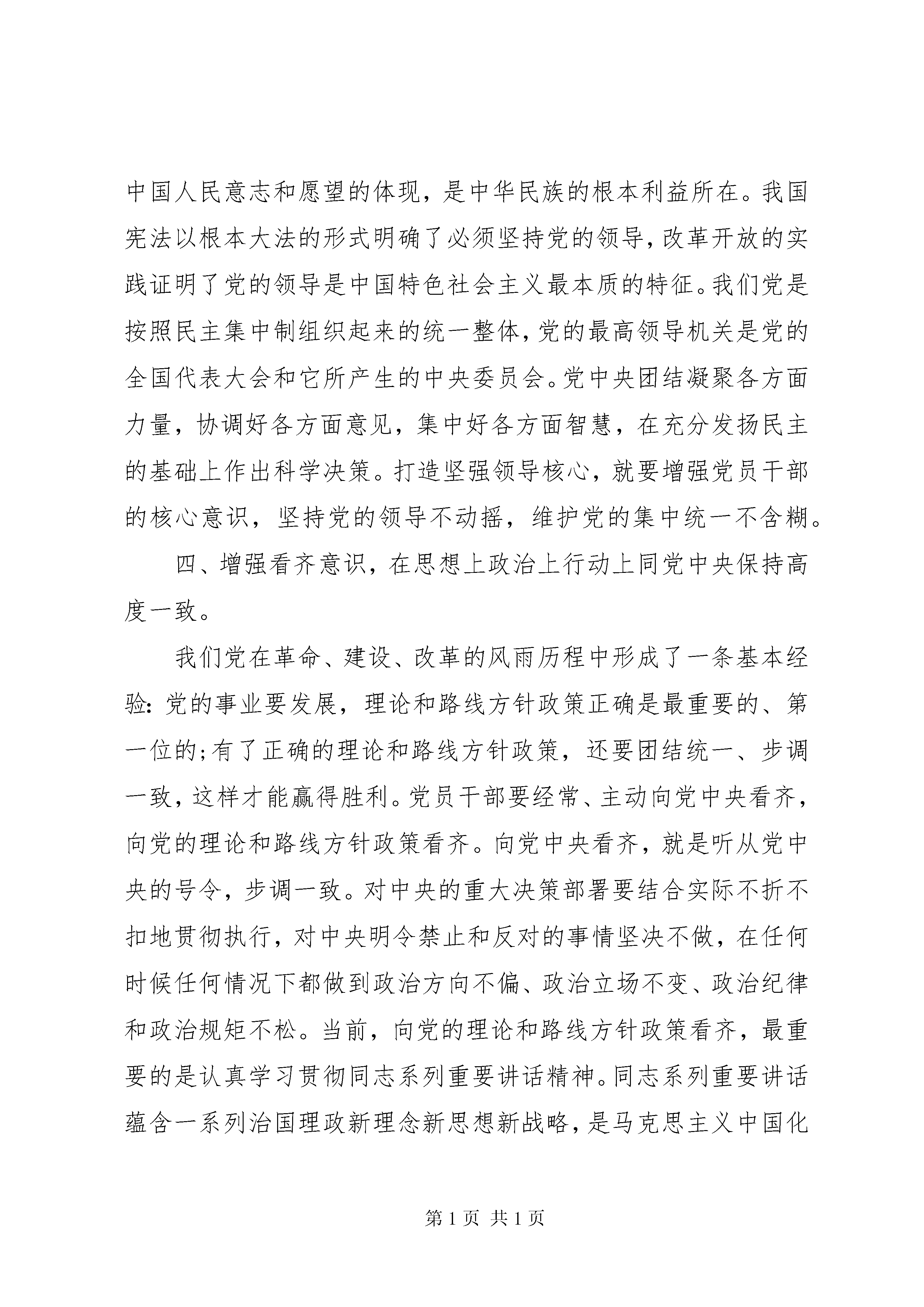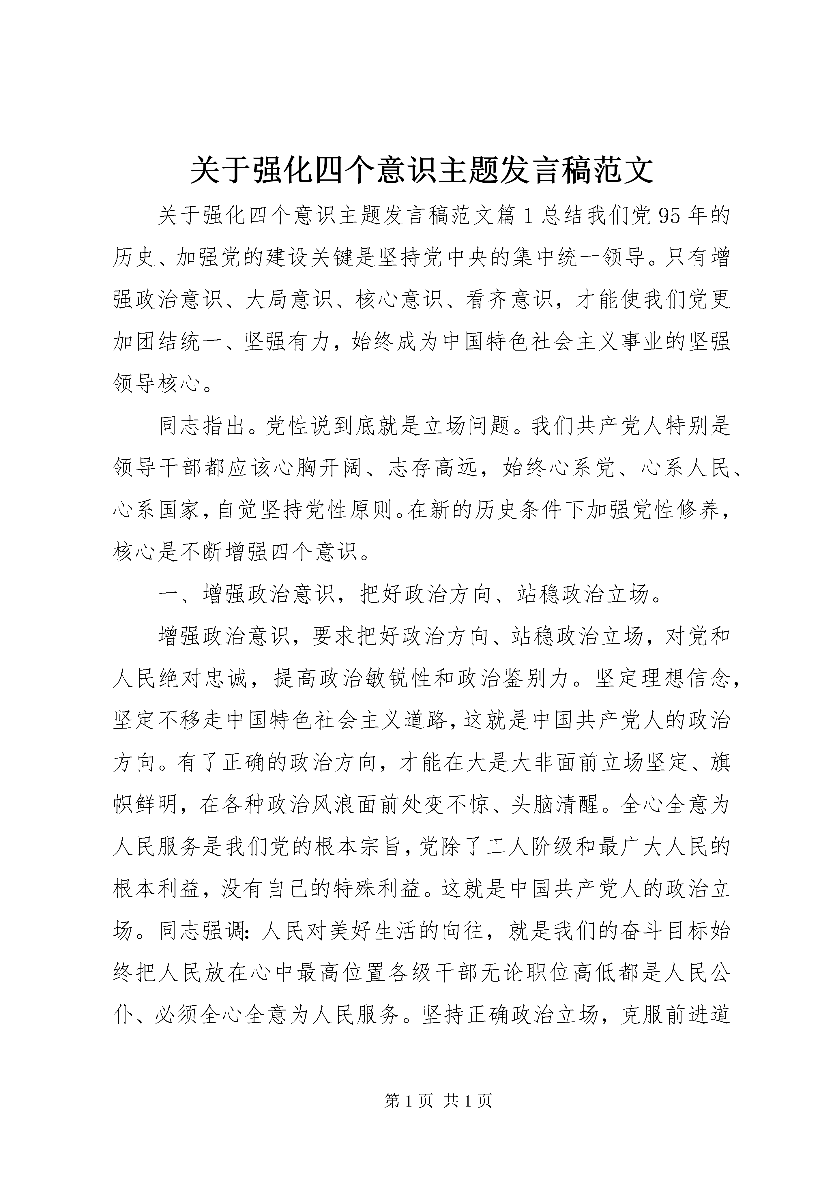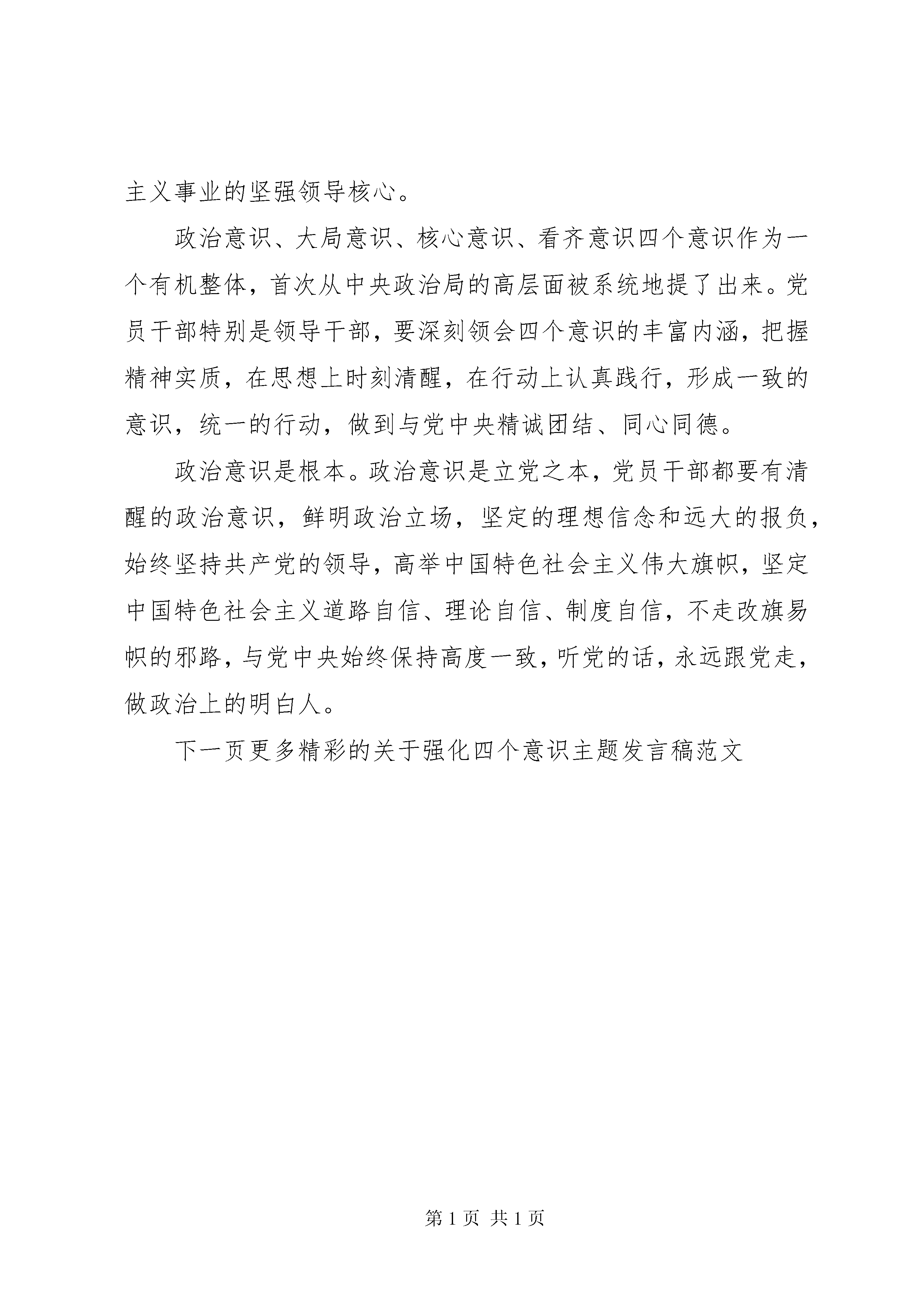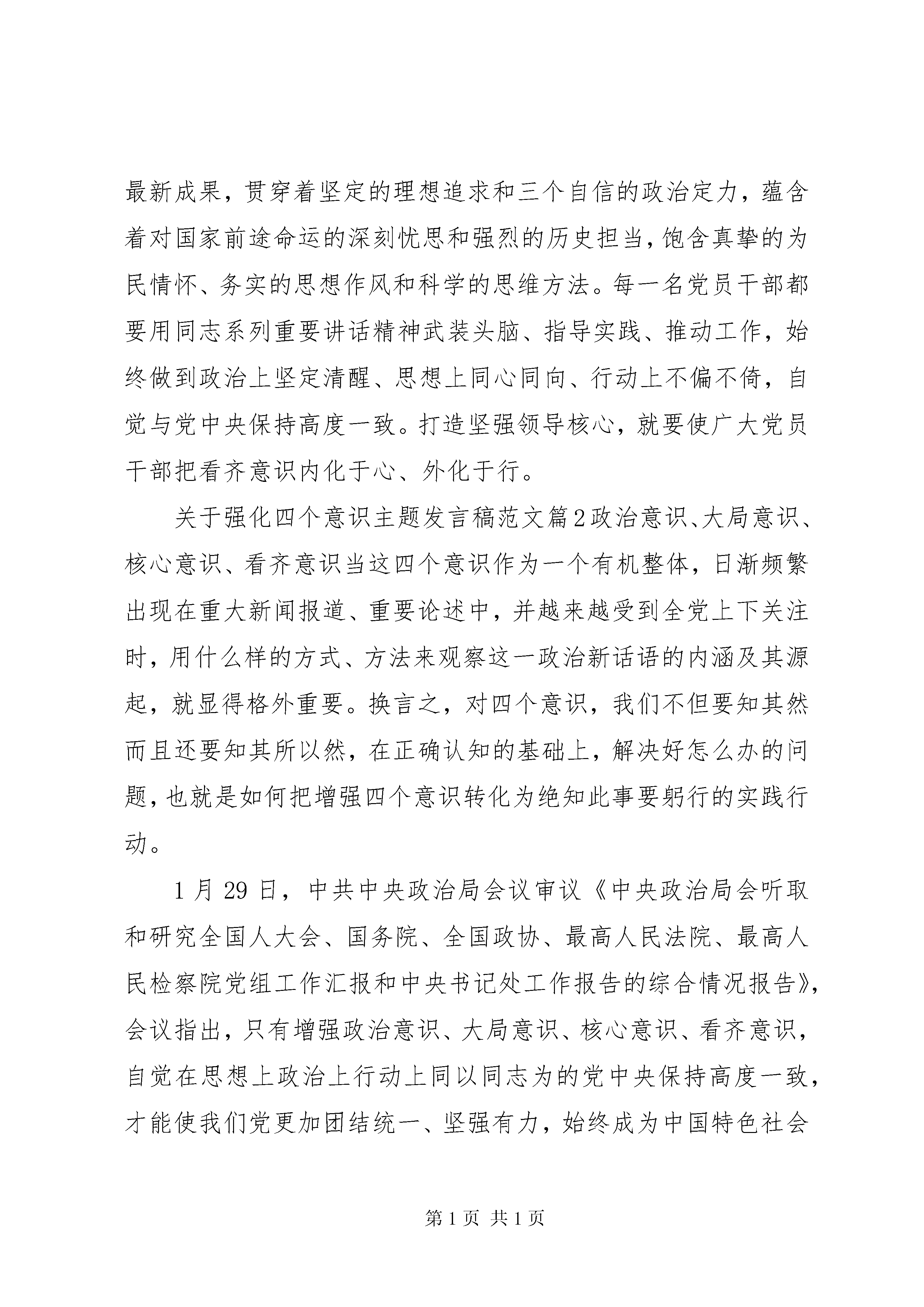 关于强化四个意识主题发言稿范文关于强化四个意识主题发言稿范文篇1总结我们党95年的历史、加强党的建设关键是坚持党中央的集中统一领导。只有增强政治意识、大局意识、核心意识、看齐意识,才能使我们党更加团结统一、坚强有力,始终成为中国特色社会主义事业的坚强领导核心。同志指出。党性说到底就是立场问题。我们共产党人特别是领导干部都应该心胸开阔、志存高远,始终心系党、心系人民、心系国家,自觉坚持党性原则。在新的历史条件下加强党性修养,核心是不断增强四个意识。一、增强政治意识,把好政治方向、站稳政治立场。增强政治意识,要求把好政治方向、站稳政治立场,对党和人民绝对忠诚,提高政治敏锐性和政治鉴别力。坚定理想信念,坚定不移走中国特色社会主义道路,这就是中国共产党人的政治方向。有了正确的政治方向,才能在大是大非面前立场坚定、旗帜鲜明,在各种政治风浪面前处变不惊、头脑清醒。全心全意为人民服务是我们党的根本宗旨,党除了工人阶级和最广大人民的根本利益,没有自己的特殊利益。这就是中国共产党人的政治立场。同志强调:人民对美好生活的向往,就是我们的奋斗目标始终把人民放在心中最高位置各级干部无论职位高低都是人民公仆、必须全心全意为人民服务。坚持正确政治立场,克服前进道路上的各种困难和风险就有了最大的底气。打造坚强领导核心,要求广大党员干部增强政治意识,做政治上的明白人,解决好从哪里来、向哪里去,忠于谁、代表谁、服务谁这个世界观、人生观、价值观的根本问题。二、增强大局意识,自觉贯彻落实党中央的决策部署。大局意识主要是指心中有全局,在大局下行动。党员干部必须自觉站在党和国家的全局想问题、办事情,自觉把本地区、本部门的工作放到全党、全国改革发展的大局中考量和谋划,不能片面强调本地区、本部门的利益,不能只顾眼前利益而不顾长远利益。要克服本位主义,坚决贯彻执行党的路线方针政策,做到政令畅通、令行禁止,全国一盘棋。坚定不移地推进各项改革,勇于突破利益固化的藩篱,为了全局利益和长远利益不惜牺牲局部利益和眼前利益,做改革的促进派和实干家。结合本地区本部门本单位的实际做好有利于大局的具体工作,是每一名党员干部的责任担当,也是党性强的表现。打造坚强领导核心,要求广大党员干部牢固树立大局意识,自觉从大局看问题,做到正确认识大局、自觉服从大局、坚决维护大局。三、增强核心意识,加强党的领导、维护党中央权威。近现代中国发生了两个影响中华民族历史命运的关键选择。历史和人民选择了中国共产党和社会主义;改革开放以来,中国共产党和中国人民选择了中国特色社会主义道路。这两个选择是中国人民意志和愿望的体现,是中华民族的根本利益所在。我国宪法以根本大法的形式明确了必须坚持党的领导,改革开放的实践证明了党的领导是中国特色社会主义最本质的特征。我们党是按照民主集中制组织起来的统一整体,党的最高领导机关是党的全国代表大会和它所产生的中央委员会。党中央团结凝聚各方面力量,协调好各方面意见,集中好各方面智慧,在充分发扬民主的基础上作出科学决策。打造坚强领导核心,就要增强党员干部的核心意识,坚持党的领导不动摇,维护党的集中统一不含糊。四、增强看齐意识,在思想上政治上行动上同党中央保持高度一致。我们党在革命、建设、改革的风雨历程中形成了一条基本经验:党的事业要发展,理论和路线方针政策正确是最重要的、第一位的;有了正确的理论和路线方针政策,还要团结统一、步调一致,这样才能赢得胜利。党员干部要经常、主动向党中央看齐,向党的理论和路线方针政策看齐。向党中央看齐,就是听从党中央的号令,步调一致。对中央的重大决策部署要结合实际不折不扣地贯彻执行,对中央明令禁止和反对的事情坚决不做,在任何时候任何情况下都做到政治方向不偏、政治立场不变、政治纪律和政治规矩不松。当前,向党的理论和路线方针政策看齐,最重要的是认真学习贯彻同志系列重要讲话精神。同志系列重要讲话蕴含一系列治国理政新理念新思想新战略,是马克思主义中国化最新成果,贯穿着坚定的理想追求和三个自信的政治定力,蕴含着对国家前途命运的深刻忧思和强烈的历史担当,饱含真挚的为民情怀、务实的思想作风和科学的思维方法。每一名党员干部都要用同志系列重要讲话精神武装头脑、指导实践、推动工作,始终做到政治上坚定清醒、思想上同心同向、行动上不偏不倚,自觉与党中央保持高度一致。打造坚强领导核心,就要使广大党员干部把看齐意识内化于心、外化于行。关于强化四个意识主题发言稿范文篇2政治意识、大局意识、核心意识、看齐意识当这四个意识作为一个有机整体,日渐频繁出现在重大新闻报道、重要论述中,并越来越受到全党上下关注时,用什么样的方式、方法来观察这一政治新话语的内涵及其源起,就显得格外重要。换言之,对四个意识,我们不但要知其然而且还要知其所以然,在正确认知的基础上,解决好怎么办的问题