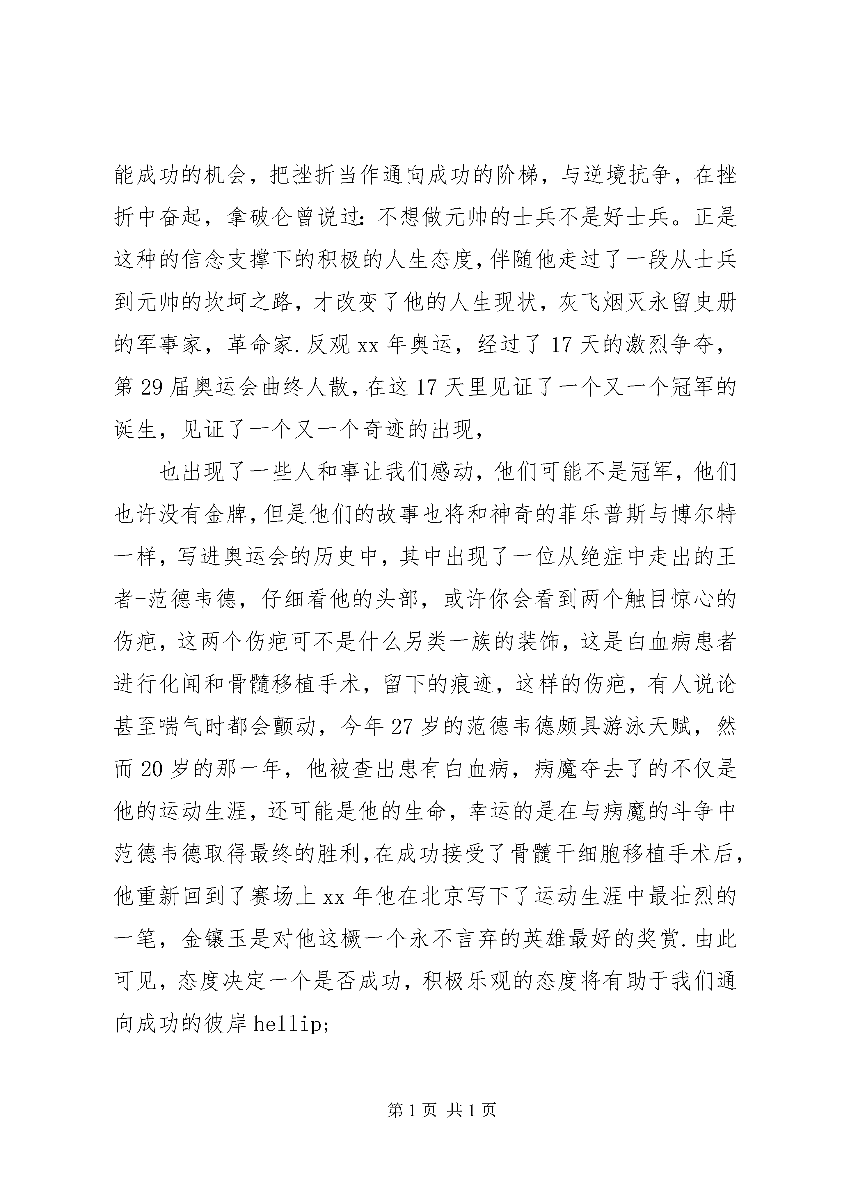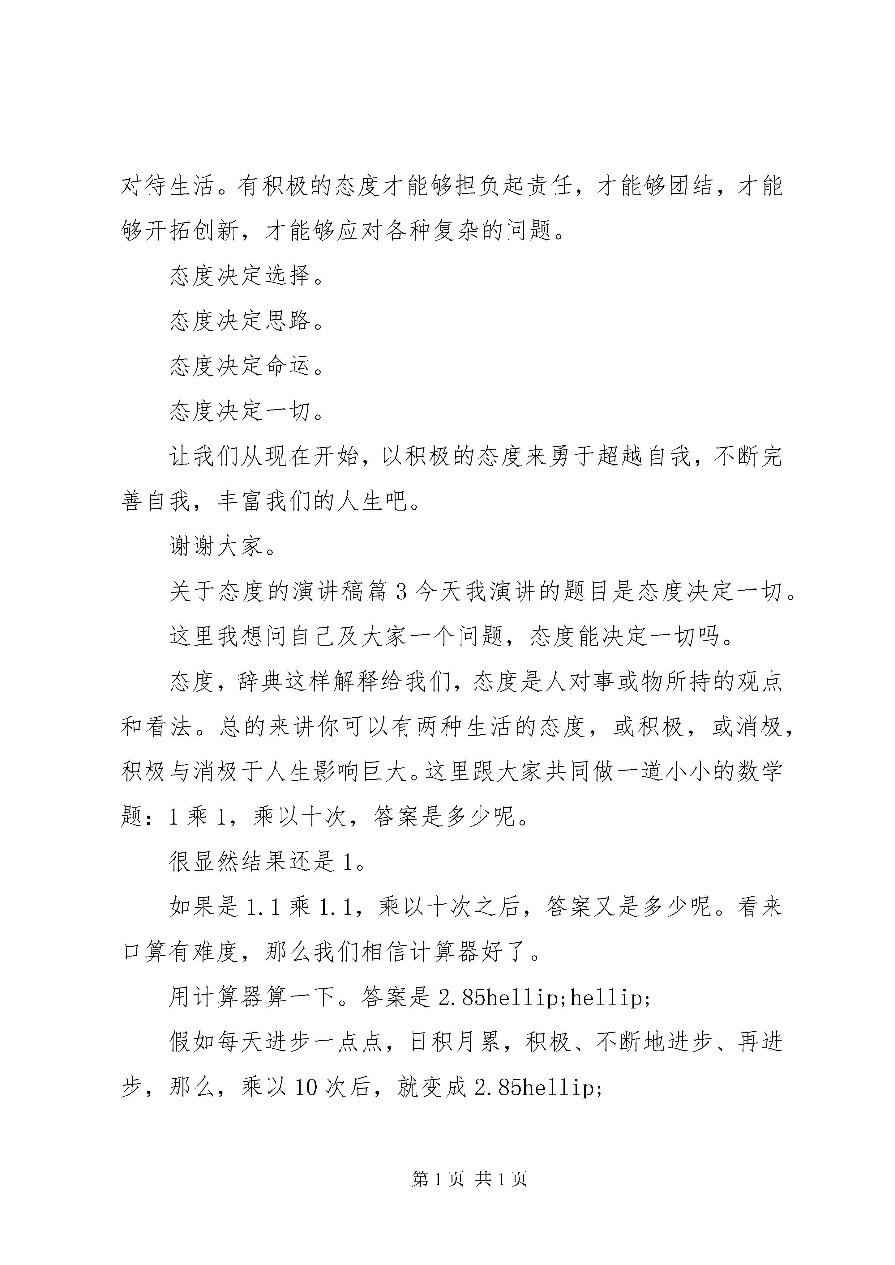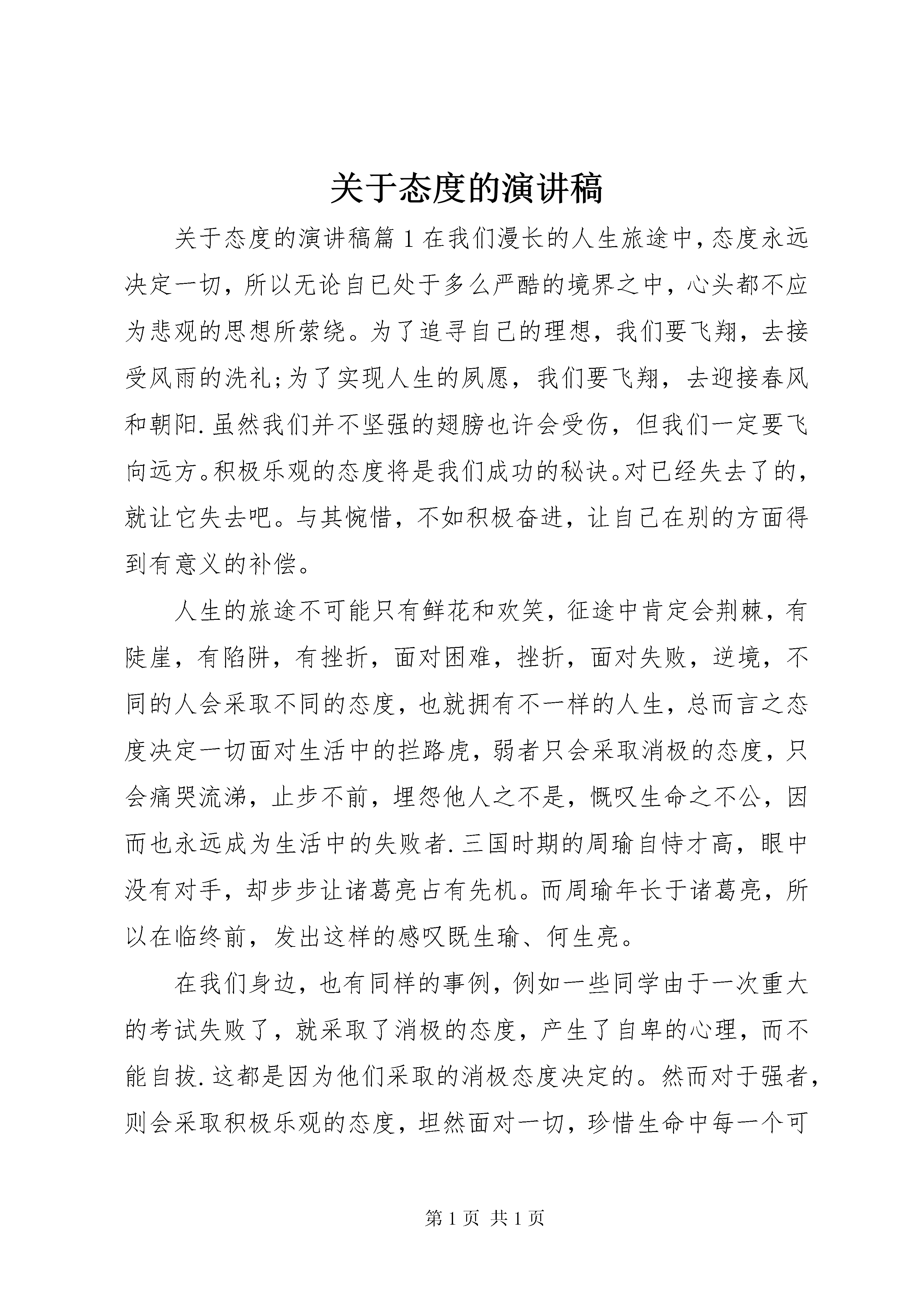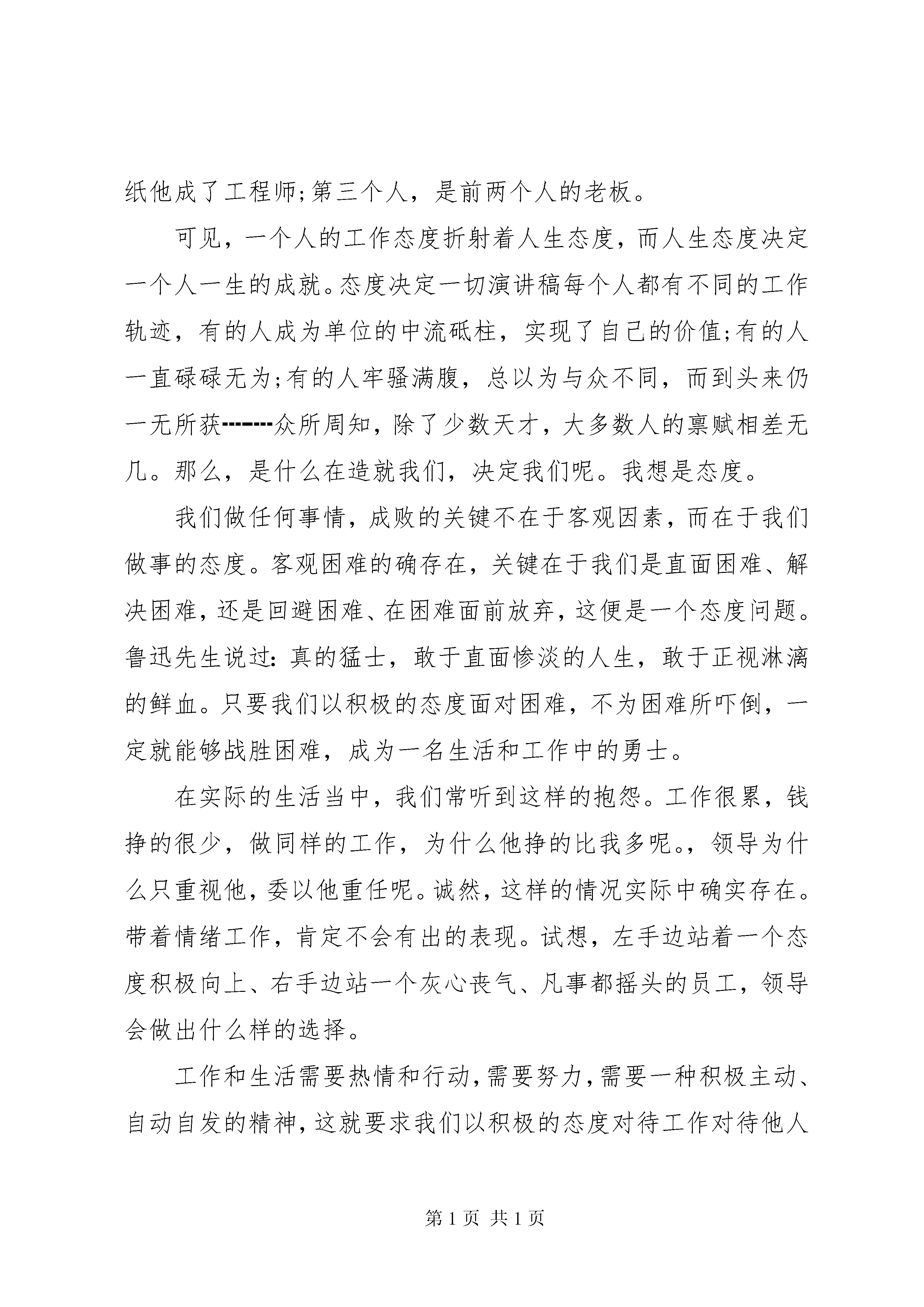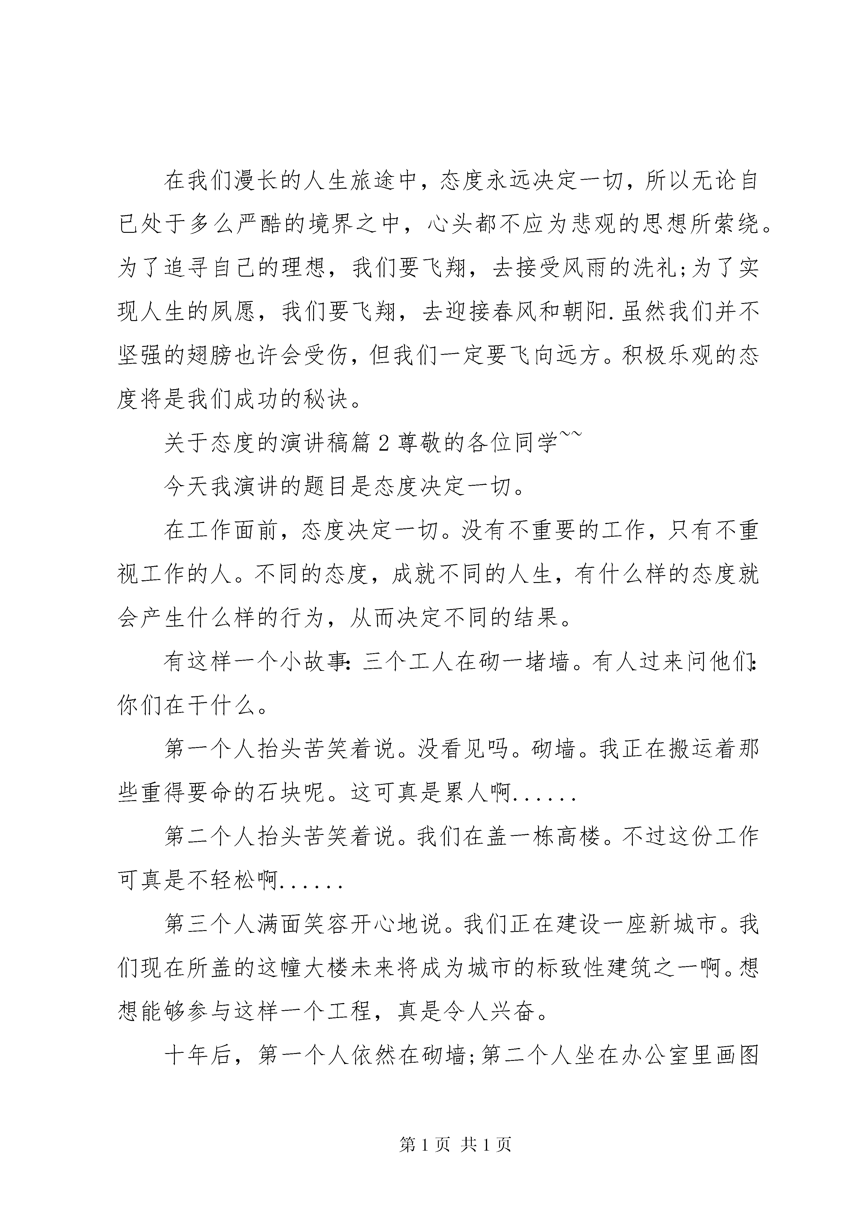 关于态度的演讲稿关于态度的演讲稿篇1在我们漫长的人生旅途中,态度永远决定一切,所以无论自已处于多么严酷的境界之中,心头都不应为悲观的思想所萦绕。为了追寻自己的理想,我们要飞翔,去接受风雨的洗礼;为了实现人生的夙愿,我们要飞翔,去迎接春风和朝阳.虽然我们并不坚强的翅膀也许会受伤,但我们一定要飞向远方。积极乐观的态度将是我们成功的秘诀。对已经失去了的,就让它失去吧。与其惋惜,不如积极奋进,让自己在别的方面得到有意义的补偿。人生的旅途不可能只有鲜花和欢笑,征途中肯定会荆棘,有陡崖,有陷阱,有挫折,面对困难,挫折,面对失败,逆境,不同的人会采取不同的态度,也就拥有不一样的人生,总而言之态度决定一切面对生活中的拦路虎,弱者只会采取消极的态度,只会痛哭流涕,止步不前,埋怨他人之不是,慨叹生命之不公,因而也永远成为生活中的失败者.三国时期的周瑜自恃才高,眼中没有对手,却步步让诸葛亮占有先机。而周瑜年长于诸葛亮,所以在临终前,发出这样的感叹既生瑜、何生亮。在我们身边,也有同样的事例,例如一些同学由于一次重大的考试失败了,就采取了消极的态度,产生了自卑的心理,而不能自拔.这都是因为他们采取的消极态度决定的。然而对于强者,则会采取积极乐观的态度,坦然面对一切,珍惜生命中每一个可能成功的机会,把挫折当作通向成功的阶梯,与逆境抗争,在挫折中奋起,拿破仑曾说过:不想做元帅的士兵不是好士兵。正是这种的信念支撑下的积极的人生态度,伴随他走过了一段从士兵到元帅的坎坷之路,才改变了他的人生现状,灰飞烟灭永留史册的军事家,革命家.反观xx年奥运,经过了17天的激烈争夺,第29届奥运会曲终人散,在这17天里见证了一个又一个冠军的诞生,见证了一个又一个奇迹的出现,也出现了一些人和事让我们感动,他们可能不是冠军,他们也许没有金牌,但是他们的故事也将和神奇的菲乐普斯与博尔特一样,写进奥运会的历史中,其中出现了一位从绝症中走出的王者-范德韦德,仔细看他的头部,或许你会看到两个触目惊心的伤疤,这两个伤疤可不是什么另类一族的装饰,这是白血病患者进行化闻和骨髓移植手术,留下的痕迹,这样的伤疤,有人说论甚至喘气时都会颤动,今年27岁的范德韦德颇具游泳天赋,然而20岁的那一年,他被查出患有白血病,病魔夺去了的不仅是他的运动生涯,还可能是他的生命,幸运的是在与病魔的斗争中范德韦德取得最终的胜利,在成功接受了骨髓干细胞移植手术后,他重新回到了赛场上xx年他在北京写下了运动生涯中最壮烈的一笔,金镶玉是对他这橛一个永不言弃的英雄最好的奖赏.由此可见,态度决定一个是否成功,积极乐观的态度将有助于我们通向成功的彼岸hellip;在我们漫长的人生旅途中,态度永远决定一切,所以无论自已处于多么严酷的境界之中,心头都不应为悲观的思想所萦绕。为了追寻自己的理想,我们要飞翔,去接受风雨的洗礼;为了实现人生的夙愿,我们要飞翔,去迎接春风和朝阳.虽然我们并不坚强的翅膀也许会受伤,但我们一定要飞向远方。积极乐观的态度将是我们成功的秘诀。关于态度的演讲稿篇2尊敬的各位同学~~今天我演讲的题目是态度决定一切。在工作面前,态度决定一切。没有不重要的工作,只有不重视工作的人。不同的态度,成就不同的人生,有什么样的态度就会产生什么样的行为,从而决定不同的结果。有这样一个小故事:三个工人在砌一堵墙。有人过来问他们:你们在干什么。第一个人抬头苦笑着说。没看见吗。砌墙。我正在搬运着那些重得要命的石块呢。这可真是累人啊......第二个人抬头苦笑着说。我们在盖一栋高楼。不过这份工作可真是不轻松啊......第三个人满面笑容开心地说。我们正在建设一座新城市。我们现在所盖的这幢大楼未来将成为城市的标致性建筑之一啊。想想能够参与这样一个工程,真是令人兴奋。十年后,第一个人依然在砌墙;第二个人坐在办公室里画图纸他成了工程师;第三个人,是前两个人的老板。可见,一个人的工作态度折射着人生态度,而人生态度决定一个人一生的成就。态度决定一切演讲稿每个人都有不同的工作轨迹,有的人成为单位的中流砥柱,实现了自己的价值;有的人一直碌碌无为;有的人牢骚满腹,总以为与众不同,而到头来仍一无所获┉┉众所周知,除了少数天才,大多数人的禀赋相差无几。那么,是什么在造就我们,决定我们呢。我想是态度。我们做任何事情,成败的关键不在于客观因素,而在于我们做事的态度。客观困难的确存在,关键在于我们是直面困难、解决困难,还是回避困难、在困难面前放弃,这便是一个态度问题。鲁迅先生说过:真的猛士,敢于直面惨淡的人生,敢于正视淋漓的鲜血。只要我们以积极的态度面对困难,不为困难所吓倒,一定就能够战胜困难,成为一名生活和工作中的勇士。在实际的生活当中,我们常听到这样的抱怨。工作很累,钱挣的很少,做同样的工作,为什么他挣的比我多呢。,领导为什么只重视他,