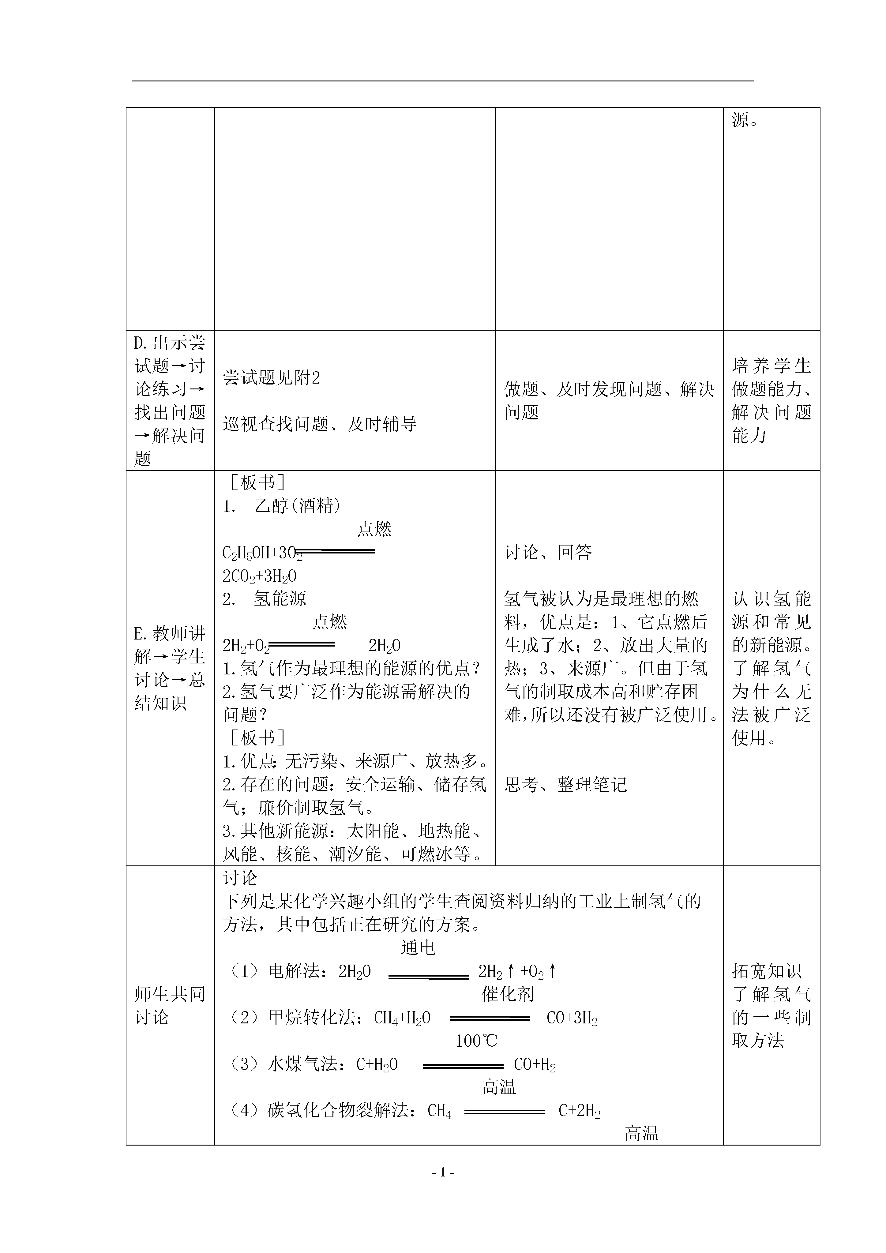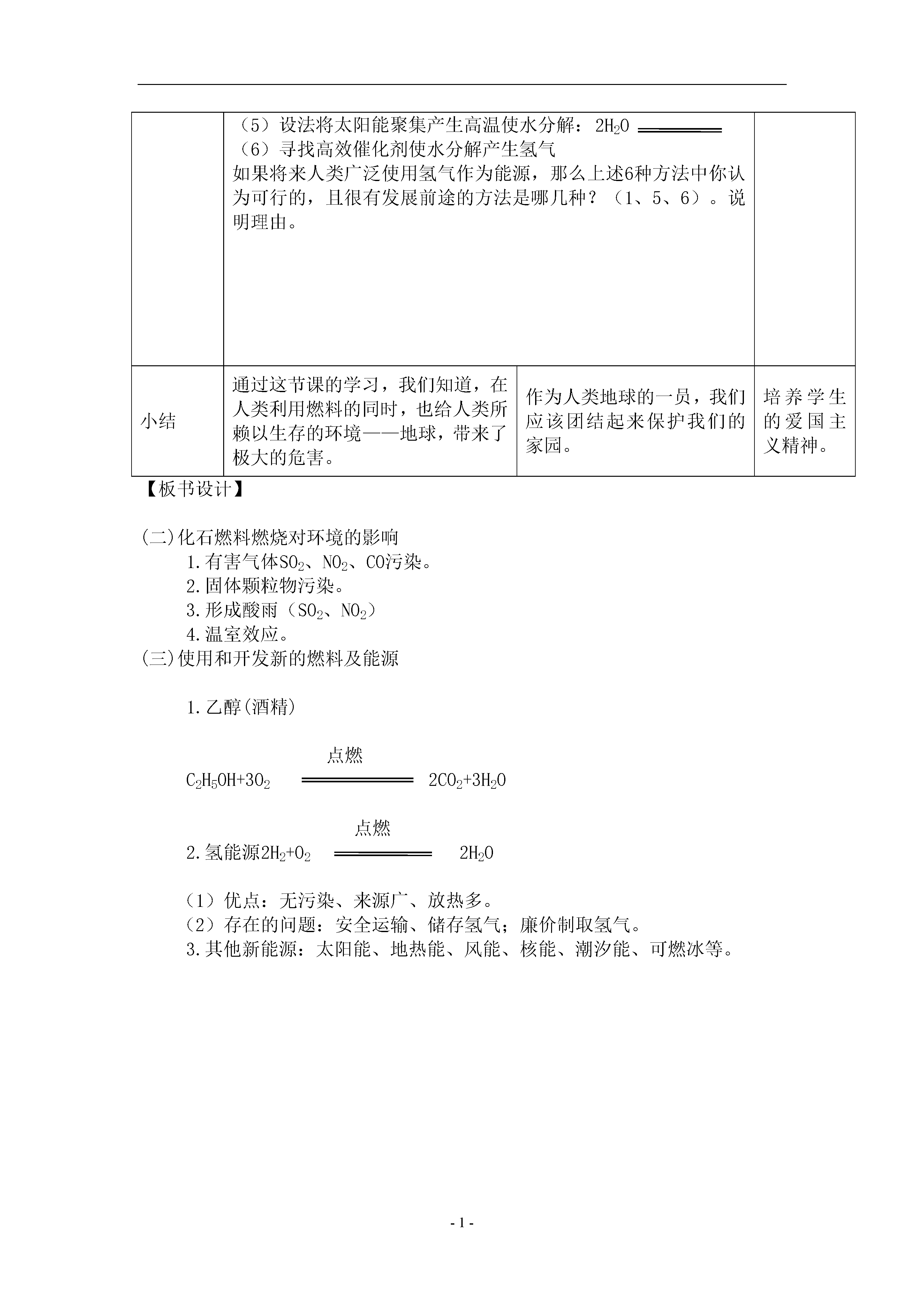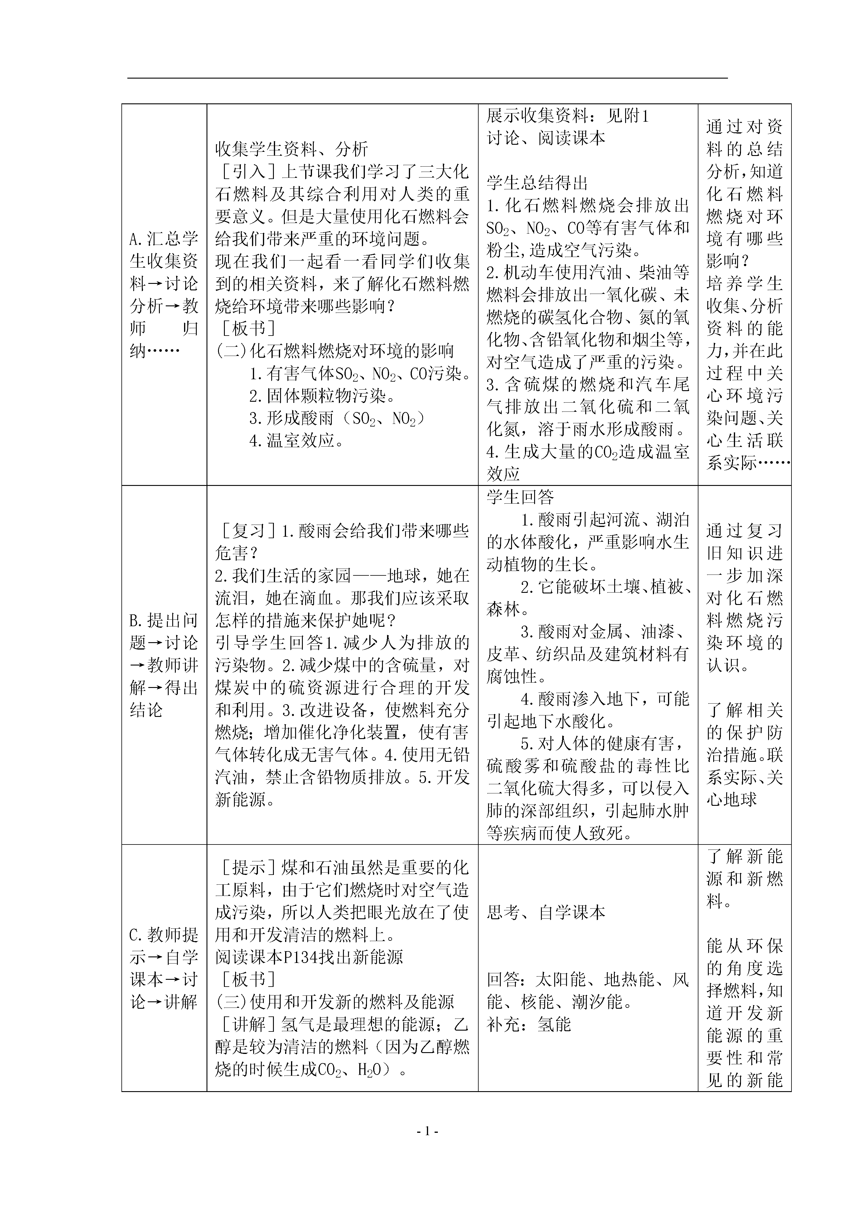 -1-单元3能源的开发和利用(2)【学习目标】1.知道化石燃料是人类重要的自然资源。2.知道煤、石油炼制出的几种主要产品及其用途。3.了解化石燃料的不可再生性,认识合理开采和节约使用化石燃料的重要性。4.认识化石燃料对人类所起的重要作用。5.掌握化石燃料燃烧对环境的影响。6.能从环保的角度选择燃料,知道开发新能源的重要性和常见的新能源。7.认识氢能源。【教学重点】1.化石燃料的形成过程和不可再生性。2.石油炼制的几种主要产品及用途。3.化石燃料燃烧对环境的影响。4.新能源。【教学难点】1.培养学生独立思考、加工信息的能力。2.煤和石油的综合利用。3.逐步培养学生对现有资料进行分析的能力【教学手段】利用多媒体给学生提供资料。【教学课时】2课时【教学用具】有关煤、石油、天然气的资料【教学流程】汇总资料→分析、讨论资料→教师讲解→提出问题→学生讨论→教师评析→第二次尝试练习→小结A、B达成目标5C达成目标6E达成目标7教学过程教学流程教师活动学生活动设计意图A.汇总学生收集资料→讨论分析→教师归纳……收集学生资料、分析[引入]上节课我们学习了三大化石燃料及其综合利用对人类的重要意义。但是大量使用化石燃料会给我们带来严重的环境问题。现在我们一起看一看同学们收集到的相关资料,来了解化石燃料燃烧给环境带来哪些影响?[板书](二)化石燃料燃烧对环境的影响1.有害气体SO2、NO2、CO污染。2.固体颗粒物污染。3.形成酸雨(SO2、NO2)4.温室效应。展示收集资料:见附1讨论、阅读课本学生总结得出1.化石燃料燃烧会排放出SO2、NO2、CO等有害气体和粉尘,造成空气污染。2.机动车使用汽油、柴油等燃料会排放出一氧化碳、未燃烧的碳氢化合物、氮的氧化物、含铅氧化物和烟尘等,对空气造成了严重的污染。3.含硫煤的燃烧和汽车尾气排放出二氧化硫和二氧化氮,溶于雨水形成酸雨。4.生成大量的CO2造成温室效应通过对资料的总结分析,知道化石燃料燃烧对环境有哪些影响?培养学生收集、分析资料的能力,并在此过程中关心环境污染问题、关心生活联系实际……B.提出问题→讨论→教师讲解→得出结论[复习]1.酸雨会给我们带来哪些危害?2.我们生活的家园——地球,她在流泪,她在滴血。那我们应该采取怎样的措施来保护她呢?引导学生回答1.减少人为排放的污染物。2.减少煤中的含硫量,对煤炭中的硫资源进行合理的开发和利用。3.改进设备,使燃料充分燃烧;增加催化净化装置,使有害气体转化成无害气体。4.使用无铅汽油,禁止含铅物质排放。5.开发新能源。学生回答1.酸雨引起河流、湖泊的水体酸化,严重影响水生动植物的生长。2.它能破坏土壤、植被、森林。3.酸雨对金属、油漆、皮革、纺织品及建筑材料有腐蚀性。4.酸雨渗入地下,可能引起地下水酸化。5.对人体的健康有害,硫酸雾和硫酸盐的毒性比二氧化硫大得多,可以侵入肺的深部组织,引起肺水肿等疾病而使人致死。通过复习旧知识进一步加深对化石燃料燃烧污染环境的认识。了解相关的保护防治措施。联系实际、关心地球C.教师提示→自学课本→讨论→讲解[提示]煤和石油虽然是重要的化工原料,由于它们燃烧时对空气造成污染,所以人类把眼光放在了使用和开发清洁的燃料上。阅读课本P134找出新能源[板书](三)使用和开发新的燃料及能源[讲解]氢气是最理想的能源;乙醇是较为清洁的燃料(因为乙醇燃烧的时候生成CO2、H2O)。思考、自学课本回答:太阳能、地热能、风能、核能、潮汐能。补充:氢能了解新能源和新燃料。能从环保的角度选择燃料,知道开发新能源的重要性和常见的新能源。D.出示尝试题→讨论练习→找出问题→解决问题尝试题见附2巡视查找问题、及时辅导做题、及时发现问题、解决问题培养学生做题能力、解决问题能力E.教师讲解→学生讨论→总结知识[板书]乙醇(酒精)点燃C2H5OH+3O22CO2+3H2O氢能源点燃2H2+O22H2O1.氢气作为最理想的能源的优点?2.氢气要广泛作为能源需解决的问题?[板书]1.优点:无污染、来源广、放热多。2.存在的问题:安全运输、储存氢气;廉价制取氢气。3.其他新能源:太阳能、地热能、风能、核能、潮汐能、可燃冰等。讨论、回答氢气被认为是最理想的燃料,优点是:1、它点燃后生成了水;2、放出大量的热;3、来源广。但由于氢气的制取成本高和贮存困难,所以还没有被广泛使用。思考、整理笔记认识氢能源和常见的新能源。了解氢气为什么无法被广泛使用。师生共同讨论讨论下列是某化学兴趣小组的学生查阅资料归纳的工业上制氢气的方法,其中包括正在研究的方案。通电(1)电解法:2H2O2H2↑+O