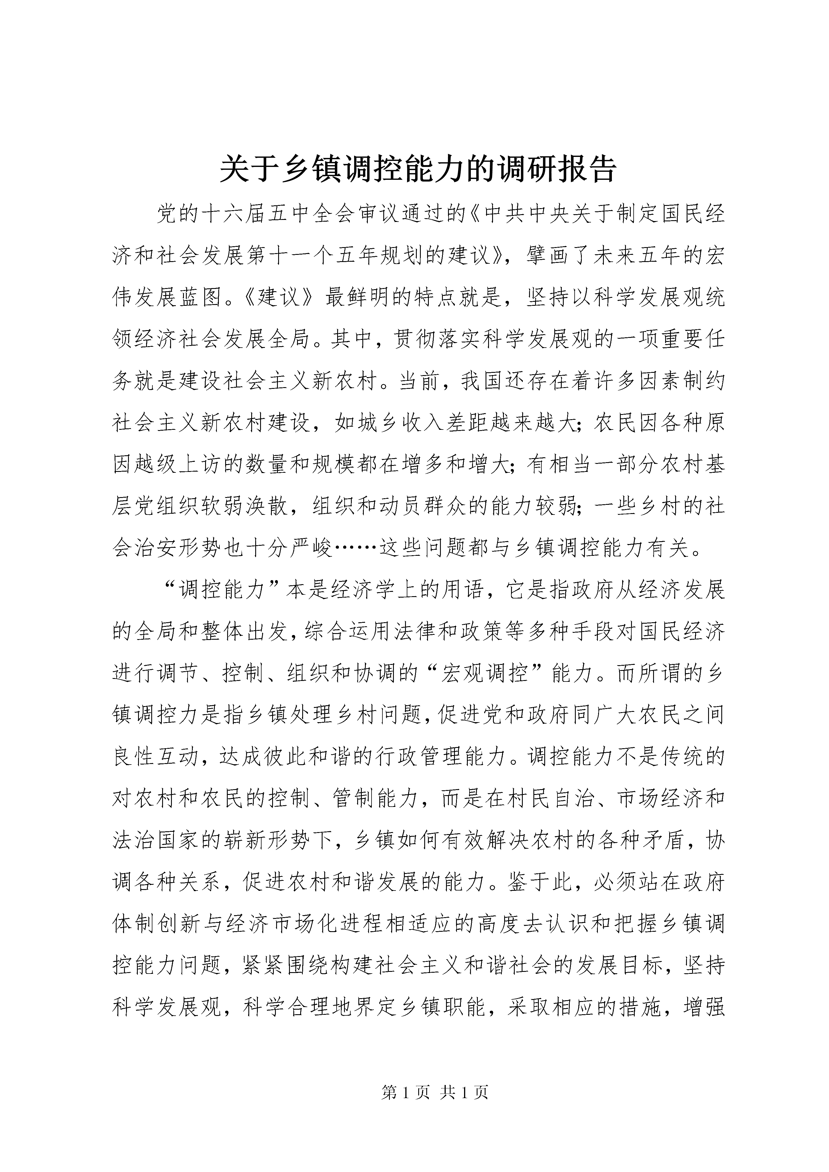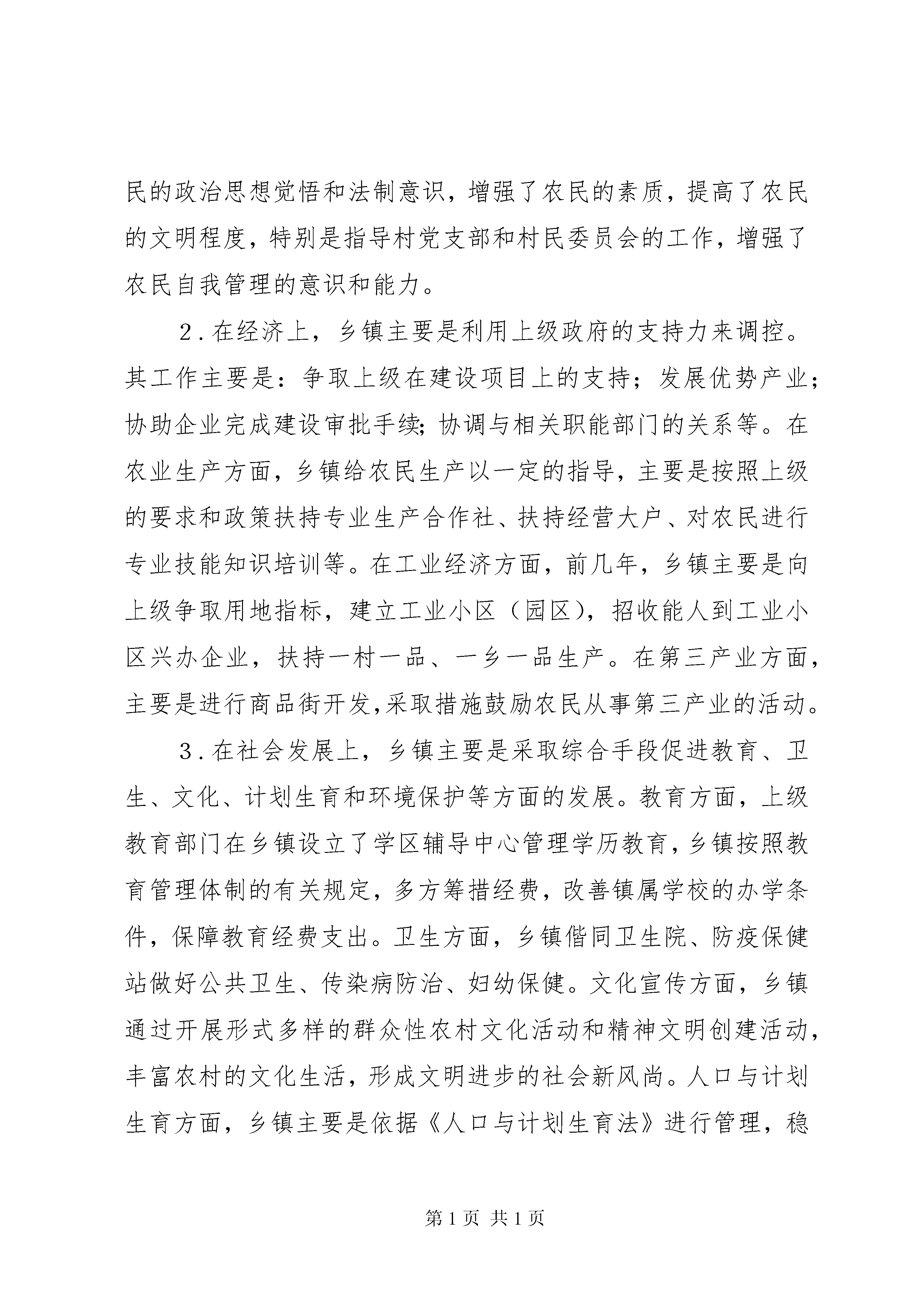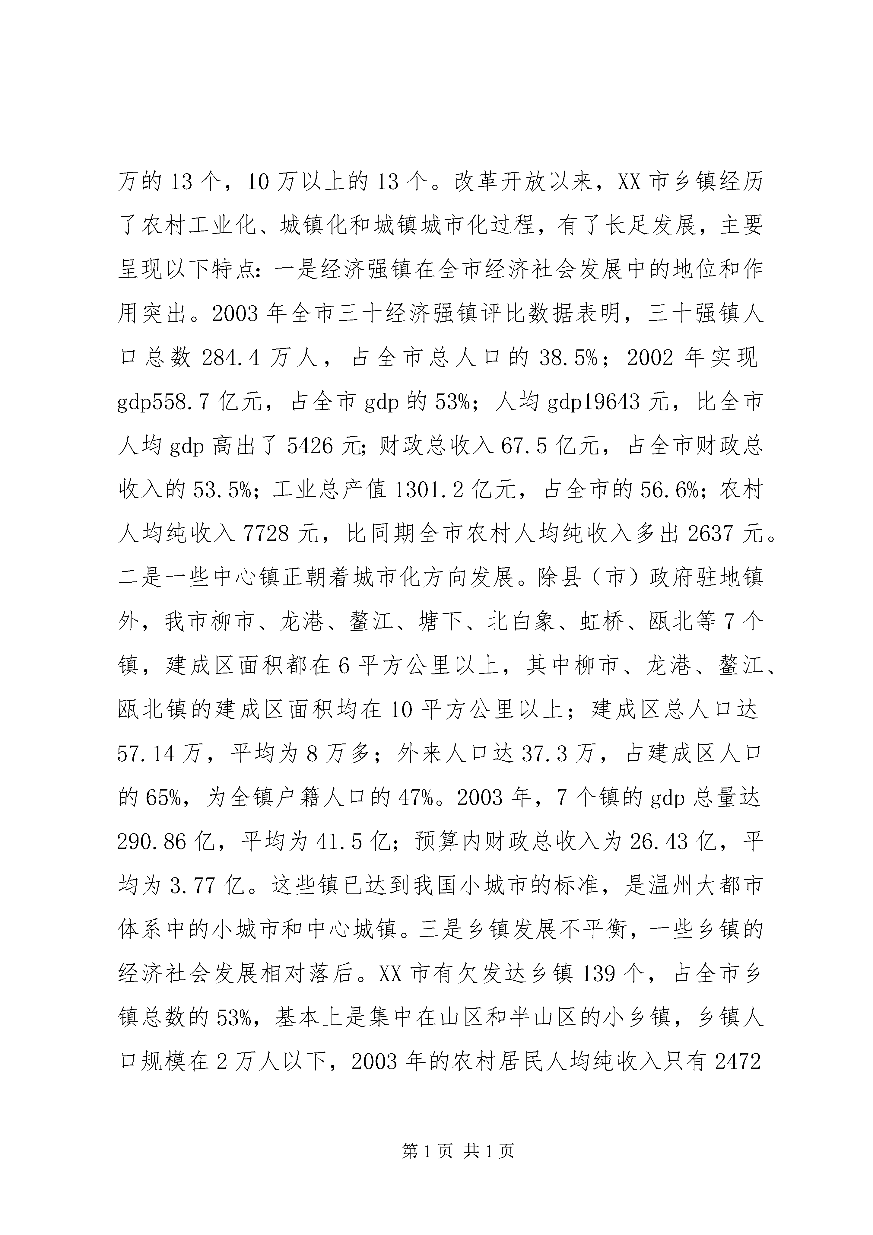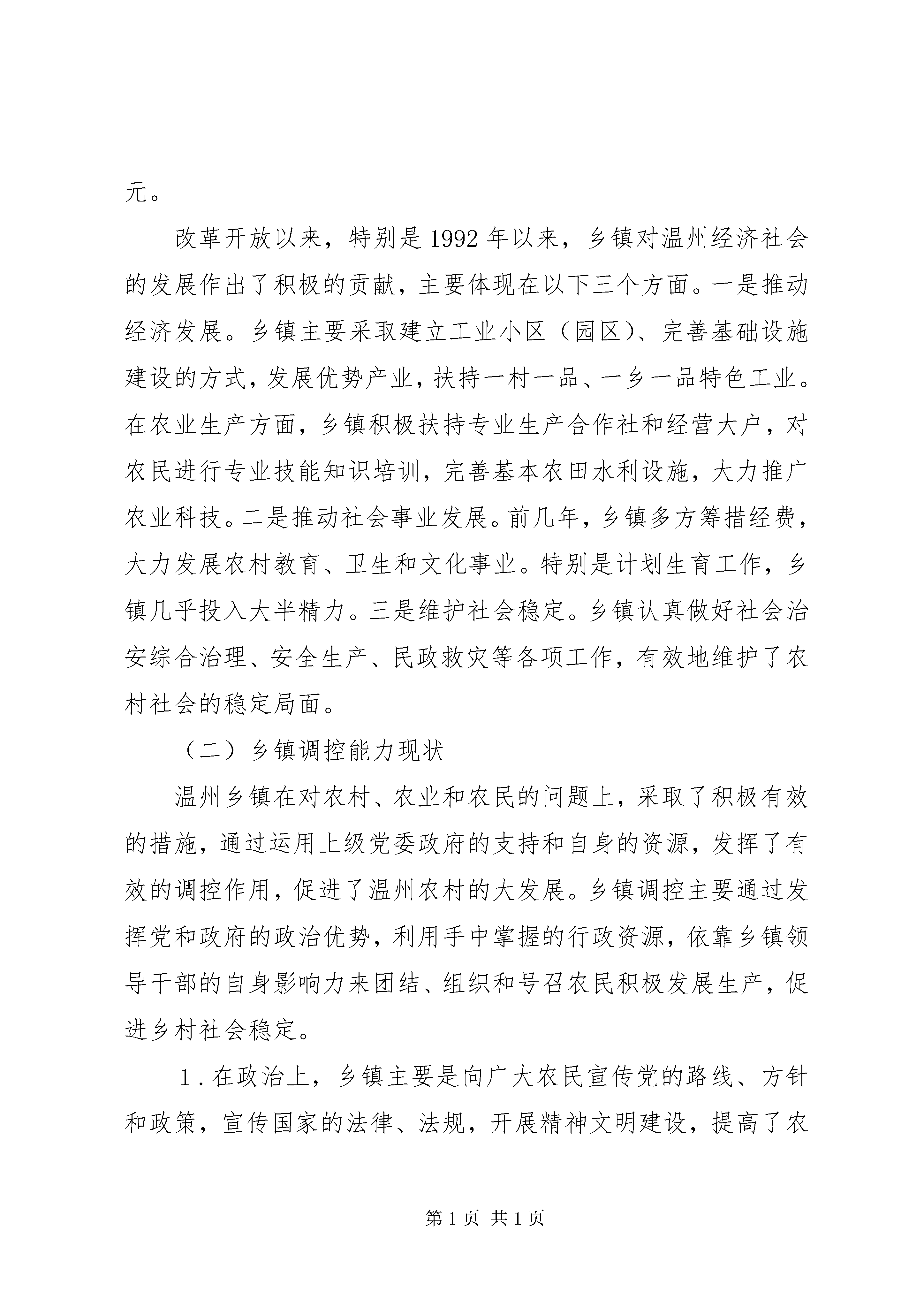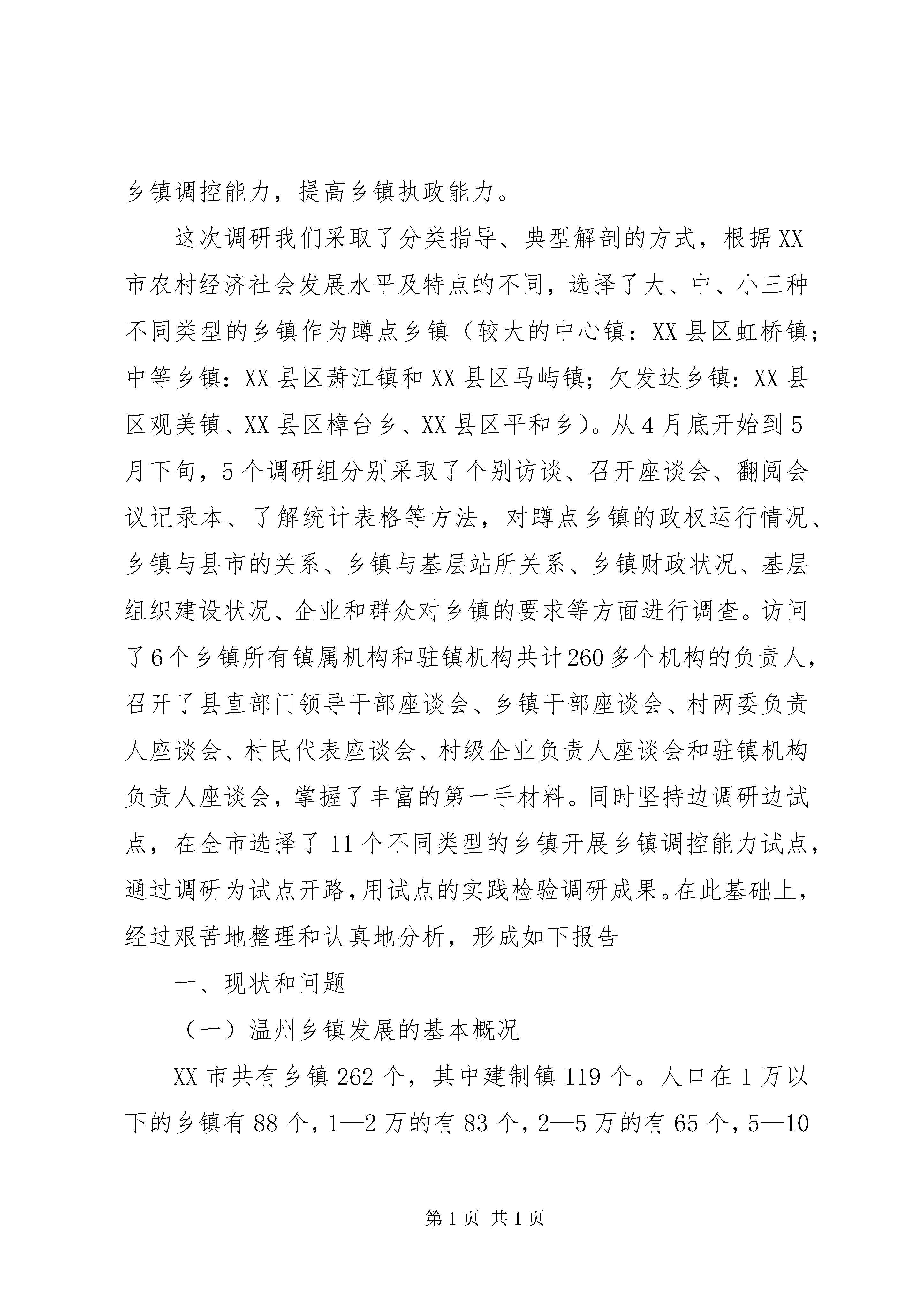 关于乡镇调控能力的调研报告党的十六届五中全会审议通过的《中共中央关于制定国民经济和社会发展第十一个五年规划的建议》,擘画了未来五年的宏伟发展蓝图。《建议》最鲜明的特点就是,坚持以科学发展观统领经济社会发展全局。其中,贯彻落实科学发展观的一项重要任务就是建设社会主义新农村。当前,我国还存在着许多因素制约社会主义新农村建设,如城乡收入差距越来越大;农民因各种原因越级上访的数量和规模都在增多和增大;有相当一部分农村基层党组织软弱涣散,组织和动员群众的能力较弱;一些乡村的社会治安形势也十分严峻……这些问题都与乡镇调控能力有关。“调控能力”本是经济学上的用语,它是指政府从经济发展的全局和整体出发,综合运用法律和政策等多种手段对国民经济进行调节、控制、组织和协调的“宏观调控”能力。而所谓的乡镇调控力是指乡镇处理乡村问题,促进党和政府同广大农民之间良性互动,达成彼此和谐的行政管理能力。调控能力不是传统的对农村和农民的控制、管制能力,而是在村民自治、市场经济和法治国家的崭新形势下,乡镇如何有效解决农村的各种矛盾,协调各种关系,促进农村和谐发展的能力。鉴于此,必须站在政府体制创新与经济市场化进程相适应的高度去认识和把握乡镇调控能力问题,紧紧围绕构建社会主义和谐社会的发展目标,坚持科学发展观,科学合理地界定乡镇职能,采取相应的措施,增强乡镇调控能力,提高乡镇执政能力。这次调研我们采取了分类指导、典型解剖的方式,根据XX市农村经济社会发展水平及特点的不同,选择了大、中、小三种不同类型的乡镇作为蹲点乡镇(较大的中心镇:XX县区虹桥镇;中等乡镇:XX县区萧江镇和XX县区马屿镇;欠发达乡镇:XX县区观美镇、XX县区樟台乡、XX县区平和乡)。从4月底开始到5月下旬,5个调研组分别采取了个别访谈、召开座谈会、翻阅会议记录本、了解统计表格等方法,对蹲点乡镇的政权运行情况、乡镇与县市的关系、乡镇与基层站所关系、乡镇财政状况、基层组织建设状况、企业和群众对乡镇的要求等方面进行调查。访问了6个乡镇所有镇属机构和驻镇机构共计260多个机构的负责人,召开了县直部门领导干部座谈会、乡镇干部座谈会、村两委负责人座谈会、村民代表座谈会、村级企业负责人座谈会和驻镇机构负责人座谈会,掌握了丰富的第一手材料。同时坚持边调研边试点,在全市选择了11个不同类型的乡镇开展乡镇调控能力试点,通过调研为试点开路,用试点的实践检验调研成果。在此基础上,经过艰苦地整理和认真地分析,形成如下报告一、现状和问题(一)温州乡镇发展的基本概况XX市共有乡镇262个,其中建制镇119个。人口在1万以下的乡镇有88个,1—2万的有83个,2—5万的有65个,5—10万的13个,10万以上的13个。改革开放以来,XX市乡镇经历了农村工业化、城镇化和城镇城市化过程,有了长足发展,主要呈现以下特点:一是经济强镇在全市经济社会发展中的地位和作用突出。2003年全市三十经济强镇评比数据表明,三十强镇人口总数284.4万人,占全市总人口的38.5%;2002年实现gdp558.7亿元,占全市gdp的53%;人均gdp19643元,比全市人均gdp高出了5426元;财政总收入67.5亿元,占全市财政总收入的53.5%;工业总产值1301.2亿元,占全市的56.6%;农村人均纯收入7728元,比同期全市农村人均纯收入多出2637元。二是一些中心镇正朝着城市化方向发展。除县(市)政府驻地镇外,我市柳市、龙港、鳌江、塘下、北白象、虹桥、瓯北等7个镇,建成区面积都在6平方公里以上,其中柳市、龙港、鳌江、瓯北镇的建成区面积均在10平方公里以上;建成区总人口达57.14万,平均为8万多;外来人口达37.3万,占建成区人口的65%,为全镇户籍人口的47%。2003年,7个镇的gdp总量达290.86亿,平均为41.5亿;预算内财政总收入为26.43亿,平均为3.77亿。这些镇已达到我国小城市的标准,是温州大都市体系中的小城市和中心城镇。三是乡镇发展不平衡,一些乡镇的经济社会发展相对落后。XX市有欠发达乡镇139个,占全市乡镇总数的53%,基本上是集中在山区和半山区的小乡镇,乡镇人口规模在2万人以下,2003年的农村居民人均纯收入只有2472元。改革开放以来,特别是1992年以来,乡镇对温州经济社会的发展作出了积极的贡献,主要体现在以下三个方面。一是推动经济发展。乡镇主要采取建立工业小区(园区)、完善基础设施建设的方式,发展优势产业,扶持一村一品、一乡一品特色工业。在农业生产方面,乡镇积极扶持专业生产合作社和经营大户,对农民进行专业技能知识培训,完善基本农田水利设施,大力推广农业科技。二是推动社会事业发展。前几年,乡镇多方筹措经费,大力发展农村教育、卫生和文化事业。特别是计划生育工作,乡镇几乎投入大半精力。三是