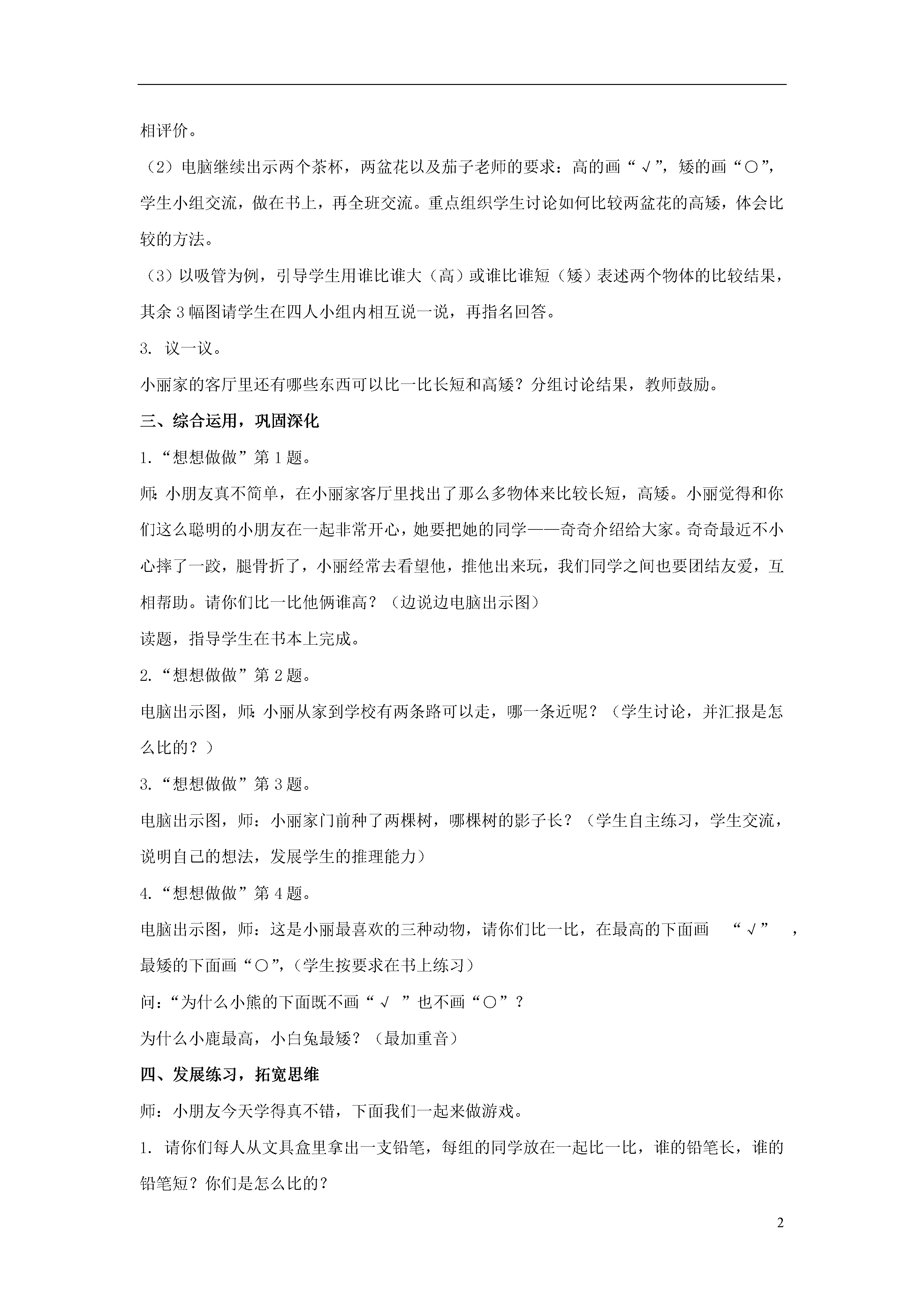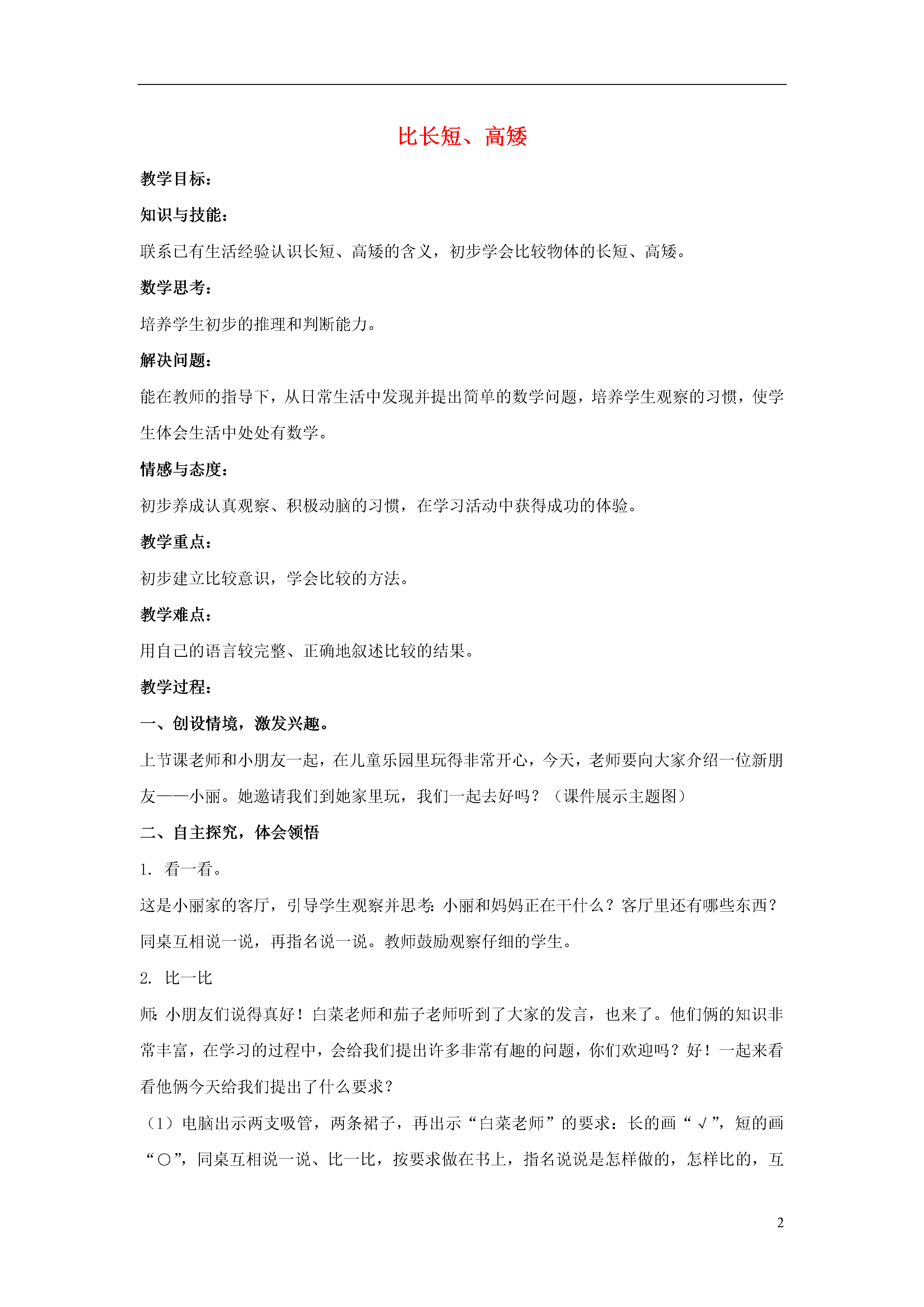 2比长短、高矮教学目标:知识与技能:联系已有生活经验认识长短、高矮的含义,初步学会比较物体的长短、高矮。数学思考:培养学生初步的推理和判断能力。解决问题:能在教师的指导下,从日常生活中发现并提出简单的数学问题,培养学生观察的习惯,使学生体会生活中处处有数学。情感与态度:初步养成认真观察、积极动脑的习惯,在学习活动中获得成功的体验。教学重点:初步建立比较意识,学会比较的方法。教学难点:用自己的语言较完整、正确地叙述比较的结果。教学过程:一、创设情境,激发兴趣。上节课老师和小朋友一起,在儿童乐园里玩得非常开心,今天,老师要向大家介绍一位新朋友——小丽。她邀请我们到她家里玩,我们一起去好吗?(课件展示主题图)二、自主探究,体会领悟1.看一看。这是小丽家的客厅,引导学生观察并思考:小丽和妈妈正在干什么?客厅里还有哪些东西?同桌互相说一说,再指名说一说。教师鼓励观察仔细的学生。2.比一比师:小朋友们说得真好!白菜老师和茄子老师听到了大家的发言,也来了。他们俩的知识非常丰富,在学习的过程中,会给我们提出许多非常有趣的问题,你们欢迎吗?好!一起来看看他俩今天给我们提出了什么要求?(1)电脑出示两支吸管,两条裙子,再出示“白菜老师”的要求:长的画“√”,短的画“○”,同桌互相说一说、比一比,按要求做在书上,指名说说是怎样做的,怎样比的,互相评价。(2)电脑继续出示两个茶杯,两盆花以及茄子老师的要求:高的画“√”,矮的画“○”,学生小组交流,做在书上,再全班交流。重点组织学生讨论如何比较两盆花的高矮,体会比较的方法。(3)以吸管为例,引导学生用谁比谁大(高)或谁比谁短(矮)表述两个物体的比较结果,其余3幅图请学生在四人小组内相互说一说,再指名回答。3.议一议。小丽家的客厅里还有哪些东西可以比一比长短和高矮?分组讨论结果,教师鼓励。三、综合运用,巩固深化1.“想想做做”第1题。师:小朋友真不简单,在小丽家客厅里找出了那么多物体来比较长短,高矮。小丽觉得和你们这么聪明的小朋友在一起非常开心,她要把她的同学——奇奇介绍给大家。奇奇最近不小心摔了一跤,腿骨折了,小丽经常去看望他,推他出来玩,我们同学之间也要团结友爱,互相帮助。请你们比一比他俩谁高?(边说边电脑出示图)读题,指导学生在书本上完成。2.“想想做做”第2题。电脑出示图,师:小丽从家到学校有两条路可以走,哪一条近呢?(学生讨论,并汇报是怎么比的?)3.“想想做做”第3题。电脑出示图,师:小丽家门前种了两棵树,哪棵树的影子长?(学生自主练习,学生交流,说明自己的想法,发展学生的推理能力)4.“想想做做”第4题。电脑出示图,师:这是小丽最喜欢的三种动物,请你们比一比,在最高的下面画“√”,最矮的下面画“○”,(学生按要求在书上练习)问:“为什么小熊的下面既不画“√”也不画“○”?为什么小鹿最高,小白兔最矮?(最加重音)四、发展练习,拓宽思维师:小朋友今天学得真不错,下面我们一起来做游戏。1.请你们每人从文具盒里拿出一支铅笔,每组的同学放在一起比一比,谁的铅笔长,谁的铅笔短?你们是怎么比的?现在请每组把最长的那支铅笔放进文具盒里,把剩下的铅笔再比一比,哪支最长也把它放进文具盒……最后把最短的放进文具盒。2.全体起立,请每组同学在课桌边排成一队,要求从矮到高排,最矮的站在最前面,最高的站在最后面。跟老师一起来跳舞。(放音乐跳舞)3.最后让小朋友自由组合比长短,高矮,想比什么就比什么,使他们感受到生活中处处有数学。五、课堂小结,课外延伸1.提问:今天这节课中,你做了些什么?2.学生自由交流。3.要求学生回家在自己家里找一找,比一比长短、高矮。