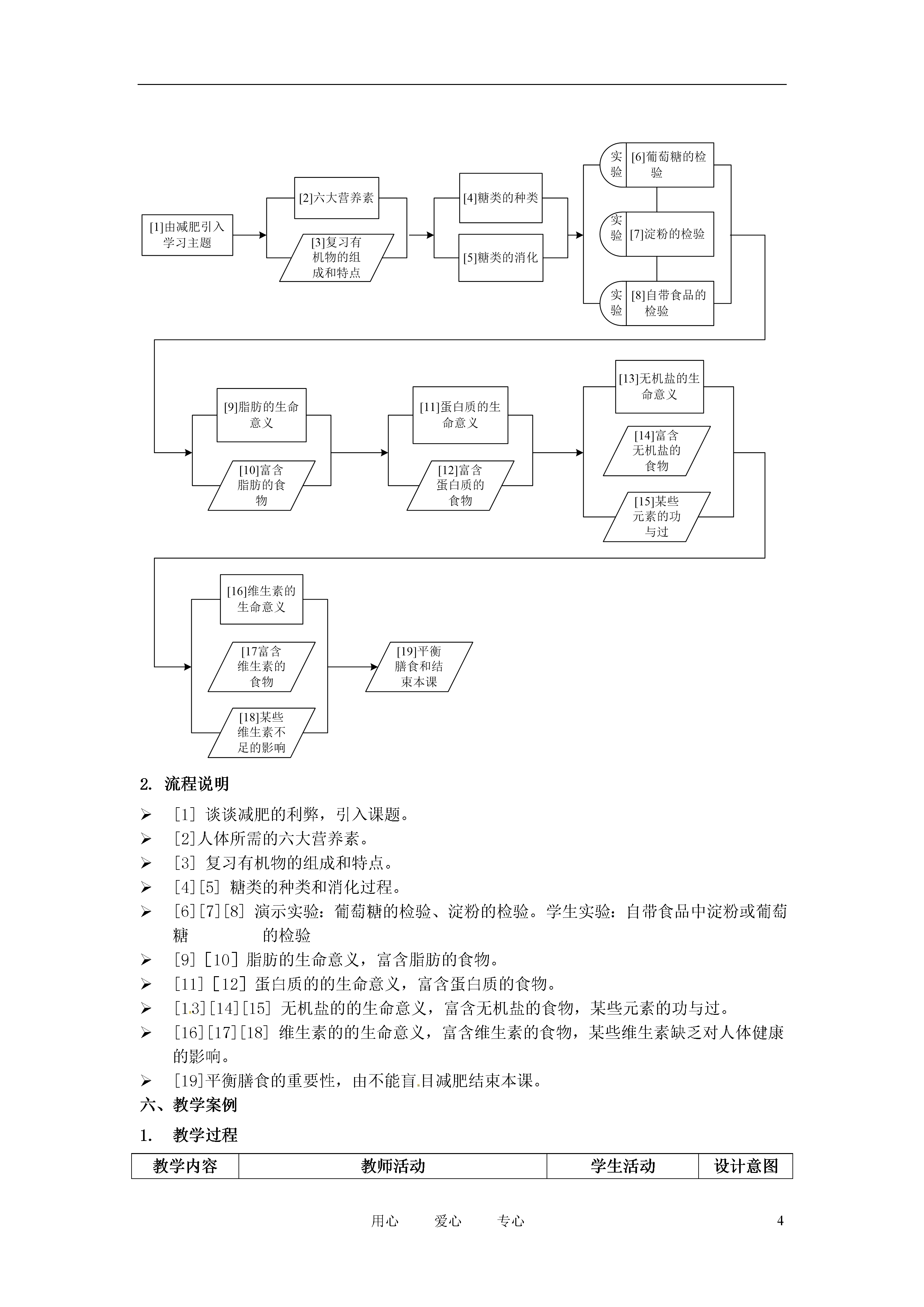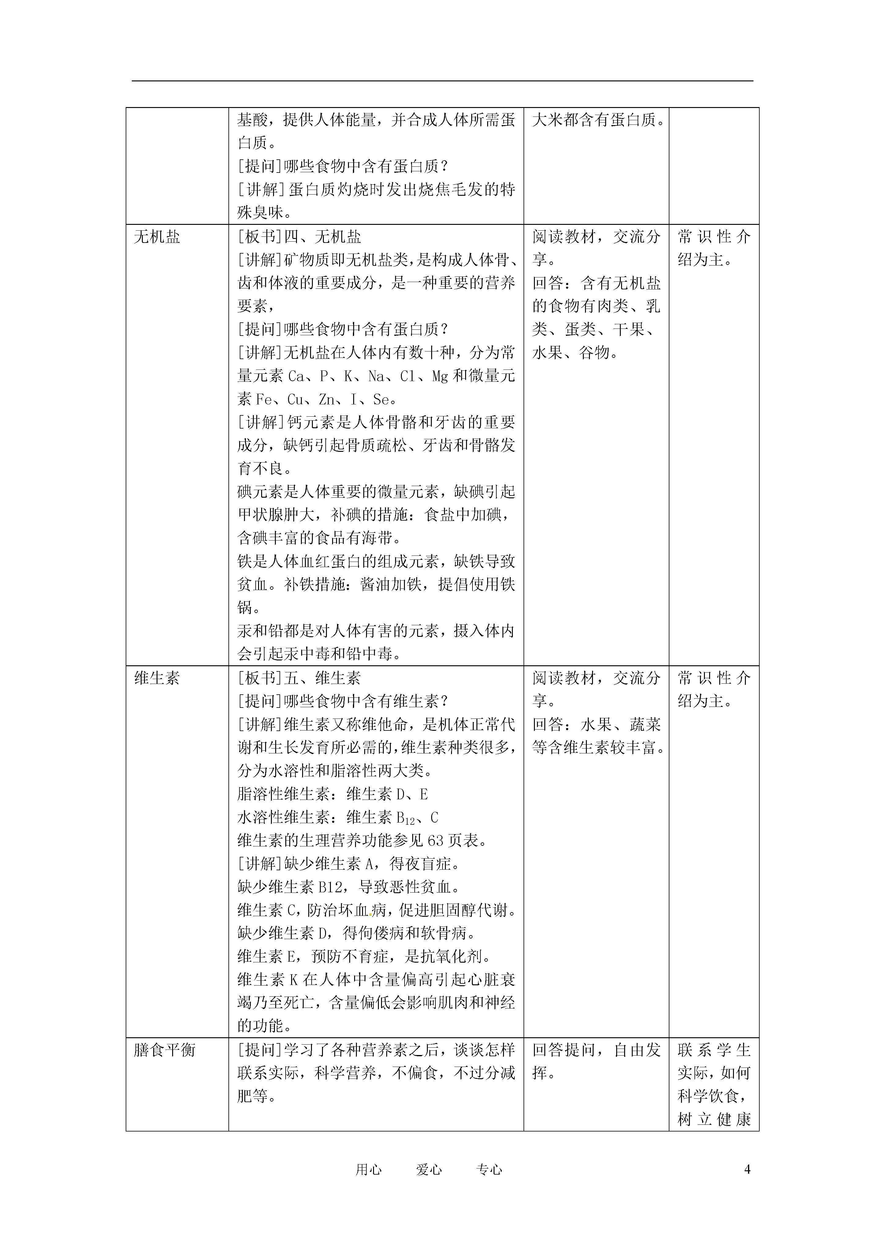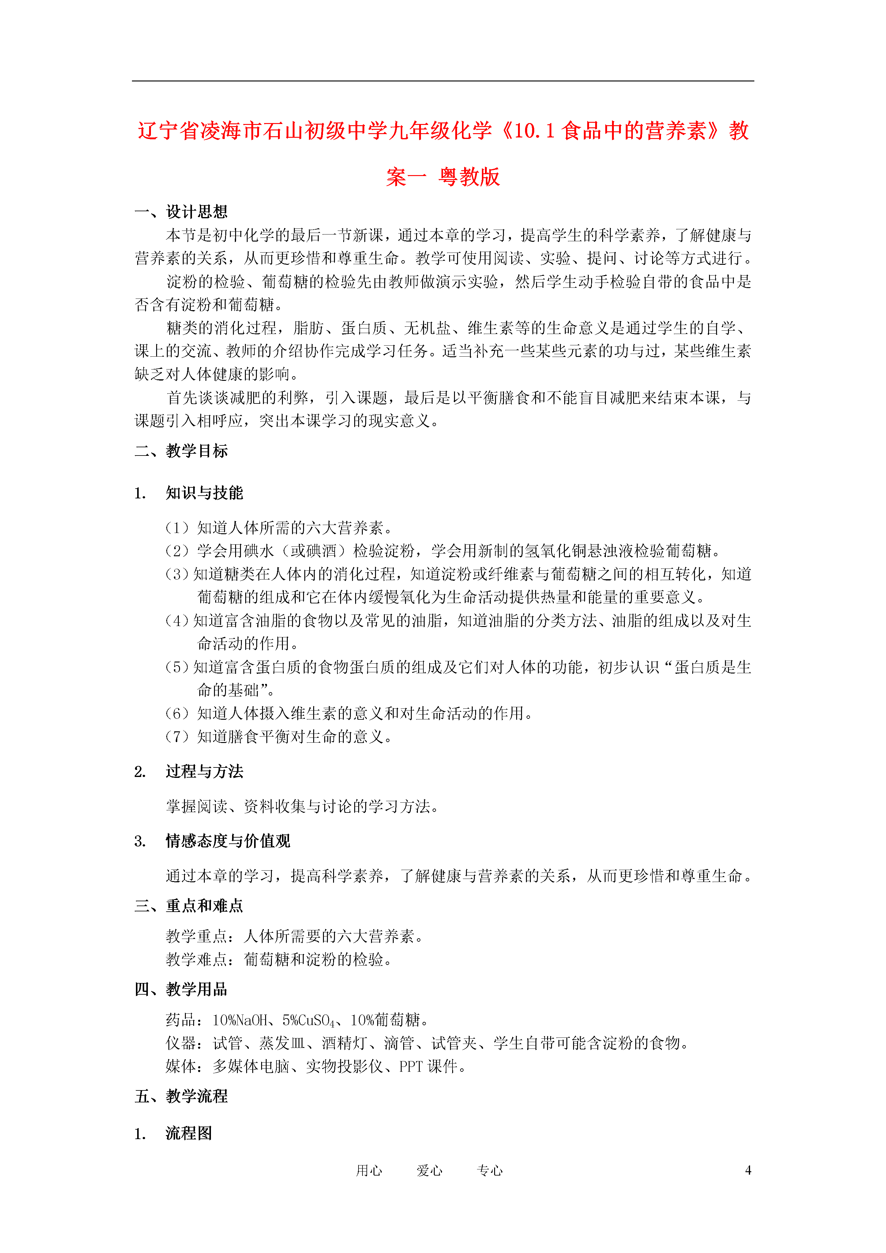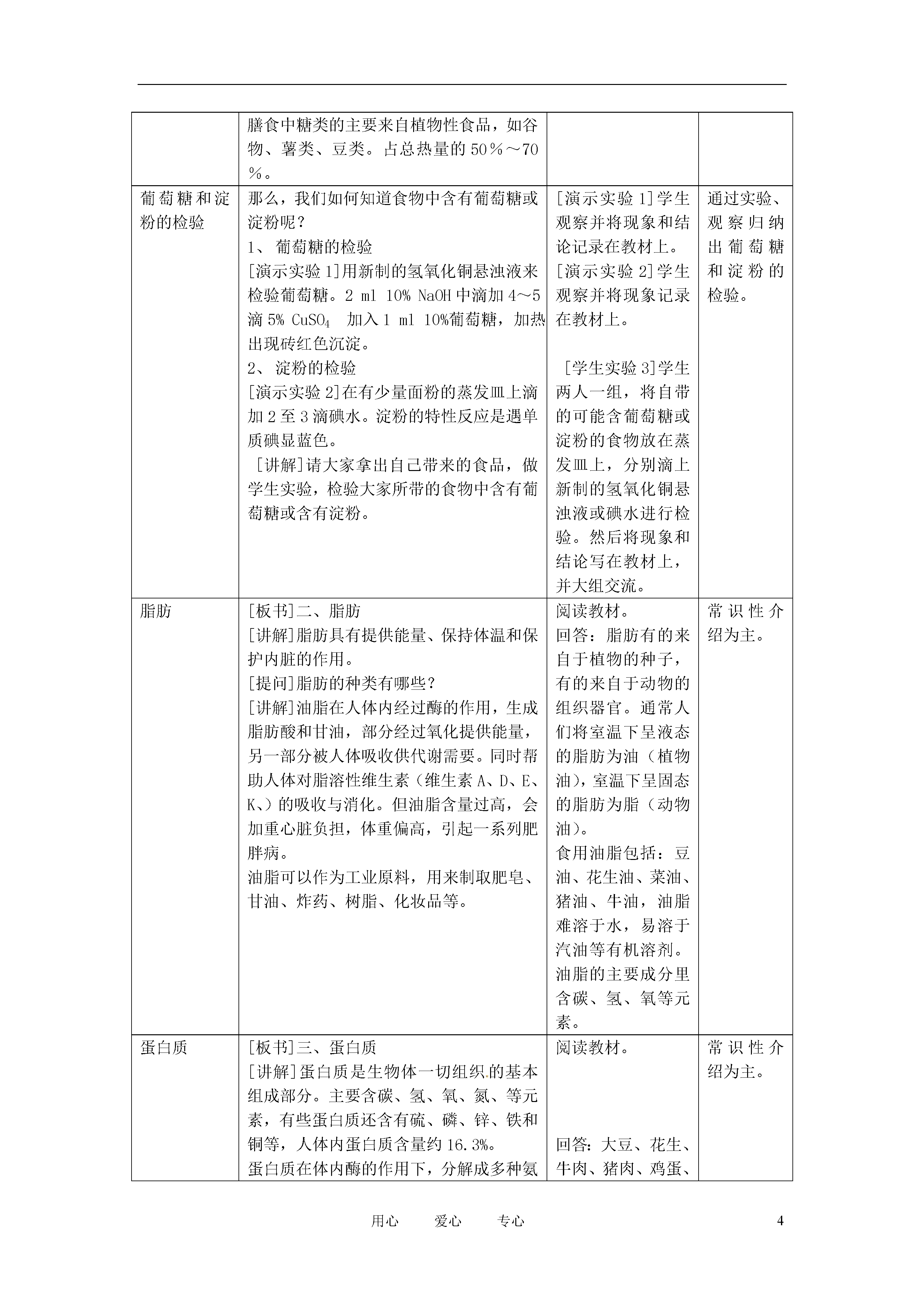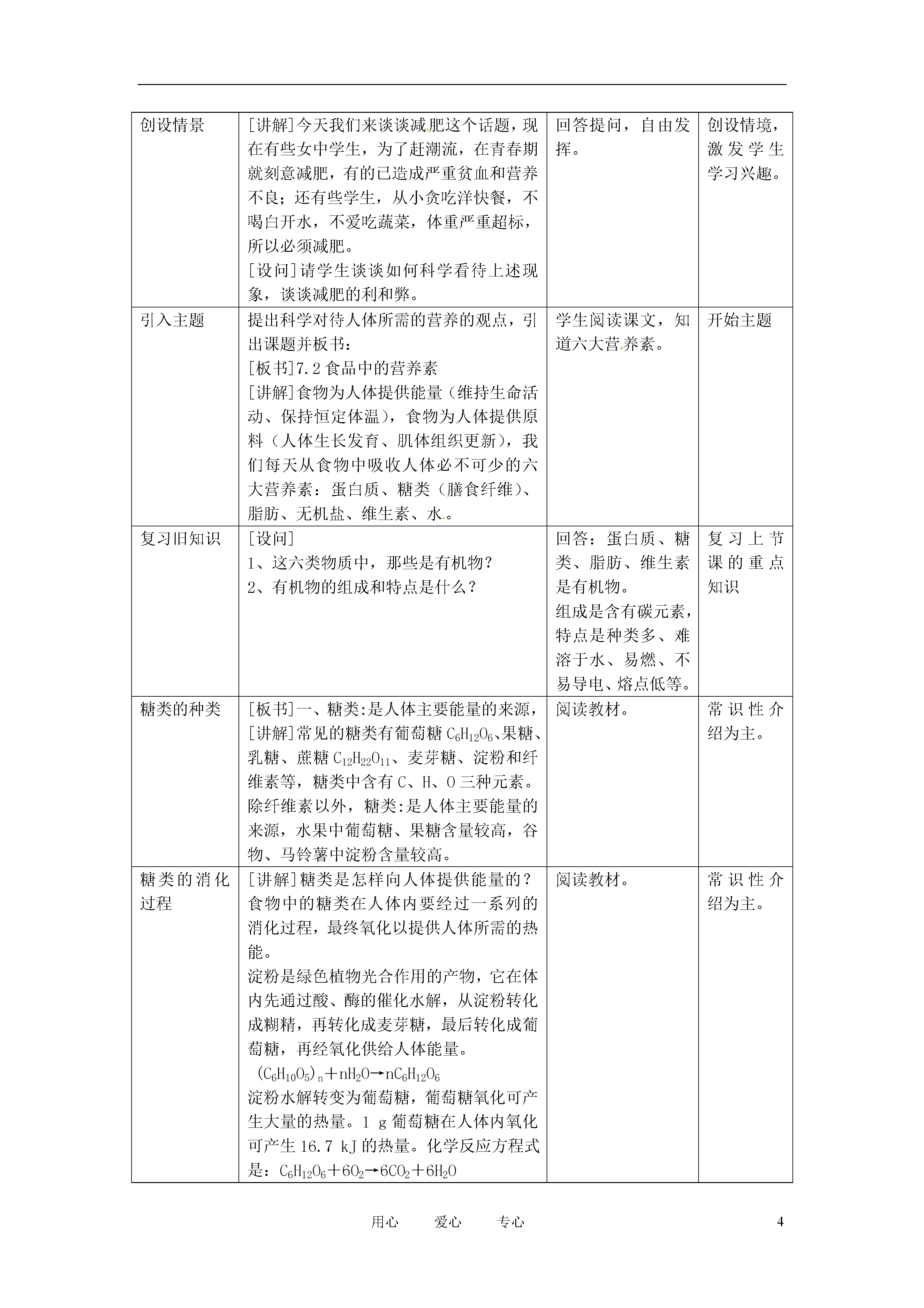 4用心爱心专心辽宁省凌海市石山初级中学九年级化学《10.1食品中的营养素》教案一粤教版一、设计思想本节是初中化学的最后一节新课,通过本章的学习,提高学生的科学素养,了解健康与营养素的关系,从而更珍惜和尊重生命。教学可使用阅读、实验、提问、讨论等方式进行。淀粉的检验、葡萄糖的检验先由教师做演示实验,然后学生动手检验自带的食品中是否含有淀粉和葡萄糖。糖类的消化过程,脂肪、蛋白质、无机盐、维生素等的生命意义是通过学生的自学、课上的交流、教师的介绍协作完成学习任务。适当补充一些某些元素的功与过,某些维生素缺乏对人体健康的影响。首先谈谈减肥的利弊,引入课题,最后是以平衡膳食和不能盲目减肥来结束本课,与课题引入相呼应,突出本课学习的现实意义。二、教学目标1.知识与技能(1)知道人体所需的六大营养素。(2)学会用碘水(或碘酒)检验淀粉,学会用新制的氢氧化铜悬浊液检验葡萄糖。(3)知道糖类在人体内的消化过程,知道淀粉或纤维素与葡萄糖之间的相互转化,知道葡萄糖的组成和它在体内缓慢氧化为生命活动提供热量和能量的重要意义。(4)知道富含油脂的食物以及常见的油脂,知道油脂的分类方法、油脂的组成以及对生命活动的作用。(5)知道富含蛋白质的食物蛋白质的组成及它们对人体的功能,初步认识“蛋白质是生命的基础”。(6)知道人体摄入维生素的意义和对生命活动的作用。(7)知道膳食平衡对生命的意义。2.过程与方法掌握阅读、资料收集与讨论的学习方法。3.情感态度与价值观通过本章的学习,提高科学素养,了解健康与营养素的关系,从而更珍惜和尊重生命。三、重点和难点教学重点:人体所需要的六大营养素。教学难点:葡萄糖和淀粉的检验。四、教学用品药品:10%NaOH、5%CuSO4、10%葡萄糖。仪器:试管、蒸发皿、酒精灯、滴管、试管夹、学生自带可能含淀粉的食物。媒体:多媒体电脑、实物投影仪、PPT课件。五、教学流程1.流程图2.流程说明[1]谈谈减肥的利弊,引入课题。[2]人体所需的六大营养素。[3]复习有机物的组成和特点。[4][5]糖类的种类和消化过程。[6][7][8]演示实验:葡萄糖的检验、淀粉的检验。学生实验:自带食品中淀粉或葡萄糖的检验[9][10]脂肪的生命意义,富含脂肪的食物。[11][12]蛋白质的的生命意义,富含蛋白质的食物。[13][14][15]无机盐的的生命意义,富含无机盐的食物,某些元素的功与过。[16][17][18]维生素的的生命意义,富含维生素的食物,某些维生素缺乏对人体健康的影响。[19]平衡膳食的重要性,由不能盲目减肥结束本课。六、教学案例1.教学过程教学内容教师活动学生活动设计意图创设情景[讲解]今天我们来谈谈减肥这个话题,现在有些女中学生,为了赶潮流,在青春期就刻意减肥,有的已造成严重贫血和营养不良;还有些学生,从小贪吃洋快餐,不喝白开水,不爱吃蔬菜,体重严重超标,所以必须减肥。[设问]请学生谈谈如何科学看待上述现象,谈谈减肥的利和弊。回答提问,自由发挥。创设情境,激发学生学习兴趣。引入主题提出科学对待人体所需的营养的观点,引出课题并板书:[板书]7.2食品中的营养素[讲解]食物为人体提供能量(维持生命活动、保持恒定体温),食物为人体提供原料(人体生长发育、肌体组织更新),我们每天从食物中吸收人体必不可少的六大营养素:蛋白质、糖类(膳食纤维)、脂肪、无机盐、维生素、水。学生阅读课文,知道六大营养素。开始主题复习旧知识[设问]1、这六类物质中,那些是有机物?2、有机物的组成和特点是什么?回答:蛋白质、糖类、脂肪、维生素是有机物。组成是含有碳元素,特点是种类多、难溶于水、易燃、不易导电、熔点低等。复习上节课的重点知识糖类的种类[板书]一、糖类:是人体主要能量的来源,[讲解]常见的糖类有葡萄糖C6H12O6、果糖、乳糖、蔗糖C12H22O11、麦芽糖、淀粉和纤维素等,糖类中含有C、H、O三种元素。除纤维素以外,糖类:是人体主要能量的来源,水果中葡萄糖、果糖含量较高,谷物、马铃薯中淀粉含量较高。阅读教材。常识性介绍为主。糖类的消化过程[讲解]糖类是怎样向人体提供能量的?食物中的糖类在人体内要经过一系列的消化过程,最终氧化以提供人体所需的热能。淀粉是绿色植物光合作用的产物,它在体内先通过酸、酶的催化水解,从淀粉转化成糊精,再转化成麦芽糖,最后转化成葡萄糖,再经氧化供给人体能量。(C6H10O5)n+nH2O→nC6H12O6淀粉水解转变为葡萄糖,葡萄糖氧化可产生大量的热量。1g葡萄糖在人体内氧化可产生16.7kJ的热量。化学反应方程式是:C6H12O6+6O2→6CO2+6H2O膳食中糖类的主要来自植物性食品,如谷物、薯