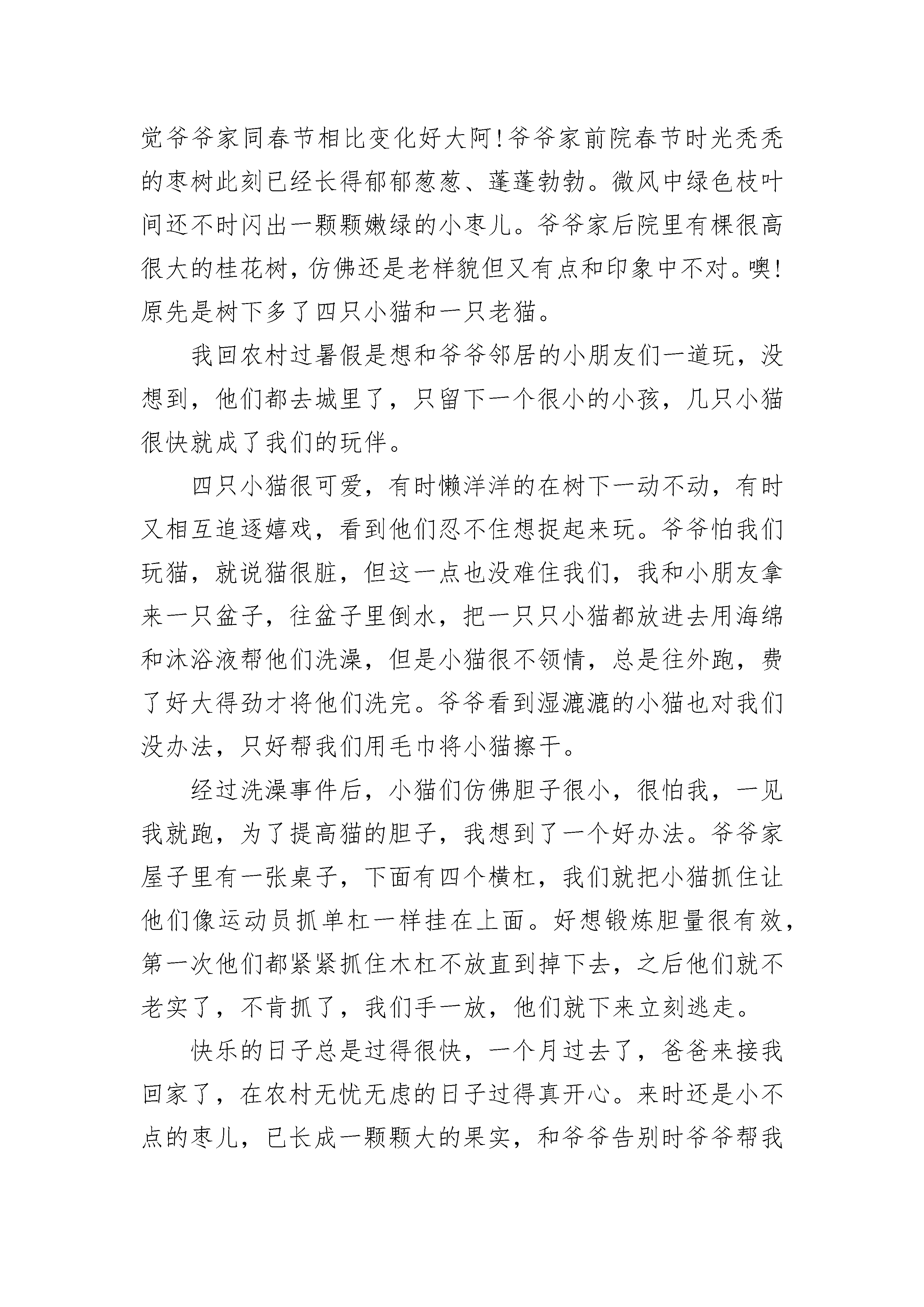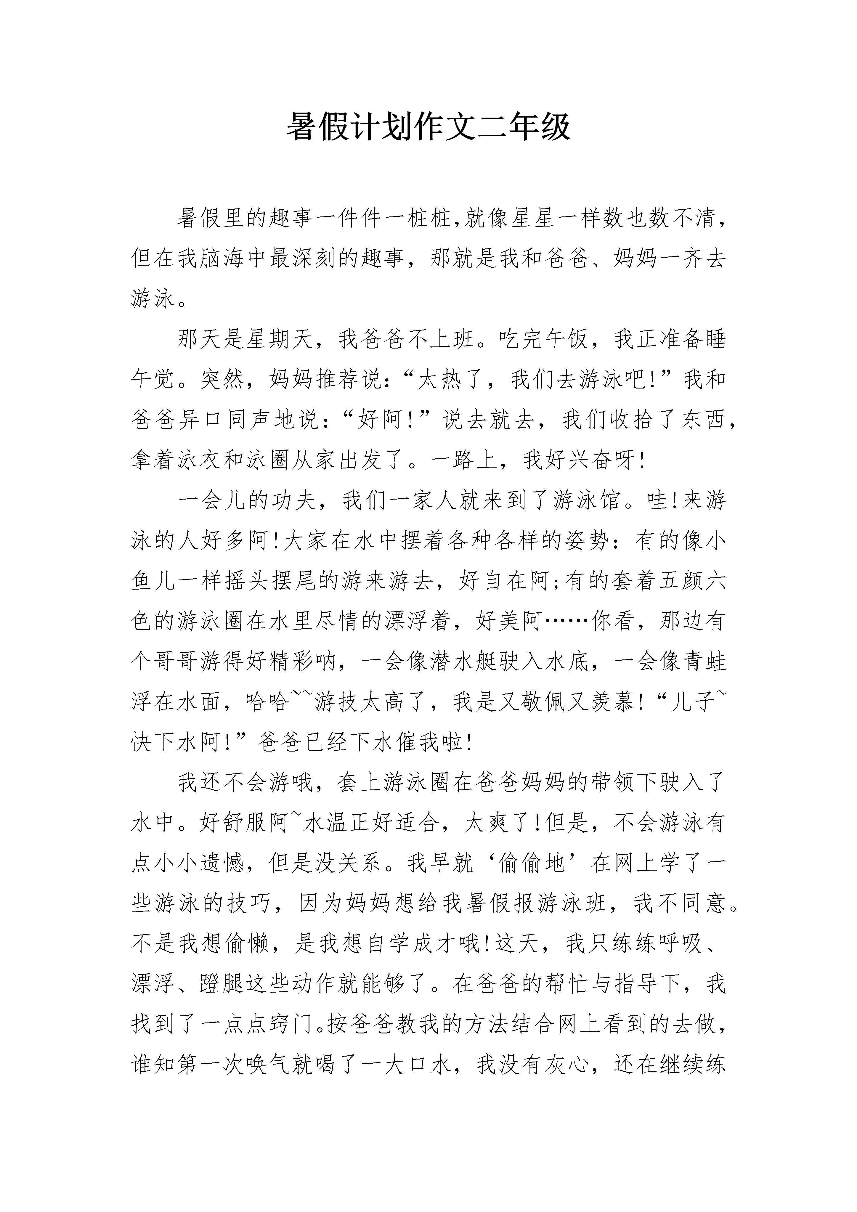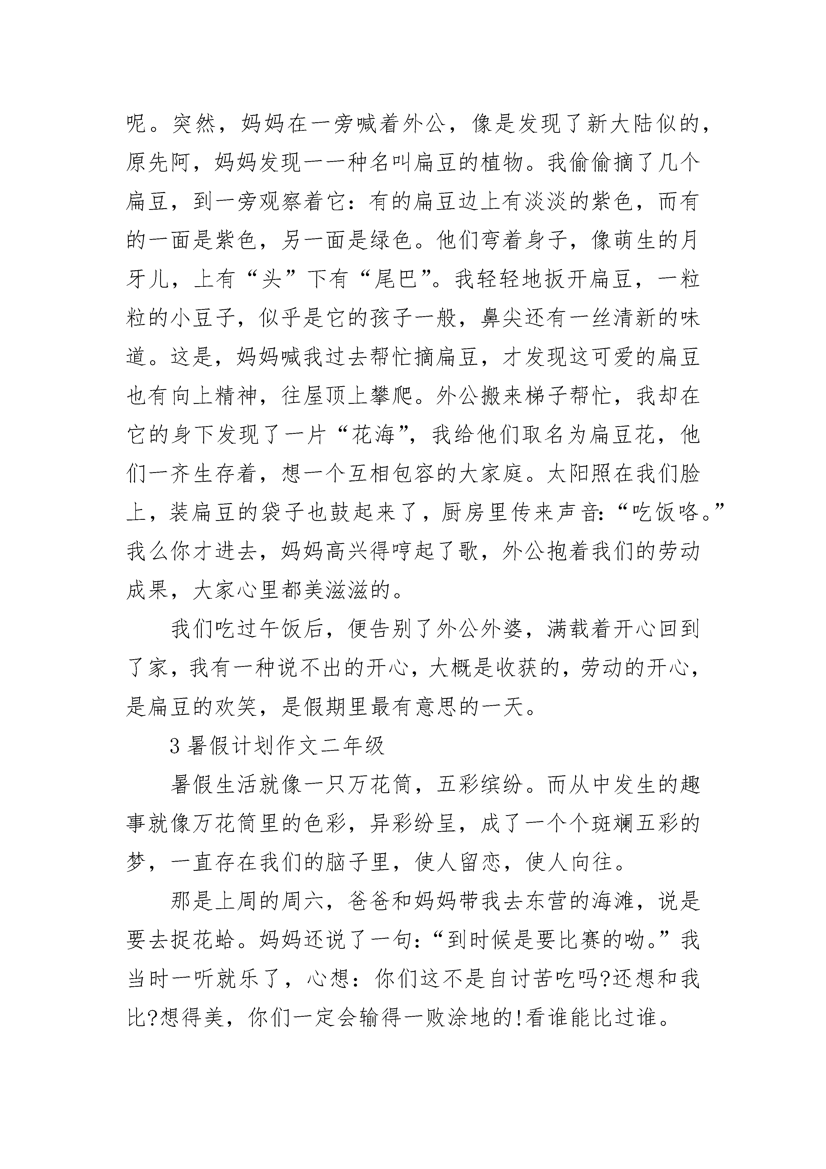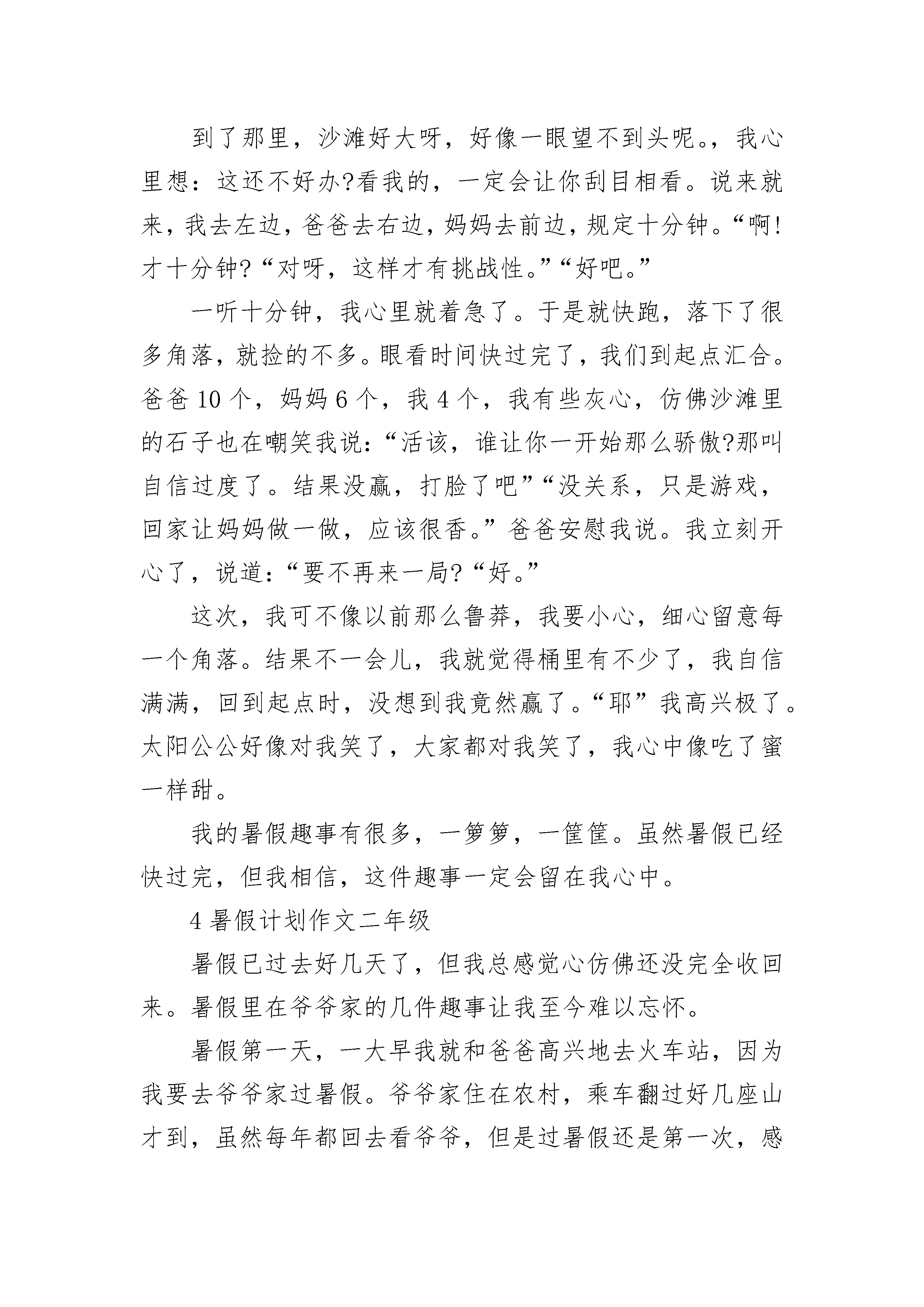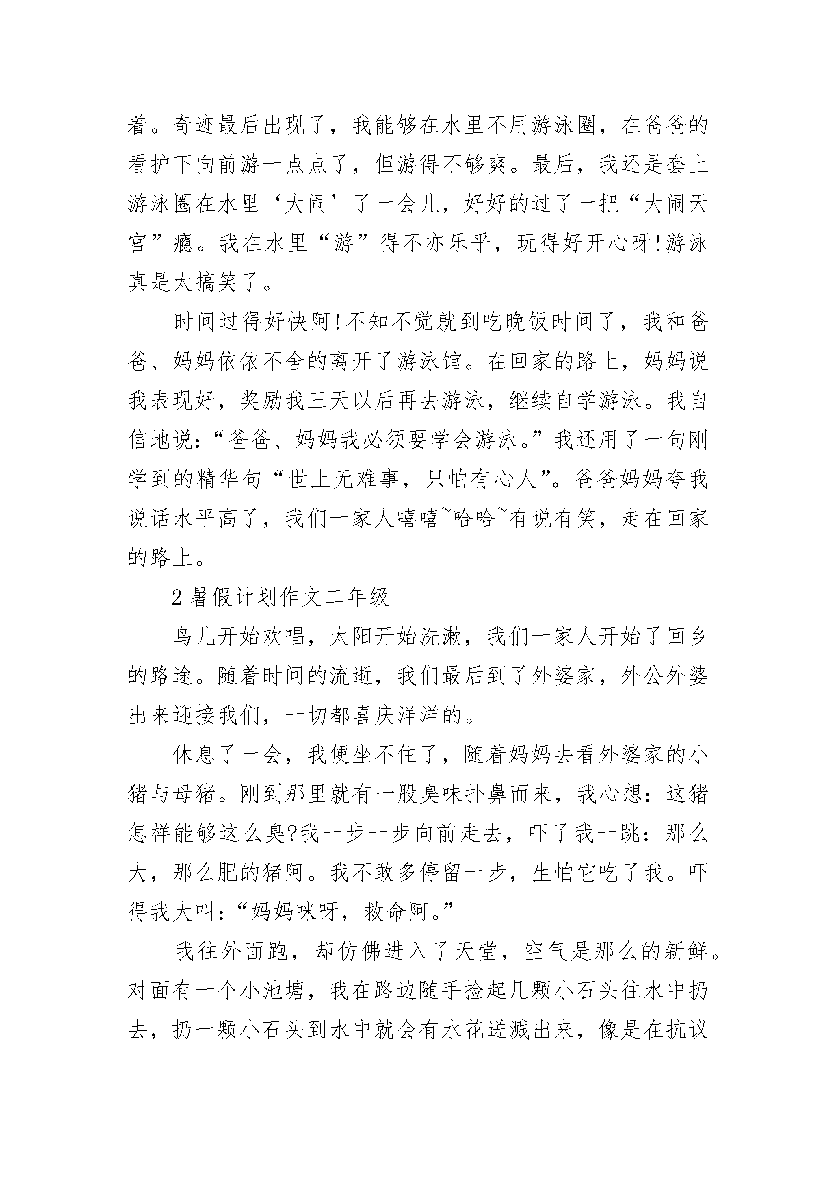 暑假计划作文二年级暑假里的趣事一件件一桩桩,就像星星一样数也数不清,但在我脑海中最深刻的趣事,那就是我和爸爸、妈妈一齐去游泳。那天是星期天,我爸爸不上班。吃完午饭,我正准备睡午觉。突然,妈妈推荐说:“太热了,我们去游泳吧!”我和爸爸异口同声地说:“好阿!”说去就去,我们收拾了东西,拿着泳衣和泳圈从家出发了。一路上,我好兴奋呀!一会儿的功夫,我们一家人就来到了游泳馆。哇!来游泳的人好多阿!大家在水中摆着各种各样的姿势:有的像小鱼儿一样摇头摆尾的游来游去,好自在阿;有的套着五颜六色的游泳圈在水里尽情的漂浮着,好美阿……你看,那边有个哥哥游得好精彩呐,一会像潜水艇驶入水底,一会像青蛙浮在水面,哈哈~~游技太高了,我是又敬佩又羡慕!“儿子~快下水阿!”爸爸已经下水催我啦!我还不会游哦,套上游泳圈在爸爸妈妈的带领下驶入了水中。好舒服阿~水温正好适合,太爽了!但是,不会游泳有点小小遗憾,但是没关系。我早就‘偷偷地’在网上学了一些游泳的技巧,因为妈妈想给我暑假报游泳班,我不同意。不是我想偷懒,是我想自学成才哦!这天,我只练练呼吸、漂浮、蹬腿这些动作就能够了。在爸爸的帮忙与指导下,我找到了一点点窍门。按爸爸教我的方法结合网上看到的去做,谁知第一次唤气就喝了一大口水,我没有灰心,还在继续练着。奇迹最后出现了,我能够在水里不用游泳圈,在爸爸的看护下向前游一点点了,但游得不够爽。最后,我还是套上游泳圈在水里‘大闹’了一会儿,好好的过了一把“大闹天宫”瘾。我在水里“游”得不亦乐乎,玩得好开心呀!游泳真是太搞笑了。时间过得好快阿!不知不觉就到吃晚饭时间了,我和爸爸、妈妈依依不舍的离开了游泳馆。在回家的路上,妈妈说我表现好,奖励我三天以后再去游泳,继续自学游泳。我自信地说:“爸爸、妈妈我必须要学会游泳。”我还用了一句刚学到的精华句“世上无难事,只怕有心人”。爸爸妈妈夸我说话水平高了,我们一家人嘻嘻~哈哈~有说有笑,走在回家的路上。2暑假计划作文二年级鸟儿开始欢唱,太阳开始洗漱,我们一家人开始了回乡的路途。随着时间的流逝,我们最后到了外婆家,外公外婆出来迎接我们,一切都喜庆洋洋的。休息了一会,我便坐不住了,随着妈妈去看外婆家的小猪与母猪。刚到那里就有一股臭味扑鼻而来,我心想:这猪怎样能够这么臭?我一步一步向前走去,吓了我一跳:那么大,那么肥的猪阿。我不敢多停留一步,生怕它吃了我。吓得我大叫:“妈妈咪呀,救命阿。”我往外面跑,却仿佛进入了天堂,空气是那么的新鲜。对面有一个小池塘,我在路边随手捡起几颗小石头往水中扔去,扔一颗小石头到水中就会有水花迸溅出来,像是在抗议呢。突然,妈妈在一旁喊着外公,像是发现了新大陆似的,原先阿,妈妈发现一一种名叫扁豆的植物。我偷偷摘了几个扁豆,到一旁观察着它:有的扁豆边上有淡淡的紫色,而有的一面是紫色,另一面是绿色。他们弯着身子,像萌生的月牙儿,上有“头”下有“尾巴”。我轻轻地扳开扁豆,一粒粒的小豆子,似乎是它的孩子一般,鼻尖还有一丝清新的味道。这是,妈妈喊我过去帮忙摘扁豆,才发现这可爱的扁豆也有向上精神,往屋顶上攀爬。外公搬来梯子帮忙,我却在它的身下发现了一片“花海”,我给他们取名为扁豆花,他们一齐生存着,想一个互相包容的大家庭。太阳照在我们脸上,装扁豆的袋子也鼓起来了,厨房里传来声音:“吃饭咯。”我么你才进去,妈妈高兴得哼起了歌,外公抱着我们的劳动成果,大家心里都美滋滋的。我们吃过午饭后,便告别了外公外婆,满载着开心回到了家,我有一种说不出的开心,大概是收获的,劳动的开心,是扁豆的欢笑,是假期里最有意思的一天。3暑假计划作文二年级暑假生活就像一只万花筒,五彩缤纷。而从中发生的趣事就像万花筒里的色彩,异彩纷呈,成了一个个斑斓五彩的梦,一直存在我们的脑子里,使人留恋,使人向往。那是上周的周六,爸爸和妈妈带我去东营的海滩,说是要去捉花蛤。妈妈还说了一句:“到时候是要比赛的呦。”我当时一听就乐了,心想:你们这不是自讨苦吃吗?还想和我比?想得美,你们一定会输得一败涂地的!看谁能比过谁。到了那里,沙滩好大呀,好像一眼望不到头呢。,我心里想:这还不好办?看我的,一定会让你刮目相看。说来就来,我去左边,爸爸去右边,妈妈去前边,规定十分钟。“啊!才十分钟?“对呀,这样才有挑战性。”“好吧。”一听十分钟,我心里就着急了。于是就快跑,落下了很多角落,就捡的不多。眼看时间快过完了,我们到起点汇合。爸爸10个,妈妈6个,我4个,我有些灰心,仿佛沙滩里的石子也在嘲笑我说:“活该,谁让你一开始那么骄傲?那叫自信过度了。结果没赢,打脸了吧”“没关系,只是游戏,回家让妈妈做一做,应该很香。”爸爸安慰我说。我立刻开心了,说道:“要不再来一局?“好。”这次,我可不像以前那么鲁莽,我要小心,细心留意每一个角落。结果不一会儿,我就觉得桶里有不少了,我自信满满,回到