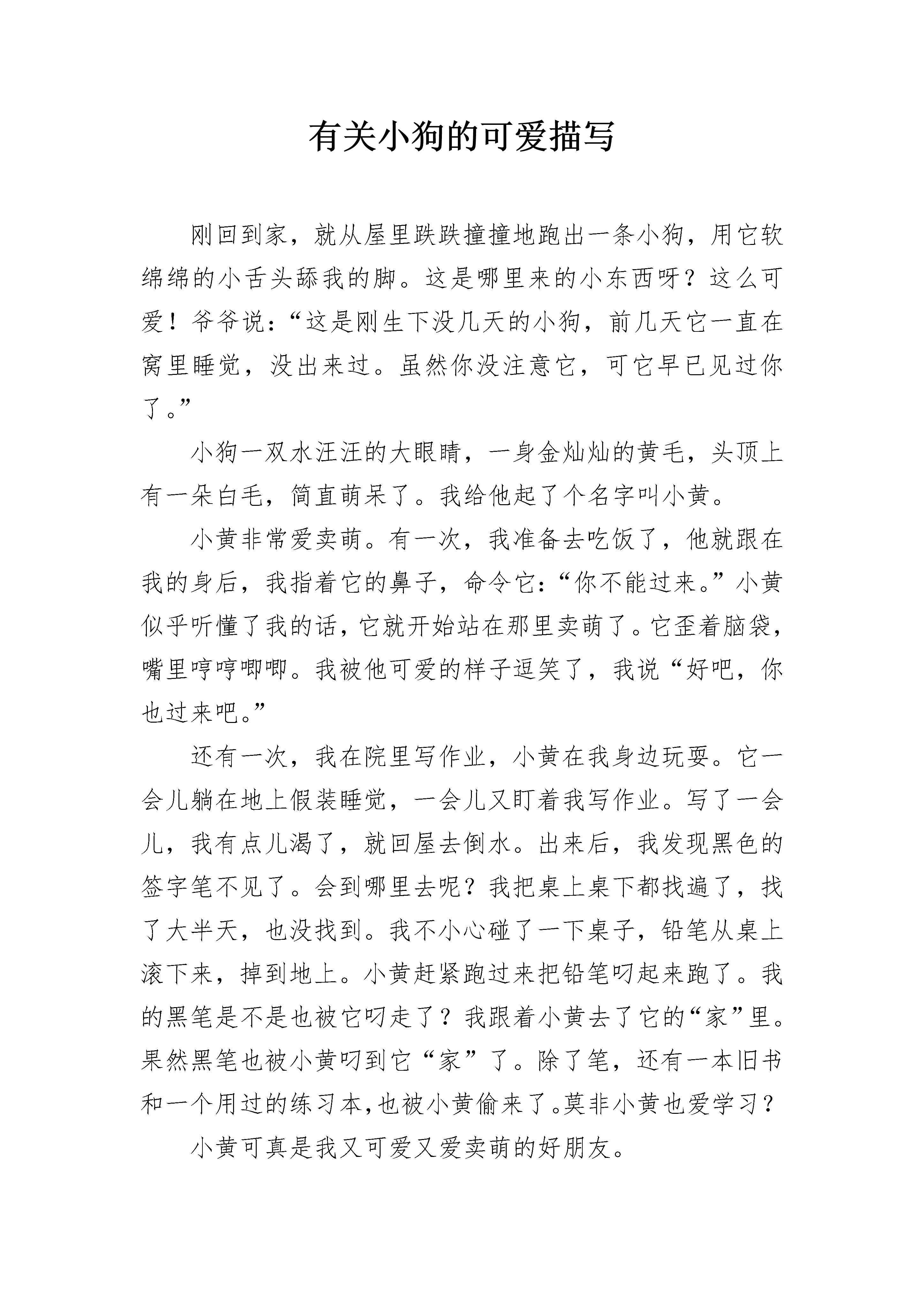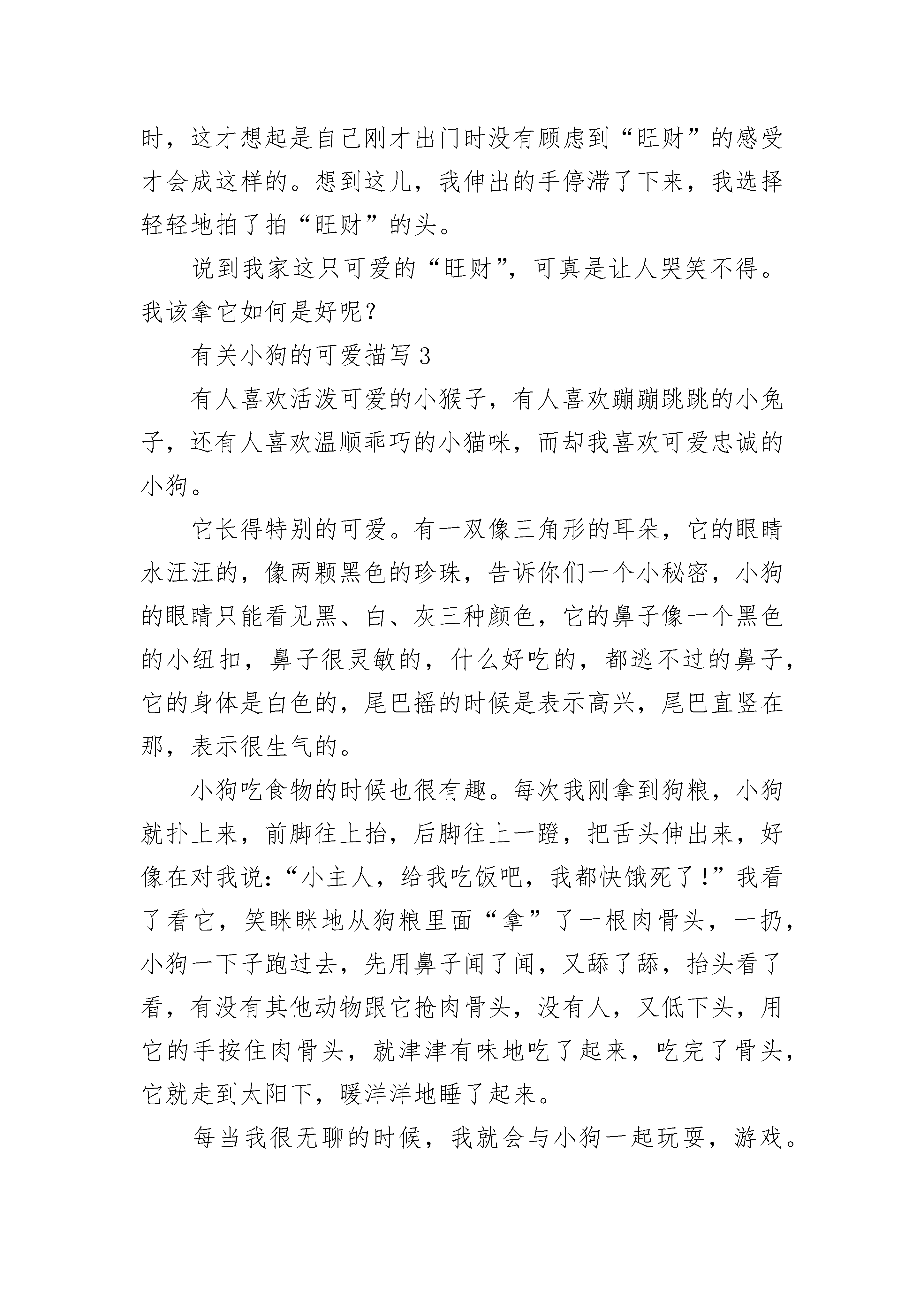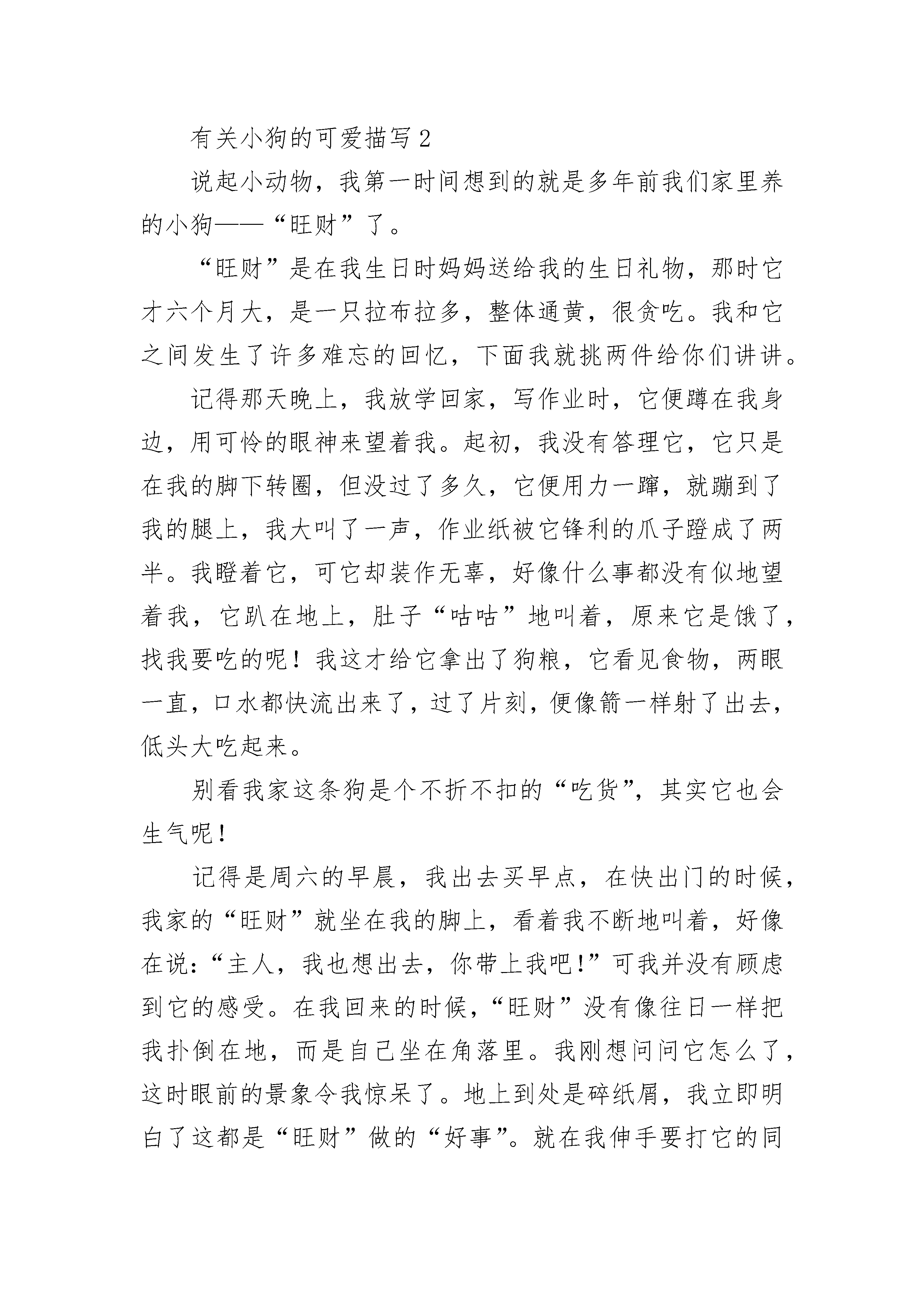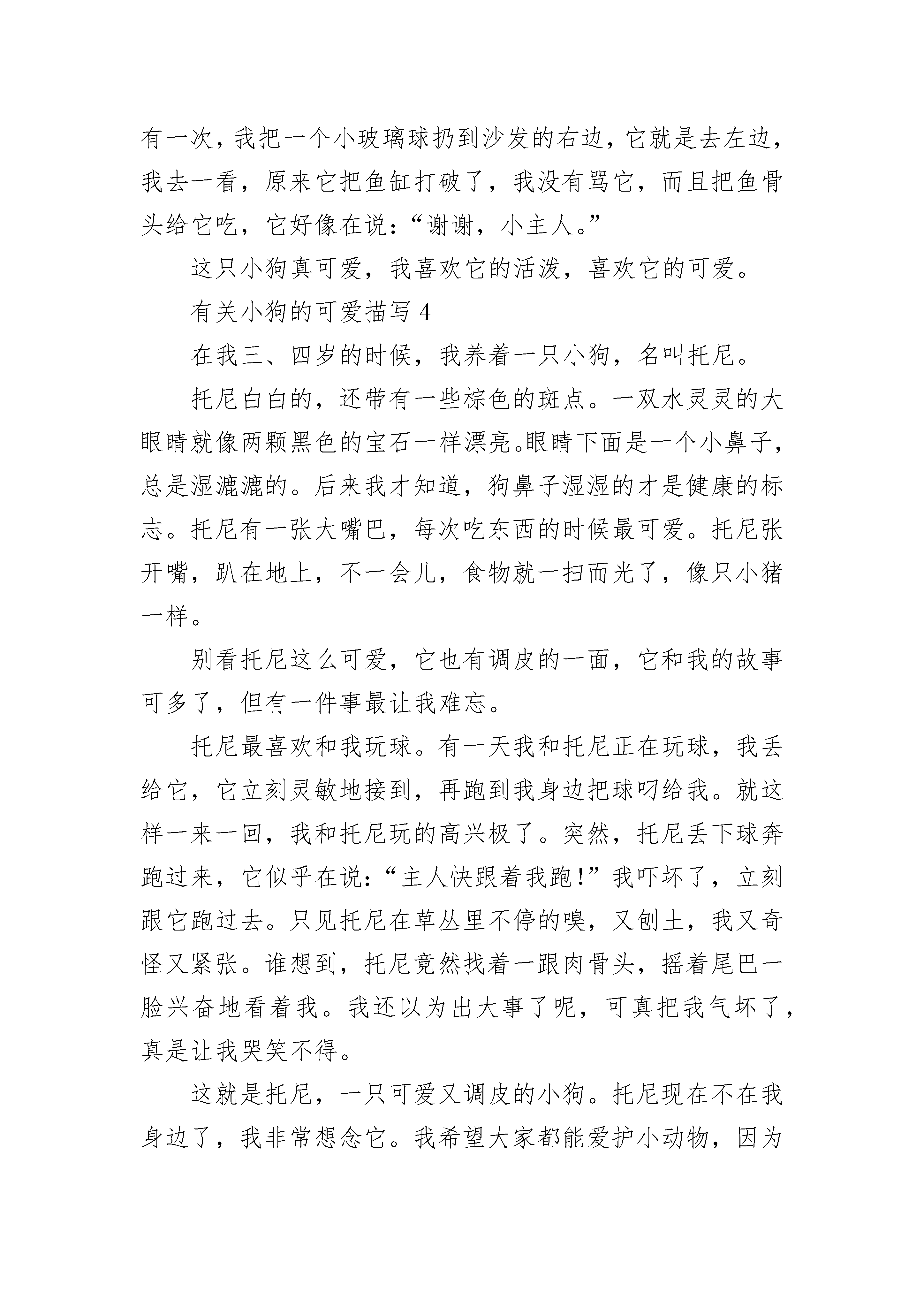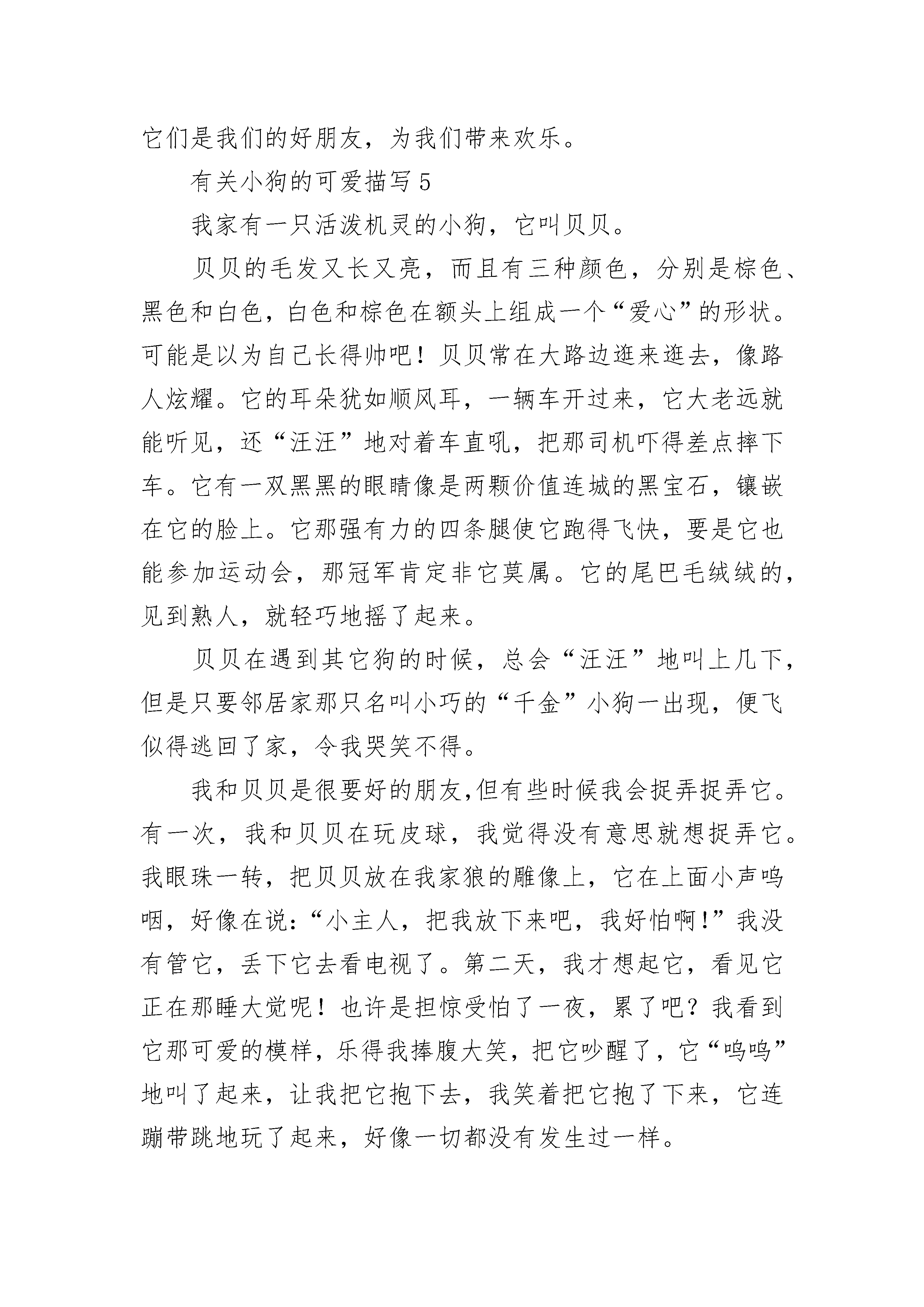 有关小狗的可爱描写刚回到家,就从屋里跌跌撞撞地跑出一条小狗,用它软绵绵的小舌头舔我的脚。这是哪里来的小东西呀?这么可爱!爷爷说:“这是刚生下没几天的小狗,前几天它一直在窝里睡觉,没出来过。虽然你没注意它,可它早已见过你了。”小狗一双水汪汪的大眼睛,一身金灿灿的黄毛,头顶上有一朵白毛,简直萌呆了。我给他起了个名字叫小黄。小黄非常爱卖萌。有一次,我准备去吃饭了,他就跟在我的身后,我指着它的鼻子,命令它:“你不能过来。”小黄似乎听懂了我的话,它就开始站在那里卖萌了。它歪着脑袋,嘴里哼哼唧唧。我被他可爱的样子逗笑了,我说“好吧,你也过来吧。”还有一次,我在院里写作业,小黄在我身边玩耍。它一会儿躺在地上假装睡觉,一会儿又盯着我写作业。写了一会儿,我有点儿渴了,就回屋去倒水。出来后,我发现黑色的签字笔不见了。会到哪里去呢?我把桌上桌下都找遍了,找了大半天,也没找到。我不小心碰了一下桌子,铅笔从桌上滚下来,掉到地上。小黄赶紧跑过来把铅笔叼起来跑了。我的黑笔是不是也被它叼走了?我跟着小黄去了它的“家”里。果然黑笔也被小黄叼到它“家”了。除了笔,还有一本旧书和一个用过的练习本,也被小黄偷来了。莫非小黄也爱学习?小黄可真是我又可爱又爱卖萌的好朋友。有关小狗的可爱描写2说起小动物,我第一时间想到的就是多年前我们家里养的小狗——“旺财”了。“旺财”是在我生日时妈妈送给我的生日礼物,那时它才六个月大,是一只拉布拉多,整体通黄,很贪吃。我和它之间发生了许多难忘的回忆,下面我就挑两件给你们讲讲。记得那天晚上,我放学回家,写作业时,它便蹲在我身边,用可怜的眼神来望着我。起初,我没有答理它,它只是在我的脚下转圈,但没过了多久,它便用力一蹿,就蹦到了我的腿上,我大叫了一声,作业纸被它锋利的爪子蹬成了两半。我瞪着它,可它却装作无辜,好像什么事都没有似地望着我,它趴在地上,肚子“咕咕”地叫着,原来它是饿了,找我要吃的呢!我这才给它拿出了狗粮,它看见食物,两眼一直,口水都快流出来了,过了片刻,便像箭一样射了出去,低头大吃起来。别看我家这条狗是个不折不扣的“吃货”,其实它也会生气呢!记得是周六的早晨,我出去买早点,在快出门的时候,我家的“旺财”就坐在我的脚上,看着我不断地叫着,好像在说:“主人,我也想出去,你带上我吧!”可我并没有顾虑到它的感受。在我回来的时候,“旺财”没有像往日一样把我扑倒在地,而是自己坐在角落里。我刚想问问它怎么了,这时眼前的景象令我惊呆了。地上到处是碎纸屑,我立即明白了这都是“旺财”做的“好事”。就在我伸手要打它的同时,这才想起是自己刚才出门时没有顾虑到“旺财”的感受才会成这样的。想到这儿,我伸出的手停滞了下来,我选择轻轻地拍了拍“旺财”的头。说到我家这只可爱的“旺财”,可真是让人哭笑不得。我该拿它如何是好呢?有关小狗的可爱描写3有人喜欢活泼可爱的小猴子,有人喜欢蹦蹦跳跳的小兔子,还有人喜欢温顺乖巧的小猫咪,而却我喜欢可爱忠诚的小狗。它长得特别的可爱。有一双像三角形的耳朵,它的眼睛水汪汪的,像两颗黑色的珍珠,告诉你们一个小秘密,小狗的眼睛只能看见黑、白、灰三种颜色,它的鼻子像一个黑色的小纽扣,鼻子很灵敏的,什么好吃的,都逃不过的鼻子,它的身体是白色的,尾巴摇的时候是表示高兴,尾巴直竖在那,表示很生气的。小狗吃食物的时候也很有趣。每次我刚拿到狗粮,小狗就扑上来,前脚往上抬,后脚往上一蹬,把舌头伸出来,好像在对我说:“小主人,给我吃饭吧,我都快饿死了!”我看了看它,笑眯眯地从狗粮里面“拿”了一根肉骨头,一扔,小狗一下子跑过去,先用鼻子闻了闻,又舔了舔,抬头看了看,有没有其他动物跟它抢肉骨头,没有人,又低下头,用它的手按住肉骨头,就津津有味地吃了起来,吃完了骨头,它就走到太阳下,暖洋洋地睡了起来。每当我很无聊的时候,我就会与小狗一起玩耍,游戏。有一次,我把一个小玻璃球扔到沙发的右边,它就是去左边,我去一看,原来它把鱼缸打破了,我没有骂它,而且把鱼骨头给它吃,它好像在说:“谢谢,小主人。”这只小狗真可爱,我喜欢它的活泼,喜欢它的可爱。有关小狗的可爱描写4在我三、四岁的时候,我养着一只小狗,名叫托尼。托尼白白的,还带有一些棕色的斑点。一双水灵灵的大眼睛就像两颗黑色的宝石一样漂亮。眼睛下面是一个小鼻子,总是湿漉漉的。后来我才知道,狗鼻子湿湿的才是健康的标志。托尼有一张大嘴巴,每次吃东西的时候最可爱。托尼张开嘴,趴在地上,不一会儿,食物就一扫而光了,像只小猪一样。别看托尼这么可爱,它也有调皮的一面,它和我的故事可多了,但有一件事最让我难忘。托尼最喜欢和我玩球。有一天我和托尼正在玩球,我丢给它,它立刻灵敏地接到,再跑到我身边把球叼给我。就这样一来一回,我和托尼玩的高兴极了。突然,托尼丢下球奔跑过来,它似乎在说:“主人快跟着我跑!”我吓坏了,立刻跟它跑过去。只见