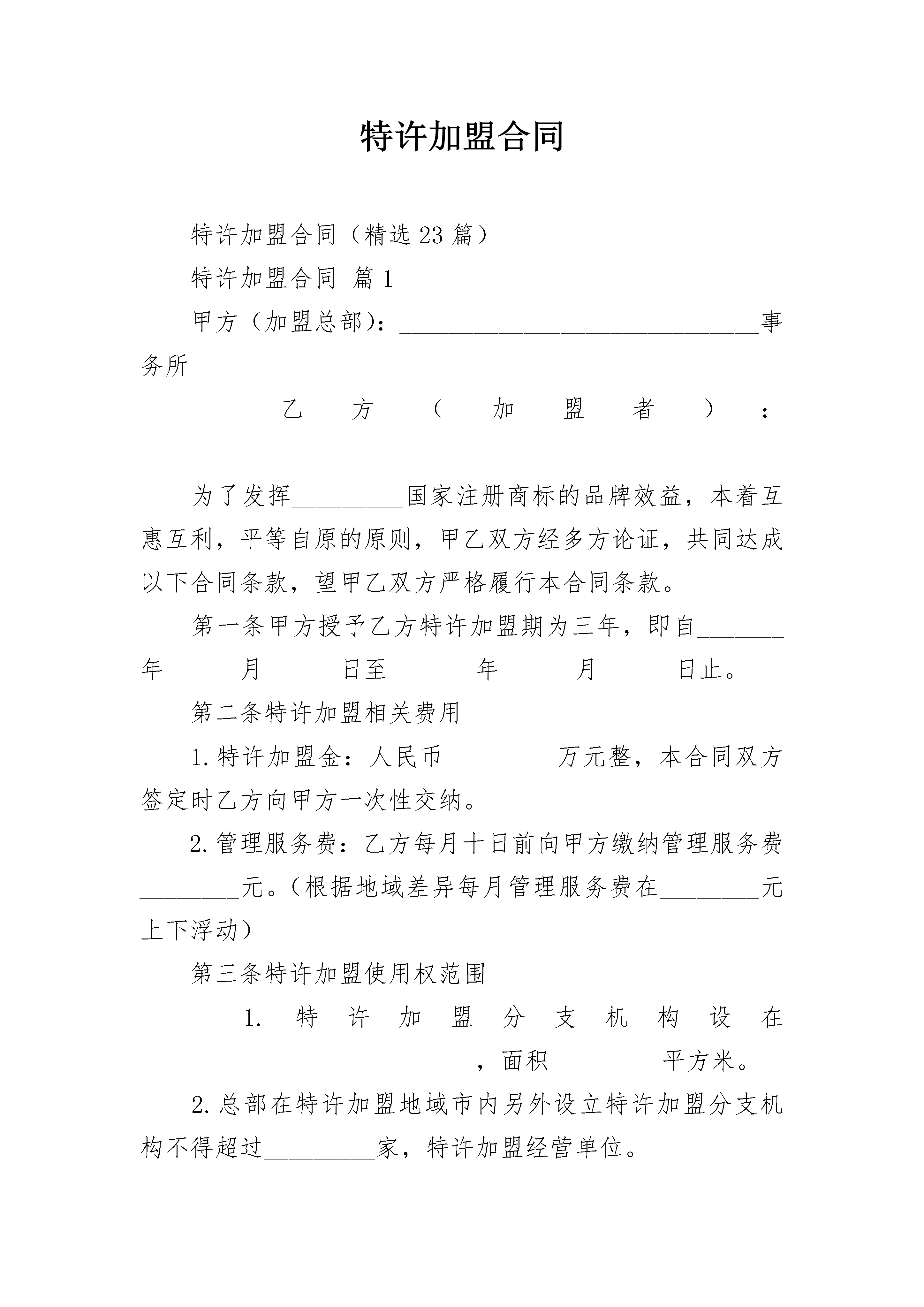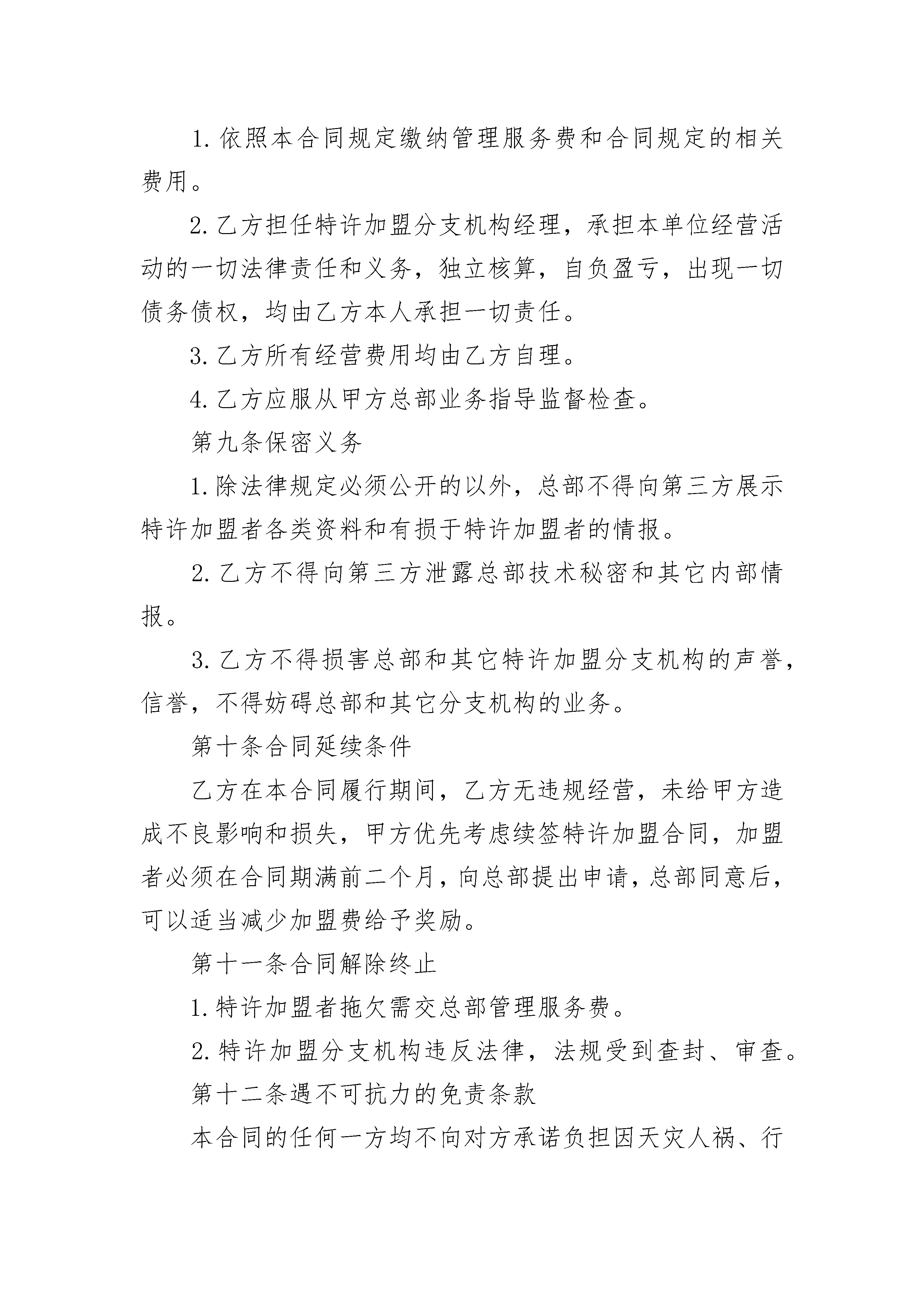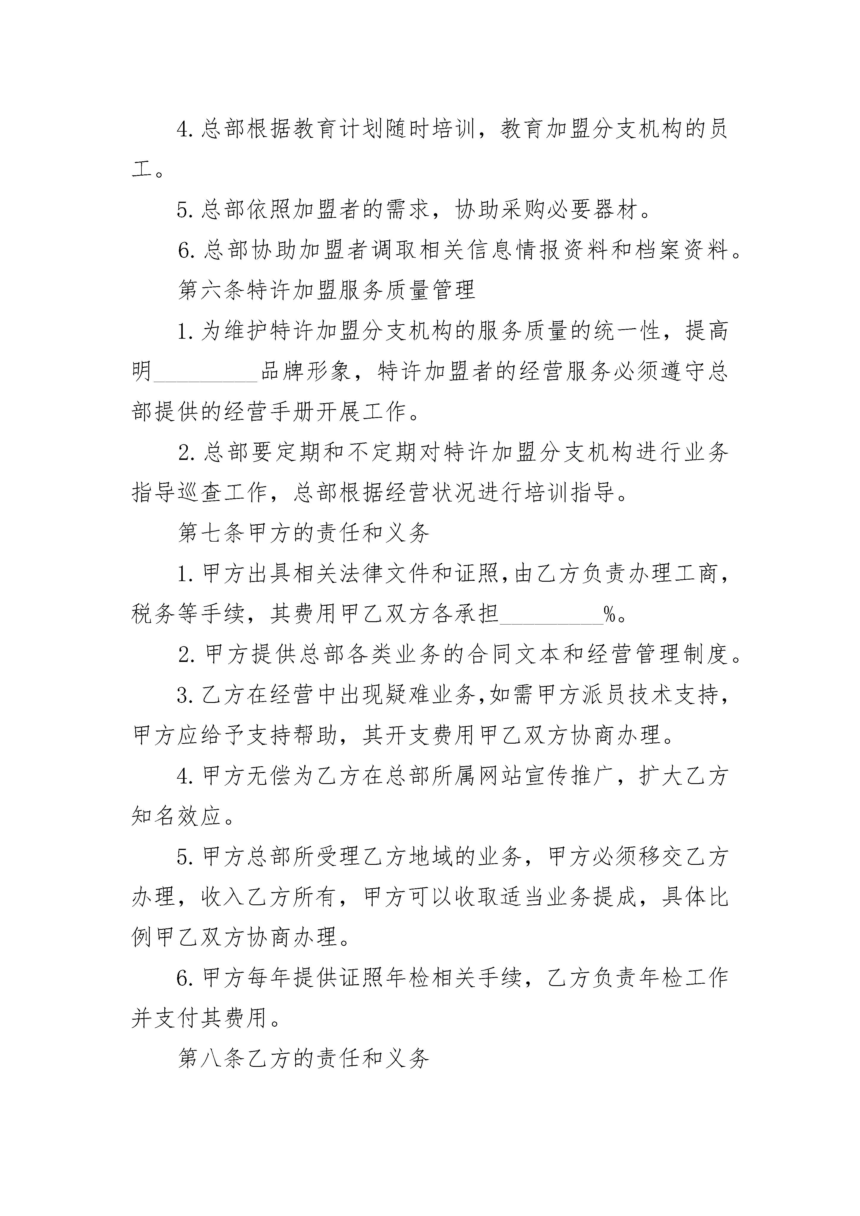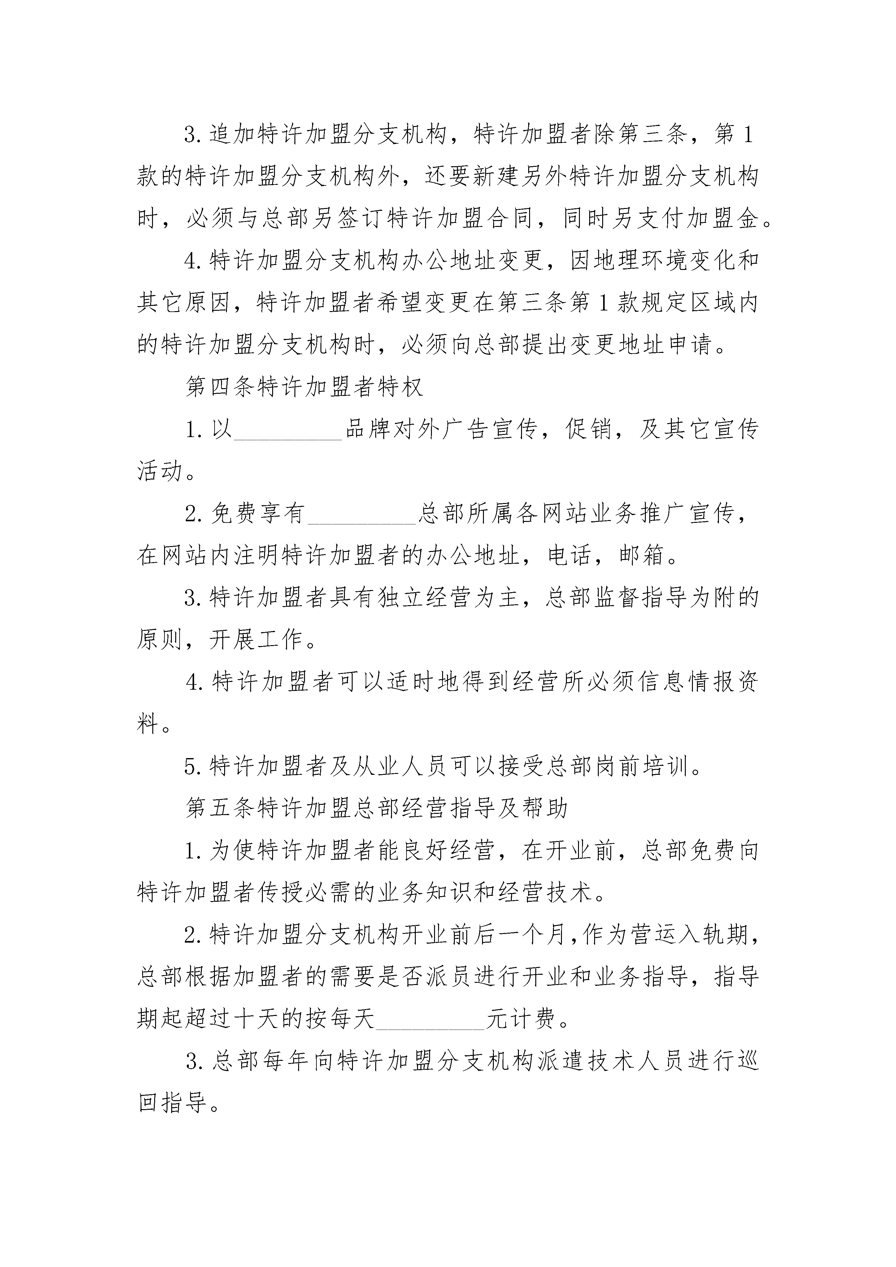 特许加盟合同特许加盟合同(精选23篇)特许加盟合同篇1甲方(加盟总部):_____________________________事务所乙方(加盟者):_____________________________________为了发挥_________国家注册商标的品牌效益,本着互惠互利,平等自原的原则,甲乙双方经多方论证,共同达成以下合同条款,望甲乙双方严格履行本合同条款。第一条甲方授予乙方特许加盟期为三年,即自_______年______月______日至_______年______月______日止。第二条特许加盟相关费用1.特许加盟金:人民币_________万元整,本合同双方签定时乙方向甲方一次性交纳。2.管理服务费:乙方每月十日前向甲方缴纳管理服务费________元。(根据地域差异每月管理服务费在________元上下浮动)第三条特许加盟使用权范围1.特许加盟分支机构设在___________________________,面积_________平方米。2.总部在特许加盟地域市内另外设立特许加盟分支机构不得超过_________家,特许加盟经营单位。3.追加特许加盟分支机构,特许加盟者除第三条,第1款的特许加盟分支机构外,还要新建另外特许加盟分支机构时,必须与总部另签订特许加盟合同,同时另支付加盟金。4.特许加盟分支机构办公地址变更,因地理环境变化和其它原因,特许加盟者希望变更在第三条第1款规定区域内的特许加盟分支机构时,必须向总部提出变更地址申请。第四条特许加盟者特权1.以_________品牌对外广告宣传,促销,及其它宣传活动。2.免费享有_________总部所属各网站业务推广宣传,在网站内注明特许加盟者的办公地址,电话,邮箱。3.特许加盟者具有独立经营为主,总部监督指导为附的原则,开展工作。4.特许加盟者可以适时地得到经营所必须信息情报资料。5.特许加盟者及从业人员可以接受总部岗前培训。第五条特许加盟总部经营指导及帮助1.为使特许加盟者能良好经营,在开业前,总部免费向特许加盟者传授必需的业务知识和经营技术。2.特许加盟分支机构开业前后一个月,作为营运入轨期,总部根据加盟者的需要是否派员进行开业和业务指导,指导期起超过十天的按每天_________元计费。3.总部每年向特许加盟分支机构派遣技术人员进行巡回指导。4.总部根据教育计划随时培训,教育加盟分支机构的员工。5.总部依照加盟者的需求,协助采购必要器材。6.总部协助加盟者调取相关信息情报资料和档案资料。第六条特许加盟服务质量管理1.为维护特许加盟分支机构的服务质量的统一性,提高明_________品牌形象,特许加盟者的经营服务必须遵守总部提供的经营手册开展工作。2.总部要定期和不定期对特许加盟分支机构进行业务指导巡查工作,总部根据经营状况进行培训指导。第七条甲方的责任和义务1.甲方出具相关法律文件和证照,由乙方负责办理工商,税务等手续,其费用甲乙双方各承担_________%。2.甲方提供总部各类业务的合同文本和经营管理制度。3.乙方在经营中出现疑难业务,如需甲方派员技术支持,甲方应给予支持帮助,其开支费用甲乙双方协商办理。4.甲方无偿为乙方在总部所属网站宣传推广,扩大乙方知名效应。5.甲方总部所受理乙方地域的业务,甲方必须移交乙方办理,收入乙方所有,甲方可以收取适当业务提成,具体比例甲乙双方协商办理。6.甲方每年提供证照年检相关手续,乙方负责年检工作并支付其费用。第八条乙方的责任和义务1.依照本合同规定缴纳管理服务费和合同规定的相关费用。2.乙方担任特许加盟分支机构经理,承担本单位经营活动的一切法律责任和义务,独立核算,自负盈亏,出现一切债务债权,均由乙方本人承担一切责任。3.乙方所有经营费用均由乙方自理。4.乙方应服从甲方总部业务指导监督检查。第九条保密义务1.除法律规定必须公开的以外,总部不得向第三方展示特许加盟者各类资料和有损于特许加盟者的情报。2.乙方不得向第三方泄露总部技术秘密和其它内部情报。3.乙方不得损害总部和其它特许加盟分支机构的声誉,信誉,不得妨碍总部和其它分支机构的业务。第十条合同延续条件乙方在本合同履行期间,乙方无违规经营,未给甲方造成不良影响和损失,甲方优先考虑续签特许加盟合同,加盟者必须在合同期满前二个月,向总部提出申请,总部同意后,可以适当减少加盟费给予奖励。第十一条合同解除终止1.特许加盟者拖欠需交总部管理服务费。2.特许加盟分支机构违反法律,法规受到查封、审查。第十二条遇不可抗力的免责条款本合同的任何一方均不向对方承诺负担因天灾人祸、行政机关的强制政策超越合理控制限度的原因造成的损失。第十三条甲乙双方应共同遵守履行本合同,违约者按本合同实际金额的_________%处以罚责。第十四条协商解决1.对本合同规定的及未定