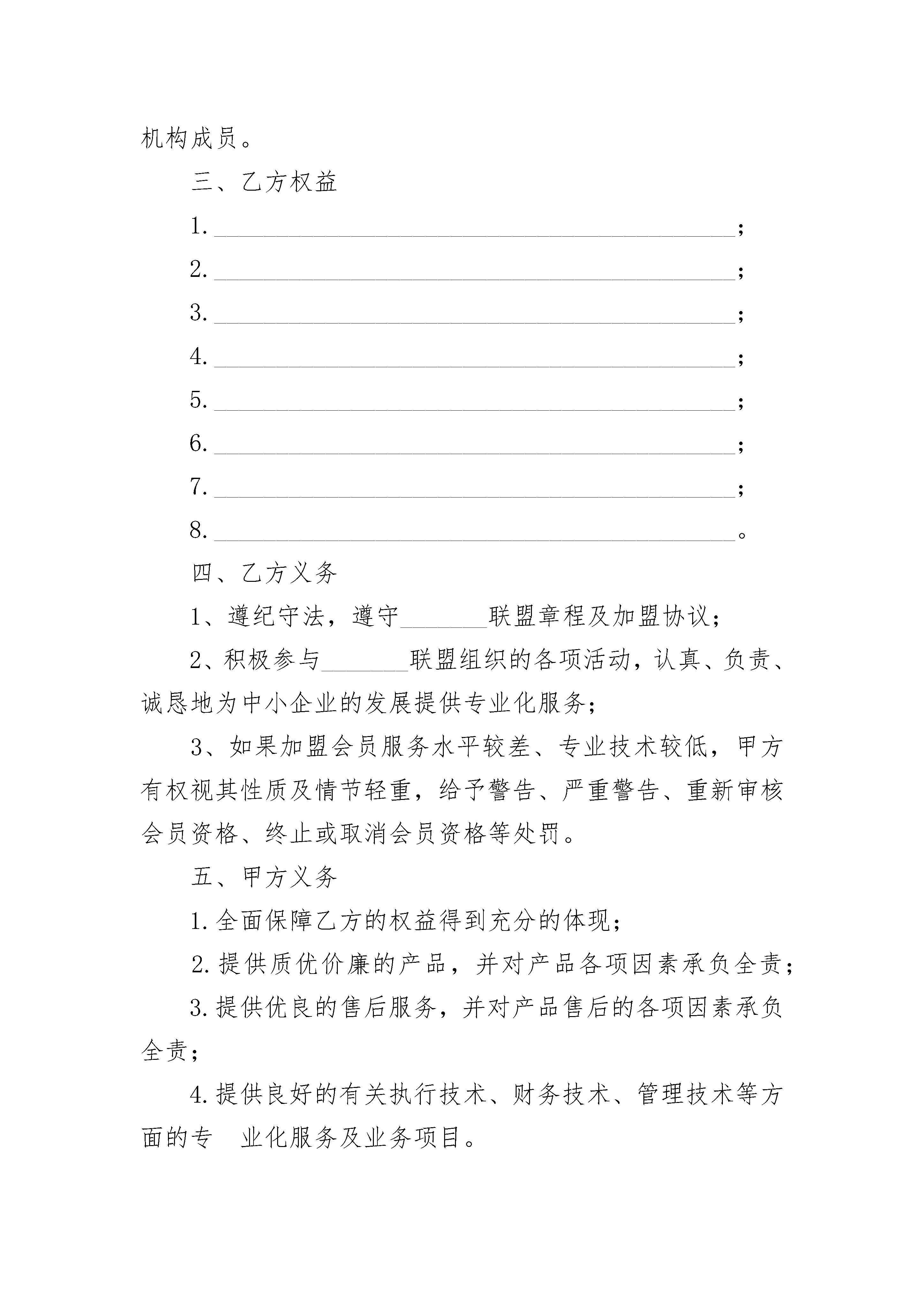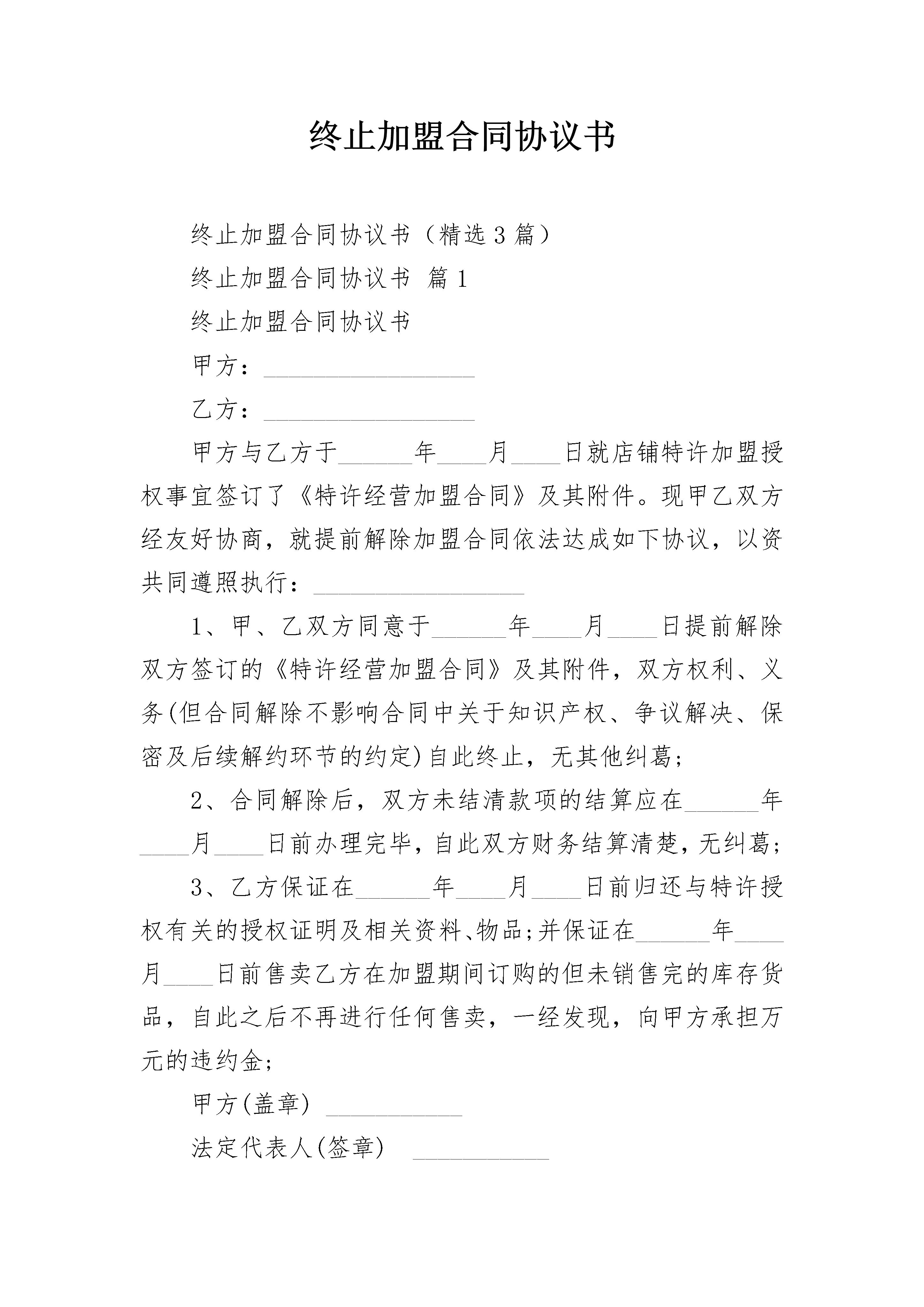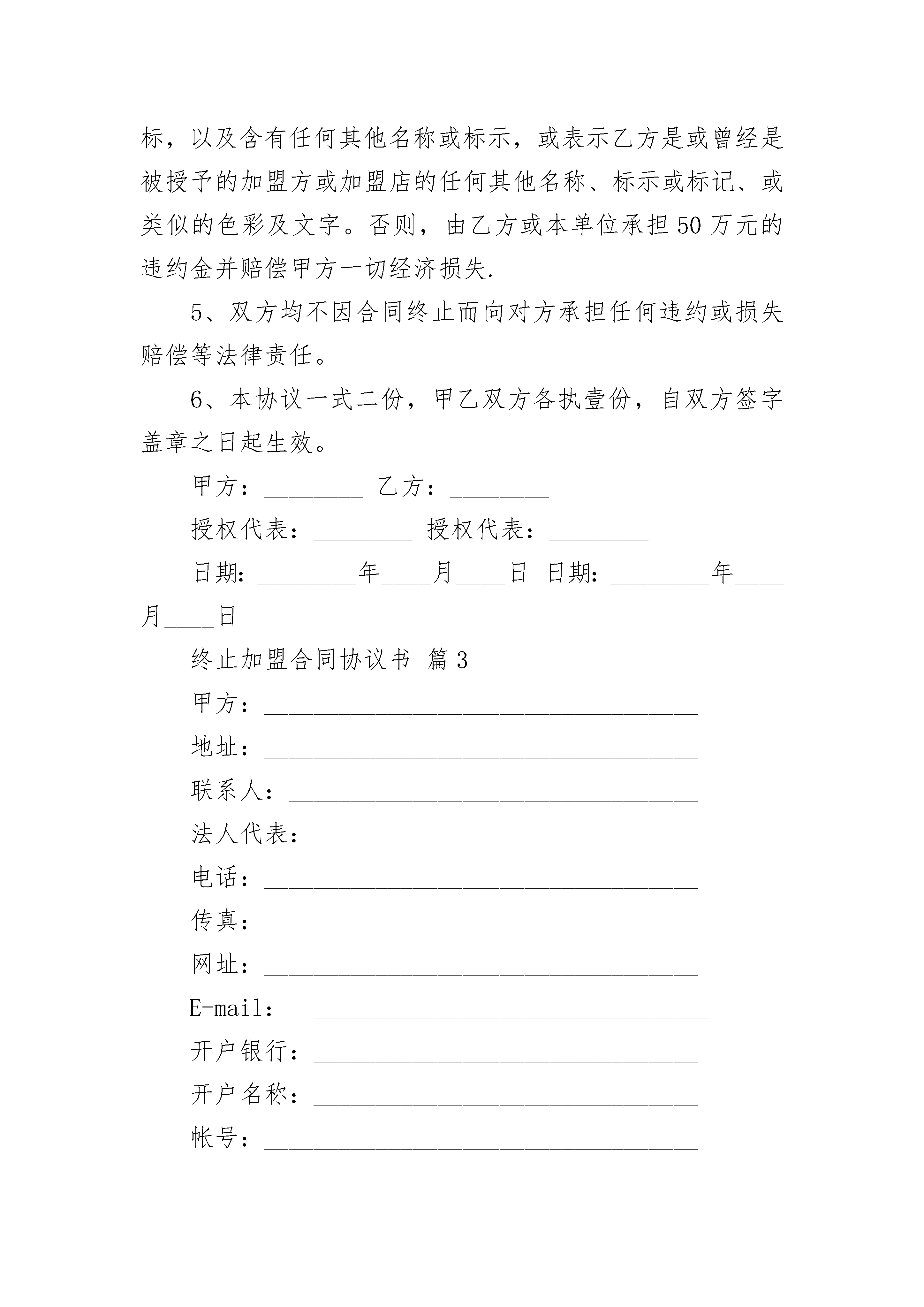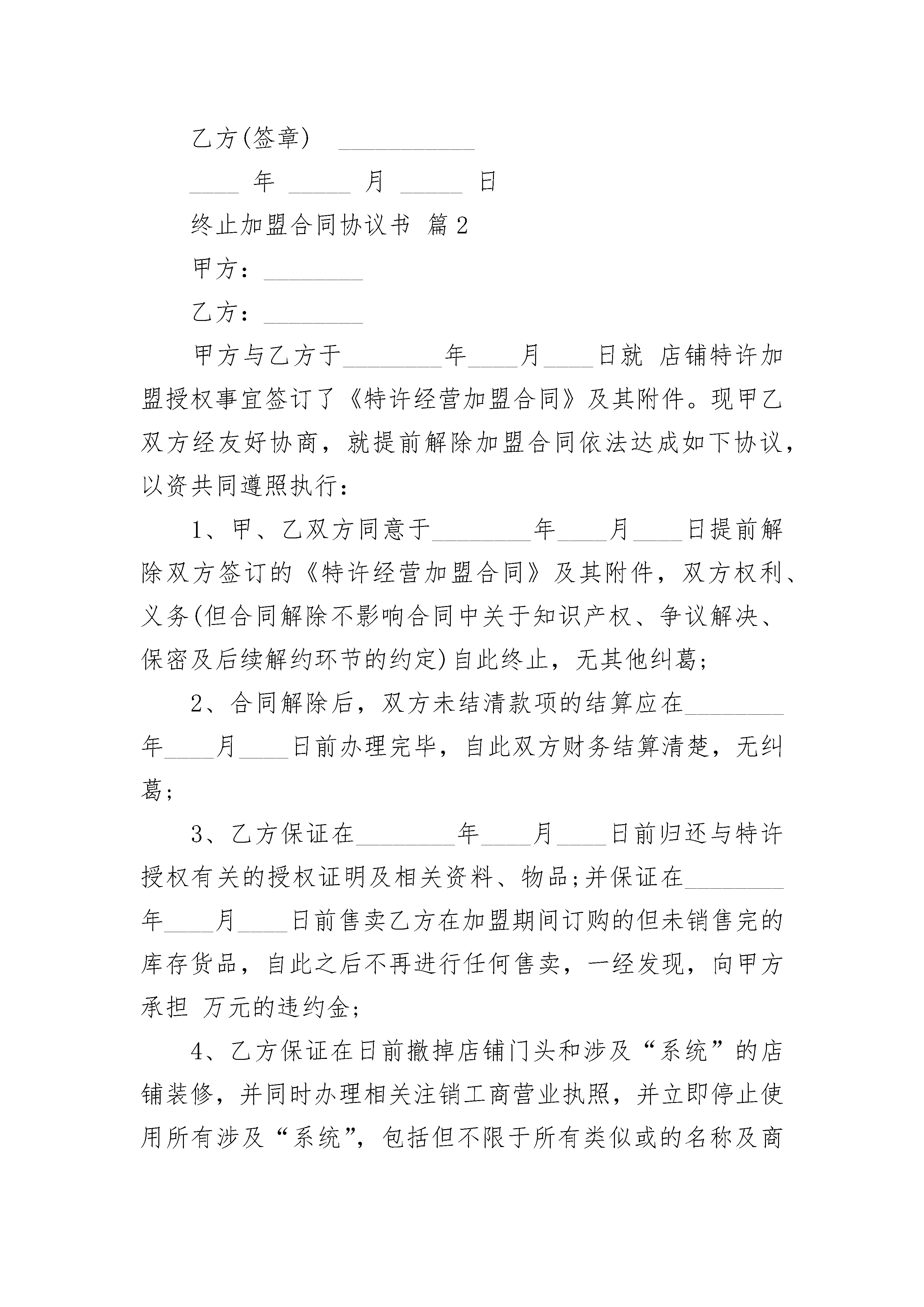 终止加盟合同协议书终止加盟合同协议书(精选3篇)终止加盟合同协议书篇1终止加盟合同协议书甲方:_________________乙方:_________________甲方与乙方于______年____月____日就店铺特许加盟授权事宜签订了《特许经营加盟合同》及其附件。现甲乙双方经友好协商,就提前解除加盟合同依法达成如下协议,以资共同遵照执行:_________________1、甲、乙双方同意于______年____月____日提前解除双方签订的《特许经营加盟合同》及其附件,双方权利、义务(但合同解除不影响合同中关于知识产权、争议解决、保密及后续解约环节的约定)自此终止,无其他纠葛;2、合同解除后,双方未结清款项的结算应在______年____月____日前办理完毕,自此双方财务结算清楚,无纠葛;3、乙方保证在______年____月____日前归还与特许授权有关的授权证明及相关资料、物品;并保证在______年____月____日前售卖乙方在加盟期间订购的但未销售完的库存货品,自此之后不再进行任何售卖,一经发现,向甲方承担万元的违约金;甲方(盖章)___________法定代表人(签章)___________乙方(签章)_______________年_____月_____日终止加盟合同协议书篇2甲方:________乙方:________甲方与乙方于________年____月____日就店铺特许加盟授权事宜签订了《特许经营加盟合同》及其附件。现甲乙双方经友好协商,就提前解除加盟合同依法达成如下协议,以资共同遵照执行:1、甲、乙双方同意于________年____月____日提前解除双方签订的《特许经营加盟合同》及其附件,双方权利、义务(但合同解除不影响合同中关于知识产权、争议解决、保密及后续解约环节的约定)自此终止,无其他纠葛;2、合同解除后,双方未结清款项的结算应在________年____月____日前办理完毕,自此双方财务结算清楚,无纠葛;3、乙方保证在________年____月____日前归还与特许授权有关的授权证明及相关资料、物品;并保证在________年____月____日前售卖乙方在加盟期间订购的但未销售完的库存货品,自此之后不再进行任何售卖,一经发现,向甲方承担万元的违约金;4、乙方保证在日前撤掉店铺门头和涉及“系统”的店铺装修,并同时办理相关注销工商营业执照,并立即停止使用所有涉及“系统”,包括但不限于所有类似或的名称及商标,以及含有任何其他名称或标示,或表示乙方是或曾经是被授予的加盟方或加盟店的任何其他名称、标示或标记、或类似的色彩及文字。否则,由乙方或本单位承担50万元的违约金并赔偿甲方一切经济损失.5、双方均不因合同终止而向对方承担任何违约或损失赔偿等法律责任。6、本协议一式二份,甲乙双方各执壹份,自双方签字盖章之日起生效。甲方:________乙方:________授权代表:________授权代表:________日期:________年____月____日日期:________年____月____日终止加盟合同协议书篇3甲方:___________________________________地址:___________________________________联系人:_________________________________法人代表:_______________________________电话:___________________________________传真:___________________________________网址:___________________________________E-mail:________________________________开户银行:_______________________________开户名称:_______________________________帐号:___________________________________乙方(法人单位):_______________________地址:___________________________________联系人:_________________________________法人代表:_______________________________电话:___________________________________传真:___________________________________网址:___________________________________E-mail:_______________