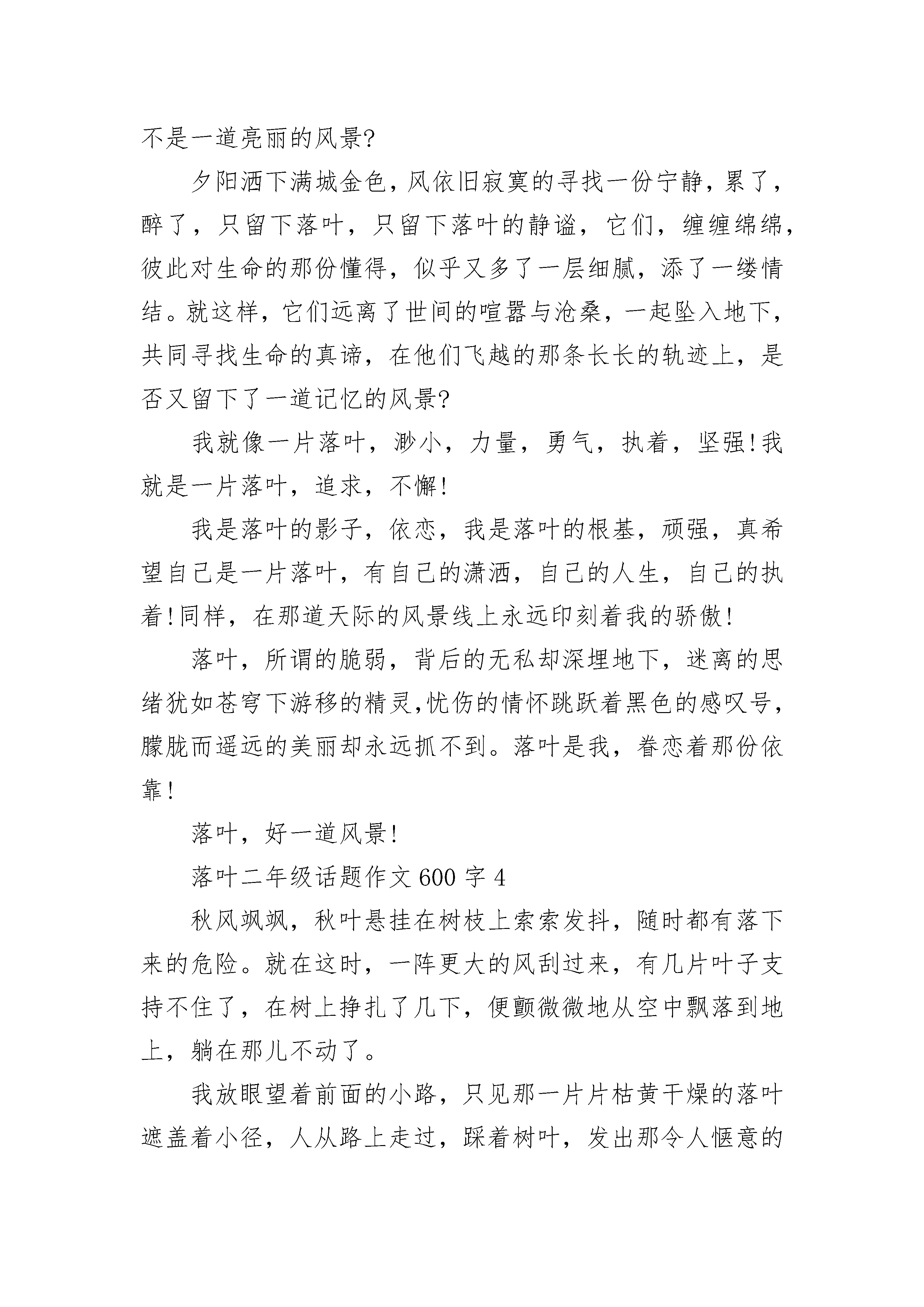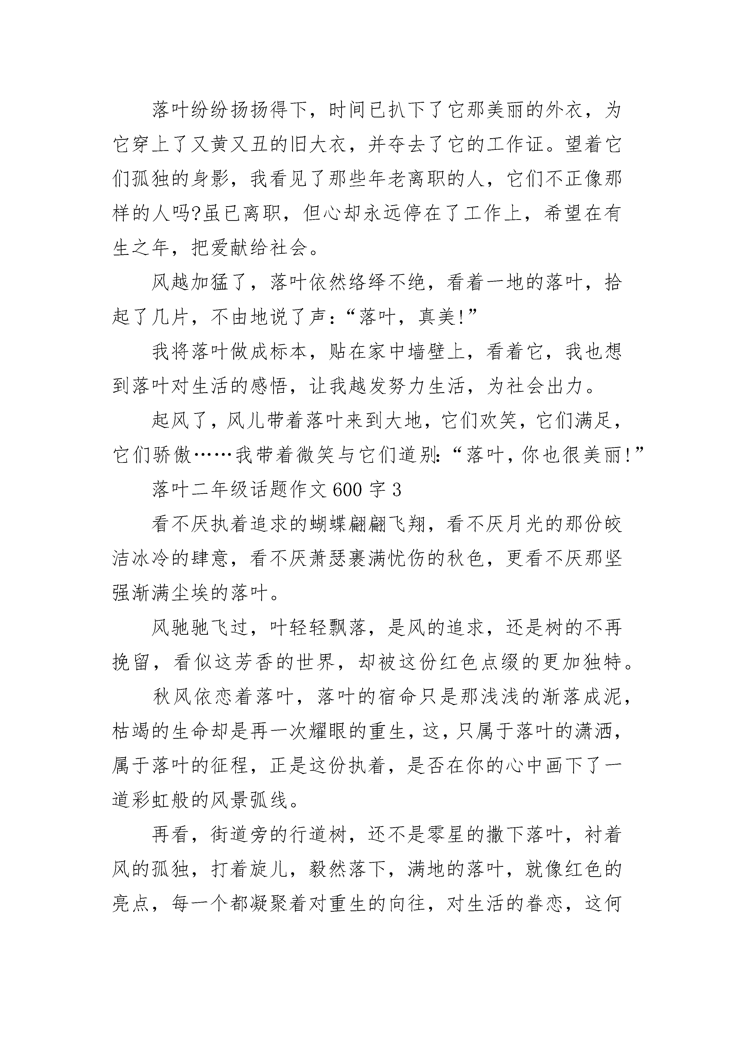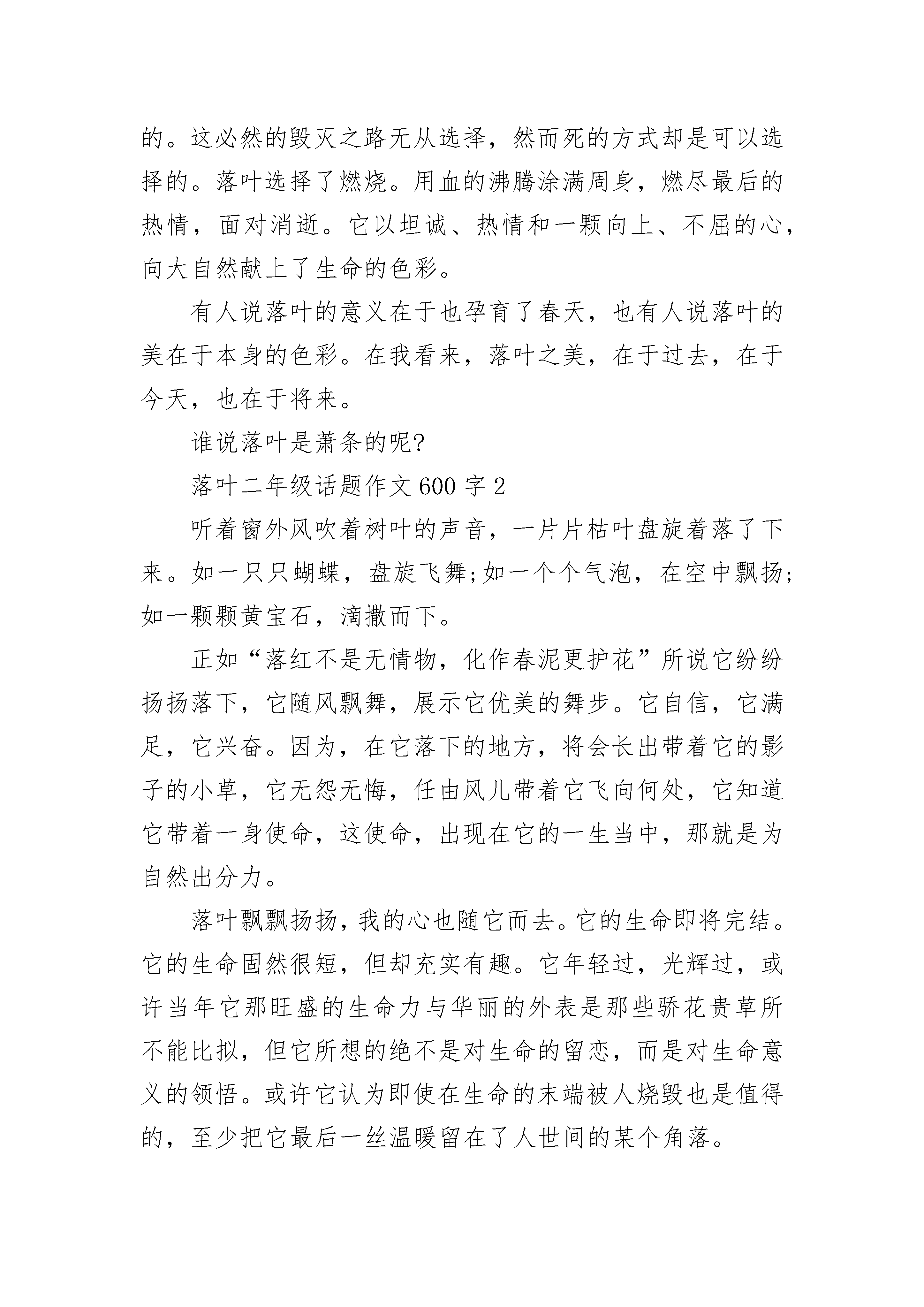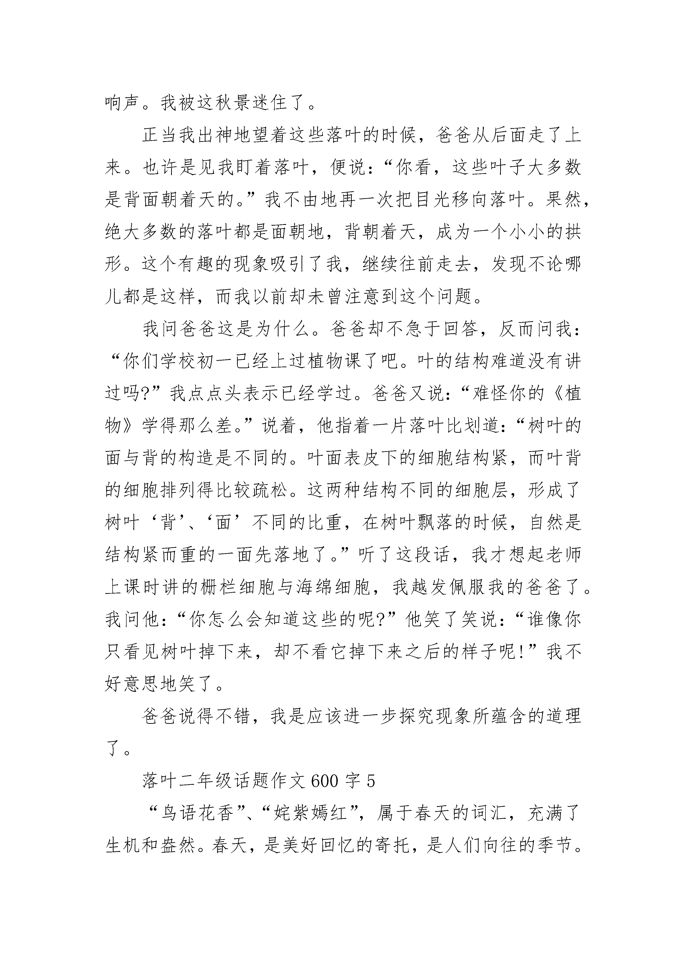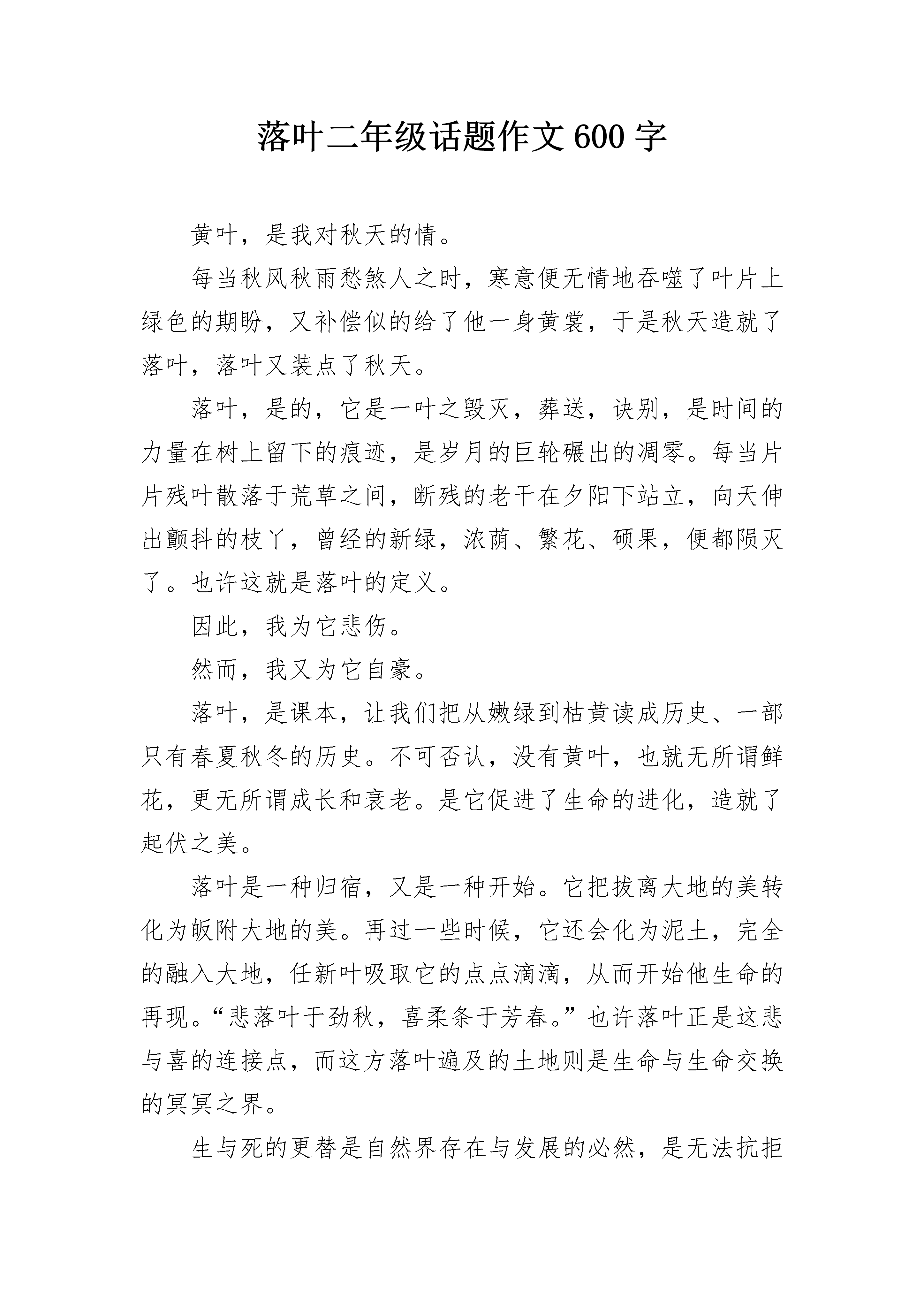 落叶二年级话题作文600字黄叶,是我对秋天的情。每当秋风秋雨愁煞人之时,寒意便无情地吞噬了叶片上绿色的期盼,又补偿似的给了他一身黄裳,于是秋天造就了落叶,落叶又装点了秋天。落叶,是的,它是一叶之毁灭,葬送,诀别,是时间的力量在树上留下的痕迹,是岁月的巨轮碾出的凋零。每当片片残叶散落于荒草之间,断残的老干在夕阳下站立,向天伸出颤抖的枝丫,曾经的新绿,浓荫、繁花、硕果,便都陨灭了。也许这就是落叶的定义。因此,我为它悲伤。然而,我又为它自豪。落叶,是课本,让我们把从嫩绿到枯黄读成历史、一部只有春夏秋冬的历史。不可否认,没有黄叶,也就无所谓鲜花,更无所谓成长和衰老。是它促进了生命的进化,造就了起伏之美。落叶是一种归宿,又是一种开始。它把拔离大地的美转化为皈附大地的美。再过一些时候,它还会化为泥土,完全的融入大地,任新叶吸取它的点点滴滴,从而开始他生命的再现。“悲落叶于劲秋,喜柔条于芳春。”也许落叶正是这悲与喜的连接点,而这方落叶遍及的土地则是生命与生命交换的冥冥之界。生与死的更替是自然界存在与发展的必然,是无法抗拒的。这必然的毁灭之路无从选择,然而死的方式却是可以选择的。落叶选择了燃烧。用血的沸腾涂满周身,燃尽最后的热情,面对消逝。它以坦诚、热情和一颗向上、不屈的心,向大自然献上了生命的色彩。有人说落叶的意义在于也孕育了春天,也有人说落叶的美在于本身的色彩。在我看来,落叶之美,在于过去,在于今天,也在于将来。谁说落叶是萧条的呢?落叶二年级话题作文600字2听着窗外风吹着树叶的声音,一片片枯叶盘旋着落了下来。如一只只蝴蝶,盘旋飞舞;如一个个气泡,在空中飘扬;如一颗颗黄宝石,滴撒而下。正如“落红不是无情物,化作春泥更护花”所说它纷纷扬扬落下,它随风飘舞,展示它优美的舞步。它自信,它满足,它兴奋。因为,在它落下的地方,将会长出带着它的影子的小草,它无怨无悔,任由风儿带着它飞向何处,它知道它带着一身使命,这使命,出现在它的一生当中,那就是为自然出分力。落叶飘飘扬扬,我的心也随它而去。它的生命即将完结。它的生命固然很短,但却充实有趣。它年轻过,光辉过,或许当年它那旺盛的生命力与华丽的外表是那些骄花贵草所不能比拟,但它所想的绝不是对生命的留恋,而是对生命意义的领悟。或许它认为即使在生命的末端被人烧毁也是值得的,至少把它最后一丝温暖留在了人世间的某个角落。落叶纷纷扬扬得下,时间已扒下了它那美丽的外衣,为它穿上了又黄又丑的旧大衣,并夺去了它的工作证。望着它们孤独的身影,我看见了那些年老离职的人,它们不正像那样的人吗?虽已离职,但心却永远停在了工作上,希望在有生之年,把爱献给社会。风越加猛了,落叶依然络绎不绝,看着一地的落叶,拾起了几片,不由地说了声:“落叶,真美!”我将落叶做成标本,贴在家中墙壁上,看着它,我也想到落叶对生活的感悟,让我越发努力生活,为社会出力。起风了,风儿带着落叶来到大地,它们欢笑,它们满足,它们骄傲……我带着微笑与它们道别:“落叶,你也很美丽!”落叶二年级话题作文600字3看不厌执着追求的蝴蝶翩翩飞翔,看不厌月光的那份皎洁冰冷的肆意,看不厌萧瑟裹满忧伤的秋色,更看不厌那坚强渐满尘埃的落叶。风驰驰飞过,叶轻轻飘落,是风的追求,还是树的不再挽留,看似这芳香的世界,却被这份红色点缀的更加独特。秋风依恋着落叶,落叶的宿命只是那浅浅的渐落成泥,枯竭的生命却是再一次耀眼的重生,这,只属于落叶的潇洒,属于落叶的征程,正是这份执着,是否在你的心中画下了一道彩虹般的风景弧线。再看,街道旁的行道树,还不是零星的撒下落叶,衬着风的孤独,打着旋儿,毅然落下,满地的落叶,就像红色的亮点,每一个都凝聚着对重生的向往,对生活的眷恋,这何不是一道亮丽的风景?夕阳洒下满城金色,风依旧寂寞的寻找一份宁静,累了,醉了,只留下落叶,只留下落叶的静谧,它们,缠缠绵绵,彼此对生命的那份懂得,似乎又多了一层细腻,添了一缕情结。就这样,它们远离了世间的喧嚣与沧桑,一起坠入地下,共同寻找生命的真谛,在他们飞越的那条长长的轨迹上,是否又留下了一道记忆的风景?我就像一片落叶,渺小,力量,勇气,执着,坚强!我就是一片落叶,追求,不懈!我是落叶的影子,依恋,我是落叶的根基,顽强,真希望自己是一片落叶,有自己的潇洒,自己的人生,自己的执着!同样,在那道天际的风景线上永远印刻着我的骄傲!落叶,所谓的脆弱,背后的无私却深埋地下,迷离的思绪犹如苍穹下游移的精灵,忧伤的情怀跳跃着黑色的感叹号,朦胧而遥远的美丽却永远抓不到。落叶是我,眷恋着那份依靠!落叶,好一道风景!落叶二年级话题作文600字4秋风飒飒,秋叶悬挂在树枝上索索发抖,随时都有落下来的危险。就在这时,一阵更大的风刮过来,有几片叶子支持不住了,在树上挣扎了几下,便颤微微地从空中飘落到地上,躺在那儿不动了。我放眼望着前面的小路,只见那一片