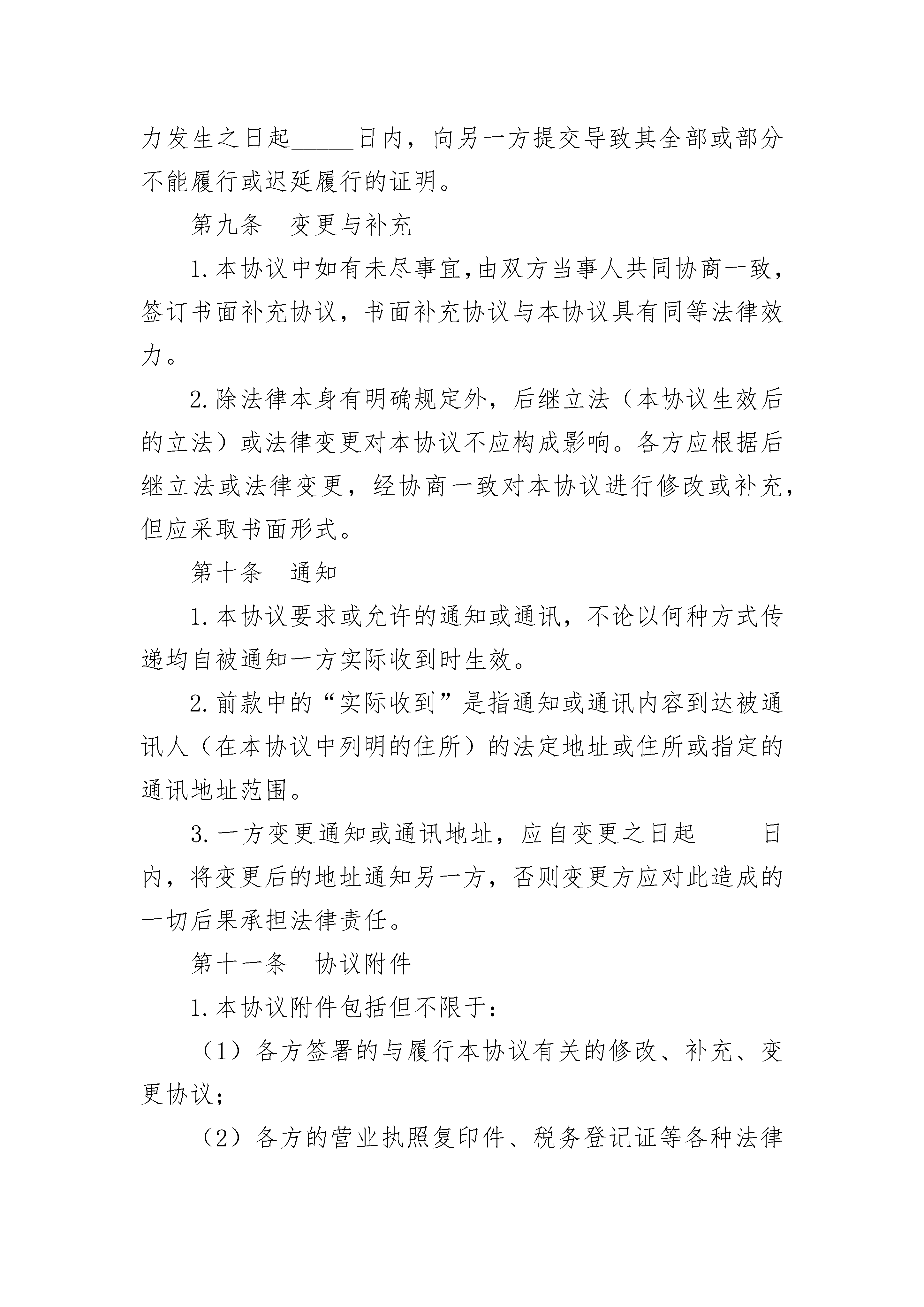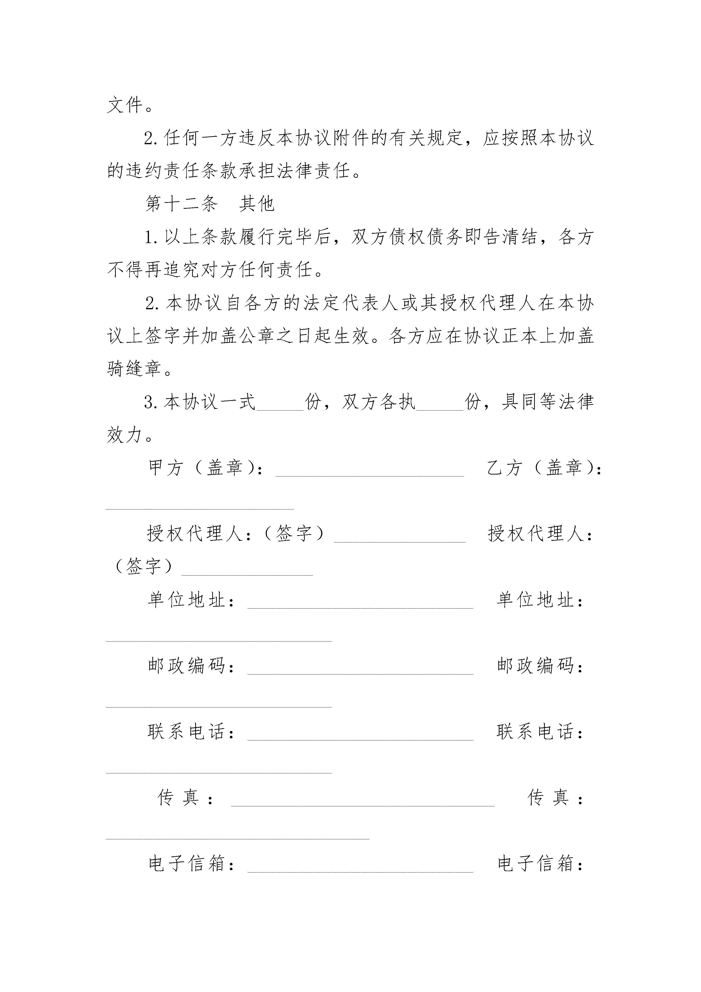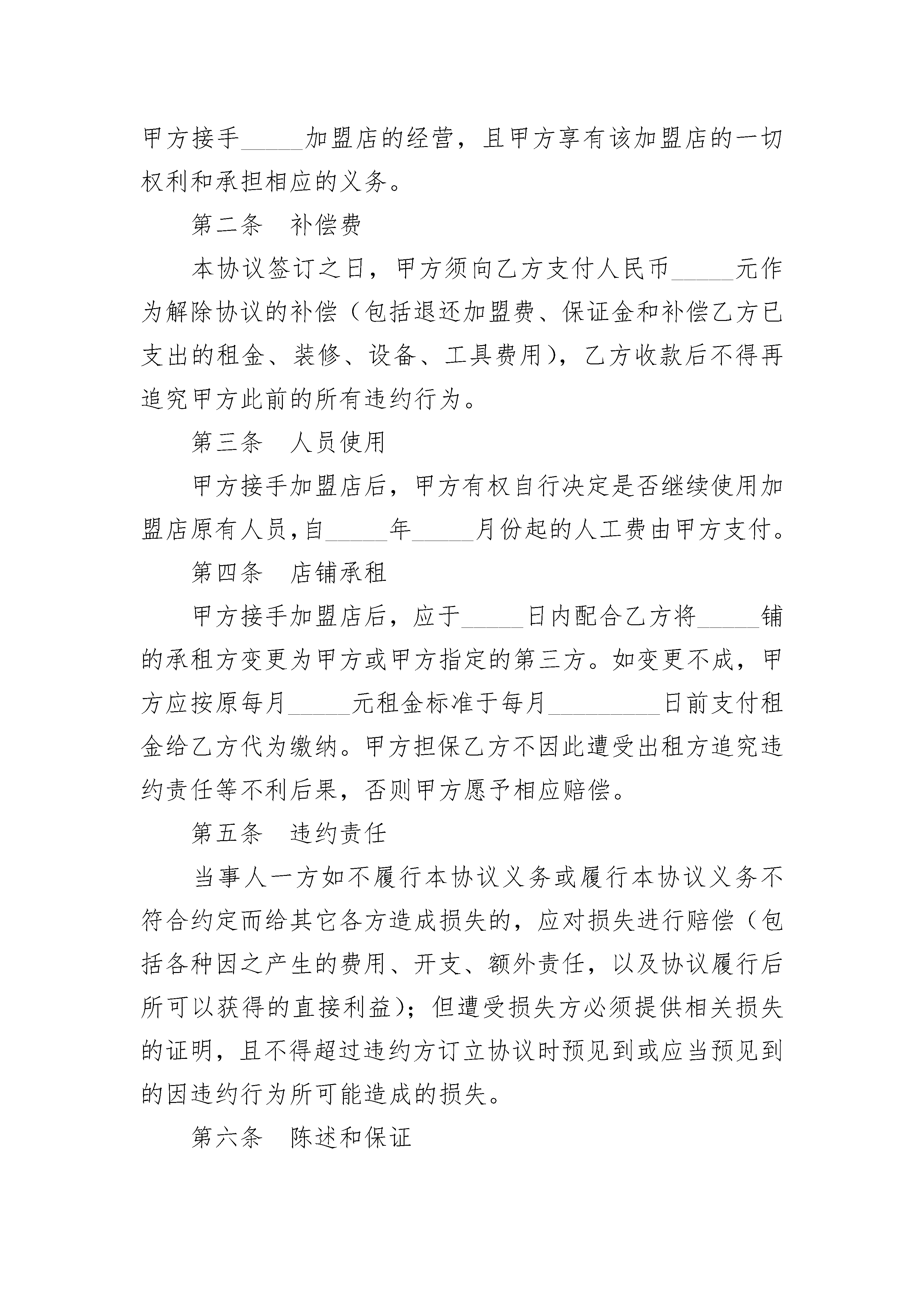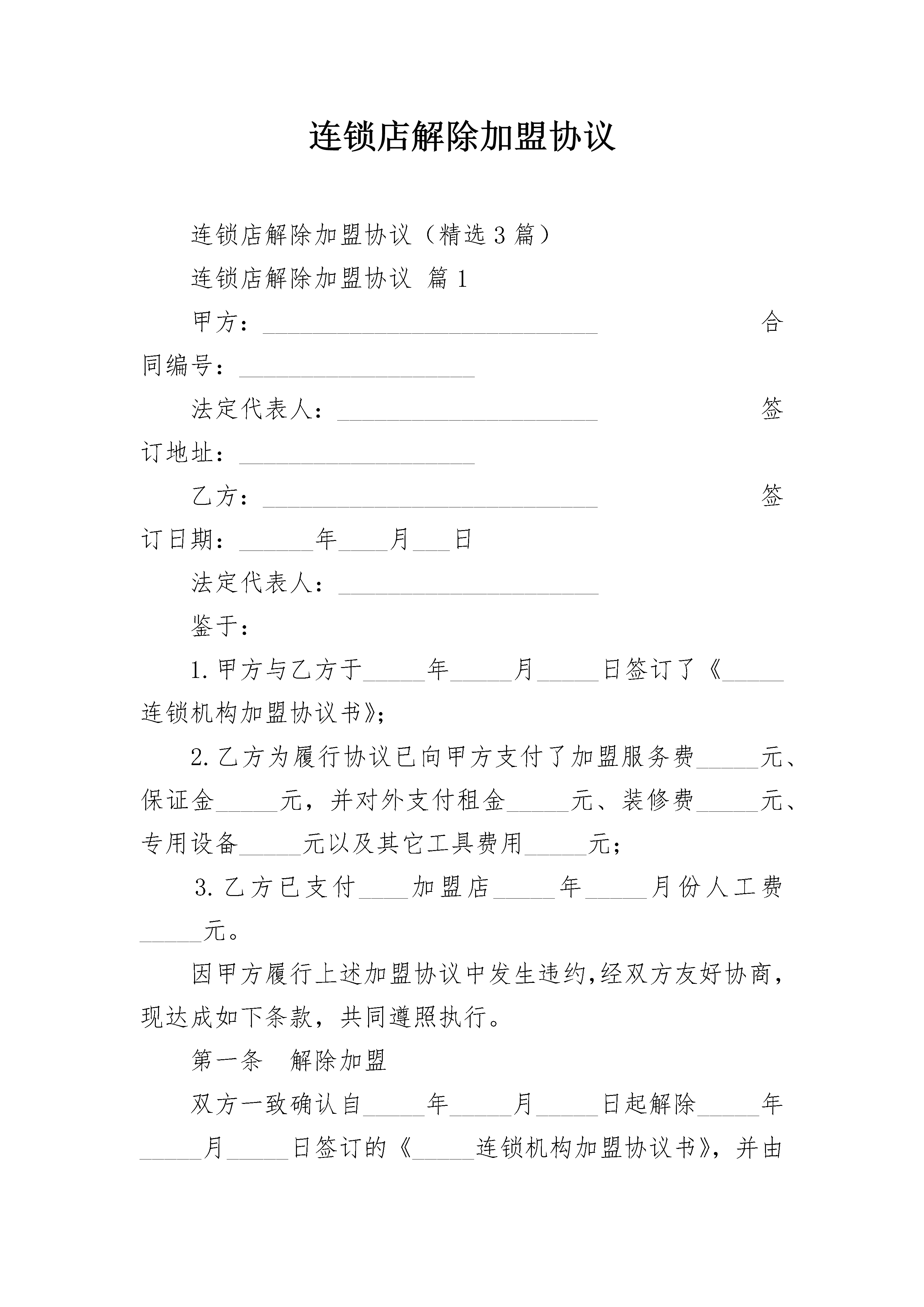 连锁店解除加盟协议连锁店解除加盟协议(精选3篇)连锁店解除加盟协议篇1甲方:___________________________合同编号:___________________法定代表人:_____________________签订地址:___________________乙方:___________________________签订日期:______年____月___日法定代表人:_____________________鉴于:1.甲方与乙方于_____年_____月_____日签订了《_____连锁机构加盟协议书》;2.乙方为履行协议已向甲方支付了加盟服务费_____元、保证金_____元,并对外支付租金_____元、装修费_____元、专用设备_____元以及其它工具费用_____元;3.乙方已支付____加盟店_____年_____月份人工费_____元。因甲方履行上述加盟协议中发生违约,经双方友好协商,现达成如下条款,共同遵照执行。第一条解除加盟双方一致确认自_____年_____月_____日起解除_____年_____月_____日签订的《_____连锁机构加盟协议书》,并由甲方接手_____加盟店的经营,且甲方享有该加盟店的一切权利和承担相应的义务。第二条补偿费本协议签订之日,甲方须向乙方支付人民币_____元作为解除协议的补偿(包括退还加盟费、保证金和补偿乙方已支出的租金、装修、设备、工具费用),乙方收款后不得再追究甲方此前的所有违约行为。第三条人员使用甲方接手加盟店后,甲方有权自行决定是否继续使用加盟店原有人员,自_____年_____月份起的人工费由甲方支付。第四条店铺承租甲方接手加盟店后,应于_____日内配合乙方将_____铺的承租方变更为甲方或甲方指定的第三方。如变更不成,甲方应按原每月_____元租金标准于每月_________日前支付租金给乙方代为缴纳。甲方担保乙方不因此遭受出租方追究违约责任等不利后果,否则甲方愿予相应赔偿。第五条违约责任当事人一方如不履行本协议义务或履行本协议义务不符合约定而给其它各方造成损失的,应对损失进行赔偿(包括各种因之产生的费用、开支、额外责任,以及协议履行后所可以获得的直接利益);但遭受损失方必须提供相关损失的证明,且不得超过违约方订立协议时预见到或应当预见到的因违约行为所可能造成的损失。第六条陈述和保证1.甲方向乙方陈述和保证如下:(1)其是一家依法设立并有效存续的有限责任公司;(2)其有权进行本协议规定的交易,并已采取所有必要的公司行为授权签订和履行本协议;(3)本协议自签定之日起对其构成有约束力的义务。2.乙方向甲方陈述和保证如下:(1)其是一家依法设立并有效存续的有限责任公司;(2)其有权进行本协议规定的交易,并已采取所有必要的公司行为授权签订和履行本协议;(3)本协议自签定之日起对其构成有约束力的义务。第七条争议的解决1.本协议适用中华人民共和国有关法律,受中华人民共和国法律管辖。2.本协议各方当事人对本协议有关条款的解释或履行发生争议时,应通过友好协商的方式予以解决。当和解或调解不成时,选择下列第____种方式解决:(1)将争议提交____仲裁委员会仲裁;(2)依法向____人民法院提起诉讼。第八条不可抗力1.在本协议履行过程中,如因不可抗力导致活动终止或带来损失,甲乙双方各自承担自己损失,互不承担违约责任。2.任何一方因遇到不可抗力致使全部或部分不能履行或迟延履行本协议的,应自不可抗力事件发生之日起_____日内,将不可抗力情况以书面形式通知另一方,并自不可抗力发生之日起_____日内,向另一方提交导致其全部或部分不能履行或迟延履行的证明。第九条变更与补充1.本协议中如有未尽事宜,由双方当事人共同协商一致,签订书面补充协议,书面补充协议与本协议具有同等法律效力。2.除法律本身有明确规定外,后继立法(本协议生效后的立法)或法律变更对本协议不应构成影响。各方应根据后继立法或法律变更,经协商一致对本协议进行修改或补充,但应采取书面形式。第十条通知1.本协议要求或允许的通知或通讯,不论以何种方式传递均自被通知一方实际收到时生效。2.前款中的“实际收到”是指通知或通讯内容到达被通讯人(在本协议中列明的住所)的法定地址或住所或指定的通讯地址范围。3.一方变更通知或通讯地址,应自变更之日起_____日内,将变更后的地址通知另一方,否则变更方应对此造成的一切后果承担法律责任。第十一条协议附件1.本协议附件包括但不限于:(1)各方签署的与履行本协议有关的修改、补充、变更协议;(2)各方的营业执照复印件、税务登记证等各种法律文件。2.任何一方违反本协议附件的有关规定,应按照本协议的违约责任条款承担法律责任。第十二条其他1.以上条款履行完毕后,双方债权债务即告清