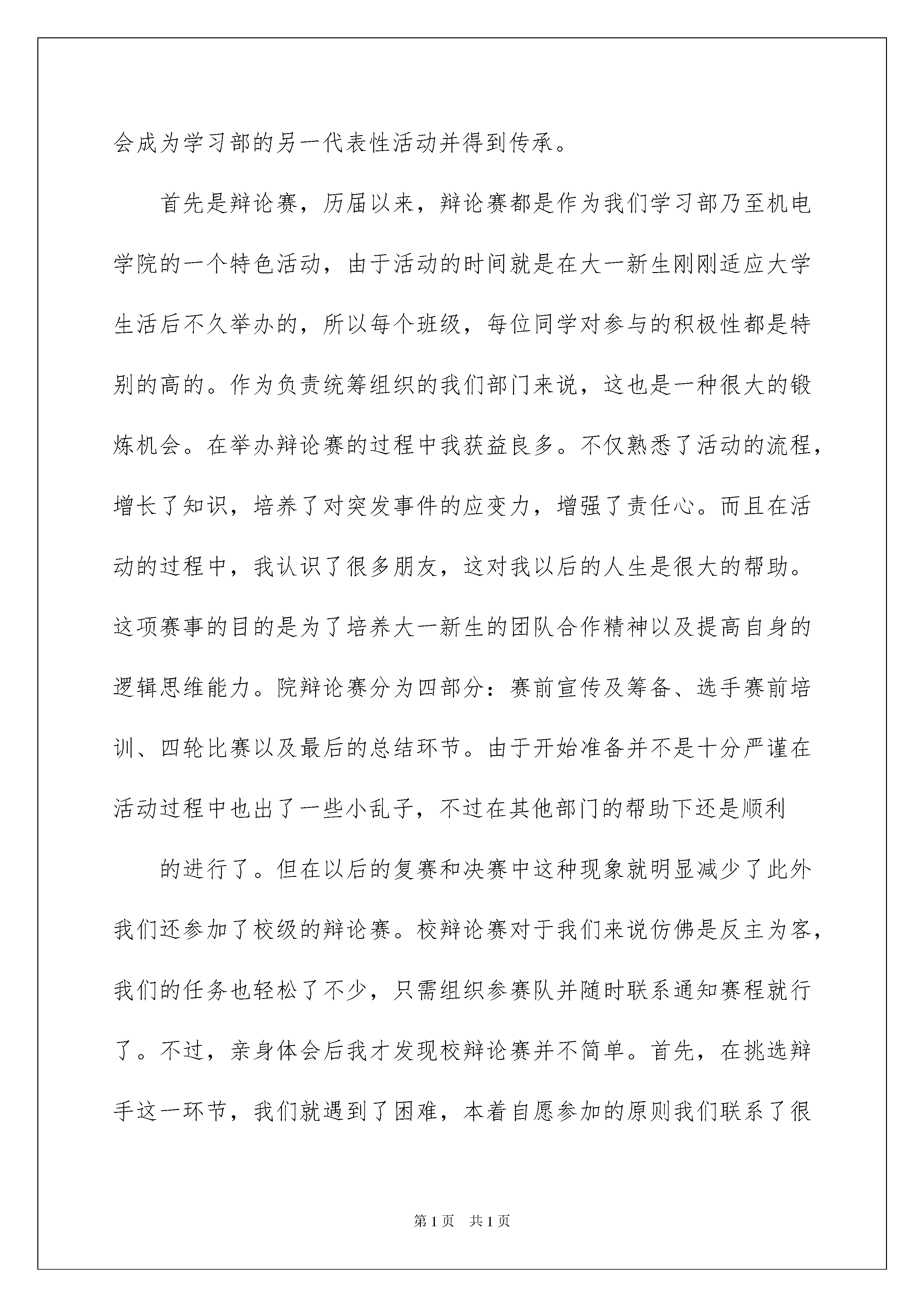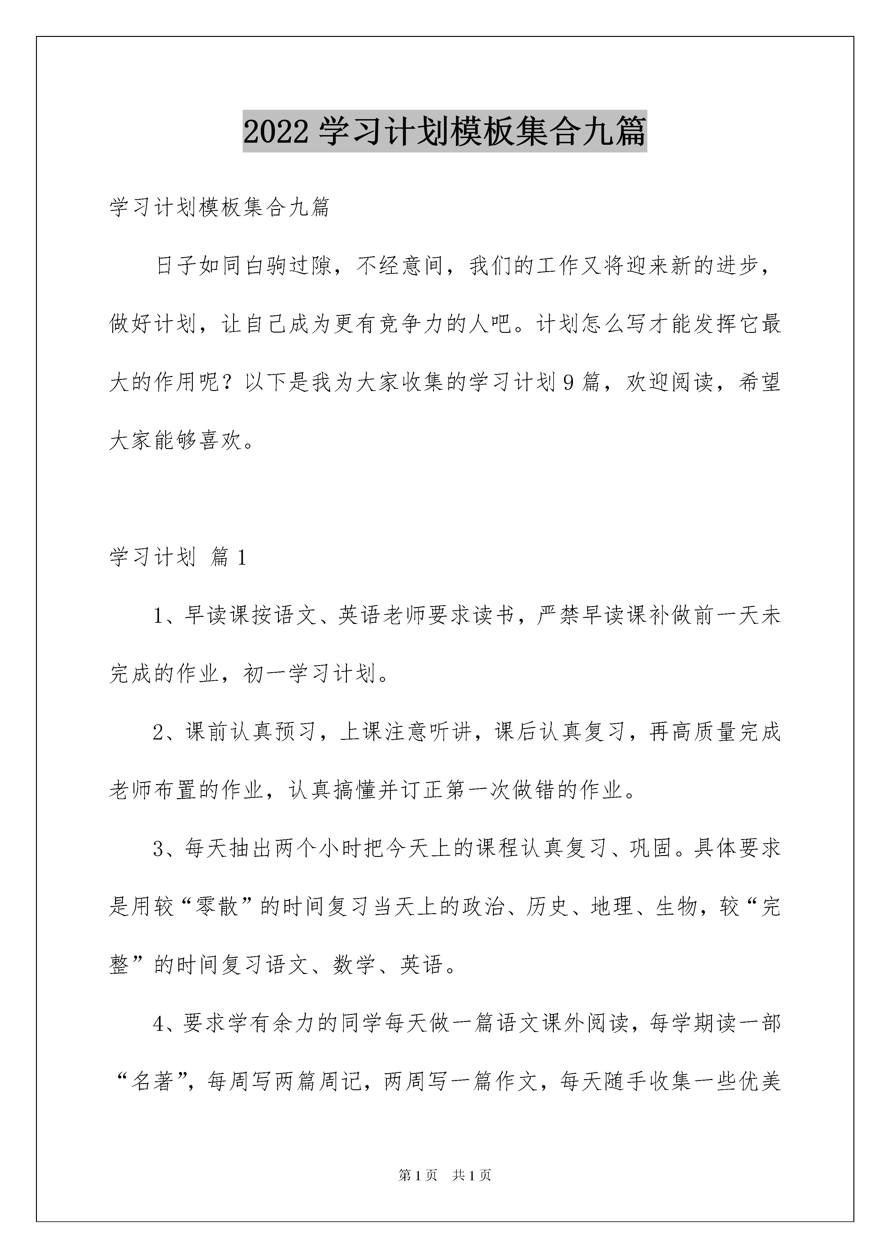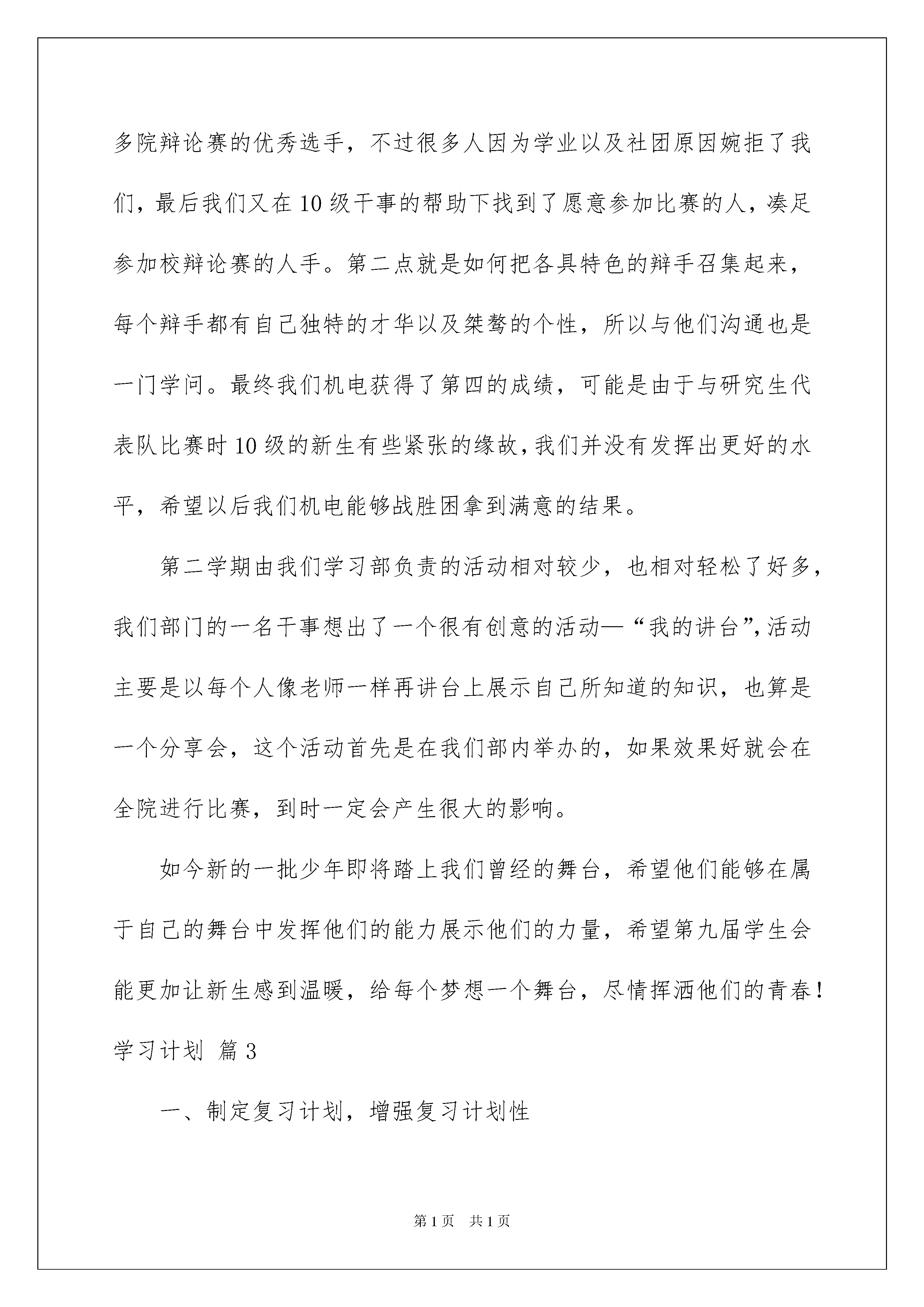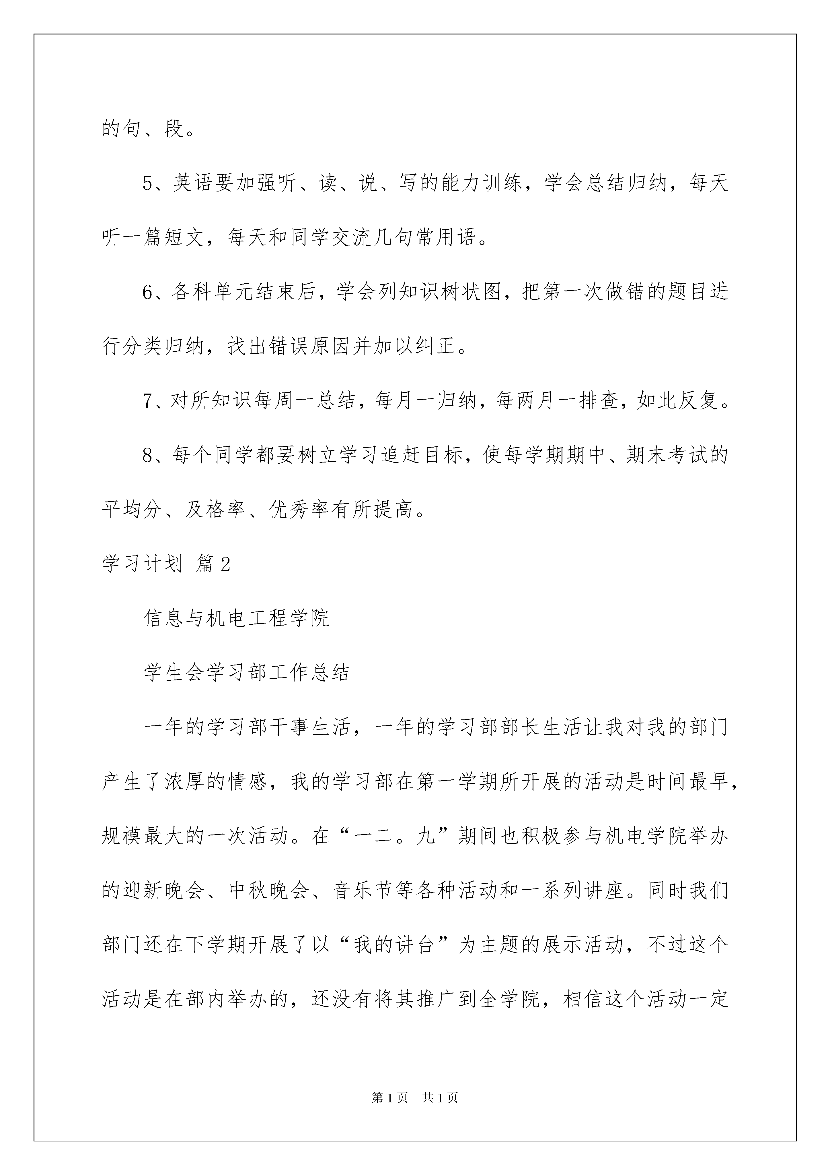 2022学习计划模板集合九篇学习计划模板集合九篇日子如同白驹过隙,不经意间,我们的工作又将迎来新的进步,做好计划,让自己成为更有竞争力的人吧。计划怎么写才能发挥它最大的作用呢?以下是我为大家收集的学习计划9篇,欢迎阅读,希望大家能够喜欢。学习计划篇11、早读课按语文、英语老师要求读书,严禁早读课补做前一天未完成的作业,初一学习计划。2、课前认真预习,上课注意听讲,课后认真复习,再高质量完成老师布置的作业,认真搞懂并订正第一次做错的作业。3、每天抽出两个小时把今天上的课程认真复习、巩固。具体要求是用较“零散”的时间复习当天上的政治、历史、地理、生物,较“完整”的时间复习语文、数学、英语。4、要求学有余力的同学每天做一篇语文课外阅读,每学期读一部“名著”,每周写两篇周记,两周写一篇作文,每天随手收集一些优美的句、段。5、英语要加强听、读、说、写的能力训练,学会总结归纳,每天听一篇短文,每天和同学交流几句常用语。6、各科单元结束后,学会列知识树状图,把第一次做错的题目进行分类归纳,找出错误原因并加以纠正。7、对所知识每周一总结,每月一归纳,每两月一排查,如此反复。8、每个同学都要树立学习追赶目标,使每学期期中、期末考试的平均分、及格率、优秀率有所提高。学习计划篇2信息与机电工程学院学生会学习部工作总结一年的学习部干事生活,一年的学习部部长生活让我对我的部门产生了浓厚的情感,我的学习部在第一学期所开展的活动是时间最早,规模最大的一次活动。在“一二。九”期间也积极参与机电学院举办的迎新晚会、中秋晚会、音乐节等各种活动和一系列讲座。同时我们部门还在下学期开展了以“我的讲台”为主题的展示活动,不过这个活动是在部内举办的,还没有将其推广到全学院,相信这个活动一定会成为学习部的另一代表性活动并得到传承。首先是辩论赛,历届以来,辩论赛都是作为我们学习部乃至机电学院的一个特色活动,由于活动的时间就是在大一新生刚刚适应大学生活后不久举办的,所以每个班级,每位同学对参与的积极性都是特别的高的。作为负责统筹组织的我们部门来说,这也是一种很大的锻炼机会。在举办辩论赛的过程中我获益良多。不仅熟悉了活动的流程,增长了知识,培养了对突发事件的应变力,增强了责任心。而且在活动的过程中,我认识了很多朋友,这对我以后的人生是很大的帮助。这项赛事的目的是为了培养大一新生的团队合作精神以及提高自身的逻辑思维能力。院辩论赛分为四部分:赛前宣传及筹备、选手赛前培训、四轮比赛以及最后的总结环节。由于开始准备并不是十分严谨在活动过程中也出了一些小乱子,不过在其他部门的帮助下还是顺利的进行了。但在以后的复赛和决赛中这种现象就明显减少了此外我们还参加了校级的辩论赛。校辩论赛对于我们来说仿佛是反主为客,我们的任务也轻松了不少,只需组织参赛队并随时联系通知赛程就行了。不过,亲身体会后我才发现校辩论赛并不简单。首先,在挑选辩手这一环节,我们就遇到了困难,本着自愿参加的原则我们联系了很多院辩论赛的优秀选手,不过很多人因为学业以及社团原因婉拒了我们,最后我们又在10级干事的帮助下找到了愿意参加比赛的人,凑足参加校辩论赛的人手。第二点就是如何把各具特色的辩手召集起来,每个辩手都有自己独特的才华以及桀骜的个性,所以与他们沟通也是一门学问。最终我们机电获得了第四的成绩,可能是由于与研究生代表队比赛时10级的新生有些紧张的缘故,我们并没有发挥出更好的水平,希望以后我们机电能够战胜困拿到满意的结果。第二学期由我们学习部负责的活动相对较少,也相对轻松了好多,我们部门的一名干事想出了一个很有创意的活动—“我的讲台”,活动主要是以每个人像老师一样再讲台上展示自己所知道的知识,也算是一个分享会,这个活动首先是在我们部内举办的,如果效果好就会在全院进行比赛,到时一定会产生很大的影响。如今新的一批少年即将踏上我们曾经的舞台,希望他们能够在属于自己的舞台中发挥他们的能力展示他们的力量,希望第九届学生会能更加让新生感到温暖,给每个梦想一个舞台,尽情挥洒他们的青春!学习计划篇3一、制定复习计划,增强复习计划性“工欲善其事,必先利其器”。意思是说无论做什么事,都要事先做好准备。期末复习是期末考试取得好成绩的有力保证,每位学生应在思想上高度重视,不能马虎应付,你在制定复习阶段计划时必须弄清以下几个问题:复习时间、考试内容、考试时间,然后制定自己的复习计划和每天学习时间安排,以便在有限的时间内复习完全部复习内容,增强复习的计划性,每天对计划完成情况进行简单的检查分析,落实复习计划,确保复习的质量。二、讲究复习方法,提高复习效率1、扎实基础知识,落实基本技能。在自己主动复习