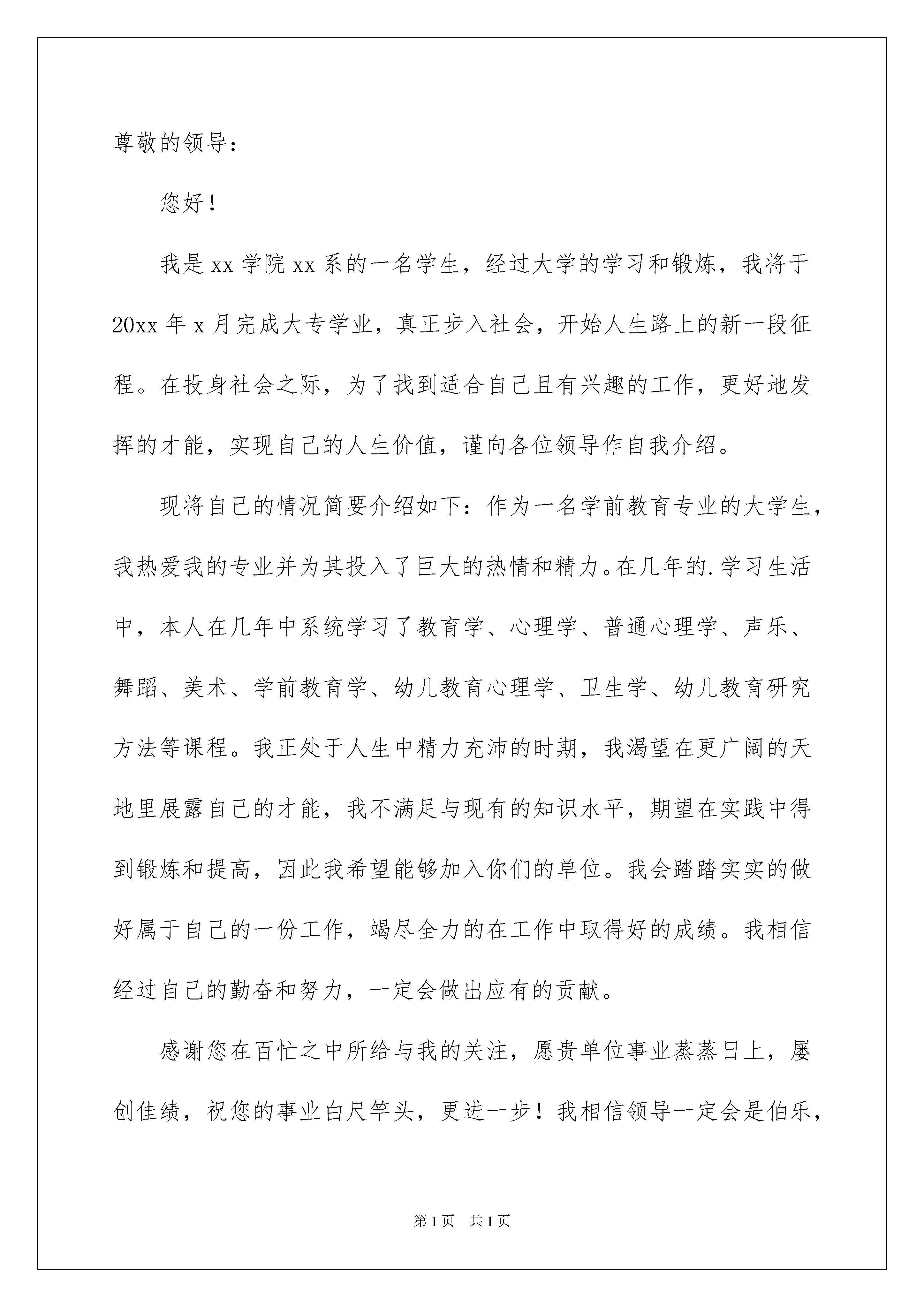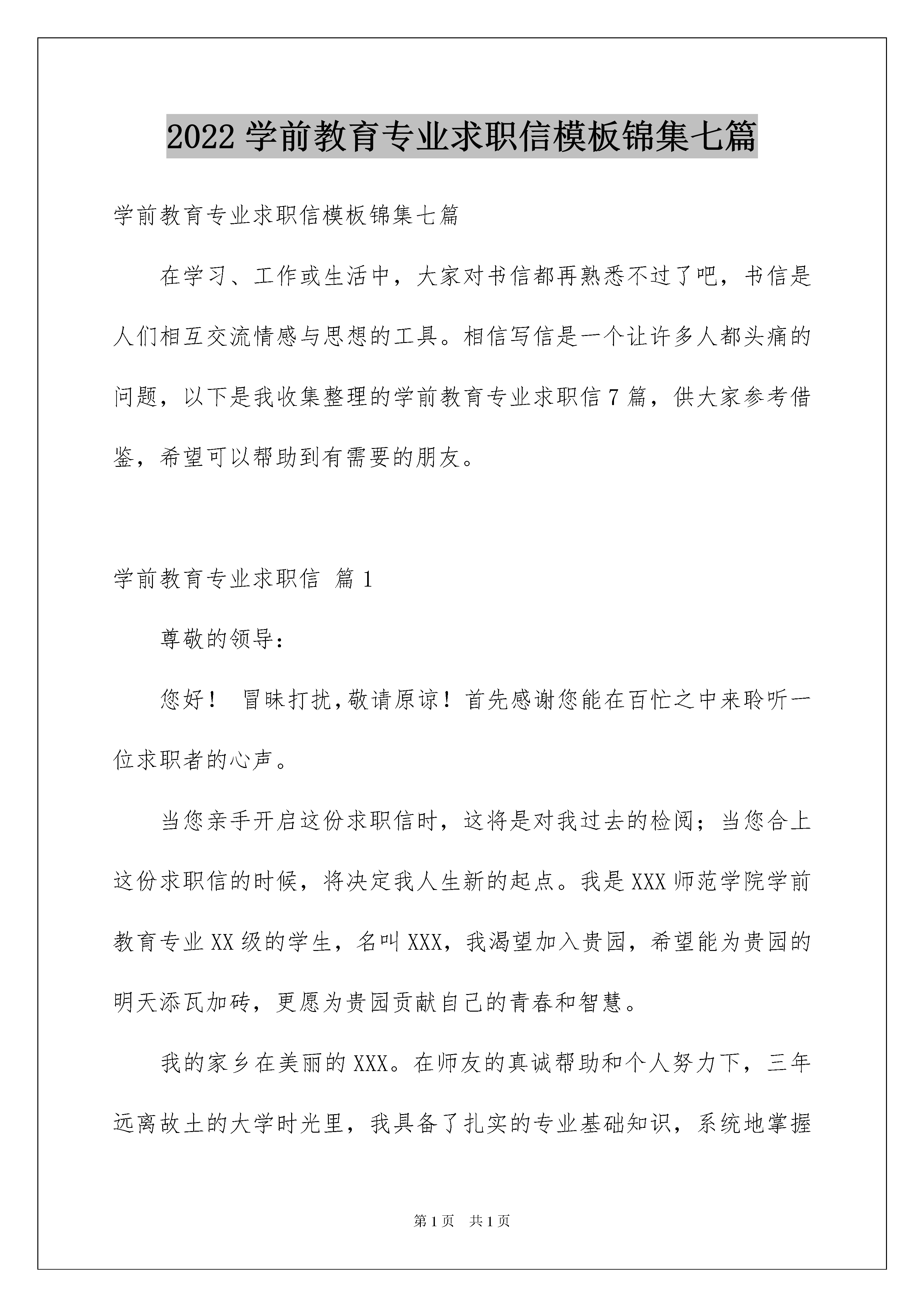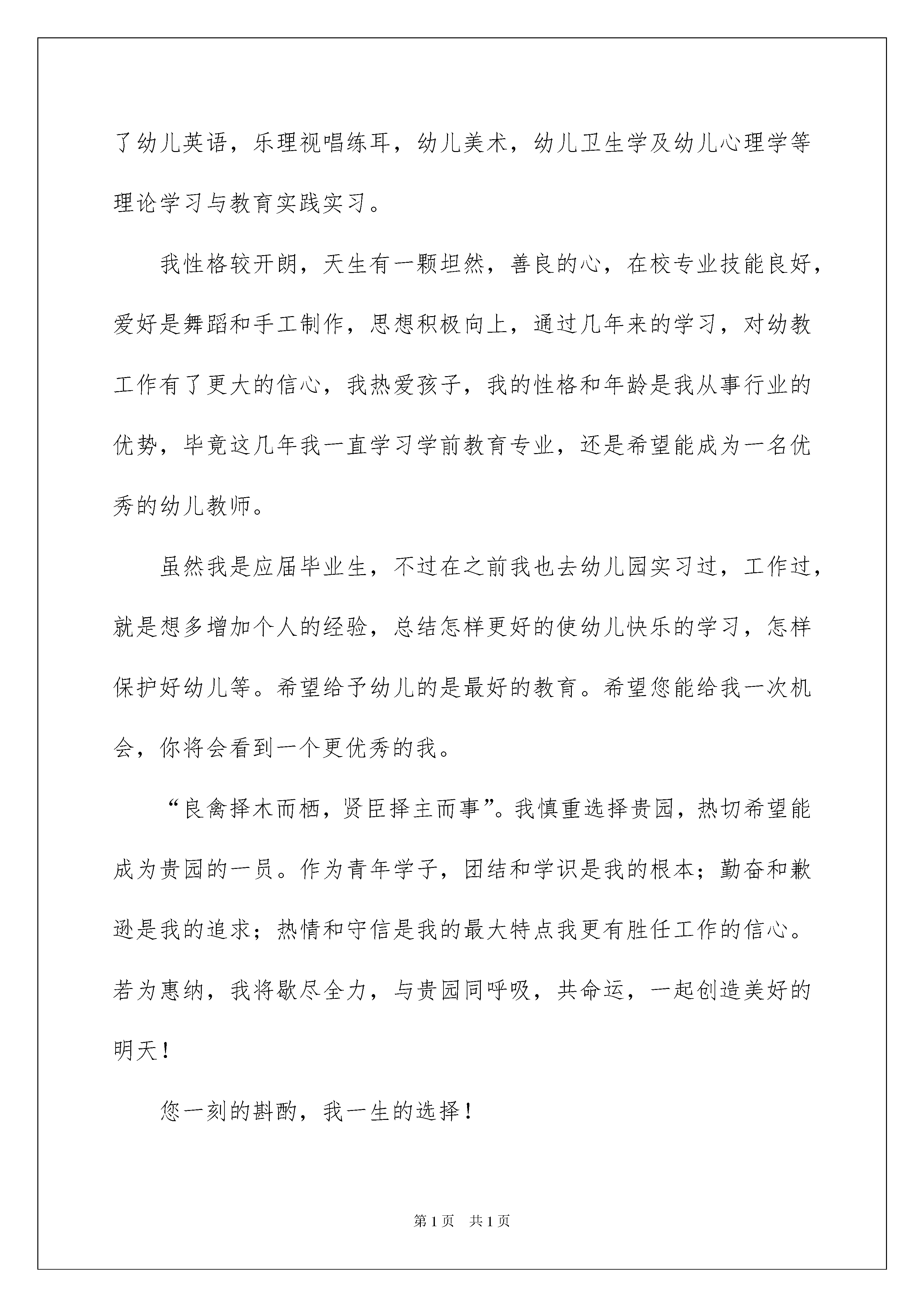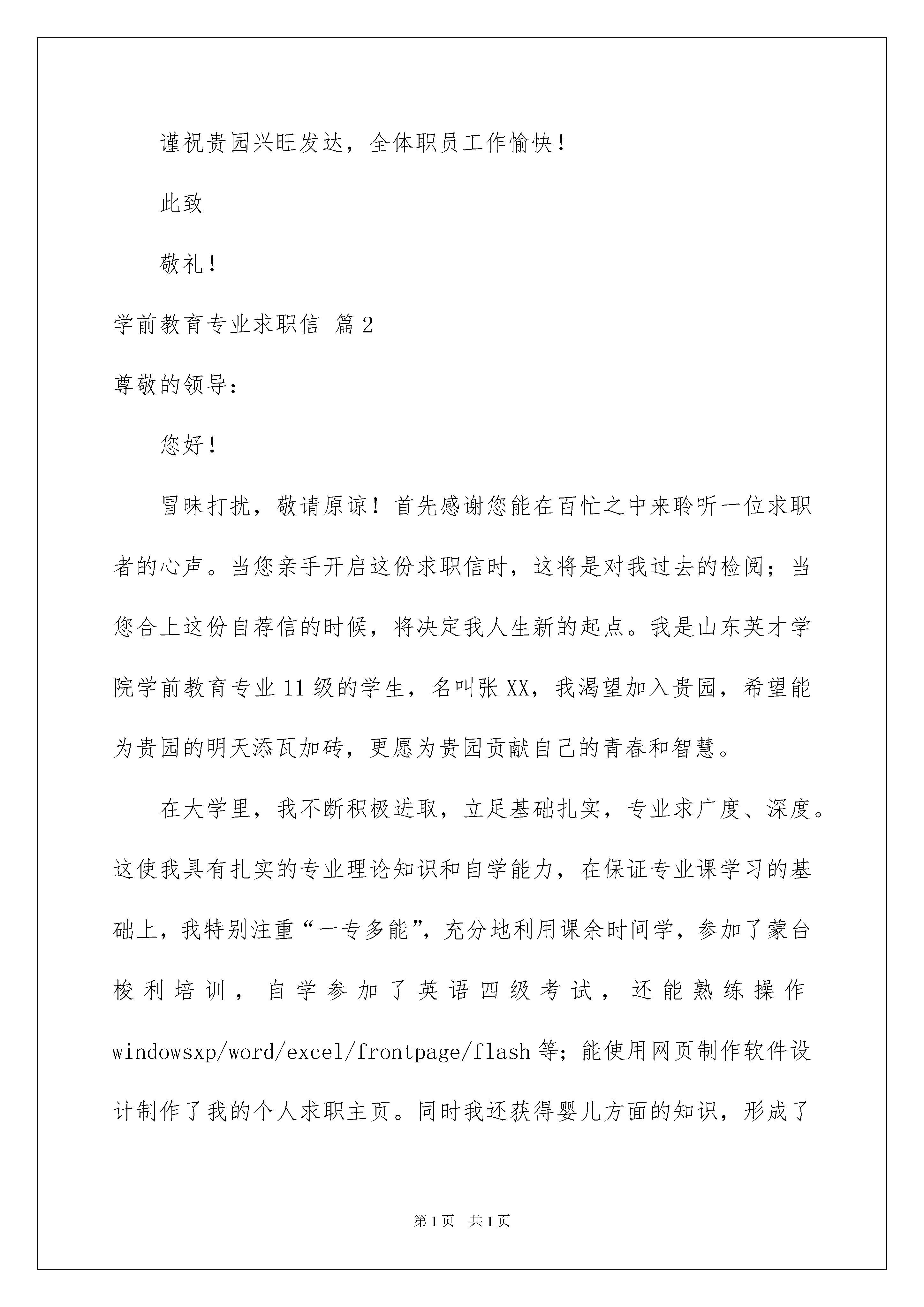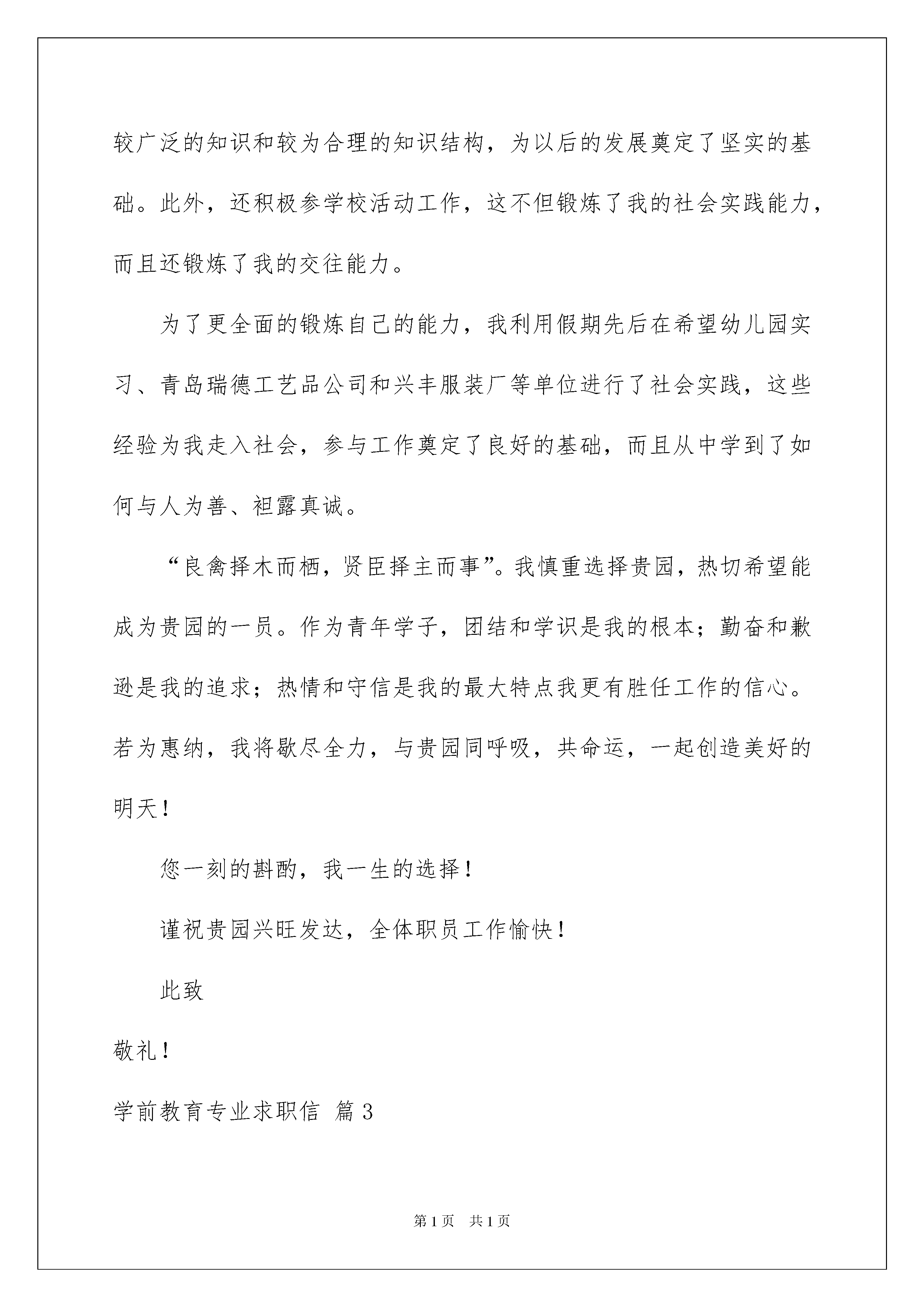 2022学前教育专业求职信模板锦集七篇学前教育专业求职信模板锦集七篇在学习、工作或生活中,大家对书信都再熟悉不过了吧,书信是人们相互交流情感与思想的工具。相信写信是一个让许多人都头痛的问题,以下是我收集整理的学前教育专业求职信7篇,供大家参考借鉴,希望可以帮助到有需要的朋友。学前教育专业求职信篇1尊敬的领导:您好!冒昧打扰,敬请原谅!首先感谢您能在百忙之中来聆听一位求职者的心声。当您亲手开启这份求职信时,这将是对我过去的检阅;当您合上这份求职信的时候,将决定我人生新的起点。我是XXX师范学院学前教育专业XX级的学生,名叫XXX,我渴望加入贵园,希望能为贵园的明天添瓦加砖,更愿为贵园贡献自己的青春和智慧。我的家乡在美丽的XXX。在师友的真诚帮助和个人努力下,三年远离故土的大学时光里,我具备了扎实的专业基础知识,系统地掌握了幼儿英语,乐理视唱练耳,幼儿美术,幼儿卫生学及幼儿心理学等理论学习与教育实践实习。我性格较开朗,天生有一颗坦然,善良的心,在校专业技能良好,爱好是舞蹈和手工制作,思想积极向上,通过几年来的学习,对幼教工作有了更大的信心,我热爱孩子,我的性格和年龄是我从事行业的优势,毕竟这几年我一直学习学前教育专业,还是希望能成为一名优秀的幼儿教师。虽然我是应届毕业生,不过在之前我也去幼儿园实习过,工作过,就是想多增加个人的经验,总结怎样更好的使幼儿快乐的学习,怎样保护好幼儿等。希望给予幼儿的是最好的教育。希望您能给我一次机会,你将会看到一个更优秀的我。“良禽择木而栖,贤臣择主而事”。我慎重选择贵园,热切希望能成为贵园的一员。作为青年学子,团结和学识是我的根本;勤奋和歉逊是我的追求;热情和守信是我的最大特点我更有胜任工作的信心。若为惠纳,我将歇尽全力,与贵园同呼吸,共命运,一起创造美好的明天!您一刻的斟酌,我一生的选择!谨祝贵园兴旺发达,全体职员工作愉快!此致敬礼!学前教育专业求职信篇2尊敬的领导:您好!冒昧打扰,敬请原谅!首先感谢您能在百忙之中来聆听一位求职者的心声。当您亲手开启这份求职信时,这将是对我过去的检阅;当您合上这份自荐信的时候,将决定我人生新的起点。我是山东英才学院学前教育专业11级的学生,名叫张XX,我渴望加入贵园,希望能为贵园的明天添瓦加砖,更愿为贵园贡献自己的青春和智慧。在大学里,我不断积极进取,立足基础扎实,专业求广度、深度。这使我具有扎实的专业理论知识和自学能力,在保证专业课学习的基础上,我特别注重“一专多能”,充分地利用课余时间学,参加了蒙台梭利培训,自学参加了英语四级考试,还能熟练操作windowsxp/word/excel/frontpage/flash等;能使用网页制作软件设计制作了我的个人求职主页。同时我还获得婴儿方面的知识,形成了较广泛的知识和较为合理的知识结构,为以后的发展奠定了坚实的基础。此外,还积极参学校活动工作,这不但锻炼了我的社会实践能力,而且还锻炼了我的交往能力。为了更全面的锻炼自己的能力,我利用假期先后在希望幼儿园实习、青岛瑞德工艺品公司和兴丰服装厂等单位进行了社会实践,这些经验为我走入社会,参与工作奠定了良好的基础,而且从中学到了如何与人为善、袒露真诚。“良禽择木而栖,贤臣择主而事”。我慎重选择贵园,热切希望能成为贵园的一员。作为青年学子,团结和学识是我的根本;勤奋和歉逊是我的追求;热情和守信是我的最大特点我更有胜任工作的信心。若为惠纳,我将歇尽全力,与贵园同呼吸,共命运,一起创造美好的明天!您一刻的斟酌,我一生的选择!谨祝贵园兴旺发达,全体职员工作愉快!此致敬礼!学前教育专业求职信篇3尊敬的领导:您好!我是xx学院xx系的一名学生,经过大学的学习和锻炼,我将于20xx年x月完成大专学业,真正步入社会,开始人生路上的新一段征程。在投身社会之际,为了找到适合自己且有兴趣的工作,更好地发挥的才能,实现自己的人生价值,谨向各位领导作自我介绍。现将自己的情况简要介绍如下:作为一名学前教育专业的大学生,我热爱我的专业并为其投入了巨大的热情和精力。在几年的.学习生活中,本人在几年中系统学习了教育学、心理学、普通心理学、声乐、舞蹈、美术、学前教育学、幼儿教育心理学、卫生学、幼儿教育研究方法等课程。我正处于人生中精力充沛的时期,我渴望在更广阔的天地里展露自己的才能,我不满足与现有的知识水平,期望在实践中得到锻炼和提高,因此我希望能够加入你们的单位。我会踏踏实实的做好属于自己的一份工作,竭尽全力的在工作中取得好的成绩。我相信经过自己的勤奋和努力,一定会做出应有的贡献。感谢您在百忙之中所给与我的关注,愿贵单位事业蒸蒸日上,屡创佳绩,祝您的事业