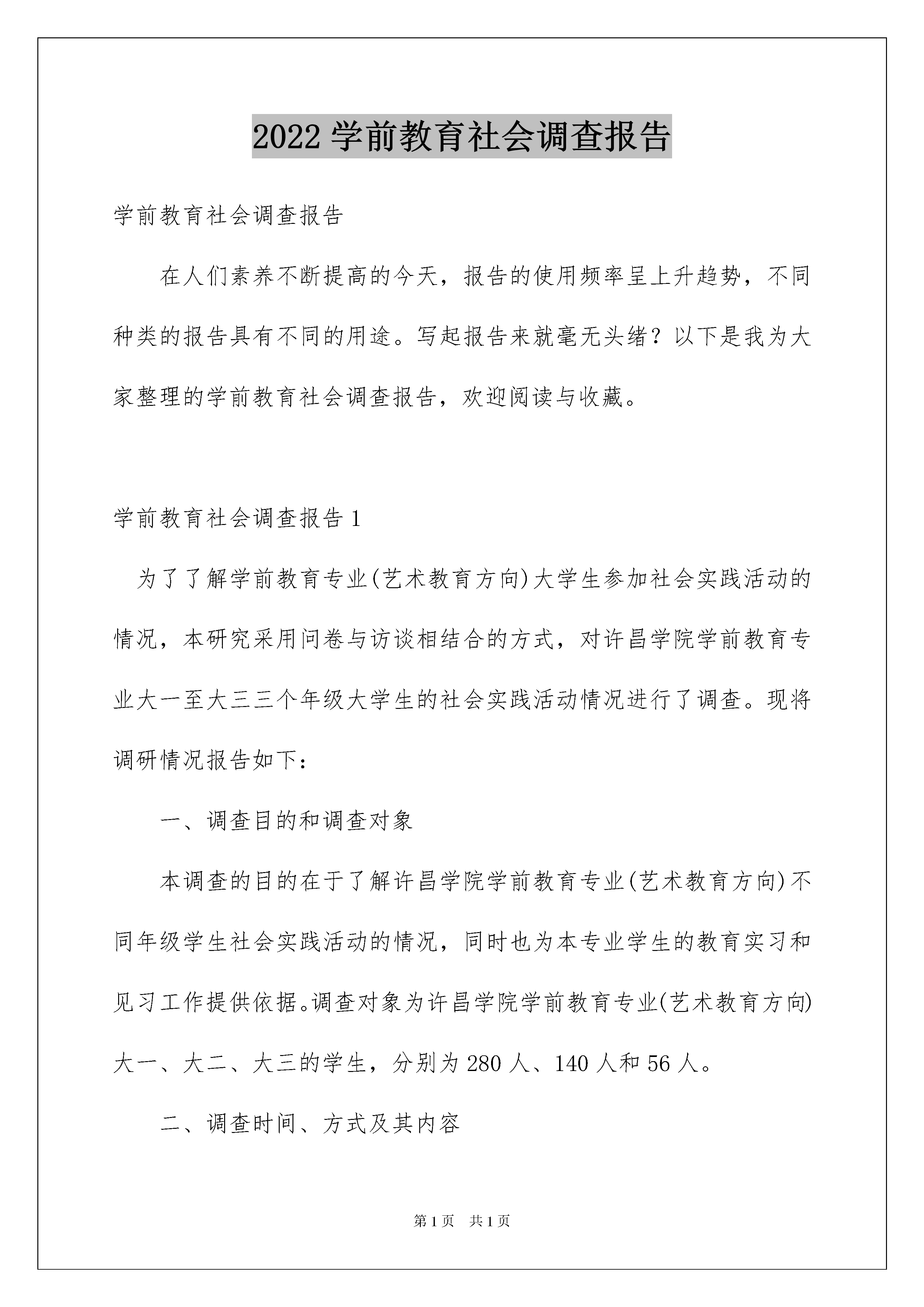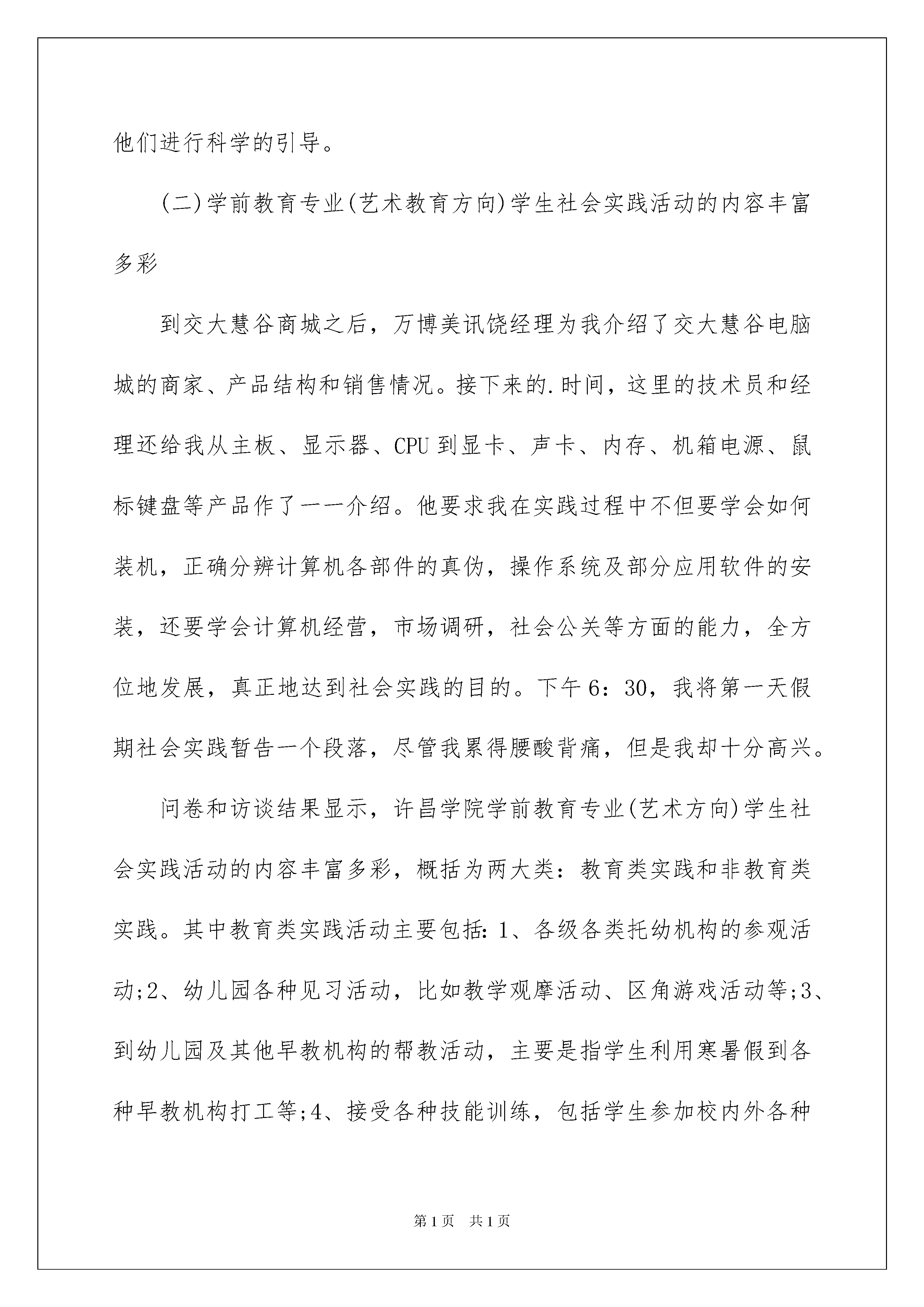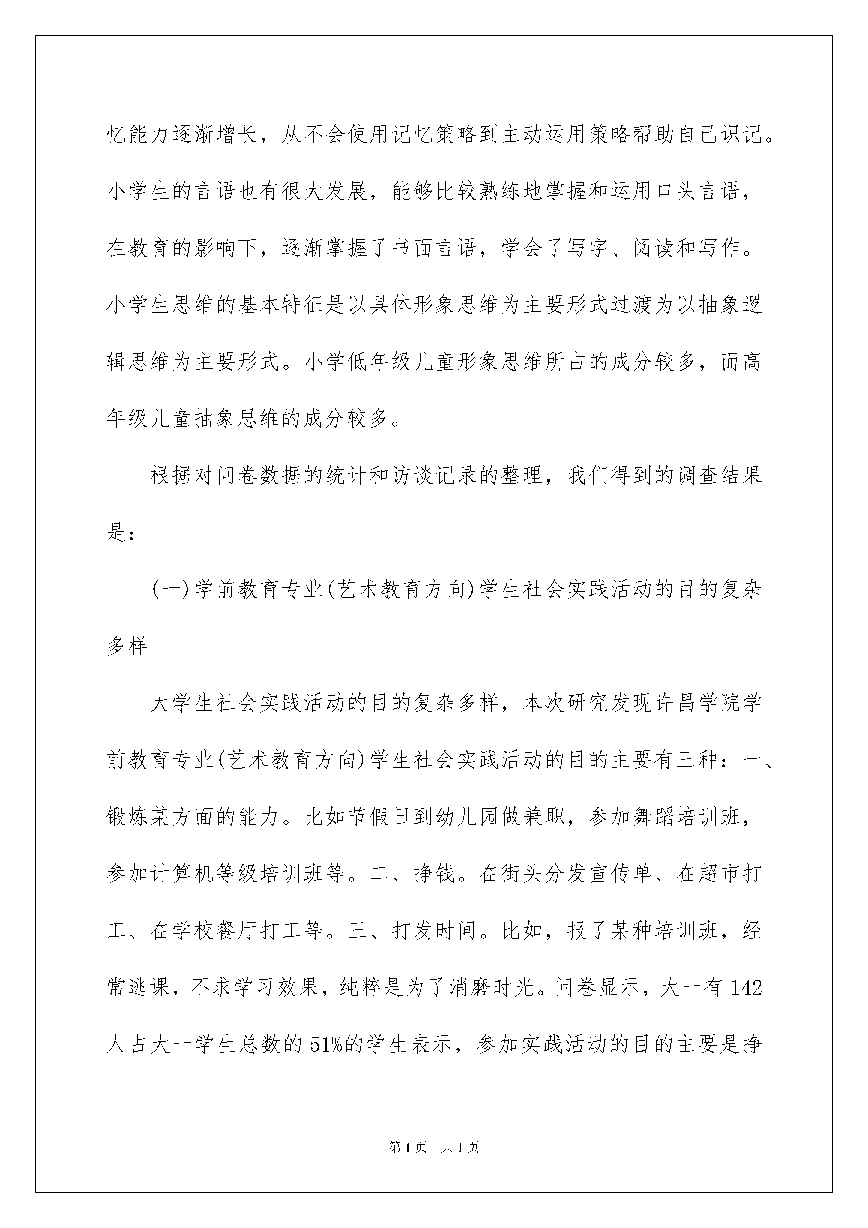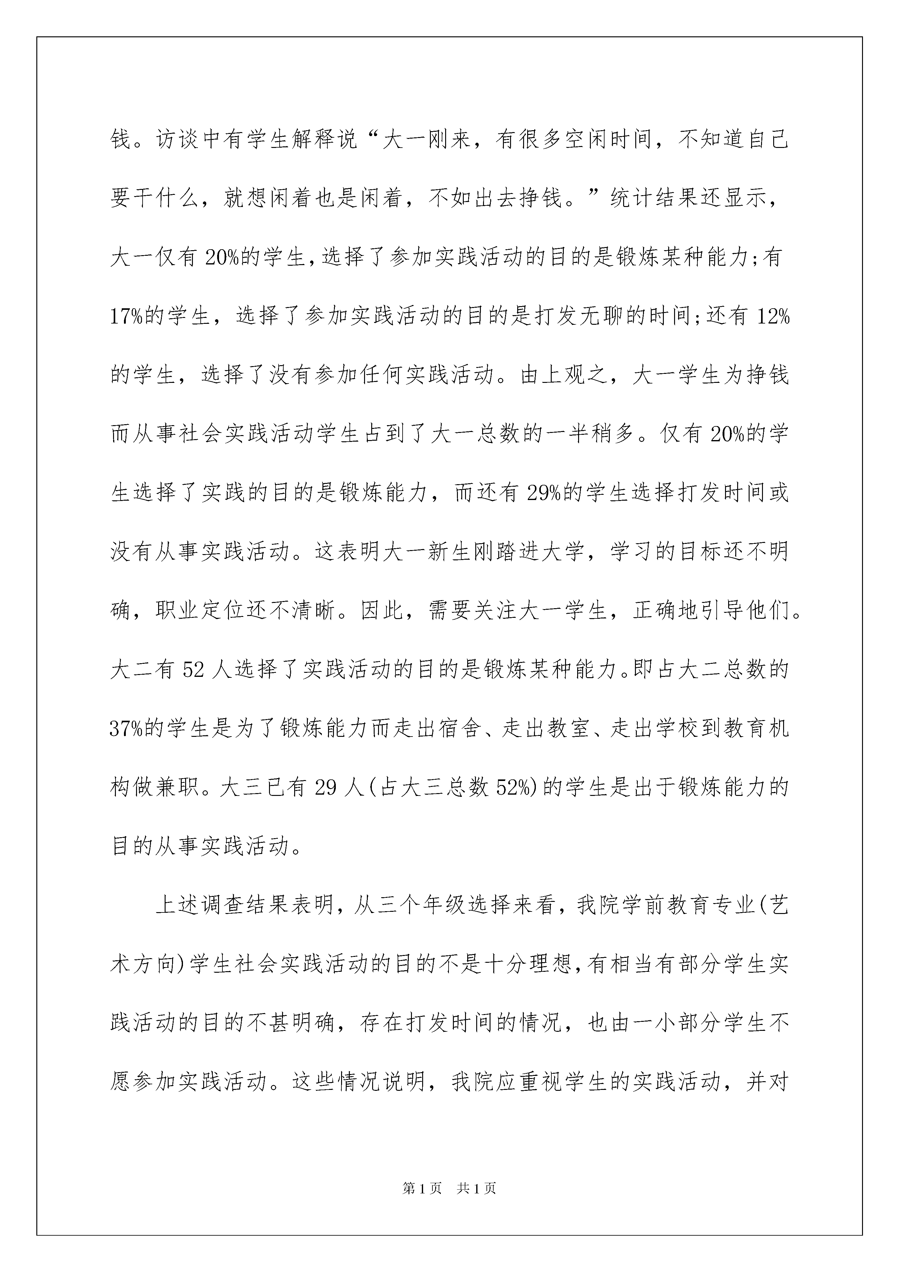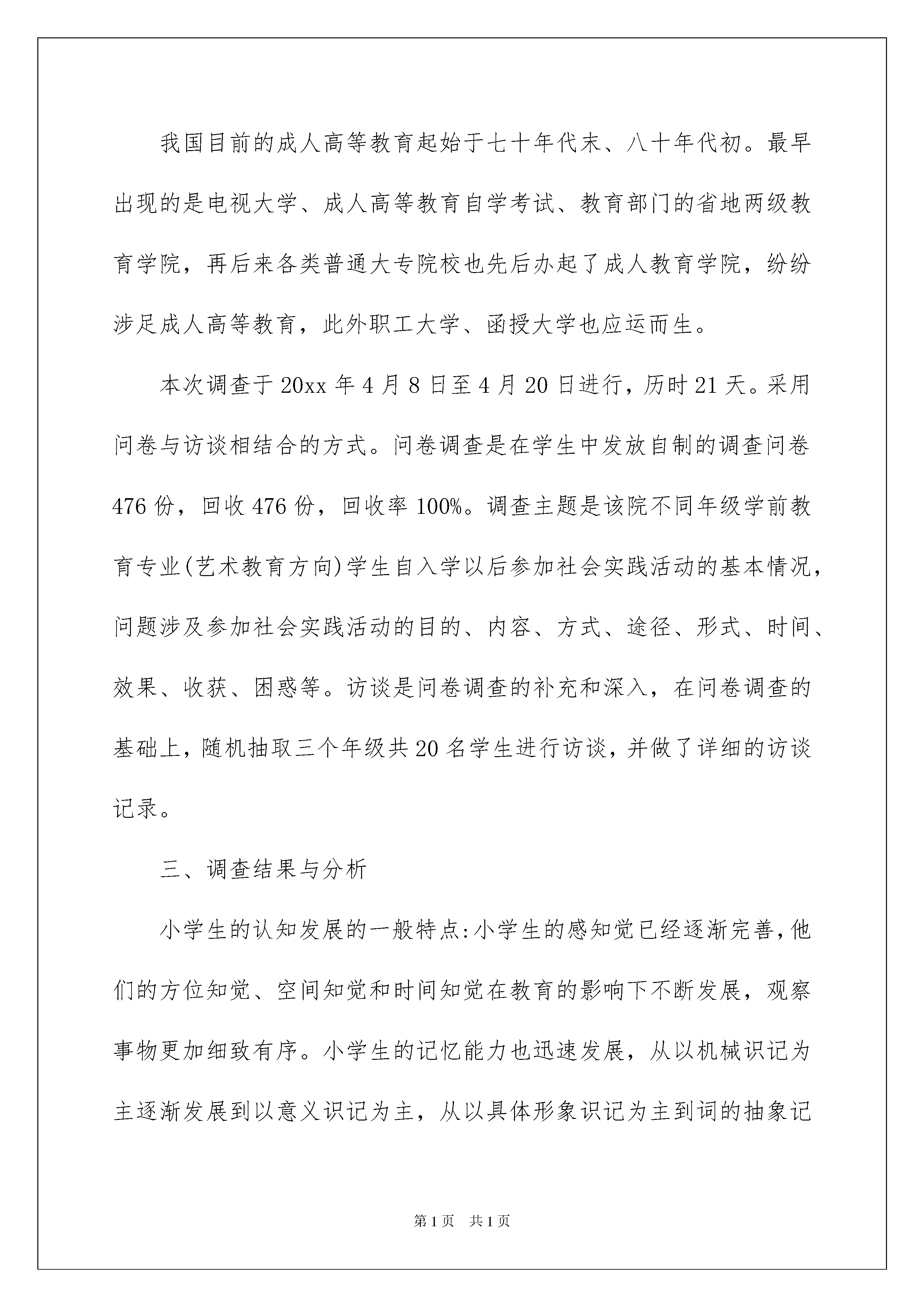 2022学前教育社会调查报告学前教育社会调查报告在人们素养不断提高的今天,报告的使用频率呈上升趋势,不同种类的报告具有不同的用途。写起报告来就毫无头绪?以下是我为大家整理的学前教育社会调查报告,欢迎阅读与收藏。学前教育社会调查报告1为了了解学前教育专业(艺术教育方向)大学生参加社会实践活动的情况,本研究采用问卷与访谈相结合的方式,对许昌学院学前教育专业大一至大三三个年级大学生的社会实践活动情况进行了调查。现将调研情况报告如下:一、调查目的和调查对象本调查的目的在于了解许昌学院学前教育专业(艺术教育方向)不同年级学生社会实践活动的情况,同时也为本专业学生的教育实习和见习工作提供依据。调查对象为许昌学院学前教育专业(艺术教育方向)大一、大二、大三的学生,分别为280人、140人和56人。二、调查时间、方式及其内容我国目前的成人高等教育起始于七十年代末、八十年代初。最早出现的是电视大学、成人高等教育自学考试、教育部门的省地两级教育学院,再后来各类普通大专院校也先后办起了成人教育学院,纷纷涉足成人高等教育,此外职工大学、函授大学也应运而生。本次调查于20xx年4月8日至4月20日进行,历时21天。采用问卷与访谈相结合的方式。问卷调查是在学生中发放自制的调查问卷476份,回收476份,回收率100%。调查主题是该院不同年级学前教育专业(艺术教育方向)学生自入学以后参加社会实践活动的基本情况,问题涉及参加社会实践活动的目的、内容、方式、途径、形式、时间、效果、收获、困惑等。访谈是问卷调查的补充和深入,在问卷调查的基础上,随机抽取三个年级共20名学生进行访谈,并做了详细的访谈记录。三、调查结果与分析小学生的认知发展的一般特点:小学生的感知觉已经逐渐完善,他们的方位知觉、空间知觉和时间知觉在教育的影响下不断发展,观察事物更加细致有序。小学生的记忆能力也迅速发展,从以机械识记为主逐渐发展到以意义识记为主,从以具体形象识记为主到词的抽象记忆能力逐渐增长,从不会使用记忆策略到主动运用策略帮助自己识记。小学生的言语也有很大发展,能够比较熟练地掌握和运用口头言语,在教育的影响下,逐渐掌握了书面言语,学会了写字、阅读和写作。小学生思维的基本特征是以具体形象思维为主要形式过渡为以抽象逻辑思维为主要形式。小学低年级儿童形象思维所占的成分较多,而高年级儿童抽象思维的成分较多。根据对问卷数据的统计和访谈记录的整理,我们得到的调查结果是:(一)学前教育专业(艺术教育方向)学生社会实践活动的目的复杂多样大学生社会实践活动的目的复杂多样,本次研究发现许昌学院学前教育专业(艺术教育方向)学生社会实践活动的目的主要有三种:一、锻炼某方面的能力。比如节假日到幼儿园做兼职,参加舞蹈培训班,参加计算机等级培训班等。二、挣钱。在街头分发宣传单、在超市打工、在学校餐厅打工等。三、打发时间。比如,报了某种培训班,经常逃课,不求学习效果,纯粹是为了消磨时光。问卷显示,大一有142人占大一学生总数的51%的学生表示,参加实践活动的目的主要是挣钱。访谈中有学生解释说“大一刚来,有很多空闲时间,不知道自己要干什么,就想闲着也是闲着,不如出去挣钱。”统计结果还显示,大一仅有20%的学生,选择了参加实践活动的目的是锻炼某种能力;有17%的学生,选择了参加实践活动的目的是打发无聊的时间;还有12%的学生,选择了没有参加任何实践活动。由上观之,大一学生为挣钱而从事社会实践活动学生占到了大一总数的一半稍多。仅有20%的学生选择了实践的目的是锻炼能力,而还有29%的学生选择打发时间或没有从事实践活动。这表明大一新生刚踏进大学,学习的目标还不明确,职业定位还不清晰。因此,需要关注大一学生,正确地引导他们。大二有52人选择了实践活动的目的是锻炼某种能力。即占大二总数的37%的学生是为了锻炼能力而走出宿舍、走出教室、走出学校到教育机构做兼职。大三已有29人(占大三总数52%)的学生是出于锻炼能力的目的从事实践活动。上述调查结果表明,从三个年级选择来看,我院学前教育专业(艺术方向)学生社会实践活动的目的不是十分理想,有相当有部分学生实践活动的目的不甚明确,存在打发时间的情况,也由一小部分学生不愿参加实践活动。这些情况说明,我院应重视学生的实践活动,并对他们进行科学的引导。(二)学前教育专业(艺术教育方向)学生社会实践活动的内容丰富多彩到交大慧谷商城之后,万博美讯饶经理为我介绍了交大慧谷电脑城的商家、产品结构和销售情况。接下来的.时间,这里的技术员和经理还给我从主板、显示器、CPU到显卡、声卡、内存、机箱电源、鼠标键盘等产品作了一一介绍。他要求我在实践过程中