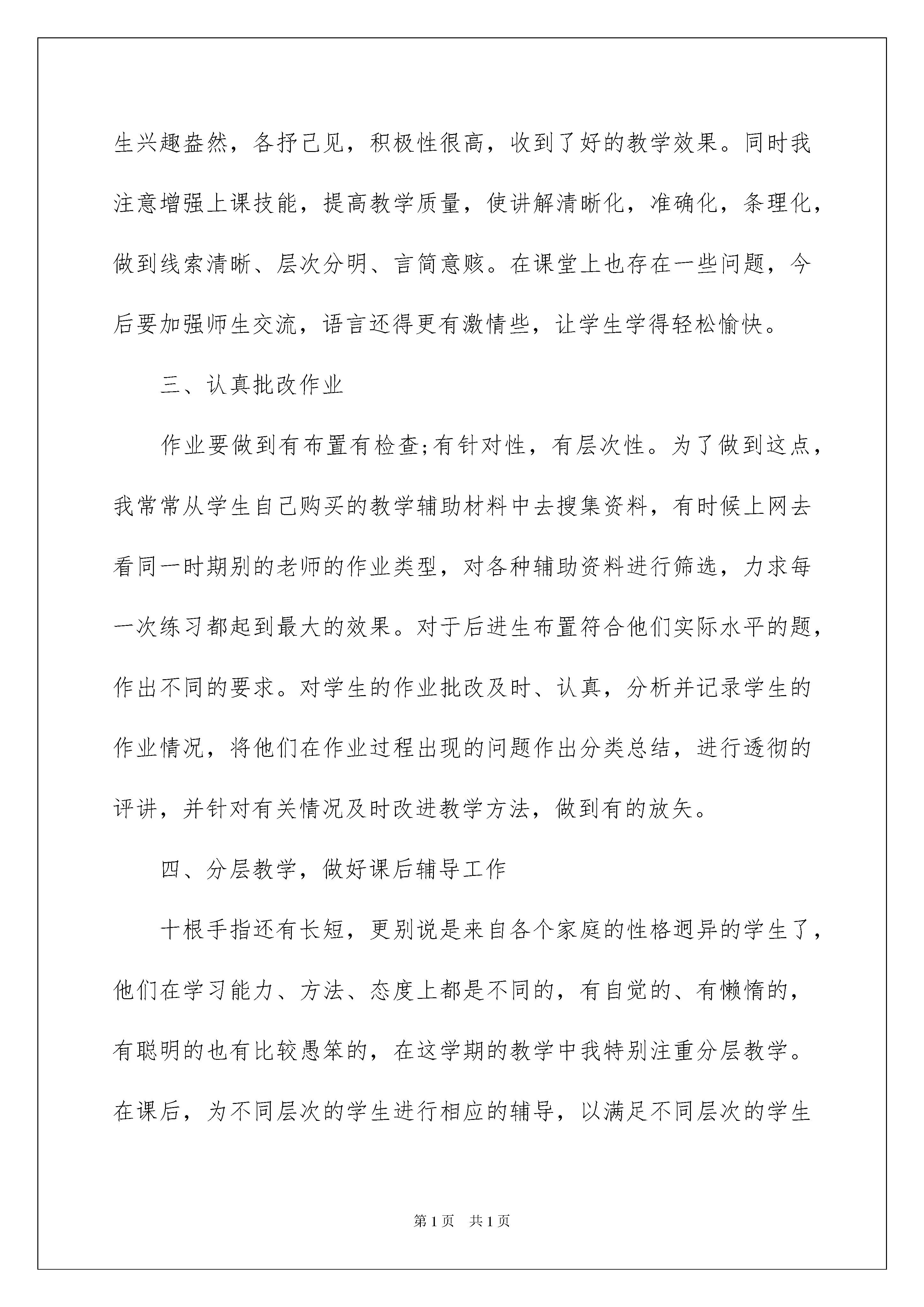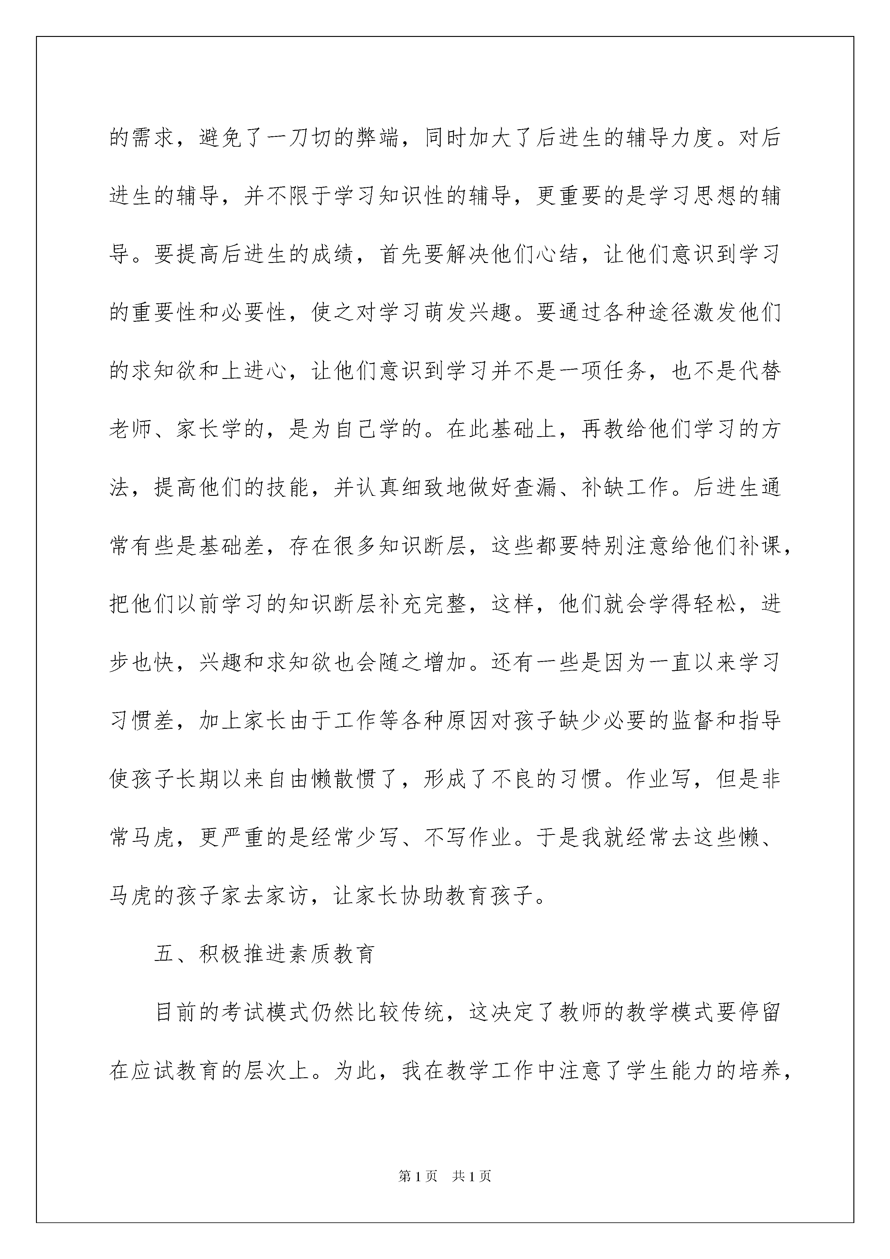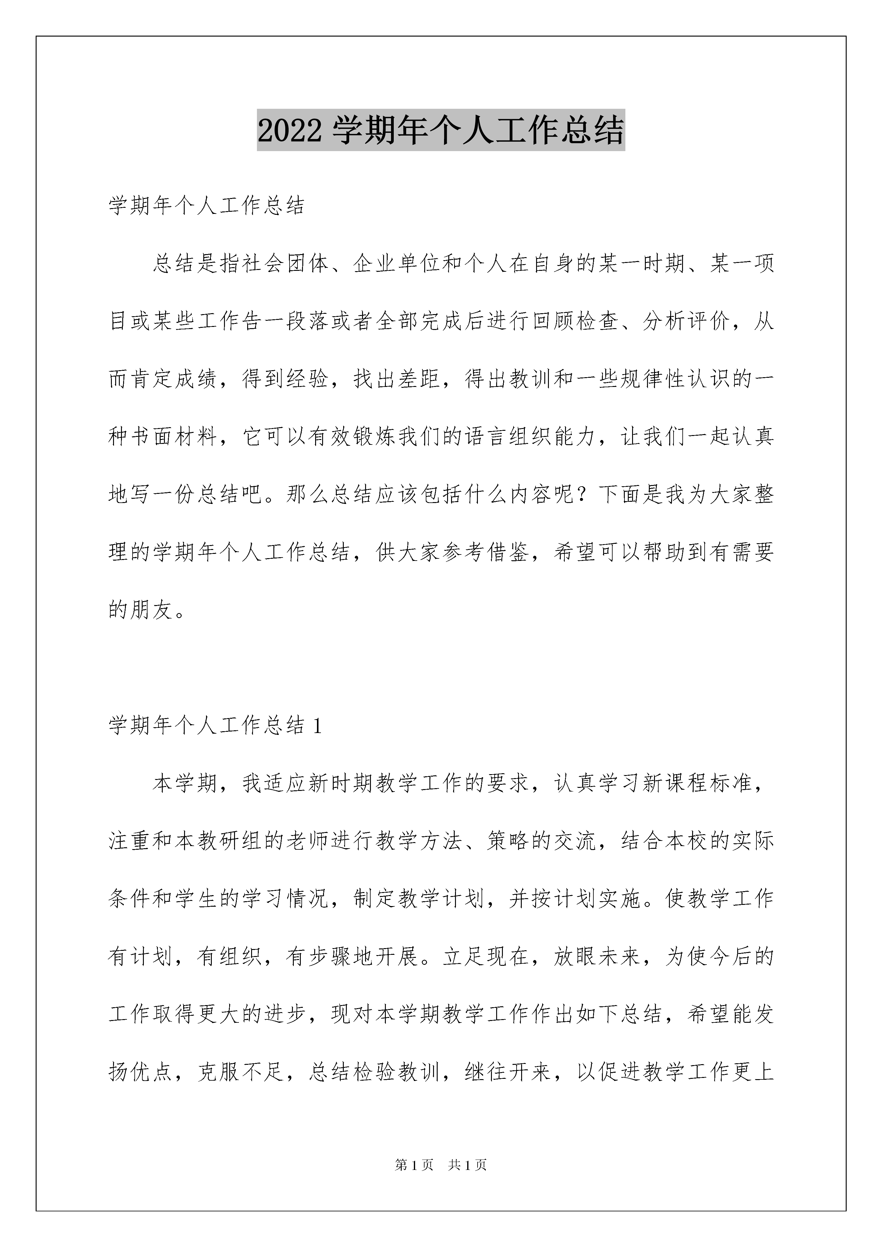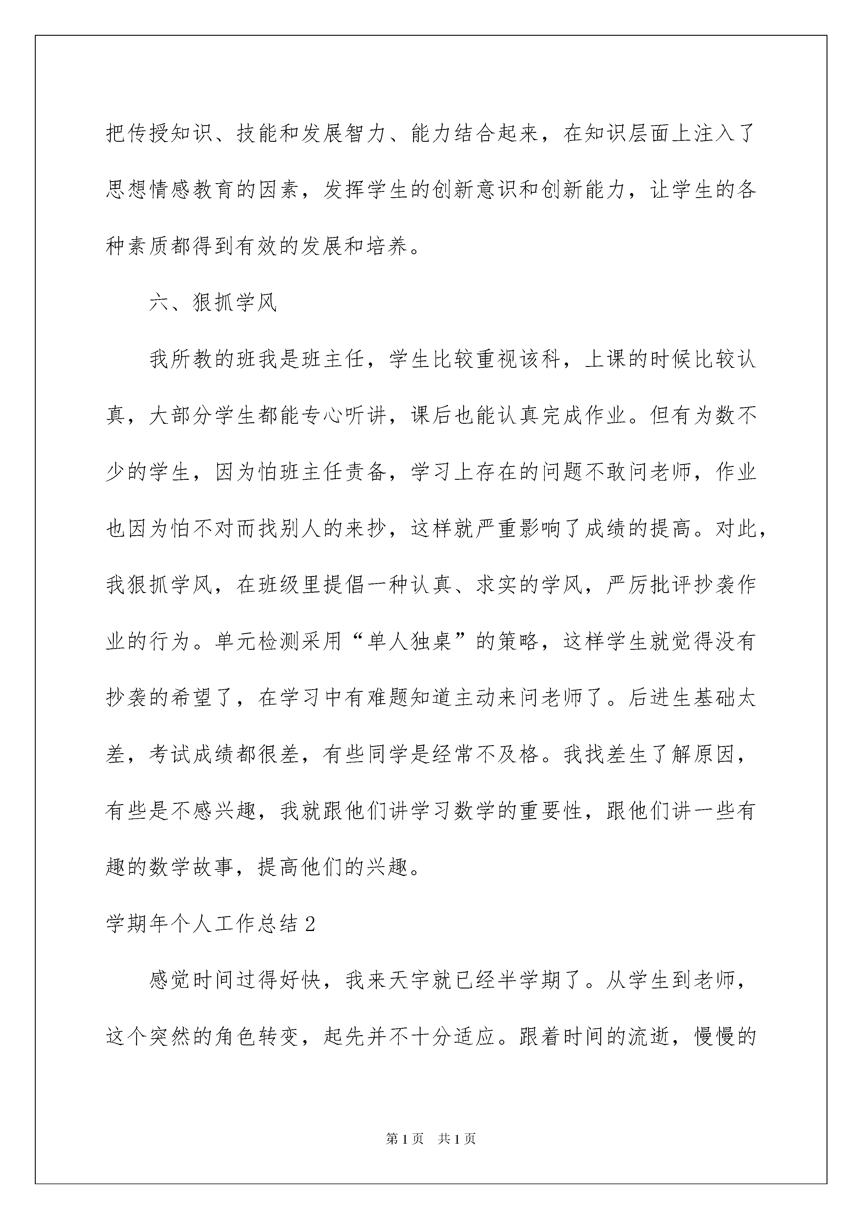 2022学期年个人工作总结学期年个人工作总结总结是指社会团体、企业单位和个人在自身的某一时期、某一项目或某些工作告一段落或者全部完成后进行回顾检查、分析评价,从而肯定成绩,得到经验,找出差距,得出教训和一些规律性认识的一种书面材料,它可以有效锻炼我们的语言组织能力,让我们一起认真地写一份总结吧。那么总结应该包括什么内容呢?下面是我为大家整理的学期年个人工作总结,供大家参考借鉴,希望可以帮助到有需要的朋友。学期年个人工作总结1本学期,我适应新时期教学工作的要求,认真学习新课程标准,注重和本教研组的老师进行教学方法、策略的交流,结合本校的实际条件和学生的学习情况,制定教学计划,并按计划实施。使教学工作有计划,有组织,有步骤地开展。立足现在,放眼未来,为使今后的工作取得更大的进步,现对本学期教学工作作出如下总结,希望能发扬优点,克服不足,总结检验教训,继往开来,以促进教学工作更上一层楼。一、注重集体备课本学期我们教师的办公室是按照教研组进行分配的,这样的工作组合有利于同年级、同教研组教师教学方法、策略和思想的交流。对于在教学中出现的问题可以在第一时间讨论解决的策略,对于闪现的好的教学思路和方法可以及时地互相交流,大家互相促进是我们的教学更加有序。在备课方面根据教材内容及学生的实际,设计课的类型,拟定采用的教学方法,并对教学过程的程序及时间安排都作了详细的记录,认真写好教案。每一课都做到“有备而来”,每堂课都在课前做好充分的准备,并制作各种利于吸引学生注意力的有趣教具、课件,课后及时对该课作出总结,写好教后感,并认真按搜集知识要点相关的资料,归纳起来。二、利用网络资源进行学习现如今办公室、家庭都有电脑了,我注意利用电脑进行学习。在上教研课时善于从网上搜集各种教学信息,比如在教学“圆的认识”一课时我看了好多网上发表的教学设计、课件、说课,还看了网上的示范课录象,根据我班学生的具体情况设计我的教案、课件。课上学生兴趣盎然,各抒己见,积极性很高,收到了好的教学效果。同时我注意增强上课技能,提高教学质量,使讲解清晰化,准确化,条理化,做到线索清晰、层次分明、言简意赅。在课堂上也存在一些问题,今后要加强师生交流,语言还得更有激情些,让学生学得轻松愉快。三、认真批改作业作业要做到有布置有检查;有针对性,有层次性。为了做到这点,我常常从学生自己购买的教学辅助材料中去搜集资料,有时候上网去看同一时期别的老师的作业类型,对各种辅助资料进行筛选,力求每一次练习都起到最大的效果。对于后进生布置符合他们实际水平的题,作出不同的要求。对学生的作业批改及时、认真,分析并记录学生的作业情况,将他们在作业过程出现的问题作出分类总结,进行透彻的评讲,并针对有关情况及时改进教学方法,做到有的放矢。四、分层教学,做好课后辅导工作十根手指还有长短,更别说是来自各个家庭的性格迥异的学生了,他们在学习能力、方法、态度上都是不同的,有自觉的、有懒惰的,有聪明的也有比较愚笨的,在这学期的教学中我特别注重分层教学。在课后,为不同层次的学生进行相应的辅导,以满足不同层次的学生的需求,避免了一刀切的弊端,同时加大了后进生的辅导力度。对后进生的辅导,并不限于学习知识性的辅导,更重要的是学习思想的辅导。要提高后进生的成绩,首先要解决他们心结,让他们意识到学习的重要性和必要性,使之对学习萌发兴趣。要通过各种途径激发他们的求知欲和上进心,让他们意识到学习并不是一项任务,也不是代替老师、家长学的,是为自己学的。在此基础上,再教给他们学习的方法,提高他们的技能,并认真细致地做好查漏、补缺工作。后进生通常有些是基础差,存在很多知识断层,这些都要特别注意给他们补课,把他们以前学习的知识断层补充完整,这样,他们就会学得轻松,进步也快,兴趣和求知欲也会随之增加。还有一些是因为一直以来学习习惯差,加上家长由于工作等各种原因对孩子缺少必要的监督和指导使孩子长期以来自由懒散惯了,形成了不良的习惯。作业写,但是非常马虎,更严重的是经常少写、不写作业。于是我就经常去这些懒、马虎的孩子家去家访,让家长协助教育孩子。五、积极推进素质教育目前的考试模式仍然比较传统,这决定了教师的教学模式要停留在应试教育的层次上。为此,我在教学工作中注意了学生能力的培养,把传授知识、技能和发展智力、能力结合起来,在知识层面上注入了思想情感教育的因素,发挥学生的创新意识和创新能力,让学生的各种素质都得到有效的发展和培养。六、狠抓学风我所教的班我是班主任,学生比较重视该科,上课的时候比较认真,大部分学生都能专心听讲,课后也能认真完成作业。但有为数不少的学生,因为怕班主任责备,学习上存在的问